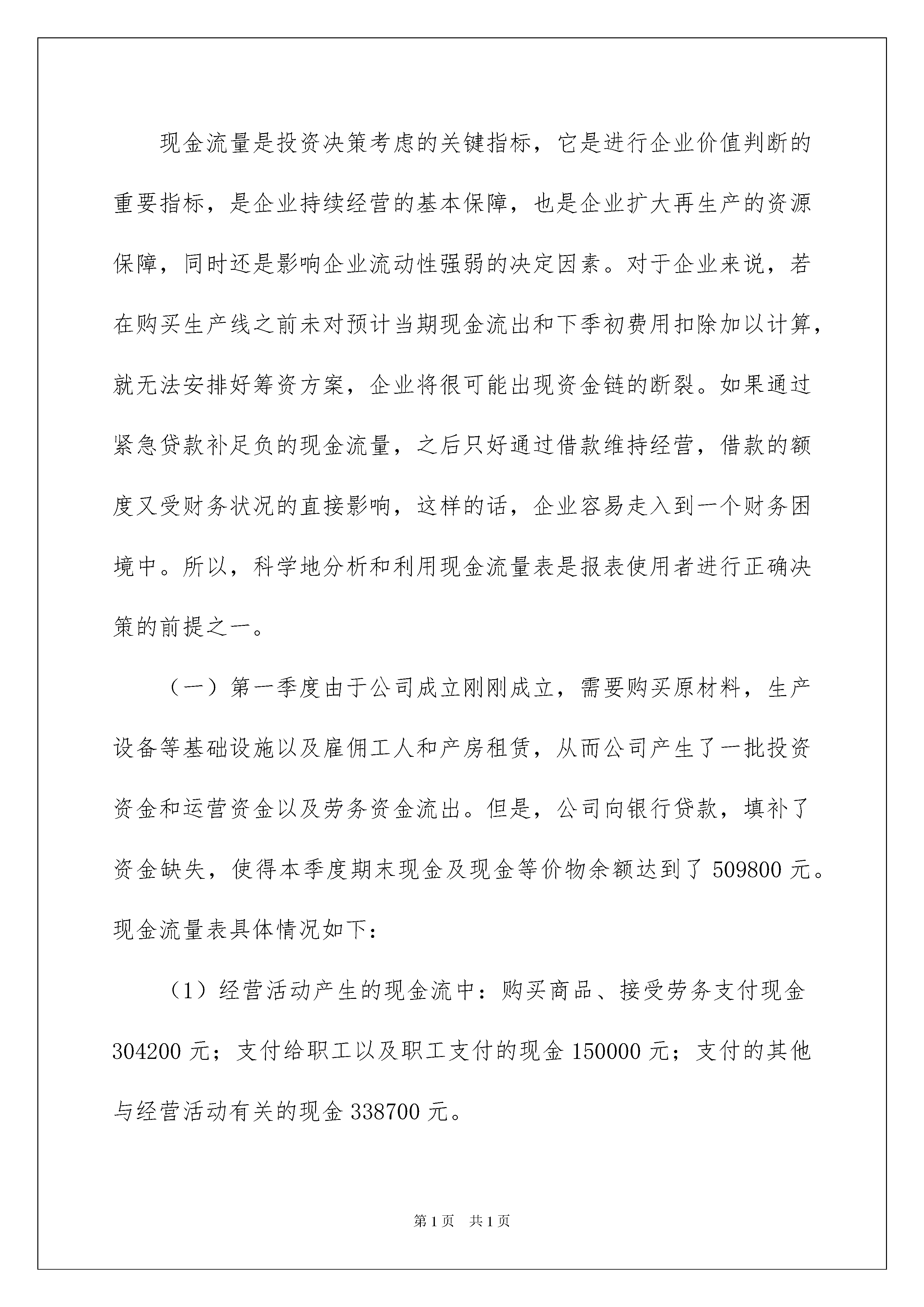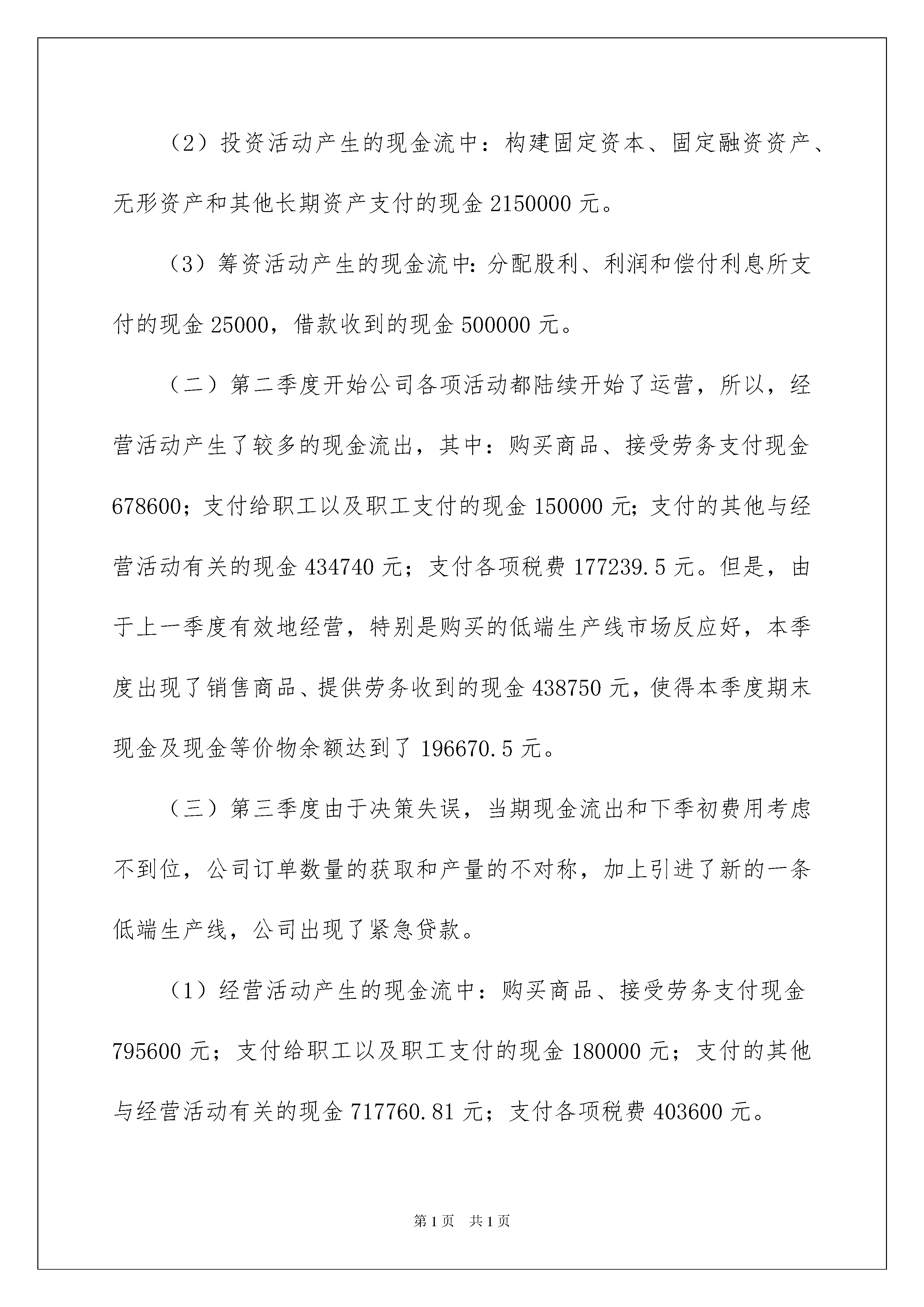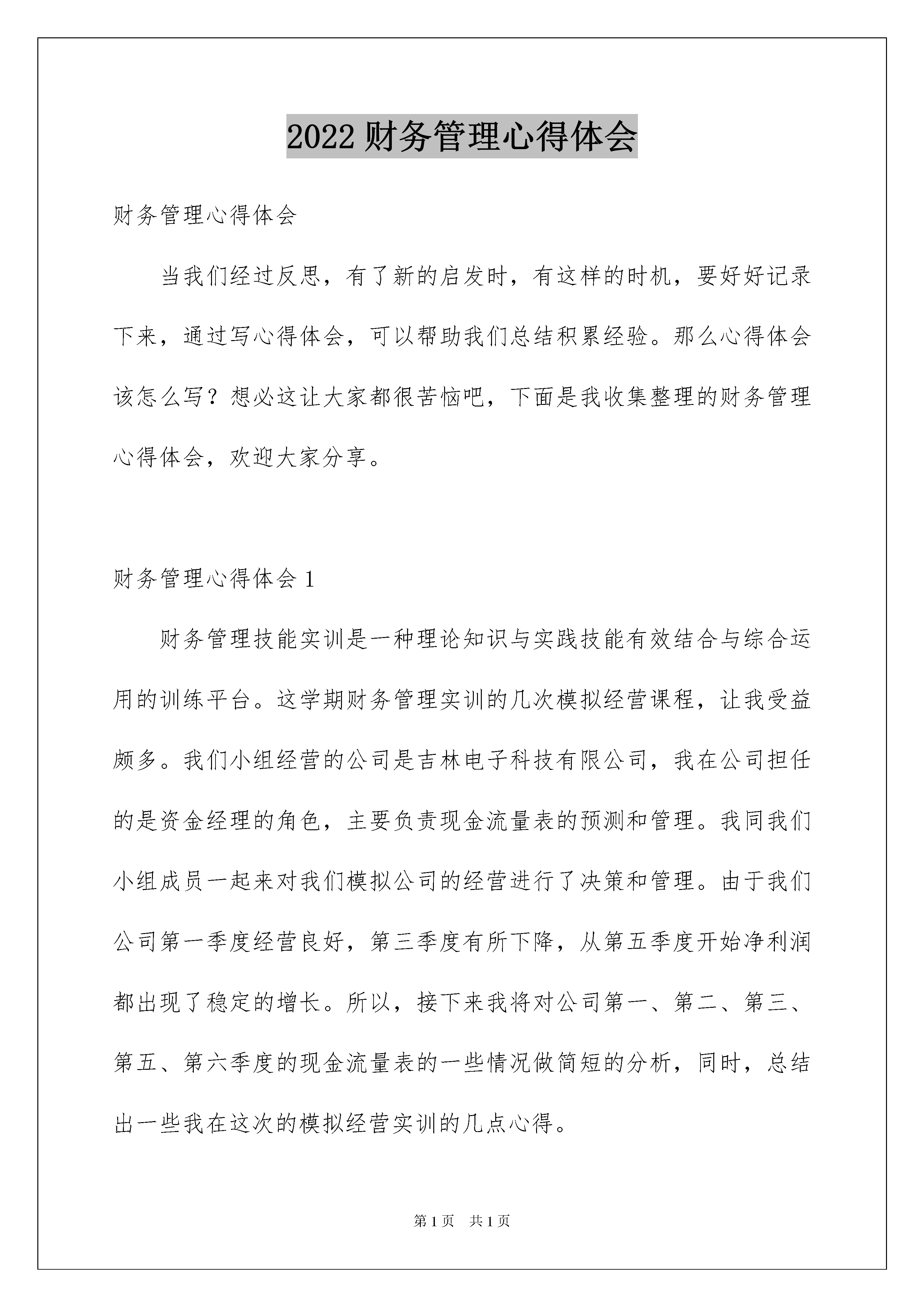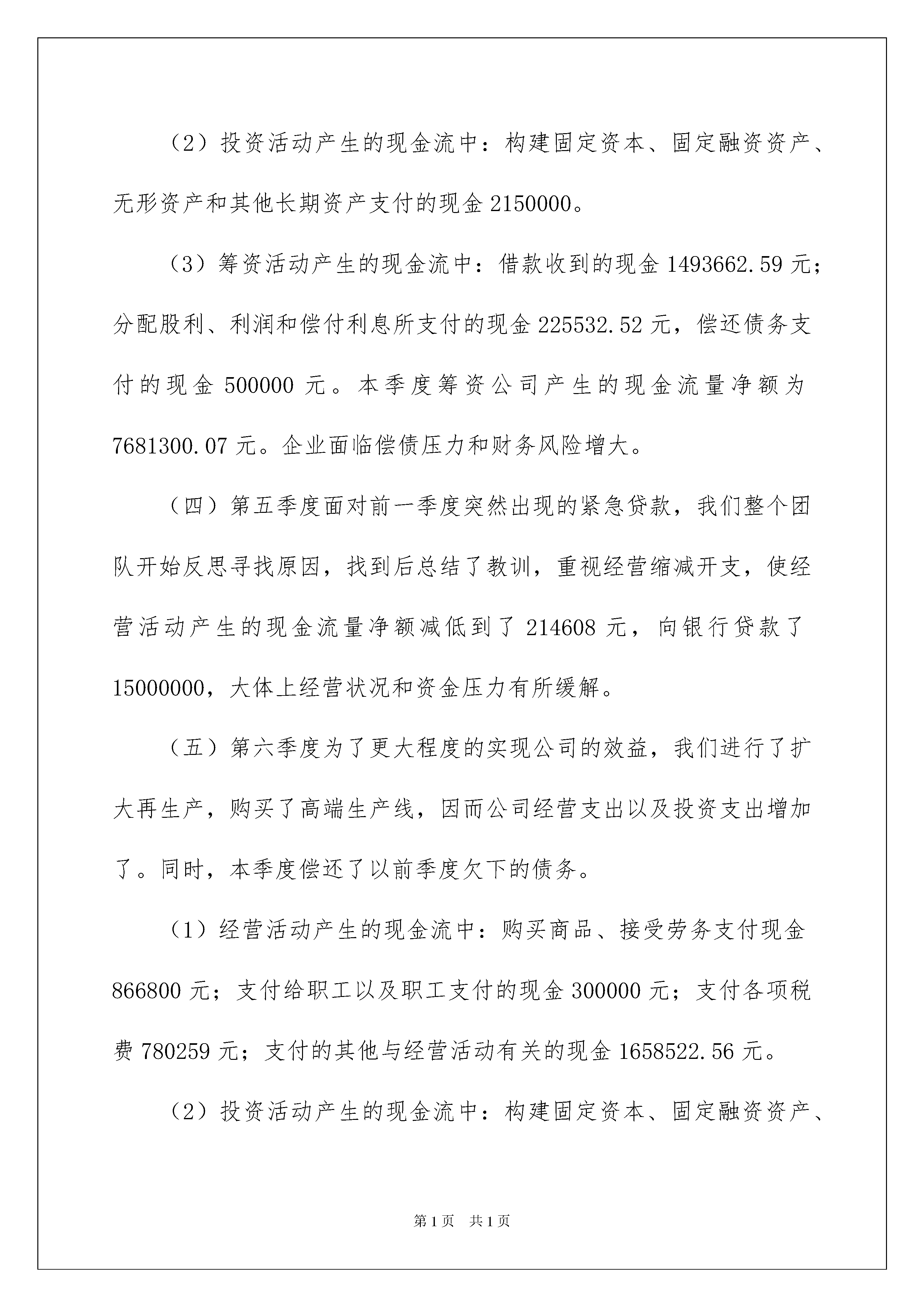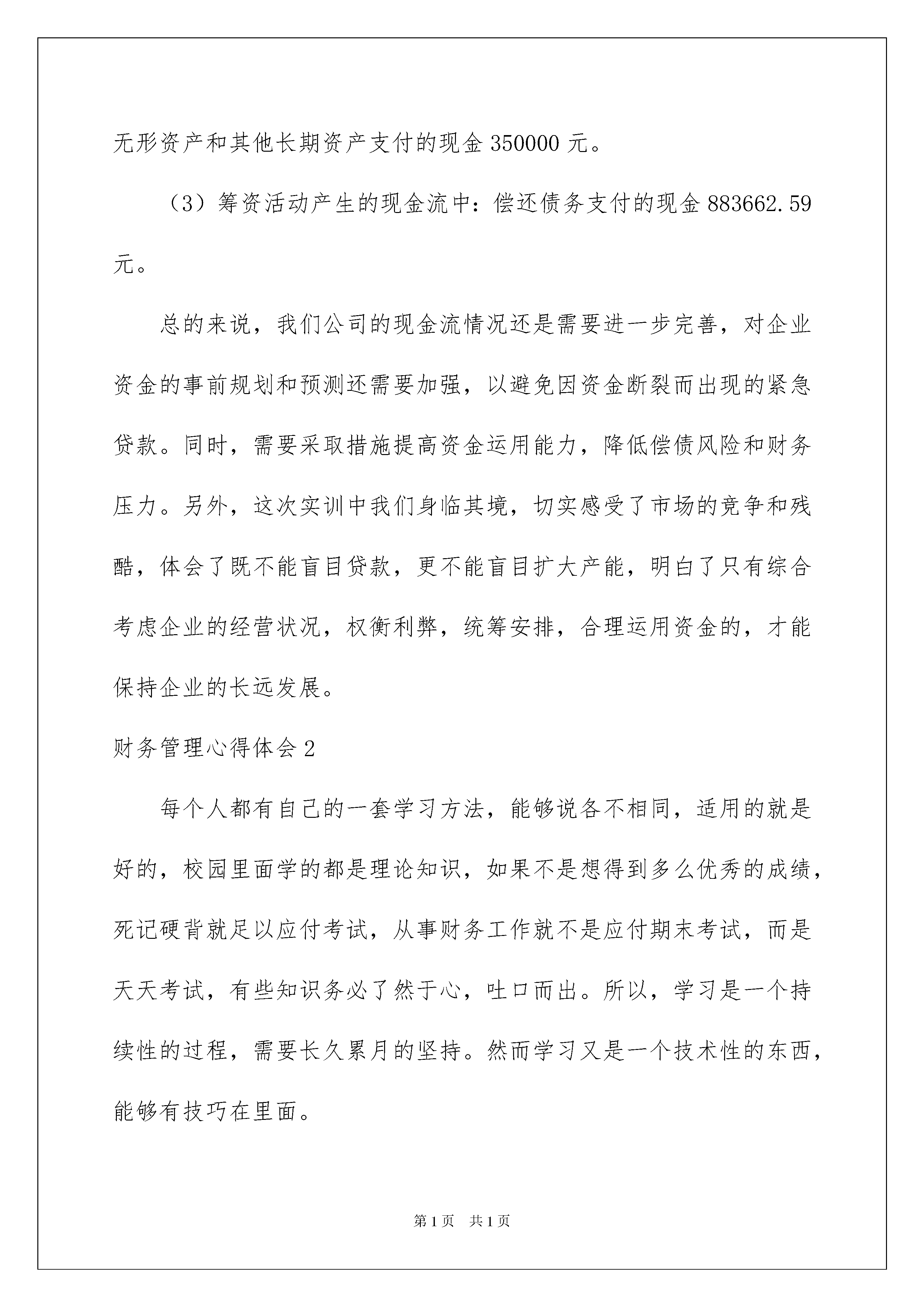 2022财务管理心得体会财务管理心得体会当我们经过反思,有了新的启发时,有这样的时机,要好好记录下来,通过写心得体会,可以帮助我们总结积累经验。那么心得体会该怎么写?想必这让大家都很苦恼吧,下面是我收集整理的财务管理心得体会,欢迎大家分享。财务管理心得体会1财务管理技能实训是一种理论知识与实践技能有效结合与综合运用的训练平台。这学期财务管理实训的几次模拟经营课程,让我受益颇多。我们小组经营的公司是吉林电子科技有限公司,我在公司担任的是资金经理的角色,主要负责现金流量表的预测和管理。我同我们小组成员一起来对我们模拟公司的经营进行了决策和管理。由于我们公司第一季度经营良好,第三季度有所下降,从第五季度开始净利润都出现了稳定的增长。所以,接下来我将对公司第一、第二、第三、第五、第六季度的现金流量表的一些情况做简短的分析,同时,总结出一些我在这次的模拟经营实训的几点心得。现金流量是投资决策考虑的关键指标,它是进行企业价值判断的重要指标,是企业持续经营的基本保障,也是企业扩大再生产的资源保障,同时还是影响企业流动性强弱的决定因素。对于企业来说,若在购买生产线之前未对预计当期现金流出和下季初费用扣除加以计算,就无法安排好筹资方案,企业将很可能出现资金链的断裂。如果通过紧急贷款补足负的现金流量,之后只好通过借款维持经营,借款的额度又受财务状况的直接影响,这样的话,企业容易走入到一个财务困境中。所以,科学地分析和利用现金流量表是报表使用者进行正确决策的前提之一。(一)第一季度由于公司成立刚刚成立,需要购买原材料,生产设备等基础设施以及雇佣工人和产房租赁,从而公司产生了一批投资资金和运营资金以及劳务资金流出。但是,公司向银行贷款,填补了资金缺失,使得本季度期末现金及现金等价物余额达到了509800元。现金流量表具体情况如下:(1)经营活动产生的现金流中:购买商品、接受劳务支付现金304200元;支付给职工以及职工支付的现金150000元;支付的其他与经营活动有关的现金338700元。(2)投资活动产生的现金流中:构建固定资本、固定融资资产、无形资产和其他长期资产支付的现金2150000元。(3)筹资活动产生的现金流中:分配股利、利润和偿付利息所支付的现金25000,借款收到的现金500000元。(二)第二季度开始公司各项活动都陆续开始了运营,所以,经营活动产生了较多的现金流出,其中:购买商品、接受劳务支付现金678600;支付给职工以及职工支付的现金150000元;支付的其他与经营活动有关的现金434740元;支付各项税费177239.5元。但是,由于上一季度有效地经营,特别是购买的低端生产线市场反应好,本季度出现了销售商品、提供劳务收到的现金438750元,使得本季度期末现金及现金等价物余额达到了196670.5元。(三)第三季度由于决策失误,当期现金流出和下季初费用考虑不到位,公司订单数量的获取和产量的不对称,加上引进了新的一条低端生产线,公司出现了紧急贷款。(1)经营活动产生的现金流中:购买商品、接受劳务支付现金795600元;支付给职工以及职工支付的现金180000元;支付的其他与经营活动有关的现金717760.81元;支付各项税费403600元。(2)投资活动产生的现金流中:构建固定资本、固定融资资产、无形资产和其他长期资产支付的现金2150000。(3)筹资活动产生的现金流中:借款收到的现金1493662.59元;分配股利、利润和偿付利息所支付的现金225532.52元,偿还债务支付的现金500000元。本季度筹资公司产生的现金流量净额为7681300.07元。企业面临偿债压力和财务风险增大。(四)第五季度面对前一季度突然出现的紧急贷款,我们整个团队开始反思寻找原因,找到后总结了教训,重视经营缩减开支,使经营活动产生的现金流量净额减低到了214608元,向银行贷款了15000000,大体上经营状况和资金压力有所缓解。(五)第六季度为了更大程度的实现公司的效益,我们进行了扩大再生产,购买了高端生产线,因而公司经营支出以及投资支出增加了。同时,本季度偿还了以前季度欠下的债务。(1)经营活动产生的现金流中:购买商品、接受劳务支付现金866800元;支付给职工以及职工支付的现金300000元;支付各项税费780259元;支付的其他与经营活动有关的现金1658522.56元。(2)投资活动产生的现金流中:构建固定资本、固定融资资产、无形资产和其他长期资产支付的现金350000元。(3)筹资活动产生的现金流中:偿还债务支付的现金883662.59元。总的来说,我们公司的现金流情况还是需要进