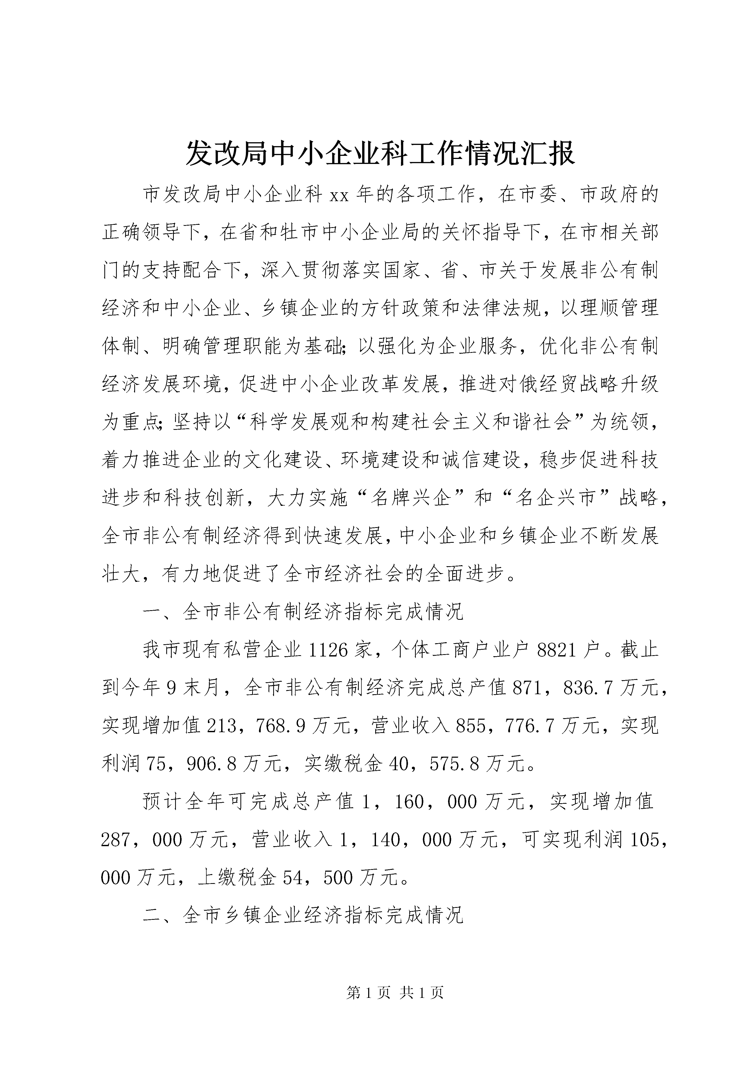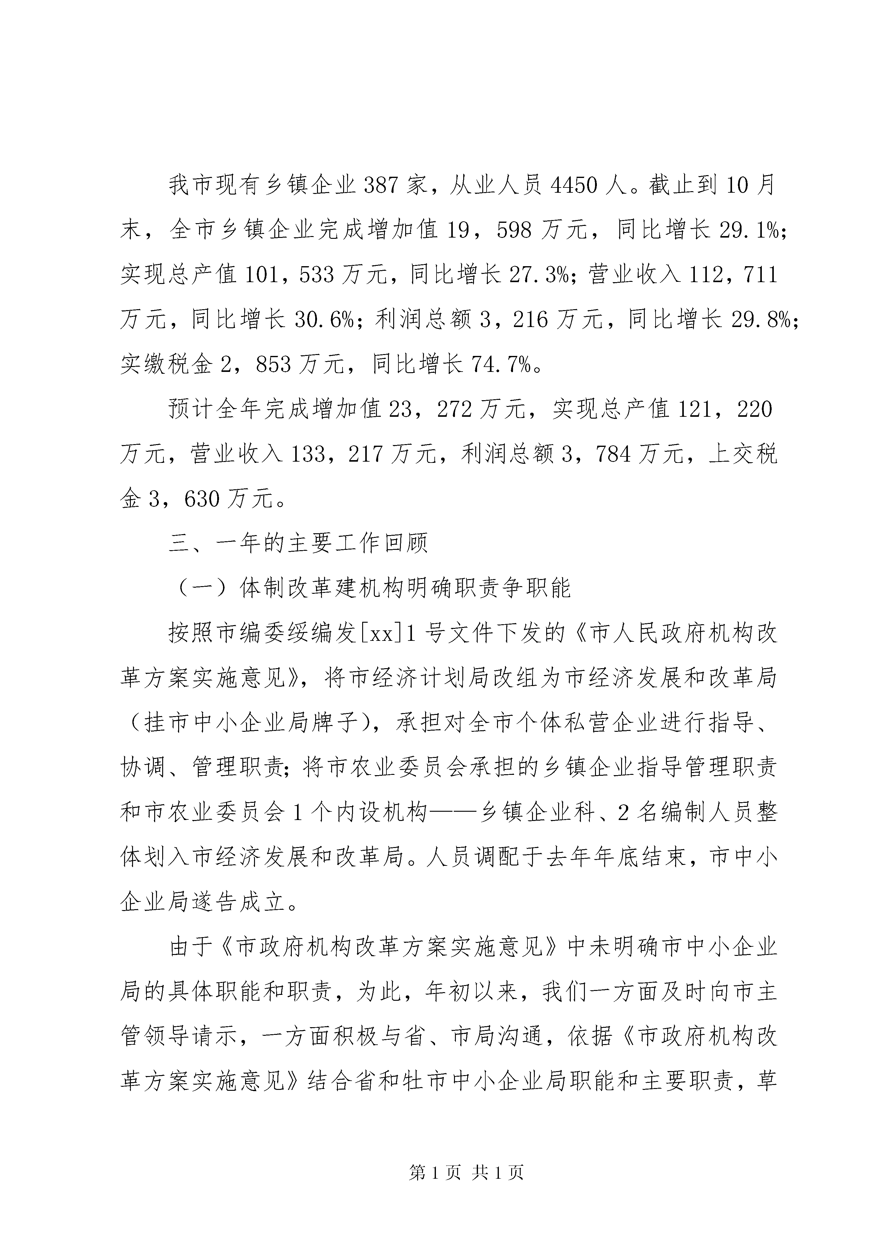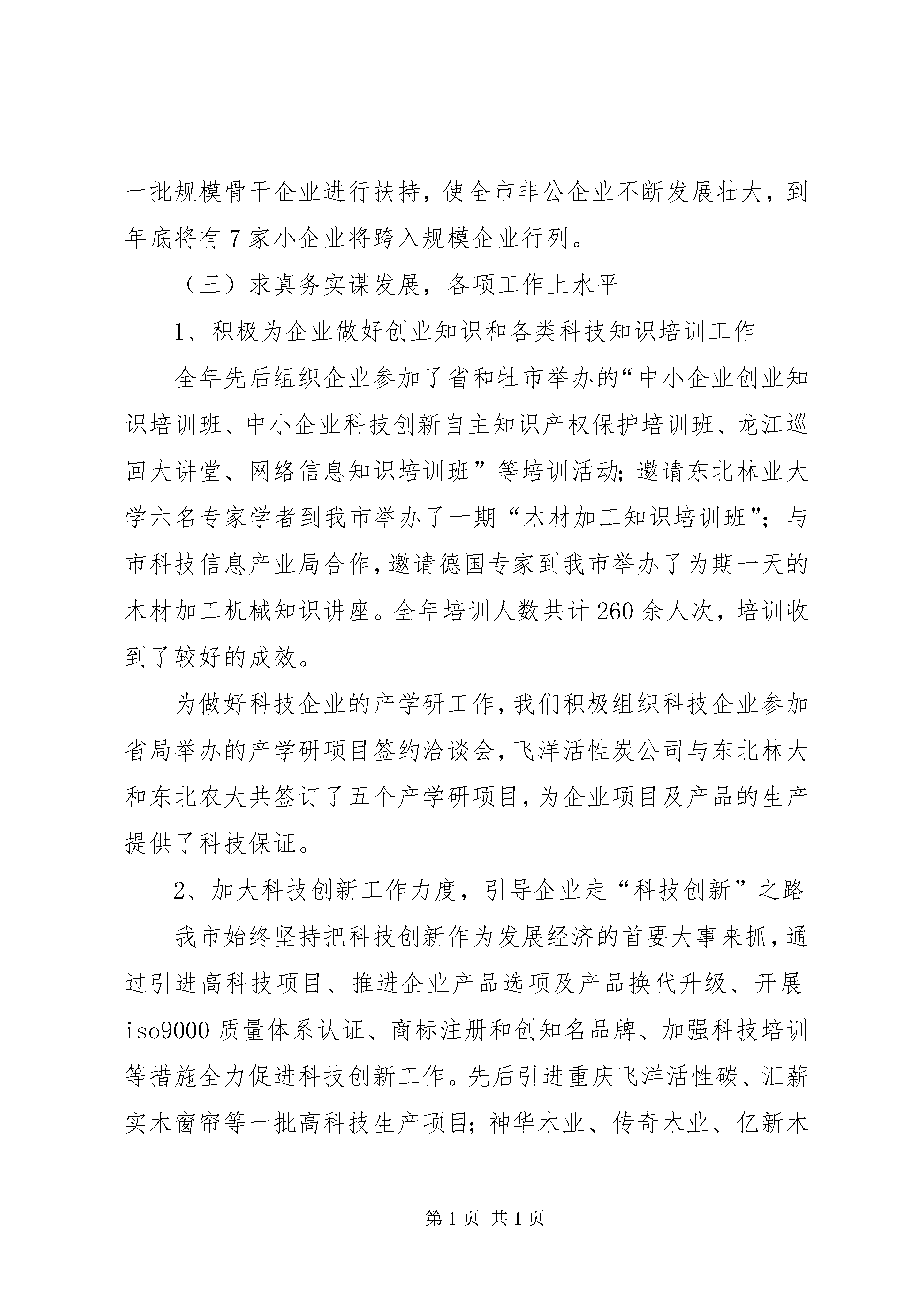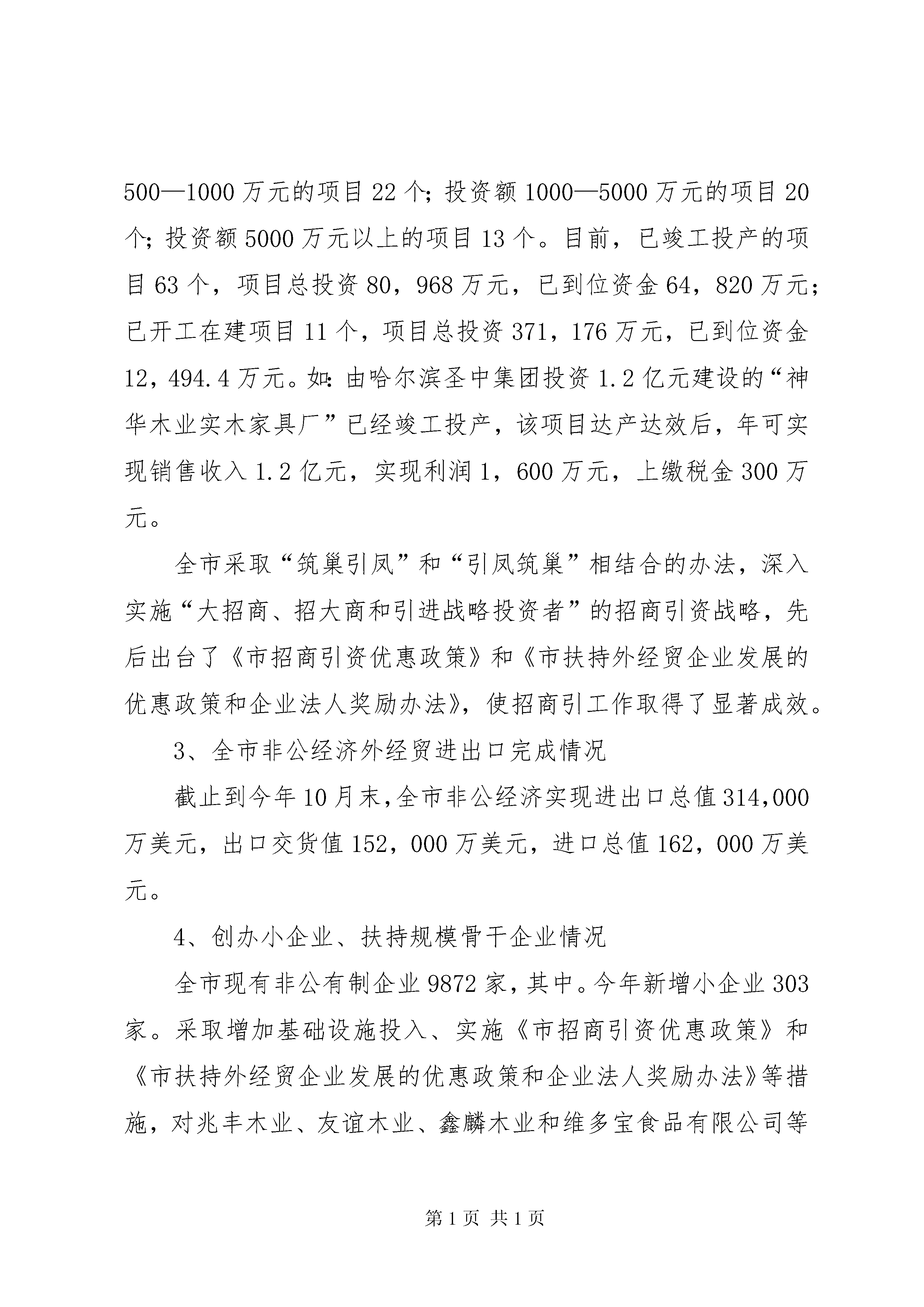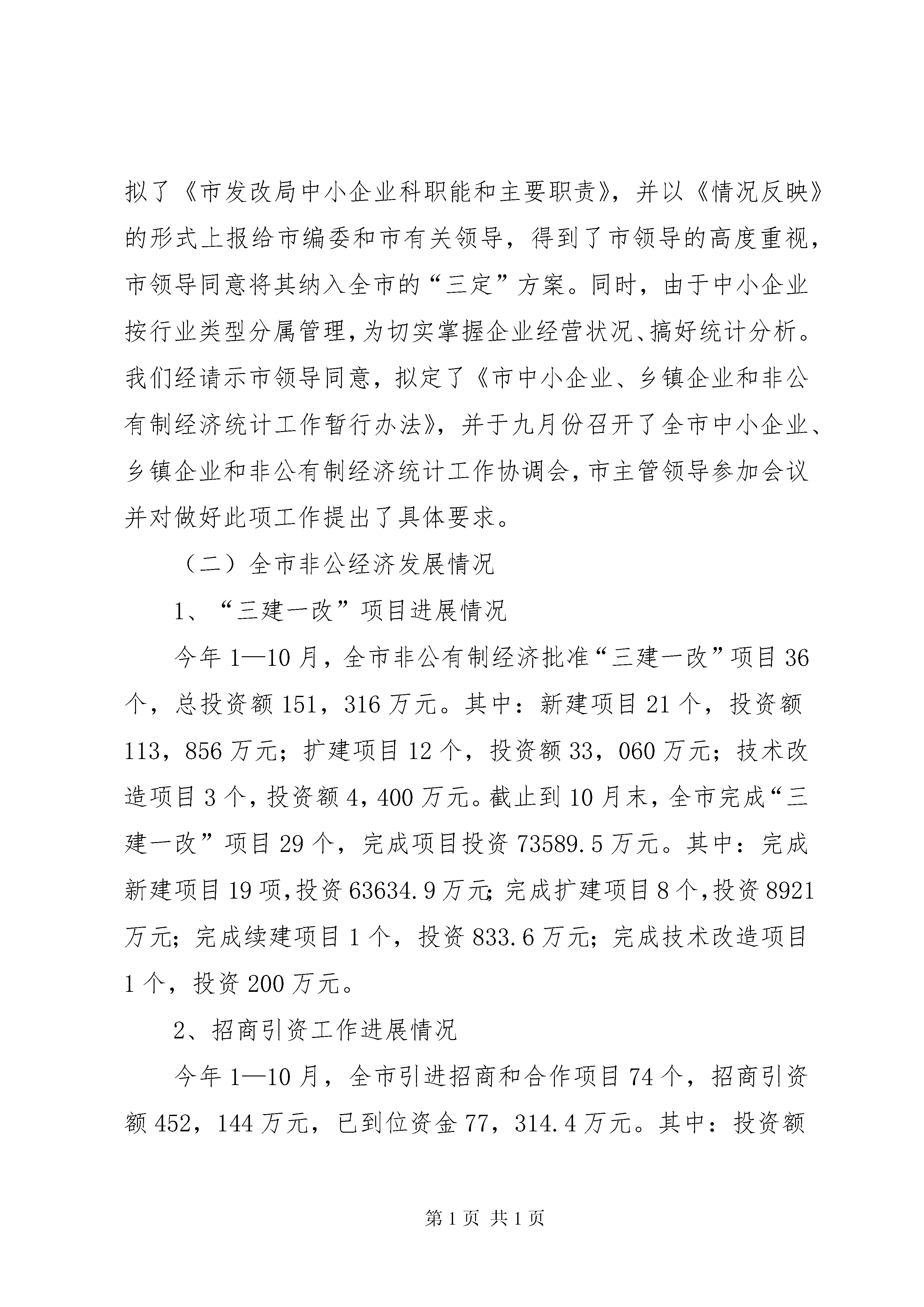 发改局中小企业科工作情况汇报市发改局中小企业科xx年的各项工作,在市委、市政府的正确领导下,在省和牡市中小企业局的关怀指导下,在市相关部门的支持配合下,深入贯彻落实国家、省、市关于发展非公有制经济和中小企业、乡镇企业的方针政策和法律法规,以理顺管理体制、明确管理职能为基础;以强化为企业服务,优化非公有制经济发展环境,促进中小企业改革发展,推进对俄经贸战略升级为重点;坚持以“科学发展观和构建社会主义和谐社会”为统领,着力推进企业的文化建设、环境建设和诚信建设,稳步促进科技进步和科技创新,大力实施“名牌兴企”和“名企兴市”战略,全市非公有制经济得到快速发展,中小企业和乡镇企业不断发展壮大,有力地促进了全市经济社会的全面进步。一、全市非公有制经济指标完成情况我市现有私营企业1126家,个体工商户业户8821户。截止到今年9末月,全市非公有制经济完成总产值871,836.7万元,实现增加值213,768.9万元,营业收入855,776.7万元,实现利润75,906.8万元,实缴税金40,575.8万元。预计全年可完成总产值1,160,000万元,实现增加值287,000万元,营业收入1,140,000万元,可实现利润105,000万元,上缴税金54,500万元。二、全市乡镇企业经济指标完成情况我市现有乡镇企业387家,从业人员4450人。截止到10月末,全市乡镇企业完成增加值19,598万元,同比增长29.1%;实现总产值101,533万元,同比增长27.3%;营业收入112,711万元,同比增长30.6%;利润总额3,216万元,同比增长29.8%;实缴税金2,853万元,同比增长74.7%。预计全年完成增加值23,272万元,实现总产值121,220万元,营业收入133,217万元,利润总额3,784万元,上交税金3,630万元。三、一年的主要工作回顾(一)体制改革建机构明确职责争职能按照市编委绥编发[xx]1号文件下发的《市人民政府机构改革方案实施意见》,将市经济计划局改组为市经济发展和改革局(挂市中小企业局牌子),承担对全市个体私营企业进行指导、协调、管理职责;将市农业委员会承担的乡镇企业指导管理职责和市农业委员会1个内设机构——乡镇企业科、2名编制人员整体划入市经济发展和改革局。人员调配于去年年底结束,市中小企业局遂告成立。由于《市政府机构改革方案实施意见》中未明确市中小企业局的具体职能和职责,为此,年初以来,我们一方面及时向市主管领导请示,一方面积极与省、市局沟通,依据《市政府机构改革方案实施意见》结合省和牡市中小企业局职能和主要职责,草拟了《市发改局中小企业科职能和主要职责》,并以《情况反映》的形式上报给市编委和市有关领导,得到了市领导的高度重视,市领导同意将其纳入全市的“三定”方案。同时,由于中小企业按行业类型分属管理,为切实掌握企业经营状况、搞好统计分析。我们经请示市领导同意,拟定了《市中小企业、乡镇企业和非公有制经济统计工作暂行办法》,并于九月份召开了全市中小企业、乡镇企业和非公有制经济统计工作协调会,市主管领导参加会议并对做好此项工作提出了具体要求。(二)全市非公经济发展情况1、“三建一改”项目进展情况今年1—10月,全市非公有制经济批准“三建一改”项目36个,总投资额151,316万元。其中:新建项目21个,投资额113,856万元;扩建项目12个,投资额33,060万元;技术改造项目3个,投资额4,400万元。截止到10月末,全市完成“三建一改”项目29个,完成项目投资73589.5万元。其中:完成新建项目19项,投资63634.9万元;完成扩建项目8个,投资8921万元;完成续建项目1个,投资833.6万元;完成技术改造项目1个,投资200万元。2、招商引资工作进展情况今年1—10月,全市引进招商和合作项目74个,招商引资额452,144万元,已到位资金77,314.4万元。其中:投资额500—1000万元的项目22个;投资额1000—5000万元的项目20个;投资额5000万元以上的项目13个。目前,已竣工投产的项目63个,项目总投资80,968万元,已到位资金64,820万元;已开工在建项目11个,项目总投资371,176万元,已到位资金12,494.4万元。如:由哈尔滨圣中集团投资1.2亿元建设的“神华木业实木家具厂”已经竣工投产,该项目达产达效后,年可实现销售收入1.2亿元,实现利润1,600万元,上缴税金300万元。全市采取“筑巢引凤”和“引凤筑巢”相结合的办法,深入实施“大招商、招大商和引进战略投资者”的招商引资战略,先后出台了《市招商引资优惠政策》和《市扶持外经贸企业发展的优惠政策和企业法人奖励办法》,使招商引工作取得了显著成效。3、全市非公经济外经贸进出口完成情况截