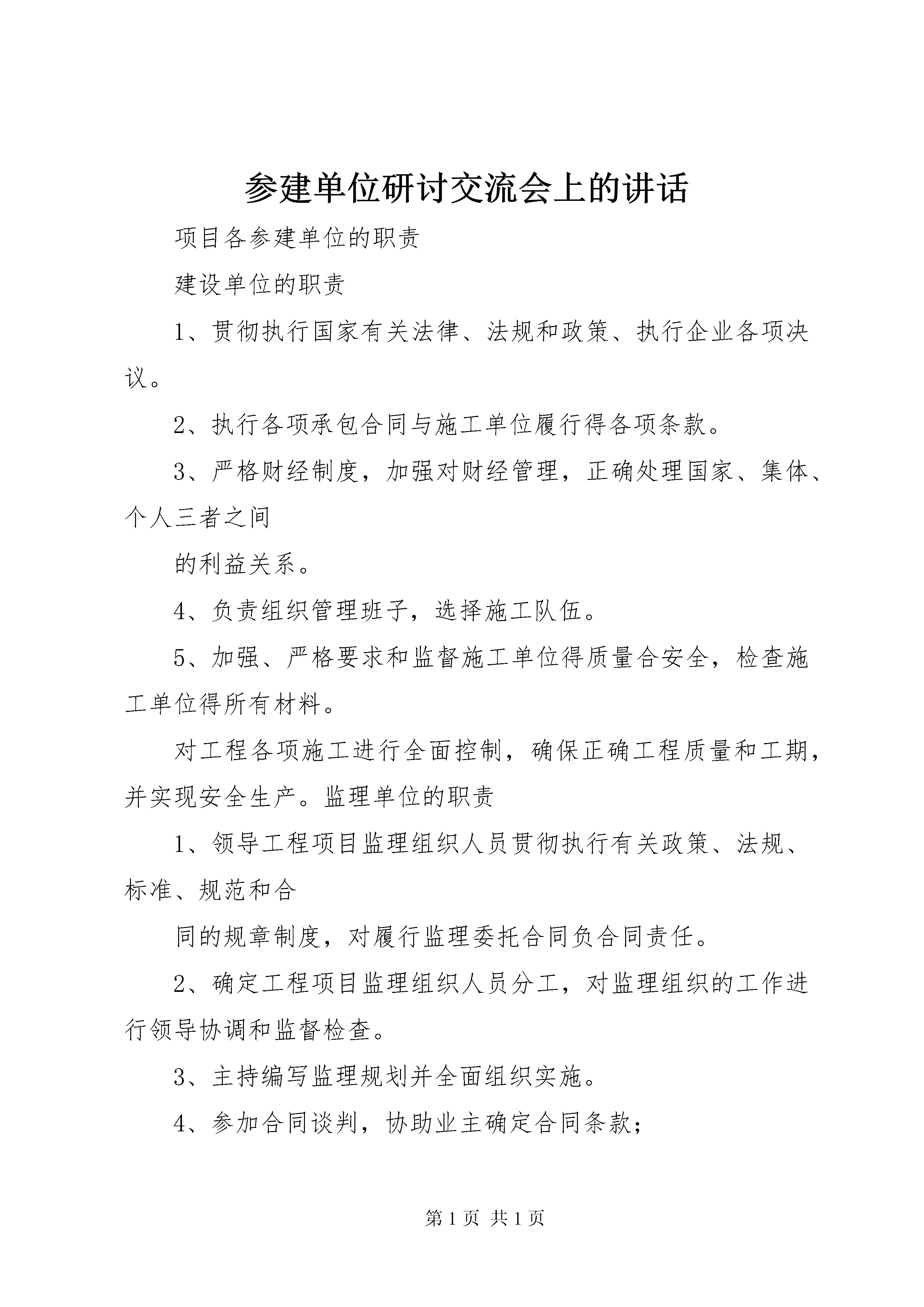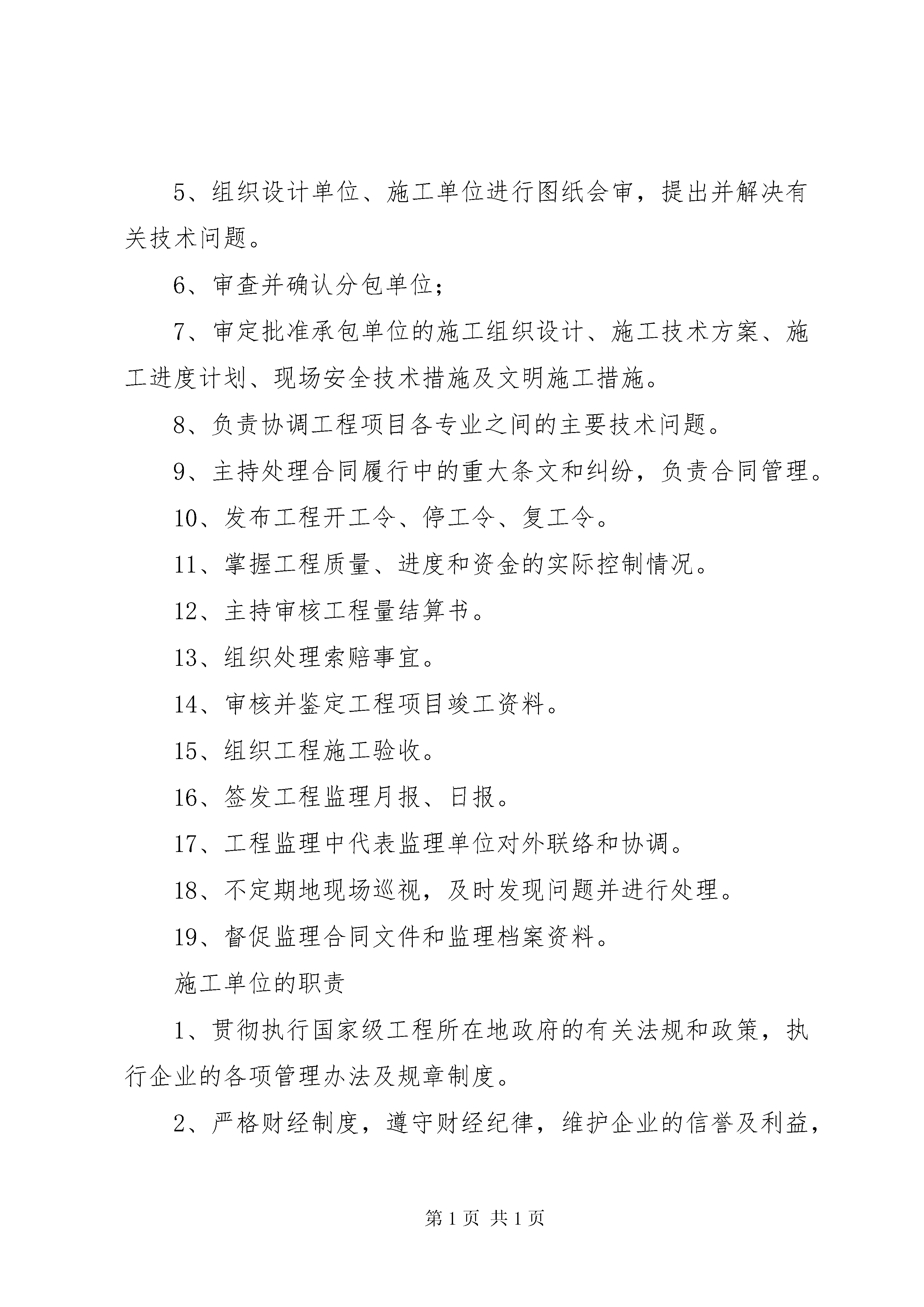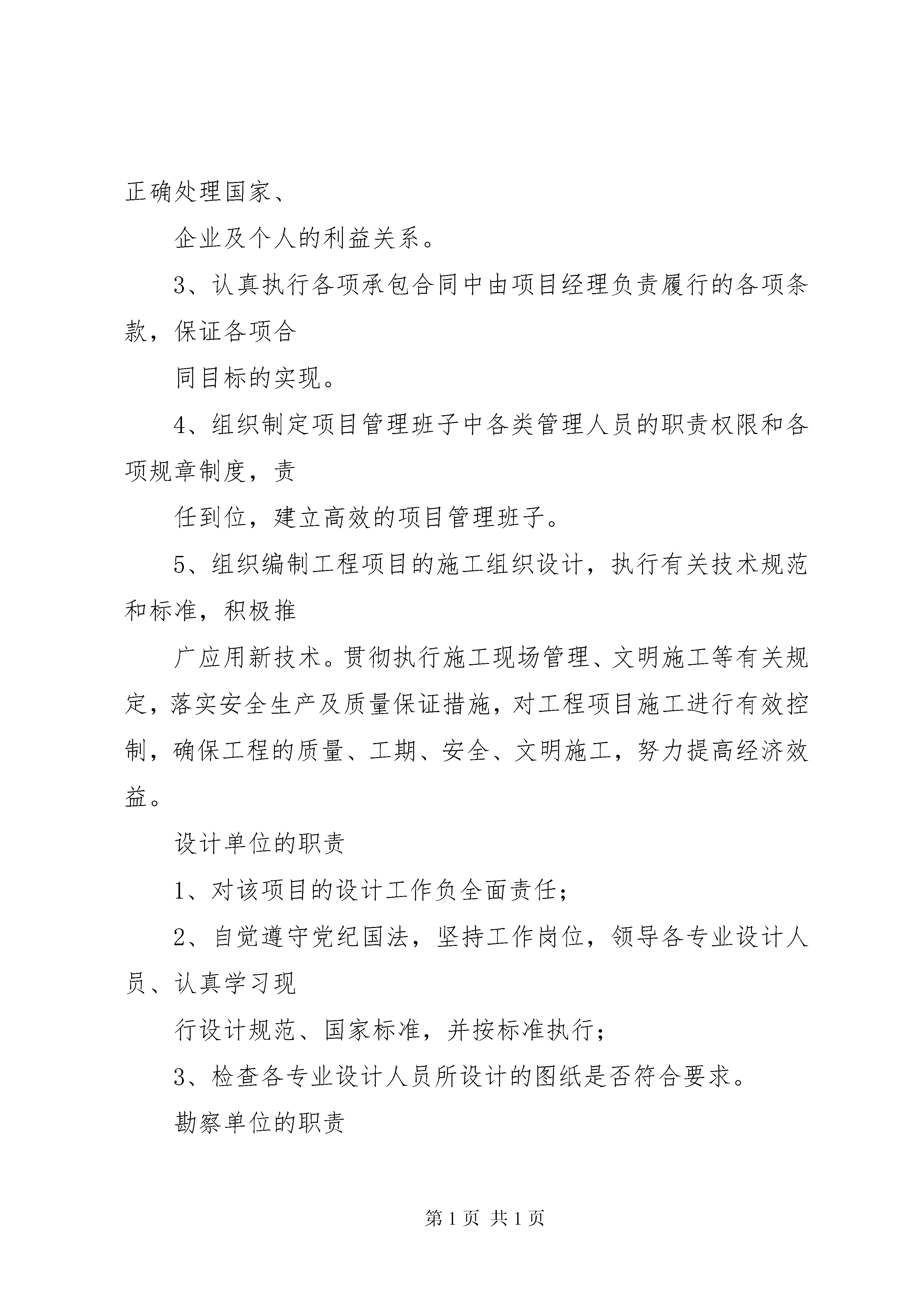 参建单位研讨交流会上的讲话项目各参建单位的职责建设单位的职责1、贯彻执行国家有关法律、法规和政策、执行企业各项决议。2、执行各项承包合同与施工单位履行得各项条款。3、严格财经制度,加强对财经管理,正确处理国家、集体、个人三者之间的利益关系。4、负责组织管理班子,选择施工队伍。5、加强、严格要求和监督施工单位得质量合安全,检查施工单位得所有材料。对工程各项施工进行全面控制,确保正确工程质量和工期,并实现安全生产。监理单位的职责1、领导工程项目监理组织人员贯彻执行有关政策、法规、标准、规范和合同的规章制度,对履行监理委托合同负合同责任。2、确定工程项目监理组织人员分工,对监理组织的工作进行领导协调和监督检查。3、主持编写监理规划并全面组织实施。4、参加合同谈判,协助业主确定合同条款;5、组织设计单位、施工单位进行图纸会审,提出并解决有关技术问题。6、审查并确认分包单位;7、审定批准承包单位的施工组织设计、施工技术方案、施工进度计划、现场安全技术措施及文明施工措施。8、负责协调工程项目各专业之间的主要技术问题。9、主持处理合同履行中的重大条文和纠纷,负责合同管理。10、发布工程开工令、停工令、复工令。11、掌握工程质量、进度和资金的实际控制情况。12、主持审核工程量结算书。13、组织处理索赔事宜。14、审核并鉴定工程项目竣工资料。15、组织工程施工验收。16、签发工程监理月报、日报。17、工程监理中代表监理单位对外联络和协调。18、不定期地现场巡视,及时发现问题并进行处理。19、督促监理合同文件和监理档案资料。施工单位的职责1、贯彻执行国家级工程所在地政府的有关法规和政策,执行企业的各项管理办法及规章制度。2、严格财经制度,遵守财经纪律,维护企业的信誉及利益,正确处理国家、企业及个人的利益关系。3、认真执行各项承包合同中由项目经理负责履行的各项条款,保证各项合同目标的实现。4、组织制定项目管理班子中各类管理人员的职责权限和各项规章制度,责任到位,建立高效的项目管理班子。5、组织编制工程项目的施工组织设计,执行有关技术规范和标准,积极推广应用新技术。贯彻执行施工现场管理、文明施工等有关规定,落实安全生产及质量保证措施,对工程项目施工进行有效控制,确保工程的质量、工期、安全、文明施工,努力提高经济效益。设计单位的职责1、对该项目的设计工作负全面责任;2、自觉遵守党纪国法,坚持工作岗位,领导各专业设计人员、认真学习现行设计规范、国家标准,并按标准执行;3、检查各专业设计人员所设计的图纸是否符合要求。勘察单位的职责1、对该项目的勘察质量负全面责任;2、认真组织技术人员编制勘察计划,组织技术人员进行技术交底;3、对勘察中出现的问题,会同建设单位技术人员共同探讨,并提出合理更好的建议。