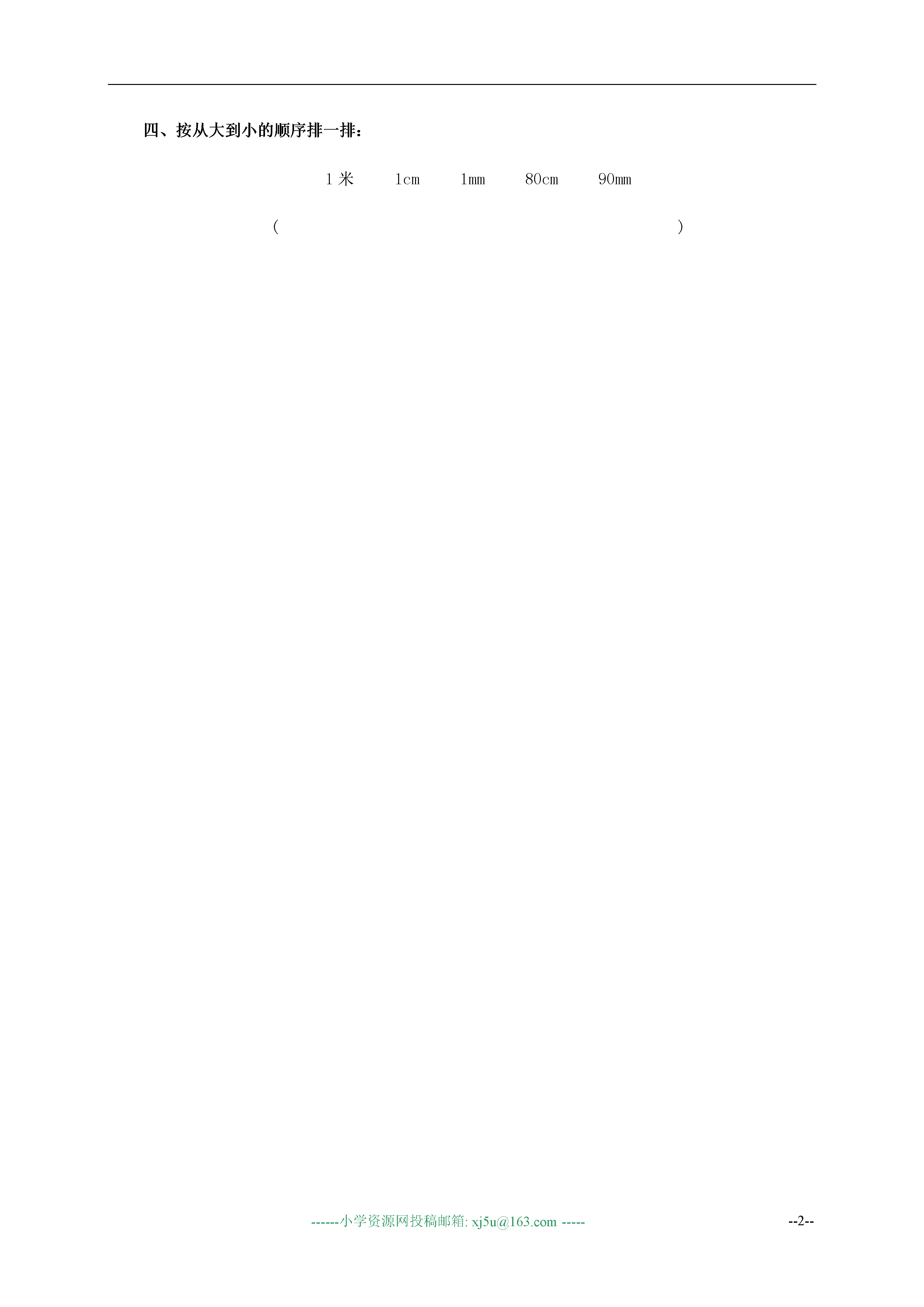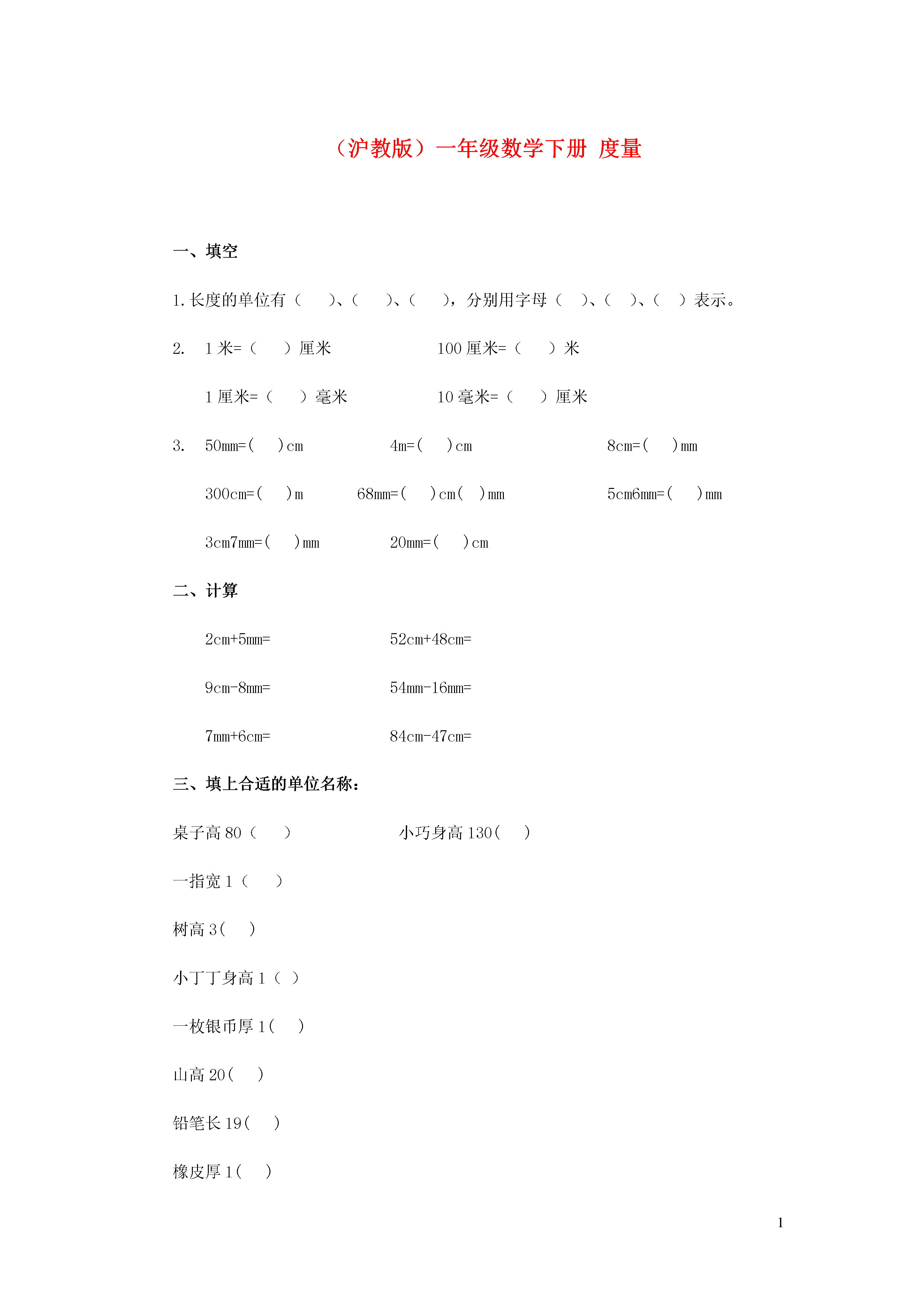 1(沪教版)一年级数学下册度量一、填空1.长度的单位有()、()、(),分别用字母()、()、()表示。2.1米=()厘米100厘米=()米1厘米=()毫米10毫米=()厘米3.50mm=()cm300cm=()m3cm7mm=()mm4m=()cm68mm=()cm()mm20mm=()cm8cm=()mm5cm6mm=()mm二、计算2cm+5mm=9cm-8mm=7mm+6cm=52cm+48cm=54mm-16mm=84cm-47cm=三、填上合适的单位名称:桌子高80()一指宽1()树高3()小丁丁身高1()一枚银币厚1()山高20()铅笔长19()橡皮厚1()小巧身高130()--2--------小学资源网投稿邮箱:xj5u@163.com-----四、按从大到小的顺序排一排:1米1cm1mm80cm90mm()