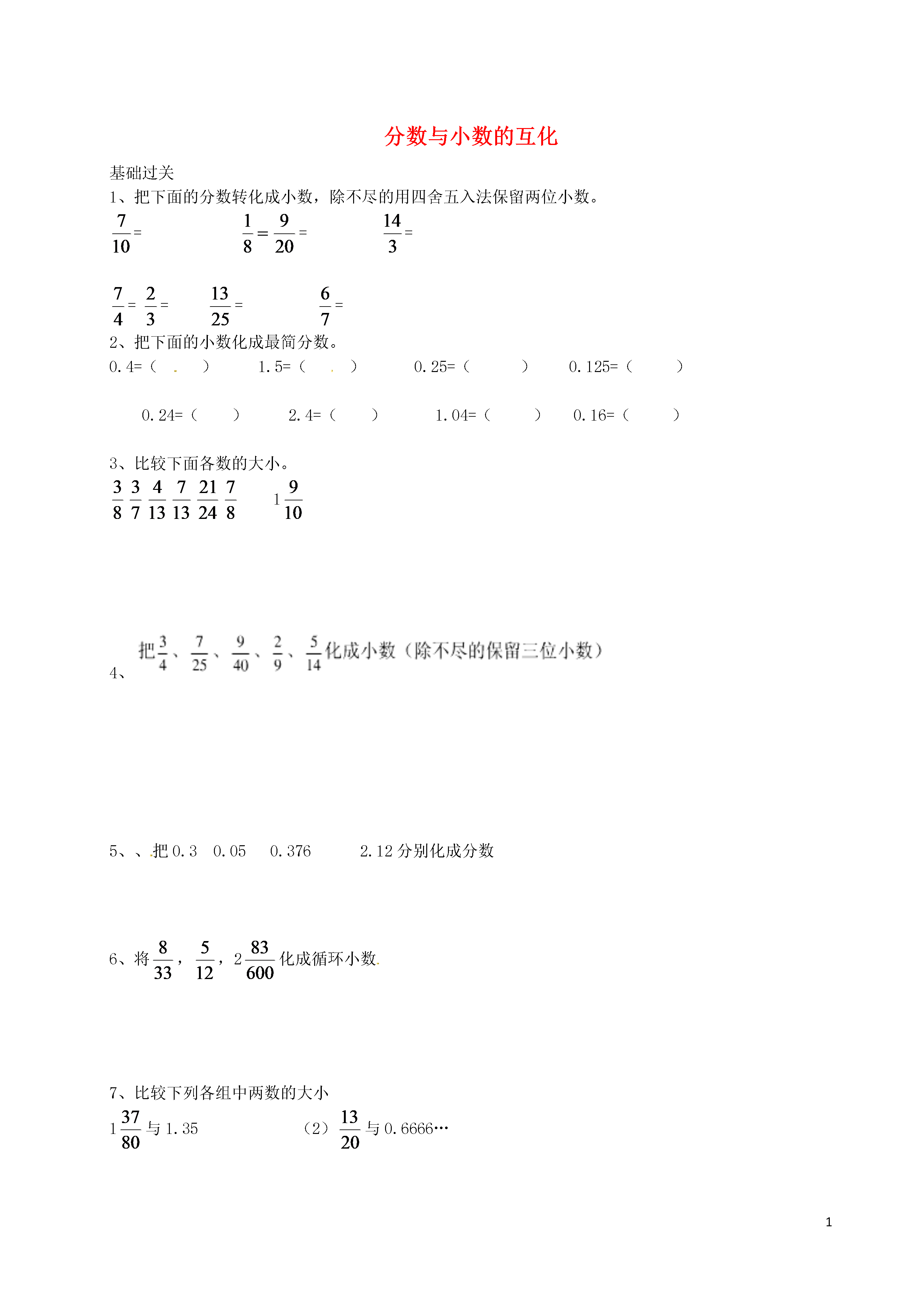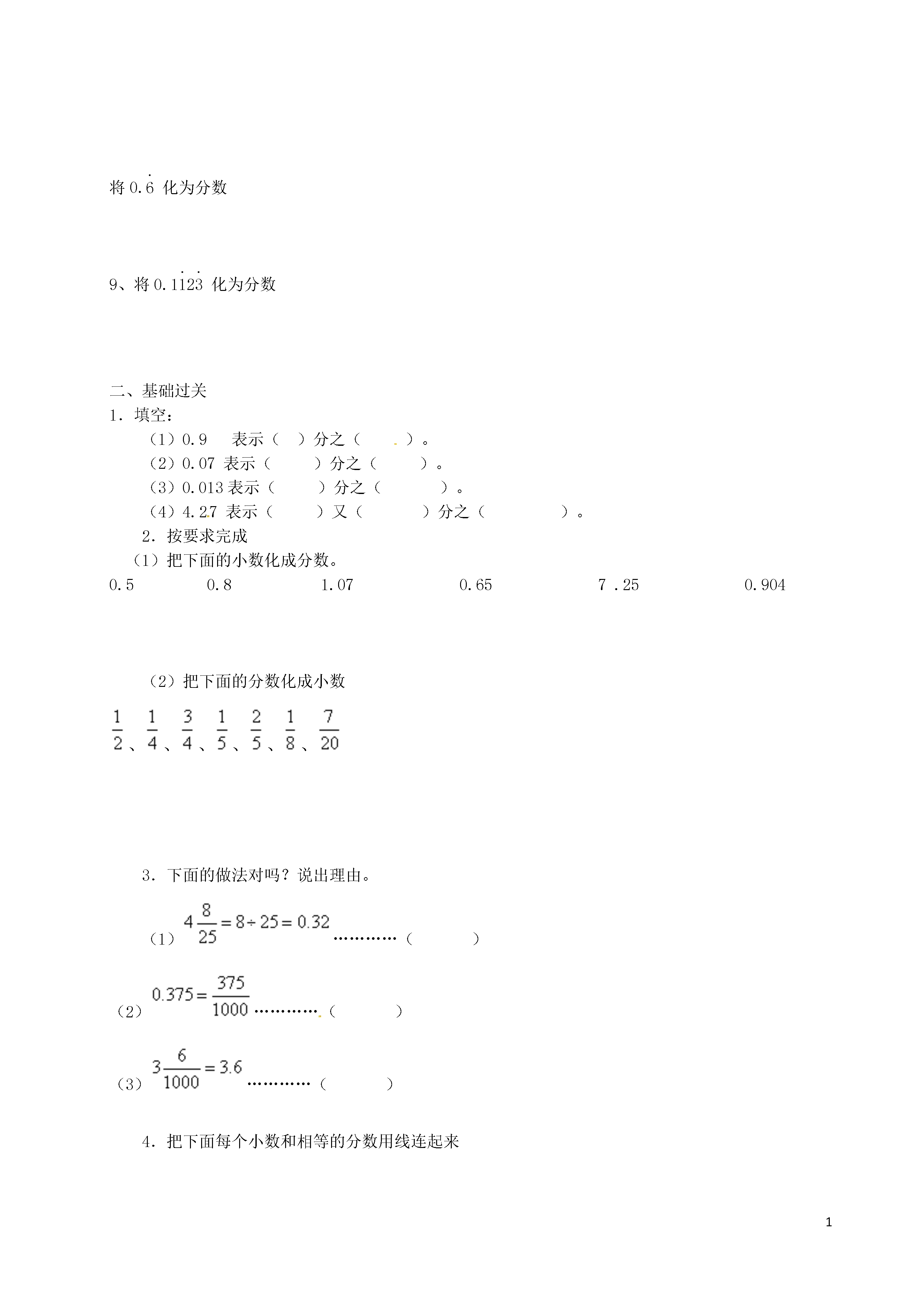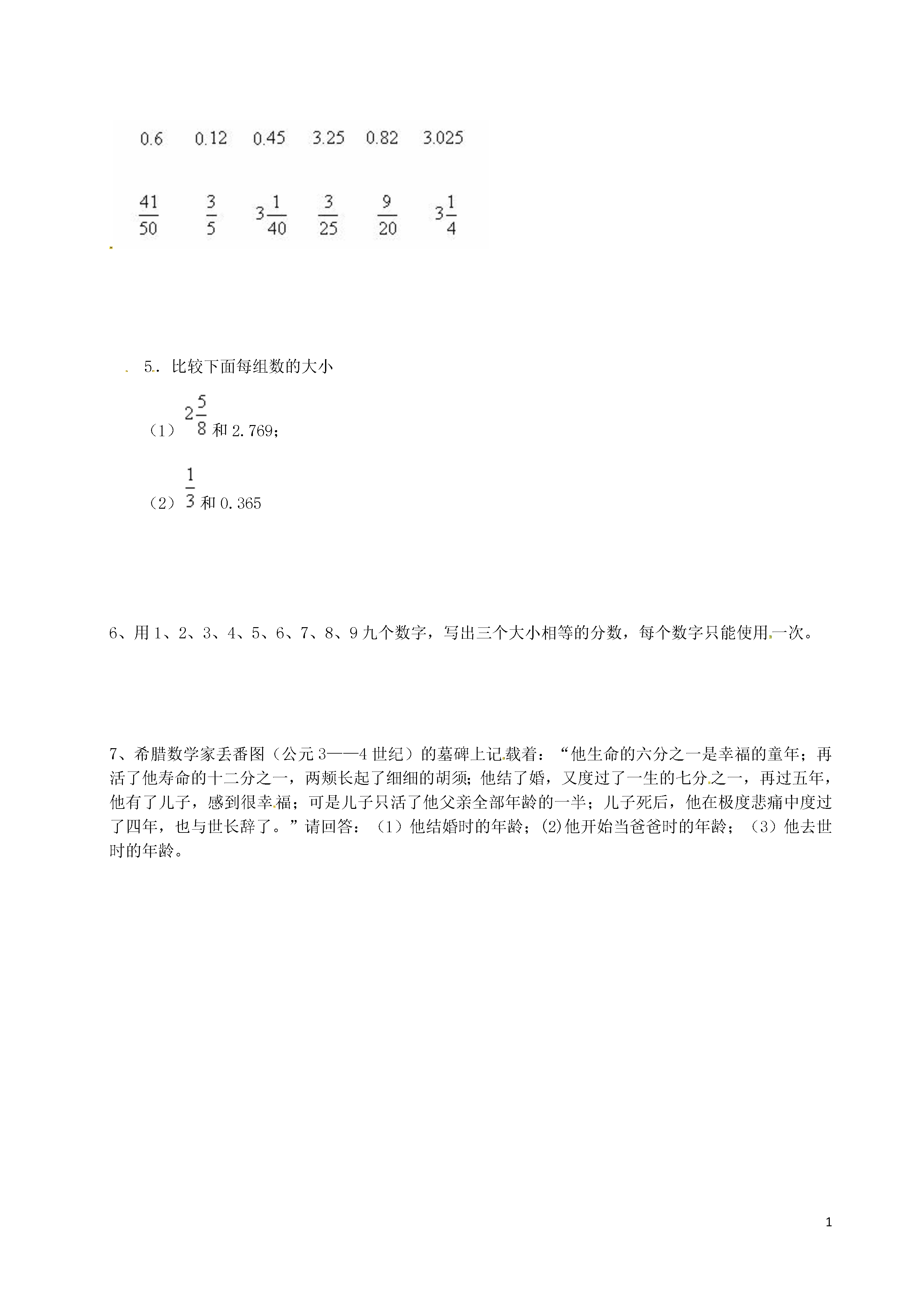 1分数与小数的互化基础过关1、把下面的分数转化成小数,除不尽的用四舍五入法保留两位小数。=======2、把下面的小数化成最简分数。0.4=()1.5=()0.25=()0.125=()0.24=()2.4=()1.04=()0.16=()3、比较下面各数的大小。1○4、5、、把0.30.050.3762.12分别化成分数6、将,,2化成循环小数7、比较下列各组中两数的大小1与1.35(2)与0.6666…将0.化为分数9、将0.12化为分数二、基础过关1.填空:(1)0.9表示()分之()。(2)0.07表示()分之()。(3)0.013表示()分之()。(4)4.27表示()又()分之()。2.按要求完成(1)把下面的小数化成分数。0.50.81.070.657.250.904(2)把下面的分数化成小数、、、、、、3.下面的做法对吗?说出理由。(1)…………()(2)…………()(3)…………()4.把下面每个小数和相等的分数用线连起来5.比较下面每组数的大小(1)和2.769;(2)和0.3656、用1、2、3、4、5、6、7、8、9九个数字,写出三个大小相等的分数,每个数字只能使用一次。7、希腊数学家丢番图(公元3——4世纪)的墓碑上记载着:“他生命的六分之一是幸福的童年;再活了他寿命的十二分之一,两颊长起了细细的胡须;他结了婚,又度过了一生的七分之一,再过五年,他有了儿子,感到很幸福;可是儿子只活了他父亲全部年龄的一半;儿子死后,他在极度悲痛中度过了四年,也与世长辞了。”请回答:(1)他结婚时的年龄;(2)他开始当爸爸时的年龄;(3)他去世时的年龄。