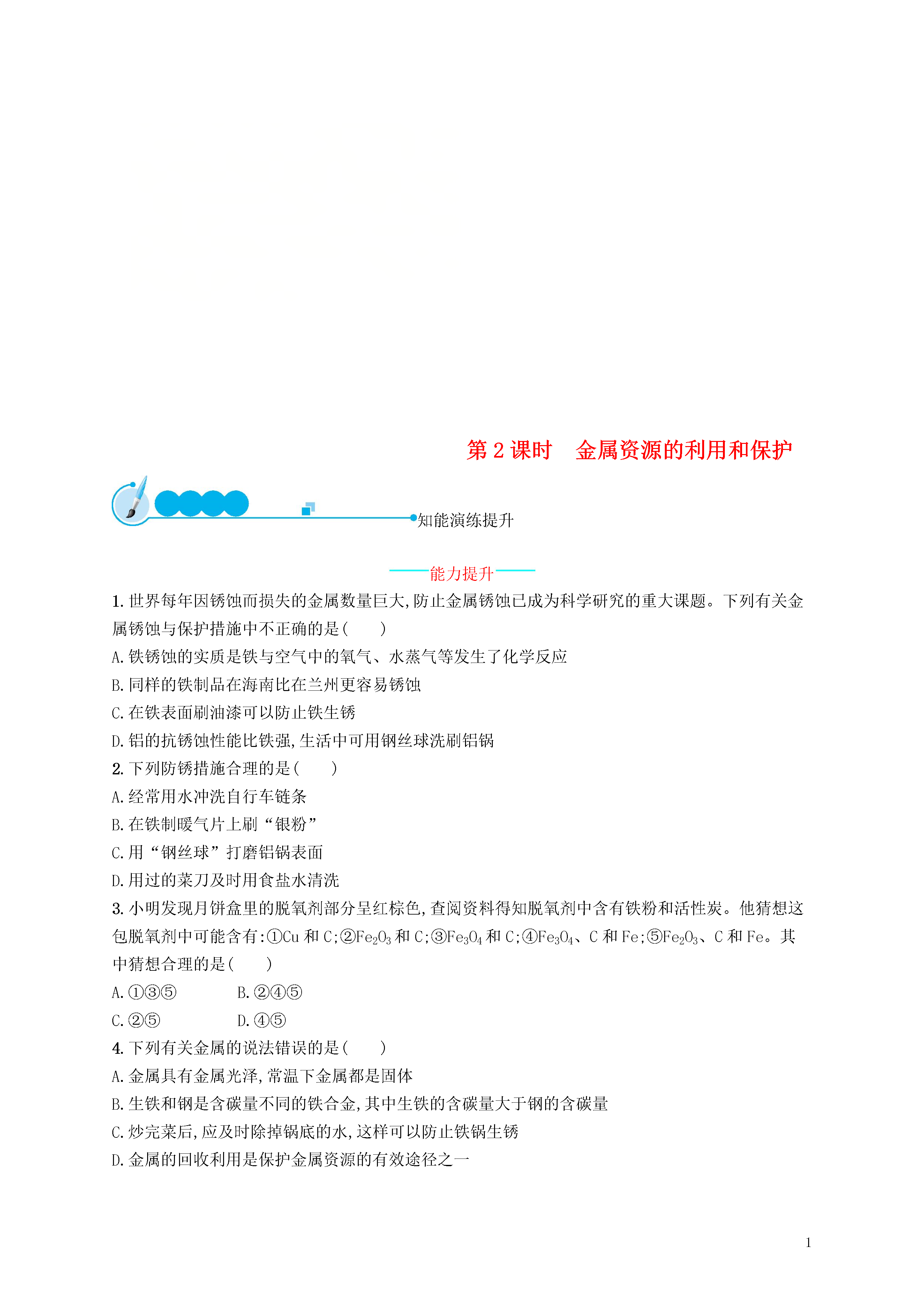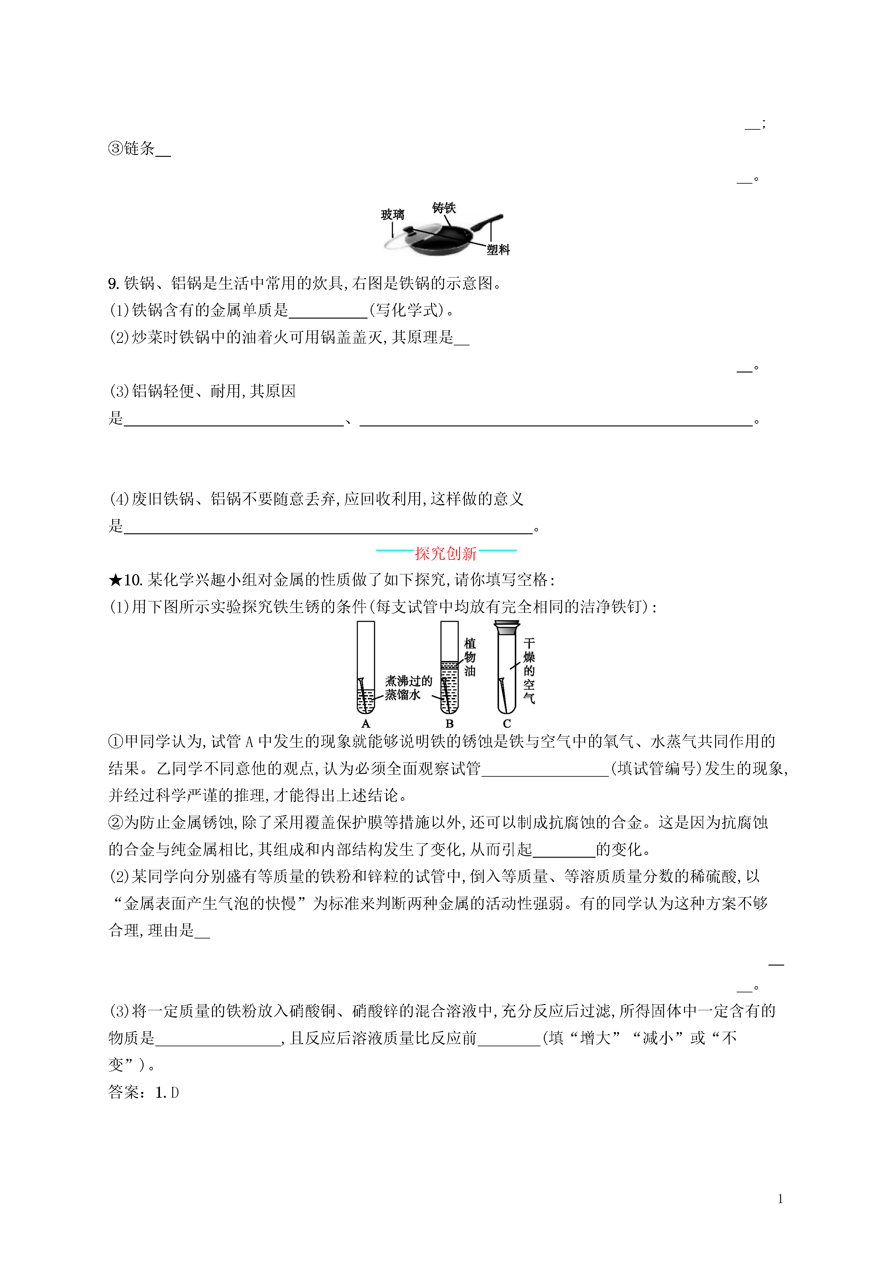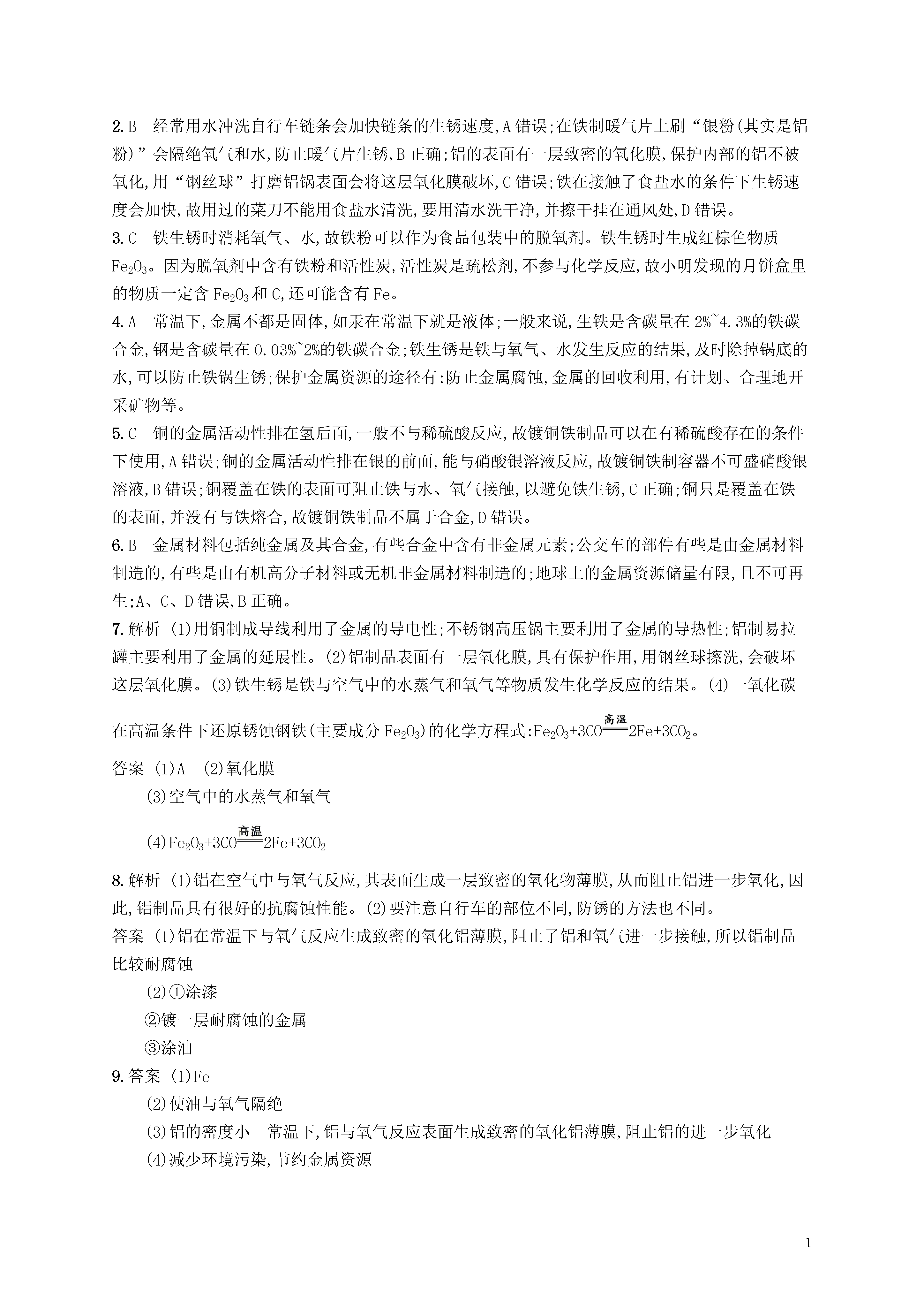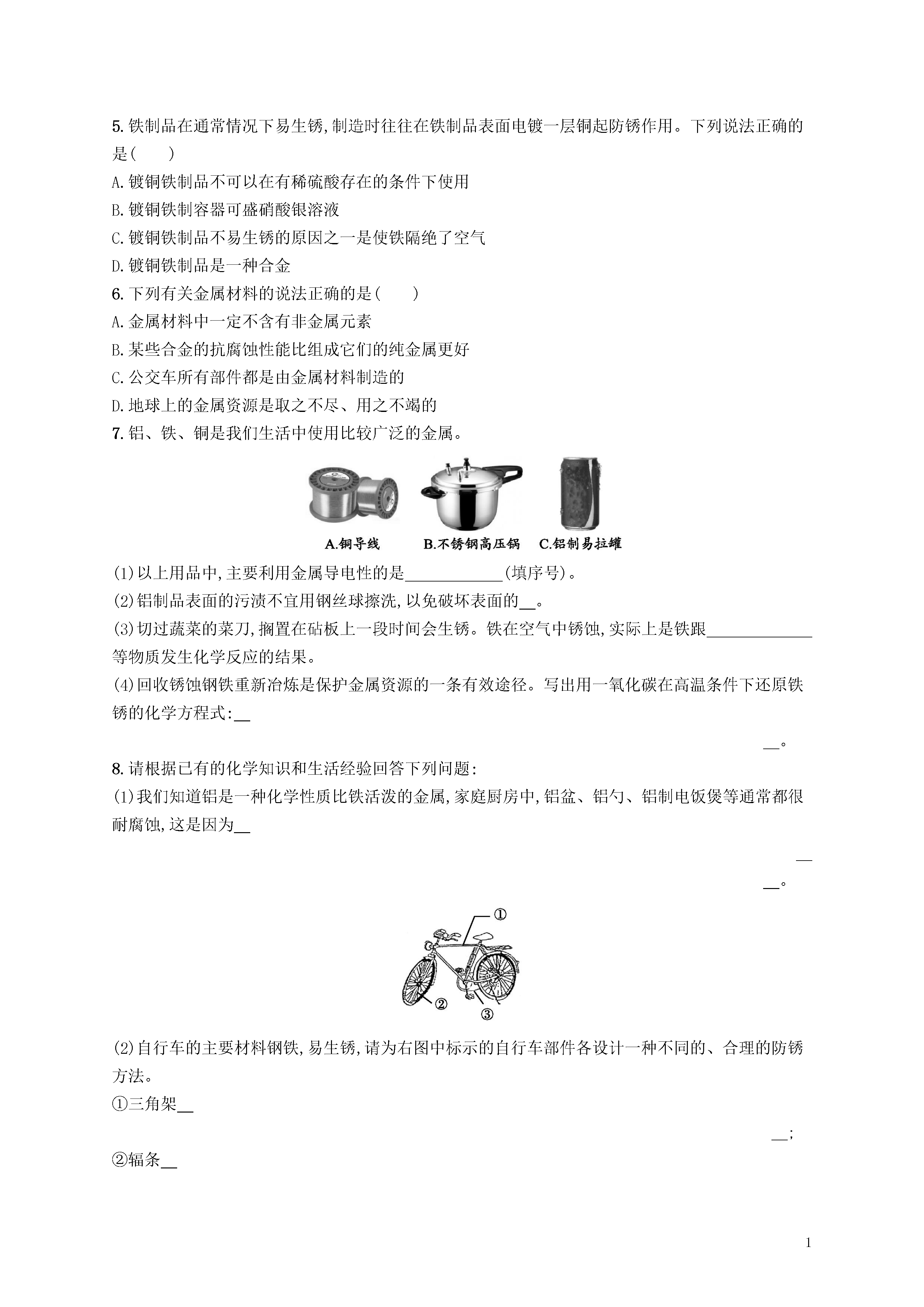 1第2课时金属资源的利用和保护知能演练提升能力提升1.世界每年因锈蚀而损失的金属数量巨大,防止金属锈蚀已成为科学研究的重大课题。下列有关金属锈蚀与保护措施中不正确的是()A.铁锈蚀的实质是铁与空气中的氧气、水蒸气等发生了化学反应B.同样的铁制品在海南比在兰州更容易锈蚀C.在铁表面刷油漆可以防止铁生锈D.铝的抗锈蚀性能比铁强,生活中可用钢丝球洗刷铝锅2.下列防锈措施合理的是()A.经常用水冲洗自行车链条B.在铁制暖气片上刷“银粉”C.用“钢丝球”打磨铝锅表面D.用过的菜刀及时用食盐水清洗3.小明发现月饼盒里的脱氧剂部分呈红棕色,查阅资料得知脱氧剂中含有铁粉和活性炭。他猜想这包脱氧剂中可能含有:①Cu和C;②Fe2O3和C;③Fe3O4和C;④Fe3O4、C和Fe;⑤Fe2O3、C和Fe。其中猜想合理的是()A.①③⑤B.②④⑤C.②⑤D.④⑤4.下列有关金属的说法错误的是()A.金属具有金属光泽,常温下金属都是固体B.生铁和钢是含碳量不同的铁合金,其中生铁的含碳量大于钢的含碳量C.炒完菜后,应及时除掉锅底的水,这样可以防止铁锅生锈D.金属的回收利用是保护金属资源的有效途径之一5.铁制品在通常情况下易生锈,制造时往往在铁制品表面电镀一层铜起防锈作用。下列说法正确的是()A.镀铜铁制品不可以在有稀硫酸存在的条件下使用B.镀铜铁制容器可盛硝酸银溶液C.镀铜铁制品不易生锈的原因之一是使铁隔绝了空气D.镀铜铁制品是一种合金6.下列有关金属材料的说法正确的是()A.金属材料中一定不含有非金属元素B.某些合金的抗腐蚀性能比组成它们的纯金属更好C.公交车所有部件都是由金属材料制造的D.地球上的金属资源是取之不尽、用之不竭的7.铝、铁、铜是我们生活中使用比较广泛的金属。(1)以上用品中,主要利用金属导电性的是(填序号)。(2)铝制品表面的污渍不宜用钢丝球擦洗,以免破坏表面的。(3)切过蔬菜的菜刀,搁置在砧板上一段时间会生锈。铁在空气中锈蚀,实际上是铁跟等物质发生化学反应的结果。(4)回收锈蚀钢铁重新冶炼是保护金属资源的一条有效途径。写出用一氧化碳在高温条件下还原铁锈的化学方程式:。8.请根据已有的化学知识和生活经验回答下列问题:(1)我们知道铝是一种化学性质比铁活泼的金属,家庭厨房中,铝盆、铝勺、铝制电饭煲等通常都很耐腐蚀,这是因为。(2)自行车的主要材料钢铁,易生锈,请为右图中标示的自行车部件各设计一种不同的、合理的防锈方法。①三角架;②辐条;③链条。9.铁锅、铝锅是生活中常用的炊具,右图是铁锅的示意图。(1)铁锅含有的金属单质是(写化学式)。(2)炒菜时铁锅中的油着火可用锅盖盖灭,其原理是。(3)铝锅轻便、耐用,其原因是、。(4)废旧铁锅、铝锅不要随意丢弃,应回收利用,这样做的意义是。探究创新★10.某化学兴趣小组对金属的性质做了如下探究,请你填写空格:(1)用下图所示实验探究铁生锈的条件(每支试管中均放有完全相同的洁净铁钉):①甲同学认为,试管A中发生的现象就能够说明铁的锈蚀是铁与空气中的氧气、水蒸气共同作用的结果。乙同学不同意他的观点,认为必须全面观察试管(填试管编号)发生的现象,并经过科学严谨的推理,才能得出上述结论。②为防止金属锈蚀,除了采用覆盖保护膜等措施以外,还可以制成抗腐蚀的合金。这是因为抗腐蚀的合金与纯金属相比,其组成和内部结构发生了变化,从而引起的变化。(2)某同学向分别盛有等质量的铁粉和锌粒的试管中,倒入等质量、等溶质质量分数的稀硫酸,以“金属表面产生气泡的快慢”为标准来判断两种金属的活动性强弱。有的同学认为这种方案不够合理,理由是。(3)将一定质量的铁粉放入硝酸铜、硝酸锌的混合溶液中,充分反应后过滤,所得固体中一定含有的物质是,且反应后溶液质量比反应前(填“增大”“减小”或“不变”)。答案:1.D2.B经常用水冲洗自行车链条会加快链条的生锈速度,A错误;在铁制暖气片上刷“银粉(其实是铝粉)”会隔绝氧气和水,防止暖气片生锈,B正确;铝的表面有一层致密的氧化膜,保护内部的铝不被氧化,用“钢丝球”打磨铝锅表面会将这层氧化膜破坏,C错误;铁在接触了食盐水的条件下生锈速度会加快,故用过的菜刀不能用食盐水清洗,要用清水洗干净,并擦干挂在通风处,D错误。3.C铁生锈时消耗氧气、水,故铁粉可以作为食品包装中的脱氧剂。铁生锈时生成红棕色物质Fe2O3。因为脱氧剂中含有铁粉和活性炭,活性炭是疏松剂,不参与化学反应,故小明发现的月饼盒里的物质一定含Fe2O3和C,还可能含有Fe。4.A常温下,金属不都是固体,如汞在常温下就是液体;一般