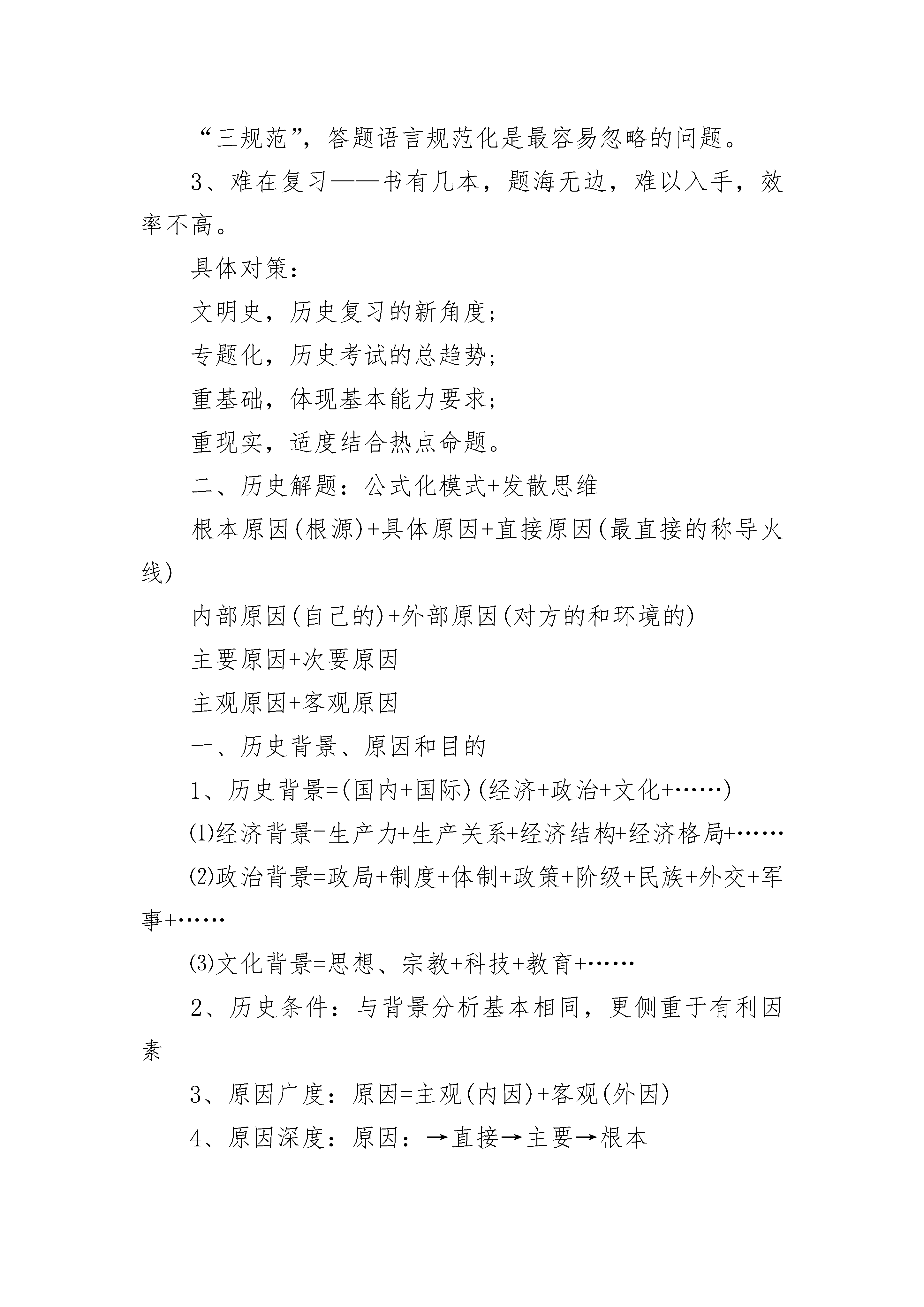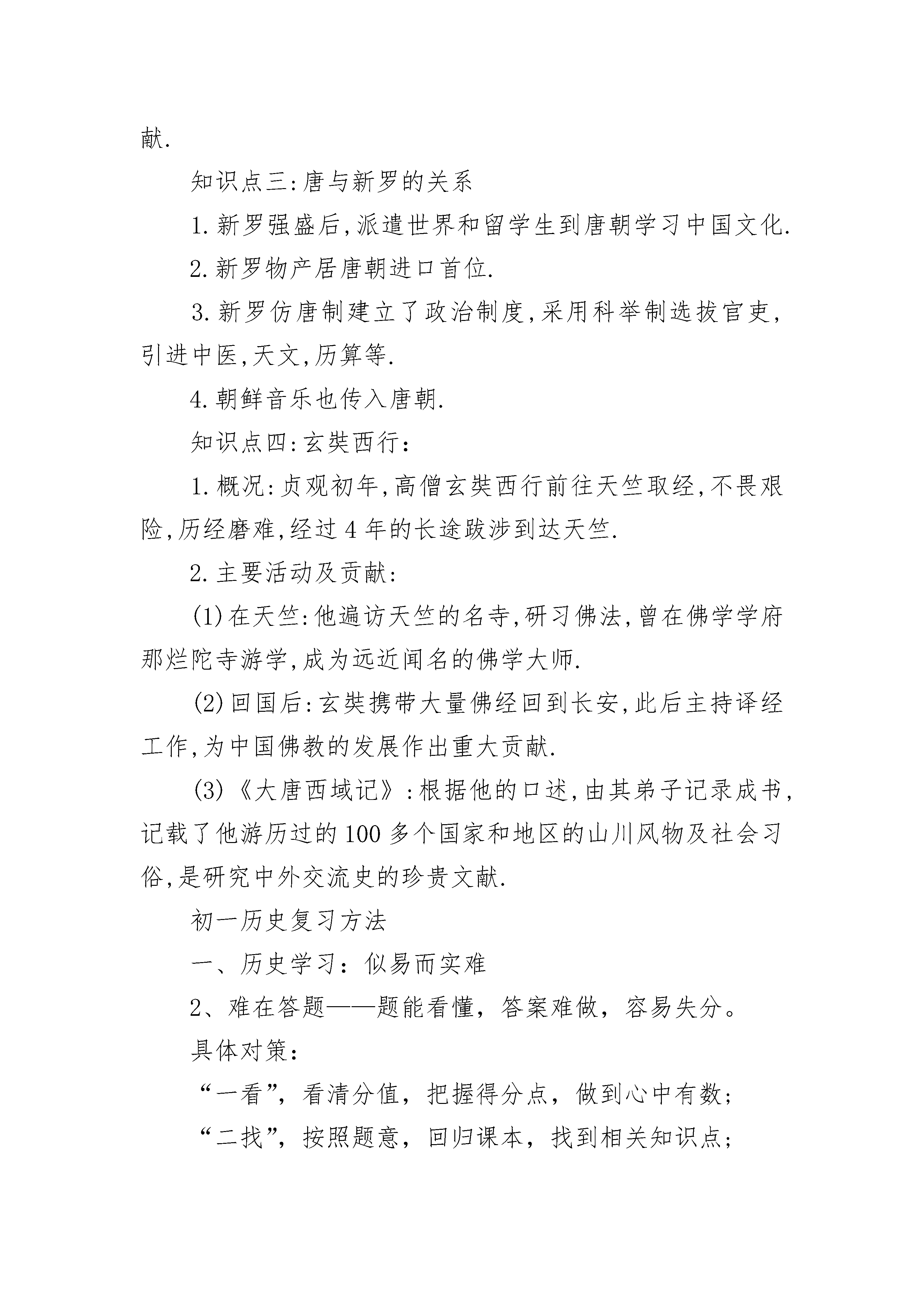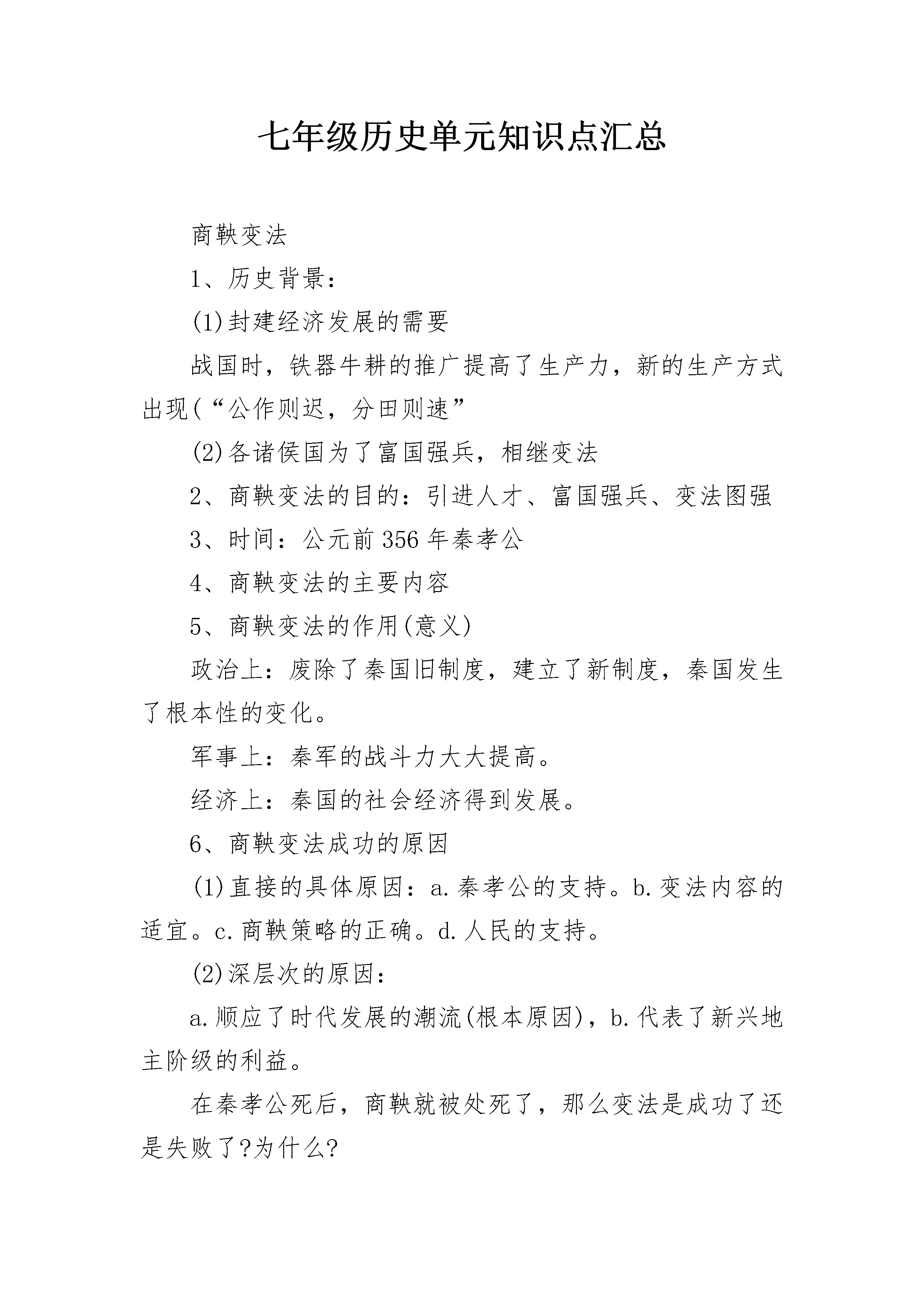 七年级历史单元知识点汇总商鞅变法1、历史背景:(1)封建经济发展的需要战国时,铁器牛耕的推广提高了生产力,新的生产方式出现(“公作则迟,分田则速”(2)各诸侯国为了富国强兵,相继变法2、商鞅变法的目的:引进人才、富国强兵、变法图强3、时间:公元前356年秦孝公4、商鞅变法的主要内容5、商鞅变法的作用(意义)政治上:废除了秦国旧制度,建立了新制度,秦国发生了根本性的变化。军事上:秦军的战斗力大大提高。经济上:秦国的社会经济得到发展。6、商鞅变法成功的原因(1)直接的具体原因:a.秦孝公的支持。b.变法内容的适宜。c.商鞅策略的正确。d.人民的支持。(2)深层次的原因:a.顺应了时代发展的潮流(根本原因),b.代表了新兴地主阶级的利益。在秦孝公死后,商鞅就被处死了,那么变法是成功了还是失败了?为什么?判定一场改革成败的标准,在于其目的是否达到。变革者个人的悲剧与变革成败不能混于一谈。7、商鞅变法成功的启示:(1)变革不会一帆风顺,要坚持不懈。(2)变革需要勇气,甚至要付出血的代价。(3)顺应时代潮流的变革,能推动社会进步。初一历史知识点唐朝的中外文化交流知识点一:遣唐使:1.背景:唐朝时期,中国和日本的交流非常频繁.为了学习中国的先进文化,日本派遣使节到中国,当时称为“遣唐使”.跟随使节来华的,还有很多的留学生和留学僧等.2.规模:日本的遣唐使有十几批,最多的一次达到500多人.3.影响:他们把唐朝先进的制度、天文历法、文字、典籍、书法艺术、建筑技术等传回日本,对日本社会的发展产生了深远的的影响。知识点二:鉴真东渡:1.评价:鉴真是唐朝和日本文化交流中影响的人物。2.六次东渡:鉴真接受日本僧人的邀请东渡日本,前五次都因种种原因没有成功,辛劳过度而双目失明.但鉴真仍矢志不渝,继续进行第六次东渡,终于在754年抵达日本.3.鉴真的贡献:他在日本传授佛经,还传播中国的医药,文学,书法,建筑,绘画等,为中日文化交流作出了卓越的贡献.知识点三:唐与新罗的关系1.新罗强盛后,派遣世界和留学生到唐朝学习中国文化.2.新罗物产居唐朝进口首位.3.新罗仿唐制建立了政治制度,采用科举制选拔官吏,引进中医,天文,历算等.4.朝鲜音乐也传入唐朝.知识点四:玄奘西行:1.概况:贞观初年,高僧玄奘西行前往天竺取经,不畏艰险,历经磨难,经过4年的长途跋涉到达天竺.2.主要活动及贡献:(1)在天竺:他遍访天竺的名寺,研习佛法,曾在佛学学府那烂陀寺游学,成为远近闻名的佛学大师.(2)回国后:玄奘携带大量佛经回到长安,此后主持译经工作,为中国佛教的发展作出重大贡献.(3)《大唐西域记》:根据他的口述,由其弟子记录成书,记载了他游历过的100多个国家和地区的山川风物及社会习俗,是研究中外交流史的珍贵文献.初一历史复习方法一、历史学习:似易而实难2、难在答题——题能看懂,答案难做,容易失分。具体对策:“一看”,看清分值,把握得分点,做到心中有数;“二找”,按照题意,回归课本,找到相关知识点;“三规范”,答题语言规范化是最容易忽略的问题。3、难在复习——书有几本,题海无边,难以入手,效率不高。具体对策:文明史,历史复习的新角度;专题化,历史考试的总趋势;重基础,体现基本能力要求;重现实,适度结合热点命题。二、历史解题:公式化模式+发散思维根本原因(根源)+具体原因+直接原因(最直接的称导火线)内部原因(自己的)+外部原因(对方的和环境的)主要原因+次要原因主观原因+客观原因一、历史背景、原因和目的1、历史背景=(国内+国际)(经济+政治+文化+……)⑴经济背景=生产力+生产关系+经济结构+经济格局+……⑵政治背景=政局+制度+体制+政策+阶级+民族+外交+军事+……⑶文化背景=思想、宗教+科技+教育+……2、历史条件:与背景分析基本相同,更侧重于有利因素3、原因广度:原因=主观(内因)+客观(外因)4、原因深度:原因:→直接→主要→根本5、矛盾分析:生产力与生产关系矛盾、经济基础与上层建筑矛盾、阶级矛盾、阶级内部矛盾、民族矛盾、宗教矛盾、不同利益集团矛盾……6、目的、动机:→直接→主要→根本二、历史内容=经济+政治+文化+……历史内容即客观历史,是人类重大历史活动的客观记载。活动的主体包括重要历史人物、群体、组织、机构等。活动内容包括经济政治方面的事件、事态、制度、政策、纲领、路线、计划、条约;文化方面的理论、技术、文物器具、工程建筑、书籍文献等。一般历史内容,可从经济、政治、文化诸方面分析。1、经济内容:生产力+生产关系+经济结构、布局+……(2)近现代经济=经济发展要素+经济成份+国际经济+……2、政治内容=制度+体制+政策+阶级+民族+外交+军事+……3、文化内容=自然科学+社会科学+文化交流+……4、事件、事态过程:准备→开始→发展或曲折→成功或失败三、历史影