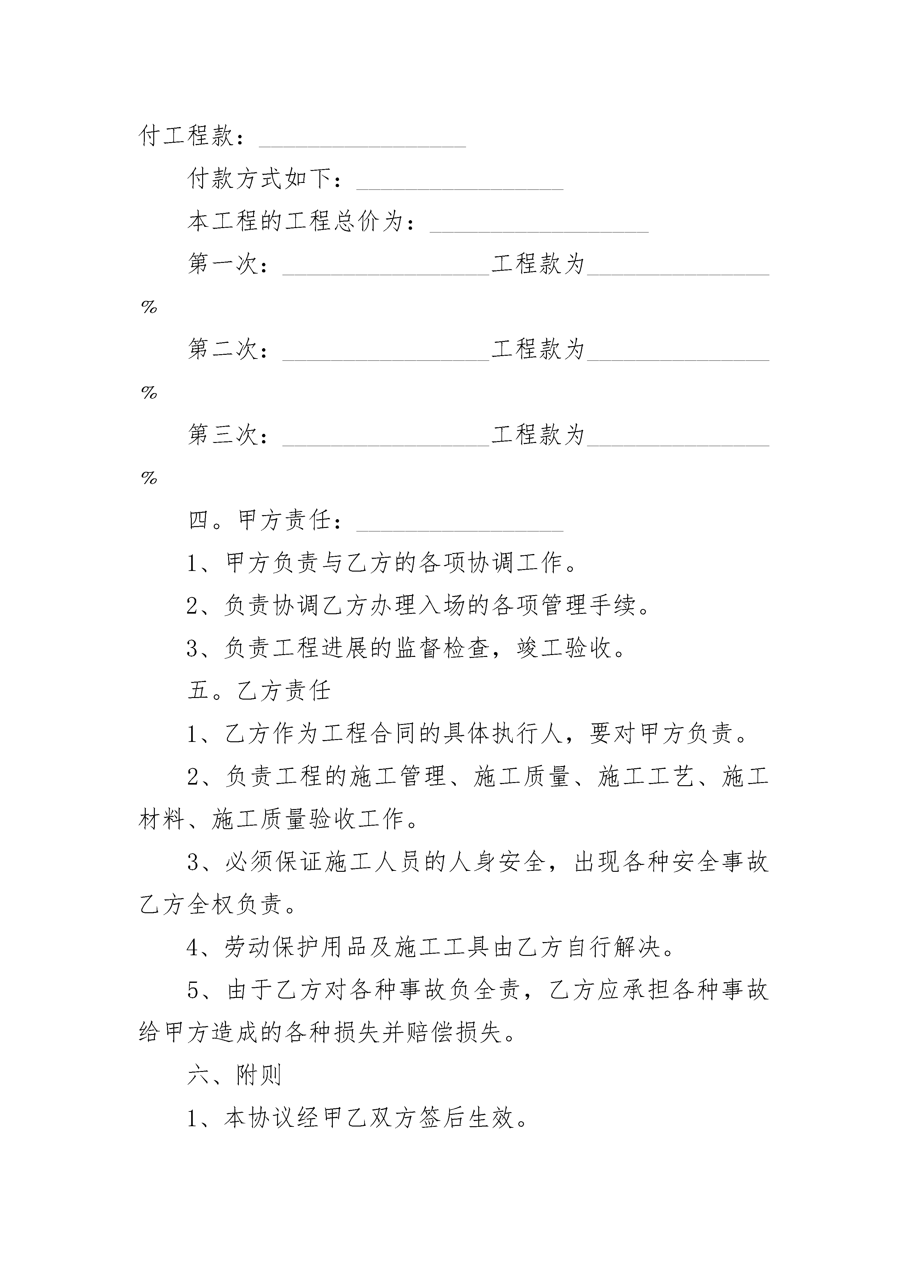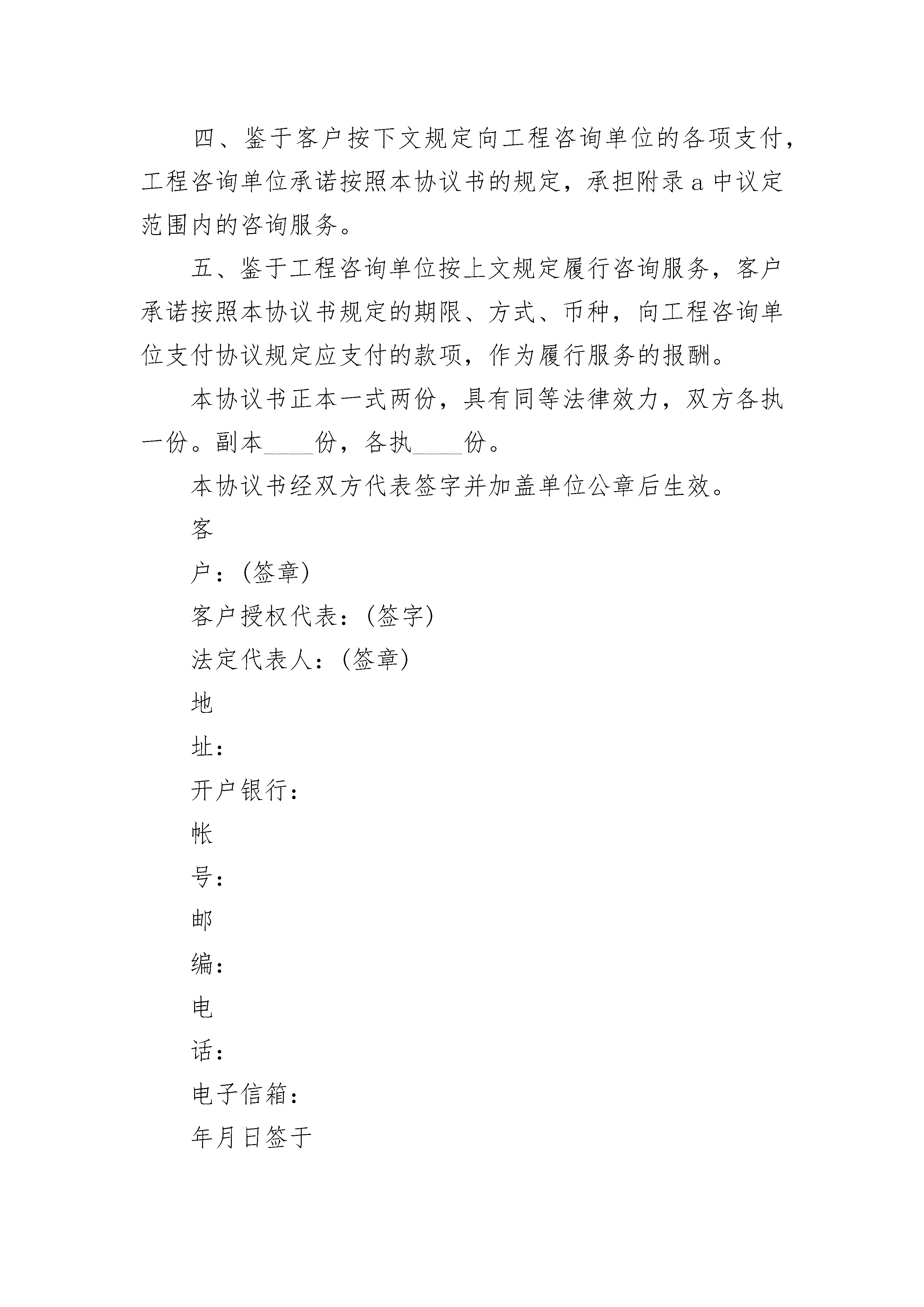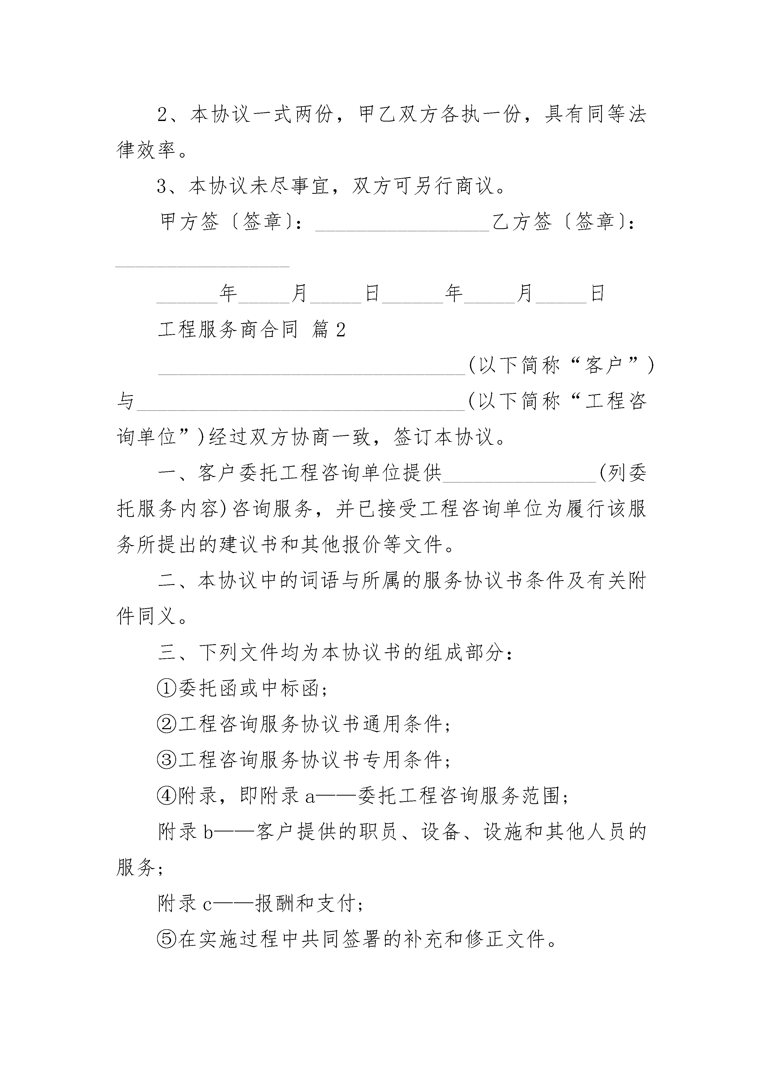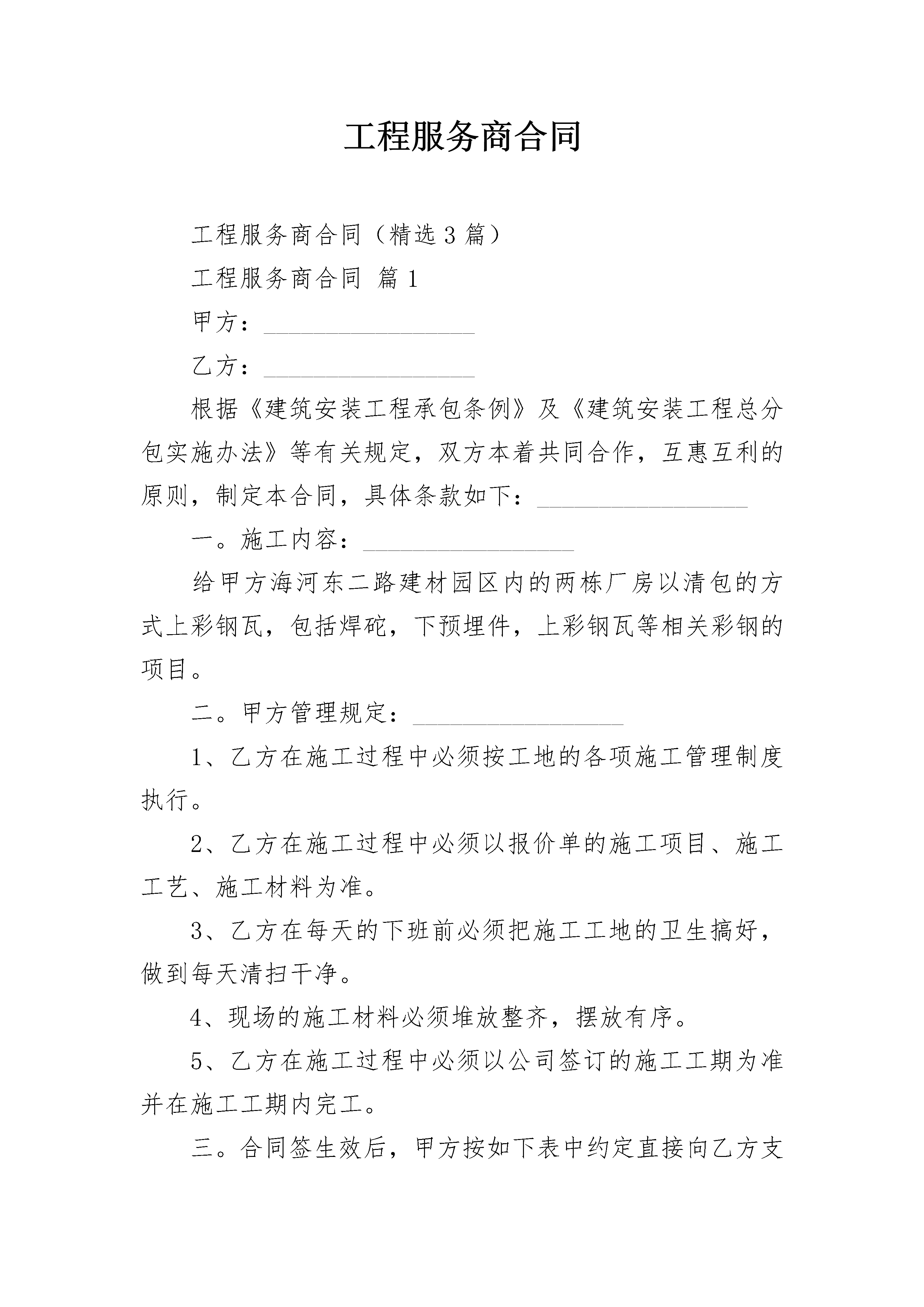 工程服务商合同工程服务商合同(精选3篇)工程服务商合同篇1甲方:_________________乙方:_________________根据《建筑安装工程承包条例》及《建筑安装工程总分包实施办法》等有关规定,双方本着共同合作,互惠互利的原则,制定本合同,具体条款如下:_________________一。施工内容:_________________给甲方海河东二路建材园区内的两栋厂房以清包的方式上彩钢瓦,包括焊砣,下预埋件,上彩钢瓦等相关彩钢的项目。二。甲方管理规定:_________________1、乙方在施工过程中必须按工地的各项施工管理制度执行。2、乙方在施工过程中必须以报价单的施工项目、施工工艺、施工材料为准。3、乙方在每天的下班前必须把施工工地的卫生搞好,做到每天清扫干净。4、现场的施工材料必须堆放整齐,摆放有序。5、乙方在施工过程中必须以公司签订的施工工期为准并在施工工期内完工。三。合同签生效后,甲方按如下表中约定直接向乙方支付工程款:_________________付款方式如下:_________________本工程的工程总价为:__________________第一次:_________________工程款为_______________﹪第二次:_________________工程款为_______________﹪第三次:_________________工程款为_______________﹪四。甲方责任:_________________1、甲方负责与乙方的各项协调工作。2、负责协调乙方办理入场的各项管理手续。3、负责工程进展的监督检查,竣工验收。五。乙方责任1、乙方作为工程合同的具体执行人,要对甲方负责。2、负责工程的施工管理、施工质量、施工工艺、施工材料、施工质量验收工作。3、必须保证施工人员的人身安全,出现各种安全事故乙方全权负责。4、劳动保护用品及施工工具由乙方自行解决。5、由于乙方对各种事故负全责,乙方应承担各种事故给甲方造成的各种损失并赔偿损失。六、附则1、本协议经甲乙双方签后生效。2、本协议一式两份,甲乙双方各执一份,具有同等法律效率。3、本协议未尽事宜,双方可另行商议。甲方签〔签章〕:_________________乙方签〔签章〕:_______________________年_____月_____日______年_____月_____日工程服务商合同篇2______________________________(以下简称“客户”)与________________________________(以下简称“工程咨询单位”)经过双方协商一致,签订本协议。一、客户委托工程咨询单位提供_______________(列委托服务内容)咨询服务,并已接受工程咨询单位为履行该服务所提出的建议书和其他报价等文件。二、本协议中的词语与所属的服务协议书条件及有关附件同义。三、下列文件均为本协议书的组成部分:①委托函或中标函;②工程咨询服务协议书通用条件;③工程咨询服务协议书专用条件;④附录,即附录a——委托工程咨询服务范围;附录b——客户提供的职员、设备、设施和其他人员的服务;附录c——报酬和支付;⑤在实施过程中共同签署的补充和修正文件。四、鉴于客户按下文规定向工程咨询单位的各项支付,工程咨询单位承诺按照本协议书的规定,承担附录a中议定范围内的咨询服务。五、鉴于工程咨询单位按上文规定履行咨询服务,客户承诺按照本协议书规定的期限、方式、币种,向工程咨询单位支付协议规定应支付的款项,作为履行服务的报酬。本协议书正本一式两份,具有同等法律效力,双方各执一份。副本____份,各执____份。本协议书经双方代表签字并加盖单位公章后生效。客户:(签章)客户授权代表:(签字)法定代表人:(签章)地址:开户银行:帐号:邮编:电话:电子信箱:年月日签于工程咨询单位:(签章)工程咨询单位授权代表:(签字)法定代表人:(签章)地址:开户银行:帐号:邮编:电话:电子信箱:年月日签于工程咨询服务协议书通用条件(文中括号内楷体字部分为说明性文字)一、词语定义下列词语,除上下文另有规定的以外,具有下列含义:1.1“项目”是指本协议书专用条件中指定的,并为之提供咨询服务的项目。1.2“服务”是指工程咨询单位根据本协议书所提供的服务,包括正常的服务、附加的服务和额外的服务。(1)“正常服务”是指附录a中列出的各项正常服务。(2)“附加服务”是指附录a中列出的各项附加服务,以及经双方书面协议,在正常服务之外的附加服务。(3)“额外服务”是指不属于正常服务和附加服务,但根据协议书第7.9条的规定,工程咨询单位必须履行的服务。1.3“工程”是指为完成项目所实施的永久性工程,包括提供给客户的设备、设施及其他物品。1.4“