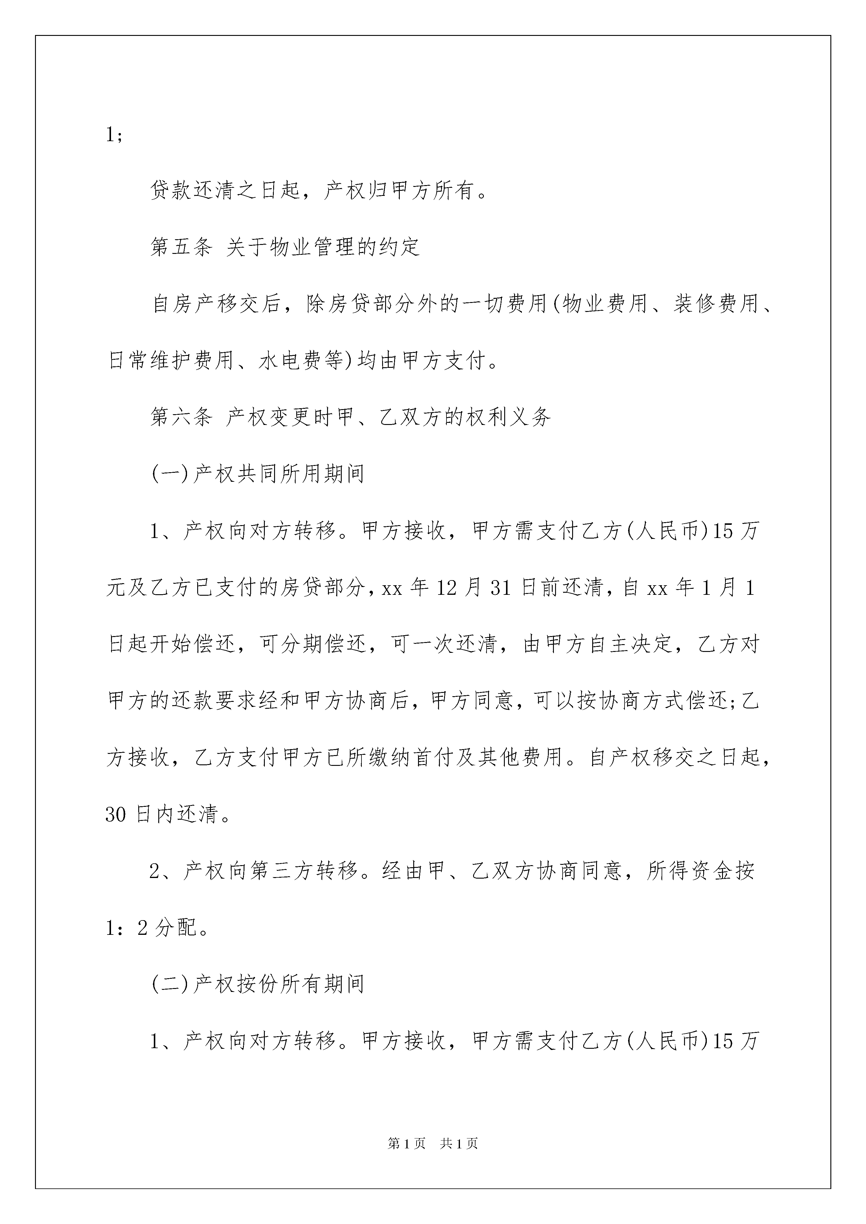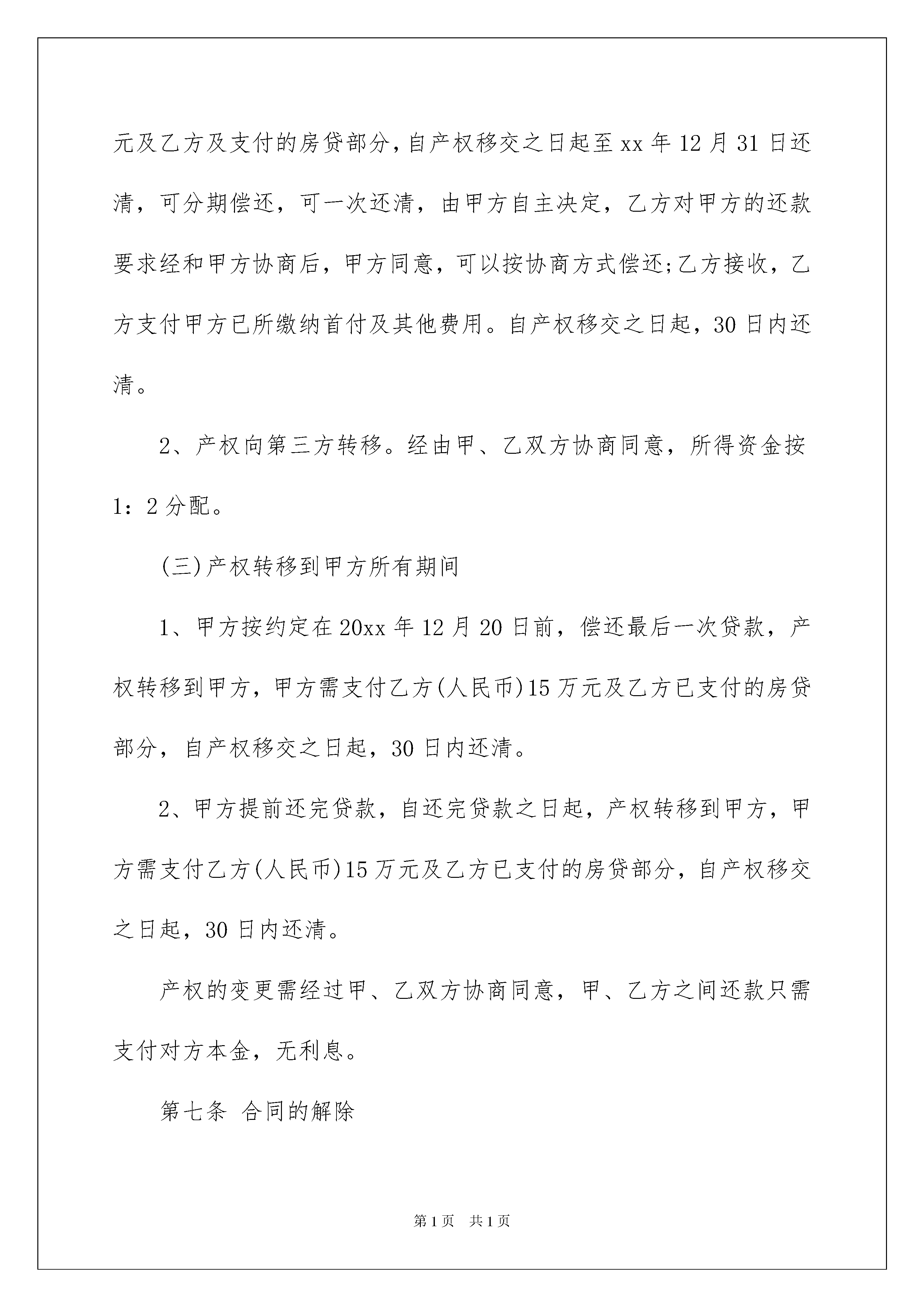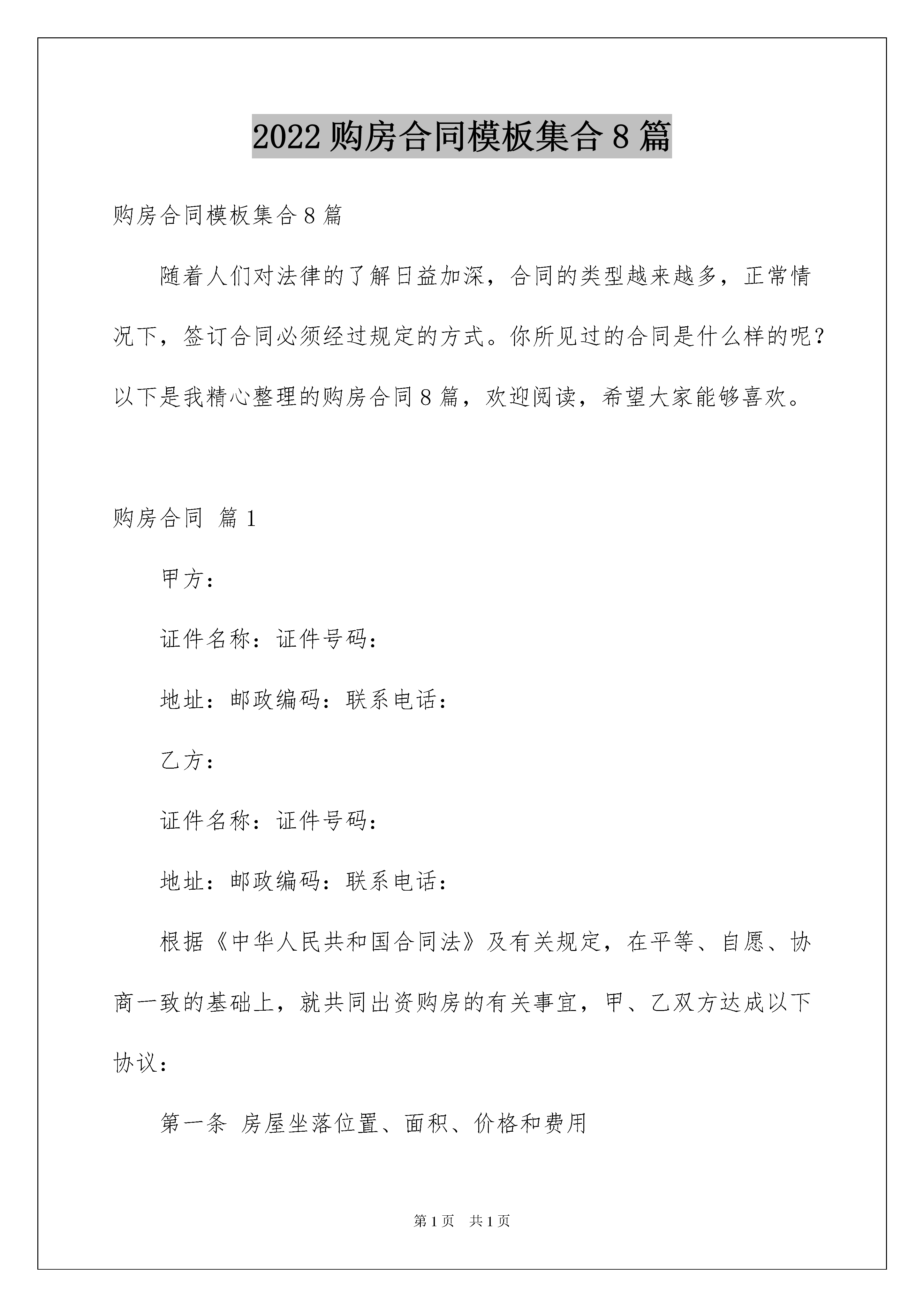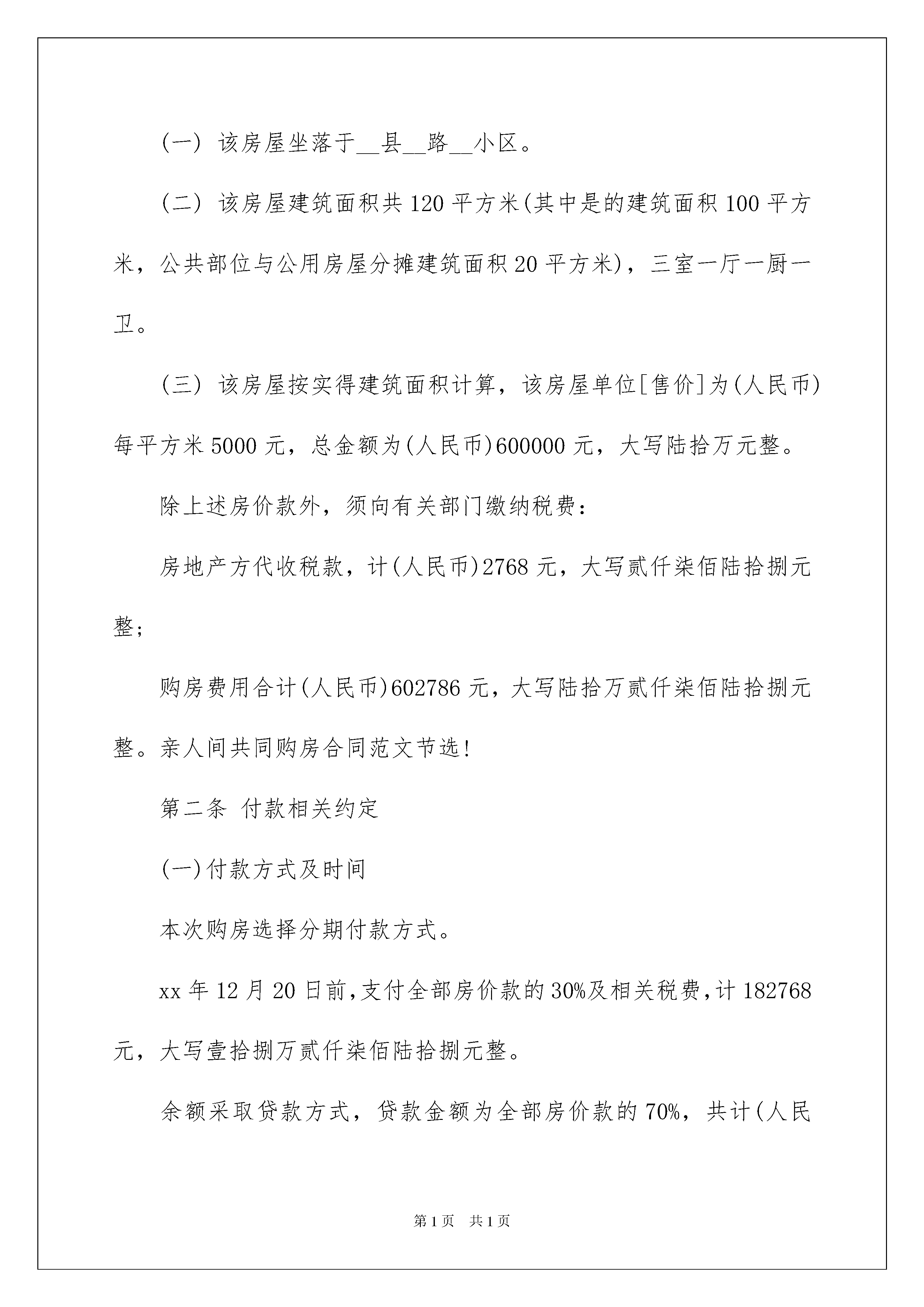 2022购房合同模板集合8篇购房合同模板集合8篇随着人们对法律的了解日益加深,合同的类型越来越多,正常情况下,签订合同必须经过规定的方式。你所见过的合同是什么样的呢?以下是我精心整理的购房合同8篇,欢迎阅读,希望大家能够喜欢。购房合同篇1甲方:证件名称:证件号码:地址:邮政编码:联系电话:乙方:证件名称:证件号码:地址:邮政编码:联系电话:根据《中华人民共和国合同法》及有关规定,在平等、自愿、协商一致的基础上,就共同出资购房的有关事宜,甲、乙双方达成以下协议:第一条房屋坐落位置、面积、价格和费用(一)该房屋坐落于__县__路__小区。(二)该房屋建筑面积共120平方米(其中是的建筑面积100平方米,公共部位与公用房屋分摊建筑面积20平方米),三室一厅一厨一卫。(三)该房屋按实得建筑面积计算,该房屋单位[售价]为(人民币)每平方米5000元,总金额为(人民币)600000元,大写陆拾万元整。除上述房价款外,须向有关部门缴纳税费:房地产方代收税款,计(人民币)2768元,大写贰仟柒佰陆拾捌元整;购房费用合计(人民币)602786元,大写陆拾万贰仟柒佰陆拾捌元整。亲人间共同购房合同范文节选!第二条付款相关约定(一)付款方式及时间本次购房选择分期付款方式。xx年12月20日前,支付全部房价款的30%及相关税费,计182768元,大写壹拾捌万贰仟柒佰陆拾捌元整。余额采取贷款方式,贷款金额为全部房价款的70%,共计(人民币)4xx0元,大写肆拾贰万元整,分二十年偿还,贷款利息共计112344.48元,本息共计532344.48元,大写伍拾叁万贰仟叁佰肆拾肆元肆角捌分。自xx年12月20日起,每月20号之前需支付房贷2218.108元,大写贰仟贰佰壹拾捌元壹角零分捌厘。(二)甲、乙双方付款义务首付由甲、乙双方共同承担,甲方承担32768元,大写叁万贰仟柒佰陆拾捌元整,乙方承担150000元,大写壹拾伍万元整。xx年1月1日至xx年12月31日,房贷由乙方偿还,xx年1月1日起至房贷还请之日,房贷由甲方偿还。第三条关于贷款人登记的约定办理银行贷款时,由甲方署名签字。第四条关于产权登记的约定在实际接收该房屋之日起,在房地产产权登记机关规定的期限内向房地产产权登记机关办理权属登记手续,登记人为甲方。xx年12月20日至xx年12月31日,产权归甲、乙双方共同所有;xx年1月1日起,产权按份共有,甲、乙双方所占份额分别为3:1;贷款还清之日起,产权归甲方所有。第五条关于物业管理的约定自房产移交后,除房贷部分外的一切费用(物业费用、装修费用、日常维护费用、水电费等)均由甲方支付。第六条产权变更时甲、乙双方的权利义务(一)产权共同所用期间1、产权向对方转移。甲方接收,甲方需支付乙方(人民币)15万元及乙方已支付的房贷部分,xx年12月31日前还清,自xx年1月1日起开始偿还,可分期偿还,可一次还清,由甲方自主决定,乙方对甲方的还款要求经和甲方协商后,甲方同意,可以按协商方式偿还;乙方接收,乙方支付甲方已所缴纳首付及其他费用。自产权移交之日起,30日内还清。2、产权向第三方转移。经由甲、乙双方协商同意,所得资金按1:2分配。(二)产权按份所有期间1、产权向对方转移。甲方接收,甲方需支付乙方(人民币)15万元及乙方及支付的房贷部分,自产权移交之日起至xx年12月31日还清,可分期偿还,可一次还清,由甲方自主决定,乙方对甲方的还款要求经和甲方协商后,甲方同意,可以按协商方式偿还;乙方接收,乙方支付甲方已所缴纳首付及其他费用。自产权移交之日起,30日内还清。2、产权向第三方转移。经由甲、乙双方协商同意,所得资金按1:2分配。(三)产权转移到甲方所有期间1、甲方按约定在20xx年12月20日前,偿还最后一次贷款,产权转移到甲方,甲方需支付乙方(人民币)15万元及乙方已支付的房贷部分,自产权移交之日起,30日内还清。2、甲方提前还完贷款,自还完贷款之日起,产权转移到甲方,甲方需支付乙方(人民币)15万元及乙方已支付的房贷部分,自产权移交之日起,30日内还清。产权的变更需经过甲、乙双方协商同意,甲、乙方之间还款只需支付对方本金,无利息。第七条合同的解除(一)产权转移到一方,并根据合同完成对对方的义务,合同解除;(二)经甲、乙双方协商一致,不违反国家法律的相关规定,合同可解除;(三)因以下原因造成合同终止的,双方互不负责:1、房屋如因不可抗拒的原因(地震、火灾、台风等)导致损毁或造成双方损失的;2、因市政建设需要拆除或改造的房屋,使甲乙双方造成损失的。第八条违约责任未经对方同意转移产权为违约行为,自逾越之日起,合