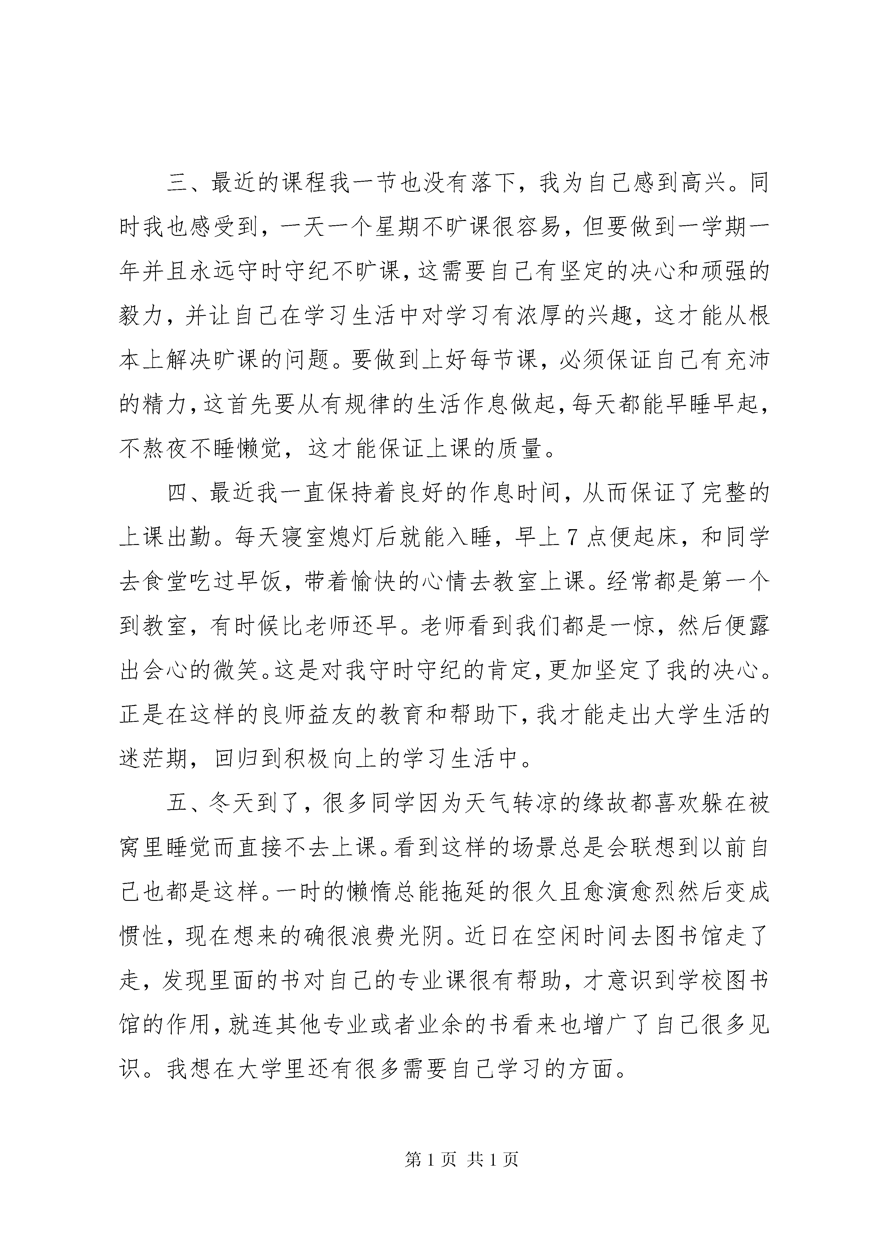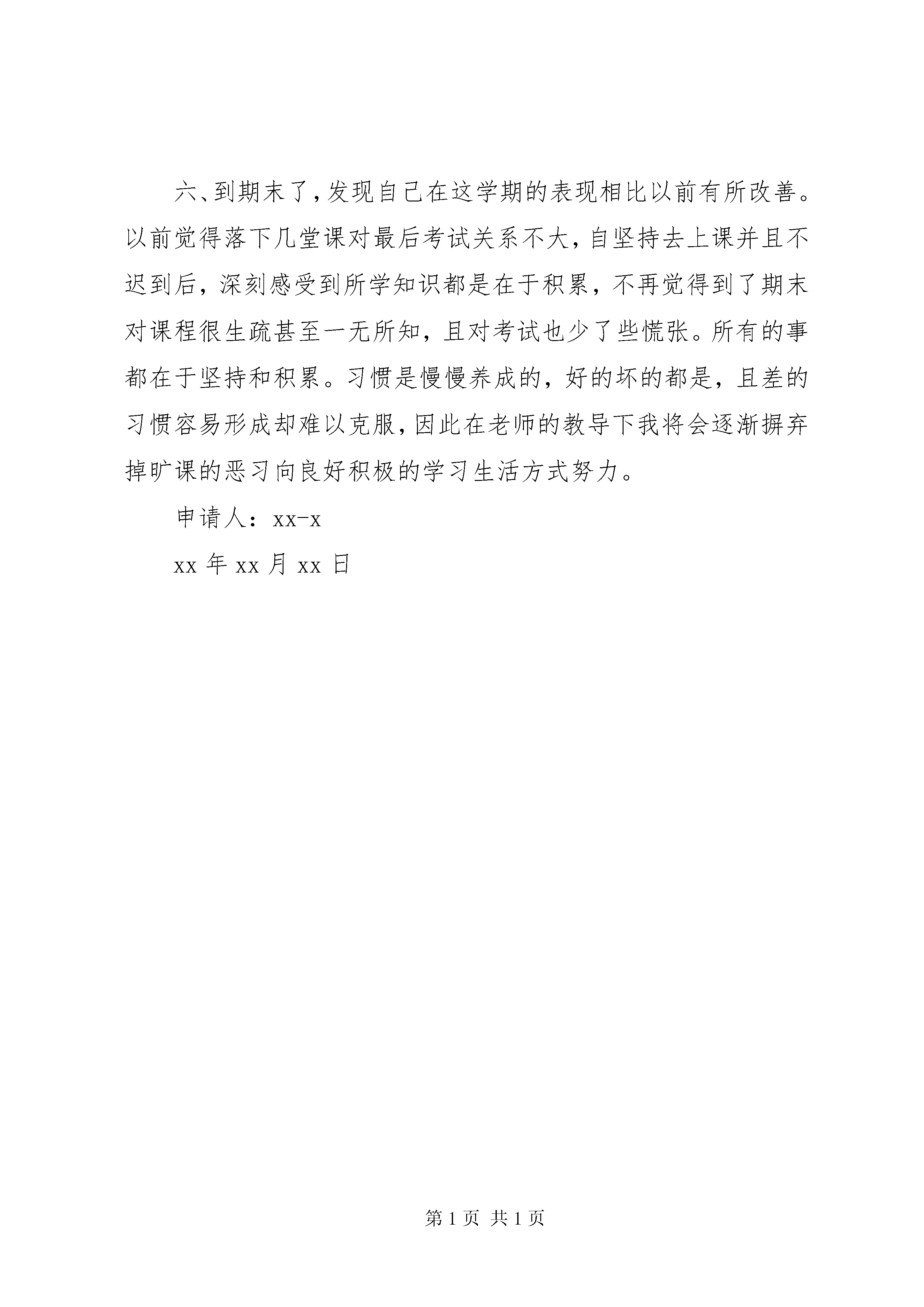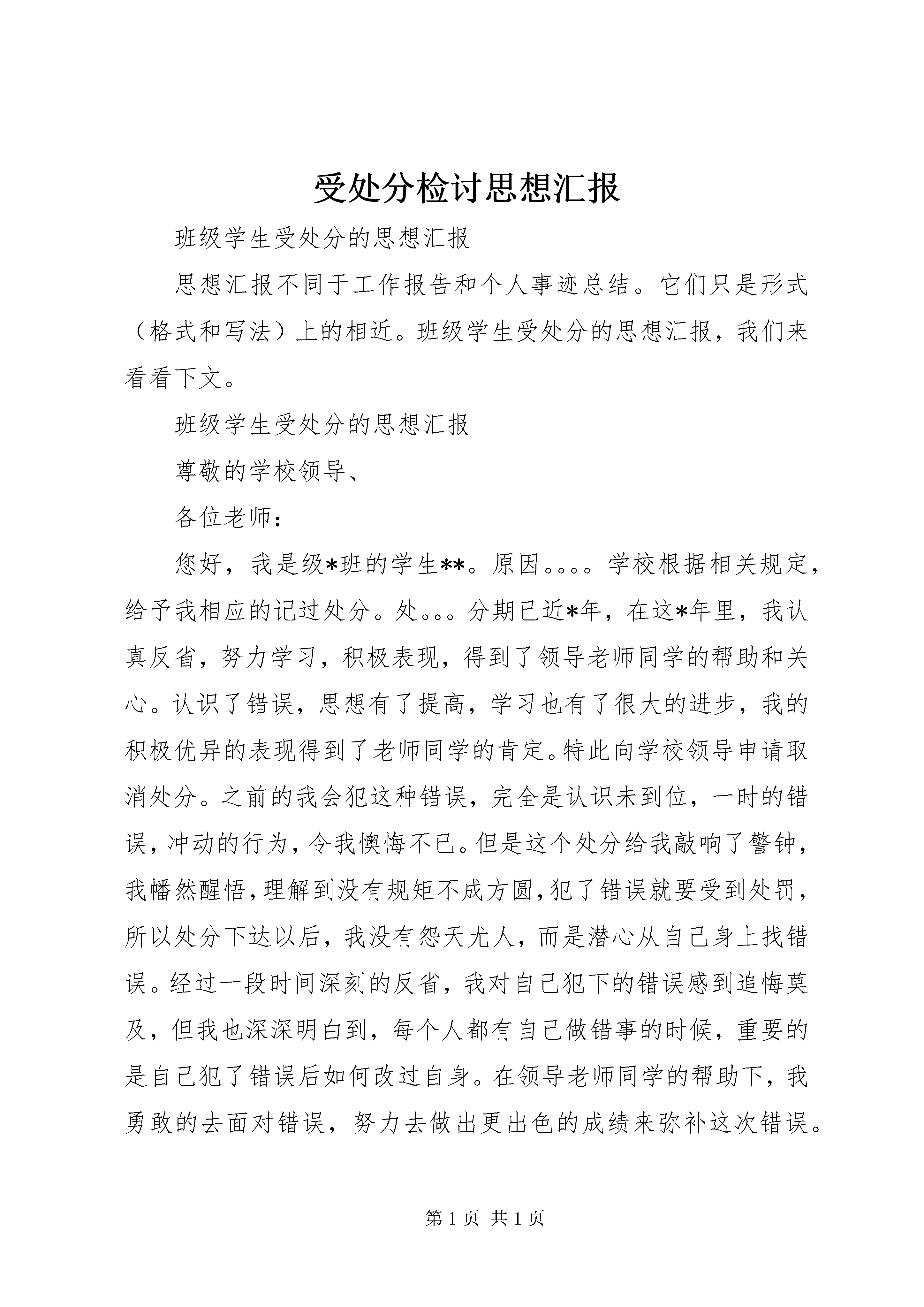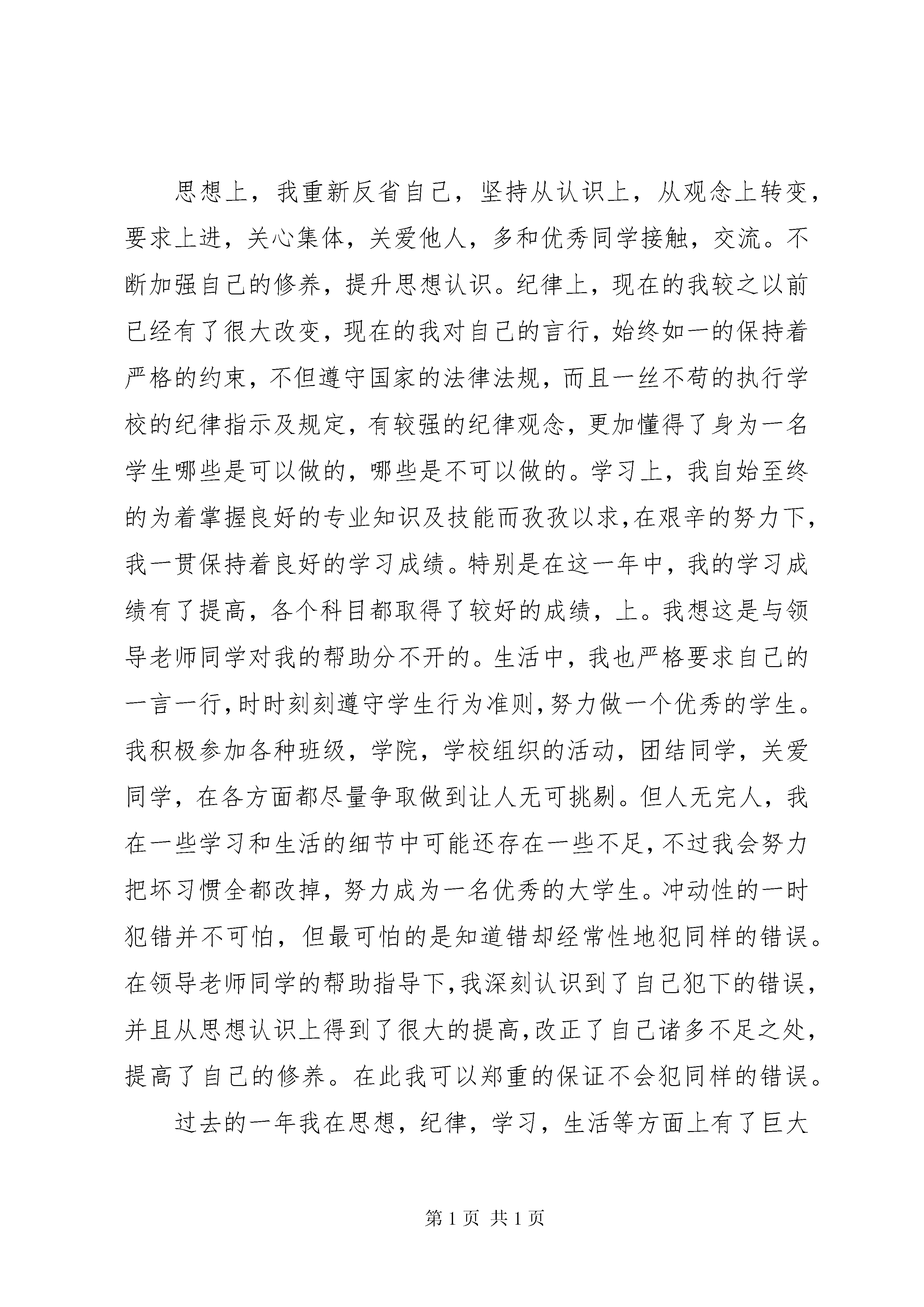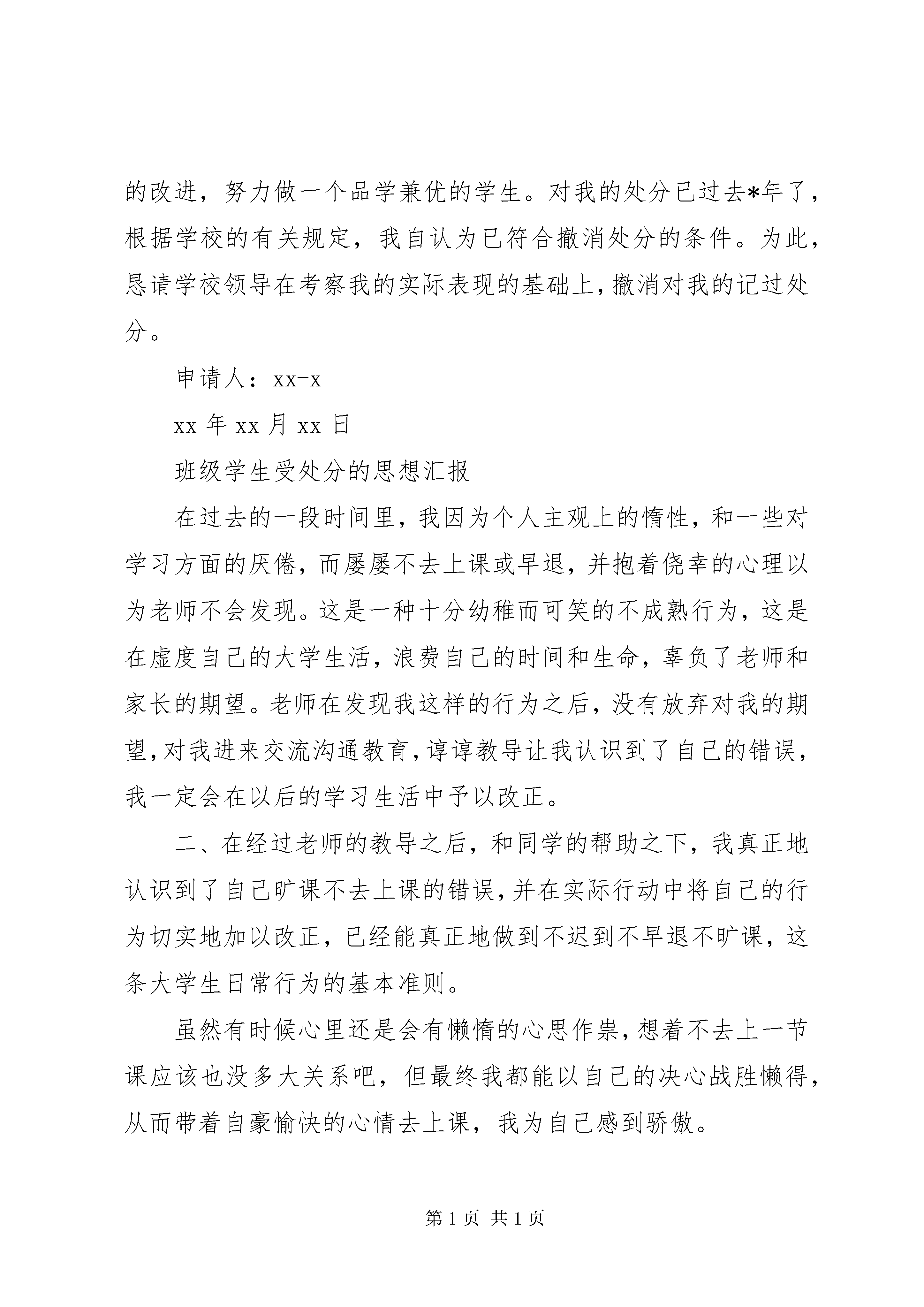 受处分检讨思想汇报班级学生受处分的思想汇报思想汇报不同于工作报告和个人事迹总结。它们只是形式(格式和写法)上的相近。班级学生受处分的思想汇报,我们来看看下文。班级学生受处分的思想汇报尊敬的学校领导、各位老师:您好,我是级*班的学生**。原因。。。。学校根据相关规定,给予我相应的记过处分。处。。。分期已近*年,在这*年里,我认真反省,努力学习,积极表现,得到了领导老师同学的帮助和关心。认识了错误,思想有了提高,学习也有了很大的进步,我的积极优异的表现得到了老师同学的肯定。特此向学校领导申请取消处分。之前的我会犯这种错误,完全是认识未到位,一时的错误,冲动的行为,令我懊悔不已。但是这个处分给我敲响了警钟,我幡然醒悟,理解到没有规矩不成方圆,犯了错误就要受到处罚,所以处分下达以后,我没有怨天尤人,而是潜心从自己身上找错误。经过一段时间深刻的反省,我对自己犯下的错误感到追悔莫及,但我也深深明白到,每个人都有自己做错事的时候,重要的是自己犯了错误后如何改过自身。在领导老师同学的帮助下,我勇敢的去面对错误,努力去做出更出色的成绩来弥补这次错误。思想上,我重新反省自己,坚持从认识上,从观念上转变,要求上进,关心集体,关爱他人,多和优秀同学接触,交流。不断加强自己的修养,提升思想认识。纪律上,现在的我较之以前已经有了很大改变,现在的我对自己的言行,始终如一的保持着严格的约束,不但遵守国家的法律法规,而且一丝不苟的执行学校的纪律指示及规定,有较强的纪律观念,更加懂得了身为一名学生哪些是可以做的,哪些是不可以做的。学习上,我自始至终的为着掌握良好的专业知识及技能而孜孜以求,在艰辛的努力下,我一贯保持着良好的学习成绩。特别是在这一年中,我的学习成绩有了提高,各个科目都取得了较好的成绩,上。我想这是与领导老师同学对我的帮助分不开的。生活中,我也严格要求自己的一言一行,时时刻刻遵守学生行为准则,努力做一个优秀的学生。我积极参加各种班级,学院,学校组织的活动,团结同学,关爱同学,在各方面都尽量争取做到让人无可挑剔。但人无完人,我在一些学习和生活的细节中可能还存在一些不足,不过我会努力把坏习惯全都改掉,努力成为一名优秀的大学生。冲动性的一时犯错并不可怕,但最可怕的是知道错却经常性地犯同样的错误。在领导老师同学的帮助指导下,我深刻认识到了自己犯下的错误,并且从思想认识上得到了很大的提高,改正了自己诸多不足之处,提高了自己的修养。在此我可以郑重的保证不会犯同样的错误。过去的一年我在思想,纪律,学习,生活等方面上有了巨大的改进,努力做一个品学兼优的学生。对我的处分已过去*年了,根据学校的有关规定,我自认为已符合撤消处分的条件。为此,恳请学校领导在考察我的实际表现的基础上,撤消对我的记过处分。申请人:xx-xxx年xx月xx日班级学生受处分的思想汇报在过去的一段时间里,我因为个人主观上的惰性,和一些对学习方面的厌倦,而屡屡不去上课或早退,并抱着侥幸的心理以为老师不会发现。这是一种十分幼稚而可笑的不成熟行为,这是在虚度自己的大学生活,浪费自己的时间和生命,辜负了老师和家长的期望。老师在发现我这样的行为之后,没有放弃对我的期望,对我进来交流沟通教育,谆谆教导让我认识到了自己的错误,我一定会在以后的学习生活中予以改正。二、在经过老师的教导之后,和同学的帮助之下,我真正地认识到了自己旷课不去上课的错误,并在实际行动中将自己的行为切实地加以改正,已经能真正地做到不迟到不早退不旷课,这条大学生日常行为的基本准则。虽然有时候心里还是会有懒惰的心思作祟,想着不去上一节课应该也没多大关系吧,但最终我都能以自己的决心战胜懒得,从而带着自豪愉快的心情去上课,我为自己感到骄傲。三、最近的课程我一节也没有落下,我为自己感到高兴。同时我也感受到,一天一个星期不旷课很容易,但要做到一学期一年并且永远守时守纪不旷课,这需要自己有坚定的决心和顽强的毅力,并让自己在学习生活中对学习有浓厚的兴趣,这才能从根本上解决旷课的问题。要做到上好每节课,必须保证自己有充沛的精力,这首先要从有规律的生活作息做起,每天都能早睡早起,不熬夜不睡懒觉,这才能保证上课的质量。四、最近我一直保持着良好的作息时间,从而保证了完整的上课出勤。每天寝室熄灯后就能入睡,早上7点便起床,和同学去食堂吃过早饭,带着愉快的心情去教室上课。经常都是第一个到教室,有时候比老师还早。老师看到我们都是一惊,然后便露出会心的微笑。这是对我守时守纪的肯定,更加坚定了我的决心。正是在这样的良师益友的教育和帮助下,我才能走出大学生活的迷茫期,回归到积极向上的学习生活中。五、冬天到了,很多同学因为天气转凉的缘故都喜欢躲在被窝里睡觉而直接不去上课。看到这样的场景总是会联想到以前自己也都是这样。一时的懒惰总能拖延的很久且愈演愈烈然后
