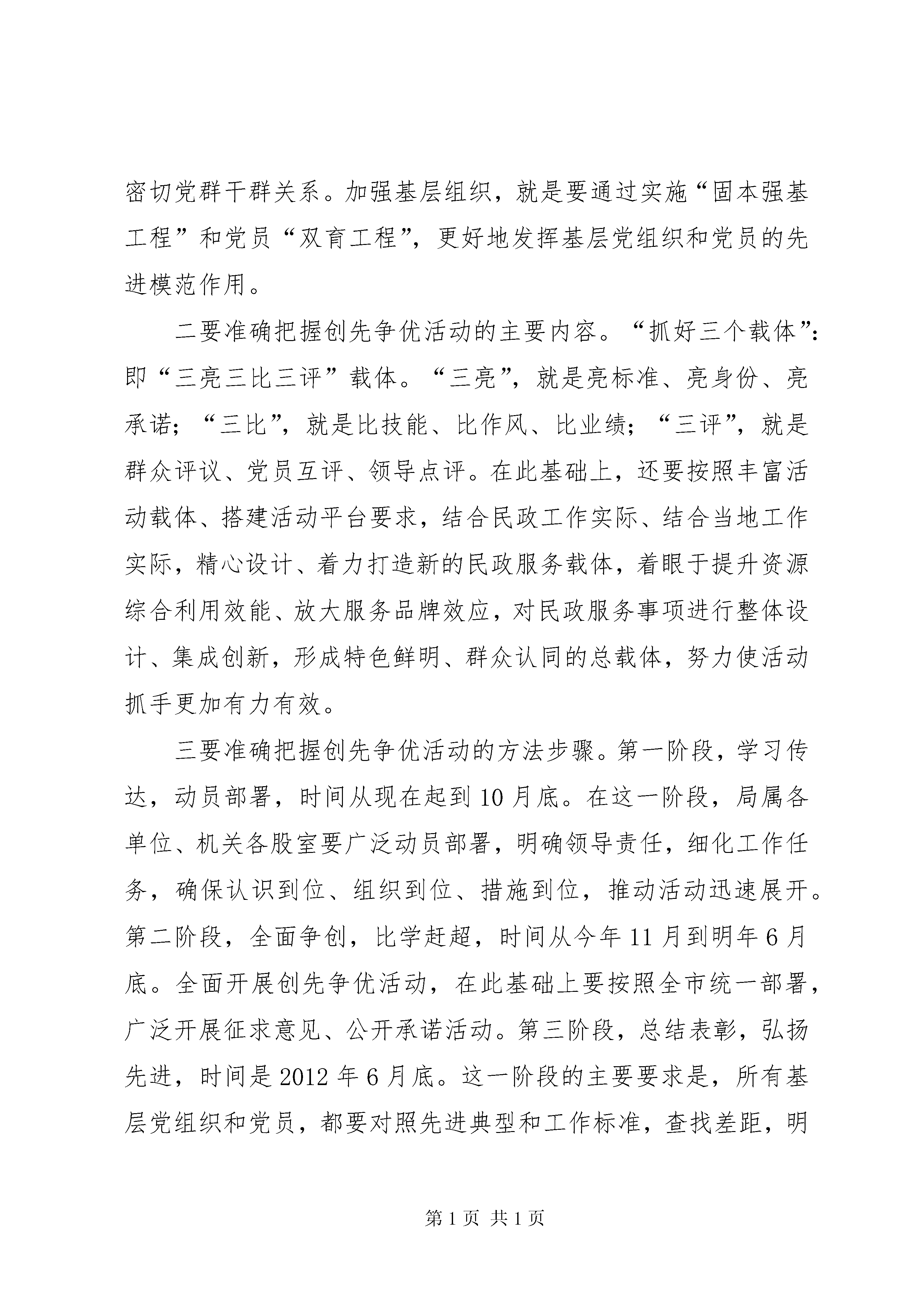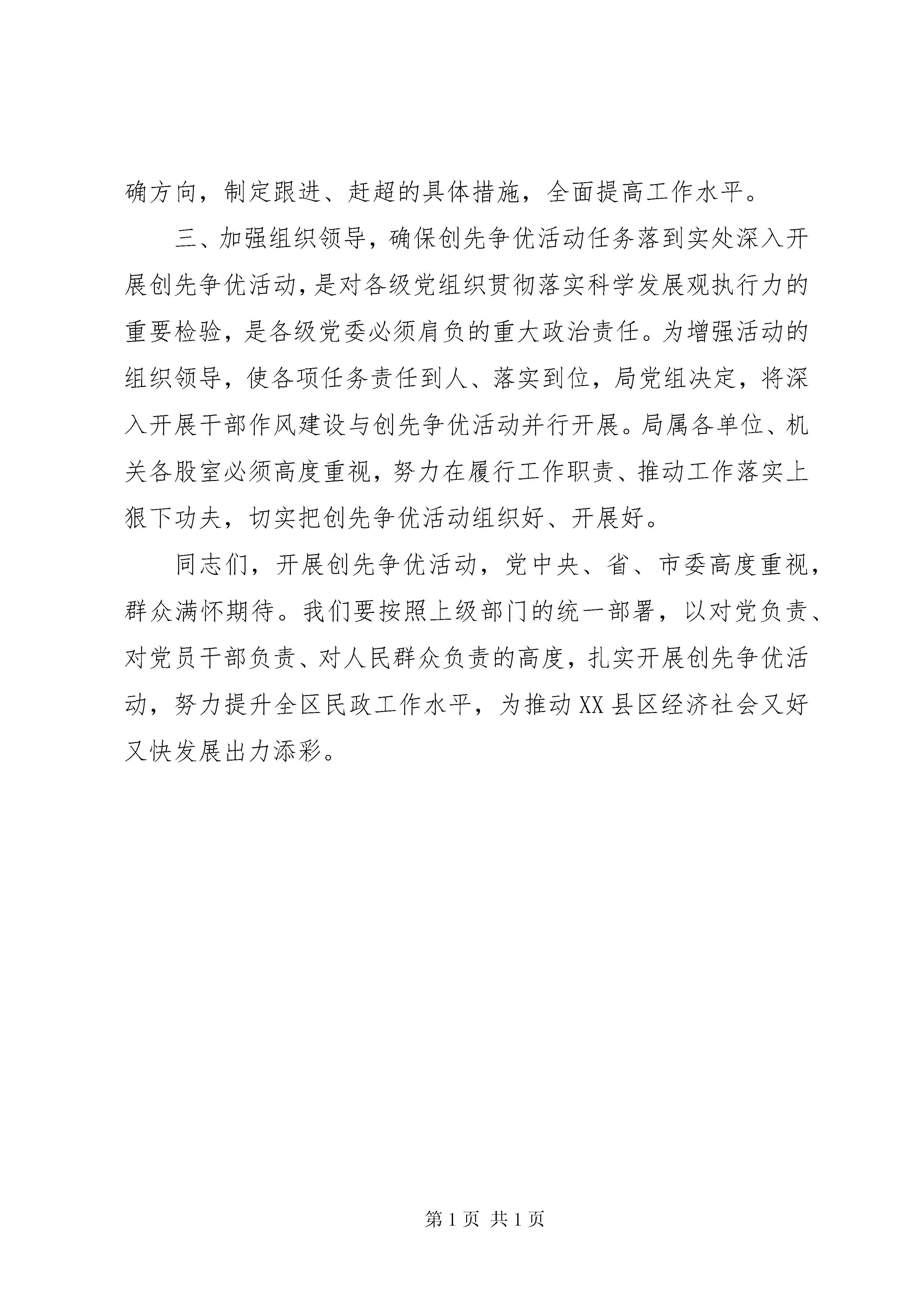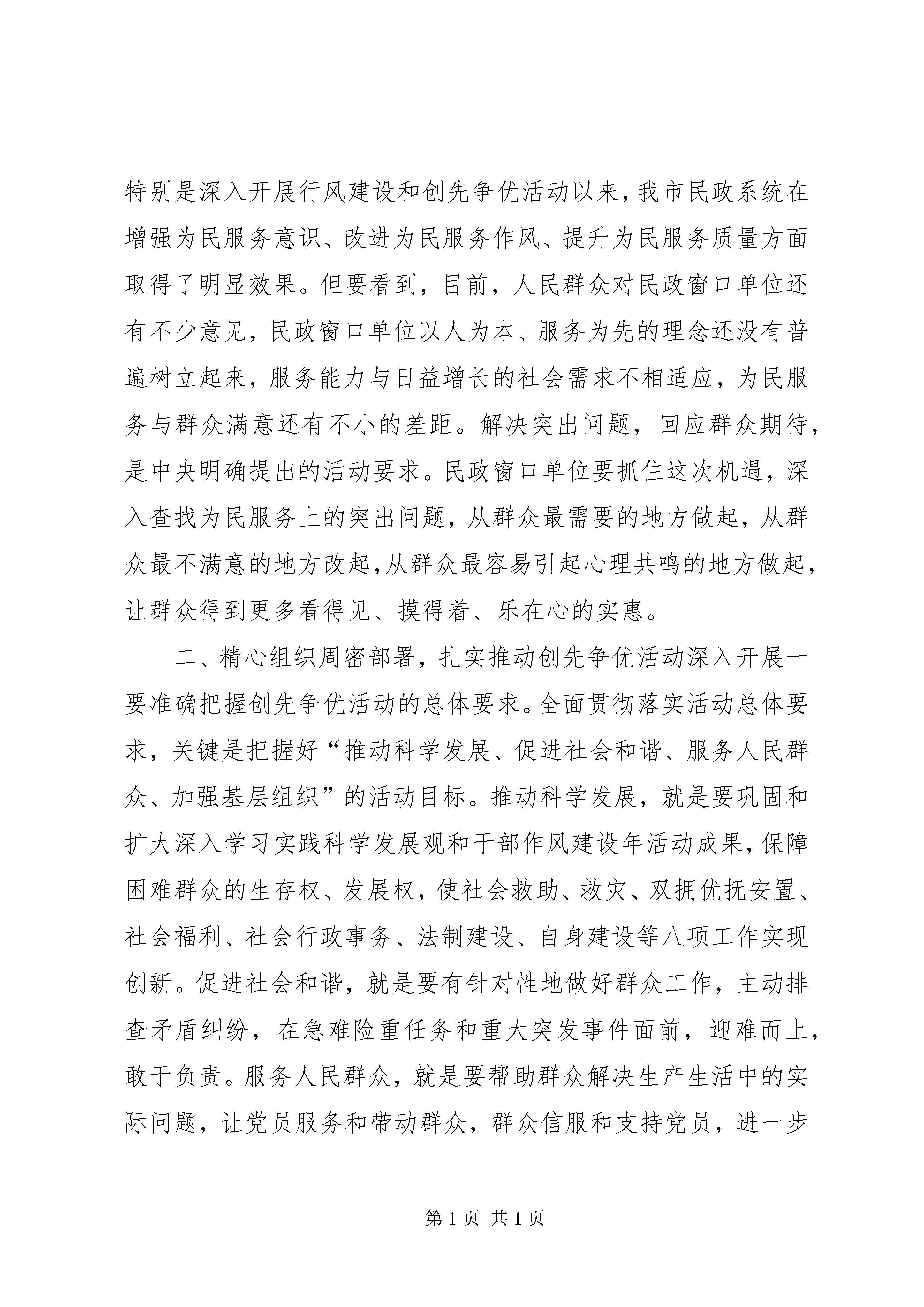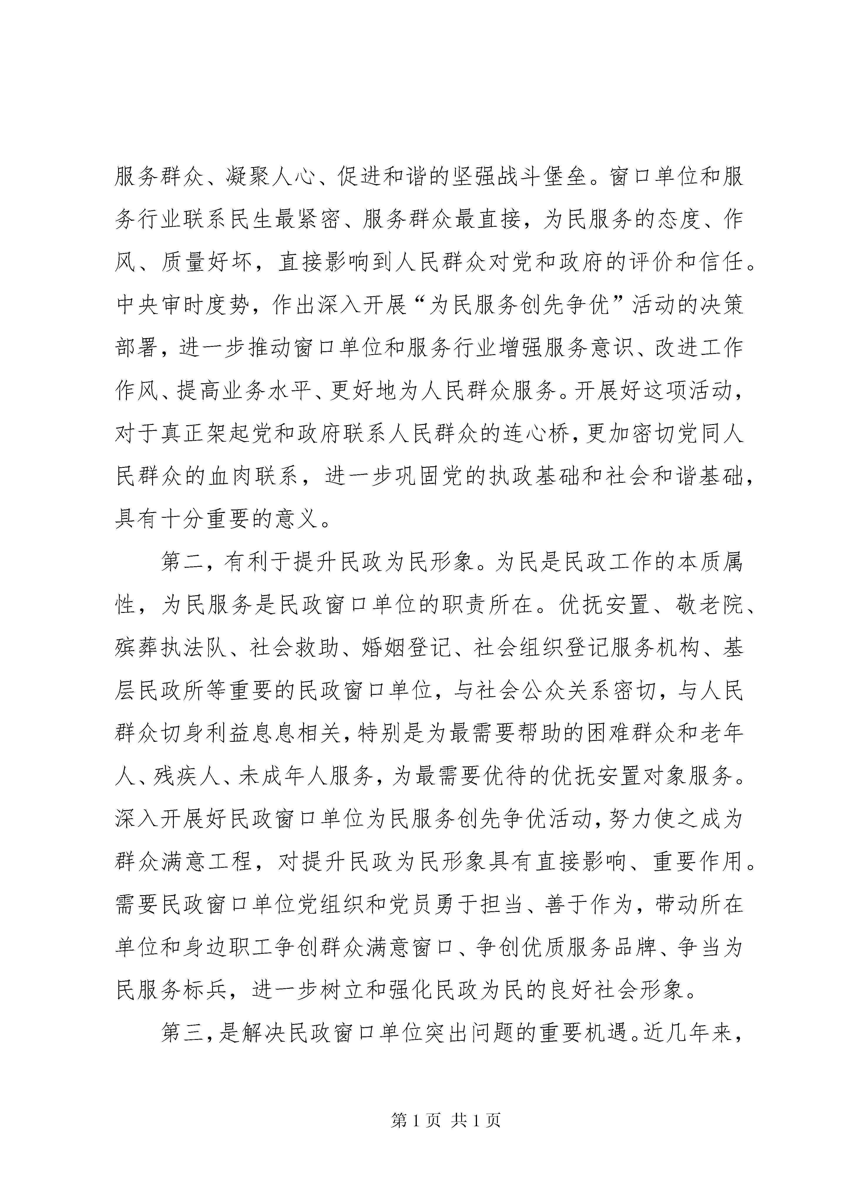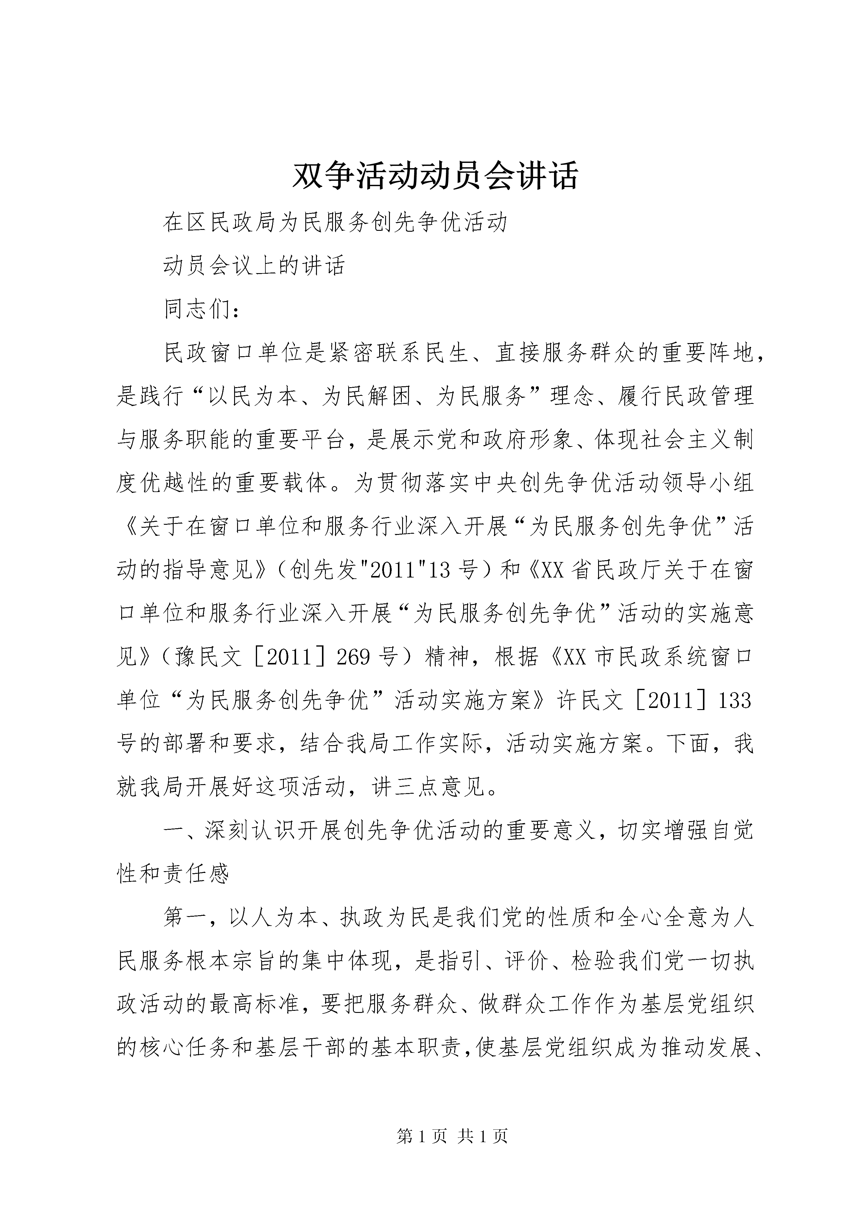 双争活动动员会讲话在区民政局为民服务创先争优活动动员会议上的讲话同志们:民政窗口单位是紧密联系民生、直接服务群众的重要阵地,是践行“以民为本、为民解困、为民服务”理念、履行民政管理与服务职能的重要平台,是展示党和政府形象、体现社会主义制度优越性的重要载体。为贯彻落实中央创先争优活动领导小组《关于在窗口单位和服务行业深入开展“为民服务创先争优”活动的指导意见》(创先发"2011"13号)和《XX省民政厅关于在窗口单位和服务行业深入开展“为民服务创先争优”活动的实施意见》(豫民文[2011]269号)精神,根据《XX市民政系统窗口单位“为民服务创先争优”活动实施方案》许民文[2011]133号的部署和要求,结合我局工作实际,活动实施方案。下面,我就我局开展好这项活动,讲三点意见。一、深刻认识开展创先争优活动的重要意义,切实增强自觉性和责任感第一,以人为本、执政为民是我们党的性质和全心全意为人民服务根本宗旨的集中体现,是指引、评价、检验我们党一切执政活动的最高标准,要把服务群众、做群众工作作为基层党组织的核心任务和基层干部的基本职责,使基层党组织成为推动发展、服务群众、凝聚人心、促进和谐的坚强战斗堡垒。窗口单位和服务行业联系民生最紧密、服务群众最直接,为民服务的态度、作风、质量好坏,直接影响到人民群众对党和政府的评价和信任。中央审时度势,作出深入开展“为民服务创先争优”活动的决策部署,进一步推动窗口单位和服务行业增强服务意识、改进工作作风、提高业务水平、更好地为人民群众服务。开展好这项活动,对于真正架起党和政府联系人民群众的连心桥,更加密切党同人民群众的血肉联系,进一步巩固党的执政基础和社会和谐基础,具有十分重要的意义。第二,有利于提升民政为民形象。为民是民政工作的本质属性,为民服务是民政窗口单位的职责所在。优抚安置、敬老院、殡葬执法队、社会救助、婚姻登记、社会组织登记服务机构、基层民政所等重要的民政窗口单位,与社会公众关系密切,与人民群众切身利益息息相关,特别是为最需要帮助的困难群众和老年人、残疾人、未成年人服务,为最需要优待的优抚安置对象服务。深入开展好民政窗口单位为民服务创先争优活动,努力使之成为群众满意工程,对提升民政为民形象具有直接影响、重要作用。需要民政窗口单位党组织和党员勇于担当、善于作为,带动所在单位和身边职工争创群众满意窗口、争创优质服务品牌、争当为民服务标兵,进一步树立和强化民政为民的良好社会形象。第三,是解决民政窗口单位突出问题的重要机遇。近几年来,特别是深入开展行风建设和创先争优活动以来,我市民政系统在增强为民服务意识、改进为民服务作风、提升为民服务质量方面取得了明显效果。但要看到,目前,人民群众对民政窗口单位还有不少意见,民政窗口单位以人为本、服务为先的理念还没有普遍树立起来,服务能力与日益增长的社会需求不相适应,为民服务与群众满意还有不小的差距。解决突出问题,回应群众期待,是中央明确提出的活动要求。民政窗口单位要抓住这次机遇,深入查找为民服务上的突出问题,从群众最需要的地方做起,从群众最不满意的地方改起,从群众最容易引起心理共鸣的地方做起,让群众得到更多看得见、摸得着、乐在心的实惠。二、精心组织周密部署,扎实推动创先争优活动深入开展一要准确把握创先争优活动的总体要求。全面贯彻落实活动总体要求,关键是把握好“推动科学发展、促进社会和谐、服务人民群众、加强基层组织”的活动目标。推动科学发展,就是要巩固和扩大深入学习实践科学发展观和干部作风建设年活动成果,保障困难群众的生存权、发展权,使社会救助、救灾、双拥优抚安置、社会福利、社会行政事务、法制建设、自身建设等八项工作实现创新。促进社会和谐,就是要有针对性地做好群众工作,主动排查矛盾纠纷,在急难险重任务和重大突发事件面前,迎难而上,敢于负责。服务人民群众,就是要帮助群众解决生产生活中的实际问题,让党员服务和带动群众,群众信服和支持党员,进一步密切党群干群关系。加强基层组织,就是要通过实施“固本强基工程”和党员“双育工程”,更好地发挥基层党组织和党员的先进模范作用。二要准确把握创先争优活动的主要内容。“抓好三个载体”:即“三亮三比三评”载体。“三亮”,就是亮标准、亮身份、亮承诺;“三比”,就是比技能、比作风、比业绩;“三评”,就是群众评议、党员互评、领导点评。在此基础上,还要按照丰富活动载体、搭建活动平台要求,结合民政工作实际、结合当地工作实际,精心设计、着力打造新的民政服务载体,着眼于提升资源综合利用效能、放大服务品牌效应,对民政服务事项进行整体设计、集成创新,形成特色鲜明、群众认同的总载体,努力使活动抓手更加有力有效。三要准确把握创先争优活动的方法步骤。第一阶段,学习传达,动员部署,时间从现在起到10月底。在这一阶段,局属各单位、机关