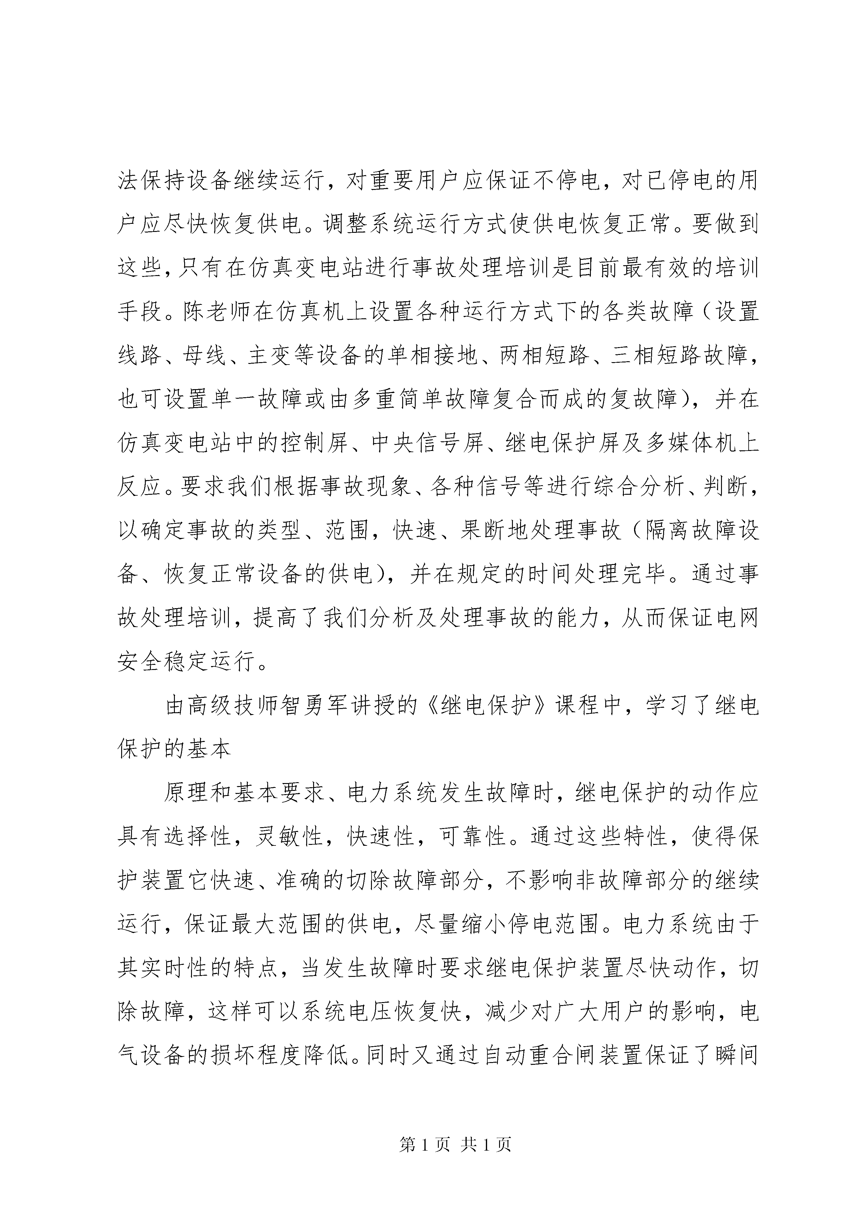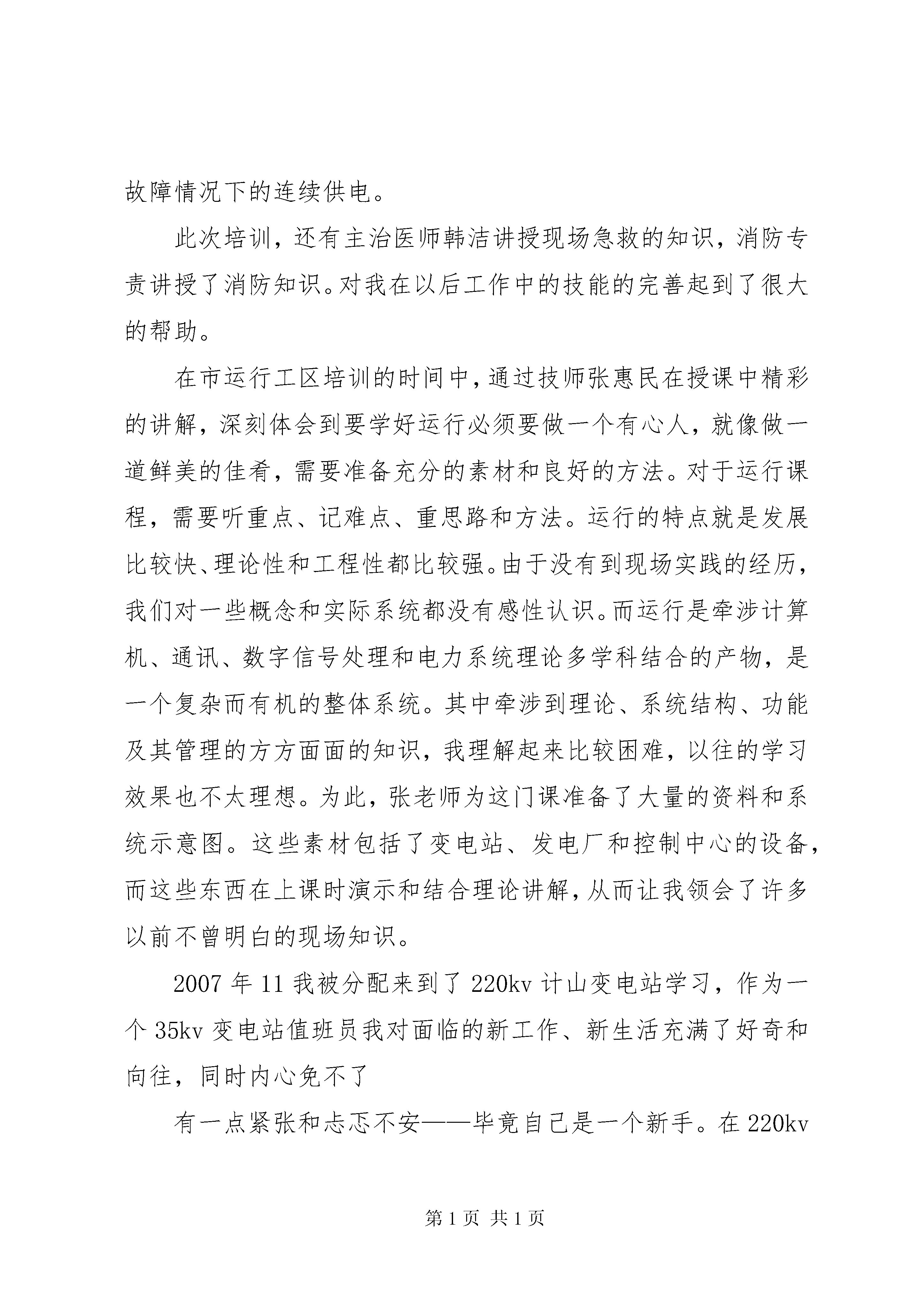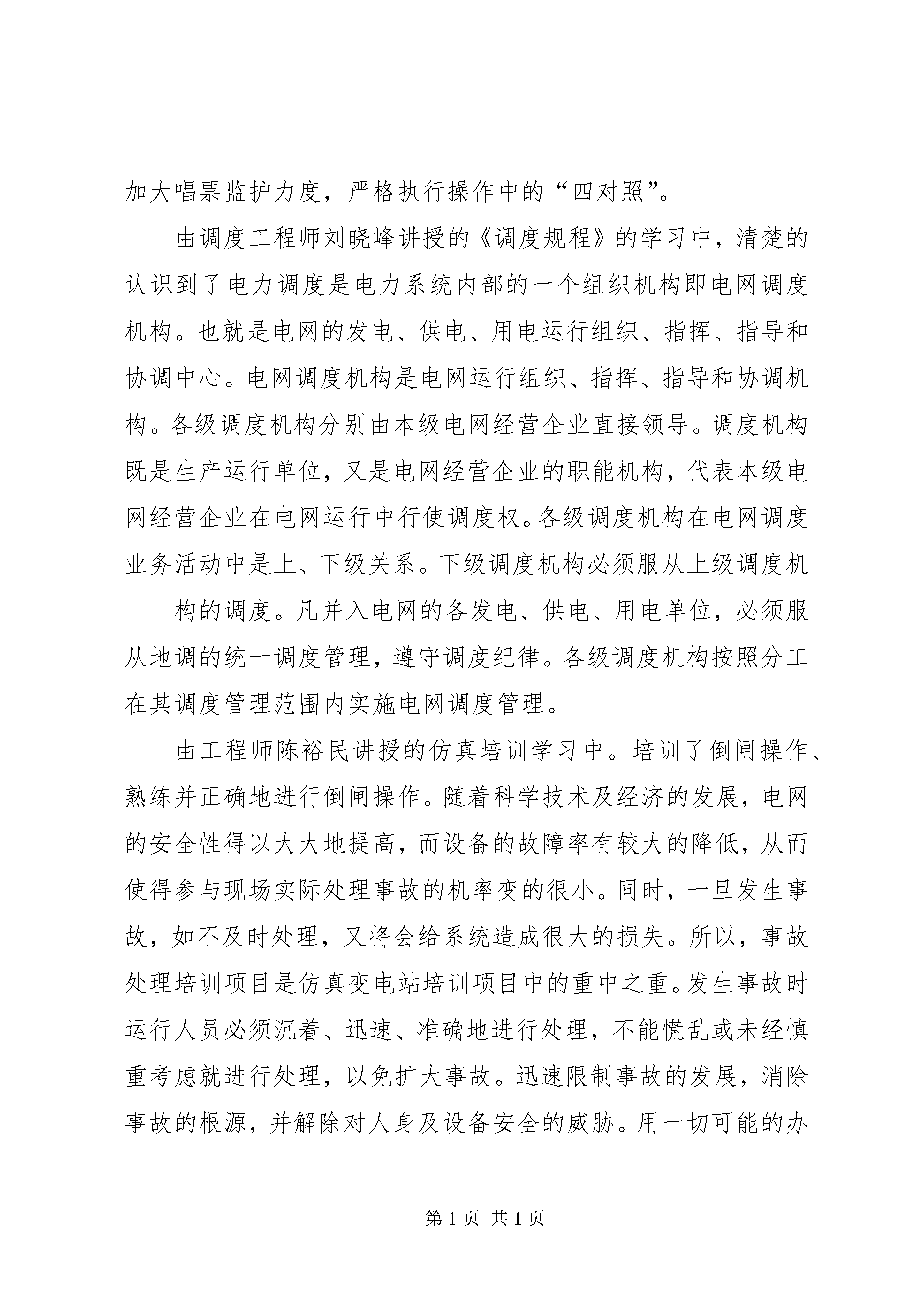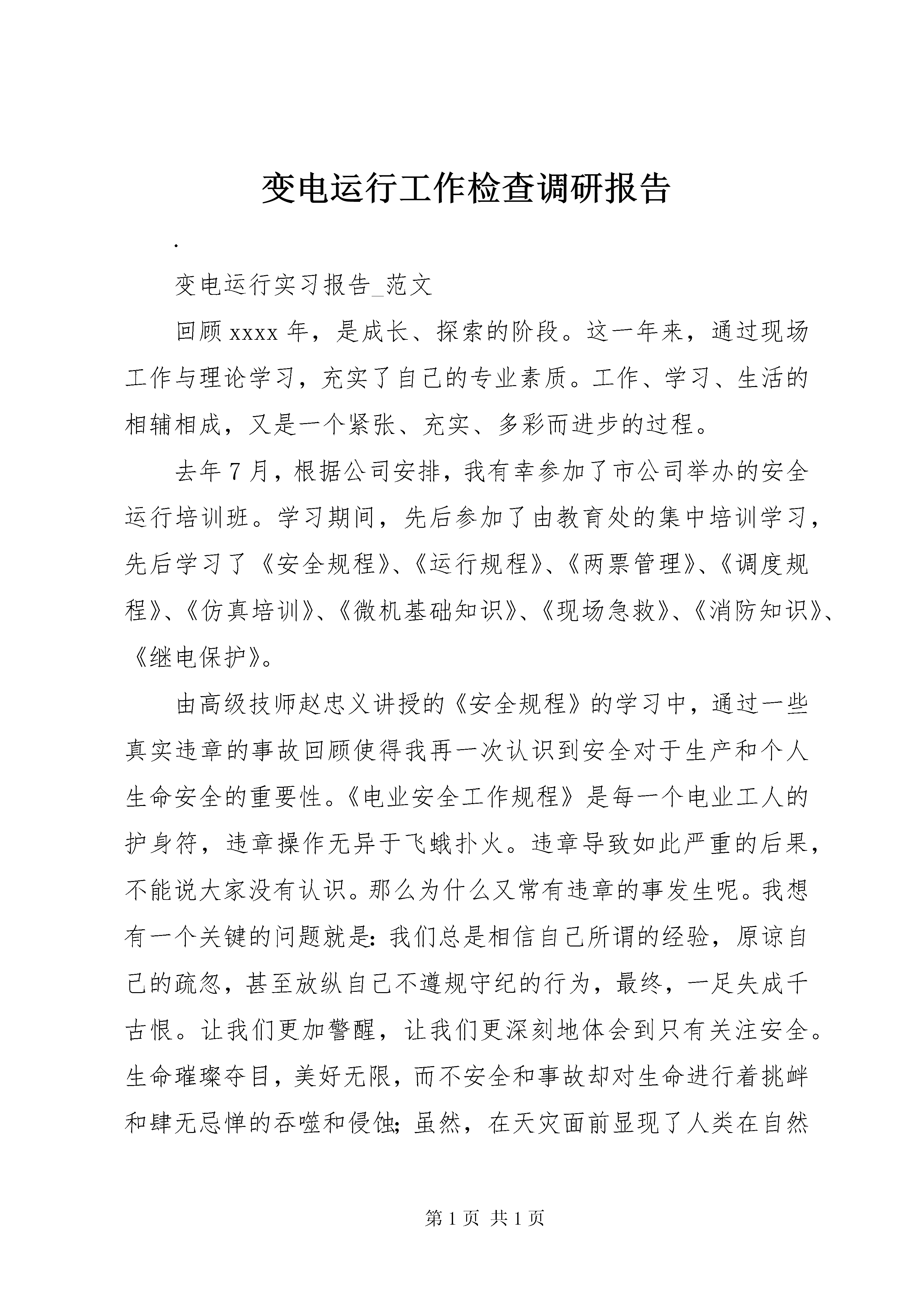 变电运行工作检查调研报告.变电运行实习报告_范文回顾xxxx年,是成长、探索的阶段。这一年来,通过现场工作与理论学习,充实了自己的专业素质。工作、学习、生活的相辅相成,又是一个紧张、充实、多彩而进步的过程。去年7月,根据公司安排,我有幸参加了市公司举办的安全运行培训班。学习期间,先后参加了由教育处的集中培训学习,先后学习了《安全规程》、《运行规程》、《两票管理》、《调度规程》、《仿真培训》、《微机基础知识》、《现场急救》、《消防知识》、《继电保护》。由高级技师赵忠义讲授的《安全规程》的学习中,通过一些真实违章的事故回顾使得我再一次认识到安全对于生产和个人生命安全的重要性。《电业安全工作规程》是每一个电业工人的护身符,违章操作无异于飞蛾扑火。违章导致如此严重的后果,不能说大家没有认识。那么为什么又常有违章的事发生呢。我想有一个关键的问题就是:我们总是相信自己所谓的经验,原谅自己的疏忽,甚至放纵自己不遵规守纪的行为,最终,一足失成千古恨。让我们更加警醒,让我们更深刻地体会到只有关注安全。生命璀璨夺目,美好无限,而不安全和事故却对生命进行着挑衅和肆无忌惮的吞噬和侵蚀;虽然,在天灾面前显现了人类在自然灾难面前的脆弱,那么,那些不讲安全的血和泪的事故的隐患,则是纯粹的人祸。正是无视安全,不遵章守纪,才对国家、集体、个人的财产和生命构成了一次又一次的威胁和伤害。正是这些惨痛的事故,让千万个家庭失去欢笑的权利,让无数个母亲和孩子在号啕哭泣。安全,是天伦,是亲情,是人性。安全,.只有安全,才能让我们远离那如泣如诉的痛苦和哀伤,安全,只有安全,才能让我们寻求快乐生活,得到平安幸福。由高级技师王予生讲授的《运行规程》,学习中我在理论上用心钻研,熟记操作规程,实践上严格遵守运行规程,保证不发生误操事故,把工作中遇到的问题和取得的经验、注意的事项随时记下来,虚心向师傅、专工请教,虽然已经明白运行规程,但深知要想把运行专业学透学精,还需要时间的磨练、知识的积累,循序渐进。即使休息期间、间歇时间,不忘看运行专业书籍,做到身不在岗心在岗,还充分利用家里网络资源,查看电力运行文献,开阔视野,继续充电,希望在上岗后能以新的认识高度对待。由高级技师艾新法讲授的《两票管理》的学习中认识到在倒闸操作,是电力企业安全生产行为的基本内容。如不加强“两票”管理,狠抓“两票”合格率,安全生产就无法得到保障。我做好“两票”工作的同时,还确保在操作前实行模拟预演操作制度,加强日常操作的基本训练,经常举行反误操作的训练和演习,加大唱票监护力度,严格执行操作中的“四对照”。由调度工程师刘晓峰讲授的《调度规程》的学习中,清楚的认识到了电力调度是电力系统内部的一个组织机构即电网调度机构。也就是电网的发电、供电、用电运行组织、指挥、指导和协调中心。电网调度机构是电网运行组织、指挥、指导和协调机构。各级调度机构分别由本级电网经营企业直接领导。调度机构既是生产运行单位,又是电网经营企业的职能机构,代表本级电网经营企业在电网运行中行使调度权。各级调度机构在电网调度业务活动中是上、下级关系。下级调度机构必须服从上级调度机构的调度。凡并入电网的各发电、供电、用电单位,必须服从地调的统一调度管理,遵守调度纪律。各级调度机构按照分工在其调度管理范围内实施电网调度管理。由工程师陈裕民讲授的仿真培训学习中。培训了倒闸操作、熟练并正确地进行倒闸操作。随着科学技术及经济的发展,电网的安全性得以大大地提高,而设备的故障率有较大的降低,从而使得参与现场实际处理事故的机率变的很小。同时,一旦发生事故,如不及时处理,又将会给系统造成很大的损失。所以,事故处理培训项目是仿真变电站培训项目中的重中之重。发生事故时运行人员必须沉着、迅速、准确地进行处理,不能慌乱或未经慎重考虑就进行处理,以免扩大事故。迅速限制事故的发展,消除事故的根源,并解除对人身及设备安全的威胁。用一切可能的办法保持设备继续运行,对重要用户应保证不停电,对已停电的用户应尽快恢复供电。调整系统运行方式使供电恢复正常。要做到这些,只有在仿真变电站进行事故处理培训是目前最有效的培训手段。陈老师在仿真机上设置各种运行方式下的各类故障(设置线路、母线、主变等设备的单相接地、两相短路、三相短路故障,也可设置单一故障或由多重简单故障复合而成的复故障),并在仿真变电站中的控制屏、中央信号屏、继电保护屏及多媒体机上反应。要求我们根据事故现象、各种信号等进行综合分析、判断,以确定事故的类型、范围,快速、果断地处理事故(隔离故障设备、恢复正常设备的供电),并在规定的时间处理完毕。通过事故处理培训,提高了我们分析及处理事故的能力,从而保证电网安全稳定运行。由高级技师智勇军讲授的《继电保护》课程中,学习了继电保护的基本原理和基本要求、电力系统发生故障时,