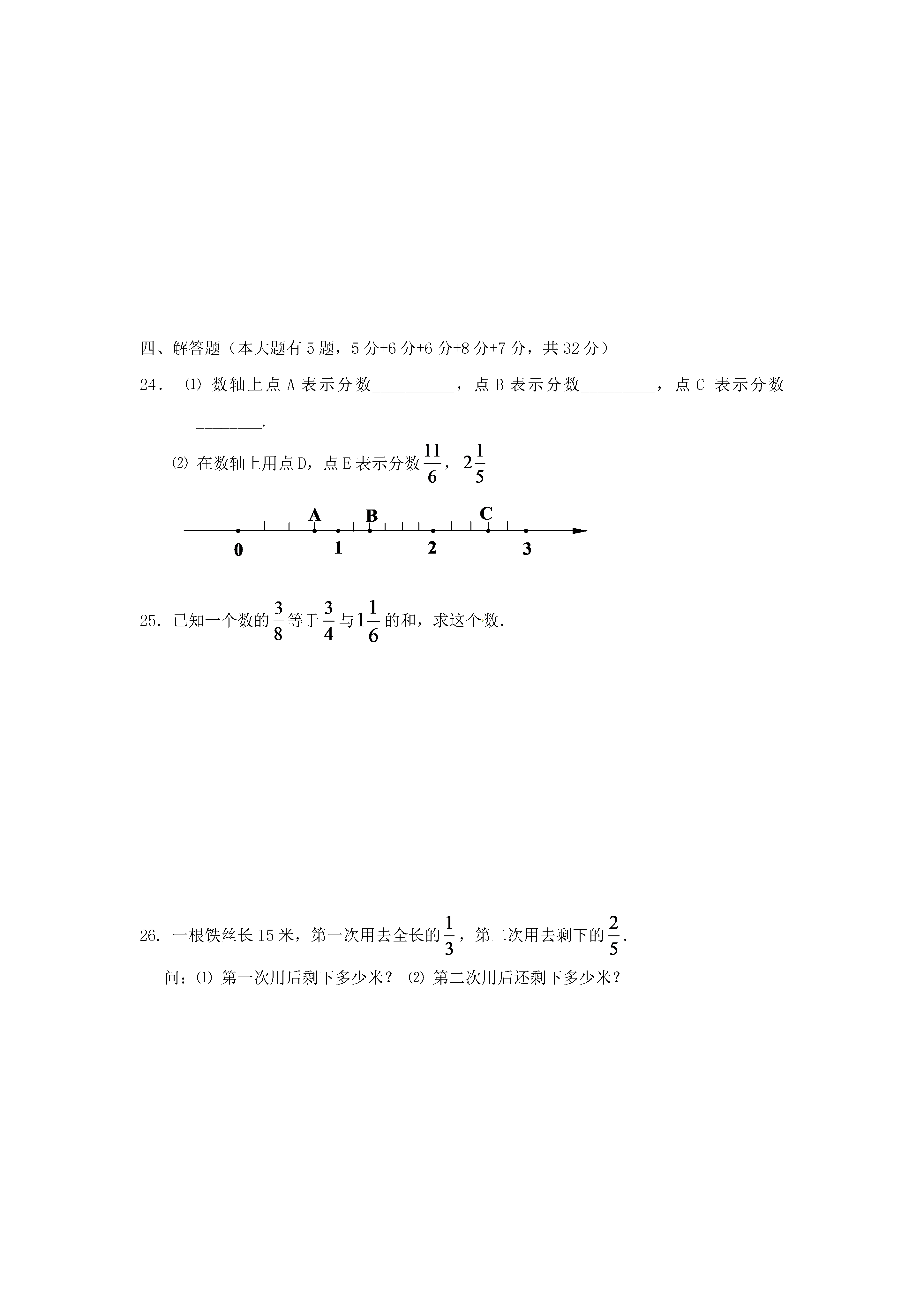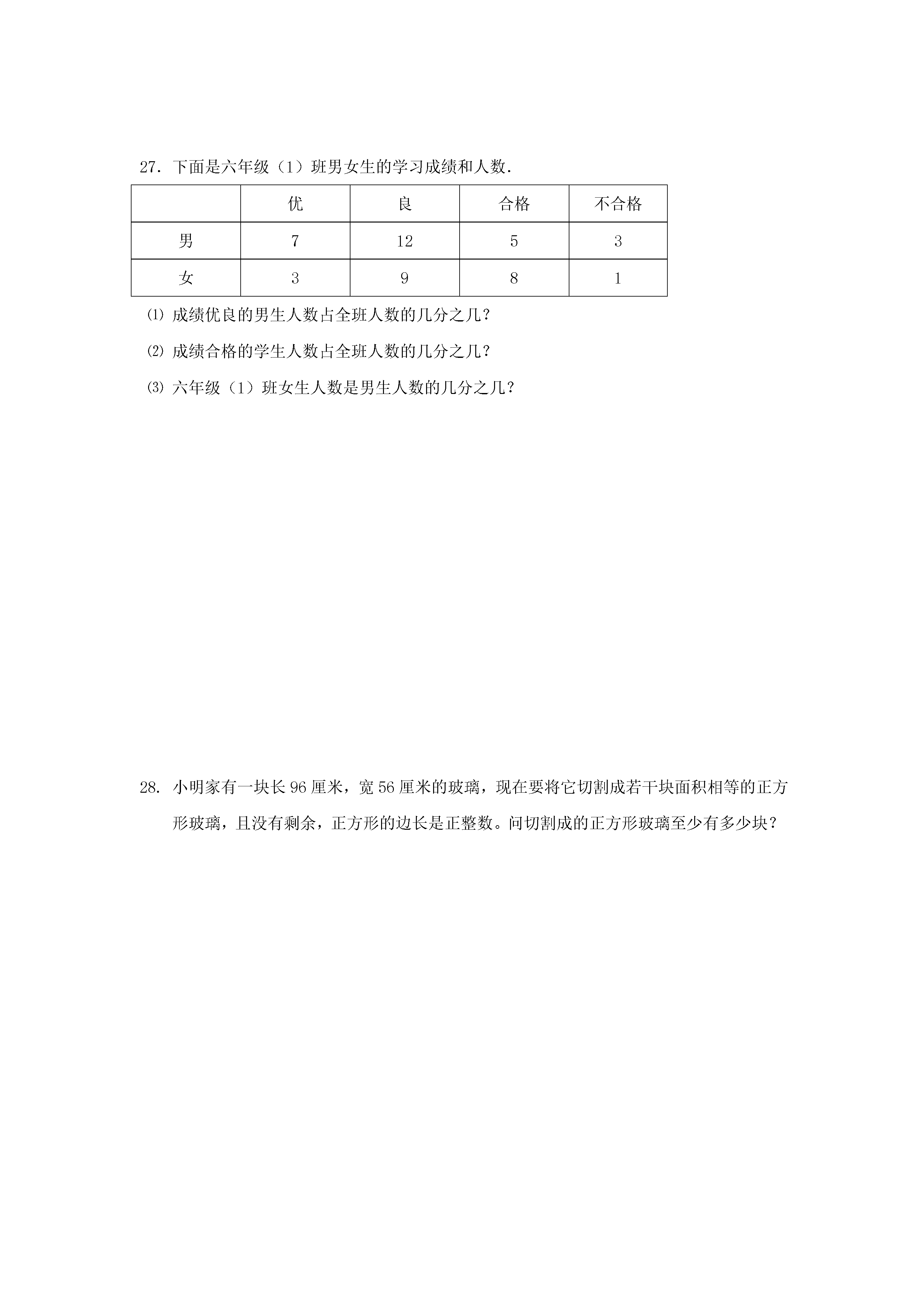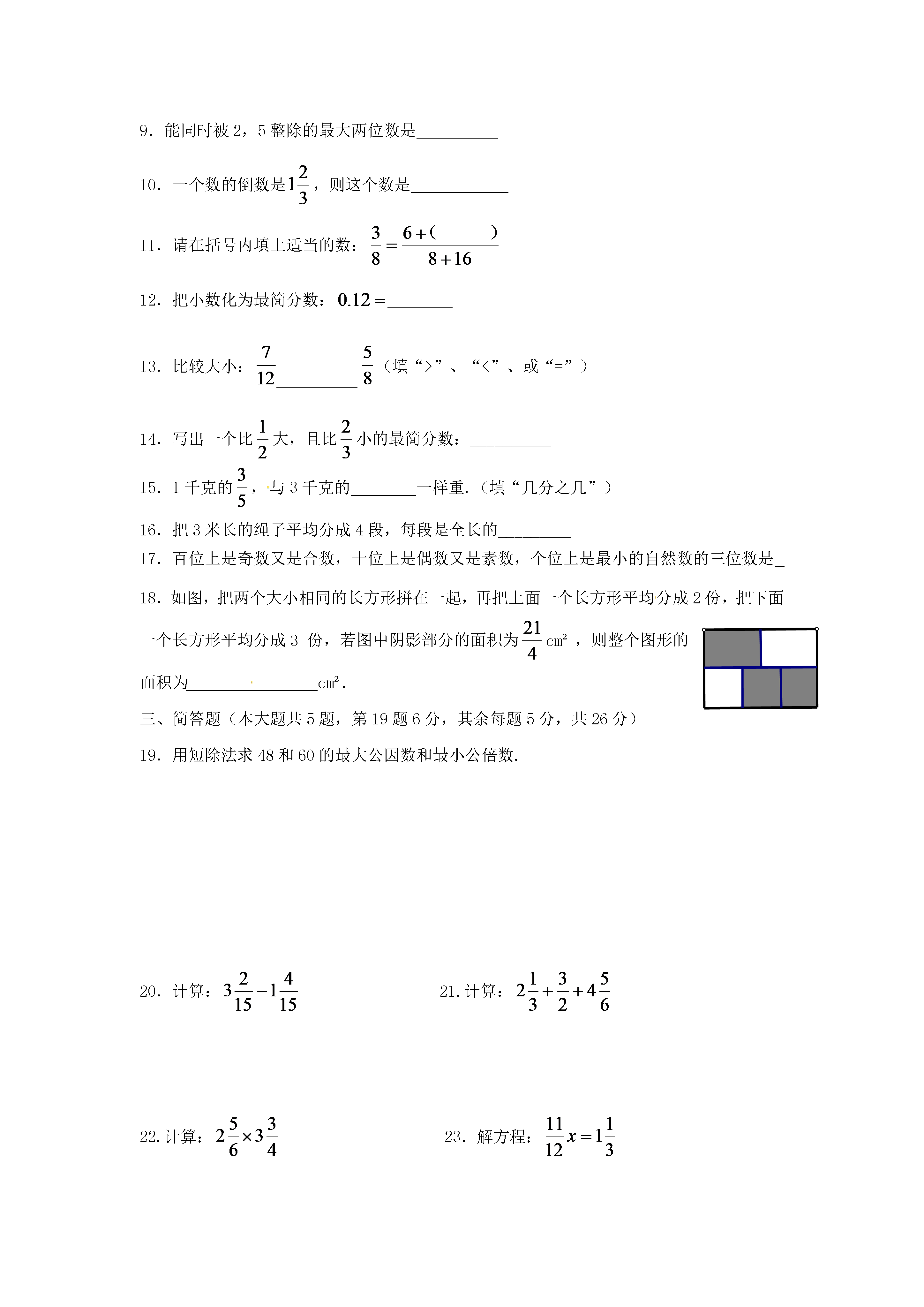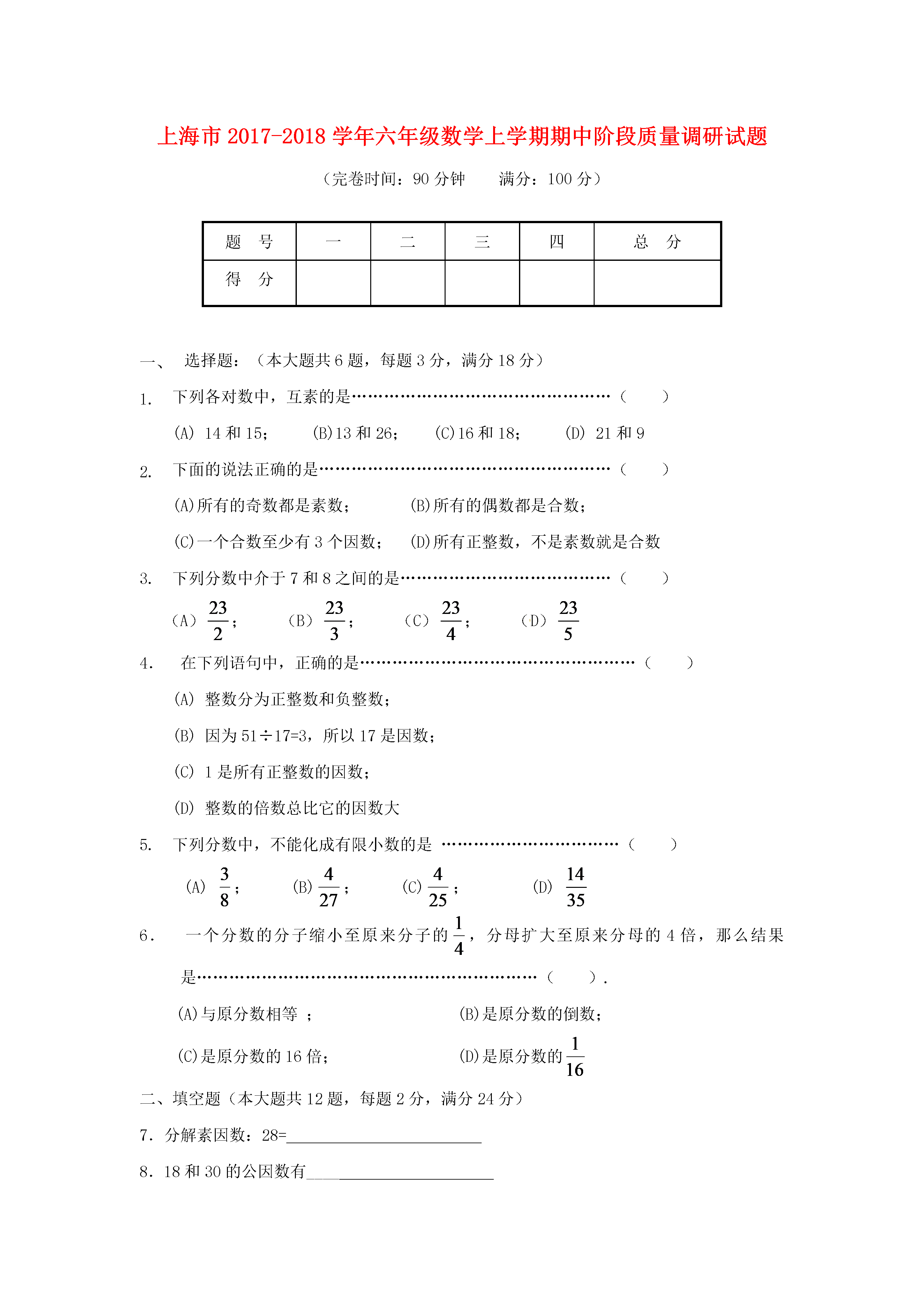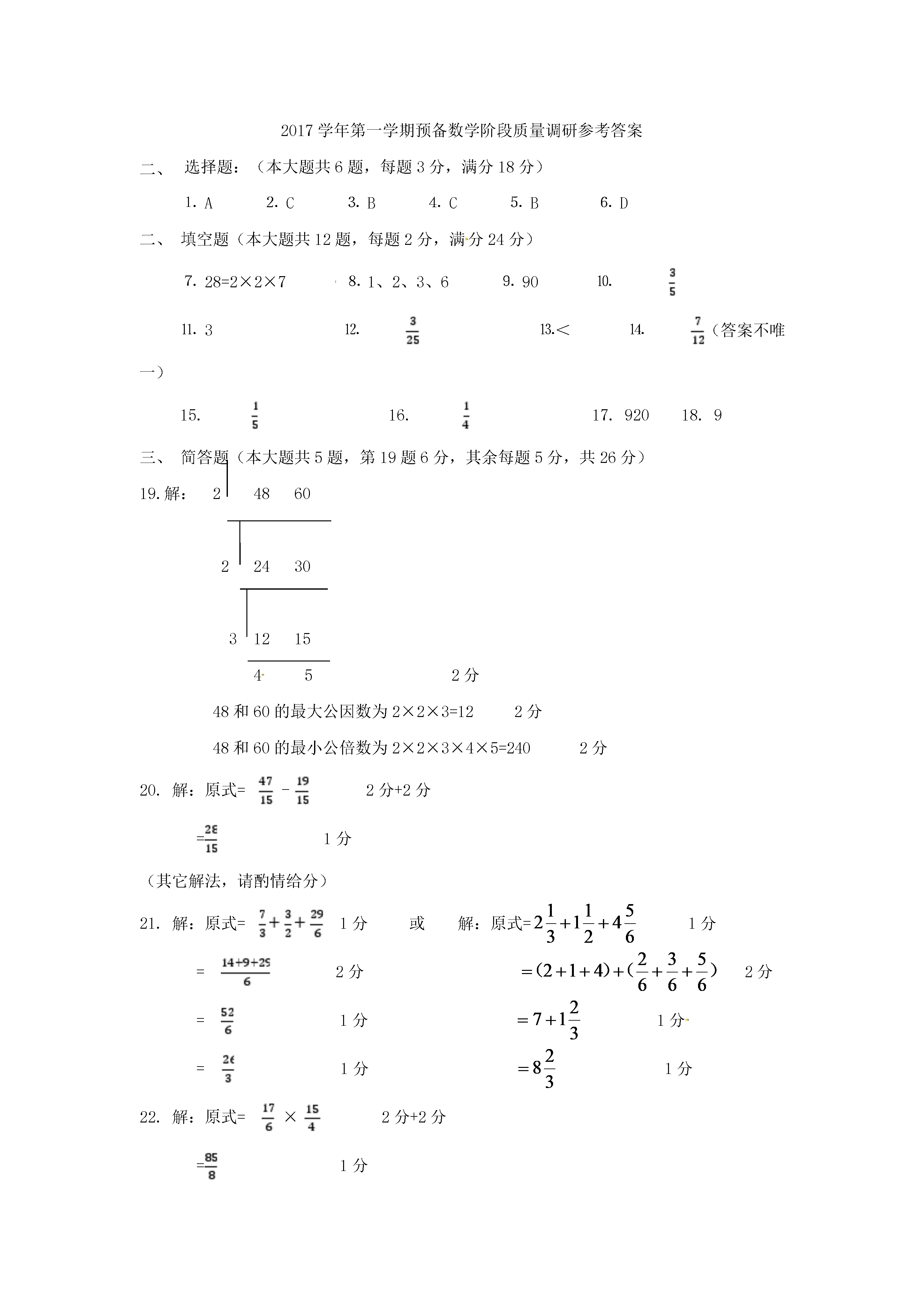 上海市2017-2018学年六年级数学上学期期中阶段质量调研试题(完卷时间:90分钟满分:100分)题号一二三四总分得分选择题:(本大题共6题,每题3分,满分18分)下列各对数中,互素的是…………………………………………()(A)14和15;(B)13和26;(C)16和18;(D)21和9下面的说法正确的是………………………………………………()(A)所有的奇数都是素数;(B)所有的偶数都是合数;(C)一个合数至少有3个因数;(D)所有正整数,不是素数就是合数3.下列分数中介于7和8之间的是…………………………………()(A);(B);(C);(D)4.在下列语句中,正确的是……………………………………………()(A)整数分为正整数和负整数;(B)因为51÷17=3,所以17是因数;(C)1是所有正整数的因数;(D)整数的倍数总比它的因数大5.下列分数中,不能化成有限小数的是……………………………()(A);(B);(C);(D)6.一个分数的分子缩小至原来分子的,分母扩大至原来分母的4倍,那么结果是………………………………………………………().(A)与原分数相等;(B)是原分数的倒数;(C)是原分数的16倍;(D)是原分数的二、填空题(本大题共12题,每题2分,满分24分)7.分解素因数:28=8.18和30的公因数有____9.能同时被2,5整除的最大两位数是10.一个数的倒数是,则这个数是11.请在括号内填上适当的数:12.把小数化为最简分数:13.比较大小:(填“>”、“<”、或“=”)14.写出一个比大,且比小的最简分数:__________15.1千克的,与3千克的一样重.(填“几分之几”)16.把3米长的绳子平均分成4段,每段是全长的_________17.百位上是奇数又是合数,十位上是偶数又是素数,个位上是最小的自然数的三位数是18.如图,把两个大小相同的长方形拼在一起,再把上面一个长方形平均分成2份,把下面一个长方形平均分成3份,若图中阴影部分的面积为cm²,则整个图形的面积为________cm².三、简答题(本大题共5题,第19题6分,其余每题5分,共26分)19.用短除法求48和60的最大公因数和最小公倍数.20.计算:21.计算:22.计算:23.解方程:四、解答题(本大题有5题,5分+6分+6分+8分+7分,共32分)24.⑴数轴上点A表示分数__________,点B表示分数_________,点C表示分数________.⑵在数轴上用点D,点E表示分数,25.已知一个数的等于与的和,求这个数.26.一根铁丝长15米,第一次用去全长的,第二次用去剩下的.问:⑴第一次用后剩下多少米?⑵第二次用后还剩下多少米?27.下面是六年级(1)班男女生的学习成绩和人数.优良合格不合格男71253女3981⑴成绩优良的男生人数占全班人数的几分之几?⑵成绩合格的学生人数占全班人数的几分之几?⑶六年级(1)班女生人数是男生人数的几分之几?28.小明家有一块长96厘米,宽56厘米的玻璃,现在要将它切割成若干块面积相等的正方形玻璃,且没有剩余,正方形的边长是正整数。问切割成的正方形玻璃至少有多少块?2017学年第一学期预备数学阶段质量调研参考答案选择题:(本大题共6题,每题3分,满分18分)⒈A⒉C⒊B⒋C⒌B⒍D二、填空题(本大题共12题,每题2分,满分24分)⒎28=2×2×7⒏1、2、3、6⒐90⒑⒒3⒓⒔<⒕(答案不唯一)15.16.17.92018.9三、简答题(本大题共5题,第19题6分,其余每题5分,共26分)19.解:248602243031215452分48和60的最大公因数为2×2×3=122分48和60的最小公倍数为2×2×3×4×5=2402分20.解:原式=-2分+2分=1分(其它解法,请酌情给分)21.解:原式=1分或解:原式=1分=2分2分=1分1分=1分1分22.解:原式=×2分+2分=1分23.解:X=÷2分X=2分X=1分四、解答题(本大题有5题,5分+6分+6分+8分+7分,共32分)24.A:B:C:D、E略1分+1分+1分+1分+1分_EC_BD_A_3_2_1_025.解:设这个数为x1分x=+2分x=1分X=×1分X=1分所以,这数为(其它解法,请酌情给分)26.解:⑴15×=5(米)1分15-5=10(米)1分答:第一次用后剩下10米.1分⑵(米)1分(米)1分答:第二次用后还剩