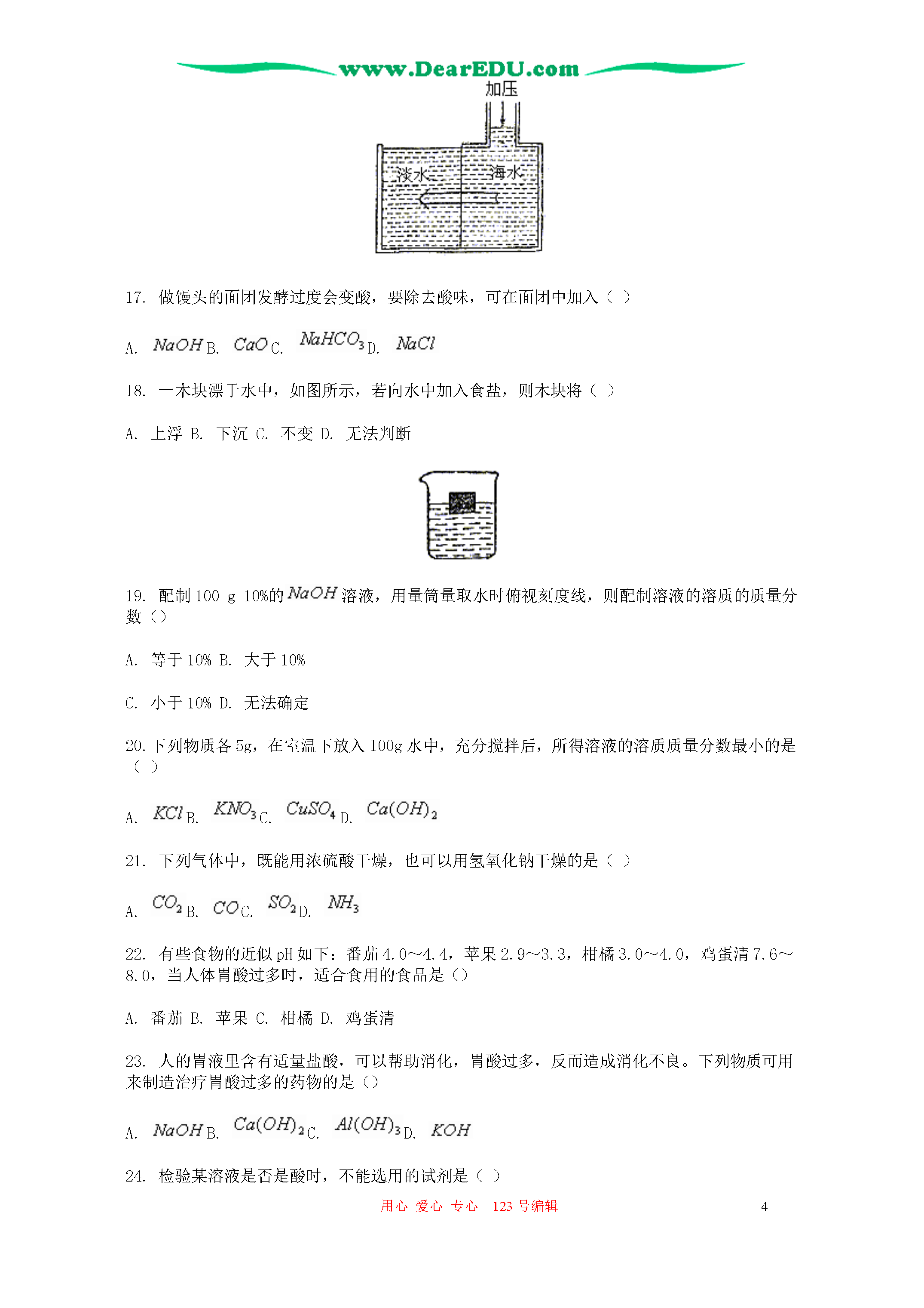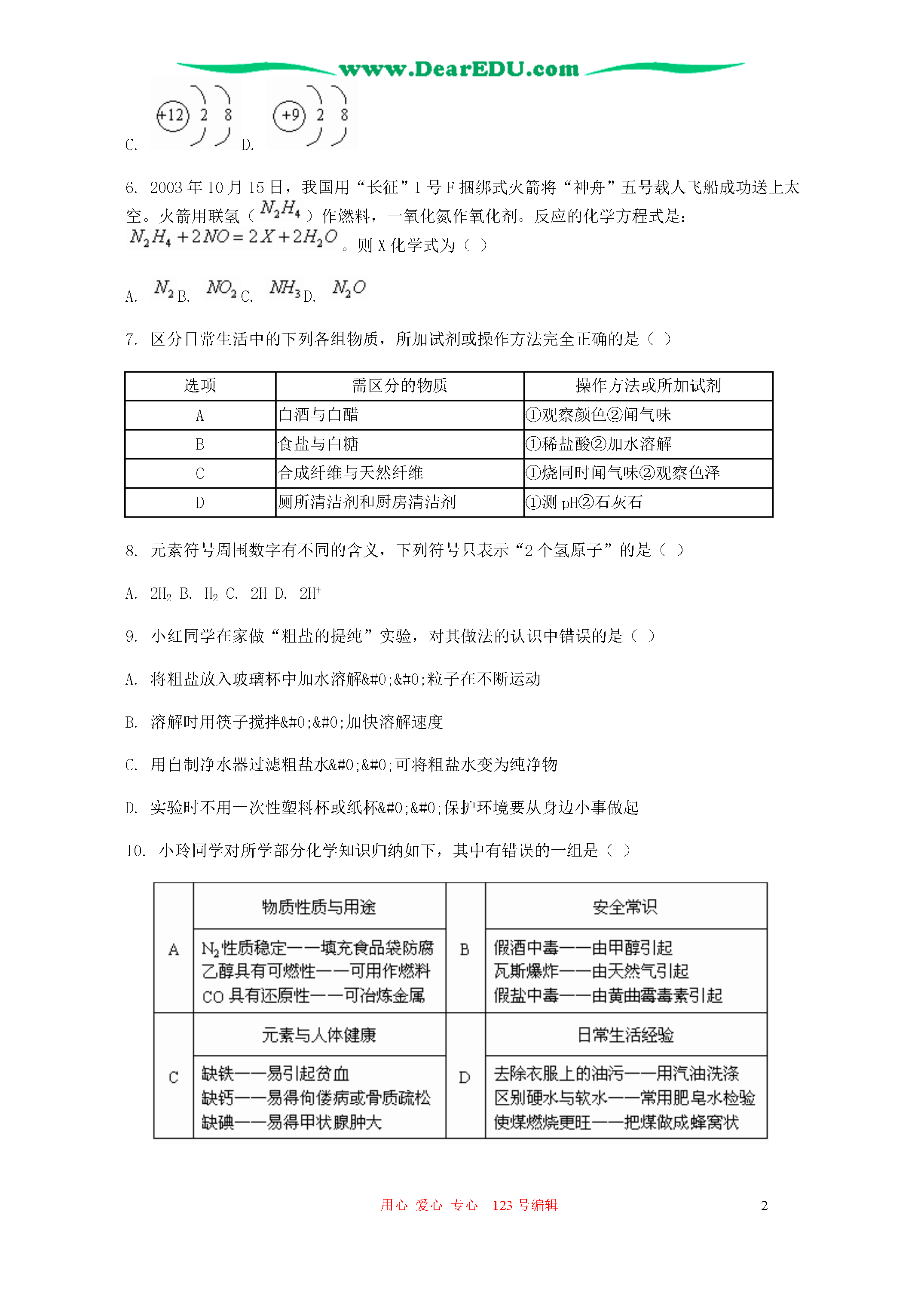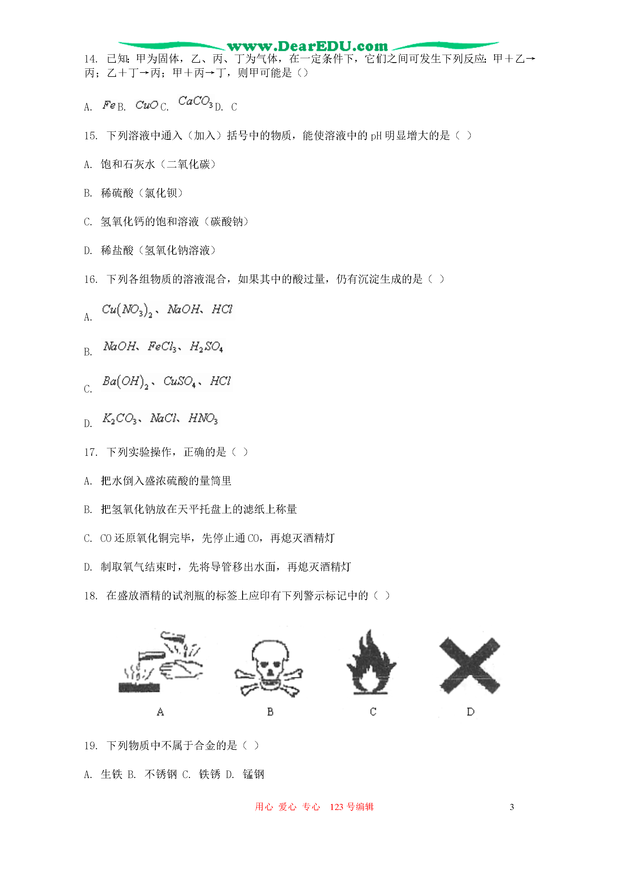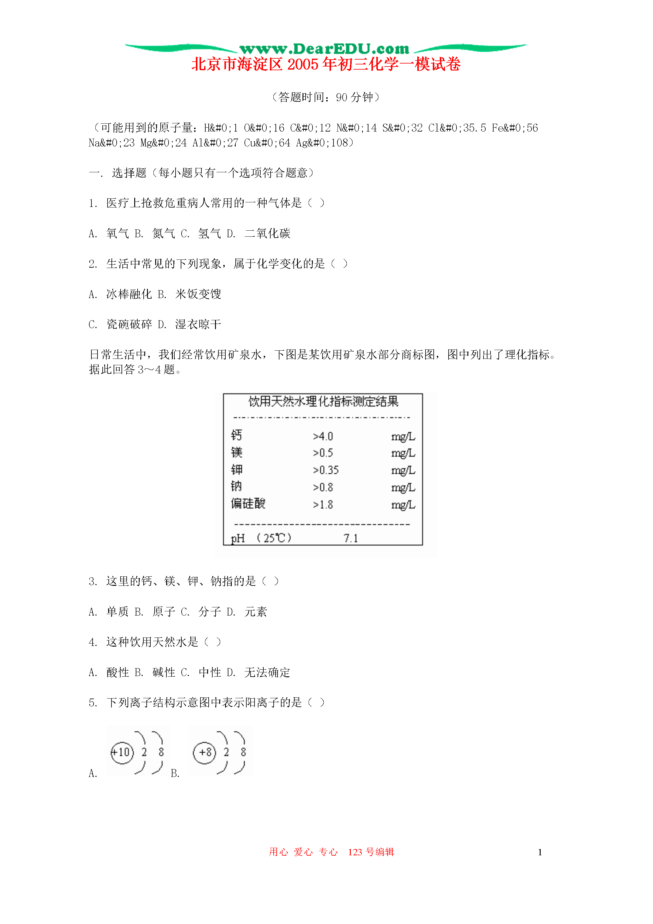 用心爱心专心123号编辑13北京市海淀区2005年初三化学一模试卷(答题时间:90分钟)(可能用到的原子量:H�1O�16C�12N�14S�32Cl�35.5Fe�56Na�23Mg�24Al�27Cu�64Ag�108)一.选择题(每小题只有一个选项符合题意)1.医疗上抢救危重病人常用的一种气体是()A.氧气B.氮气C.氢气D.二氧化碳2.生活中常见的下列现象,属于化学变化的是()A.冰棒融化B.米饭变馊C.瓷碗破碎D.湿衣晾干日常生活中,我们经常饮用矿泉水,下图是某饮用矿泉水部分商标图,图中列出了理化指标。据此回答3~4题。3.这里的钙、镁、钾、钠指的是()A.单质B.原子C.分子D.元素4.这种饮用天然水是()A.酸性B.碱性C.中性D.无法确定5.下列离子结构示意图中表示阳离子的是()A.B.C.D.6.2003年10月15日,我国用“长征”1号F捆绑式火箭将“神舟”五号载人飞船成功送上太空。火箭用联氢()作燃料,一氧化氮作氧化剂。反应的化学方程式是:。则X化学式为()A.B.C.D.7.区分日常生活中的下列各组物质,所加试剂或操作方法完全正确的是()选项需区分的物质操作方法或所加试剂A白酒与白醋①观察颜色②闻气味B食盐与白糖①稀盐酸②加水溶解C合成纤维与天然纤维①烧同时闻气味②观察色泽D厕所清洁剂和厨房清洁剂①测pH②石灰石8.元素符号周围数字有不同的含义,下列符号只表示“2个氢原子”的是()A.2H2B.H2C.2HD.2H+9.小红同学在家做“粗盐的提纯”实验,对其做法的认识中错误的是()A.将粗盐放入玻璃杯中加水溶解��粒子在不断运动B.溶解时用筷子搅拌��加快溶解速度C.用自制净水器过滤粗盐水��可将粗盐水变为纯净物D.实验时不用一次性塑料杯或纸杯��保护环境要从身边小事做起10.小玲同学对所学部分化学知识归纳如下,其中有错误的一组是()11.一种新兴的金属由于其密度小、延展性好、耐腐蚀性强,它和它的合金在航空、航海和化学工业中正逐步取代铝和铝的合金而被广泛应用,该金属是()A.铜B.锌C.钛D.锰12.“垃圾是放错了位置的资源”,应该分类回收。生活中废弃的铁锅、铝制易拉罐、铜导线可以归为一类加以回收,因为它们属于()A.氧化物B.化合物C.混合物D.金属或合金13.我们常说“真金不怕火炼”的原因是()A.金的熔点高B.金的硬度大C.金的密度大D.金不活泼,高温时也不与氧气反应14.相同质量的镁和铝分别与足量的稀盐酸充分反应,其结果是()A.镁反应生成的氢气的质量大B.铝反应生成的氢气的质量大C.铝和镁反应生成的氢气一样多D.无法比较生成氢气的质量15.为验证铁、铜、铝三种金属的活动性顺序,可选用的一组物质是()A.溶液、溶液B.溶液、、溶液C.溶液、D.溶液、16.海水淡化可采用膜分离技术,如图所示,对淡化膜右侧的海水加压,水分子可以透过淡化膜进入左侧淡化池,而海水中的各种离子不能通过淡化膜,从而得到淡水。对加压后右侧海水成分变化进行分析,正确的是()A.溶质的质量增加B.溶剂的质量减少C.溶液的质量不变D.以上三种情况都有可能17.做馒头的面团发酵过度会变酸,要除去酸味,可在面团中加入()A.B.C.D.18.一木块漂于水中,如图所示,若向水中加入食盐,则木块将()A.上浮B.下沉C.不变D.无法判断19.配制100g10%的溶液,用量筒量取水时俯视刻度线,则配制溶液的溶质的质量分数()A.等于10%B.大于10%C.小于10%D.无法确定20.下列物质各5g,在室温下放入100g水中,充分搅拌后,所得溶液的溶质质量分数最小的是()A.B.C.D.21.下列气体中,既能用浓硫酸干燥,也可以用氢氧化钠干燥的是()A.B.C.D.22.有些食物的近似pH如下:番茄4.0~4.4,苹果2.9~3.3,柑橘3.0~4.0,鸡蛋清7.6~8.0,当人体胃酸过多时,适合食用的食品是()A.番茄B.苹果C.柑橘D.鸡蛋清23.人的胃液里含有适量盐酸,可以帮助消化,胃酸过多,反而造成消化不良。下列物质可用来制造治疗胃酸过多的药物的是()A.B.C.D.24.检验某溶液是否是酸时,不能选用的试剂是()A.无色酚酞试液B.紫色石蕊试液C.碳酸钠溶液D.锌粒25.有关下列物质的用途不正确的是()A.建筑业上利用熟石灰制三合土或砌砖、抹墙B.氢氧化钠可用于制肥皂和造纸业C.利用硫酸溶液来干燥氢气D.利用盐酸除去金属表面的锈26.在我国某地曾发生把白色的工业用盐误作食盐的中毒事件,这种工业用盐可能含有()A.B.C.D.27.玻璃棒不可用来()A.蘸取溶液测定其酸碱度B.过滤时引流液体注入漏斗C.搅拌漏斗中的悬