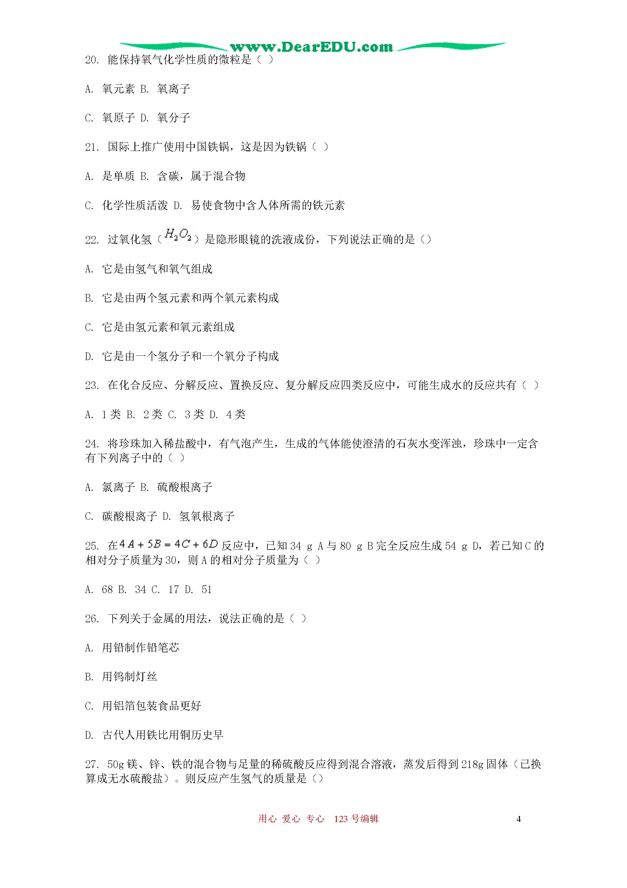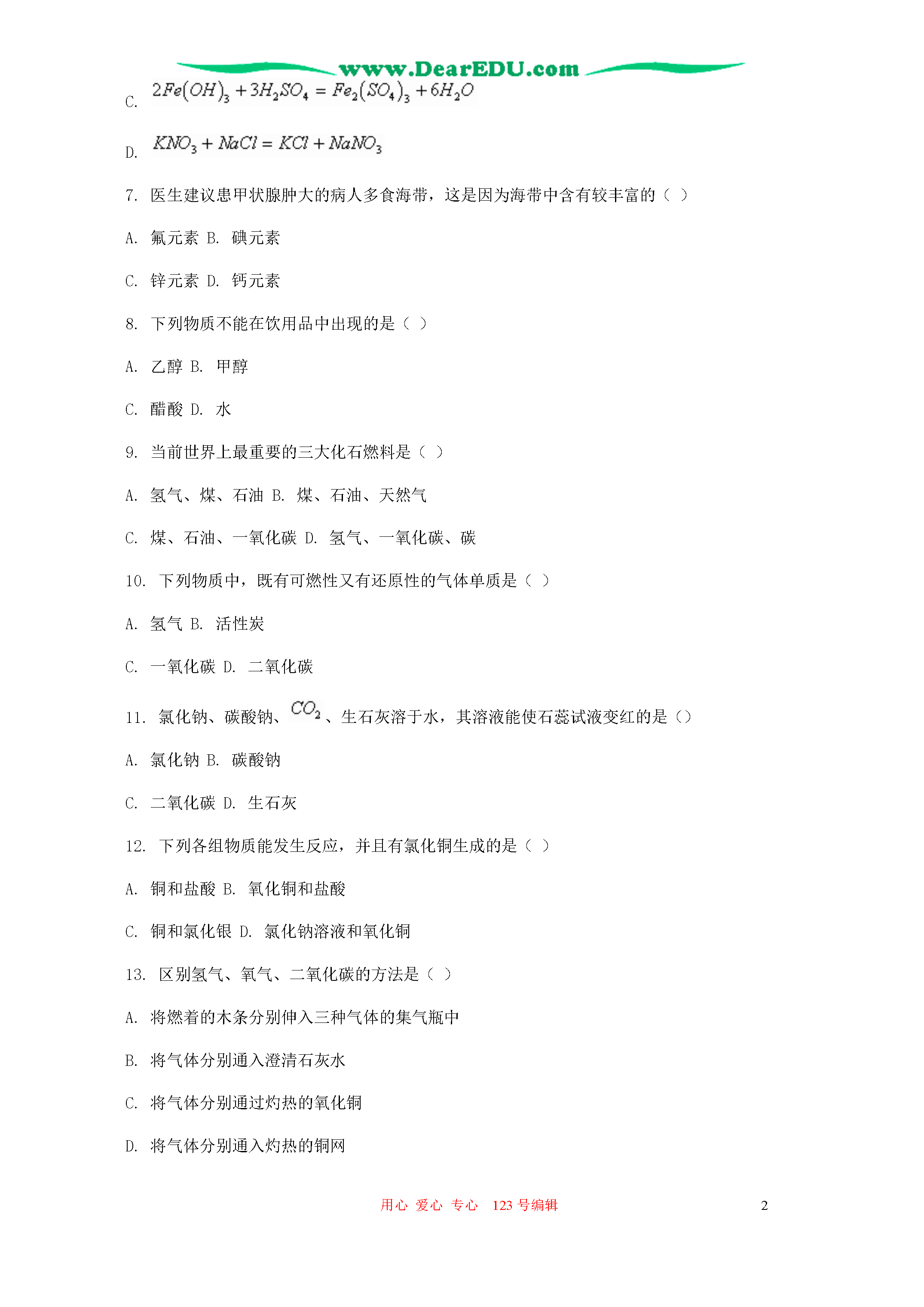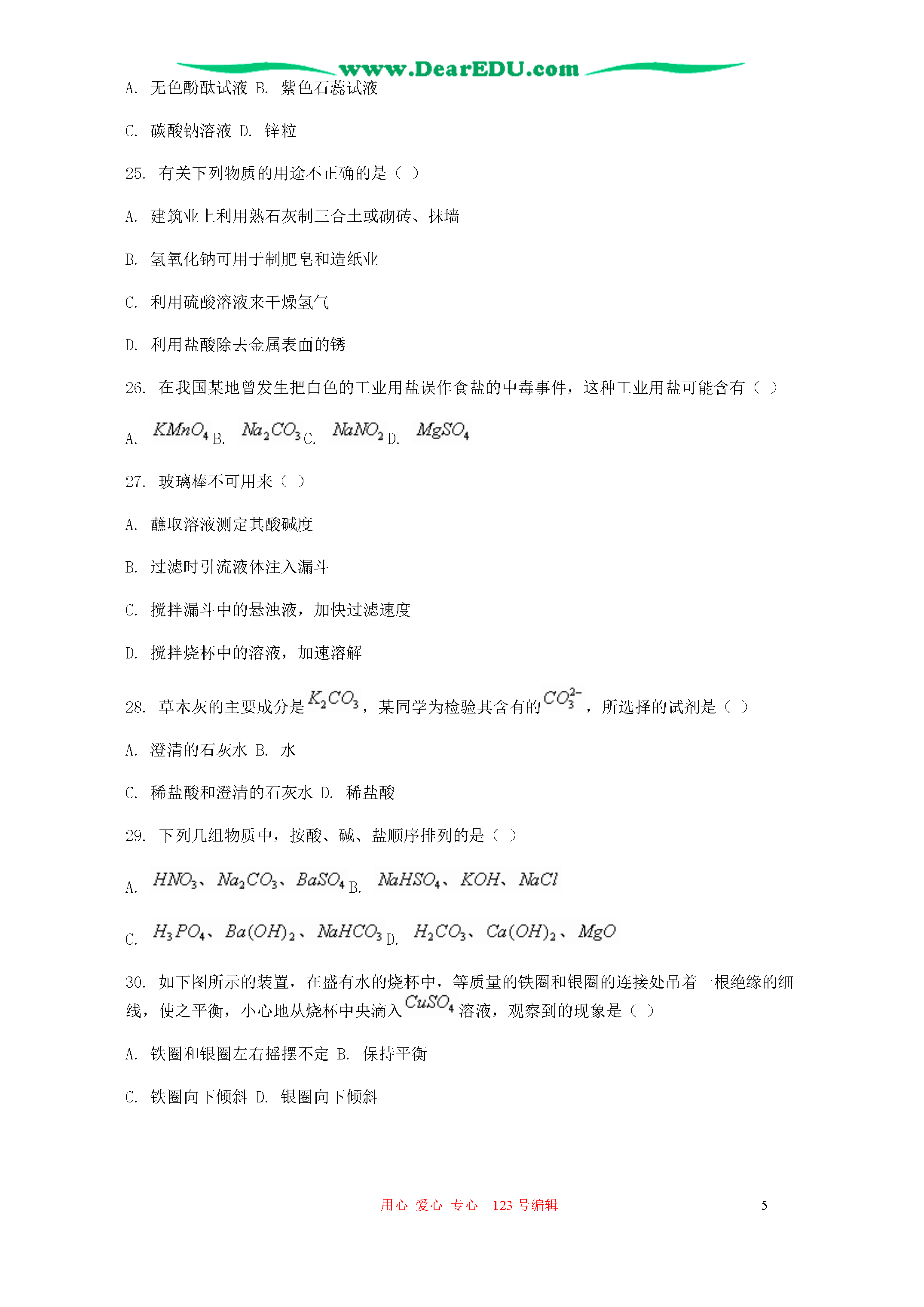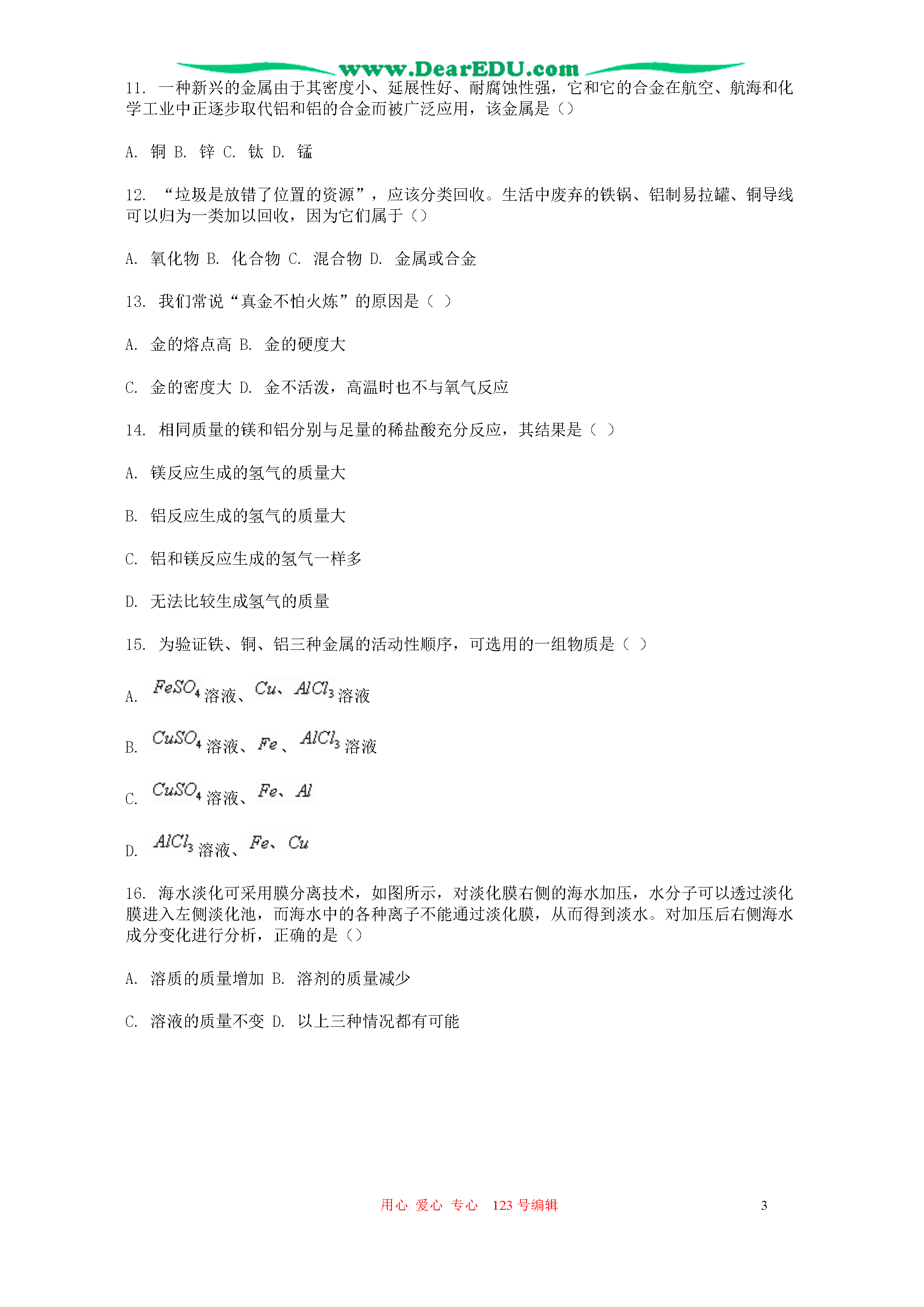 用心爱心专心123号编辑13北京市海淀区2005年初三化学一模试卷(答题时间:90分钟)(可能用到的原子量:H�1O�16C�12N�14S�32Cl�35.5Fe�56Na�23Mg�24Al�27Cu�64Ag�108)一.选择题(每小题只有一个选项符合题意)1.医疗上抢救危重病人常用的一种气体是()A.氧气B.氮气C.氢气D.二氧化碳2.生活中常见的下列现象,属于化学变化的是()A.冰棒融化B.米饭变馊C.瓷碗破碎D.湿衣晾干日常生活中,我们经常饮用矿泉水,下图是某饮用矿泉水部分商标图,图中列出了理化指标。据此回答3~4题。3.这里的钙、镁、钾、钠指的是()A.单质B.原子C.分子D.元素4.这种饮用天然水是()A.酸性B.碱性C.中性D.无法确定5.下列离子结构示意图中表示阳离子的是()A.B.C.D.6.2003年10月15日,我国用“长征”1号F捆绑式火箭将“神舟”五号载人飞船成功送上太空。火箭用联氢()作燃料,一氧化氮作氧化剂。反应的化学方程式是:。则X化学式为()A.B.C.D.7.区分日常生活中的下列各组物质,所加试剂或操作方法完全正确的是()选项需区分的物质操作方法或所加试剂A白酒与白醋①观察颜色②闻气味B食盐与白糖①稀盐酸②加水溶解C合成纤维与天然纤维①烧同时闻气味②观察色泽D厕所清洁剂和厨房清洁剂①测pH②石灰石8.元素符号周围数字有不同的含义,下列符号只表示“2个氢原子”的是()A.2H2B.H2C.2HD.2H+9.小红同学在家做“粗盐的提纯”实验,对其做法的认识中错误的是()A.将粗盐放入玻璃杯中加水溶解��粒子在不断运动B.溶解时用筷子搅拌��加快溶解速度C.用自制净水器过滤粗盐水��可将粗盐水变为纯净物D.实验时不用一次性塑料杯或纸杯��保护环境要从身边小事做起10.小玲同学对所学部分化学知识归纳如下,其中有错误的一组是()11.一种新兴的金属由于其密度小、延展性好、耐腐蚀性强,它和它的合金在航空、航海和化学工业中正逐步取代铝和铝的合金而被广泛应用,该金属是()A.铜B.锌C.钛D.锰12.“垃圾是放错了位置的资源”,应该分类回收。生活中废弃的铁锅、铝制易拉罐、铜导线可以归为一类加以回收,因为它们属于()A.氧化物B.化合物C.混合物D.金属或合金13.我们常说“真金不怕火炼”的原因是()A.金的熔点高B.金的硬度大C.金的密度大D.金不活泼,高温时也不与氧气反应14.相同质量的镁和铝分别与足量的稀盐酸充分反应,其结果是()A.镁反应生成的氢气的质量大B.铝反应生成的氢气的质量大C.铝和镁反应生成的氢气一样多D.无法比较生成氢气的质量15.为验证铁、铜、铝三种金属的活动性顺序,可选用的一组物质是()A.溶液、溶液B.溶液、、溶液C.溶液、D.溶液、16.海水淡化可采用膜分离技术,如图所示,对淡化膜右侧的海水加压,水分子可以透过淡化膜进入左侧淡化池,而海水中的各种离子不能通过淡化膜,从而得到淡水。对加压后右侧海水成分变化进行分析,正确的是()A.溶质的质量增加B.溶剂的质量减少C.溶液的质量不变D.以上三种情况都有可能17.做馒头的面团发酵过度会变酸,要除去酸味,可在面团中加入()A.B.C.D.18.一木块漂于水中,如图所示,若向水中加入食盐,则木块将()A.上浮B.下沉C.不变D.无法判断19.配制100g10%的溶液,用量筒量取水时俯视刻度线,则配制溶液的溶质的质量分数()A.等于10%B.大于10%C.小于10%D.无法确定20.下列物质各5g,在室温下放入100g水中,充分搅拌后,所得溶液的溶质质量分数最小的是()A.B.C.D.21.下列气体中,既能用浓硫酸干燥,也可以用氢氧化钠干燥的是()A.B.C.D.22.有些食物的近似pH如下:番茄4.0~4.4,苹果2.9~3.3,柑橘3.0~4.0,鸡蛋清7.6~8.0,当人体胃酸过多时,适合食用的食品是()A.番茄B.苹果C.柑橘D.鸡蛋清23.人的胃液里含有适量盐酸,可以帮助消化,胃酸过多,反而造成消化不良。下列物质可用来制造治疗胃酸过多的药物的是()A.B.C.D.24.检验某溶液是否是酸时,不能选用的试剂是()A.无色酚酞试液B.紫色石蕊试液C.碳酸钠溶液D.锌粒25.有关下列物质的用途不正确的是()A.建筑业上利用熟石灰制三合土或砌砖、抹墙B.氢氧化钠可用于制肥皂和造纸业C.利用硫酸溶液来干燥氢气D.利用盐酸除去金属表面的锈26.在我国某地曾发生把白色的工业用盐误作食盐的中毒事件,这种工业用盐可能含有()A.B.C.D.27.玻璃棒不可用来()A.蘸取溶液测定其酸碱度B.过滤时引流液体注入漏斗C.搅拌漏斗中的悬