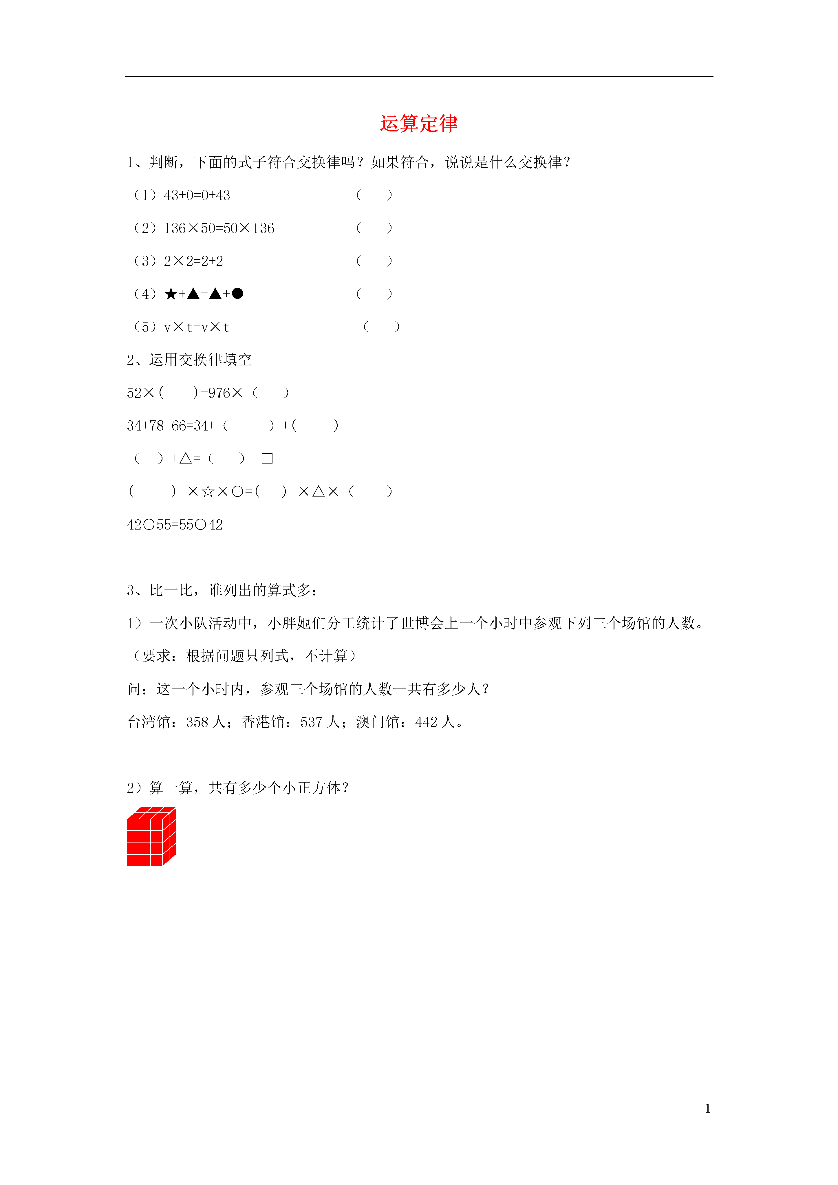 1运算定律1、判断,下面的式子符合交换律吗?如果符合,说说是什么交换律?(1)43+0=0+43()(2)136×50=50×136()(3)2×2=2+2()(4)★+▲=▲+●()(5)v×t=v×t()2、运用交换律填空52×()=976×()34+78+66=34+()+()()+△=()+□()×☆×○=()×△×()42○55=55○423、比一比,谁列出的算式多:1)一次小队活动中,小胖她们分工统计了世博会上一个小时中参观下列三个场馆的人数。(要求:根据问题只列式,不计算)问:这一个小时内,参观三个场馆的人数一共有多少人?台湾馆:358人;香港馆:537人;澳门馆:442人。2)算一算,共有多少个小正方体?