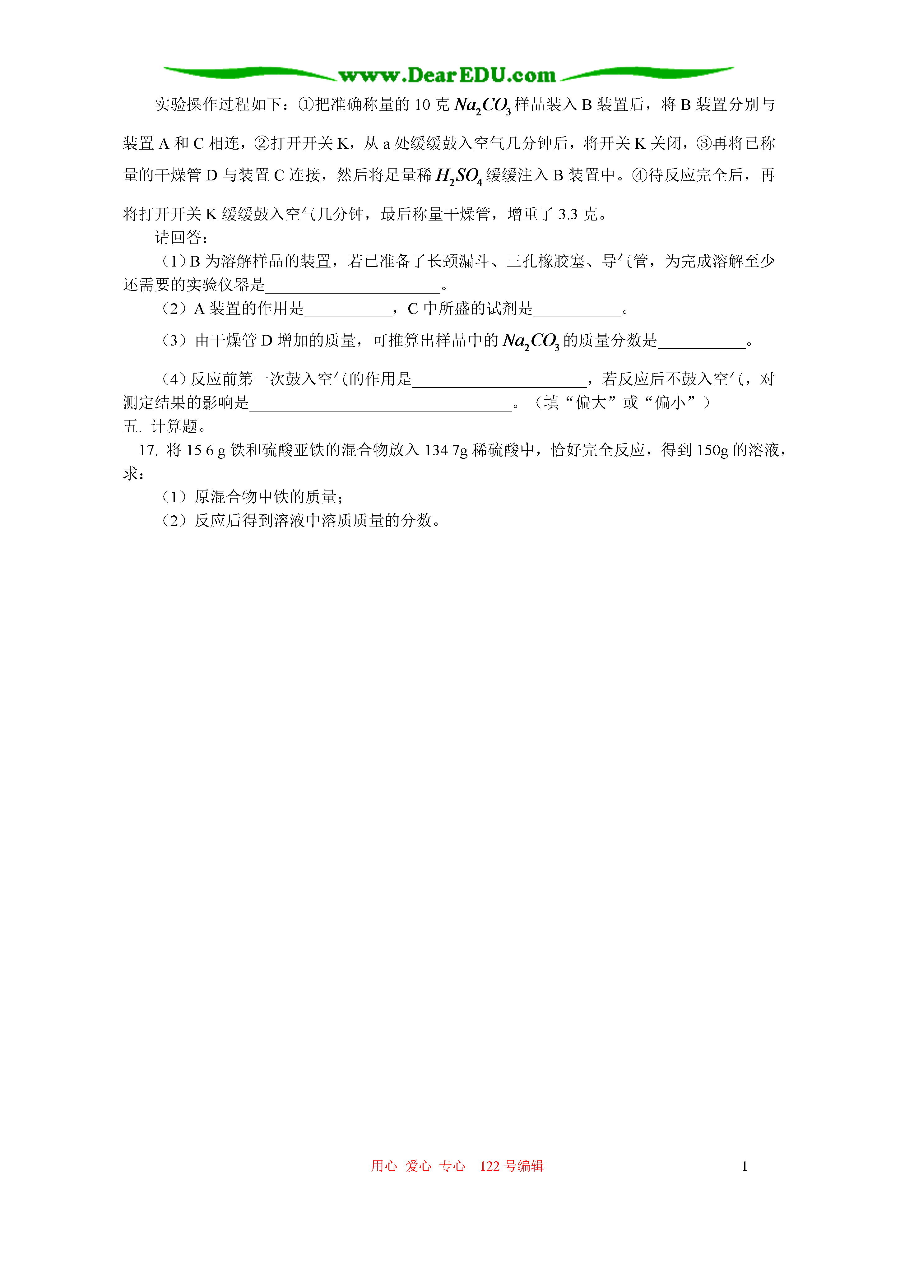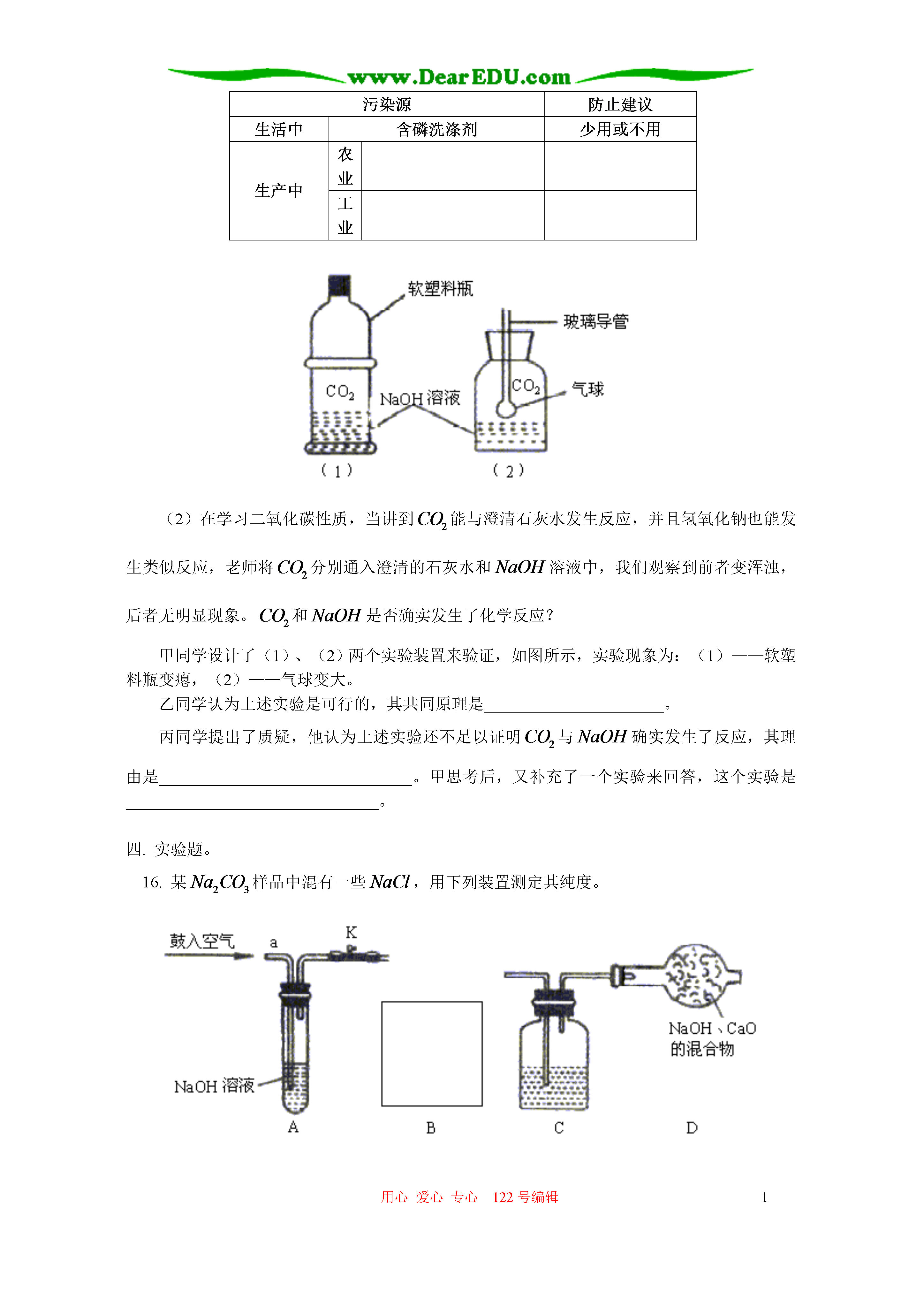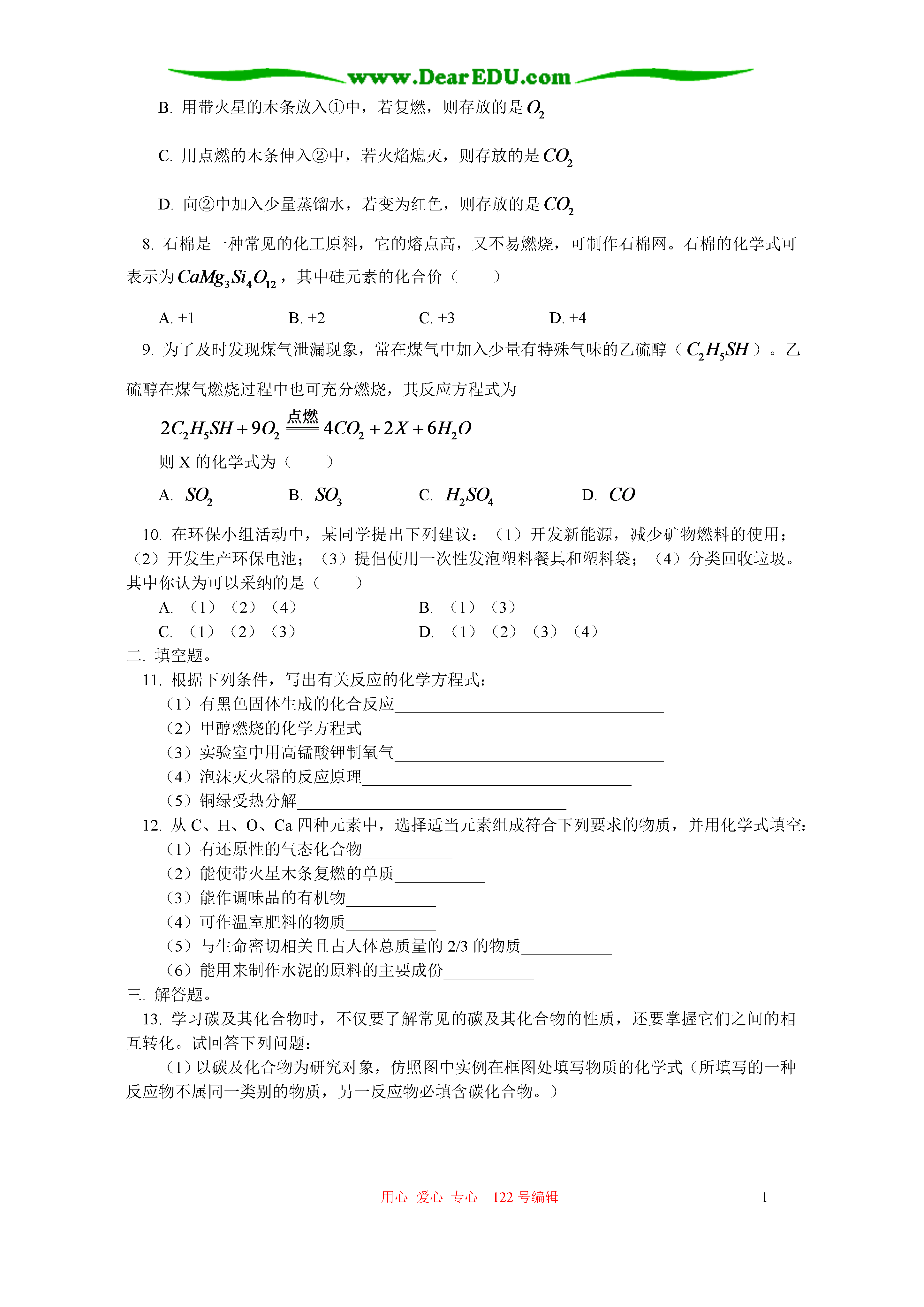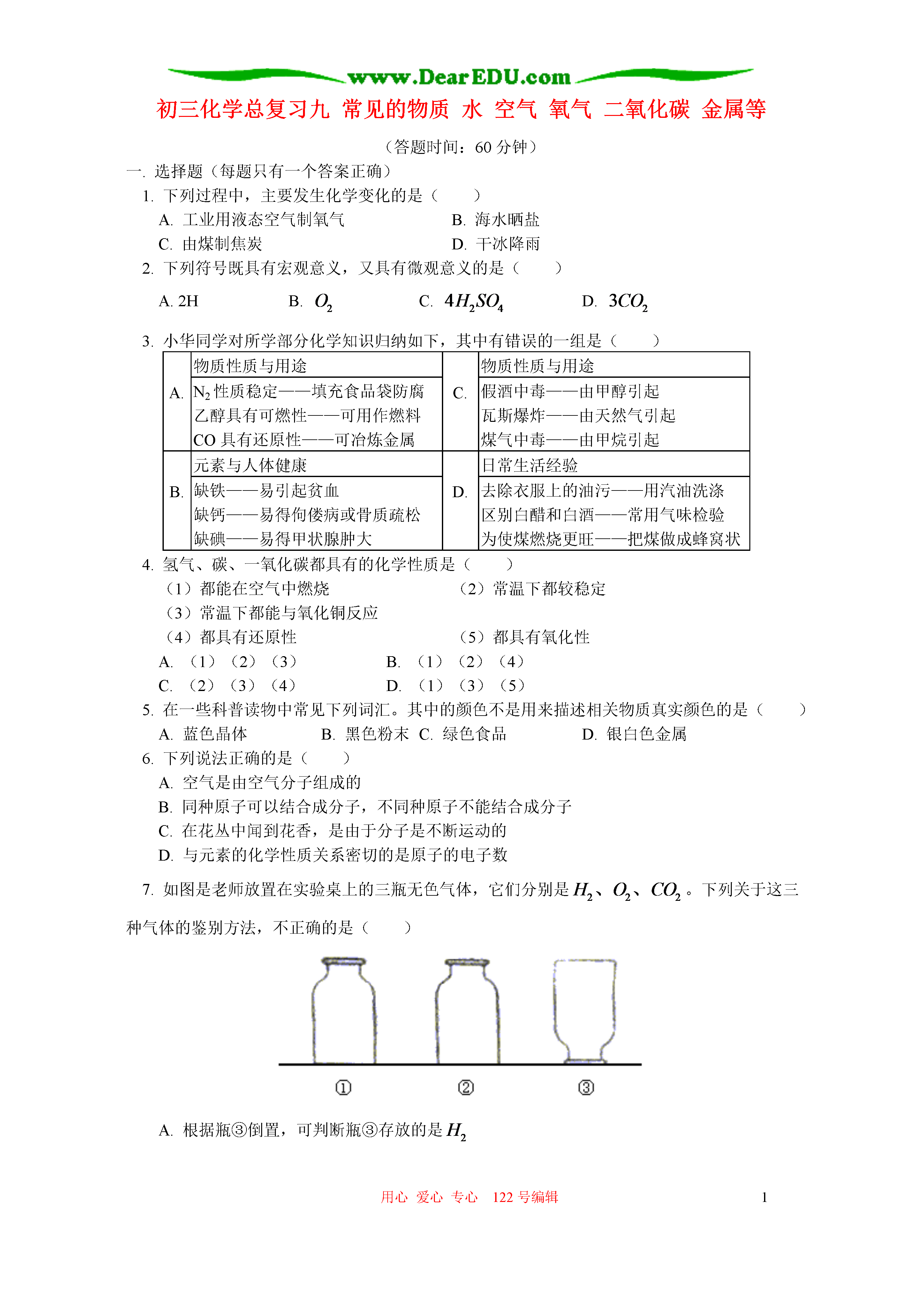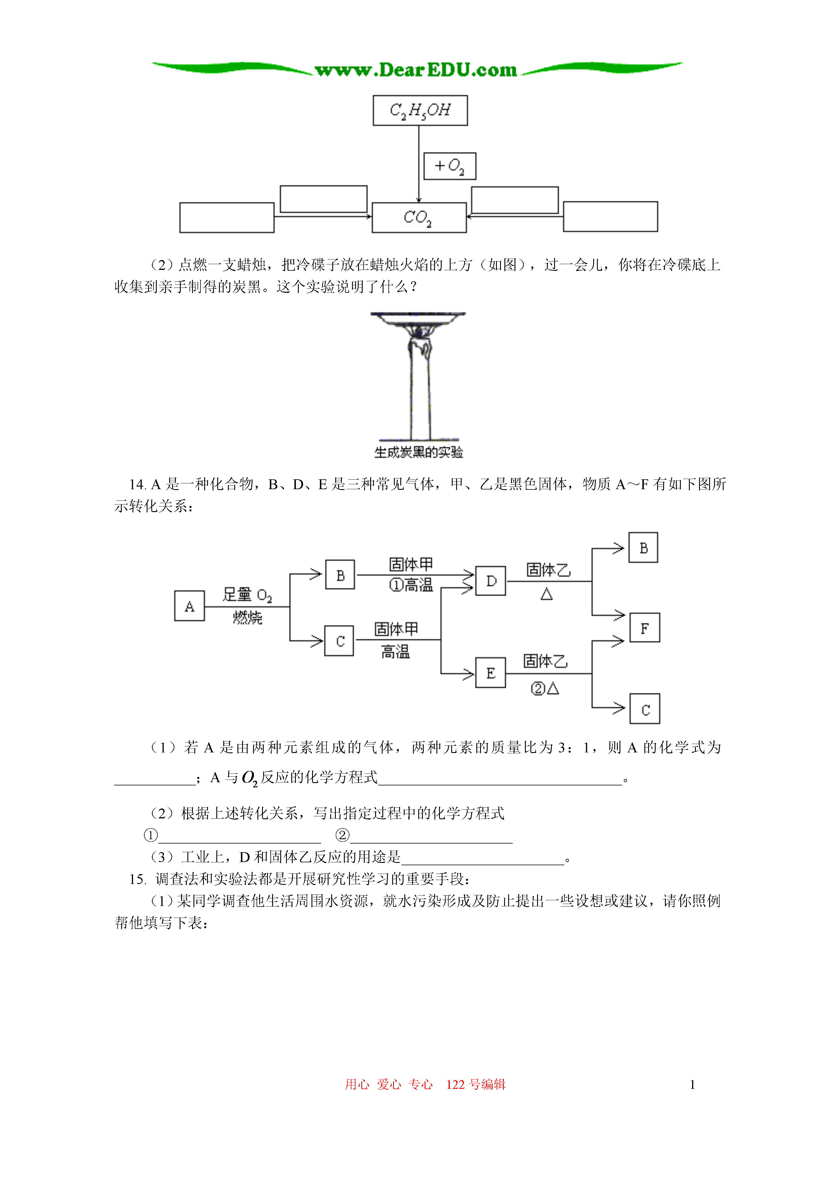 用心爱心专心122号编辑1初三化学总复习九常见的物质水空气氧气二氧化碳金属等(答题时间:60分钟)一.选择题(每题只有一个答案正确)1.下列过程中,主要发生化学变化的是()A.工业用液态空气制氧气B.海水晒盐C.由煤制焦炭D.干冰降雨2.下列符号既具有宏观意义,又具有微观意义的是()A.2HB.C.D.3.小华同学对所学部分化学知识归纳如下,其中有错误的一组是()物质性质与用途物质性质与用途A.N2性质稳定——填充食品袋防腐乙醇具有可燃性——可用作燃料CO具有还原性——可冶炼金属C.假酒中毒——由甲醇引起瓦斯爆炸——由天然气引起煤气中毒——由甲烷引起元素与人体健康日常生活经验B.缺铁——易引起贫血缺钙——易得佝偻病或骨质疏松缺碘——易得甲状腺肿大D.去除衣服上的油污——用汽油洗涤区别白醋和白酒——常用气味检验为使煤燃烧更旺——把煤做成蜂窝状4.氢气、碳、一氧化碳都具有的化学性质是()(1)都能在空气中燃烧(2)常温下都较稳定(3)常温下都能与氧化铜反应(4)都具有还原性(5)都具有氧化性A.(1)(2)(3)B.(1)(2)(4)C.(2)(3)(4)D.(1)(3)(5)5.在一些科普读物中常见下列词汇。其中的颜色不是用来描述相关物质真实颜色的是()A.蓝色晶体B.黑色粉末C.绿色食品D.银白色金属6.下列说法正确的是()A.空气是由空气分子组成的B.同种原子可以结合成分子,不同种原子不能结合成分子C.在花丛中闻到花香,是由于分子是不断运动的D.与元素的化学性质关系密切的是原子的电子数7.如图是老师放置在实验桌上的三瓶无色气体,它们分别是。下列关于这三种气体的鉴别方法,不正确的是()A.根据瓶③倒置,可判断瓶③存放的是B.用带火星的木条放入①中,若复燃,则存放的是C.用点燃的木条伸入②中,若火焰熄灭,则存放的是D.向②中加入少量蒸馏水,若变为红色,则存放的是8.石棉是一种常见的化工原料,它的熔点高,又不易燃烧,可制作石棉网。石棉的化学式可表示为,其中硅元素的化合价()A.+1B.+2C.+3D.+49.为了及时发现煤气泄漏现象,常在煤气中加入少量有特殊气味的乙硫醇()。乙硫醇在煤气燃烧过程中也可充分燃烧,其反应方程式为则X的化学式为()A.B.C.D.10.在环保小组活动中,某同学提出下列建议:(1)开发新能源,减少矿物燃料的使用;(2)开发生产环保电池;(3)提倡使用一次性发泡塑料餐具和塑料袋;(4)分类回收垃圾。其中你认为可以采纳的是()A.(1)(2)(4)B.(1)(3)C.(1)(2)(3)D.(1)(2)(3)(4)二.填空题。11.根据下列条件,写出有关反应的化学方程式:(1)有黑色固体生成的化合反应_________________________________(2)甲醇燃烧的化学方程式_________________________________(3)实验室中用高锰酸钾制氧气_________________________________(4)泡沫灭火器的反应原理_________________________________(5)铜绿受热分解_________________________________12.从C、H、O、Ca四种元素中,选择适当元素组成符合下列要求的物质,并用化学式填空:(1)有还原性的气态化合物___________(2)能使带火星木条复燃的单质___________(3)能作调味品的有机物___________(4)可作温室肥料的物质___________(5)与生命密切相关且占人体总质量的2/3的物质___________(6)能用来制作水泥的原料的主要成份___________三.解答题。13.学习碳及其化合物时,不仅要了解常见的碳及其化合物的性质,还要掌握它们之间的相互转化。试回答下列问题:(1)以碳及化合物为研究对象,仿照图中实例在框图处填写物质的化学式(所填写的一种反应物不属同一类别的物质,另一反应物必填含碳化合物。)(2)点燃一支蜡烛,把冷碟子放在蜡烛火焰的上方(如图),过一会儿,你将在冷碟底上收集到亲手制得的炭黑。这个实验说明了什么?14.A是一种化合物,B、D、E是三种常见气体,甲、乙是黑色固体,物质A~F有如下图所示转化关系:(1)若A是由两种元素组成的气体,两种元素的质量比为3:1,则A的化学式为___________;A与反应的化学方程式_________________________________。(2)根据上述转化关系,写出指定过程中的化学方程式①______________________②___
