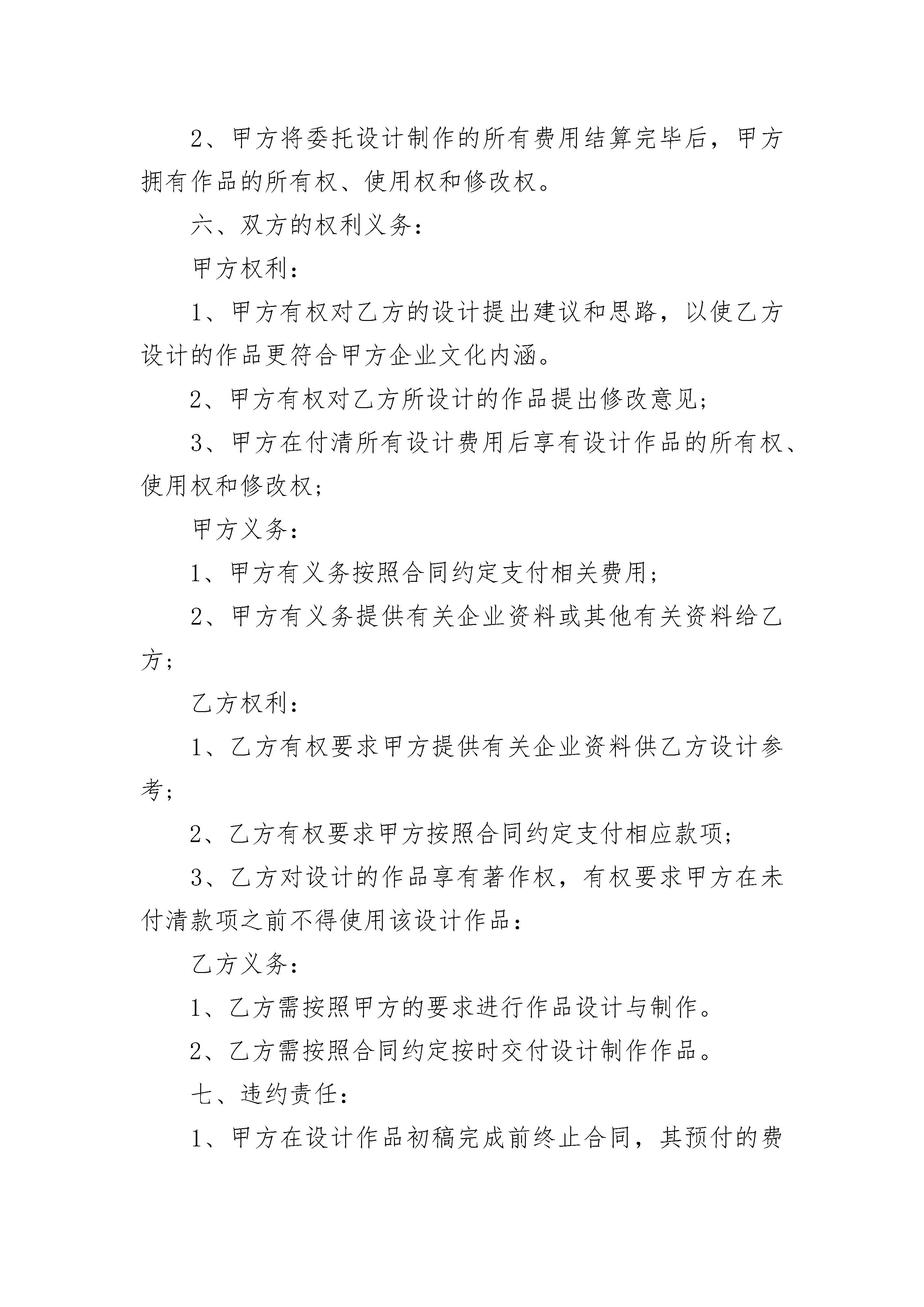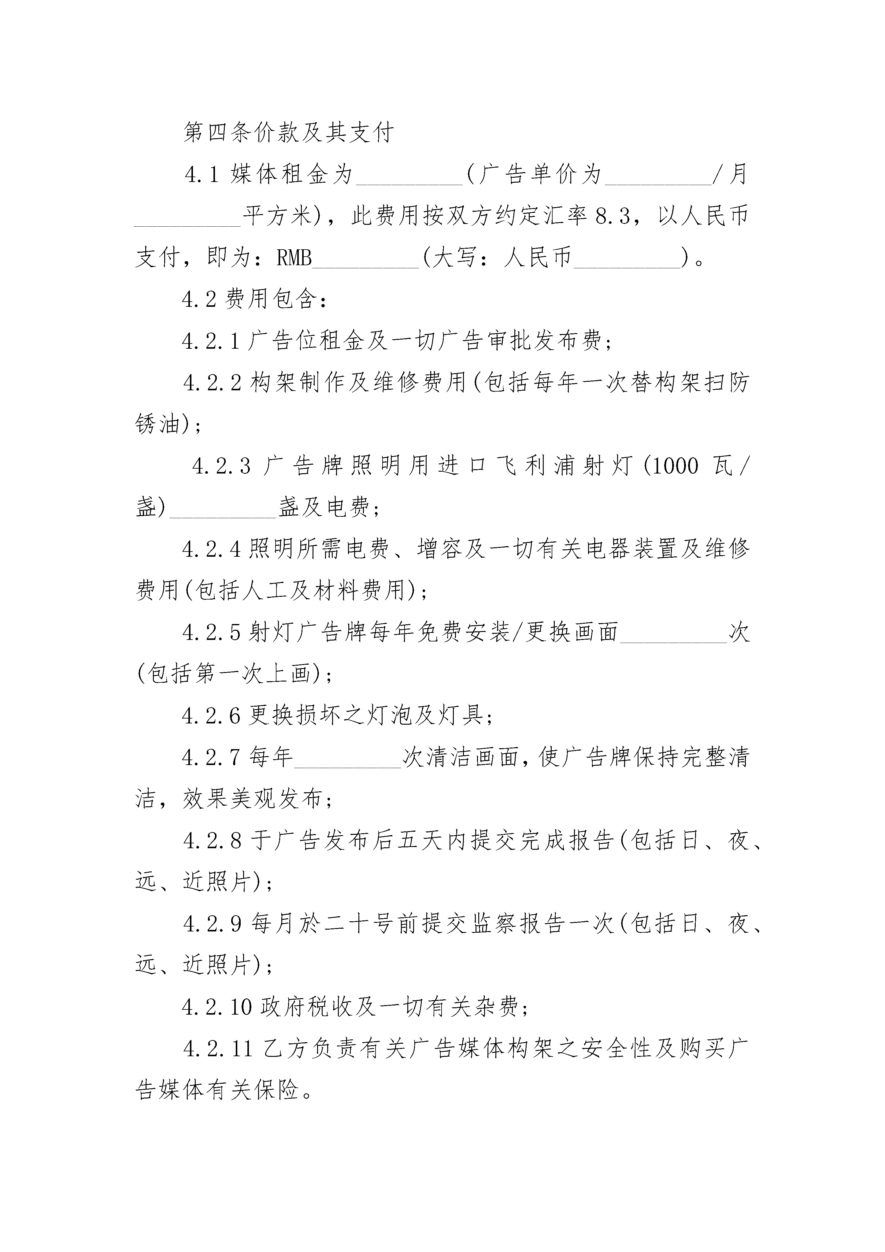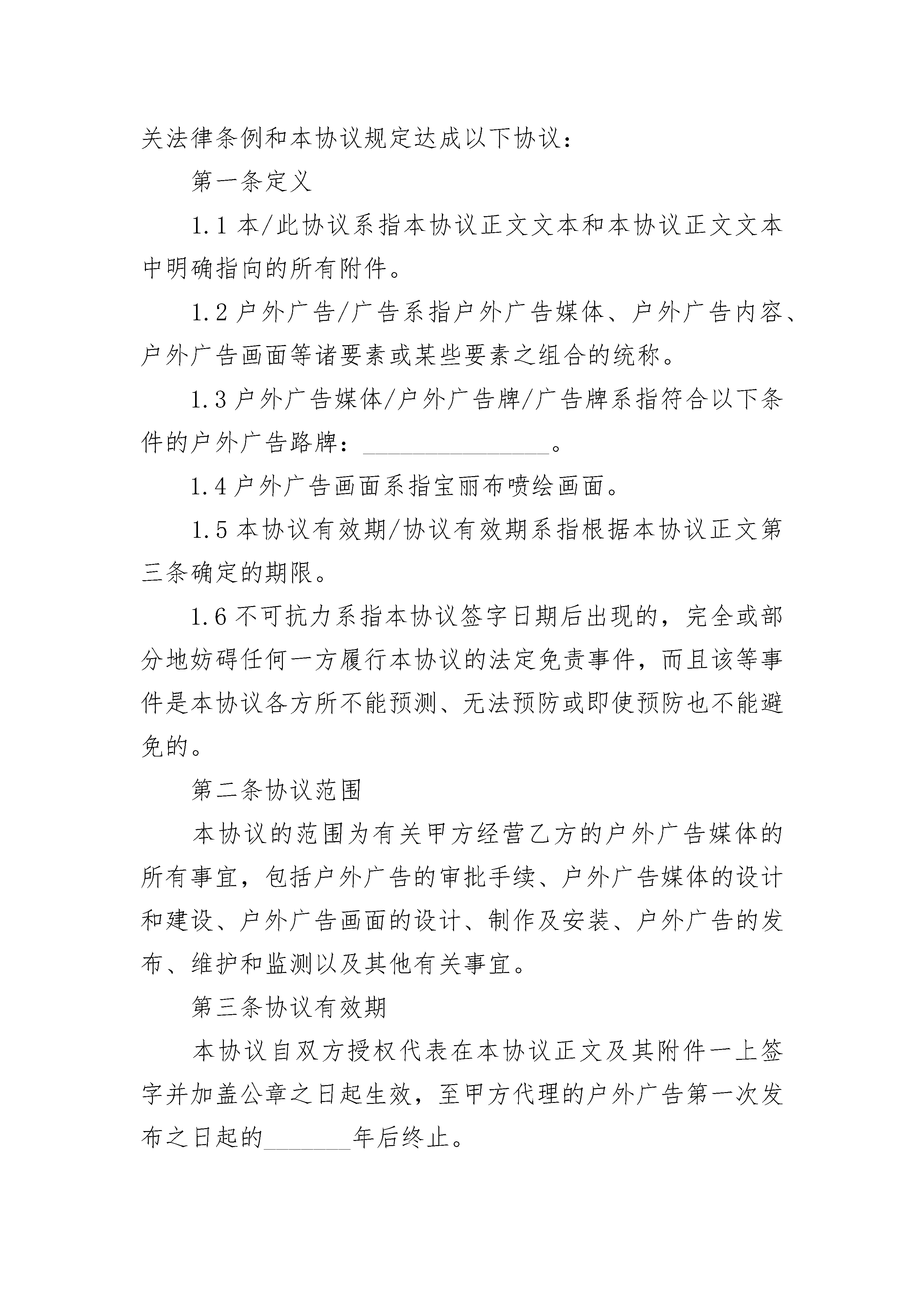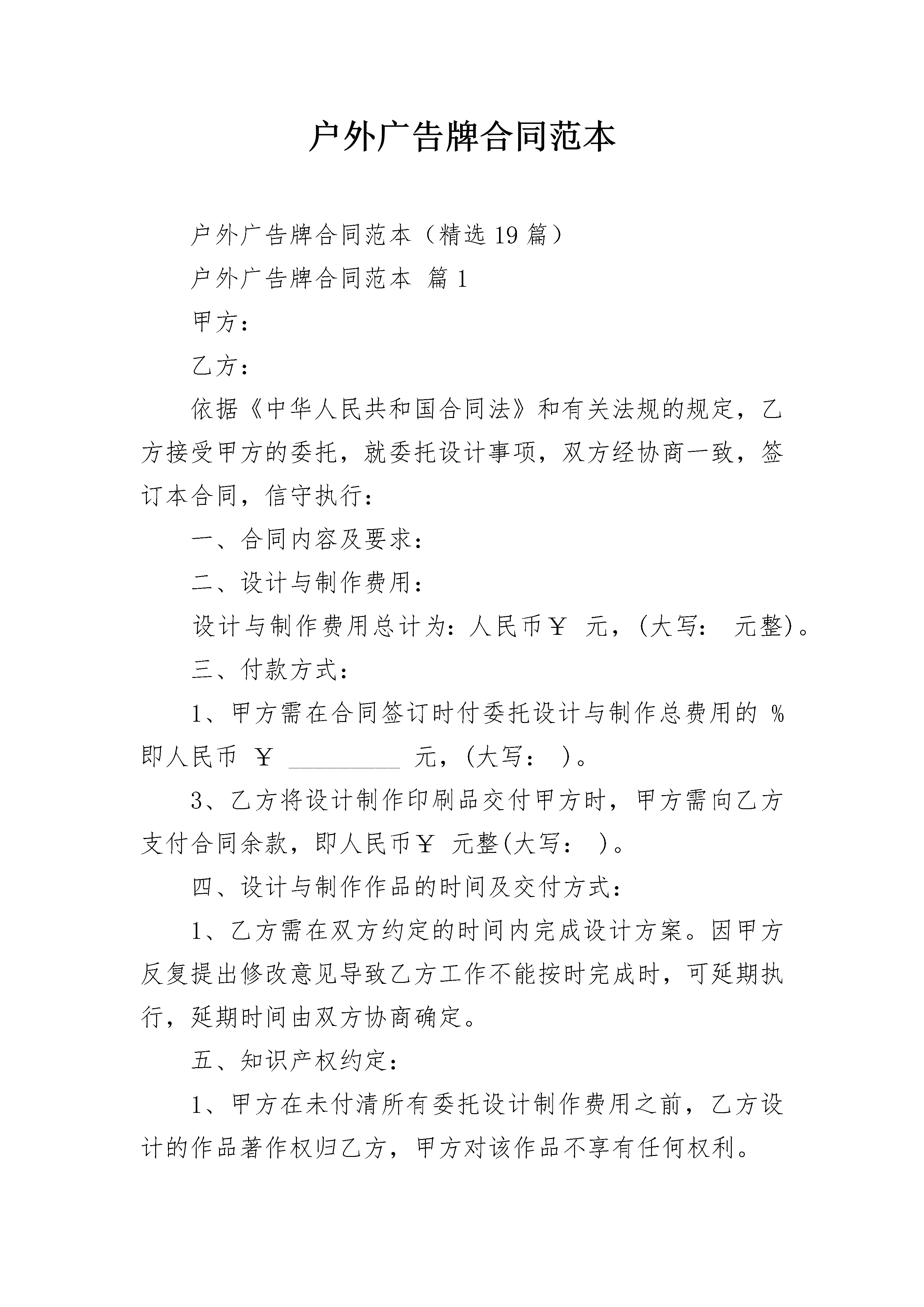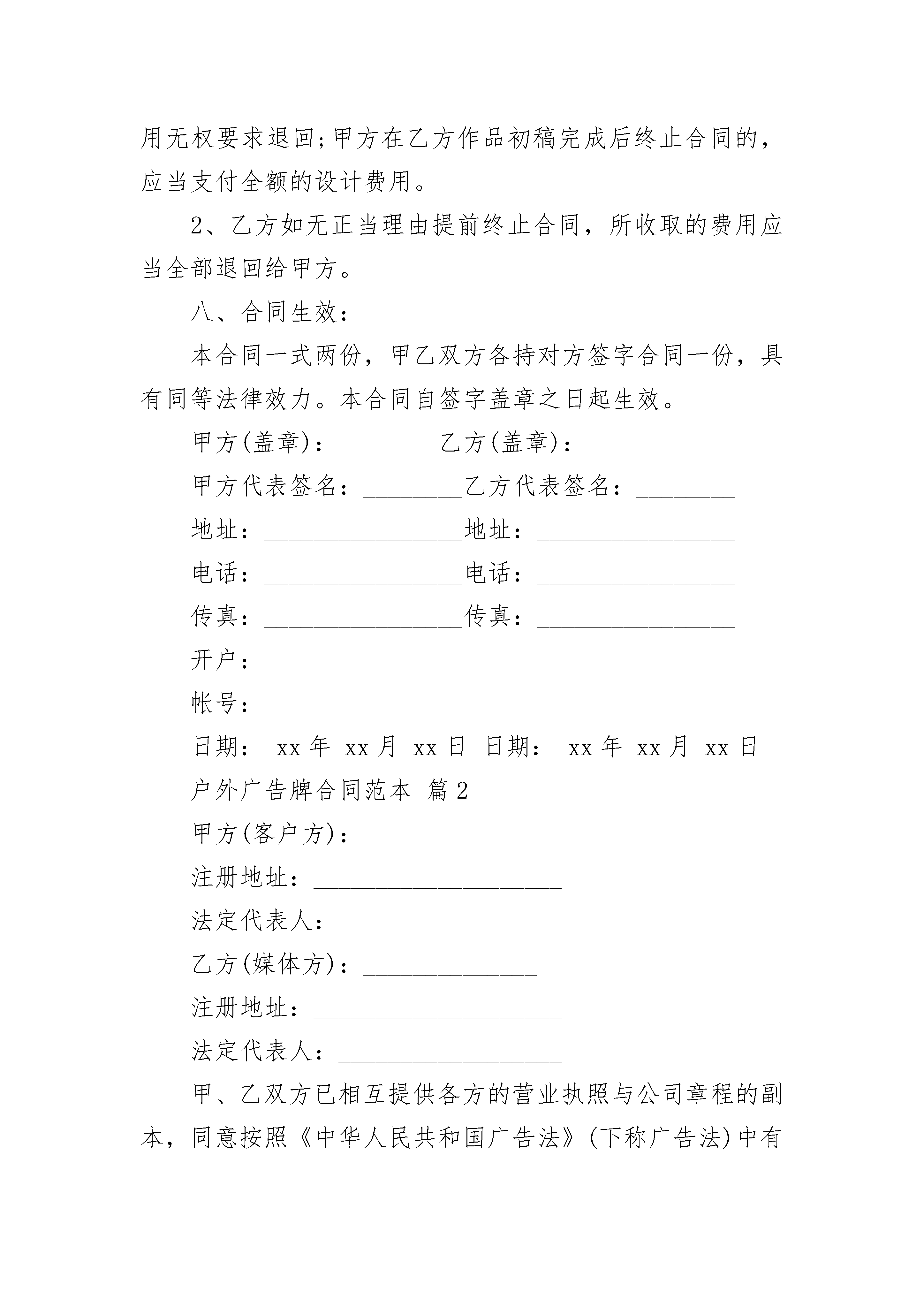 户外广告牌合同范本户外广告牌合同范本(精选19篇)户外广告牌合同范本篇1甲方:乙方:依据《中华人民共和国合同法》和有关法规的规定,乙方接受甲方的委托,就委托设计事项,双方经协商一致,签订本合同,信守执行:一、合同内容及要求:二、设计与制作费用:设计与制作费用总计为:人民币¥元,(大写:元整)。三、付款方式:1、甲方需在合同签订时付委托设计与制作总费用的%即人民币¥_________元,(大写:)。3、乙方将设计制作印刷品交付甲方时,甲方需向乙方支付合同余款,即人民币¥元整(大写:)。四、设计与制作作品的时间及交付方式:1、乙方需在双方约定的时间内完成设计方案。因甲方反复提出修改意见导致乙方工作不能按时完成时,可延期执行,延期时间由双方协商确定。五、知识产权约定:1、甲方在未付清所有委托设计制作费用之前,乙方设计的作品著作权归乙方,甲方对该作品不享有任何权利。2、甲方将委托设计制作的所有费用结算完毕后,甲方拥有作品的所有权、使用权和修改权。六、双方的权利义务:甲方权利:1、甲方有权对乙方的设计提出建议和思路,以使乙方设计的作品更符合甲方企业文化内涵。2、甲方有权对乙方所设计的作品提出修改意见;3、甲方在付清所有设计费用后享有设计作品的所有权、使用权和修改权;甲方义务:1、甲方有义务按照合同约定支付相关费用;2、甲方有义务提供有关企业资料或其他有关资料给乙方;乙方权利:1、乙方有权要求甲方提供有关企业资料供乙方设计参考;2、乙方有权要求甲方按照合同约定支付相应款项;3、乙方对设计的作品享有著作权,有权要求甲方在未付清款项之前不得使用该设计作品:乙方义务:1、乙方需按照甲方的要求进行作品设计与制作。2、乙方需按照合同约定按时交付设计制作作品。七、违约责任:1、甲方在设计作品初稿完成前终止合同,其预付的费用无权要求退回;甲方在乙方作品初稿完成后终止合同的,应当支付全额的设计费用。2、乙方如无正当理由提前终止合同,所收取的费用应当全部退回给甲方。八、合同生效:本合同一式两份,甲乙双方各持对方签字合同一份,具有同等法律效力。本合同自签字盖章之日起生效。甲方(盖章):________乙方(盖章):________甲方代表签名:________乙方代表签名:________地址:________________地址:________________电话:________________电话:________________传真:________________传真:________________开户:帐号:日期:xx年xx月xx日日期:xx年xx月xx日户外广告牌合同范本篇2甲方(客户方):______________注册地址:____________________法定代表人:__________________乙方(媒体方):______________注册地址:____________________法定代表人:__________________甲、乙双方已相互提供各方的营业执照与公司章程的副本,同意按照《中华人民共和国广告法》(下称广告法)中有关法律条例和本协议规定达成以下协议:第一条定义1.1本/此协议系指本协议正文文本和本协议正文文本中明确指向的所有附件。1.2户外广告/广告系指户外广告媒体、户外广告内容、户外广告画面等诸要素或某些要素之组合的统称。1.3户外广告媒体/户外广告牌/广告牌系指符合以下条件的户外广告路牌:_______________。1.4户外广告画面系指宝丽布喷绘画面。1.5本协议有效期/协议有效期系指根据本协议正文第三条确定的期限。1.6不可抗力系指本协议签字日期后出现的,完全或部分地妨碍任何一方履行本协议的法定免责事件,而且该等事件是本协议各方所不能预测、无法预防或即使预防也不能避免的。第二条协议范围本协议的范围为有关甲方经营乙方的户外广告媒体的所有事宜,包括户外广告的审批手续、户外广告媒体的设计和建设、户外广告画面的设计、制作及安装、户外广告的发布、维护和监测以及其他有关事宜。第三条协议有效期本协议自双方授权代表在本协议正文及其附件一上签字并加盖公章之日起生效,至甲方代理的户外广告第一次发布之日起的_______年后终止。第四条价款及其支付4.1媒体租金为_________(广告单价为_________/月_________平方米),此费用按双方约定汇率8.3,以人民币支付,即为:RMB_________(大写:人民币_________)。4.2费用包含:4.2.1广告位租金及一切广告审批发布费;4.2.2构架制作及维修费用(包括每年一次替构架扫防锈油);4.2.3广告牌照明用进口飞利浦射灯(1000瓦/盏)_________盏及电费;4.2.4照明所需电费、增容及一切有关电器装置及维修费用(包括人