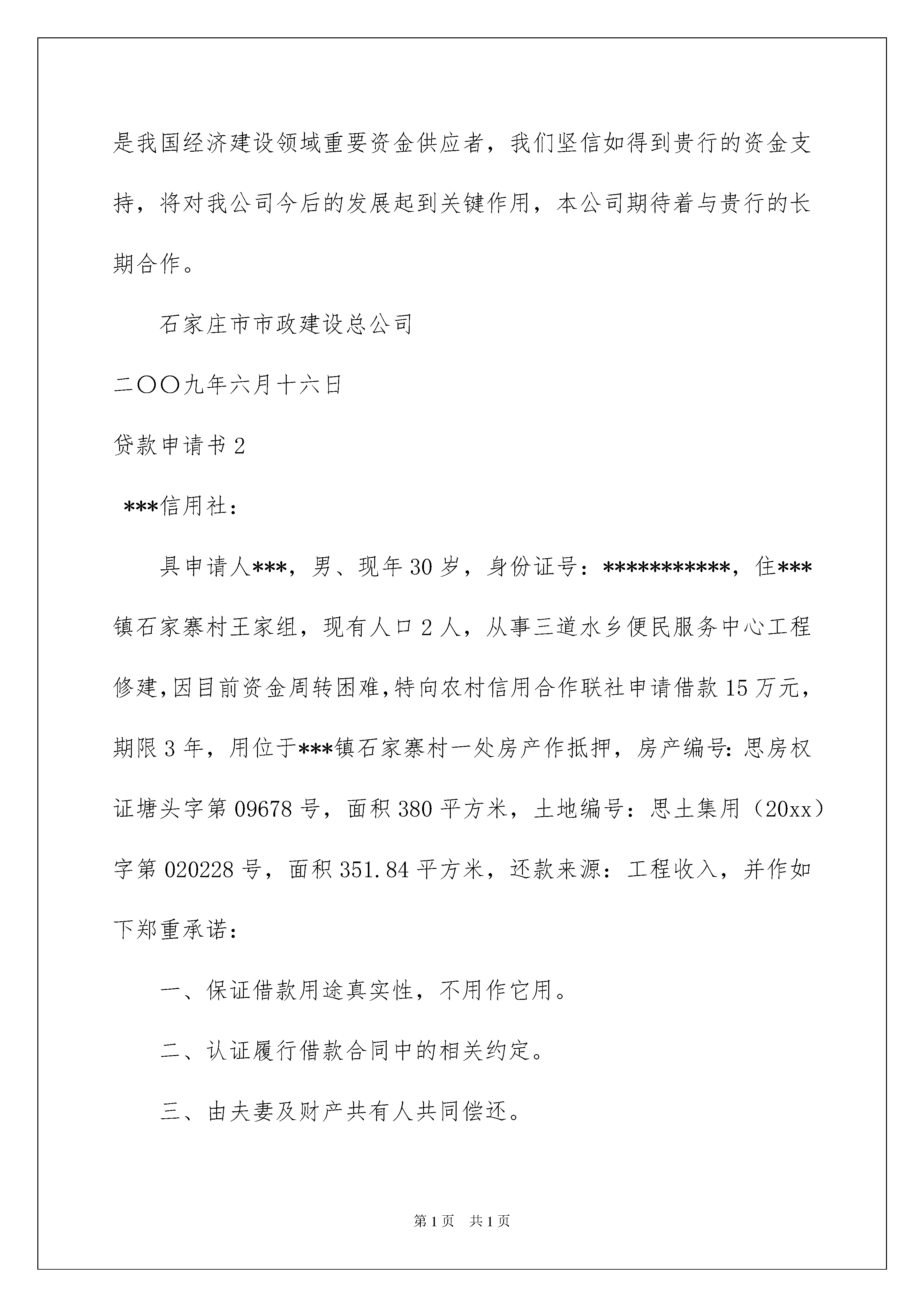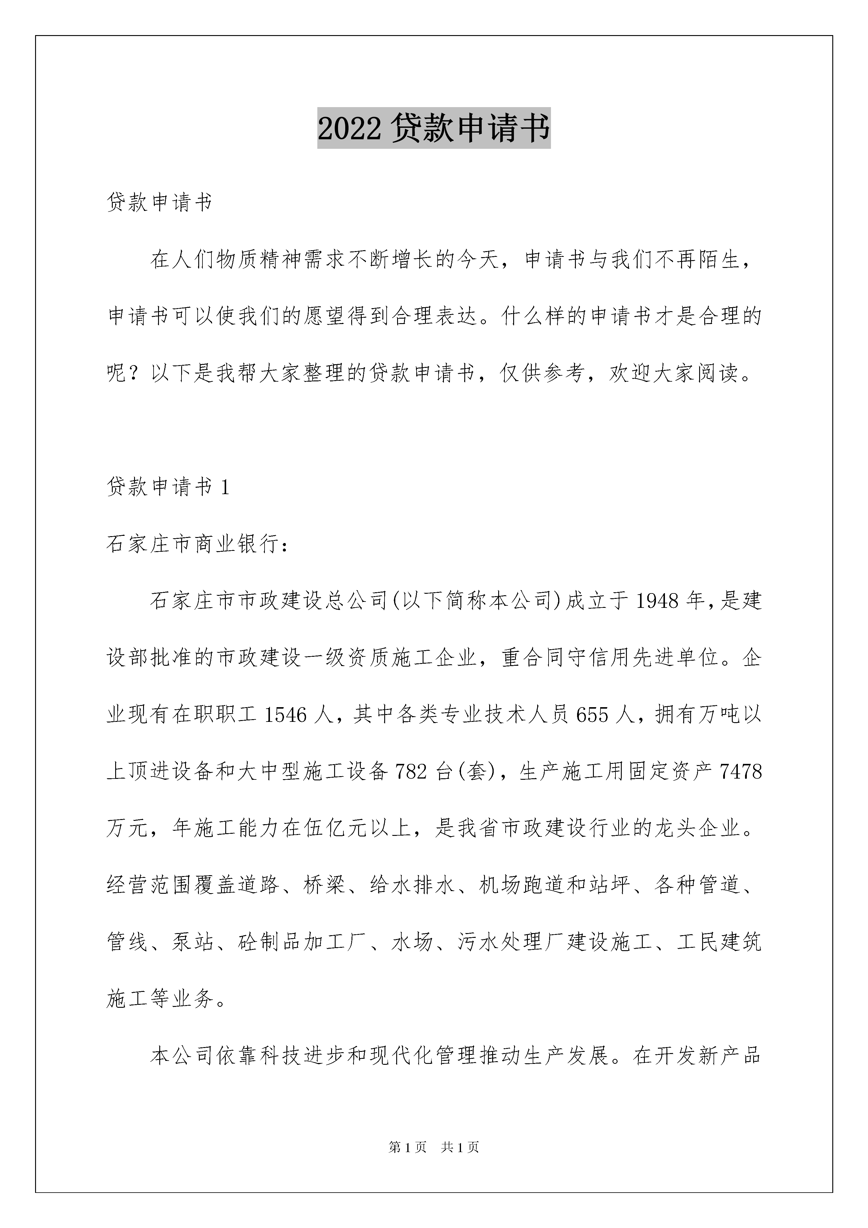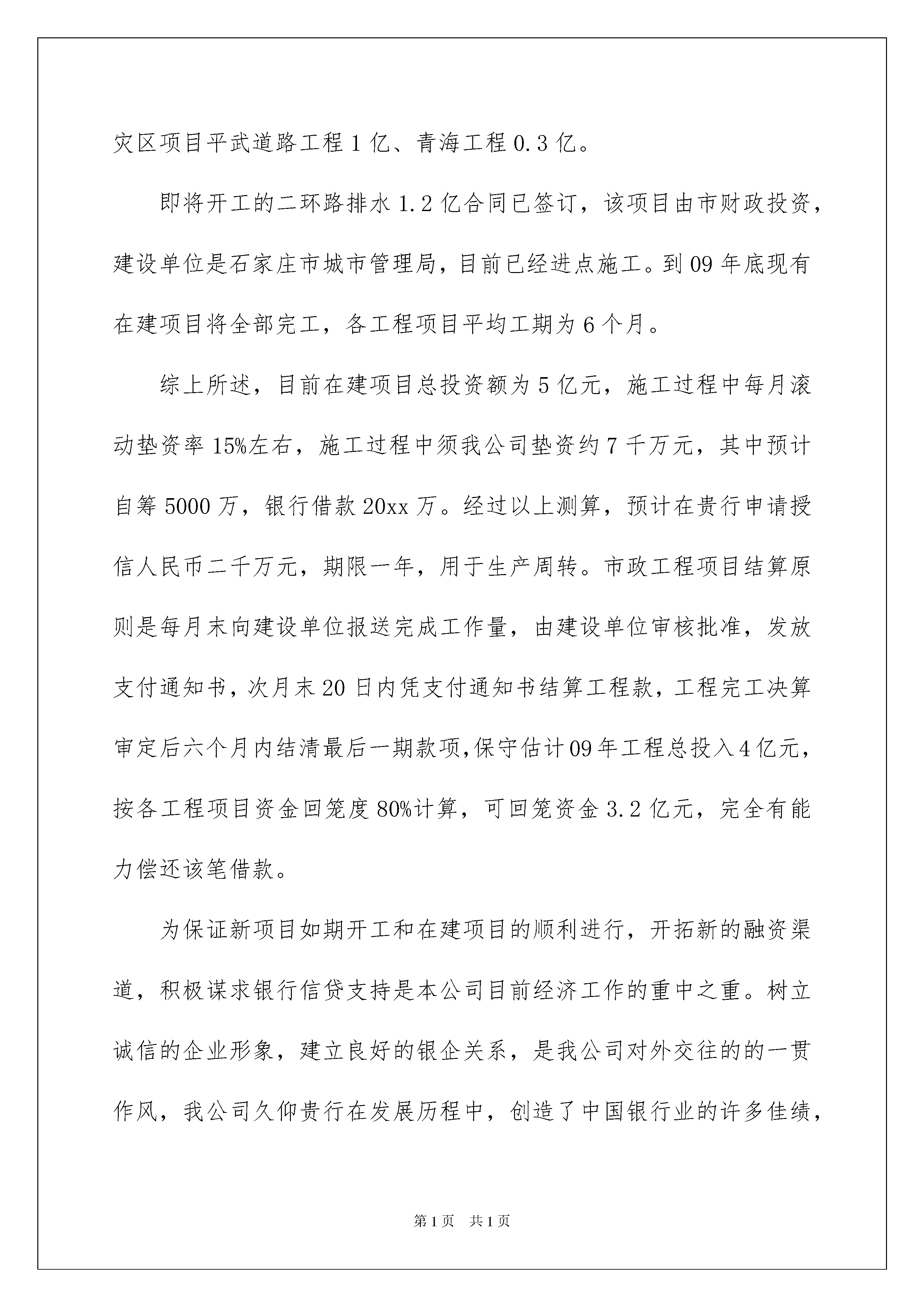 2022贷款申请书贷款申请书在人们物质精神需求不断增长的今天,申请书与我们不再陌生,申请书可以使我们的愿望得到合理表达。什么样的申请书才是合理的呢?以下是我帮大家整理的贷款申请书,仅供参考,欢迎大家阅读。贷款申请书1石家庄市商业银行:石家庄市市政建设总公司(以下简称本公司)成立于1948年,是建设部批准的市政建设一级资质施工企业,重合同守信用先进单位。企业现有在职职工1546人,其中各类专业技术人员655人,拥有万吨以上顶进设备和大中型施工设备782台(套),生产施工用固定资产7478万元,年施工能力在伍亿元以上,是我省市政建设行业的龙头企业。经营范围覆盖道路、桥梁、给水排水、机场跑道和站坪、各种管道、管线、泵站、砼制品加工厂、水场、污水处理厂建设施工、工民建筑施工等业务。本公司依靠科技进步和现代化管理推动生产发展。在开发新产品和应用新技术、新工艺、新材料、技术改造等方面取得了突出成绩。曾获4项省以上科技成果奖和科学大会奖,并受建设部委托主编了全国《城镇地道桥顶进施工技术规程》,为我国桥梁建设作出了重要贡献。我们本着“建桥筑路、造福人民”的宗旨,坚持“忠于设计、精心施工、竭诚服务、顾客满意”的质量方针,为市政行业作出了应有的贡献,取得了良好的社会声誉。为本省及全国各地修建大型主要干道二百余条,公路、铁路立交桥60余座,质量合格率达100%,共创146项优质工程,其中,省、部优工程25项。近年承建石家庄市红星街跨太平河桥、槐安路东延下穿石安高速地道桥、南水北调友谊大街桥和果研所桥、中华大街跨太平河无风撑钢管拱桥、石家庄市裕华东路工程、石家庄市二环高等级快速路(含道路、排水、桥梁、路灯、收费站)工程、石家庄市中山西路工程均获中国市政工程质量最高奖─“市政工程金杯奖”;石家庄市长江大道道路工程获一九九九年度省优质工程、石正公路石津渠桥梁工程、石家庄市青园街道路工程分别获二〇〇二年度、二〇〇三年度河北省建筑工程安济杯奖(省优质工程);石家庄市和平东路道路排水工程获二〇〇〇年度河北省优质样板工程;二〇〇六年石家庄市建设大街道路改造被评为省优工程,并获特殊荣誉—“市长特别奖”,二〇〇七年完工的平安大街道路工程又创奇迹,以超快工期,超高施工质量赢得市领导和市民好评,受到媒体的高度赞扬,创造了“石家庄速度”荣获市政工程金杯奖;二〇〇年承建的和平路跨线桥工程,克服冬季施工技术难题,采用新技术、新工艺,仅用八个月的时间,比原定工期提前了十个月,创造了省会建桥市的奇迹。未来三年,将是石家庄城市和产业布局的重大调整期、基础设施的攻坚期和生态环境恢复的关键期,随着城市框架的拉开,省会市政建设迎来了新的历史时期,公司发展面临非常广阔的历史前景。以闫杰总经理为首的公司领导班子带领广大干部职工抓住机会,找准定位,超前谋划,积极举措,在承揽施工任务方面率先实现了历史性突破,截至20xx年5月底已承揽施工任务5亿元,承建的工程项目都是国家投资,建设资金来源稳定,投资风险小,回报率高,为20xx年力争完成六亿元产值、实现三千万元利润目标奠定了坚实的基础。目前,在建的工程项目石家庄市区内有和平路跨线桥1.3亿(今年0.6亿)已进入收尾阶段;石家庄市裕华路改造工程1.2亿、友谊大街道路0.4亿、学府路道路0.2亿等工程正在进行,外埠项目援建四川灾区项目平武道路工程1亿、青海工程0.3亿。即将开工的二环路排水1.2亿合同已签订,该项目由市财政投资,建设单位是石家庄市城市管理局,目前已经进点施工。到09年底现有在建项目将全部完工,各工程项目平均工期为6个月。综上所述,目前在建项目总投资额为5亿元,施工过程中每月滚动垫资率15%左右,施工过程中须我公司垫资约7千万元,其中预计自筹5000万,银行借款20xx万。经过以上测算,预计在贵行申请授信人民币二千万元,期限一年,用于生产周转。市政工程项目结算原则是每月末向建设单位报送完成工作量,由建设单位审核批准,发放支付通知书,次月末20日内凭支付通知书结算工程款,工程完工决算审定后六个月内结清最后一期款项,保守估计09年工程总投入4亿元,按各工程项目资金回笼度80%计算,可回笼资金3.2亿元,完全有能力偿还该笔借款。为保证新项目如期开工和在建项目的顺利进行,开拓新的融资渠道,积极谋求银行信贷支持是本公司目前经济工作的重中之重。树立诚信的企业形象,建立良好的银企关系,是我公司对外交往的的一贯作风,我公司久仰贵行在发展历程中,创造了中国银行业的许多佳绩,是我国经济建设领域重要资金供应者,我们坚信如得到贵行的资金支持,将对我公司今后的发展起到关键作用,本公司期待着与贵行的长期合作。
