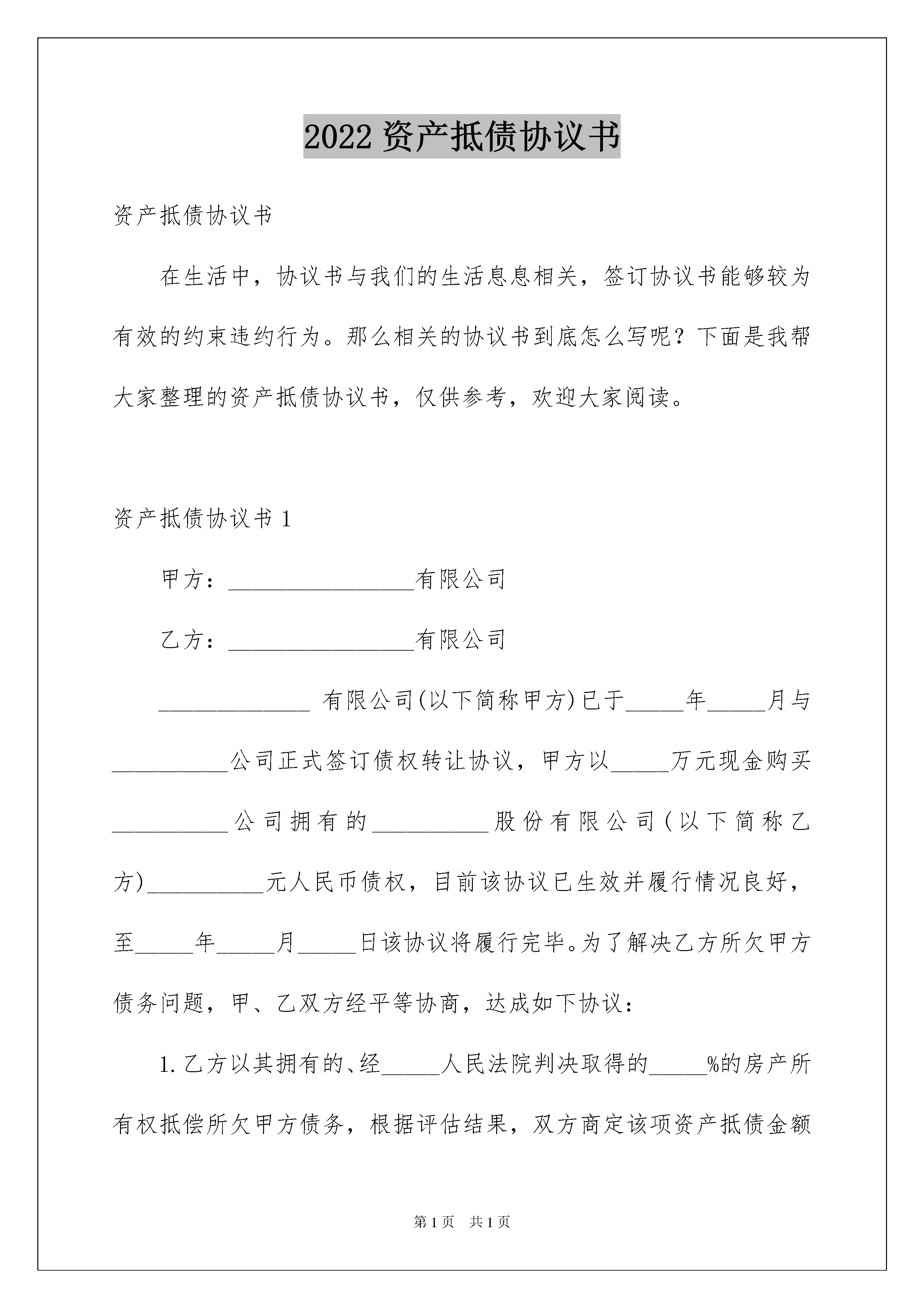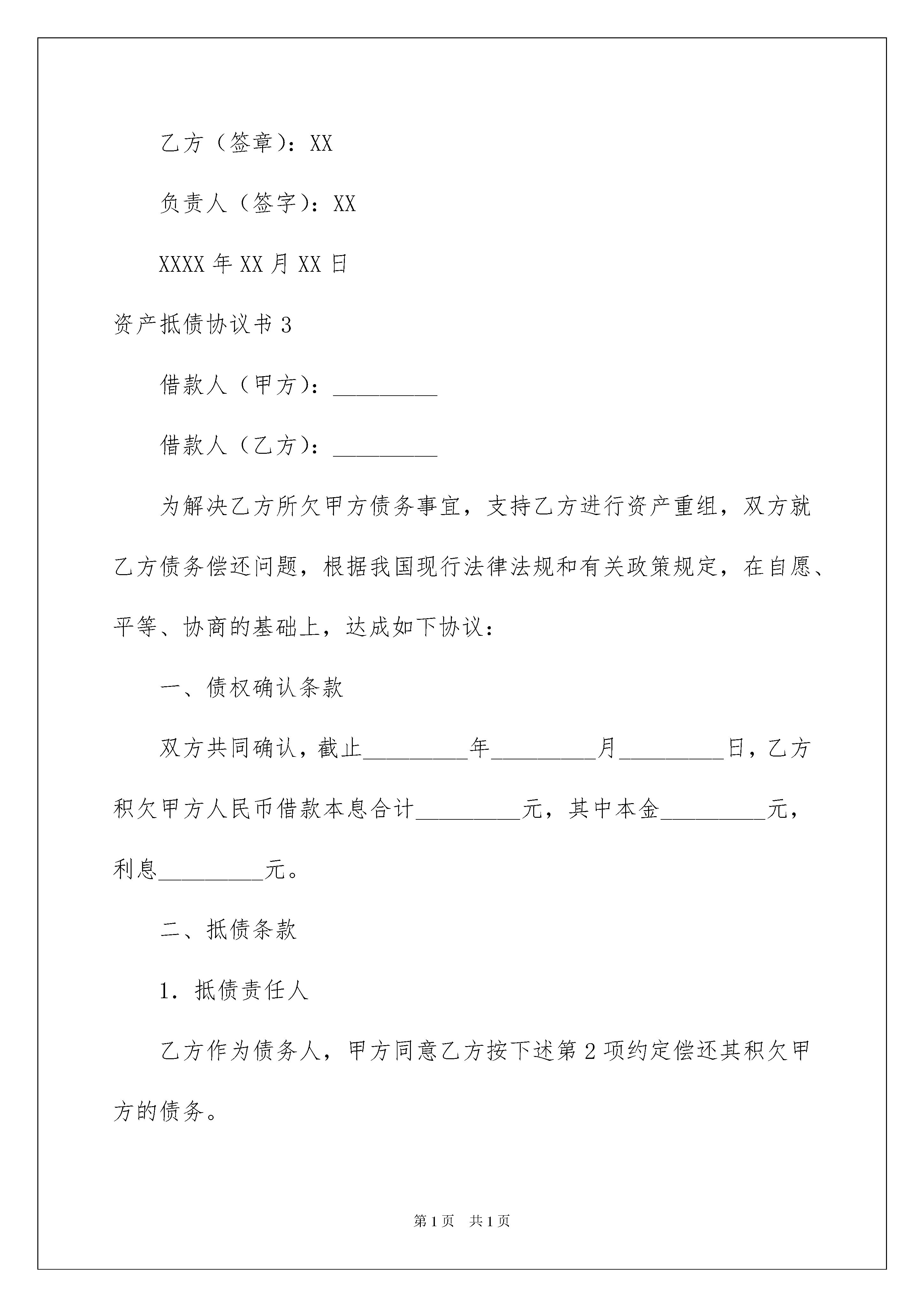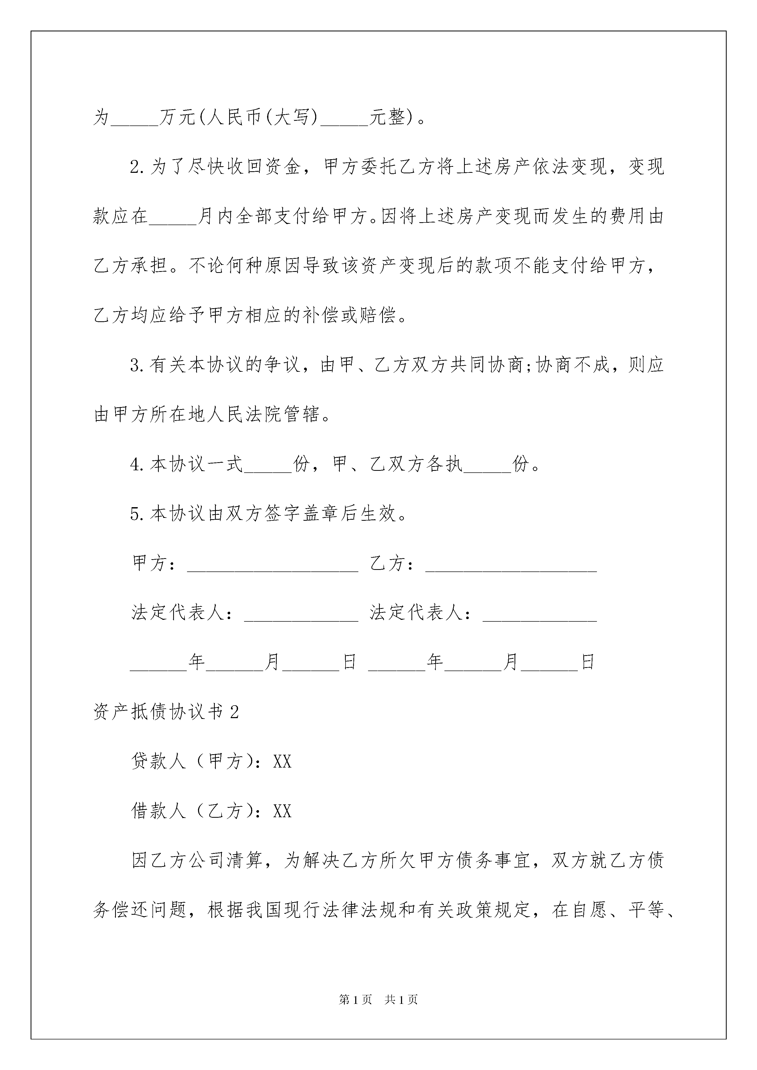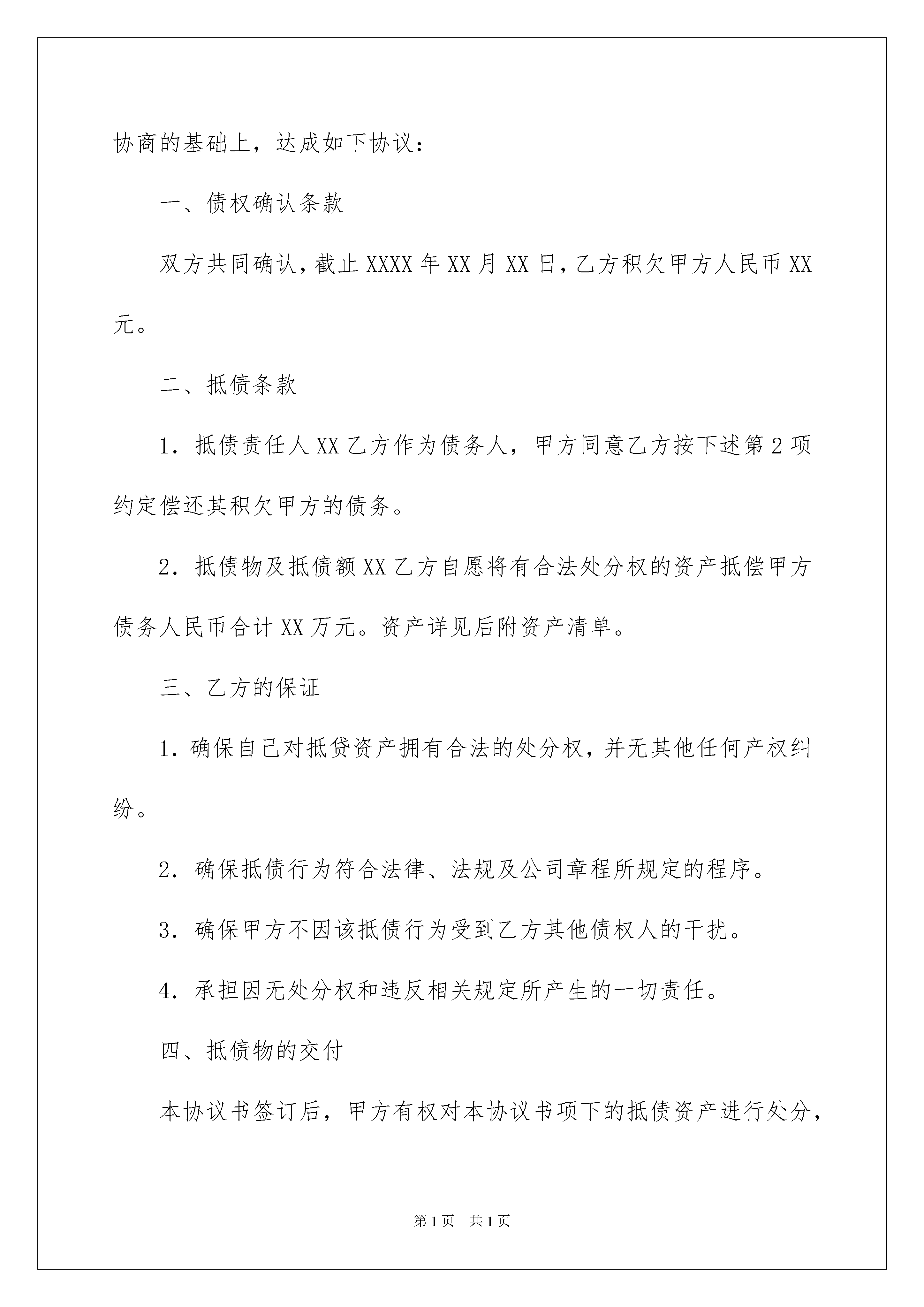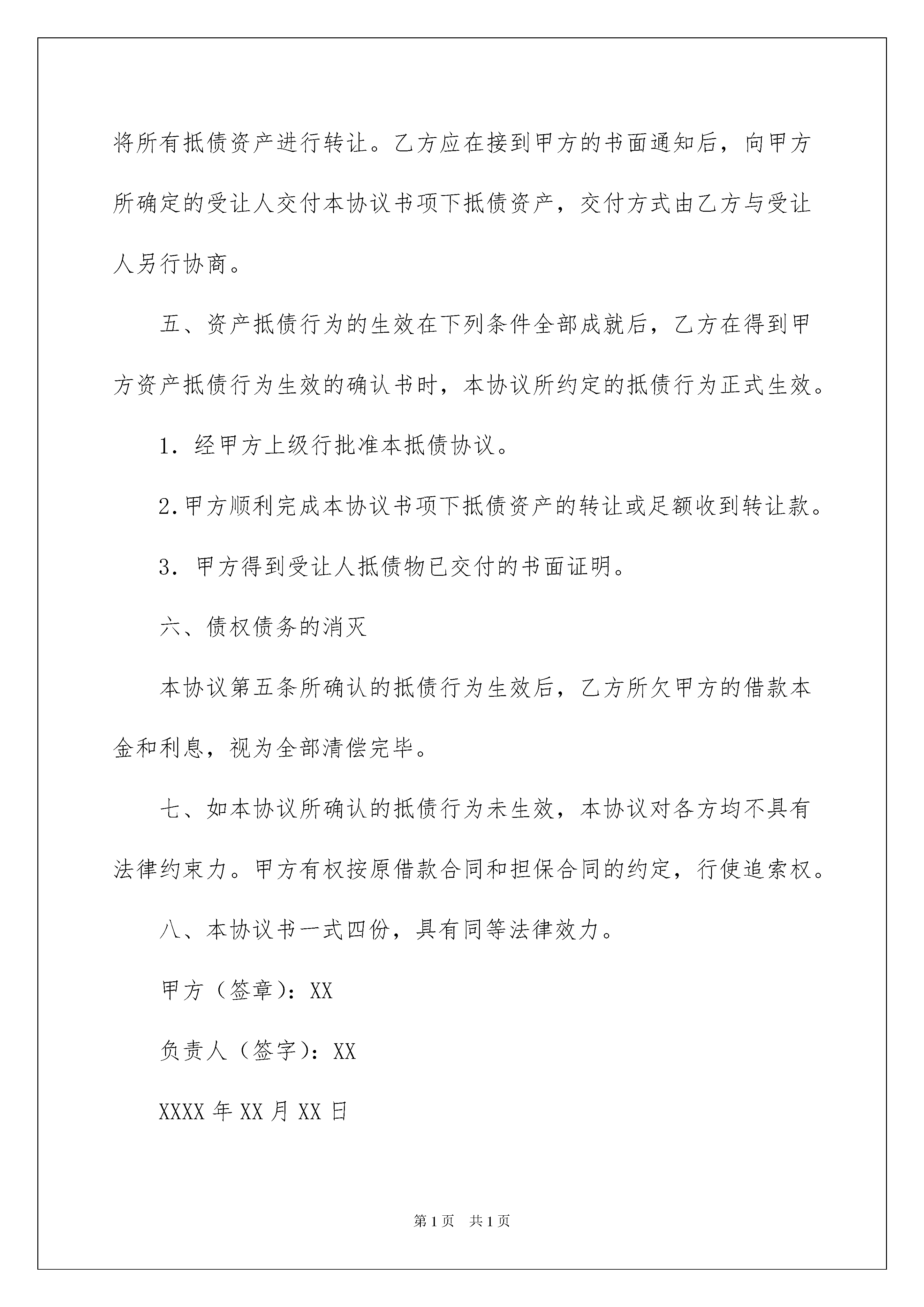 2022资产抵债协议书资产抵债协议书在生活中,协议书与我们的生活息息相关,签订协议书能够较为有效的约束违约行为。那么相关的协议书到底怎么写呢?下面是我帮大家整理的资产抵债协议书,仅供参考,欢迎大家阅读。资产抵债协议书1甲方:________________有限公司乙方:________________有限公司_____________有限公司(以下简称甲方)已于_____年_____月与__________公司正式签订债权转让协议,甲方以_____万元现金购买__________公司拥有的__________股份有限公司(以下简称乙方)__________元人民币债权,目前该协议已生效并履行情况良好,至_____年_____月_____日该协议将履行完毕。为了解决乙方所欠甲方债务问题,甲、乙双方经平等协商,达成如下协议:1.乙方以其拥有的、经_____人民法院判决取得的_____%的房产所有权抵偿所欠甲方债务,根据评估结果,双方商定该项资产抵债金额为_____万元(人民币(大写)_____元整)。2.为了尽快收回资金,甲方委托乙方将上述房产依法变现,变现款应在_____月内全部支付给甲方。因将上述房产变现而发生的费用由乙方承担。不论何种原因导致该资产变现后的款项不能支付给甲方,乙方均应给予甲方相应的补偿或赔偿。3.有关本协议的争议,由甲、乙方双方共同协商;协商不成,则应由甲方所在地人民法院管辖。4.本协议一式_____份,甲、乙双方各执_____份。5.本协议由双方签字盖章后生效。甲方:__________________乙方:__________________法定代表人:____________法定代表人:__________________年______月______日______年______月______日资产抵债协议书2贷款人(甲方):XX借款人(乙方):XX因乙方公司清算,为解决乙方所欠甲方债务事宜,双方就乙方债务偿还问题,根据我国现行法律法规和有关政策规定,在自愿、平等、协商的基础上,达成如下协议:一、债权确认条款双方共同确认,截止XXXX年XX月XX日,乙方积欠甲方人民币XX元。二、抵债条款1.抵债责任人XX乙方作为债务人,甲方同意乙方按下述第2项约定偿还其积欠甲方的债务。2.抵债物及抵债额XX乙方自愿将有合法处分权的资产抵偿甲方债务人民币合计XX万元。资产详见后附资产清单。三、乙方的保证1.确保自己对抵贷资产拥有合法的处分权,并无其他任何产权纠纷。2.确保抵债行为符合法律、法规及公司章程所规定的程序。3.确保甲方不因该抵债行为受到乙方其他债权人的干扰。4.承担因无处分权和违反相关规定所产生的一切责任。四、抵债物的交付本协议书签订后,甲方有权对本协议书项下的抵债资产进行处分,将所有抵债资产进行转让。乙方应在接到甲方的书面通知后,向甲方所确定的受让人交付本协议书项下抵债资产,交付方式由乙方与受让人另行协商。五、资产抵债行为的生效在下列条件全部成就后,乙方在得到甲方资产抵债行为生效的确认书时,本协议所约定的抵债行为正式生效。1.经甲方上级行批准本抵债协议。2.甲方顺利完成本协议书项下抵债资产的转让或足额收到转让款。3.甲方得到受让人抵债物已交付的书面证明。六、债权债务的消灭本协议第五条所确认的抵债行为生效后,乙方所欠甲方的借款本金和利息,视为全部清偿完毕。七、如本协议所确认的抵债行为未生效,本协议对各方均不具有法律约束力。甲方有权按原借款合同和担保合同的约定,行使追索权。八、本协议书一式四份,具有同等法律效力。甲方(签章):XX负责人(签字):XXXXXX年XX月XX日乙方(签章):XX负责人(签字):XXXXXX年XX月XX日资产抵债协议书3借款人(甲方):_________借款人(乙方):_________为解决乙方所欠甲方债务事宜,支持乙方进行资产重组,双方就乙方债务偿还问题,根据我国现行法律法规和有关政策规定,在自愿、平等、协商的基础上,达成如下协议:一、债权确认条款双方共同确认,截止_________年_________月_________日,乙方积欠甲方人民币借款本息合计_________元,其中本金_________元,利息_________元。二、抵债条款1.抵债责任人乙方作为债务人,甲方同意乙方按下述第2项约定偿还其积欠甲方的债务。2.抵债物及抵债额乙方自愿将国家授权其经营并有合法处分权的已抵押给甲方的资产抵偿甲方债务人民币合计_________万元。三、乙方的保证1.确保自己对抵贷资产拥有合法的处分权,并无其他任何产权纠纷。2.确保抵债行
