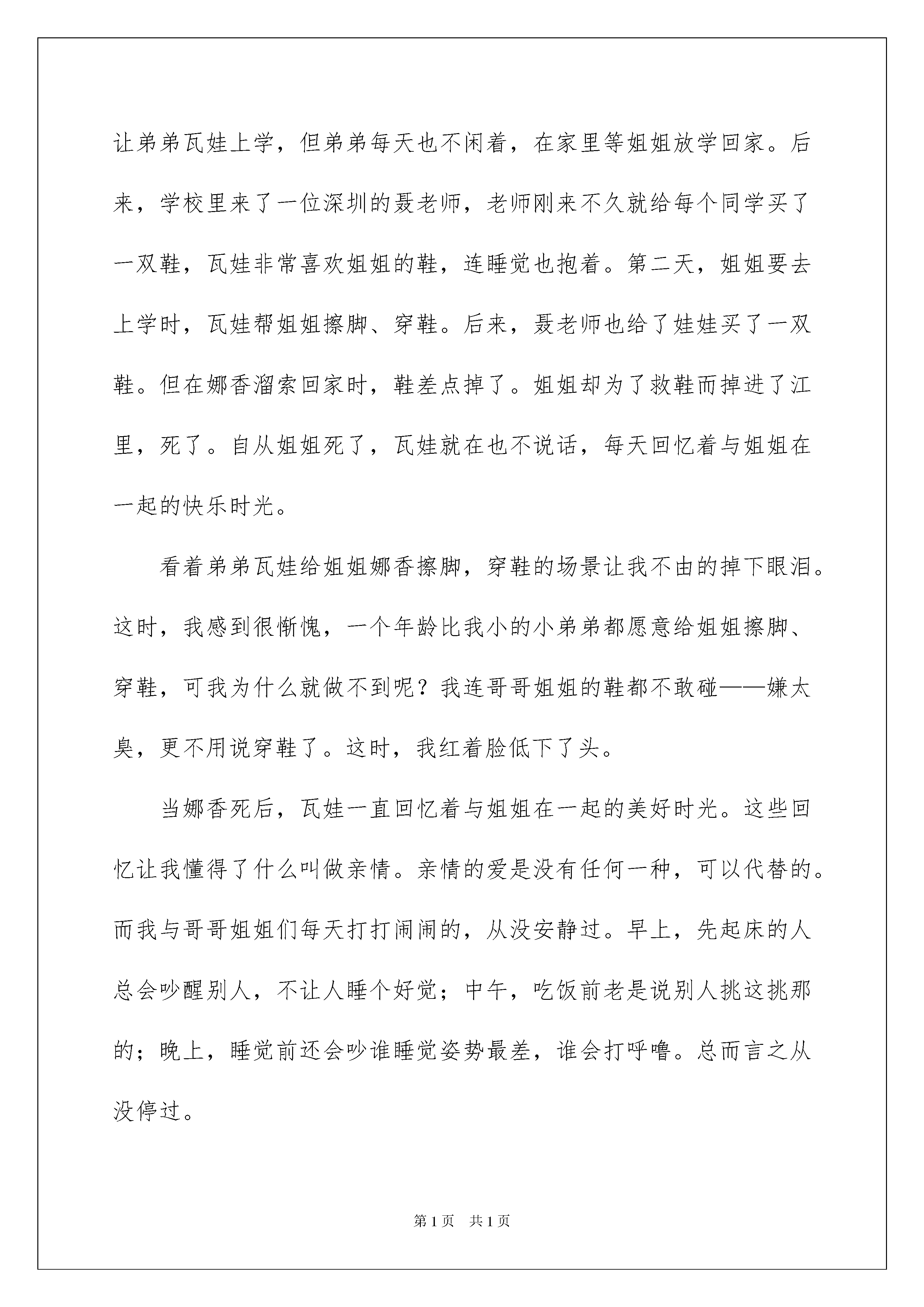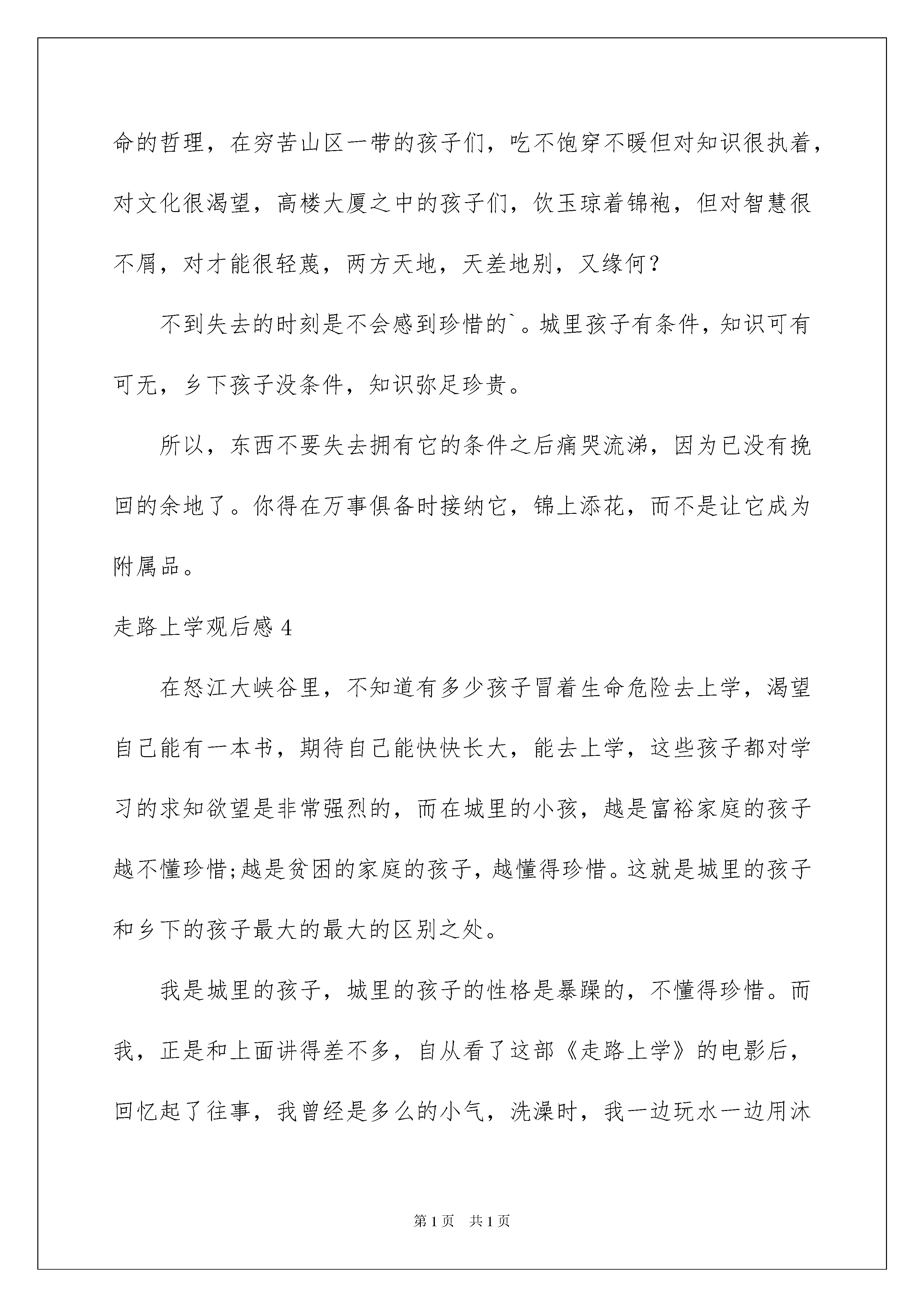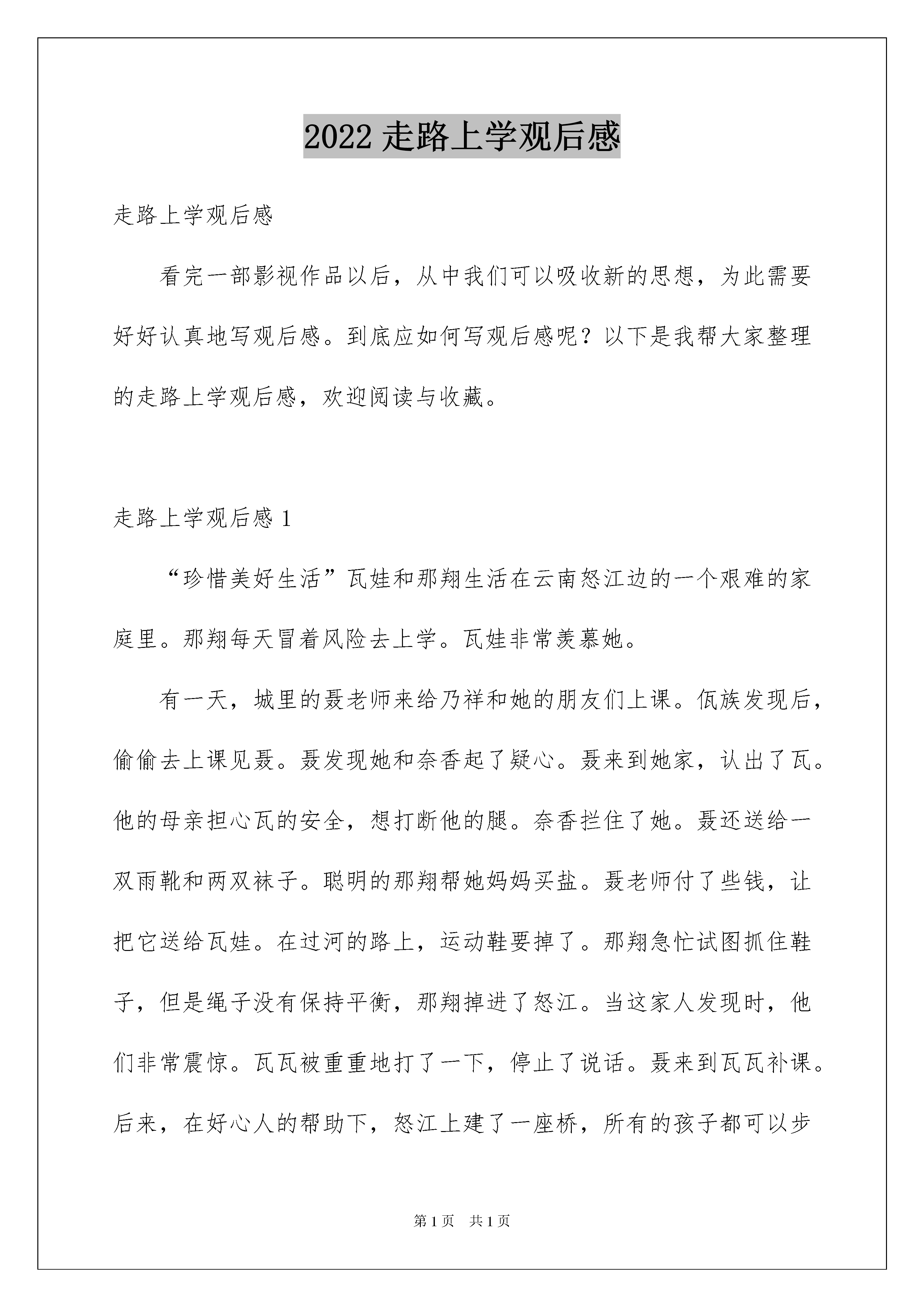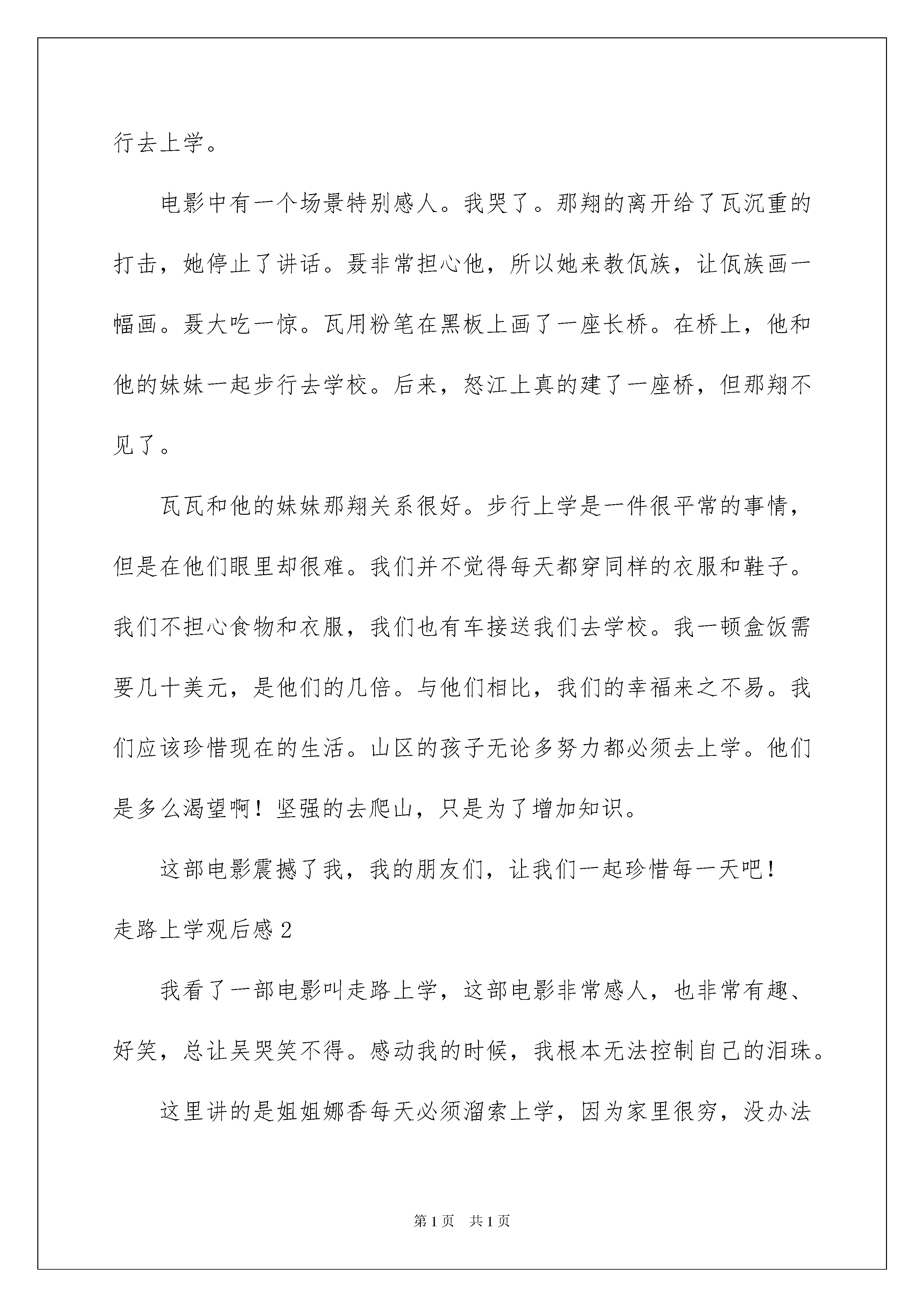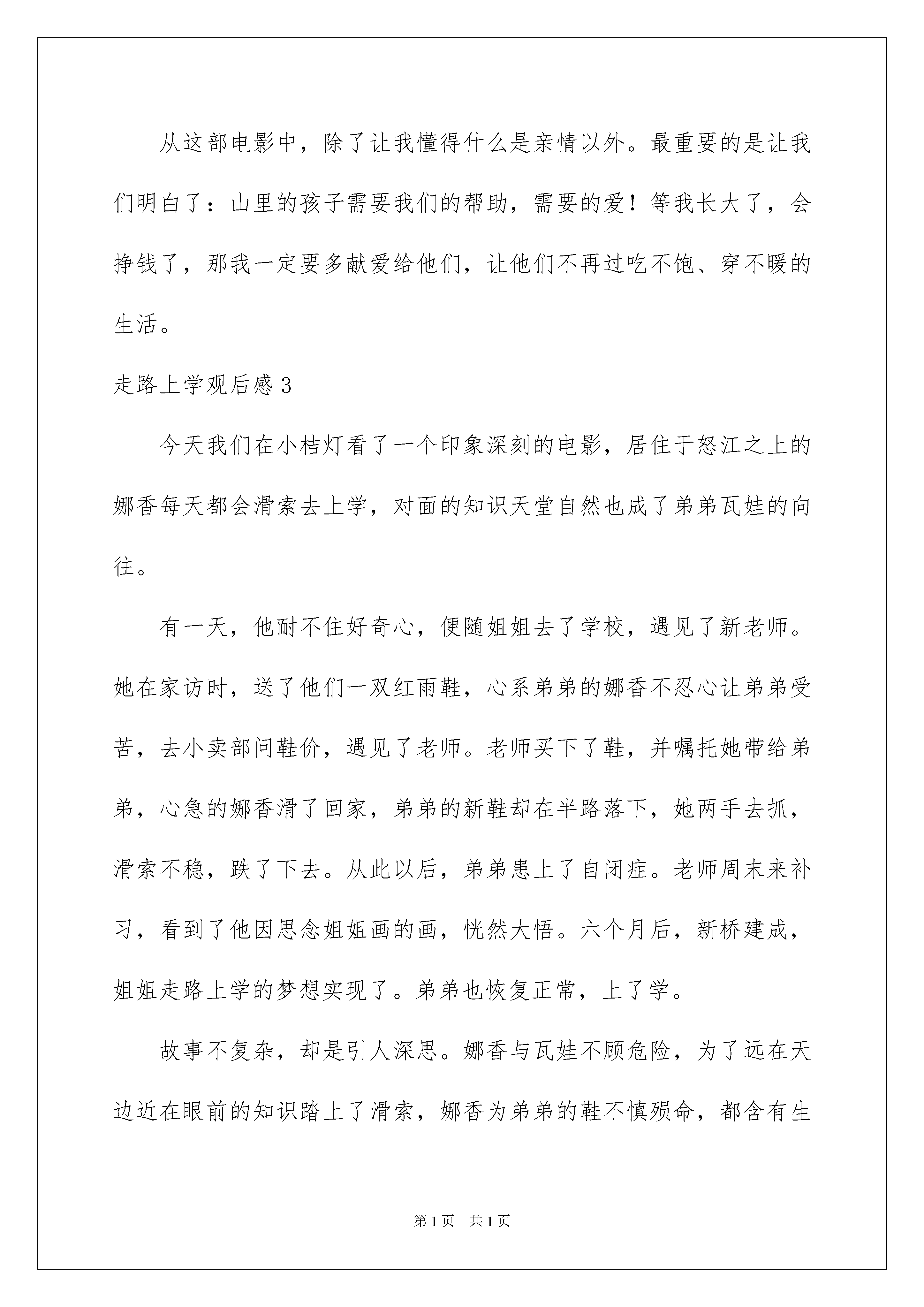 2022走路上学观后感走路上学观后感看完一部影视作品以后,从中我们可以吸收新的思想,为此需要好好认真地写观后感。到底应如何写观后感呢?以下是我帮大家整理的走路上学观后感,欢迎阅读与收藏。走路上学观后感1“珍惜美好生活”瓦娃和那翔生活在云南怒江边的一个艰难的家庭里。那翔每天冒着风险去上学。瓦娃非常羡慕她。有一天,城里的聂老师来给乃祥和她的朋友们上课。佤族发现后,偷偷去上课见聂。聂发现她和奈香起了疑心。聂来到她家,认出了瓦。他的母亲担心瓦的安全,想打断他的腿。奈香拦住了她。聂还送给一双雨靴和两双袜子。聪明的那翔帮她妈妈买盐。聂老师付了些钱,让把它送给瓦娃。在过河的路上,运动鞋要掉了。那翔急忙试图抓住鞋子,但是绳子没有保持平衡,那翔掉进了怒江。当这家人发现时,他们非常震惊。瓦瓦被重重地打了一下,停止了说话。聂来到瓦瓦补课。后来,在好心人的帮助下,怒江上建了一座桥,所有的孩子都可以步行去上学。电影中有一个场景特别感人。我哭了。那翔的离开给了瓦沉重的打击,她停止了讲话。聂非常担心他,所以她来教佤族,让佤族画一幅画。聂大吃一惊。瓦用粉笔在黑板上画了一座长桥。在桥上,他和他的妹妹一起步行去学校。后来,怒江上真的建了一座桥,但那翔不见了。瓦瓦和他的妹妹那翔关系很好。步行上学是一件很平常的事情,但是在他们眼里却很难。我们并不觉得每天都穿同样的衣服和鞋子。我们不担心食物和衣服,我们也有车接送我们去学校。我一顿盒饭需要几十美元,是他们的几倍。与他们相比,我们的幸福来之不易。我们应该珍惜现在的生活。山区的孩子无论多努力都必须去上学。他们是多么渴望啊!坚强的去爬山,只是为了增加知识。这部电影震撼了我,我的朋友们,让我们一起珍惜每一天吧!走路上学观后感2我看了一部电影叫走路上学,这部电影非常感人,也非常有趣、好笑,总让吴哭笑不得。感动我的时候,我根本无法控制自己的泪珠。这里讲的是姐姐娜香每天必须溜索上学,因为家里很穷,没办法让弟弟瓦娃上学,但弟弟每天也不闲着,在家里等姐姐放学回家。后来,学校里来了一位深圳的聂老师,老师刚来不久就给每个同学买了一双鞋,瓦娃非常喜欢姐姐的鞋,连睡觉也抱着。第二天,姐姐要去上学时,瓦娃帮姐姐擦脚、穿鞋。后来,聂老师也给了娃娃买了一双鞋。但在娜香溜索回家时,鞋差点掉了。姐姐却为了救鞋而掉进了江里,死了。自从姐姐死了,瓦娃就在也不说话,每天回忆着与姐姐在一起的快乐时光。看着弟弟瓦娃给姐姐娜香擦脚,穿鞋的场景让我不由的掉下眼泪。这时,我感到很惭愧,一个年龄比我小的小弟弟都愿意给姐姐擦脚、穿鞋,可我为什么就做不到呢?我连哥哥姐姐的鞋都不敢碰——嫌太臭,更不用说穿鞋了。这时,我红着脸低下了头。当娜香死后,瓦娃一直回忆着与姐姐在一起的美好时光。这些回忆让我懂得了什么叫做亲情。亲情的爱是没有任何一种,可以代替的。而我与哥哥姐姐们每天打打闹闹的,从没安静过。早上,先起床的人总会吵醒别人,不让人睡个好觉;中午,吃饭前老是说别人挑这挑那的;晚上,睡觉前还会吵谁睡觉姿势最差,谁会打呼噜。总而言之从没停过。从这部电影中,除了让我懂得什么是亲情以外。最重要的是让我们明白了:山里的孩子需要我们的帮助,需要的爱!等我长大了,会挣钱了,那我一定要多献爱给他们,让他们不再过吃不饱、穿不暖的生活。走路上学观后感3今天我们在小桔灯看了一个印象深刻的电影,居住于怒江之上的娜香每天都会滑索去上学,对面的知识天堂自然也成了弟弟瓦娃的向往。有一天,他耐不住好奇心,便随姐姐去了学校,遇见了新老师。她在家访时,送了他们一双红雨鞋,心系弟弟的娜香不忍心让弟弟受苦,去小卖部问鞋价,遇见了老师。老师买下了鞋,并嘱托她带给弟弟,心急的娜香滑了回家,弟弟的新鞋却在半路落下,她两手去抓,滑索不稳,跌了下去。从此以后,弟弟患上了自闭症。老师周末来补习,看到了他因思念姐姐画的画,恍然大悟。六个月后,新桥建成,姐姐走路上学的梦想实现了。弟弟也恢复正常,上了学。故事不复杂,却是引人深思。娜香与瓦娃不顾危险,为了远在天边近在眼前的知识踏上了滑索,娜香为弟弟的鞋不慎殒命,都含有生命的哲理,在穷苦山区一带的孩子们,吃不饱穿不暖但对知识很执着,对文化很渴望,高楼大厦之中的孩子们,饮玉琼着锦袍,但对智慧很不屑,对才能很轻蔑,两方天地,天差地别,又缘何?不到失去的时刻是不会感到珍惜的`。城里孩子有条件,知识可有可无,乡下孩子没条件,知识弥足珍贵。所以,东西不要失去拥有它的条件之后痛哭流涕,因为已没有挽回的余地了。你得在万事俱备时接纳它,锦上添花,而不是让它成为附属品。走路上学观后感4在怒江大峡谷里,不知道有多少孩子冒着生命危险去上学,渴望自己能有一本书