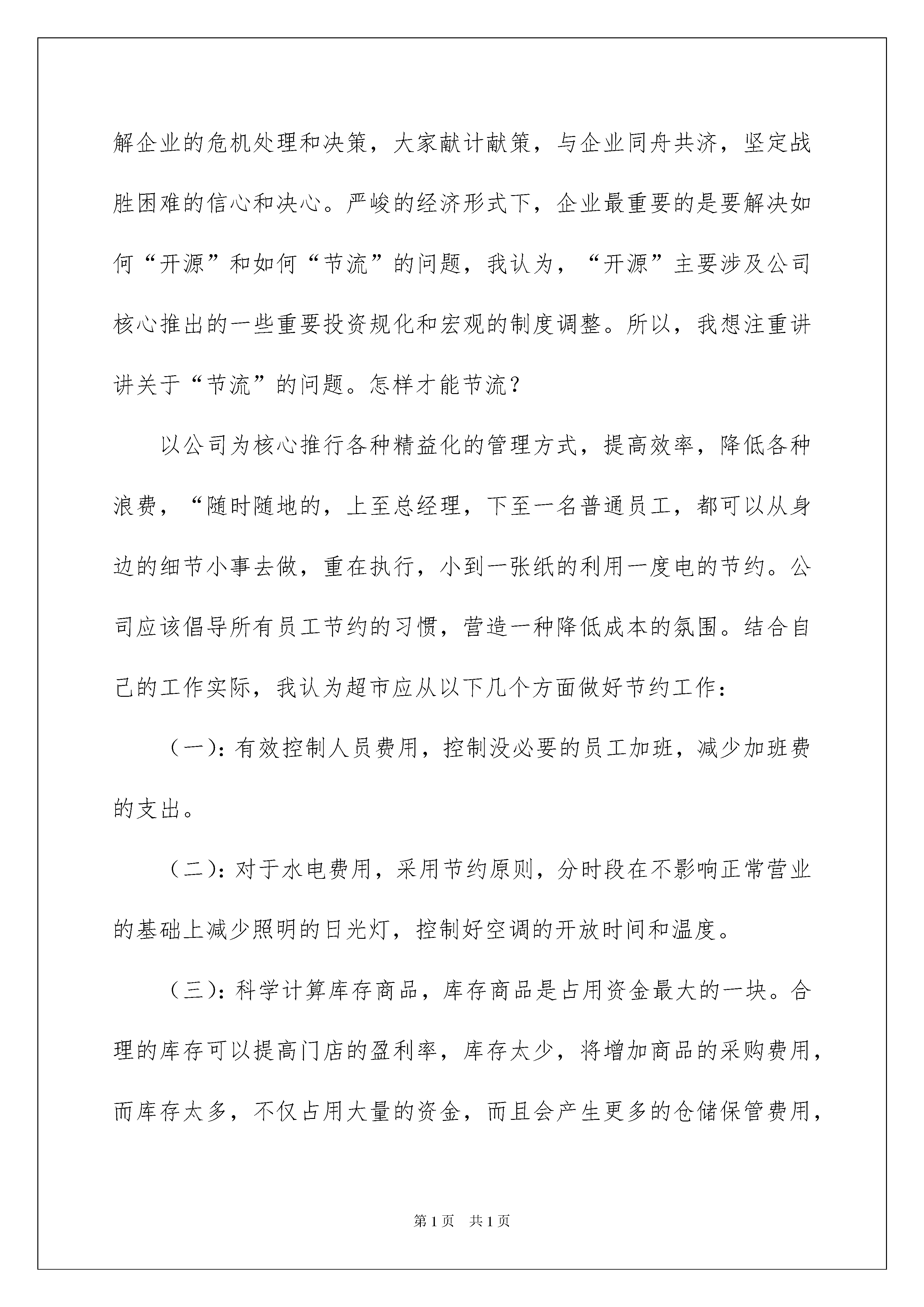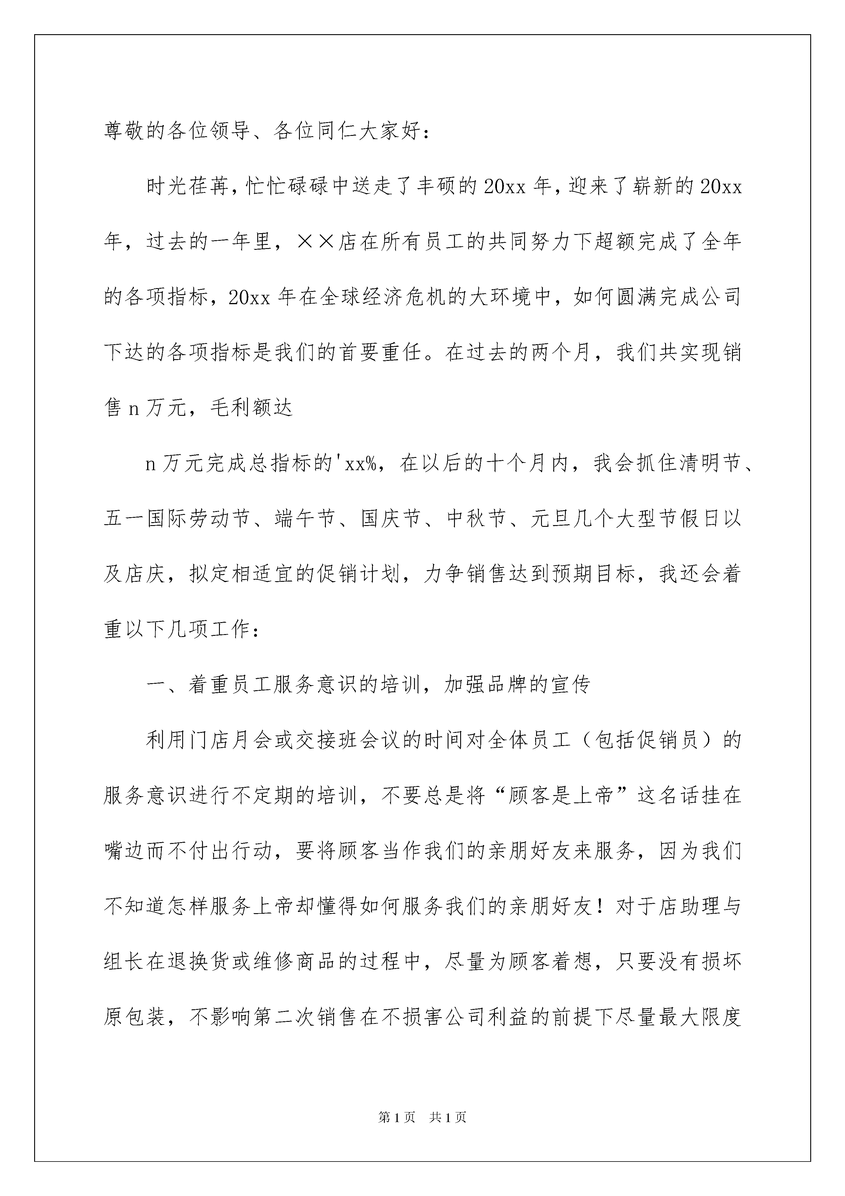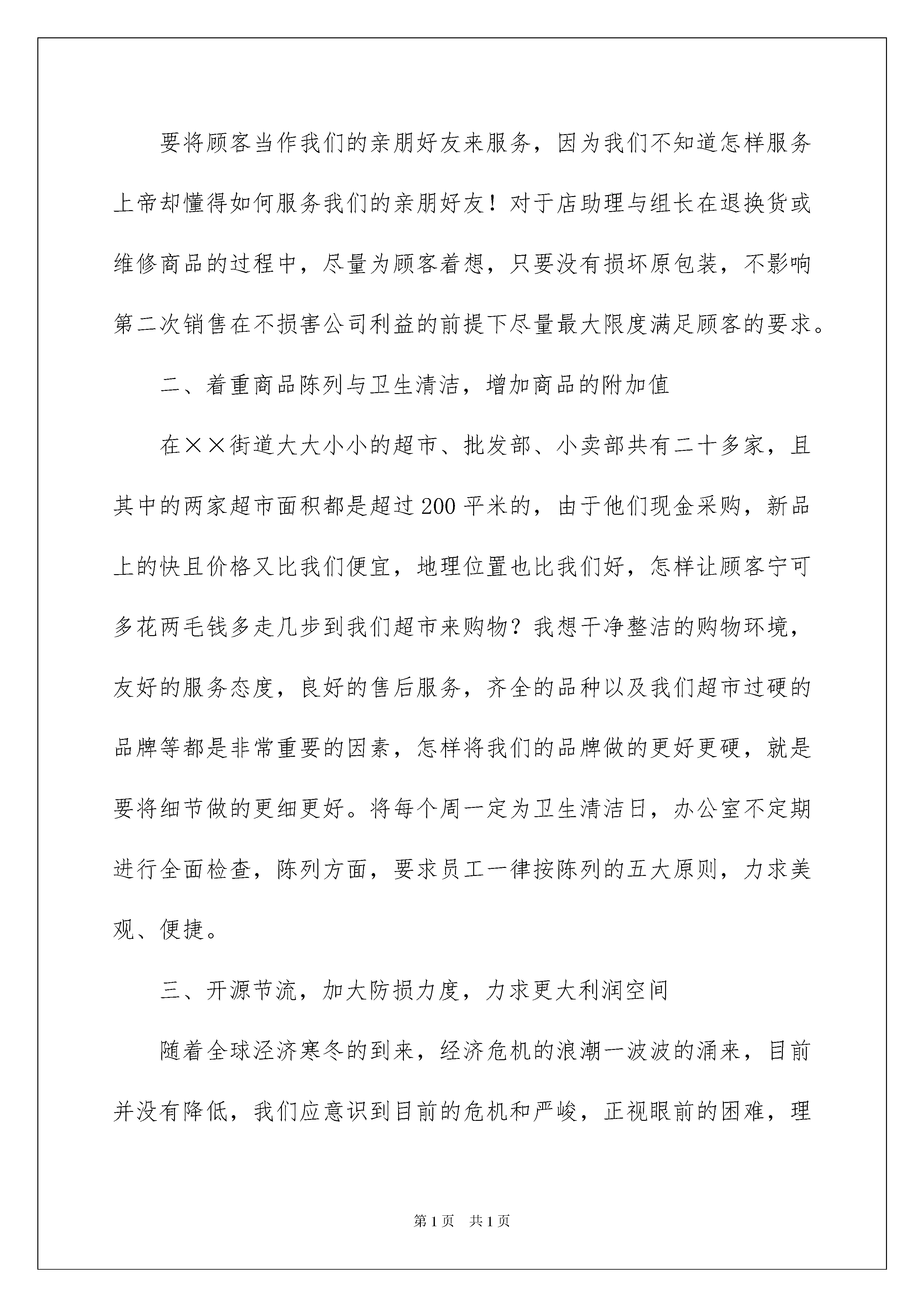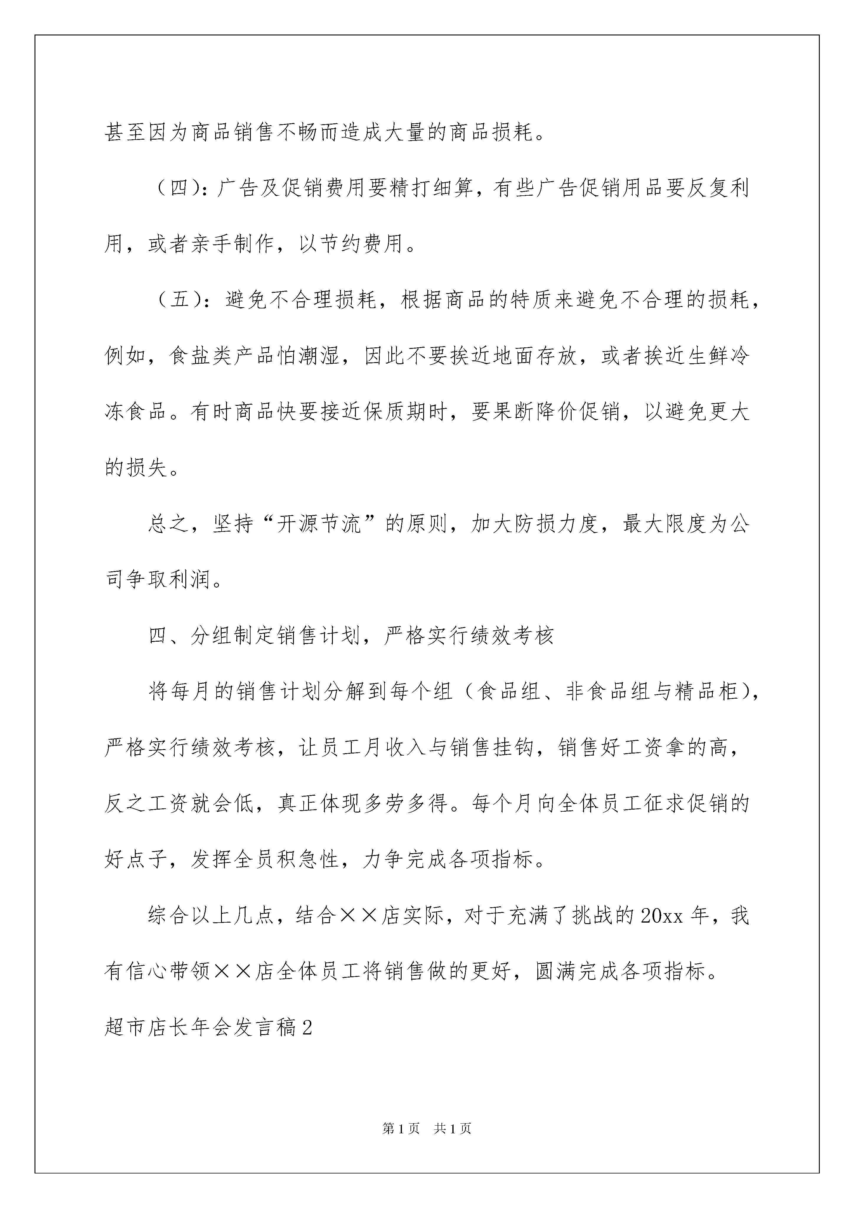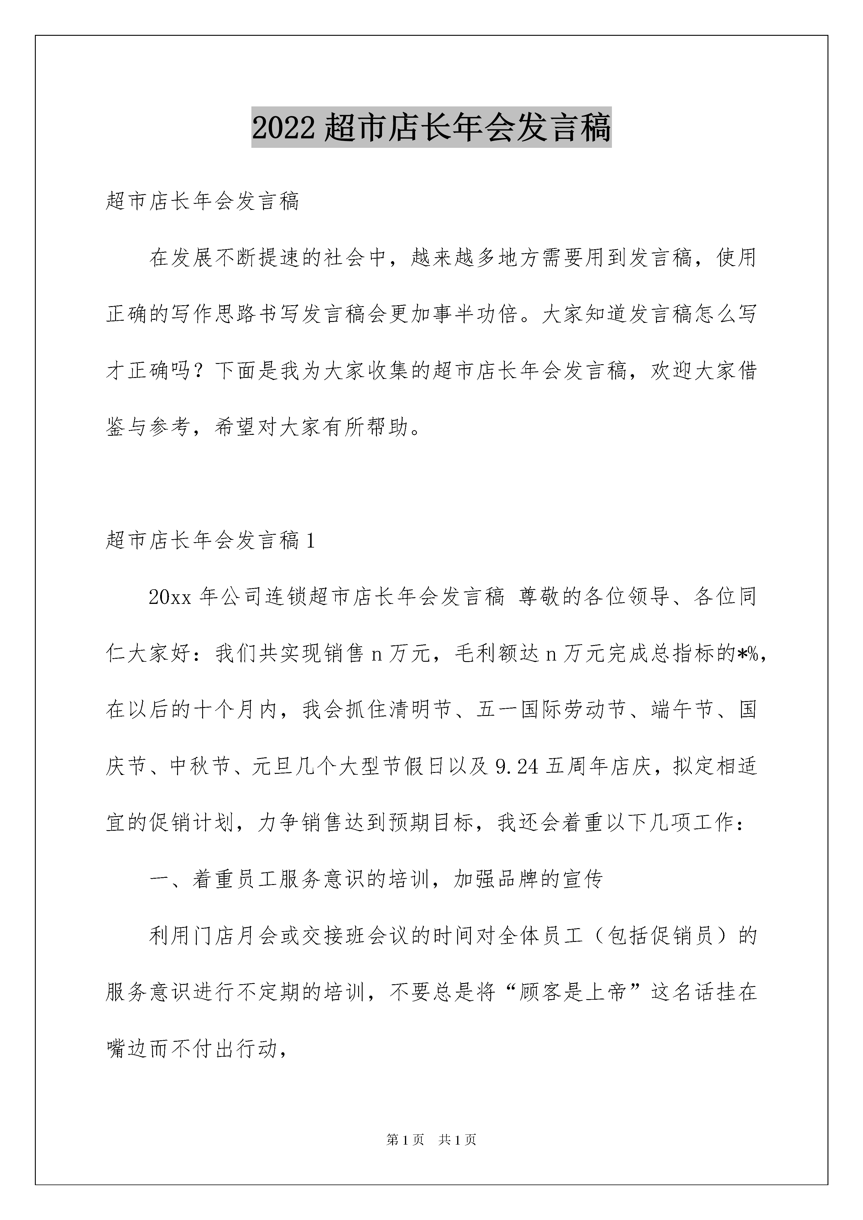2022超市店长年会发言稿超市店长年会发言稿在发展不断提速的社会中,越来越多地方需要用到发言稿,使用正确的写作思路书写发言稿会更加事半功倍。大家知道发言稿怎么写才正确吗?下面是我为大家收集的超市店长年会发言稿,欢迎大家借鉴与参考,希望对大家有所帮助。超市店长年会发言稿120xx年公司连锁超市店长年会发言稿尊敬的各位领导、各位同仁大家好:我们共实现销售n万元,毛利额达n万元完成总指标的*%,在以后的十个月内,我会抓住清明节、五一国际劳动节、端午节、国庆节、中秋节、元旦几个大型节假日以及9.24五周年店庆,拟定相适宜的促销计划,力争销售达到预期目标,我还会着重以下几项工作:一、着重员工服务意识的培训,加强品牌的宣传利用门店月会或交接班会议的时间对全体员工(包括促销员)的服务意识进行不定期的培训,不要总是将“顾客是上帝”这名话挂在嘴边而不付出行动,要将顾客当作我们的亲朋好友来服务,因为我们不知道怎样服务上帝却懂得如何服务我们的亲朋好友!对于店助理与组长在退换货或维修商品的过程中,尽量为顾客着想,只要没有损坏原包装,不影响第二次销售在不损害公司利益的前提下尽量最大限度满足顾客的要求。二、着重商品陈列与卫生清洁,增加商品的附加值在××街道大大小小的超市、批发部、小卖部共有二十多家,且其中的两家超市面积都是超过200平米的,由于他们现金采购,新品上的快且价格又比我们便宜,地理位置也比我们好,怎样让顾客宁可多花两毛钱多走几步到我们超市来购物?我想干净整洁的购物环境,友好的服务态度,良好的售后服务,齐全的品种以及我们超市过硬的品牌等都是非常重要的因素,怎样将我们的品牌做的更好更硬,就是要将细节做的更细更好。将每个周一定为卫生清洁日,办公室不定期进行全面检查,陈列方面,要求员工一律按陈列的五大原则,力求美观、便捷。三、开源节流,加大防损力度,力求更大利润空间随着全球泾济寒冬的到来,经济危机的浪潮一波波的涌来,目前并没有降低,我们应意识到目前的危机和严峻,正视眼前的困难,理解企业的危机处理和决策,大家献计献策,与企业同舟共济,坚定战胜困难的信心和决心。严峻的经济形式下,企业最重要的是要解决如何“开源”和如何“节流”的问题,我认为,“开源”主要涉及公司核心推出的一些重要投资规化和宏观的制度调整。所以,我想注重讲讲关于“节流”的问题。怎样才能节流?以公司为核心推行各种精益化的管理方式,提高效率,降低各种浪费,“随时随地的,上至总经理,下至一名普通员工,都可以从身边的细节小事去做,重在执行,小到一张纸的利用一度电的节约。公司应该倡导所有员工节约的习惯,营造一种降低成本的氛围。结合自己的工作实际,我认为超市应从以下几个方面做好节约工作:(一):有效控制人员费用,控制没必要的员工加班,减少加班费的支出。(二):对于水电费用,采用节约原则,分时段在不影响正常营业的基础上减少照明的日光灯,控制好空调的开放时间和温度。(三):科学计算库存商品,库存商品是占用资金最大的一块。合理的库存可以提高门店的盈利率,库存太少,将增加商品的采购费用,而库存太多,不仅占用大量的资金,而且会产生更多的仓储保管费用,甚至因为商品销售不畅而造成大量的商品损耗。(四):广告及促销费用要精打细算,有些广告促销用品要反复利用,或者亲手制作,以节约费用。(五):避免不合理损耗,根据商品的特质来避免不合理的损耗,例如,食盐类产品怕潮湿,因此不要挨近地面存放,或者挨近生鲜冷冻食品。有时商品快要接近保质期时,要果断降价促销,以避免更大的损失。总之,坚持“开源节流”的原则,加大防损力度,最大限度为公司争取利润。四、分组制定销售计划,严格实行绩效考核将每月的销售计划分解到每个组(食品组、非食品组与精品柜),严格实行绩效考核,让员工月收入与销售挂钩,销售好工资拿的高,反之工资就会低,真正体现多劳多得。每个月向全体员工征求促销的好点子,发挥全员积急性,力争完成各项指标。综合以上几点,结合××店实际,对于充满了挑战的20xx年,我有信心带领××店全体员工将销售做的更好,圆满完成各项指标。超市店长年会发言稿2尊敬的各位领导、各位同仁大家好:时光荏苒,忙忙碌碌中送走了丰硕的20xx年,迎来了崭新的20xx年,过去的一年里,××店在所有员工的共同努力下超额完成了全年的各项指标,20xx年在全球经济危机的大环境中,如何圆满完成公司下达的各项指标是我们的首要重任。在过去的两个月,我们共实现销售n万元,毛利额达n万元完成总指标的'xx%,在以后的十个月内,我会抓住清明节、五一国际劳动节、端午节、国庆节、中秋节、元旦几个大型节假日以及店庆,拟定相适宜的促销计划,力争