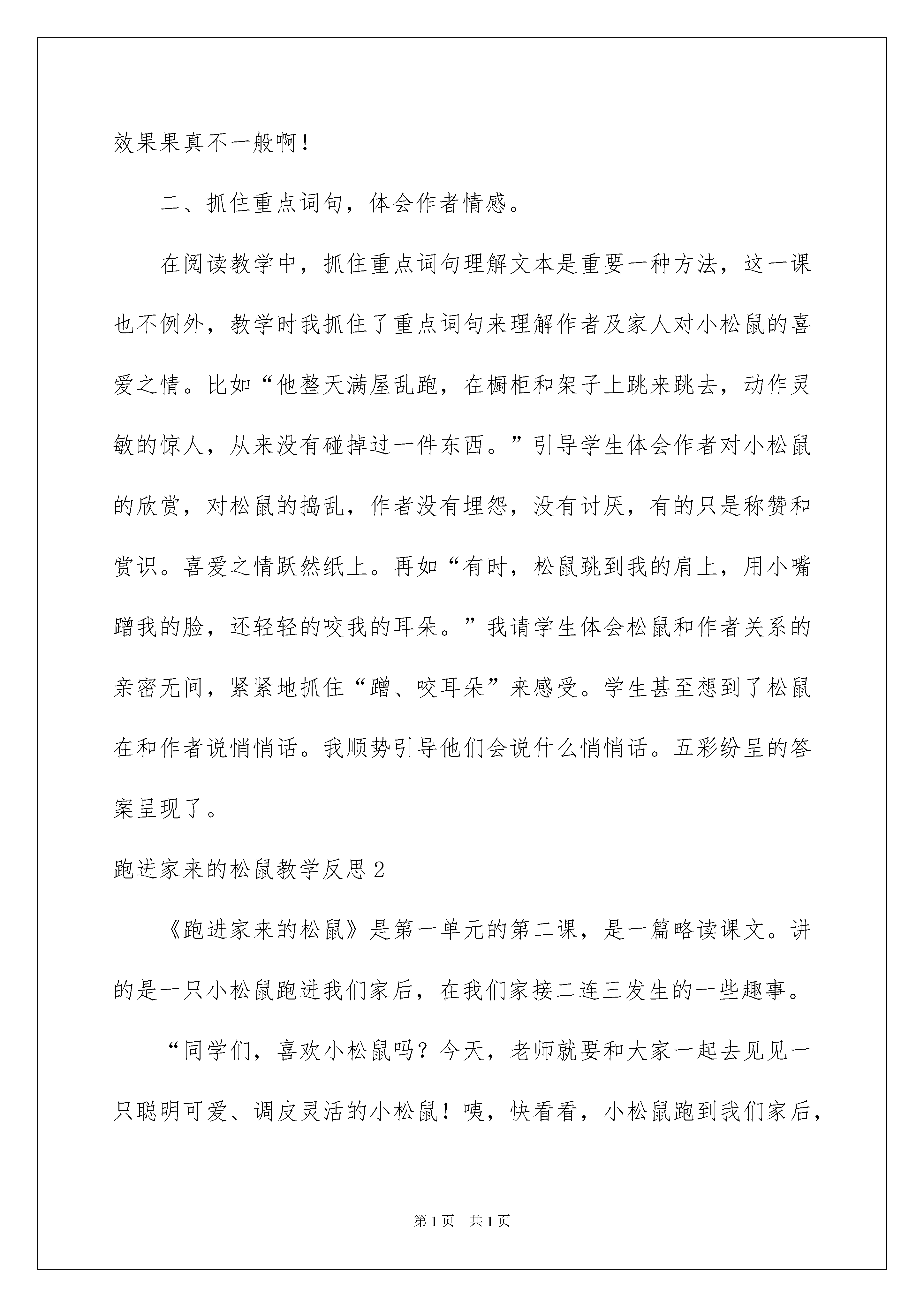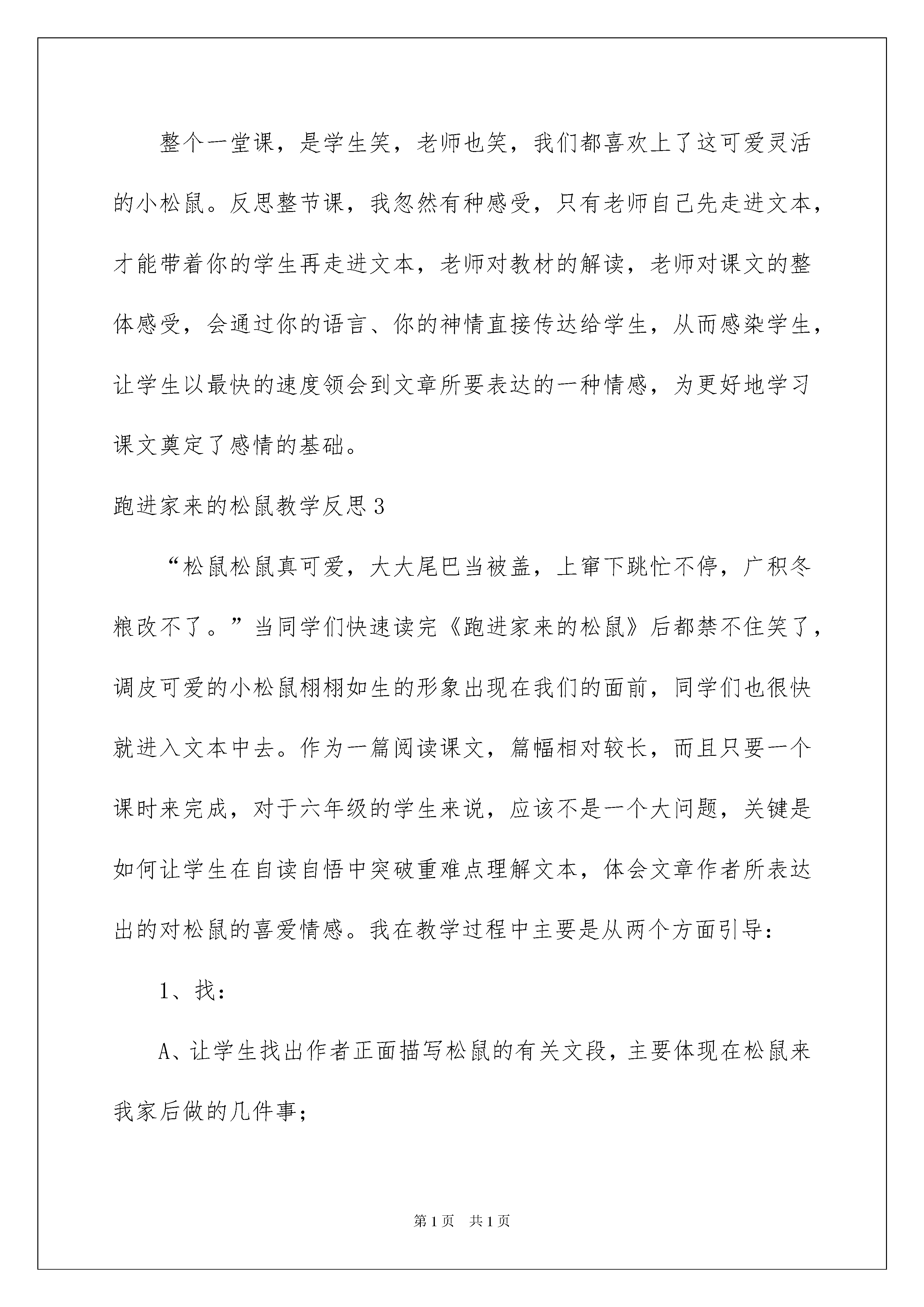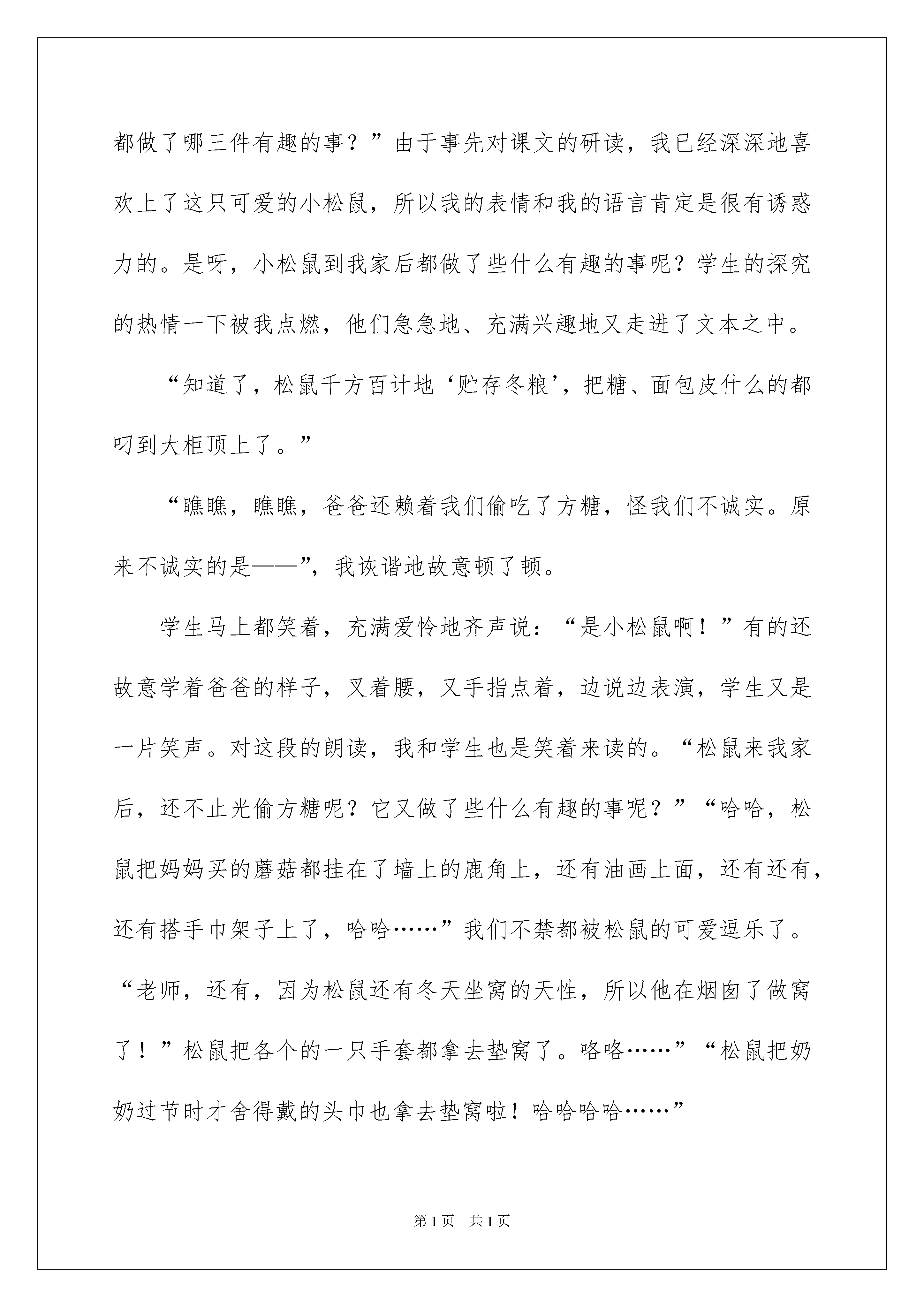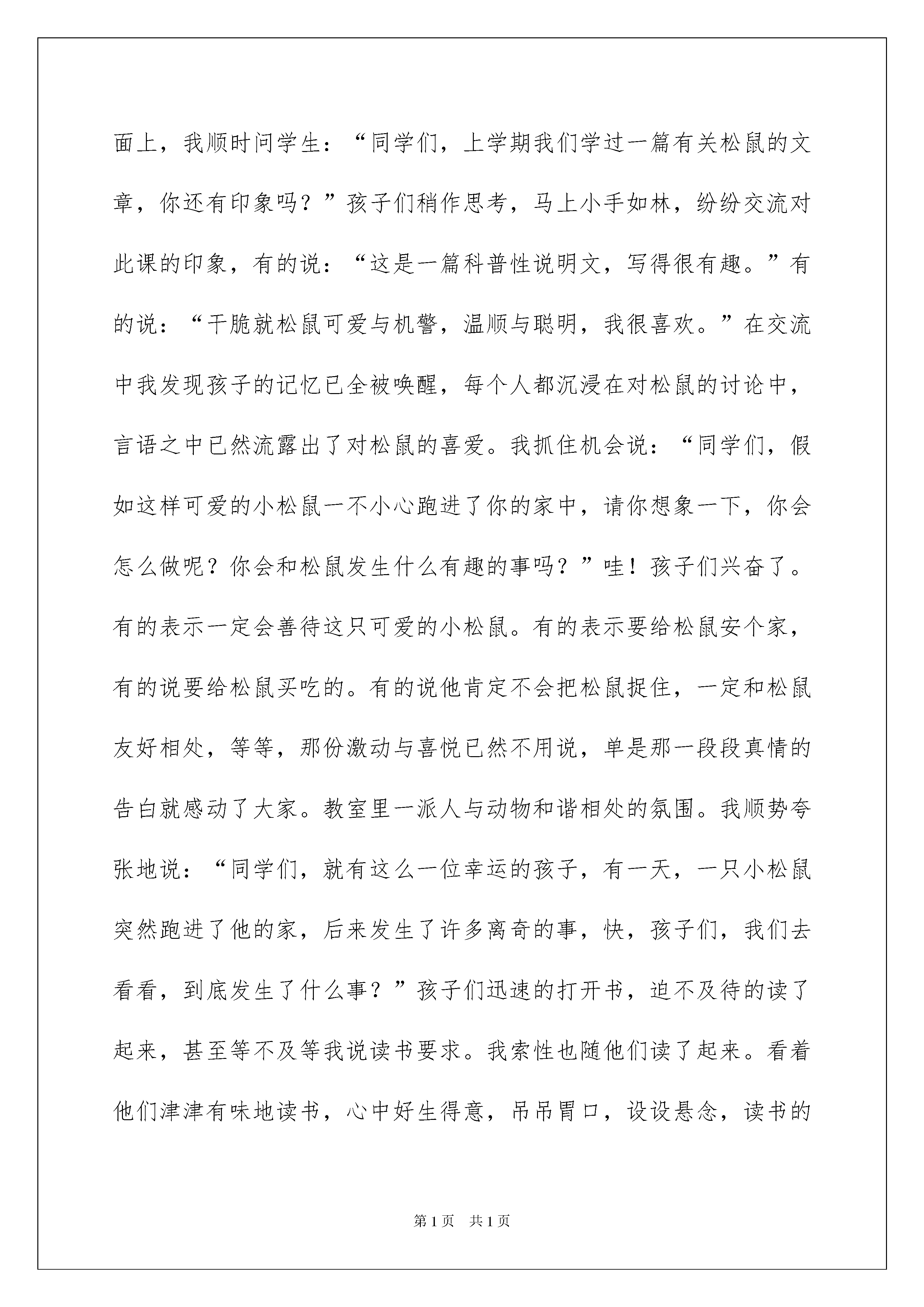 2022跑进家来的松鼠教学反思跑进家来的松鼠教学反思作为一位到岗不久的教师,课堂教学是我们的任务之一,通过教学反思可以很好地改正讲课缺点,那么优秀的教学反思是什么样的呢?以下是我为大家整理的跑进家来的松鼠教学反思,供大家参考借鉴,希望可以帮助到有需要的朋友。跑进家来的松鼠教学反思1因为要上一节校级展示课,我翻了一下课本,最后决定上《跑进家来的松鼠》。选择这一课,一是因为很亲切,从来就比较喜欢小动物,觉得可爱,我想孩子们也会和我有同感;二是如今有许多伤害、虐待小动物的事件经常发生,我想为孩子,为那些可爱的小动物做点什么。上好课,依然思潮起伏,下面是我对这一课教后的一点想法。一、美图引入,谈话激情,让学生很兴奋。一上课,我就通过课件给学生们上演了一场视觉盛宴,各种各样的或可爱或有趣的小动物轮番出演,让学生纷纷进入缤纷的动物世界,课堂上不时响起孩子们的“啧啧”声。这时,画面停在了“松鼠”画面上,我顺时问学生:“同学们,上学期我们学过一篇有关松鼠的文章,你还有印象吗?”孩子们稍作思考,马上小手如林,纷纷交流对此课的印象,有的说:“这是一篇科普性说明文,写得很有趣。”有的说:“干脆就松鼠可爱与机警,温顺与聪明,我很喜欢。”在交流中我发现孩子的记忆已全被唤醒,每个人都沉浸在对松鼠的讨论中,言语之中已然流露出了对松鼠的喜爱。我抓住机会说:“同学们,假如这样可爱的小松鼠一不小心跑进了你的家中,请你想象一下,你会怎么做呢?你会和松鼠发生什么有趣的事吗?”哇!孩子们兴奋了。有的表示一定会善待这只可爱的小松鼠。有的表示要给松鼠安个家,有的说要给松鼠买吃的。有的说他肯定不会把松鼠捉住,一定和松鼠友好相处,等等,那份激动与喜悦已然不用说,单是那一段段真情的告白就感动了大家。教室里一派人与动物和谐相处的氛围。我顺势夸张地说:“同学们,就有这么一位幸运的孩子,有一天,一只小松鼠突然跑进了他的家,后来发生了许多离奇的事,快,孩子们,我们去看看,到底发生了什么事?”孩子们迅速的打开书,迫不及待的读了起来,甚至等不及等我说读书要求。我索性也随他们读了起来。看着他们津津有味地读书,心中好生得意,吊吊胃口,设设悬念,读书的效果果真不一般啊!二、抓住重点词句,体会作者情感。在阅读教学中,抓住重点词句理解文本是重要一种方法,这一课也不例外,教学时我抓住了重点词句来理解作者及家人对小松鼠的喜爱之情。比如“他整天满屋乱跑,在橱柜和架子上跳来跳去,动作灵敏的惊人,从来没有碰掉过一件东西。”引导学生体会作者对小松鼠的欣赏,对松鼠的捣乱,作者没有埋怨,没有讨厌,有的只是称赞和赏识。喜爱之情跃然纸上。再如“有时,松鼠跳到我的肩上,用小嘴蹭我的脸,还轻轻的咬我的耳朵。”我请学生体会松鼠和作者关系的亲密无间,紧紧地抓住“蹭、咬耳朵”来感受。学生甚至想到了松鼠在和作者说悄悄话。我顺势引导他们会说什么悄悄话。五彩纷呈的答案呈现了。跑进家来的松鼠教学反思2《跑进家来的松鼠》是第一单元的第二课,是一篇略读课文。讲的是一只小松鼠跑进我们家后,在我们家接二连三发生的一些趣事。“同学们,喜欢小松鼠吗?今天,老师就要和大家一起去见见一只聪明可爱、调皮灵活的小松鼠!咦,快看看,小松鼠跑到我们家后,都做了哪三件有趣的事?”由于事先对课文的研读,我已经深深地喜欢上了这只可爱的小松鼠,所以我的表情和我的语言肯定是很有诱惑力的。是呀,小松鼠到我家后都做了些什么有趣的事呢?学生的探究的热情一下被我点燃,他们急急地、充满兴趣地又走进了文本之中。“知道了,松鼠千方百计地‘贮存冬粮’,把糖、面包皮什么的都叼到大柜顶上了。”“瞧瞧,瞧瞧,爸爸还赖着我们偷吃了方糖,怪我们不诚实。原来不诚实的是——”,我诙谐地故意顿了顿。学生马上都笑着,充满爱怜地齐声说:“是小松鼠啊!”有的还故意学着爸爸的样子,叉着腰,又手指点着,边说边表演,学生又是一片笑声。对这段的朗读,我和学生也是笑着来读的。“松鼠来我家后,还不止光偷方糖呢?它又做了些什么有趣的事呢?”“哈哈,松鼠把妈妈买的蘑菇都挂在了墙上的鹿角上,还有油画上面,还有还有,还有搭手巾架子上了,哈哈……”我们不禁都被松鼠的可爱逗乐了。“老师,还有,因为松鼠还有冬天坐窝的天性,所以他在烟囱了做窝了!”松鼠把各个的一只手套都拿去垫窝了。咯咯……”“松鼠把奶奶过节时才舍得戴的头巾也拿去垫窝啦!哈哈哈哈……”整个一堂课,是学生笑,老师也笑,我们都喜欢上了这可爱灵活的小松鼠。反思整节课,我忽然有种感受,只有老师自己先走进文本,才能带着你的学生再走进文本,老师对教材的解读,老师对课文的整体感受,会通过你的语言、你的神情直接传达给学生,从而感染