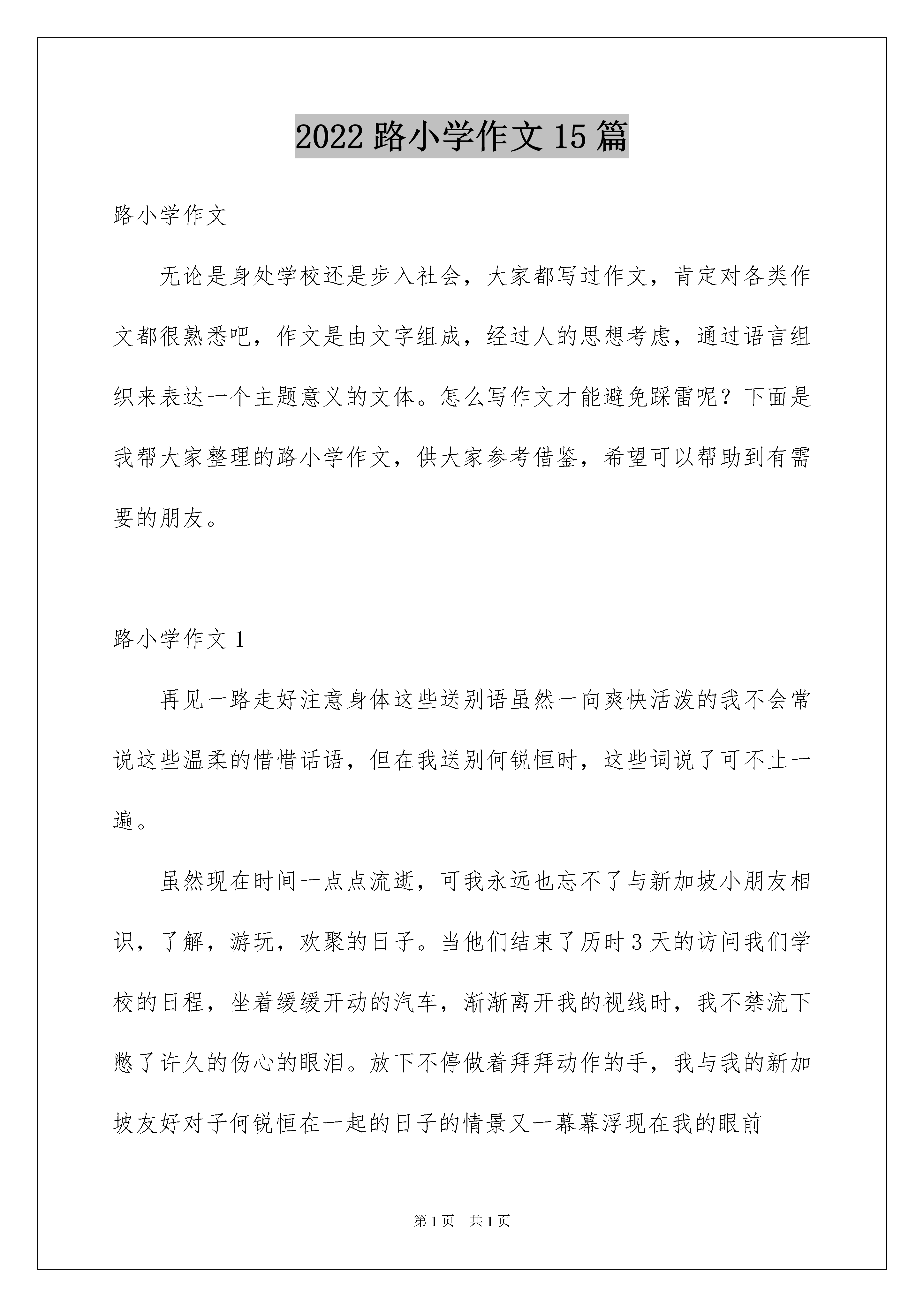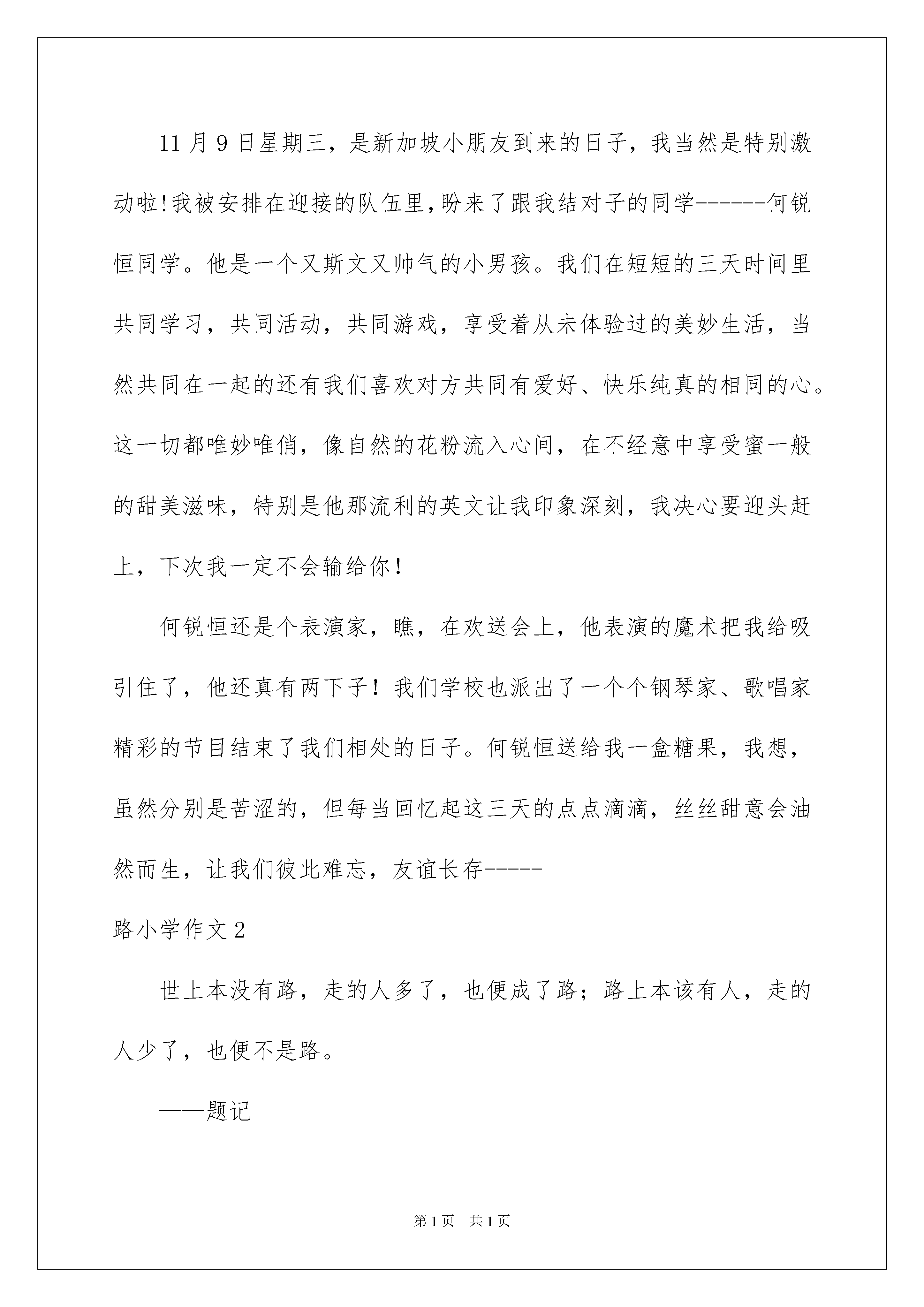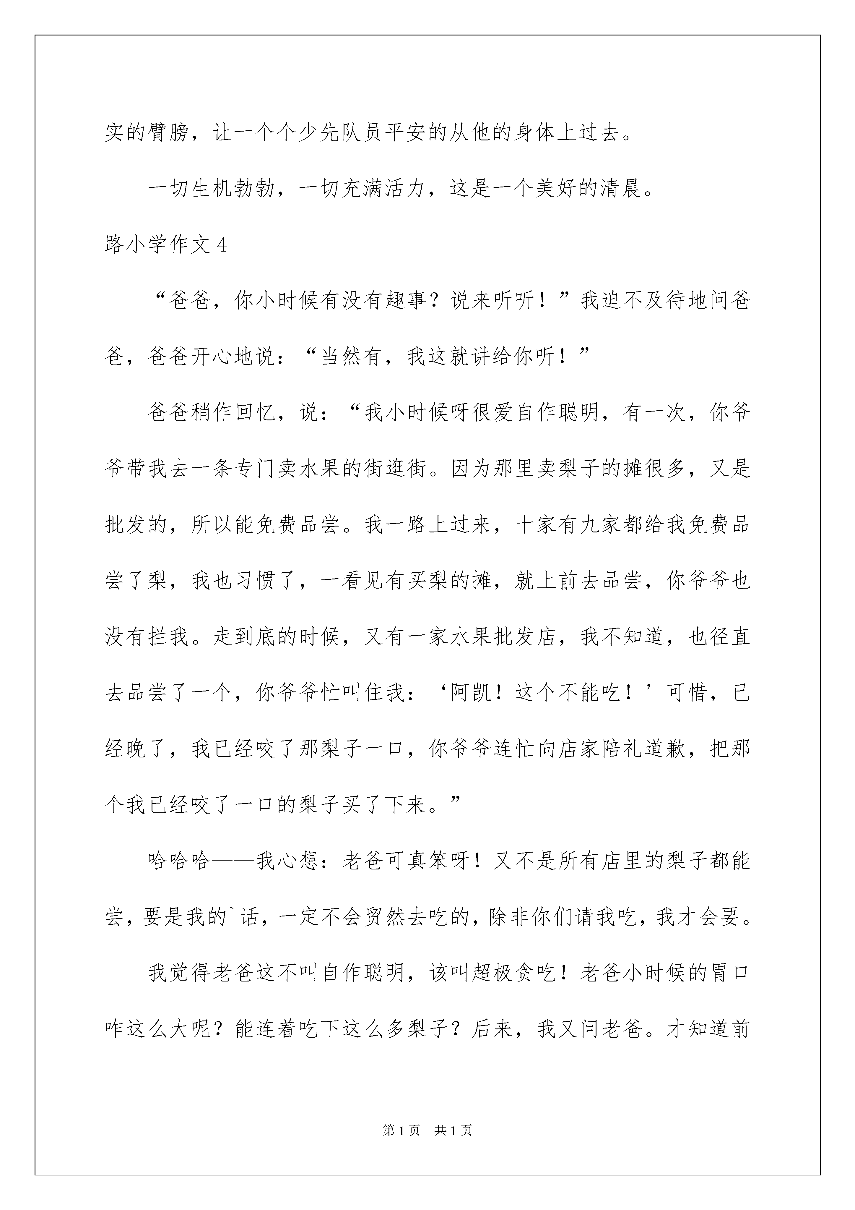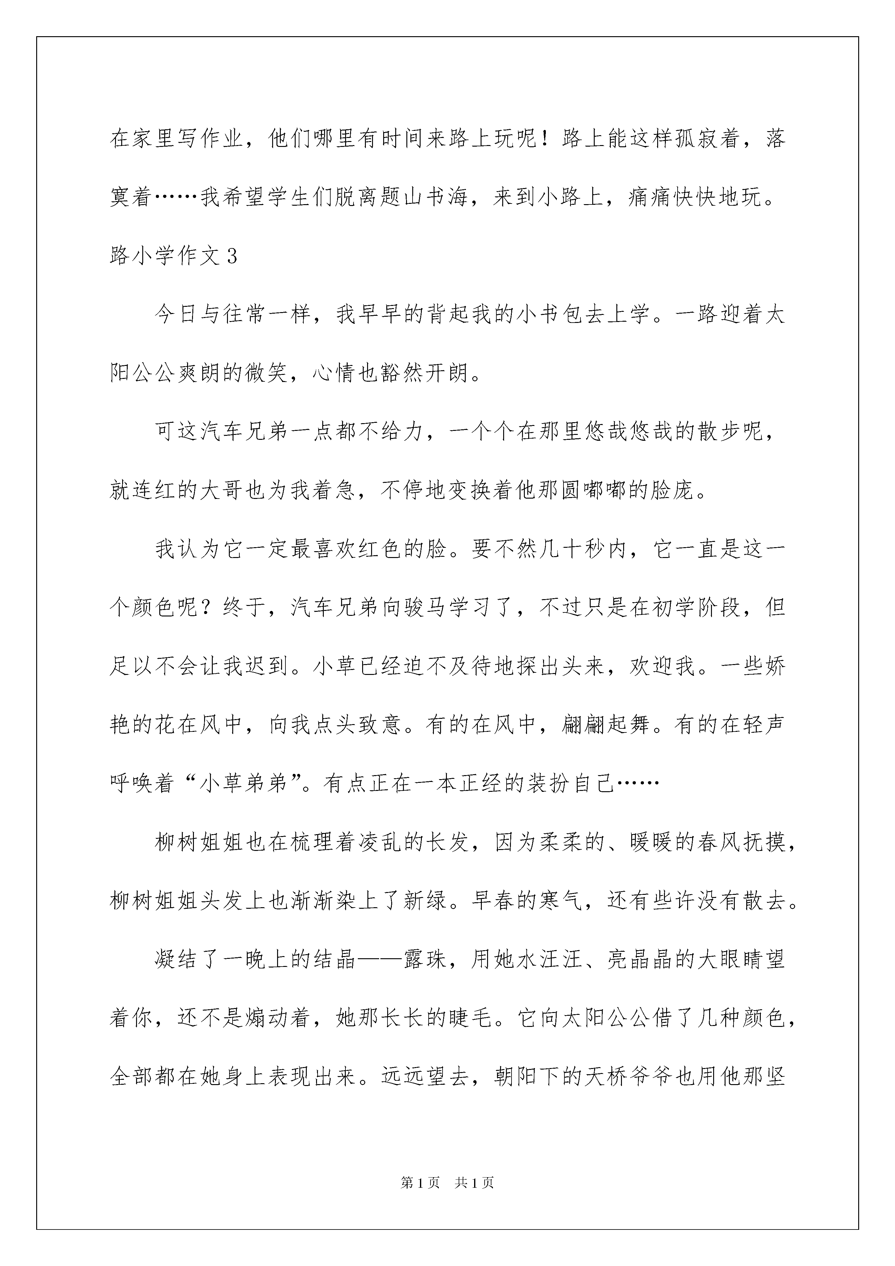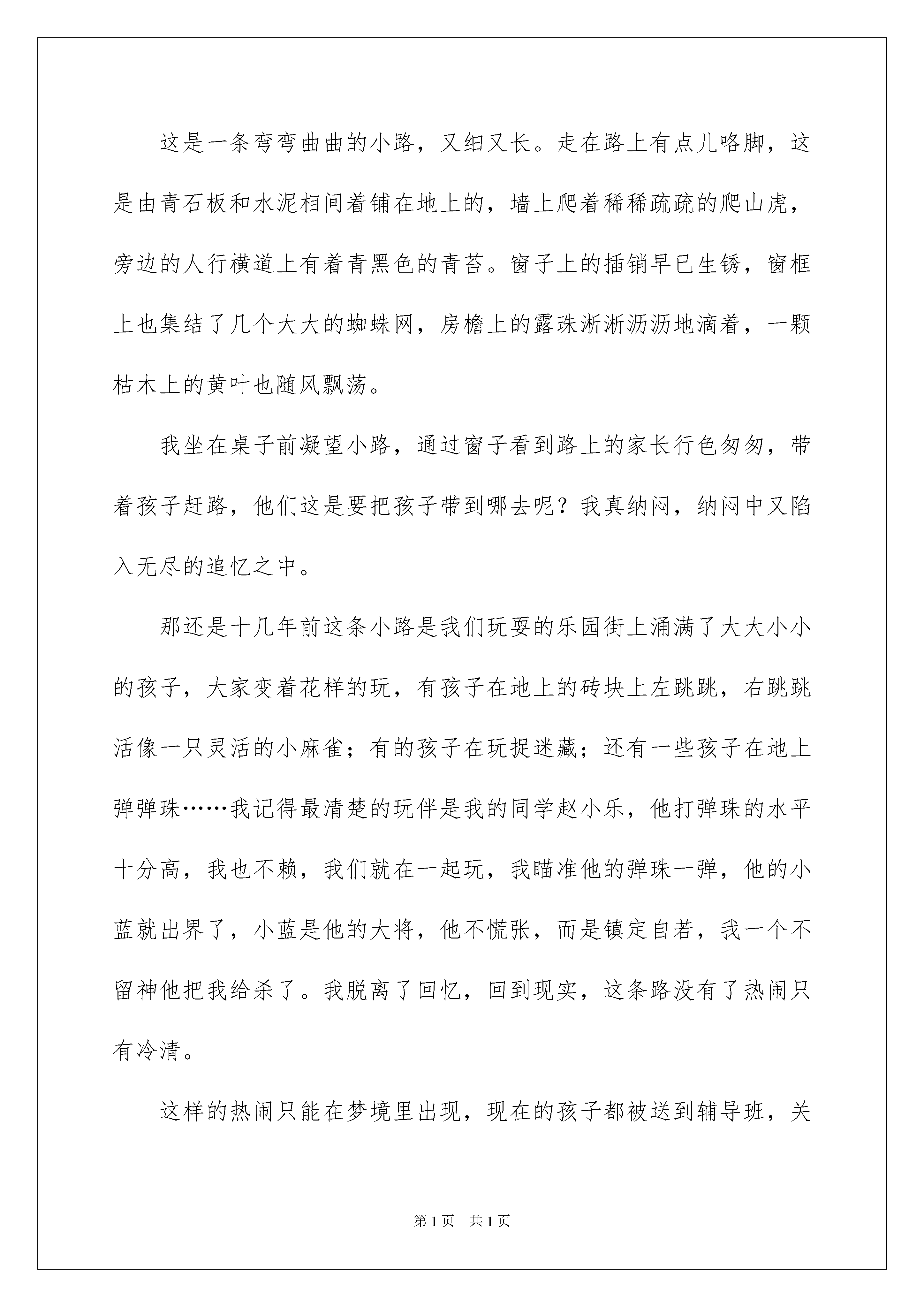2022路小学作文15篇路小学作文无论是身处学校还是步入社会,大家都写过作文,肯定对各类作文都很熟悉吧,作文是由文字组成,经过人的思想考虑,通过语言组织来表达一个主题意义的文体。怎么写作文才能避免踩雷呢?下面是我帮大家整理的路小学作文,供大家参考借鉴,希望可以帮助到有需要的朋友。路小学作文1再见一路走好注意身体这些送别语虽然一向爽快活泼的我不会常说这些温柔的惜惜话语,但在我送别何锐恒时,这些词说了可不止一遍。虽然现在时间一点点流逝,可我永远也忘不了与新加坡小朋友相识,了解,游玩,欢聚的日子。当他们结束了历时3天的访问我们学校的日程,坐着缓缓开动的汽车,渐渐离开我的视线时,我不禁流下憋了许久的伤心的眼泪。放下不停做着拜拜动作的手,我与我的新加坡友好对子何锐恒在一起的日子的情景又一幕幕浮现在我的眼前11月9日星期三,是新加坡小朋友到来的日子,我当然是特别激动啦!我被安排在迎接的队伍里,盼来了跟我结对子的同学------何锐恒同学。他是一个又斯文又帅气的小男孩。我们在短短的三天时间里共同学习,共同活动,共同游戏,享受着从未体验过的美妙生活,当然共同在一起的还有我们喜欢对方共同有爱好、快乐纯真的相同的心。这一切都唯妙唯俏,像自然的花粉流入心间,在不经意中享受蜜一般的甜美滋味,特别是他那流利的英文让我印象深刻,我决心要迎头赶上,下次我一定不会输给你!何锐恒还是个表演家,瞧,在欢送会上,他表演的魔术把我给吸引住了,他还真有两下子!我们学校也派出了一个个钢琴家、歌唱家精彩的节目结束了我们相处的日子。何锐恒送给我一盒糖果,我想,虽然分别是苦涩的,但每当回忆起这三天的点点滴滴,丝丝甜意会油然而生,让我们彼此难忘,友谊长存-----路小学作文2世上本没有路,走的人多了,也便成了路;路上本该有人,走的人少了,也便不是路。——题记这是一条弯弯曲曲的小路,又细又长。走在路上有点儿咯脚,这是由青石板和水泥相间着铺在地上的,墙上爬着稀稀疏疏的爬山虎,旁边的人行横道上有着青黑色的青苔。窗子上的插销早已生锈,窗框上也集结了几个大大的蜘蛛网,房檐上的露珠淅淅沥沥地滴着,一颗枯木上的黄叶也随风飘荡。我坐在桌子前凝望小路,通过窗子看到路上的家长行色匆匆,带着孩子赶路,他们这是要把孩子带到哪去呢?我真纳闷,纳闷中又陷入无尽的追忆之中。那还是十几年前这条小路是我们玩耍的乐园街上涌满了大大小小的孩子,大家变着花样的玩,有孩子在地上的砖块上左跳跳,右跳跳活像一只灵活的小麻雀;有的孩子在玩捉迷藏;还有一些孩子在地上弹弹珠……我记得最清楚的玩伴是我的同学赵小乐,他打弹珠的水平十分高,我也不赖,我们就在一起玩,我瞄准他的弹珠一弹,他的小蓝就出界了,小蓝是他的大将,他不慌张,而是镇定自若,我一个不留神他把我给杀了。我脱离了回忆,回到现实,这条路没有了热闹只有冷清。这样的热闹只能在梦境里出现,现在的孩子都被送到辅导班,关在家里写作业,他们哪里有时间来路上玩呢!路上能这样孤寂着,落寞着……我希望学生们脱离题山书海,来到小路上,痛痛快快地玩。路小学作文3今日与往常一样,我早早的背起我的小书包去上学。一路迎着太阳公公爽朗的微笑,心情也豁然开朗。可这汽车兄弟一点都不给力,一个个在那里悠哉悠哉的散步呢,就连红的大哥也为我着急,不停地变换着他那圆嘟嘟的脸庞。我认为它一定最喜欢红色的脸。要不然几十秒内,它一直是这一个颜色呢?终于,汽车兄弟向骏马学习了,不过只是在初学阶段,但足以不会让我迟到。小草已经迫不及待地探出头来,欢迎我。一些娇艳的花在风中,向我点头致意。有的在风中,翩翩起舞。有的在轻声呼唤着“小草弟弟”。有点正在一本正经的装扮自己……柳树姐姐也在梳理着凌乱的长发,因为柔柔的、暖暖的春风抚摸,柳树姐姐头发上也渐渐染上了新绿。早春的寒气,还有些许没有散去。凝结了一晚上的结晶——露珠,用她水汪汪、亮晶晶的大眼睛望着你,还不是煽动着,她那长长的睫毛。它向太阳公公借了几种颜色,全部都在她身上表现出来。远远望去,朝阳下的天桥爷爷也用他那坚实的臂膀,让一个个少先队员平安的从他的身体上过去。一切生机勃勃,一切充满活力,这是一个美好的清晨。路小学作文4“爸爸,你小时候有没有趣事?说来听听!”我迫不及待地问爸爸,爸爸开心地说:“当然有,我这就讲给你听!”爸爸稍作回忆,说:“我小时候呀很爱自作聪明,有一次,你爷爷带我去一条专门卖水果的街逛街。因为那里卖梨子的摊很多,又是批发的,所以能免费品尝。我一路上过来,十家有九家都给我免费品尝了梨,我也习惯了,一看见有买梨的摊,就上前去品尝,你爷爷也没有拦我。走到底的时候,又有一家水果批发店,我不知道,也径直去品尝了一个