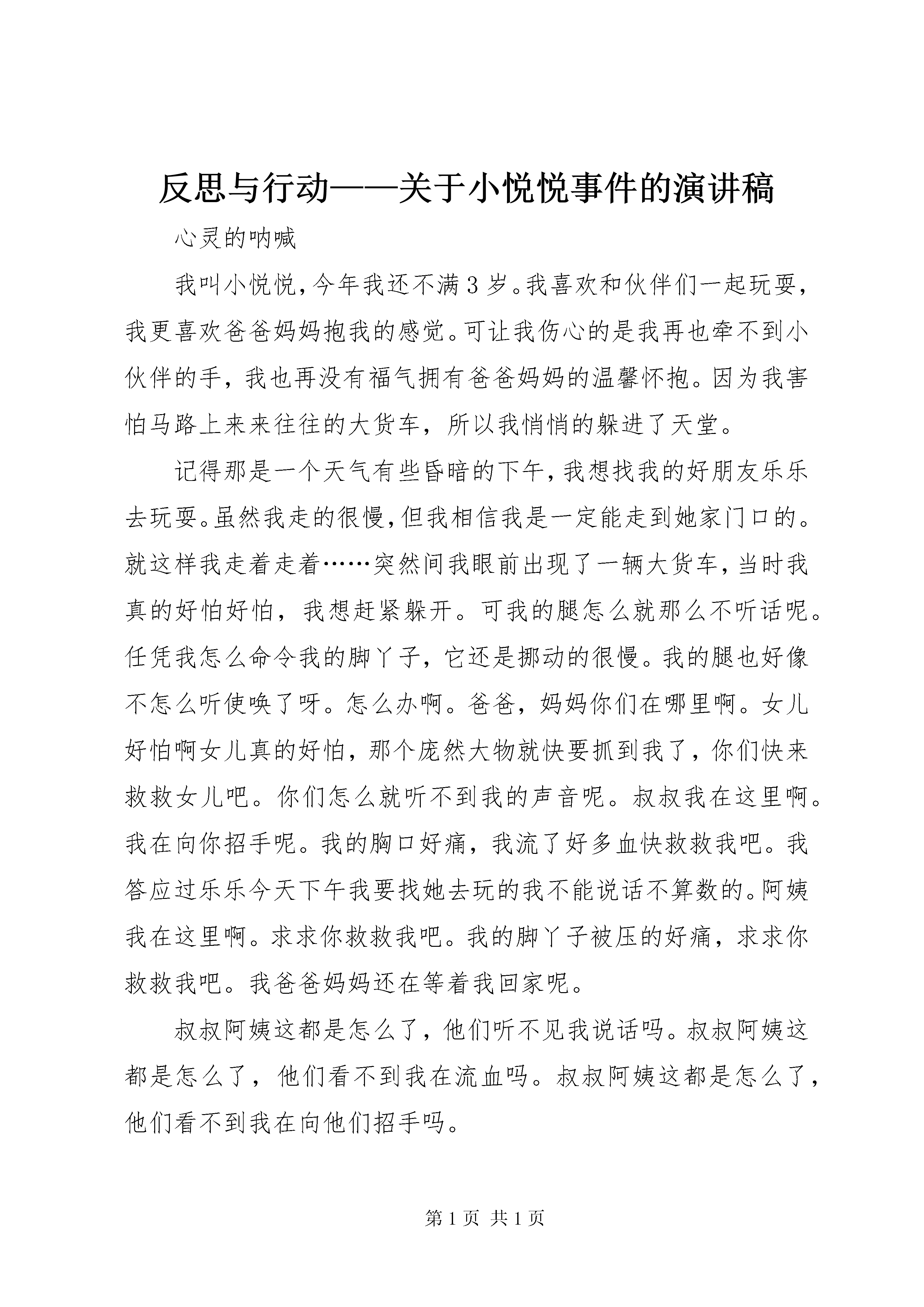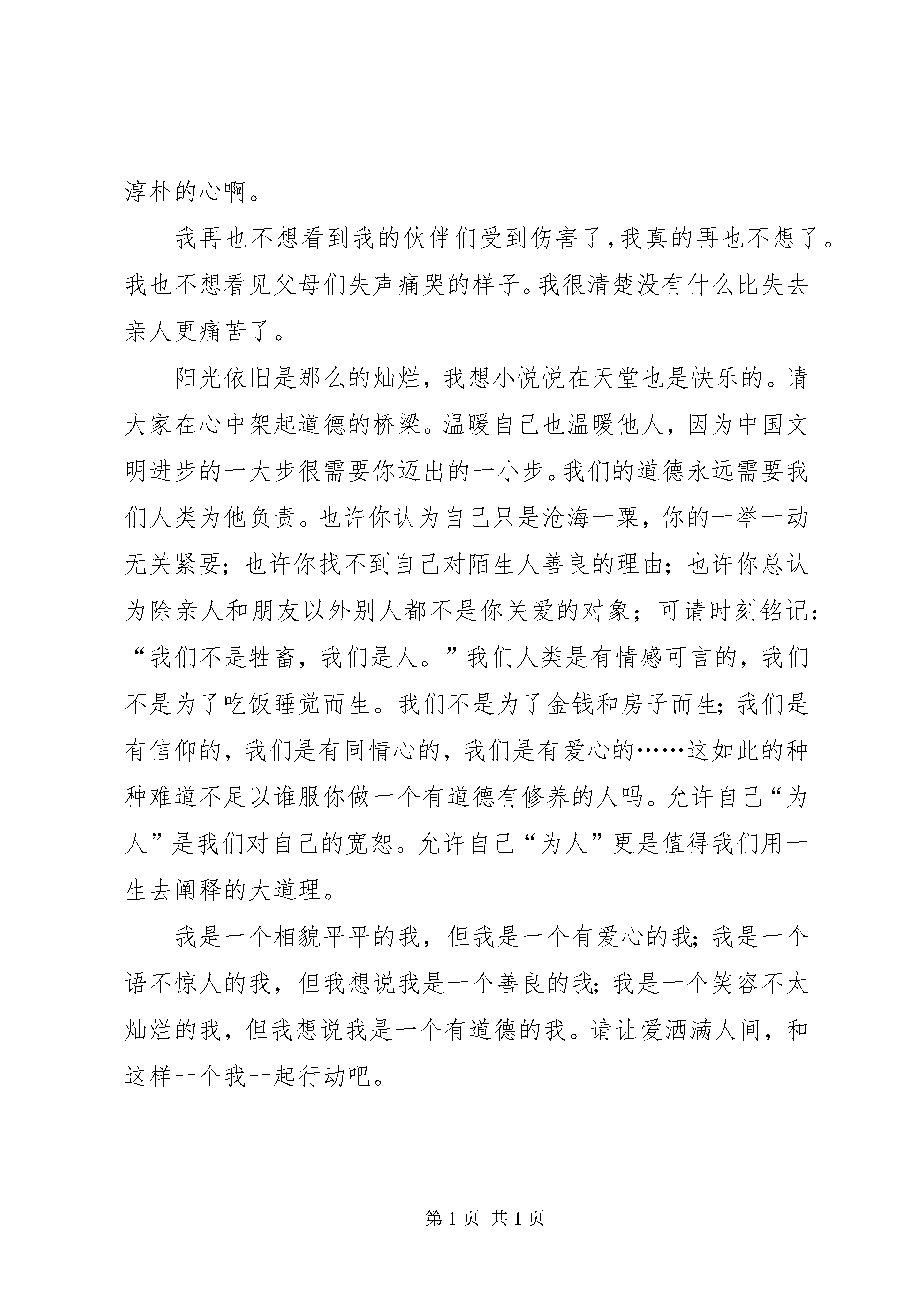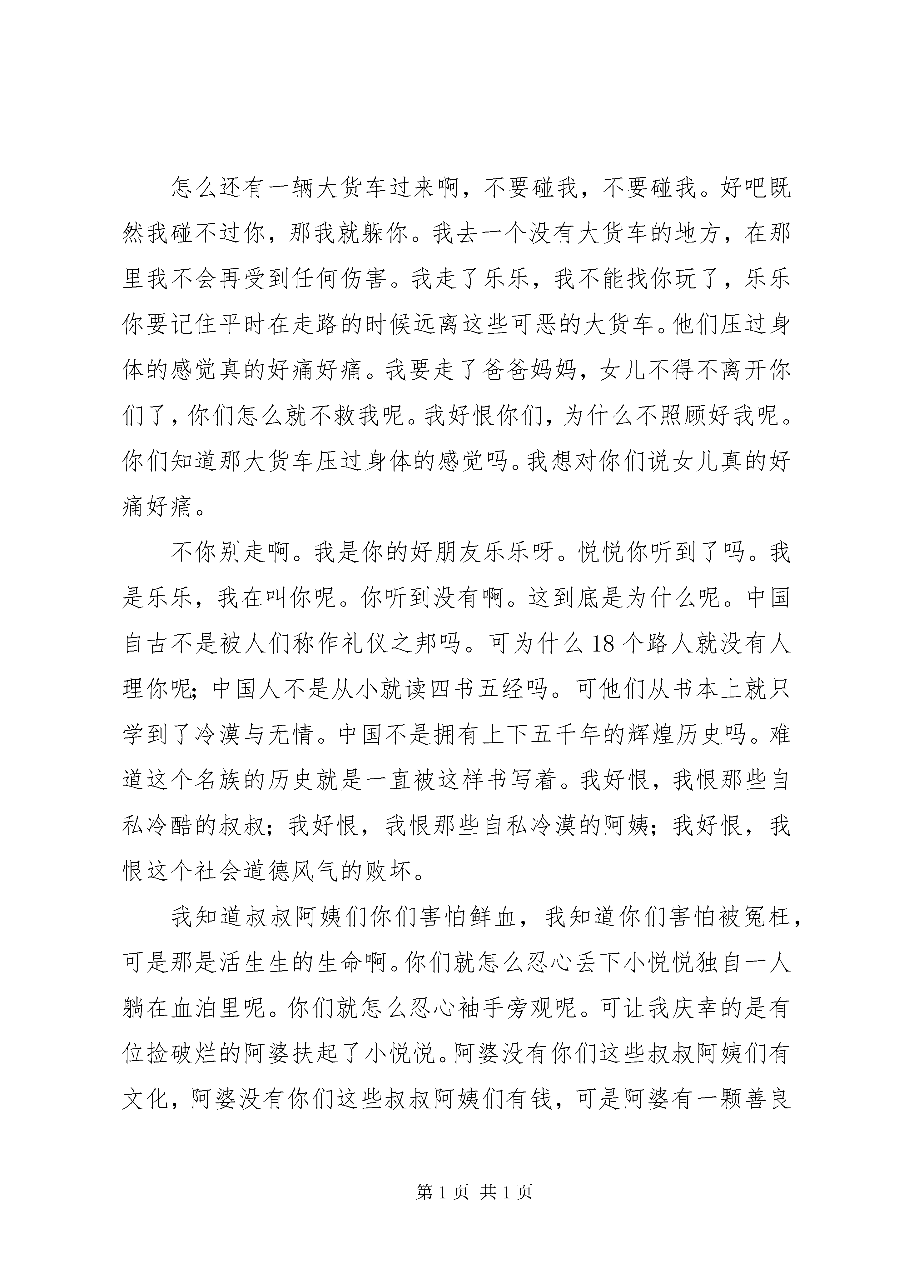 反思与行动——关于小悦悦事件的演讲稿心灵的呐喊我叫小悦悦,今年我还不满3岁。我喜欢和伙伴们一起玩耍,我更喜欢爸爸妈妈抱我的感觉。可让我伤心的是我再也牵不到小伙伴的手,我也再没有福气拥有爸爸妈妈的温馨怀抱。因为我害怕马路上来来往往的大货车,所以我悄悄的躲进了天堂。记得那是一个天气有些昏暗的下午,我想找我的好朋友乐乐去玩耍。虽然我走的很慢,但我相信我是一定能走到她家门口的。就这样我走着走着……突然间我眼前出现了一辆大货车,当时我真的好怕好怕,我想赶紧躲开。可我的腿怎么就那么不听话呢。任凭我怎么命令我的脚丫子,它还是挪动的很慢。我的腿也好像不怎么听使唤了呀。怎么办啊。爸爸,妈妈你们在哪里啊。女儿好怕啊女儿真的好怕,那个庞然大物就快要抓到我了,你们快来救救女儿吧。你们怎么就听不到我的声音呢。叔叔我在这里啊。我在向你招手呢。我的胸口好痛,我流了好多血快救救我吧。我答应过乐乐今天下午我要找她去玩的我不能说话不算数的。阿姨我在这里啊。求求你救救我吧。我的脚丫子被压的好痛,求求你救救我吧。我爸爸妈妈还在等着我回家呢。叔叔阿姨这都是怎么了,他们听不见我说话吗。叔叔阿姨这都是怎么了,他们看不到我在流血吗。叔叔阿姨这都是怎么了,他们看不到我在向他们招手吗。怎么还有一辆大货车过来啊,不要碰我,不要碰我。好吧既然我碰不过你,那我就躲你。我去一个没有大货车的地方,在那里我不会再受到任何伤害。我走了乐乐,我不能找你玩了,乐乐你要记住平时在走路的时候远离这些可恶的大货车。他们压过身体的感觉真的好痛好痛。我要走了爸爸妈妈,女儿不得不离开你们了,你们怎么就不救我呢。我好恨你们,为什么不照顾好我呢。你们知道那大货车压过身体的感觉吗。我想对你们说女儿真的好痛好痛。不你别走啊。我是你的好朋友乐乐呀。悦悦你听到了吗。我是乐乐,我在叫你呢。你听到没有啊。这到底是为什么呢。中国自古不是被人们称作礼仪之邦吗。可为什么18个路人就没有人理你呢;中国人不是从小就读四书五经吗。可他们从书本上就只学到了冷漠与无情。中国不是拥有上下五千年的辉煌历史吗。难道这个名族的历史就是一直被这样书写着。我好恨,我恨那些自私冷酷的叔叔;我好恨,我恨那些自私冷漠的阿姨;我好恨,我恨这个社会道德风气的败坏。我知道叔叔阿姨们你们害怕鲜血,我知道你们害怕被冤枉,可是那是活生生的生命啊。你们就怎么忍心丢下小悦悦独自一人躺在血泊里呢。你们就怎么忍心袖手旁观呢。可让我庆幸的是有位捡破烂的阿婆扶起了小悦悦。阿婆没有你们这些叔叔阿姨们有文化,阿婆没有你们这些叔叔阿姨们有钱,可是阿婆有一颗善良淳朴的心啊。我再也不想看到我的伙伴们受到伤害了,我真的再也不想了。我也不想看见父母们失声痛哭的样子。我很清楚没有什么比失去亲人更痛苦了。阳光依旧是那么的灿烂,我想小悦悦在天堂也是快乐的。请大家在心中架起道德的桥梁。温暖自己也温暖他人,因为中国文明进步的一大步很需要你迈出的一小步。我们的道德永远需要我们人类为他负责。也许你认为自己只是沧海一粟,你的一举一动无关紧要;也许你找不到自己对陌生人善良的理由;也许你总认为除亲人和朋友以外别人都不是你关爱的对象;可请时刻铭记:“我们不是牲畜,我们是人。”我们人类是有情感可言的,我们不是为了吃饭睡觉而生。我们不是为了金钱和房子而生;我们是有信仰的,我们是有同情心的,我们是有爱心的……这如此的种种难道不足以谁服你做一个有道德有修养的人吗。允许自己“为人”是我们对自己的宽恕。允许自己“为人”更是值得我们用一生去阐释的大道理。我是一个相貌平平的我,但我是一个有爱心的我;我是一个语不惊人的我,但我想说我是一个善良的我;我是一个笑容不太灿烂的我,但我想说我是一个有道德的我。请让爱洒满人间,和这样一个我一起行动吧。