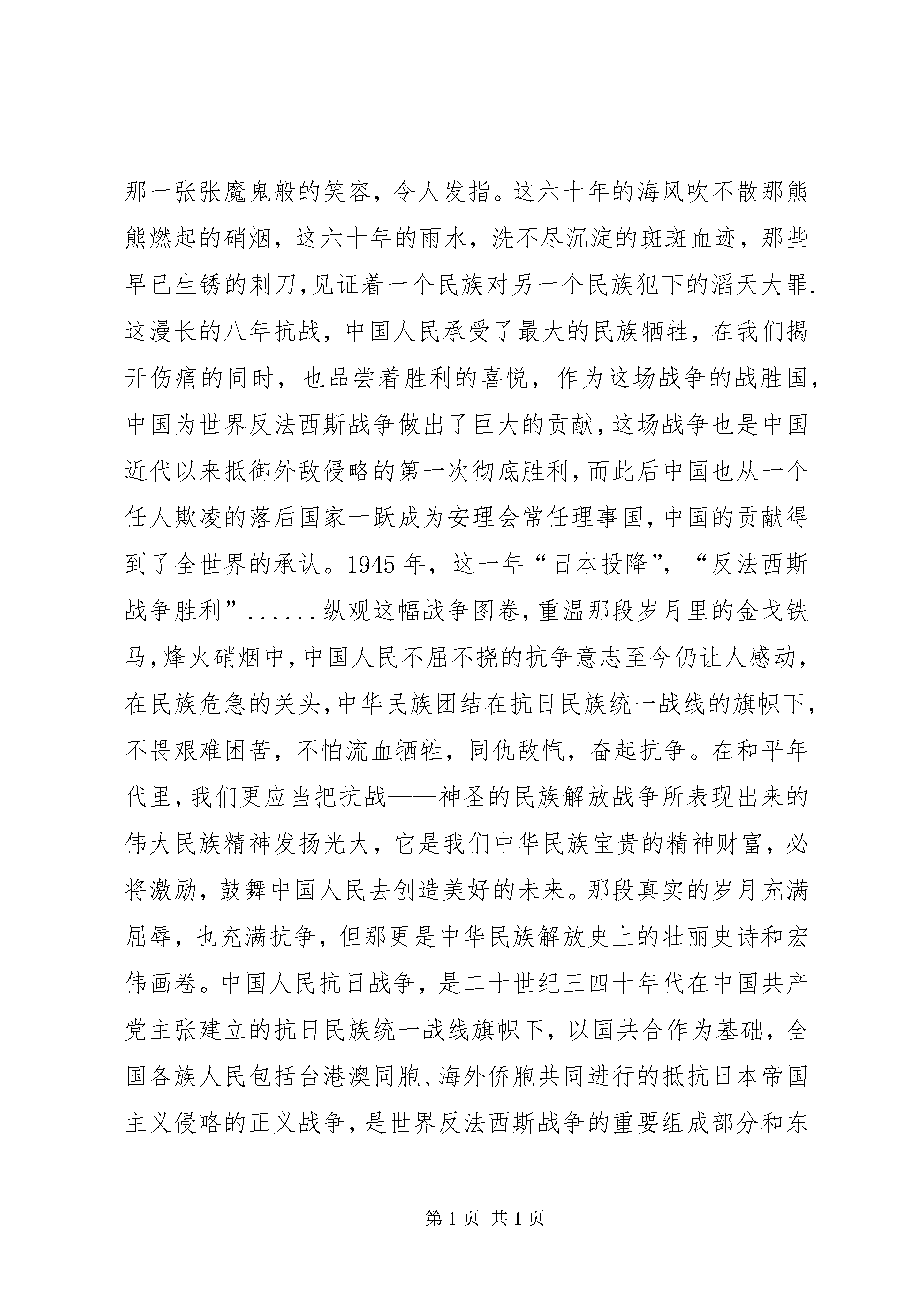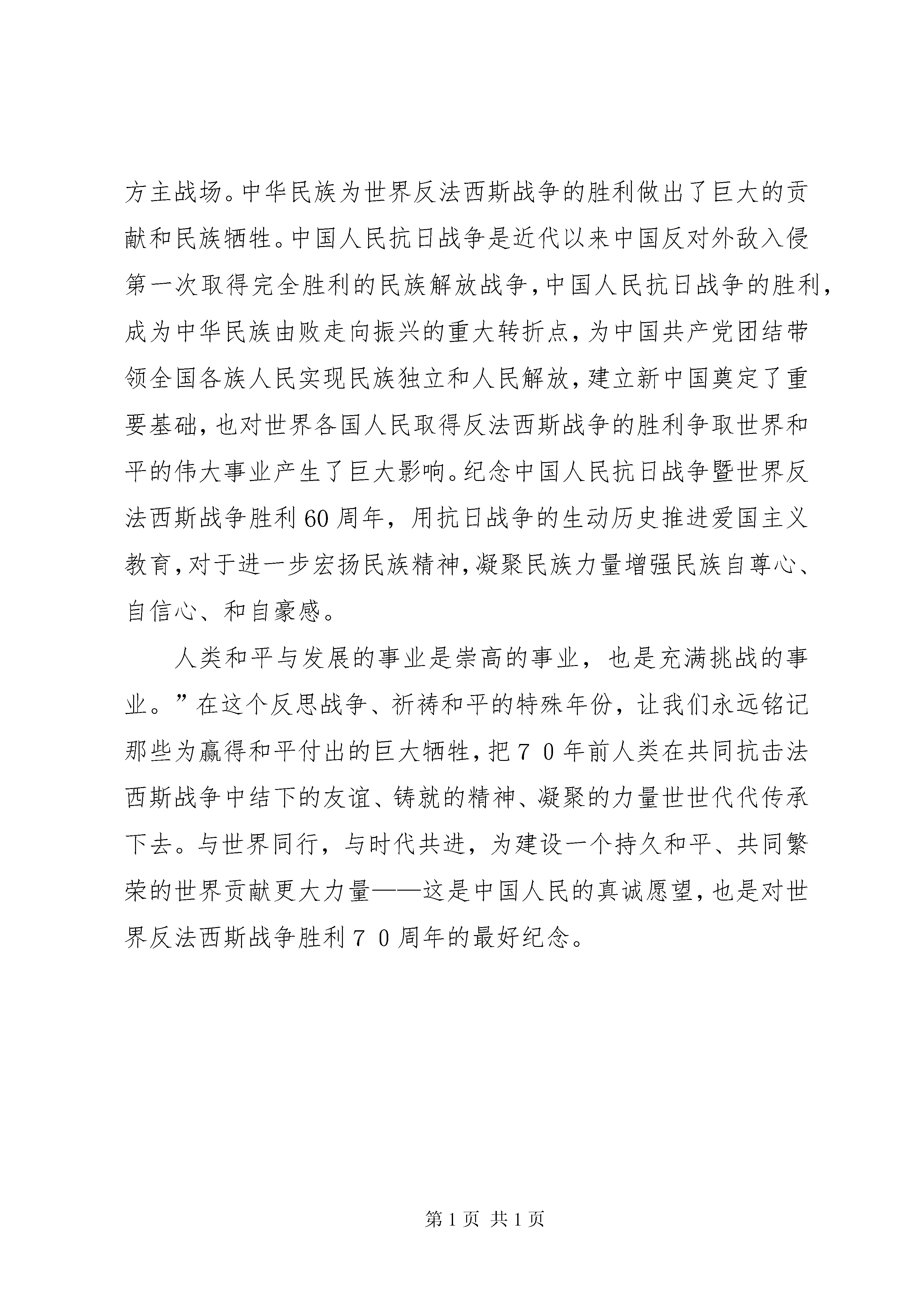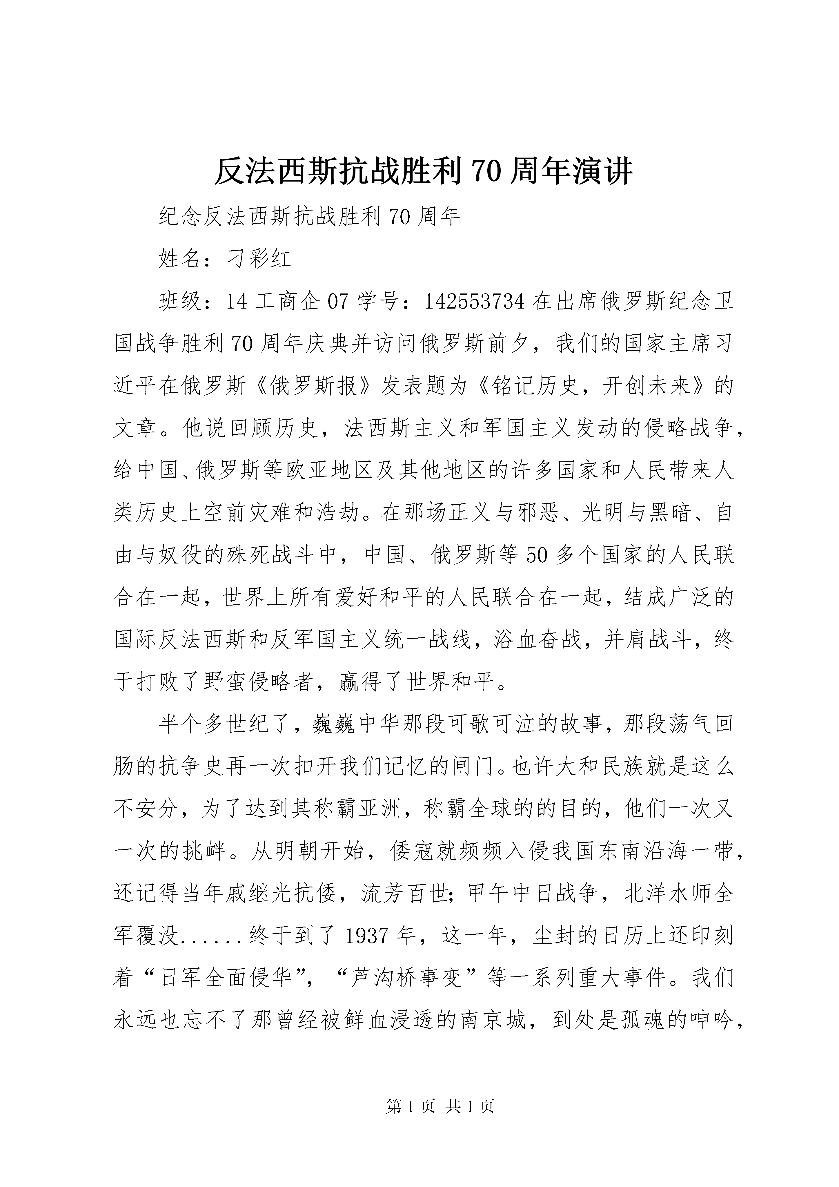 反法西斯抗战胜利70周年演讲纪念反法西斯抗战胜利70周年姓名:刁彩红班级:14工商企07学号:142553734在出席俄罗斯纪念卫国战争胜利70周年庆典并访问俄罗斯前夕,我们的国家主席习近平在俄罗斯《俄罗斯报》发表题为《铭记历史,开创未来》的文章。他说回顾历史,法西斯主义和军国主义发动的侵略战争,给中国、俄罗斯等欧亚地区及其他地区的许多国家和人民带来人类历史上空前灾难和浩劫。在那场正义与邪恶、光明与黑暗、自由与奴役的殊死战斗中,中国、俄罗斯等50多个国家的人民联合在一起,世界上所有爱好和平的人民联合在一起,结成广泛的国际反法西斯和反军国主义统一战线,浴血奋战,并肩战斗,终于打败了野蛮侵略者,赢得了世界和平。半个多世纪了,巍巍中华那段可歌可泣的故事,那段荡气回肠的抗争史再一次扣开我们记忆的闸门。也许大和民族就是这么不安分,为了达到其称霸亚洲,称霸全球的的目的,他们一次又一次的挑衅。从明朝开始,倭寇就频频入侵我国东南沿海一带,还记得当年戚继光抗倭,流芳百世;甲午中日战争,北洋水师全军覆没......终于到了1937年,这一年,尘封的日历上还印刻着“日军全面侵华”,“芦沟桥事变”等一系列重大事件。我们永远也忘不了那曾经被鲜血浸透的南京城,到处是孤魂的呻吟,那一张张魔鬼般的笑容,令人发指。这六十年的海风吹不散那熊熊燃起的硝烟,这六十年的雨水,洗不尽沉淀的斑斑血迹,那些早已生锈的刺刀,见证着一个民族对另一个民族犯下的滔天大罪.这漫长的八年抗战,中国人民承受了最大的民族牺牲,在我们揭开伤痛的同时,也品尝着胜利的喜悦,作为这场战争的战胜国,中国为世界反法西斯战争做出了巨大的贡献,这场战争也是中国近代以来抵御外敌侵略的第一次彻底胜利,而此后中国也从一个任人欺凌的落后国家一跃成为安理会常任理事国,中国的贡献得到了全世界的承认。1945年,这一年“日本投降”,“反法西斯战争胜利”......纵观这幅战争图卷,重温那段岁月里的金戈铁马,烽火硝烟中,中国人民不屈不挠的抗争意志至今仍让人感动,在民族危急的关头,中华民族团结在抗日民族统一战线的旗帜下,不畏艰难困苦,不怕流血牺牲,同仇敌忾,奋起抗争。在和平年代里,我们更应当把抗战——神圣的民族解放战争所表现出来的伟大民族精神发扬光大,它是我们中华民族宝贵的精神财富,必将激励,鼓舞中国人民去创造美好的未来。那段真实的岁月充满屈辱,也充满抗争,但那更是中华民族解放史上的壮丽史诗和宏伟画卷。中国人民抗日战争,是二十世纪三四十年代在中国共产党主张建立的抗日民族统一战线旗帜下,以国共合作为基础,全国各族人民包括台港澳同胞、海外侨胞共同进行的抵抗日本帝国主义侵略的正义战争,是世界反法西斯战争的重要组成部分和东方主战场。中华民族为世界反法西斯战争的胜利做出了巨大的贡献和民族牺牲。中国人民抗日战争是近代以来中国反对外敌入侵第一次取得完全胜利的民族解放战争,中国人民抗日战争的胜利,成为中华民族由败走向振兴的重大转折点,为中国共产党团结带领全国各族人民实现民族独立和人民解放,建立新中国奠定了重要基础,也对世界各国人民取得反法西斯战争的胜利争取世界和平的伟大事业产生了巨大影响。纪念中国人民抗日战争暨世界反法西斯战争胜利60周年,用抗日战争的生动历史推进爱国主义教育,对于进一步宏扬民族精神,凝聚民族力量增强民族自尊心、自信心、和自豪感。人类和平与发展的事业是崇高的事业,也是充满挑战的事业。”在这个反思战争、祈祷和平的特殊年份,让我们永远铭记那些为赢得和平付出的巨大牺牲,把70年前人类在共同抗击法西斯战争中结下的友谊、铸就的精神、凝聚的力量世世代代传承下去。与世界同行,与时代共进,为建设一个持久和平、共同繁荣的世界贡献更大力量——这是中国人民的真诚愿望,也是对世界反法西斯战争胜利70周年的最好纪念。