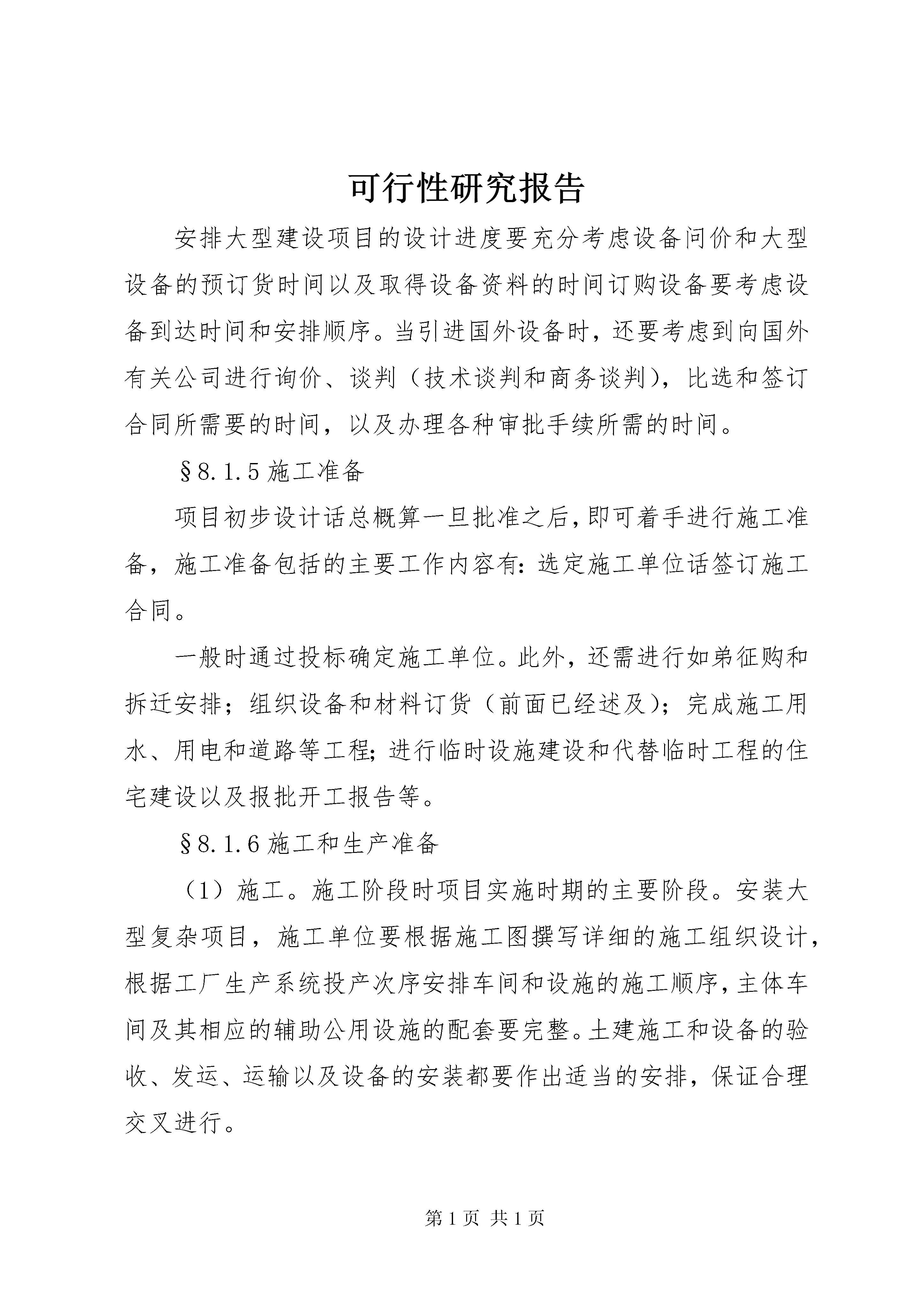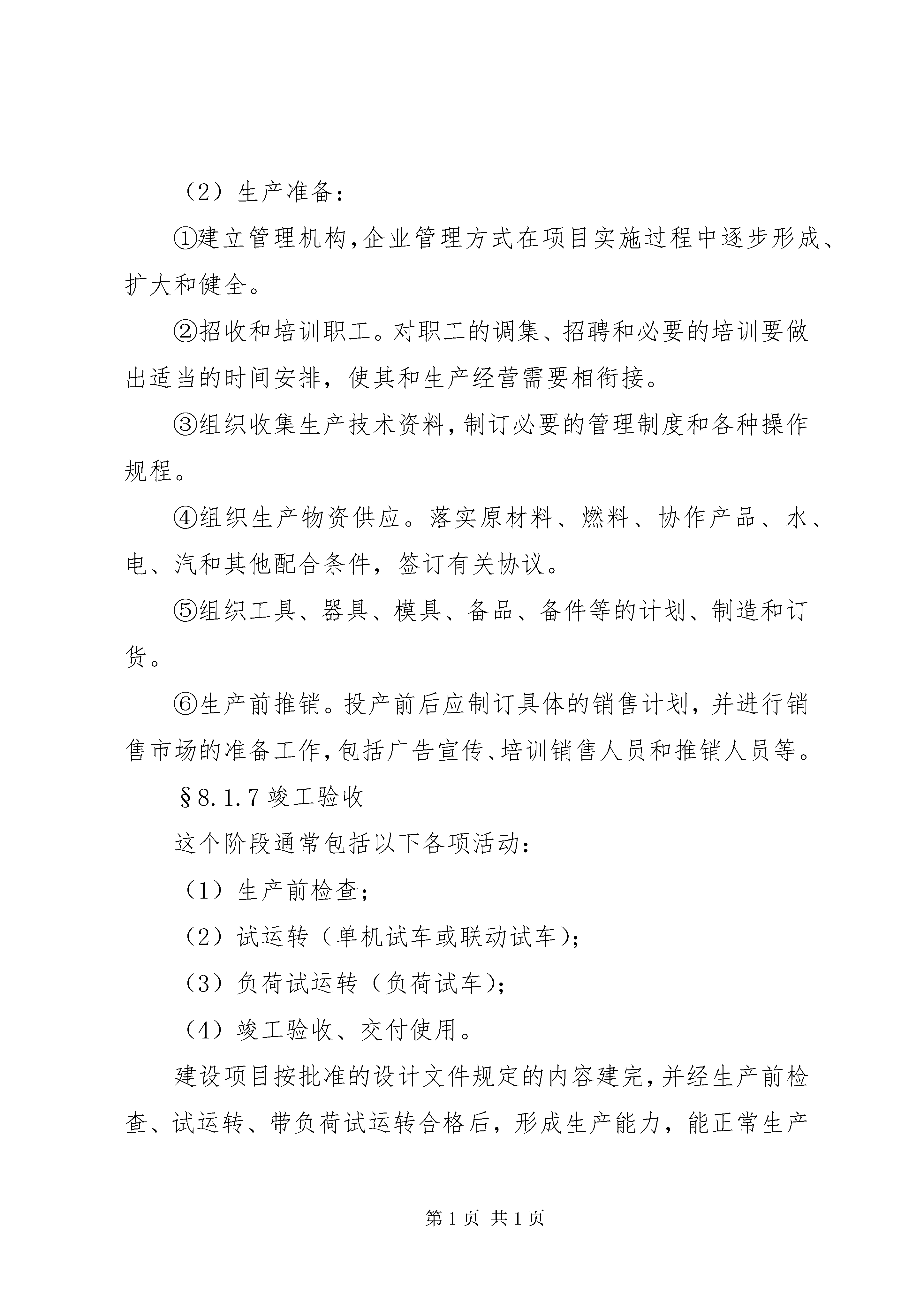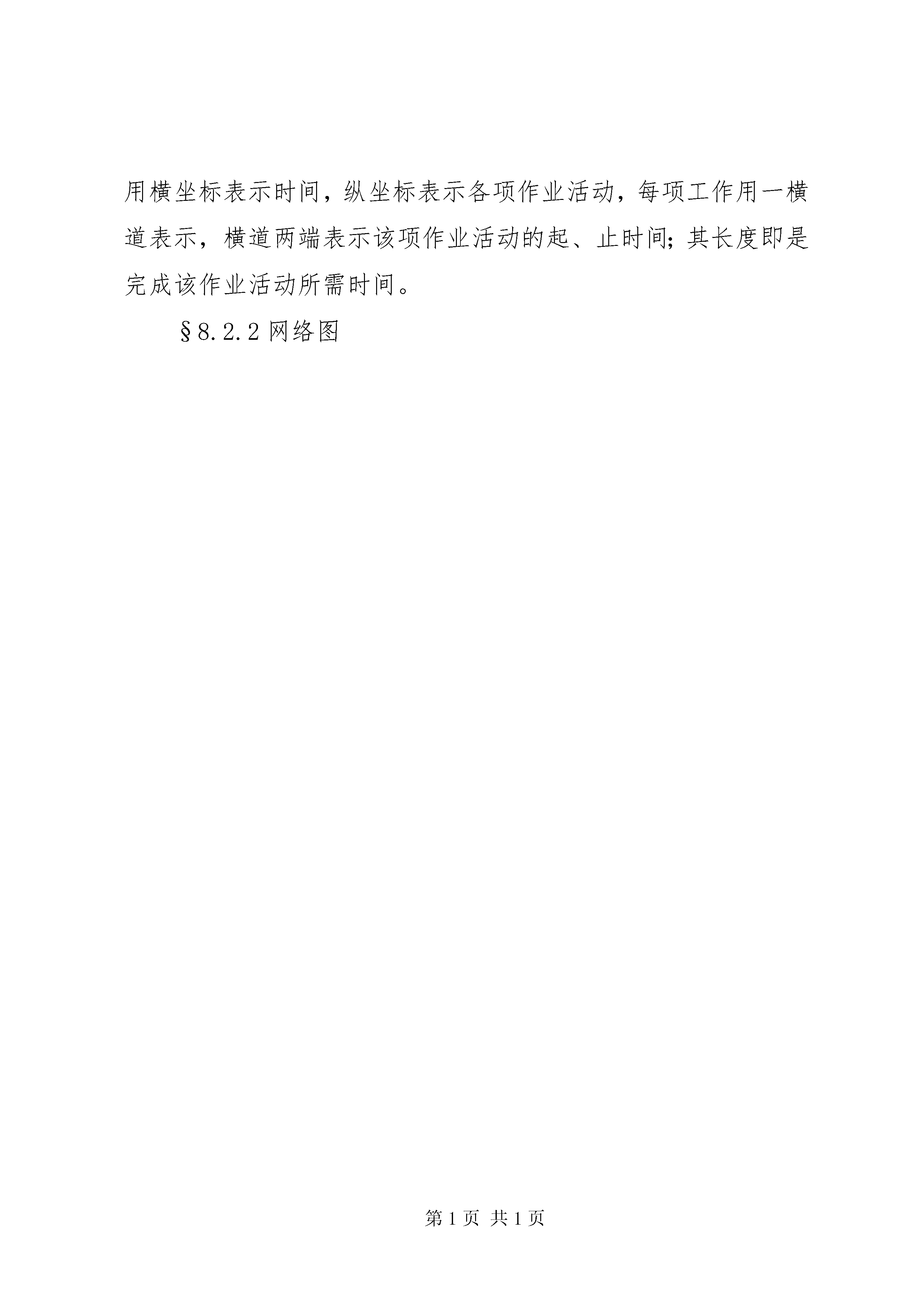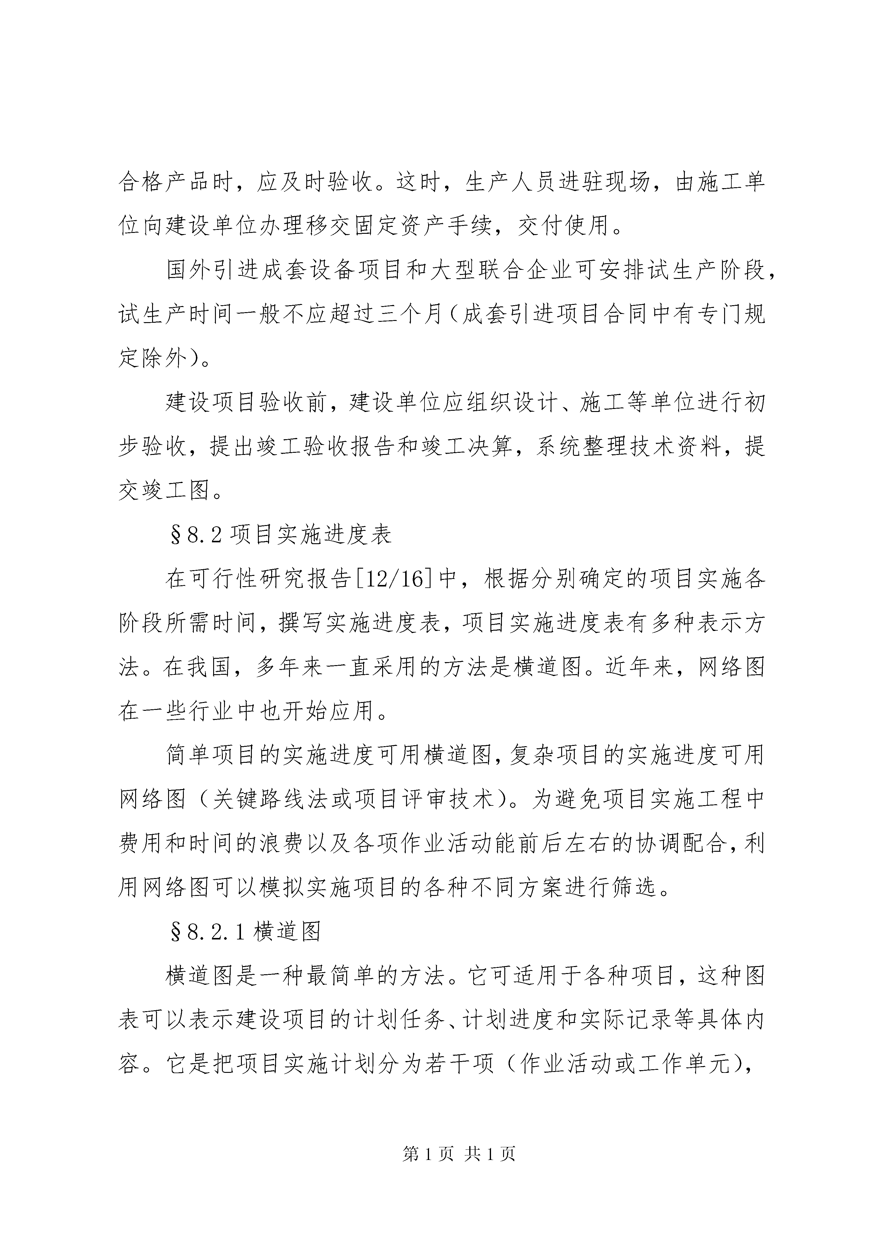 可行性研究报告安排大型建设项目的设计进度要充分考虑设备问价和大型设备的预订货时间以及取得设备资料的时间订购设备要考虑设备到达时间和安排顺序。当引进国外设备时,还要考虑到向国外有关公司进行询价、谈判(技术谈判和商务谈判),比选和签订合同所需要的时间,以及办理各种审批手续所需的时间。§8.1.5施工准备项目初步设计话总概算一旦批准之后,即可着手进行施工准备,施工准备包括的主要工作内容有:选定施工单位话签订施工合同。一般时通过投标确定施工单位。此外,还需进行如弟征购和拆迁安排;组织设备和材料订货(前面已经述及);完成施工用水、用电和道路等工程;进行临时设施建设和代替临时工程的住宅建设以及报批开工报告等。§8.1.6施工和生产准备(1)施工。施工阶段时项目实施时期的主要阶段。安装大型复杂项目,施工单位要根据施工图撰写详细的施工组织设计,根据工厂生产系统投产次序安排车间和设施的施工顺序,主体车间及其相应的辅助公用设施的配套要完整。土建施工和设备的验收、发运、运输以及设备的安装都要作出适当的安排,保证合理交叉进行。(2)生产准备:①建立管理机构,企业管理方式在项目实施过程中逐步形成、扩大和健全。②招收和培训职工。对职工的调集、招聘和必要的培训要做出适当的时间安排,使其和生产经营需要相衔接。③组织收集生产技术资料,制订必要的管理制度和各种操作规程。④组织生产物资供应。落实原材料、燃料、协作产品、水、电、汽和其他配合条件,签订有关协议。⑤组织工具、器具、模具、备品、备件等的计划、制造和订货。⑥生产前推销。投产前后应制订具体的销售计划,并进行销售市场的准备工作,包括广告宣传、培训销售人员和推销人员等。§8.1.7竣工验收这个阶段通常包括以下各项活动:(1)生产前检查;(2)试运转(单机试车或联动试车);(3)负荷试运转(负荷试车);(4)竣工验收、交付使用。建设项目按批准的设计文件规定的内容建完,并经生产前检查、试运转、带负荷试运转合格后,形成生产能力,能正常生产合格产品时,应及时验收。这时,生产人员进驻现场,由施工单位向建设单位办理移交固定资产手续,交付使用。国外引进成套设备项目和大型联合企业可安排试生产阶段,试生产时间一般不应超过三个月(成套引进项目合同中有专门规定除外)。建设项目验收前,建设单位应组织设计、施工等单位进行初步验收,提出竣工验收报告和竣工决算,系统整理技术资料,提交竣工图。§8.2项目实施进度表在可行性研究报告[12/16]中,根据分别确定的项目实施各阶段所需时间,撰写实施进度表,项目实施进度表有多种表示方法。在我国,多年来一直采用的方法是横道图。近年来,网络图在一些行业中也开始应用。简单项目的实施进度可用横道图,复杂项目的实施进度可用网络图(关键路线法或项目评审技术)。为避免项目实施工程中费用和时间的浪费以及各项作业活动能前后左右的协调配合,利用网络图可以模拟实施项目的各种不同方案进行筛选。§8.2.1横道图横道图是一种最简单的方法。它可适用于各种项目,这种图表可以表示建设项目的计划任务、计划进度和实际记录等具体内容。它是把项目实施计划分为若干项(作业活动或工作单元),用横坐标表示时间,纵坐标表示各项作业活动,每项工作用一横道表示,横道两端表示该项作业活动的起、止时间;其长度即是完成该作业活动所需时间。§8.2.2网络图