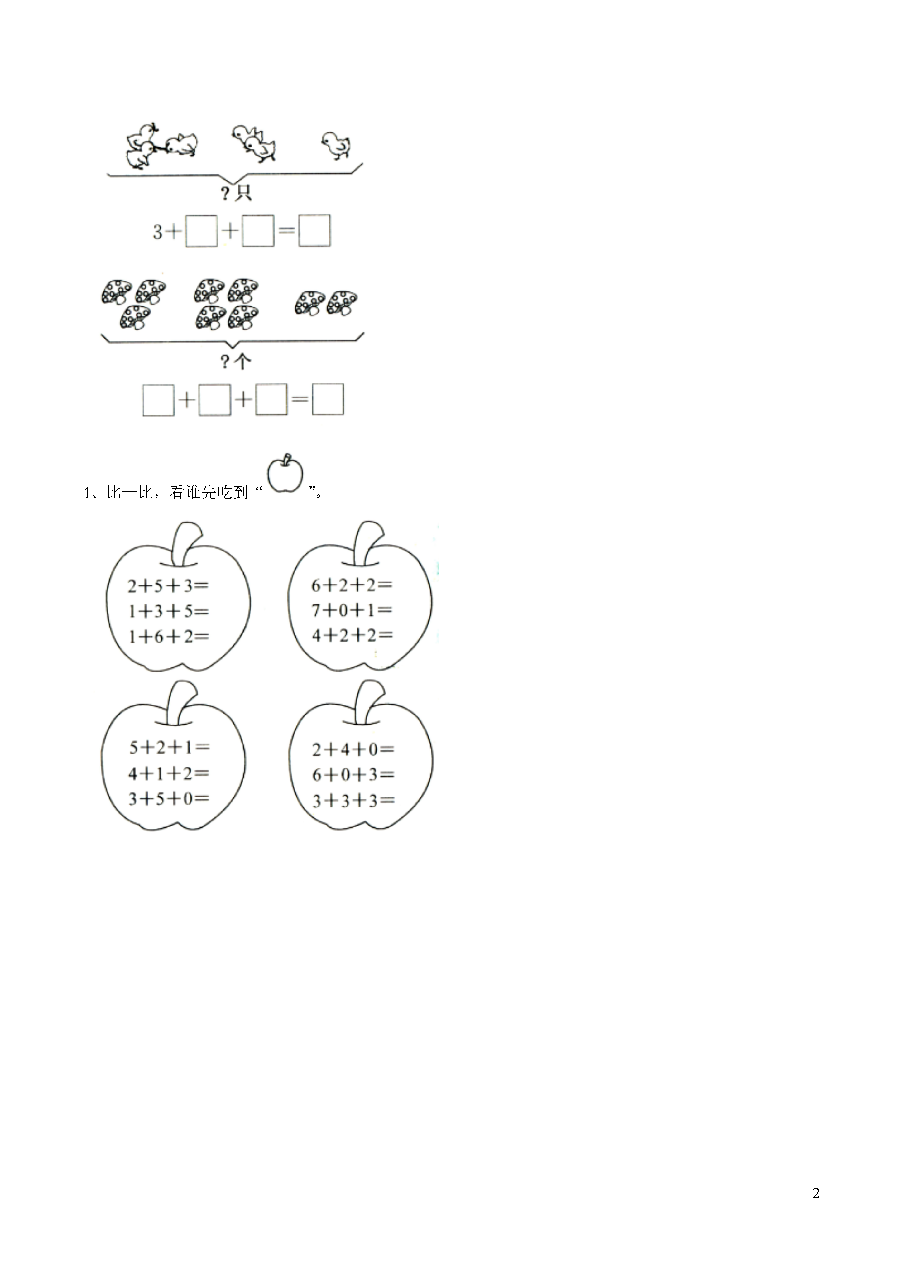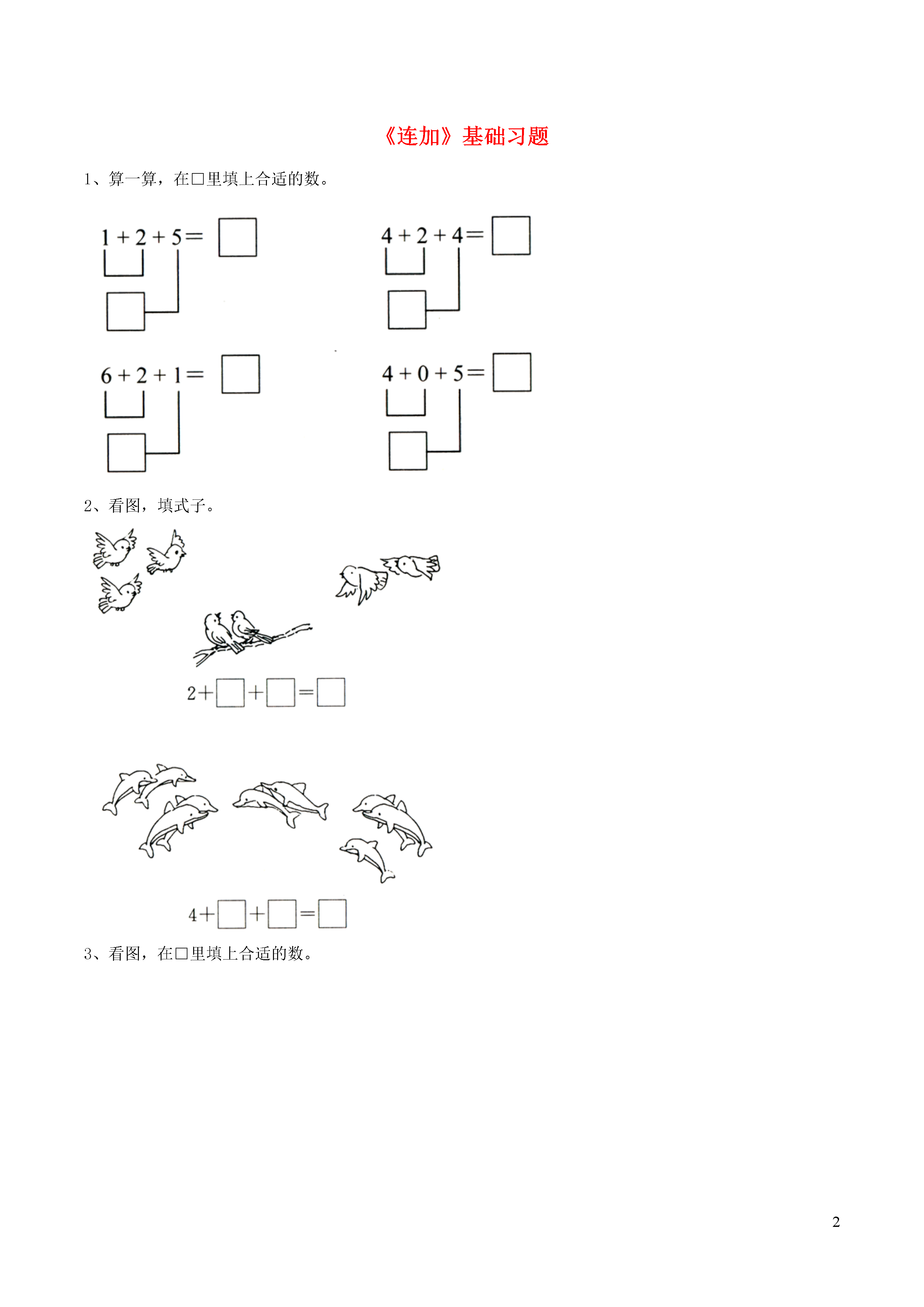 2《连加》基础习题1、算一算,在□里填上合适的数。2、看图,填式子。3、看图,在□里填上合适的数。4、比一比,看谁先吃到“”。