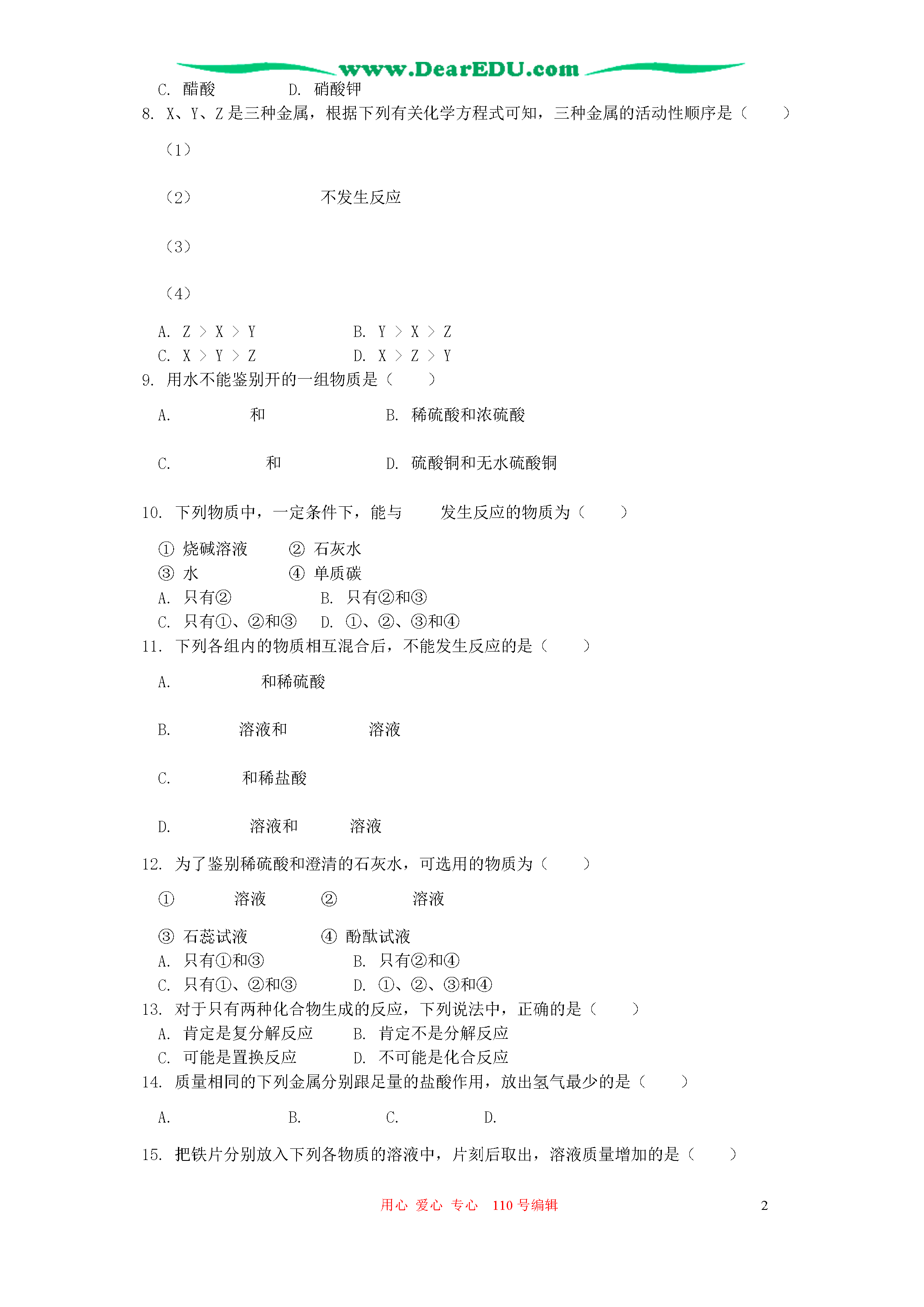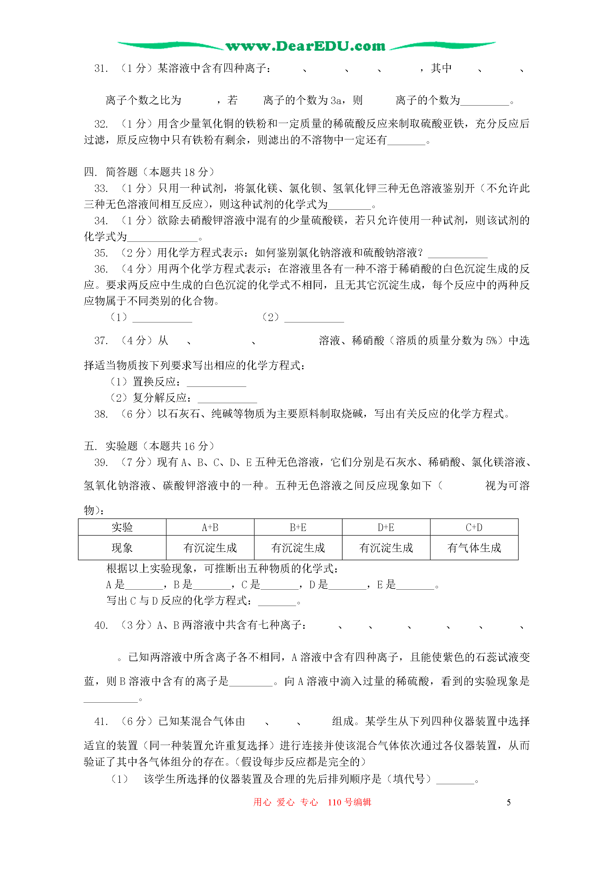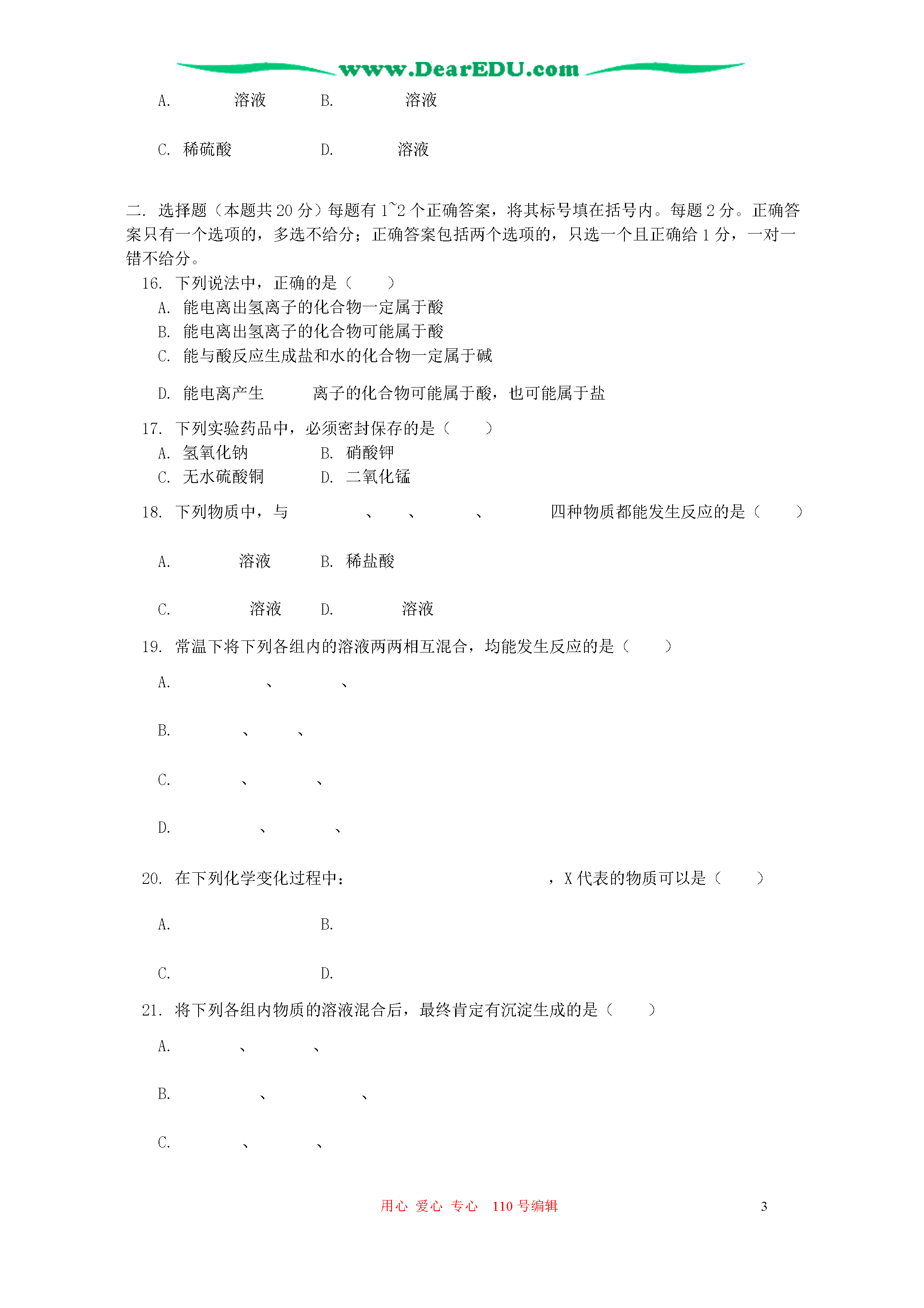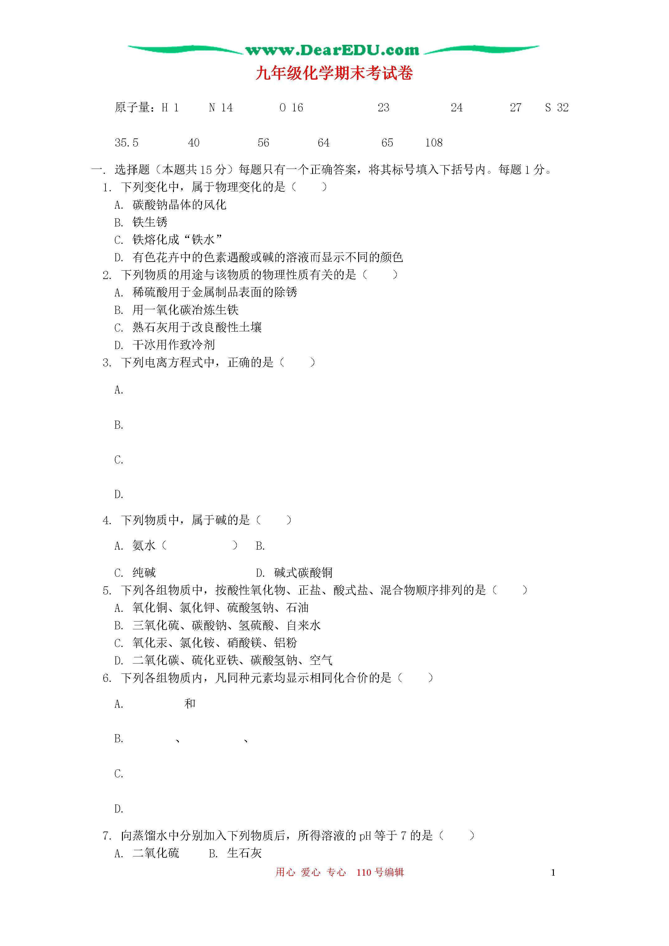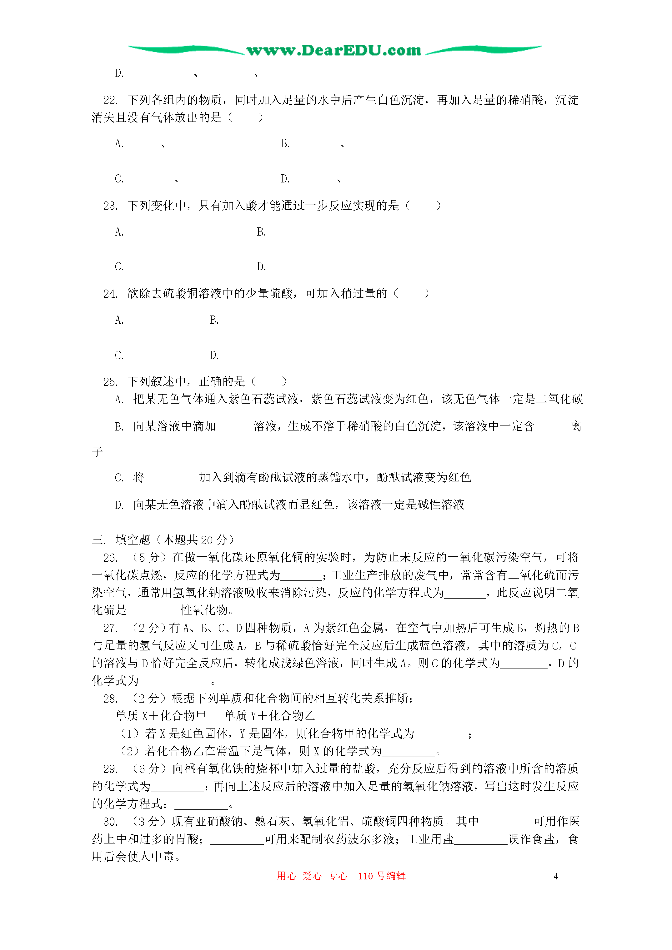 用心爱心专心110号编辑10九年级化学期末考试卷原子量:H1N14O16232427S3235.540566465108一.选择题(本题共15分)每题只有一个正确答案,将其标号填入下括号内。每题1分。1.下列变化中,属于物理变化的是()A.碳酸钠晶体的风化B.铁生锈C.铁熔化成“铁水”D.有色花卉中的色素遇酸或碱的溶液而显示不同的颜色2.下列物质的用途与该物质的物理性质有关的是()A.稀硫酸用于金属制品表面的除锈B.用一氧化碳冶炼生铁C.熟石灰用于改良酸性土壤D.干冰用作致冷剂3.下列电离方程式中,正确的是()A.B.C.D.4.下列物质中,属于碱的是()A.氨水()B.C.纯碱D.碱式碳酸铜5.下列各组物质中,按酸性氧化物、正盐、酸式盐、混合物顺序排列的是()A.氧化铜、氯化钾、硫酸氢钠、石油B.三氧化硫、碳酸钠、氢硫酸、自来水C.氧化汞、氯化铵、硝酸镁、铝粉D.二氧化碳、硫化亚铁、碳酸氢钠、空气6.下列各组物质内,凡同种元素均显示相同化合价的是()A.和B.、、C.D.7.向蒸馏水中分别加入下列物质后,所得溶液的pH等于7的是()A.二氧化硫B.生石灰C.醋酸D.硝酸钾8.X、Y、Z是三种金属,根据下列有关化学方程式可知,三种金属的活动性顺序是()(1)(2)不发生反应(3)(4)A.Z>X>YB.Y>X>ZC.X>Y>ZD.X>Z>Y9.用水不能鉴别开的一组物质是()A.和B.稀硫酸和浓硫酸C.和D.硫酸铜和无水硫酸铜10.下列物质中,一定条件下,能与发生反应的物质为()①烧碱溶液②石灰水③水④单质碳A.只有②B.只有②和③C.只有①、②和③D.①、②、③和④11.下列各组内的物质相互混合后,不能发生反应的是()A.和稀硫酸B.溶液和溶液C.和稀盐酸D.溶液和溶液12.为了鉴别稀硫酸和澄清的石灰水,可选用的物质为()①溶液②溶液③石蕊试液④酚酞试液A.只有①和③B.只有②和④C.只有①、②和③D.①、②、③和④13.对于只有两种化合物生成的反应,下列说法中,正确的是()A.肯定是复分解反应B.肯定不是分解反应C.可能是置换反应D.不可能是化合反应14.质量相同的下列金属分别跟足量的盐酸作用,放出氢气最少的是()A.B.C.D.15.把铁片分别放入下列各物质的溶液中,片刻后取出,溶液质量增加的是()A.溶液B.溶液C.稀硫酸D.溶液二.选择题(本题共20分)每题有1~2个正确答案,将其标号填在括号内。每题2分。正确答案只有一个选项的,多选不给分;正确答案包括两个选项的,只选一个且正确给1分,一对一错不给分。16.下列说法中,正确的是()A.能电离出氢离子的化合物一定属于酸B.能电离出氢离子的化合物可能属于酸C.能与酸反应生成盐和水的化合物一定属于碱D.能电离产生离子的化合物可能属于酸,也可能属于盐17.下列实验药品中,必须密封保存的是()A.氢氧化钠B.硝酸钾C.无水硫酸铜D.二氧化锰18.下列物质中,与、、、四种物质都能发生反应的是()A.溶液B.稀盐酸C.溶液D.溶液19.常温下将下列各组内的溶液两两相互混合,均能发生反应的是()A.、、B.、、C.、、D.、、20.在下列化学变化过程中:,X代表的物质可以是()A.B.C.D.21.将下列各组内物质的溶液混合后,最终肯定有沉淀生成的是()A.、、B.、、C.、、D.、、22.下列各组内的物质,同时加入足量的水中后产生白色沉淀,再加入足量的稀硝酸,沉淀消失且没有气体放出的是()A.、B.、C.、D.、23.下列变化中,只有加入酸才能通过一步反应实现的是()A.B.C.D.24.欲除去硫酸铜溶液中的少量硫酸,可加入稍过量的()A.B.C.D.25.下列叙述中,正确的是()A.把某无色气体通入紫色石蕊试液,紫色石蕊试液变为红色,该无色气体一定是二氧化碳B.向某溶液中滴加溶液,生成不溶于稀硝酸的白色沉淀,该溶液中一定含离子C.将加入到滴有酚酞试液的蒸馏水中,酚酞试液变为红色D.向某无色溶液中滴入酚酞试液而显红色,该溶液一定是碱性溶液三.填空题(本题共20分)26.(5分)在做一氧化碳还原氧化铜的实验时,为防止未反应的一氧化碳污染空气,可将一氧化碳点燃,反应的化学方程式为_______;工业生产排放的废气中,常常含有二氧化硫而污染空气,通常用氢氧化钠溶液吸收来消除污染,反应的化学方程式为_______,此反应说明二氧化硫是_________性氧化物。27.(2分)有A、B、C、D四种物质,A为紫红色金属,在空气中加热后可生成B,灼热的B与足量的氢气反应又可生成A,B与稀硫酸恰好完全反应后生成蓝色溶液,其中的溶质为C,C的溶液与D恰好完全反应后,转化成浅绿色溶液,同时生成A。则C的化学式为________,D的化学式为____________。28.(2分)根据下列单质和化合物间