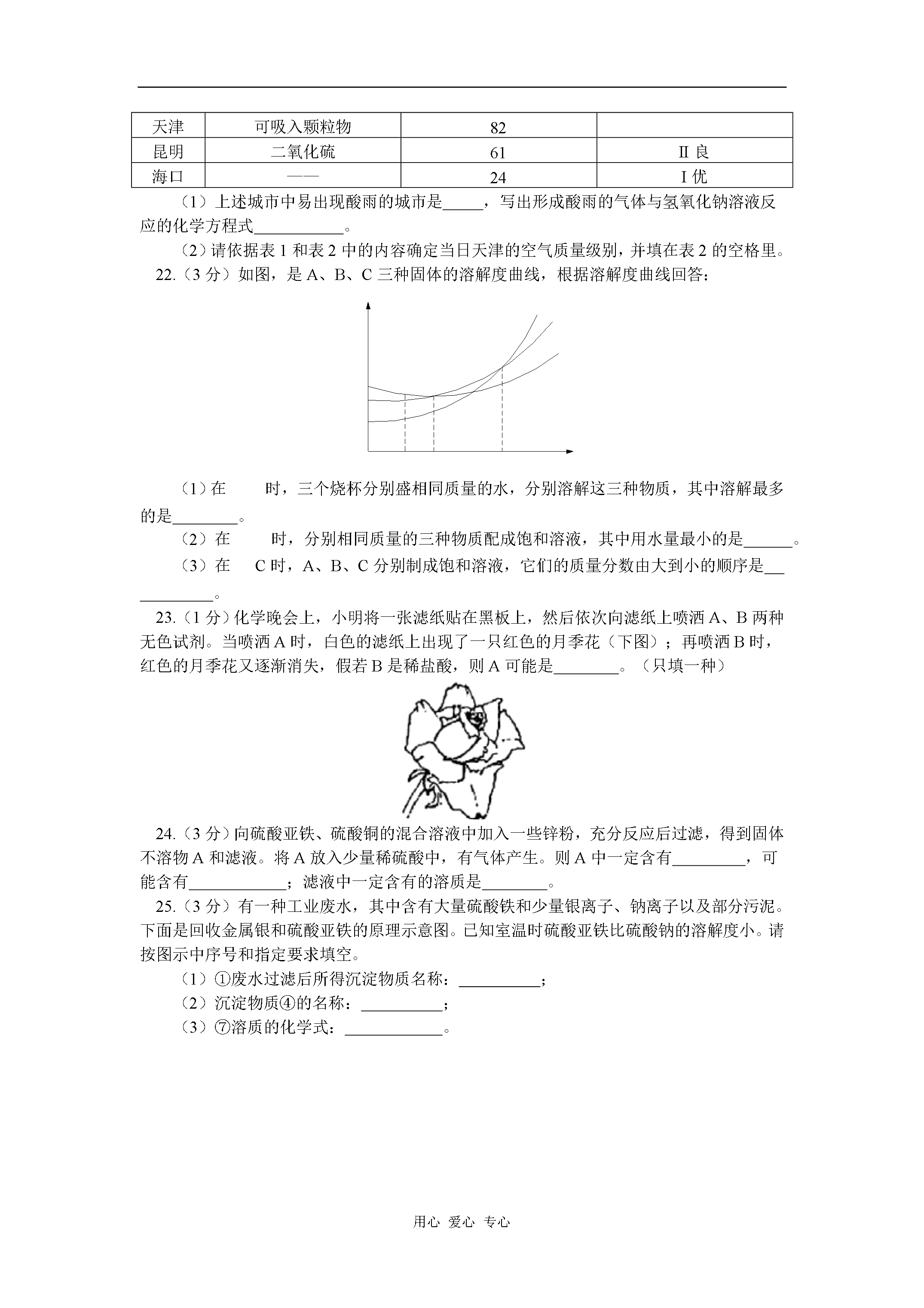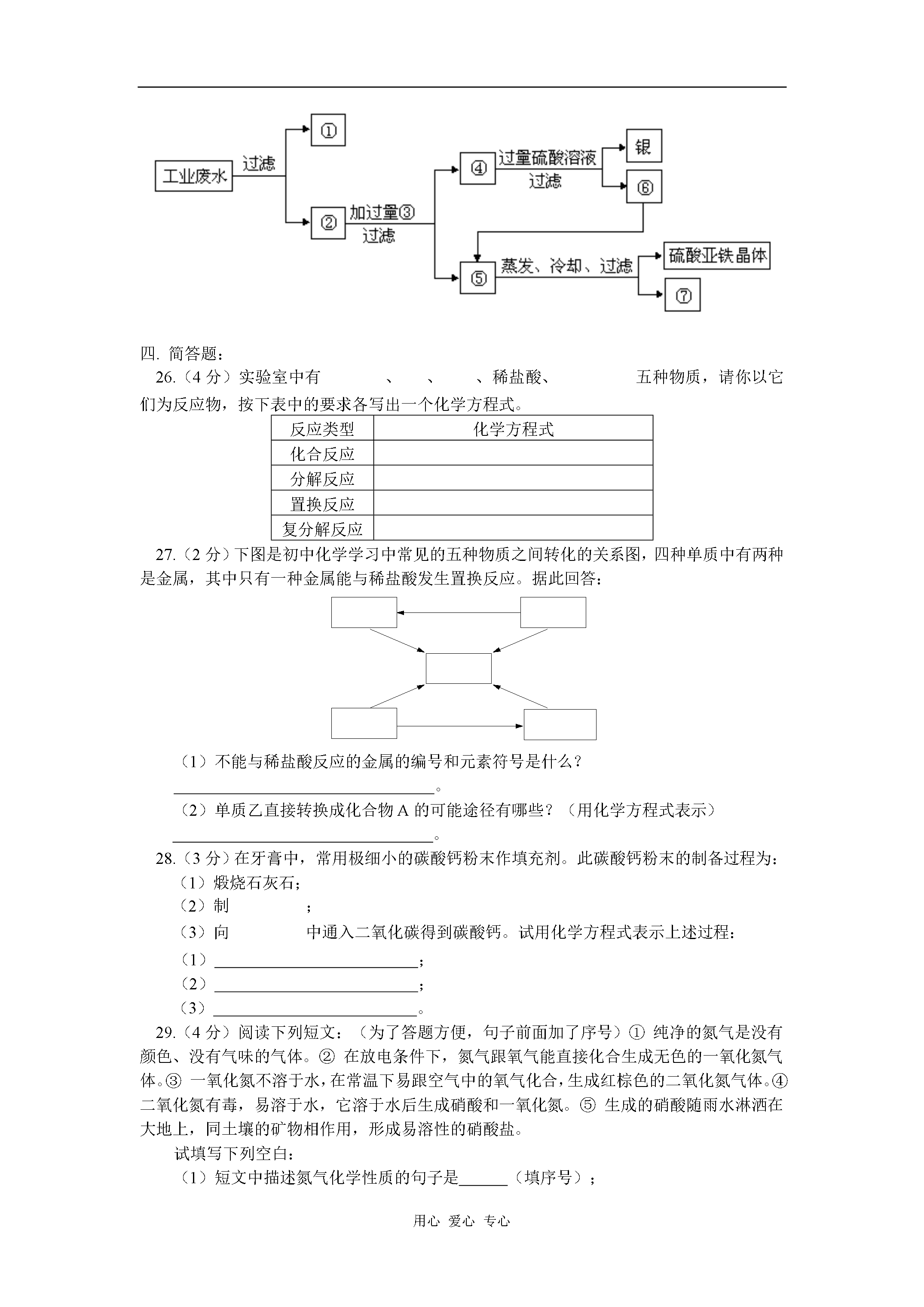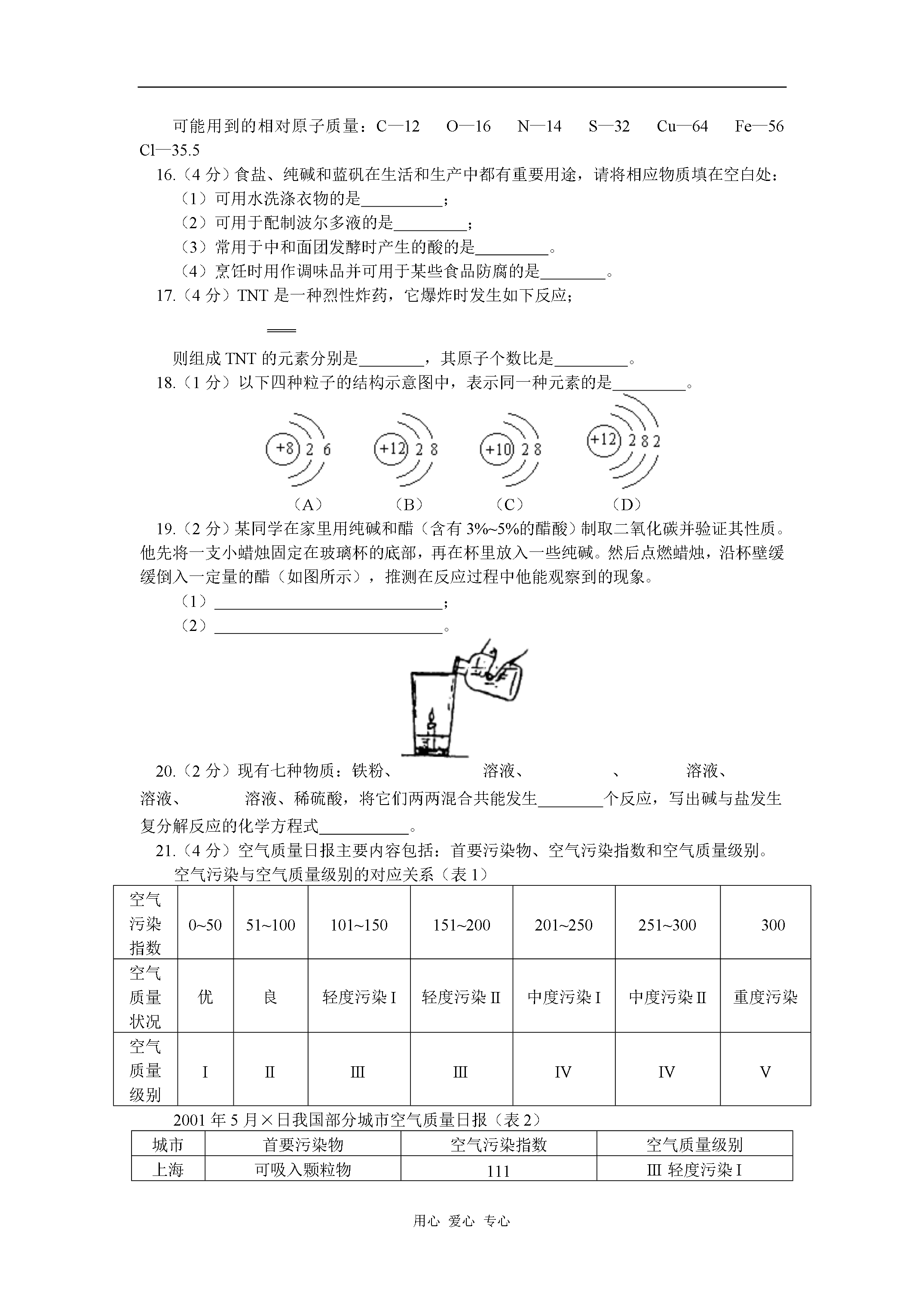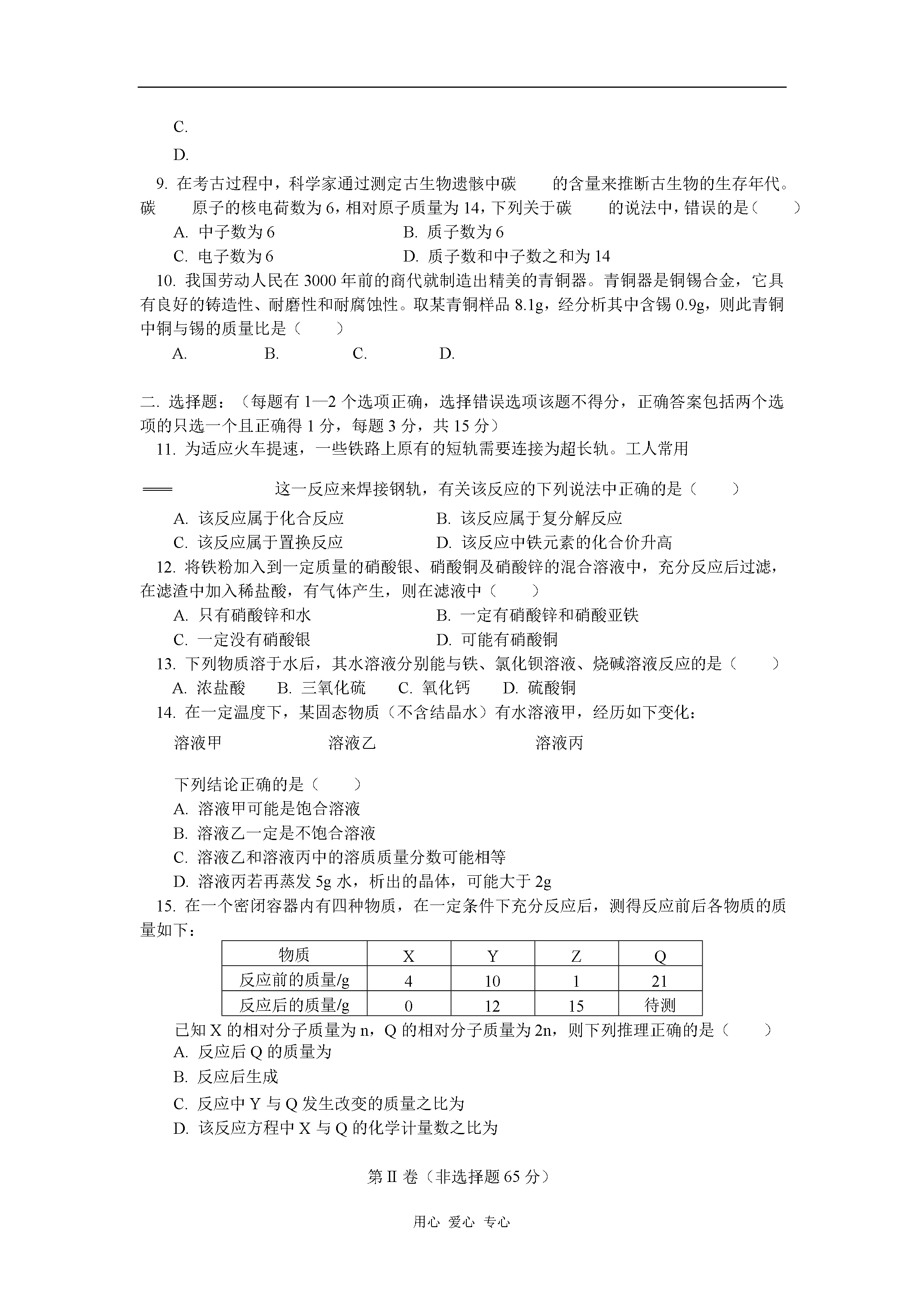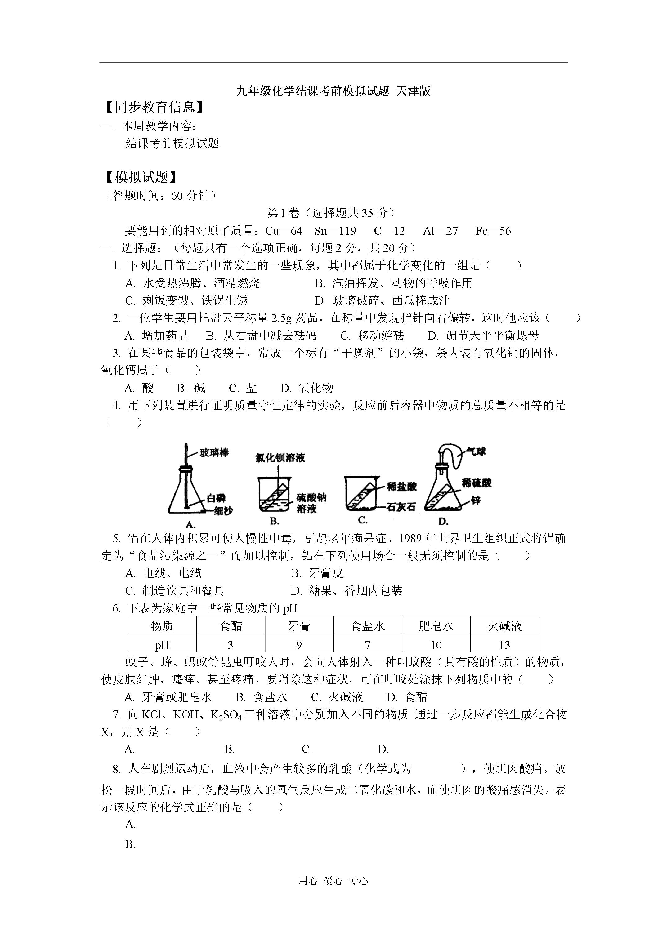 用心爱心专心九年级化学结课考前模拟试题天津版【同步教育信息】一.本周教学内容:结课考前模拟试题【模拟试题】(答题时间:60分钟)第I卷(选择题共35分)要能用到的相对原子质量:Cu—64Sn—119C—12Al—27Fe—56一.选择题:(每题只有一个选项正确,每题2分,共20分)1.下列是日常生活中常发生的一些现象,其中都属于化学变化的一组是()A.水受热沸腾、酒精燃烧B.汽油挥发、动物的呼吸作用C.剩饭变馊、铁锅生锈D.玻璃破碎、西瓜榨成汁2.一位学生要用托盘天平称量2.5g药品,在称量中发现指针向右偏转,这时他应该()A.增加药品B.从右盘中减去砝码C.移动游砝D.调节天平平衡螺母3.在某些食品的包装袋中,常放一个标有“干燥剂”的小袋,袋内装有氧化钙的固体,氧化钙属于()A.酸B.碱C.盐D.氧化物4.用下列装置进行证明质量守恒定律的实验,反应前后容器中物质的总质量不相等的是()5.铝在人体内积累可使人慢性中毒,引起老年痴呆症。1989年世界卫生组织正式将铝确定为“食品污染源之一”而加以控制,铝在下列使用场合一般无须控制的是()A.电线、电缆B.牙膏皮C.制造饮具和餐具D.糖果、香烟内包装6.下表为家庭中一些常见物质的pH物质食醋牙膏食盐水肥皂水火碱液pH3971013蚊子、蜂、蚂蚁等昆虫叮咬人时,会向人体射入一种叫蚁酸(具有酸的性质)的物质,使皮肤红肿、瘙痒、甚至疼痛。要消除这种症状,可在叮咬处涂抹下列物质中的()A.牙膏或肥皂水B.食盐水C.火碱液D.食醋7.向KCl、KOH、K2SO4三种溶液中分别加入不同的物质通过一步反应都能生成化合物X,则X是()A.B.C.D.8.人在剧烈运动后,血液中会产生较多的乳酸(化学式为),使肌肉酸痛。放松一段时间后,由于乳酸与吸入的氧气反应生成二氧化碳和水,而使肌肉的酸痛感消失。表示该反应的化学式正确的是()A.B.C.D.9.在考古过程中,科学家通过测定古生物遗骸中碳的含量来推断古生物的生存年代。碳原子的核电荷数为6,相对原子质量为14,下列关于碳的说法中,错误的是()A.中子数为6B.质子数为6C.电子数为6D.质子数和中子数之和为1410.我国劳动人民在3000年前的商代就制造出精美的青铜器。青铜器是铜锡合金,它具有良好的铸造性、耐磨性和耐腐蚀性。取某青铜样品8.1g,经分析其中含锡0.9g,则此青铜中铜与锡的质量比是()A.B.C.D.二.选择题:(每题有1—2个选项正确,选择错误选项该题不得分,正确答案包括两个选项的只选一个且正确得1分,每题3分,共15分)11.为适应火车提速,一些铁路上原有的短轨需要连接为超长轨。工人常用这一反应来焊接钢轨,有关该反应的下列说法中正确的是()A.该反应属于化合反应B.该反应属于复分解反应C.该反应属于置换反应D.该反应中铁元素的化合价升高12.将铁粉加入到一定质量的硝酸银、硝酸铜及硝酸锌的混合溶液中,充分反应后过滤,在滤渣中加入稀盐酸,有气体产生,则在滤液中()A.只有硝酸锌和水B.一定有硝酸锌和硝酸亚铁C.一定没有硝酸银D.可能有硝酸铜13.下列物质溶于水后,其水溶液分别能与铁、氯化钡溶液、烧碱溶液反应的是()A.浓盐酸B.三氧化硫C.氧化钙D.硫酸铜14.在一定温度下,某固态物质(不含结晶水)有水溶液甲,经历如下变化:溶液甲溶液乙溶液丙下列结论正确的是()A.溶液甲可能是饱合溶液B.溶液乙一定是不饱合溶液C.溶液乙和溶液丙中的溶质质量分数可能相等D.溶液丙若再蒸发5g水,析出的晶体,可能大于2g15.在一个密闭容器内有四种物质,在一定条件下充分反应后,测得反应前后各物质的质量如下:物质XYZQ反应前的质量/g410121反应后的质量/g01215待测已知X的相对分子质量为n,Q的相对分子质量为2n,则下列推理正确的是()A.反应后Q的质量为B.反应后生成C.反应中Y与Q发生改变的质量之比为D.该反应方程中X与Q的化学计量数之比为第II卷(非选择题65分)可能用到的相对原子质量:C—12O—16N—14S—32Cu—64Fe—56Cl—35.516.(4分)食盐、纯碱和蓝矾在生活和生产中都有重要用途,请将相应物质填在空白处:(1)可用水洗涤衣物的是;(2)可用于配制波尔多液的是;(3)常用于中和面团发酵时产生的酸的是。(4)烹饪时用作调味品并可用于某些食品防腐的是。17.(4分)TNT是一种烈性炸药,它爆炸时发生如下反应;则组成TNT的元素分别是,其原子个数比是。18.(1分)以下四种粒子的结构示意图中,表示同一种元素的是。(A)(B)(C)(D)19.(2分)某同学在家里用纯碱和醋(含有3%~5%的醋酸)制取二氧化碳并验证其性质。他先将一支小蜡烛固定在玻璃杯的底部,再在杯里放入一些纯碱。然后点燃蜡烛,沿杯壁缓缓倒入一定量的醋(如图所