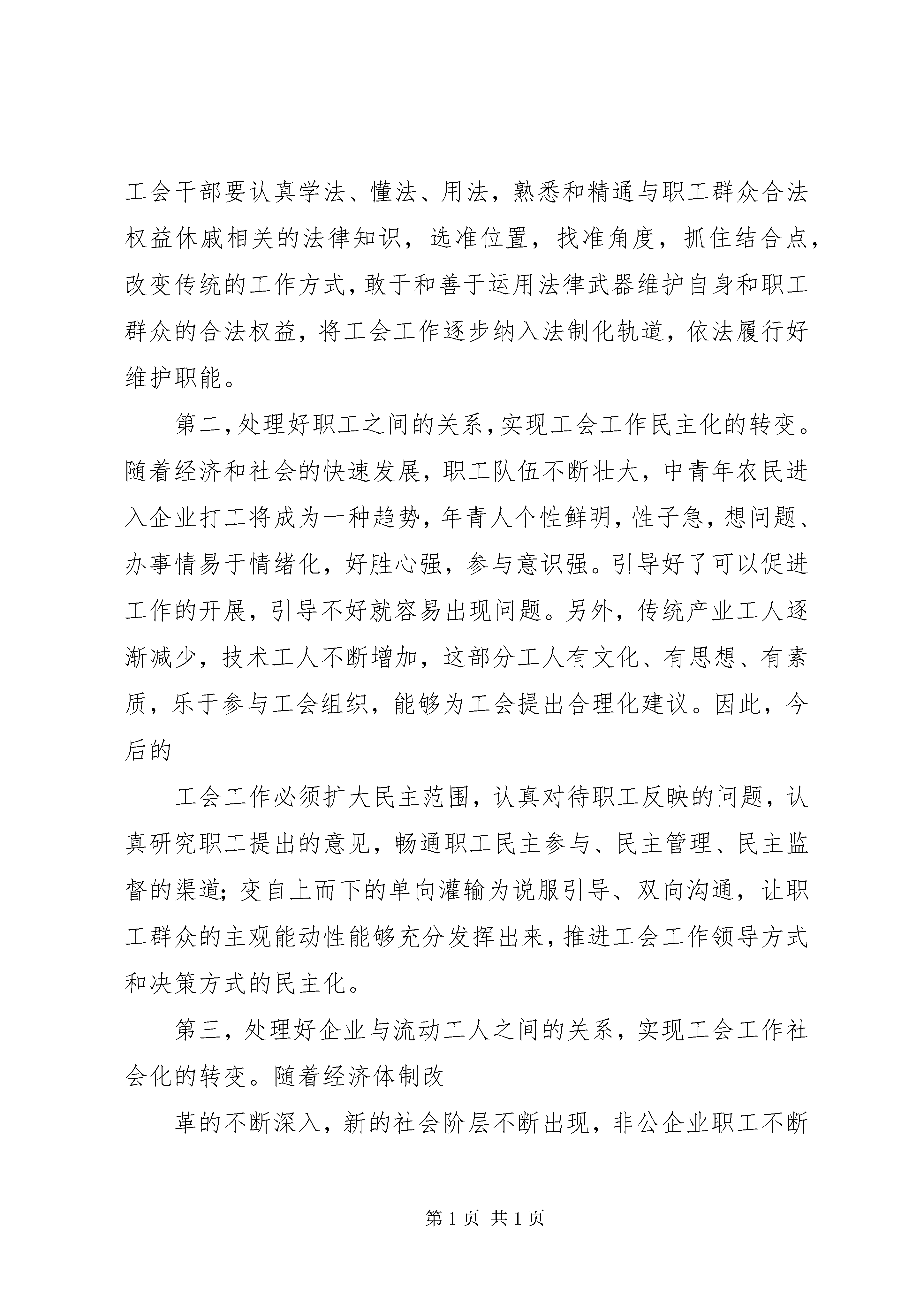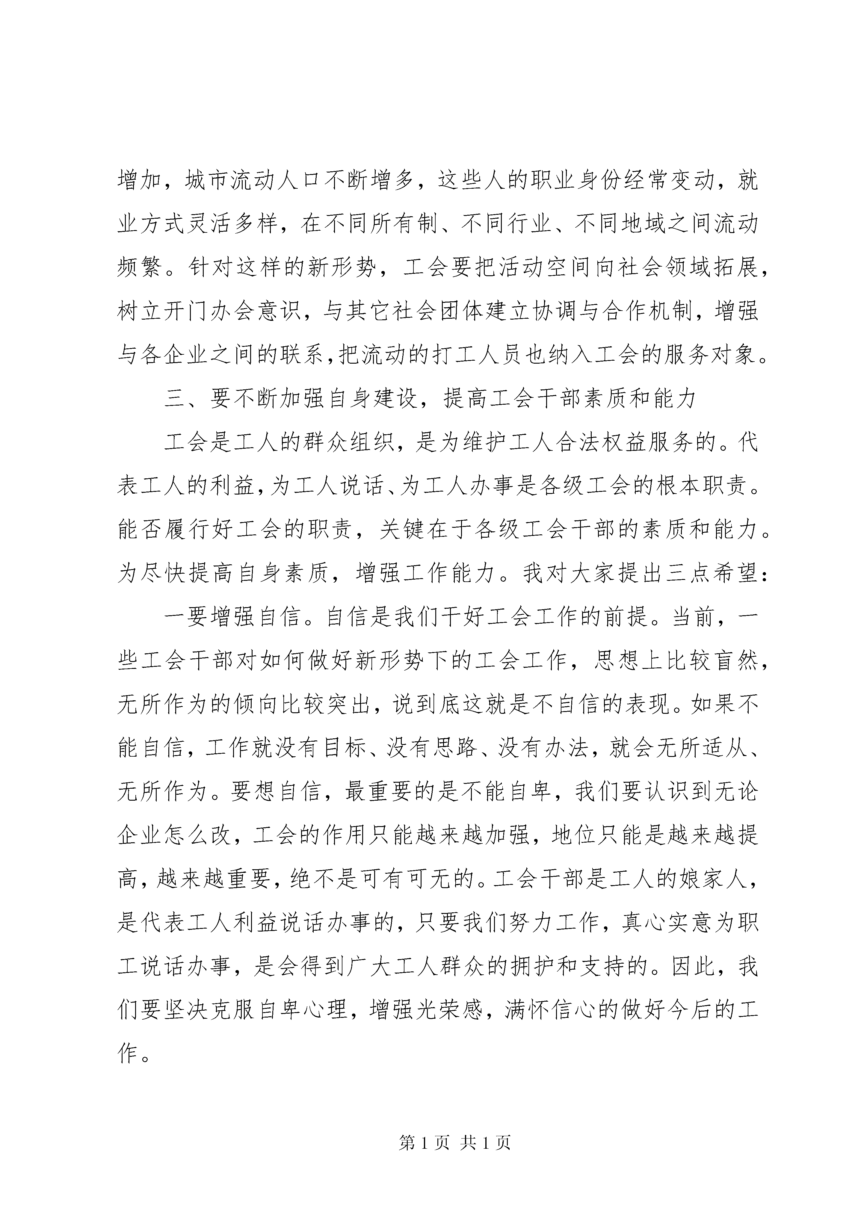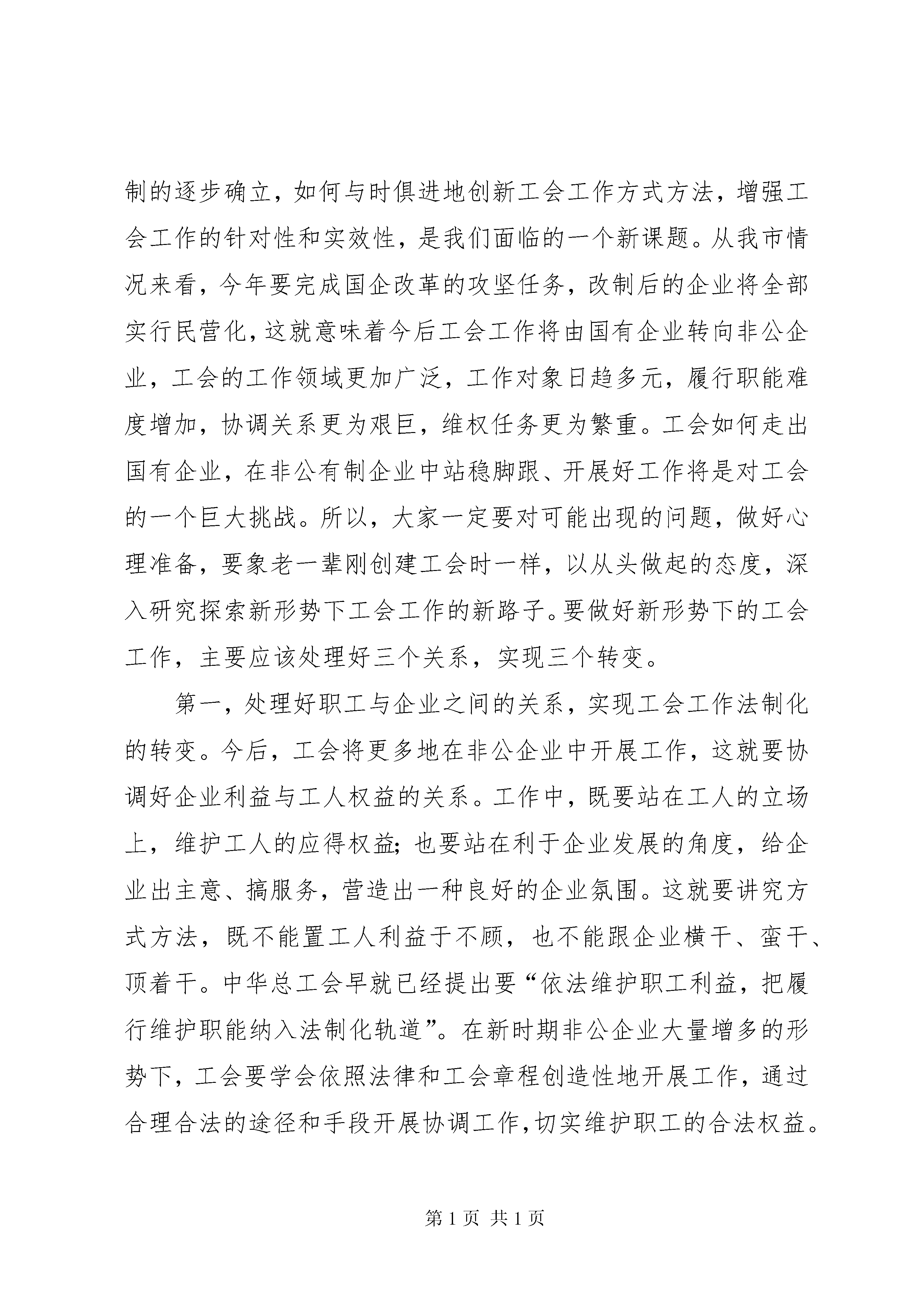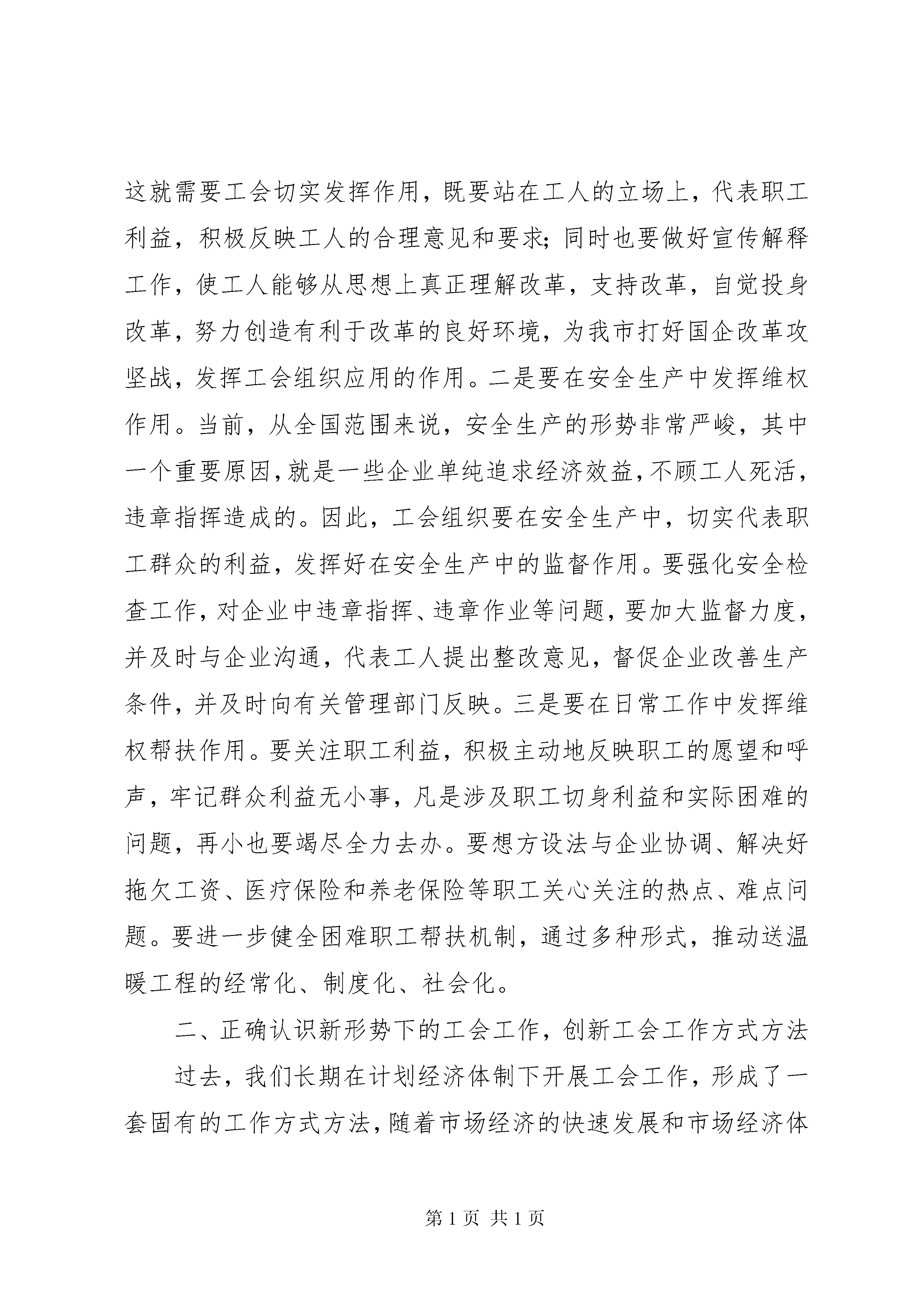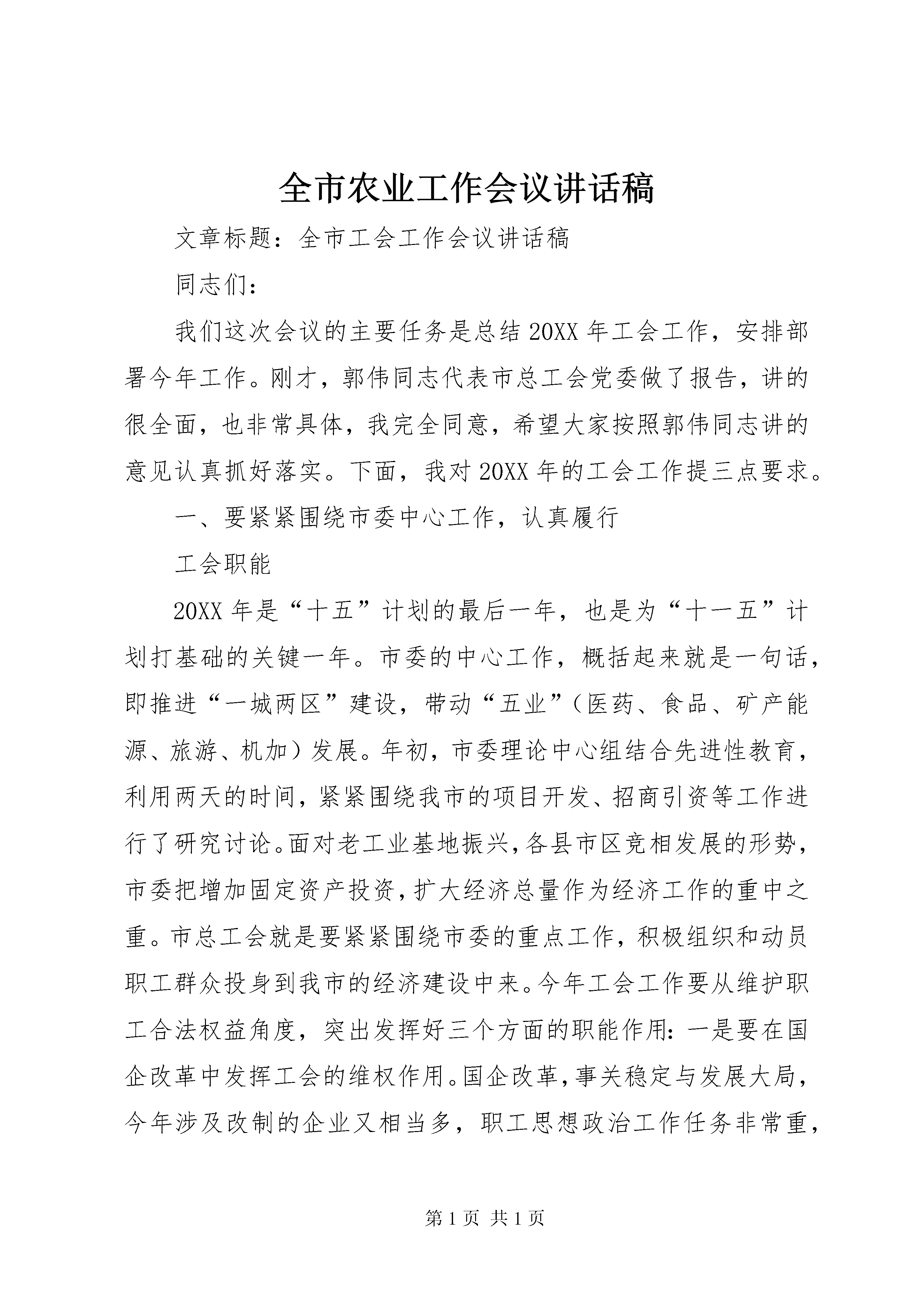 全市农业工作会议讲话稿文章标题:全市工会工作会议讲话稿同志们:我们这次会议的主要任务是总结20XX年工会工作,安排部署今年工作。刚才,郭伟同志代表市总工会党委做了报告,讲的很全面,也非常具体,我完全同意,希望大家按照郭伟同志讲的意见认真抓好落实。下面,我对20XX年的工会工作提三点要求。一、要紧紧围绕市委中心工作,认真履行工会职能20XX年是“十五”计划的最后一年,也是为“十一五”计划打基础的关键一年。市委的中心工作,概括起来就是一句话,即推进“一城两区”建设,带动“五业”(医药、食品、矿产能源、旅游、机加)发展。年初,市委理论中心组结合先进性教育,利用两天的时间,紧紧围绕我市的项目开发、招商引资等工作进行了研究讨论。面对老工业基地振兴,各县市区竞相发展的形势,市委把增加固定资产投资,扩大经济总量作为经济工作的重中之重。市总工会就是要紧紧围绕市委的重点工作,积极组织和动员职工群众投身到我市的经济建设中来。今年工会工作要从维护职工合法权益角度,突出发挥好三个方面的职能作用:一是要在国企改革中发挥工会的维权作用。国企改革,事关稳定与发展大局,今年涉及改制的企业又相当多,职工思想政治工作任务非常重,这就需要工会切实发挥作用,既要站在工人的立场上,代表职工利益,积极反映工人的合理意见和要求;同时也要做好宣传解释工作,使工人能够从思想上真正理解改革,支持改革,自觉投身改革,努力创造有利于改革的良好环境,为我市打好国企改革攻坚战,发挥工会组织应用的作用。二是要在安全生产中发挥维权作用。当前,从全国范围来说,安全生产的形势非常严峻,其中一个重要原因,就是一些企业单纯追求经济效益,不顾工人死活,违章指挥造成的。因此,工会组织要在安全生产中,切实代表职工群众的利益,发挥好在安全生产中的监督作用。要强化安全检查工作,对企业中违章指挥、违章作业等问题,要加大监督力度,并及时与企业沟通,代表工人提出整改意见,督促企业改善生产条件,并及时向有关管理部门反映。三是要在日常工作中发挥维权帮扶作用。要关注职工利益,积极主动地反映职工的愿望和呼声,牢记群众利益无小事,凡是涉及职工切身利益和实际困难的问题,再小也要竭尽全力去办。要想方设法与企业协调、解决好拖欠工资、医疗保险和养老保险等职工关心关注的热点、难点问题。要进一步健全困难职工帮扶机制,通过多种形式,推动送温暖工程的经常化、制度化、社会化。二、正确认识新形势下的工会工作,创新工会工作方式方法过去,我们长期在计划经济体制下开展工会工作,形成了一套固有的工作方式方法,随着市场经济的快速发展和市场经济体制的逐步确立,如何与时俱进地创新工会工作方式方法,增强工会工作的针对性和实效性,是我们面临的一个新课题。从我市情况来看,今年要完成国企改革的攻坚任务,改制后的企业将全部实行民营化,这就意味着今后工会工作将由国有企业转向非公企业,工会的工作领域更加广泛,工作对象日趋多元,履行职能难度增加,协调关系更为艰巨,维权任务更为繁重。工会如何走出国有企业,在非公有制企业中站稳脚跟、开展好工作将是对工会的一个巨大挑战。所以,大家一定要对可能出现的问题,做好心理准备,要象老一辈刚创建工会时一样,以从头做起的态度,深入研究探索新形势下工会工作的新路子。要做好新形势下的工会工作,主要应该处理好三个关系,实现三个转变。第一,处理好职工与企业之间的关系,实现工会工作法制化的转变。今后,工会将更多地在非公企业中开展工作,这就要协调好企业利益与工人权益的关系。工作中,既要站在工人的立场上,维护工人的应得权益;也要站在利于企业发展的角度,给企业出主意、搞服务,营造出一种良好的企业氛围。这就要讲究方式方法,既不能置工人利益于不顾,也不能跟企业横干、蛮干、顶着干。中华总工会早就已经提出要“依法维护职工利益,把履行维护职能纳入法制化轨道”。在新时期非公企业大量增多的形势下,工会要学会依照法律和工会章程创造性地开展工作,通过合理合法的途径和手段开展协调工作,切实维护职工的合法权益。工会干部要认真学法、懂法、用法,熟悉和精通与职工群众合法权益休戚相关的法律知识,选准位置,找准角度,抓住结合点,改变传统的工作方式,敢于和善于运用法律武器维护自身和职工群众的合法权益,将工会工作逐步纳入法制化轨道,依法履行好维护职能。第二,处理好职工之间的关系,实现工会工作民主化的转变。随着经济和社会的快速发展,职工队伍不断壮大,中青年农民进入企业打工将成为一种趋势,年青人个性鲜明,性子急,想问题、办事情易于情绪化,好胜心强,参与意识强。引导好了可以促进工作的开展,引导不好就容易出现问题。另外,传统产业工人逐渐减少,技术工人不断增加,这部分工人有文化、有思想、有素质,乐于参与工会组织,能够为工会提出合理化建议。因此,今后的工会工作必须扩大民主范围,