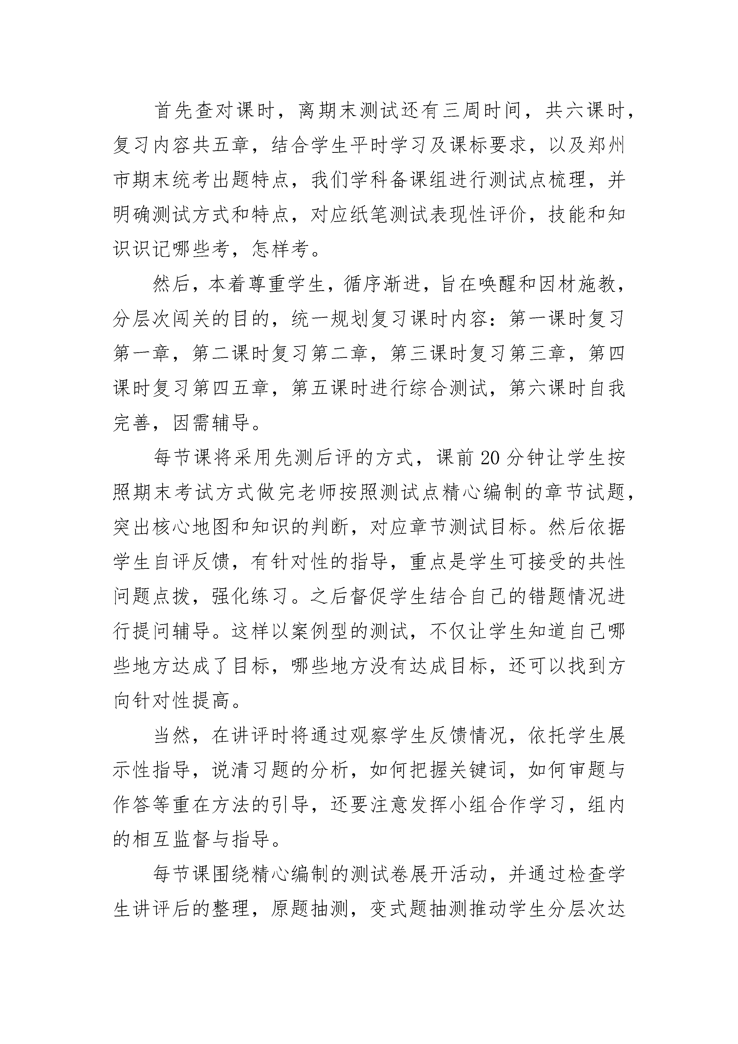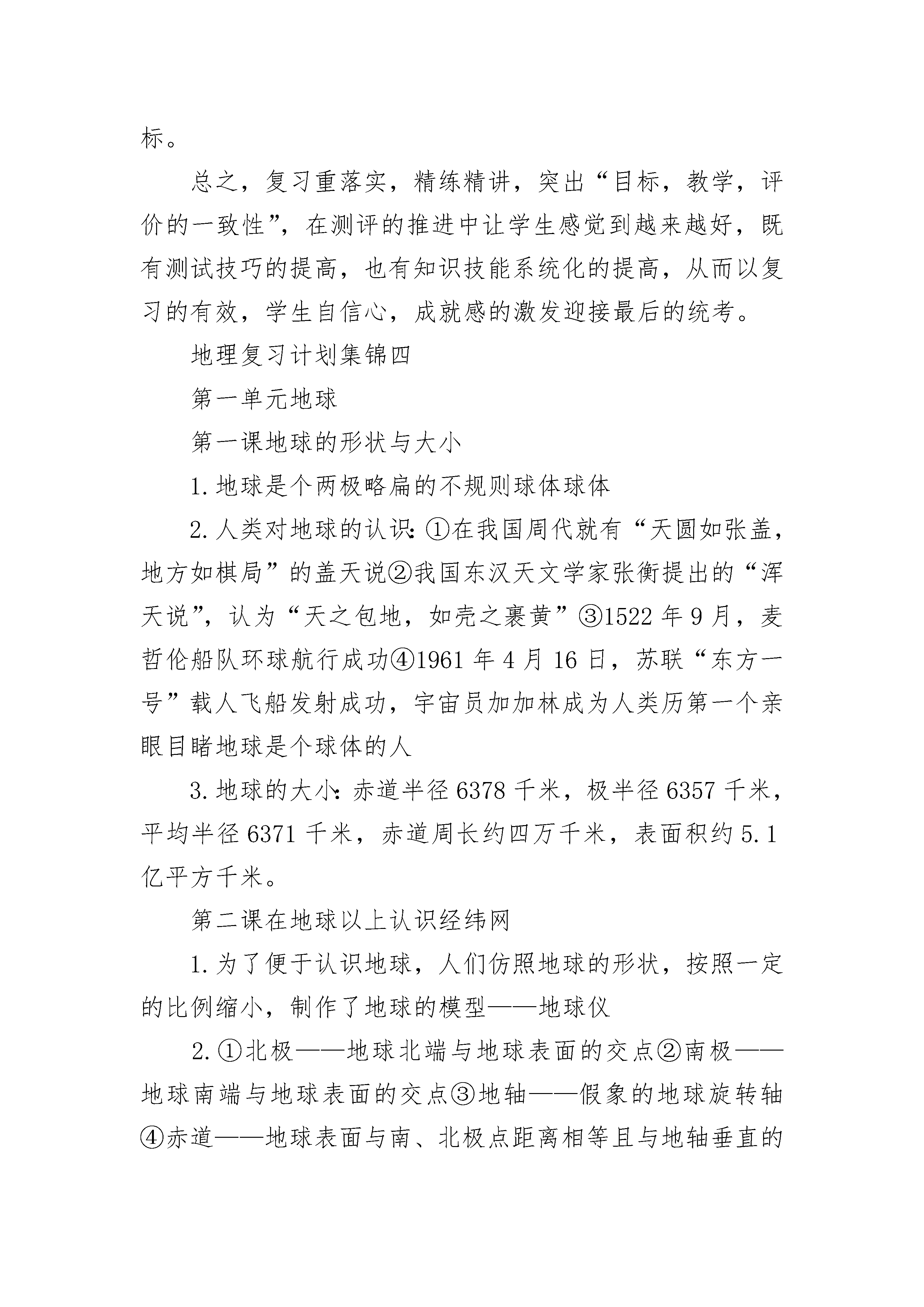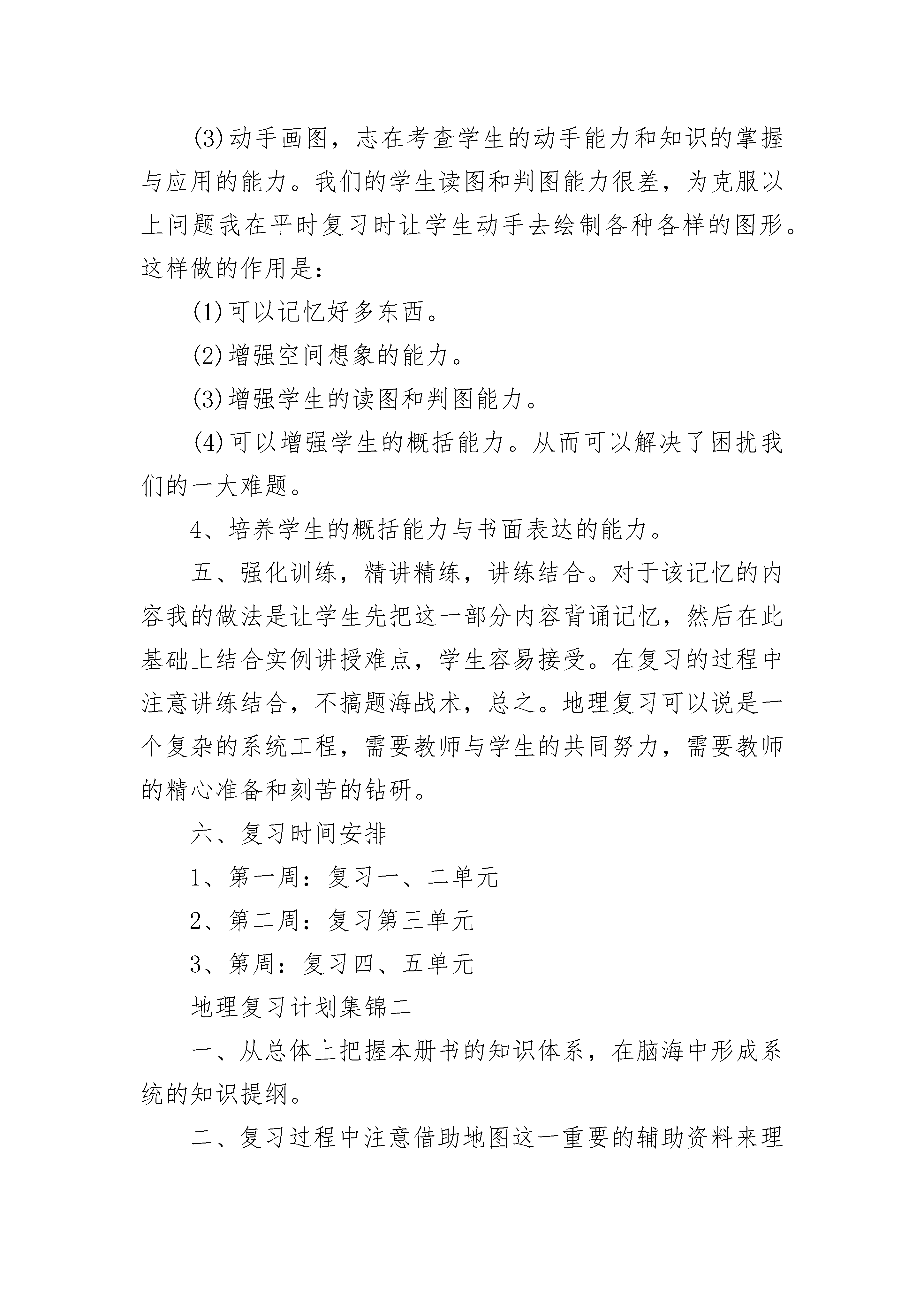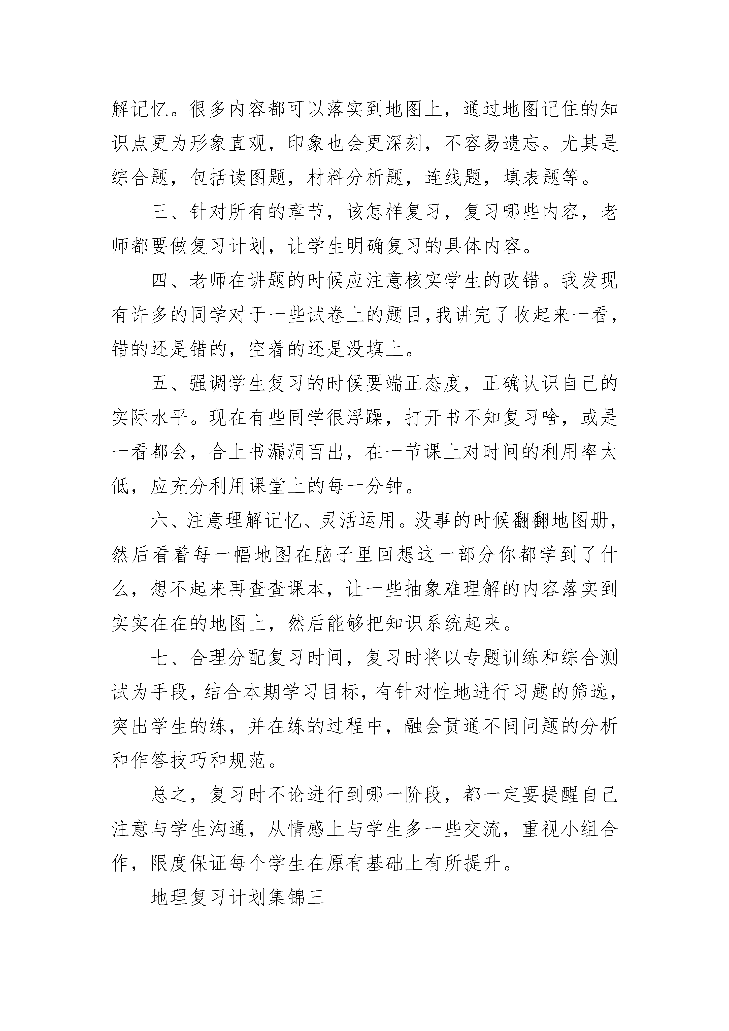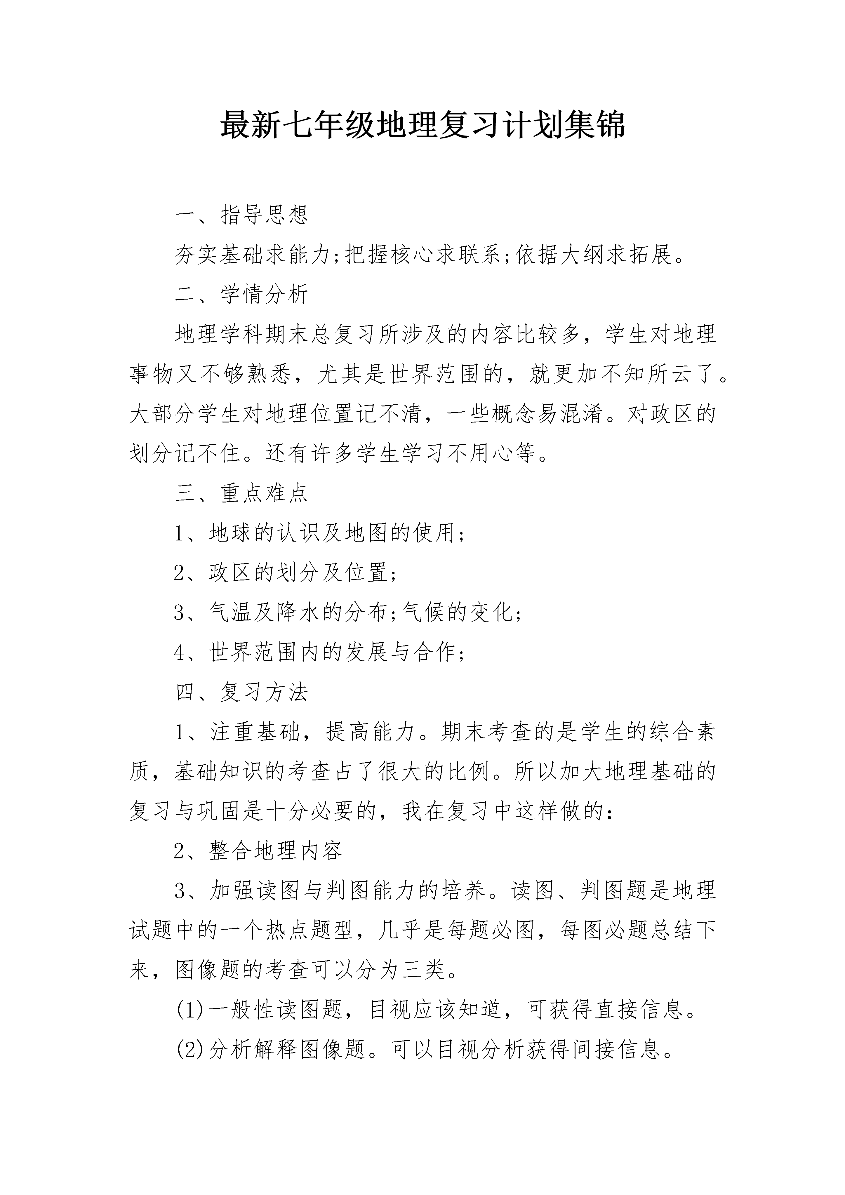 最新七年级地理复习计划集锦一、指导思想夯实基础求能力;把握核心求联系;依据大纲求拓展。二、学情分析地理学科期末总复习所涉及的内容比较多,学生对地理事物又不够熟悉,尤其是世界范围的,就更加不知所云了。大部分学生对地理位置记不清,一些概念易混淆。对政区的划分记不住。还有许多学生学习不用心等。三、重点难点1、地球的认识及地图的使用;2、政区的划分及位置;3、气温及降水的分布;气候的变化;4、世界范围内的发展与合作;四、复习方法1、注重基础,提高能力。期末考查的是学生的综合素质,基础知识的考查占了很大的比例。所以加大地理基础的复习与巩固是十分必要的,我在复习中这样做的:2、整合地理内容3、加强读图与判图能力的培养。读图、判图题是地理试题中的一个热点题型,几乎是每题必图,每图必题总结下来,图像题的考查可以分为三类。(1)一般性读图题,目视应该知道,可获得直接信息。(2)分析解释图像题。可以目视分析获得间接信息。(3)动手画图,志在考查学生的动手能力和知识的掌握与应用的能力。我们的学生读图和判图能力很差,为克服以上问题我在平时复习时让学生动手去绘制各种各样的图形。这样做的作用是:(1)可以记忆好多东西。(2)增强空间想象的能力。(3)增强学生的读图和判图能力。(4)可以增强学生的概括能力。从而可以解决了困扰我们的一大难题。4、培养学生的概括能力与书面表达的能力。五、强化训练,精讲精练,讲练结合。对于该记忆的内容我的做法是让学生先把这一部分内容背诵记忆,然后在此基础上结合实例讲授难点,学生容易接受。在复习的过程中注意讲练结合,不搞题海战术,总之。地理复习可以说是一个复杂的系统工程,需要教师与学生的共同努力,需要教师的精心准备和刻苦的钻研。六、复习时间安排1、第一周:复习一、二单元2、第二周:复习第三单元3、第周:复习四、五单元地理复习计划集锦二一、从总体上把握本册书的知识体系,在脑海中形成系统的知识提纲。二、复习过程中注意借助地图这一重要的辅助资料来理解记忆。很多内容都可以落实到地图上,通过地图记住的知识点更为形象直观,印象也会更深刻,不容易遗忘。尤其是综合题,包括读图题,材料分析题,连线题,填表题等。三、针对所有的章节,该怎样复习,复习哪些内容,老师都要做复习计划,让学生明确复习的具体内容。四、老师在讲题的时候应注意核实学生的改错。我发现有许多的同学对于一些试卷上的题目,我讲完了收起来一看,错的还是错的,空着的还是没填上。五、强调学生复习的时候要端正态度,正确认识自己的实际水平。现在有些同学很浮躁,打开书不知复习啥,或是一看都会,合上书漏洞百出,在一节课上对时间的利用率太低,应充分利用课堂上的每一分钟。六、注意理解记忆、灵活运用。没事的时候翻翻地图册,然后看着每一幅地图在脑子里回想这一部分你都学到了什么,想不起来再查查课本,让一些抽象难理解的内容落实到实实在在的地图上,然后能够把知识系统起来。七、合理分配复习时间,复习时将以专题训练和综合测试为手段,结合本期学习目标,有针对性地进行习题的筛选,突出学生的练,并在练的过程中,融会贯通不同问题的分析和作答技巧和规范。总之,复习时不论进行到哪一阶段,都一定要提醒自己注意与学生沟通,从情感上与学生多一些交流,重视小组合作,限度保证每个学生在原有基础上有所提升。地理复习计划集锦三首先查对课时,离期末测试还有三周时间,共六课时,复习内容共五章,结合学生平时学习及课标要求,以及郑州市期末统考出题特点,我们学科备课组进行测试点梳理,并明确测试方式和特点,对应纸笔测试表现性评价,技能和知识识记哪些考,怎样考。然后,本着尊重学生,循序渐进,旨在唤醒和因材施教,分层次闯关的目的,统一规划复习课时内容:第一课时复习第一章,第二课时复习第二章,第三课时复习第三章,第四课时复习第四五章,第五课时进行综合测试,第六课时自我完善,因需辅导。每节课将采用先测后评的方式,课前20分钟让学生按照期末考试方式做完老师按照测试点精心编制的章节试题,突出核心地图和知识的判断,对应章节测试目标。然后依据学生自评反馈,有针对性的指导,重点是学生可接受的共性问题点拨,强化练习。之后督促学生结合自己的错题情况进行提问辅导。这样以案例型的测试,不仅让学生知道自己哪些地方达成了目标,哪些地方没有达成目标,还可以找到方向针对性提高。当然,在讲评时将通过观察学生反馈情况,依托学生展示性指导,说清习题的分析,如何把握关键词,如何审题与作答等重在方法的引导,还要注意发挥小组合作学习,组内的相互监督与指导。每节课围绕精心编制的测试卷展开活动,并通过检查学生讲评后的整理,原题抽测,变式题抽测推动学生分层次达标。总之,复习重落实,精练精讲,突出“目标,教学,评价的一致性”,在测评的推进中让学生感觉到越来越好,既有测试技巧的提高,也有知识技能系统化的提高,