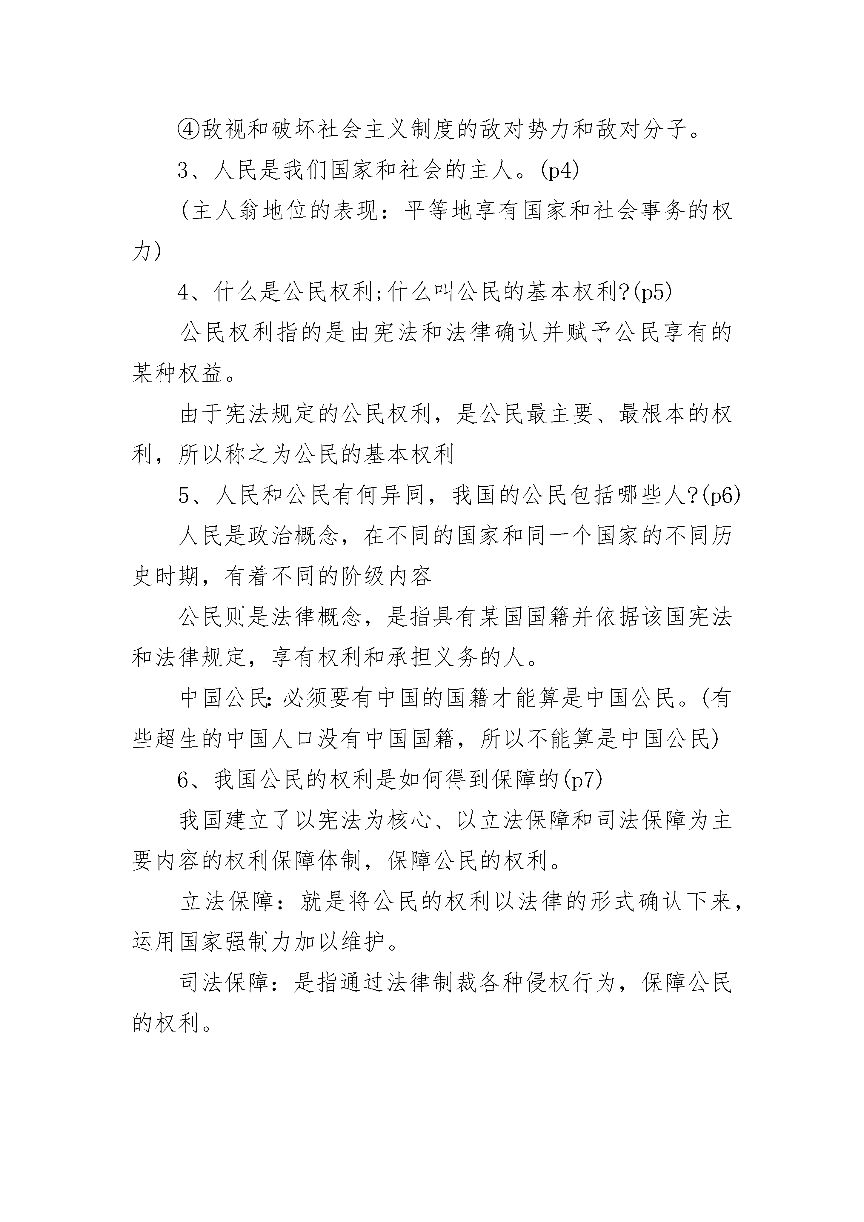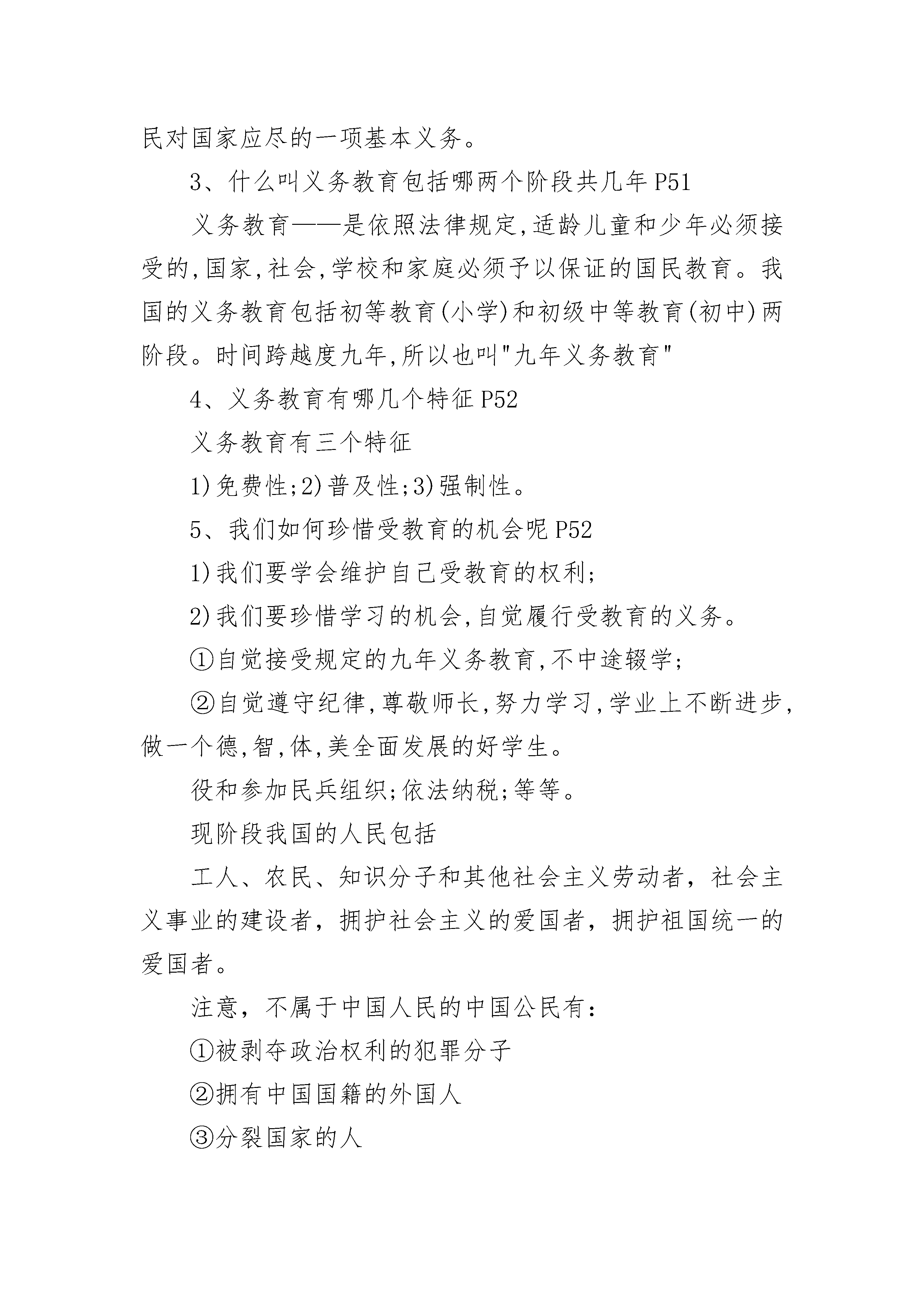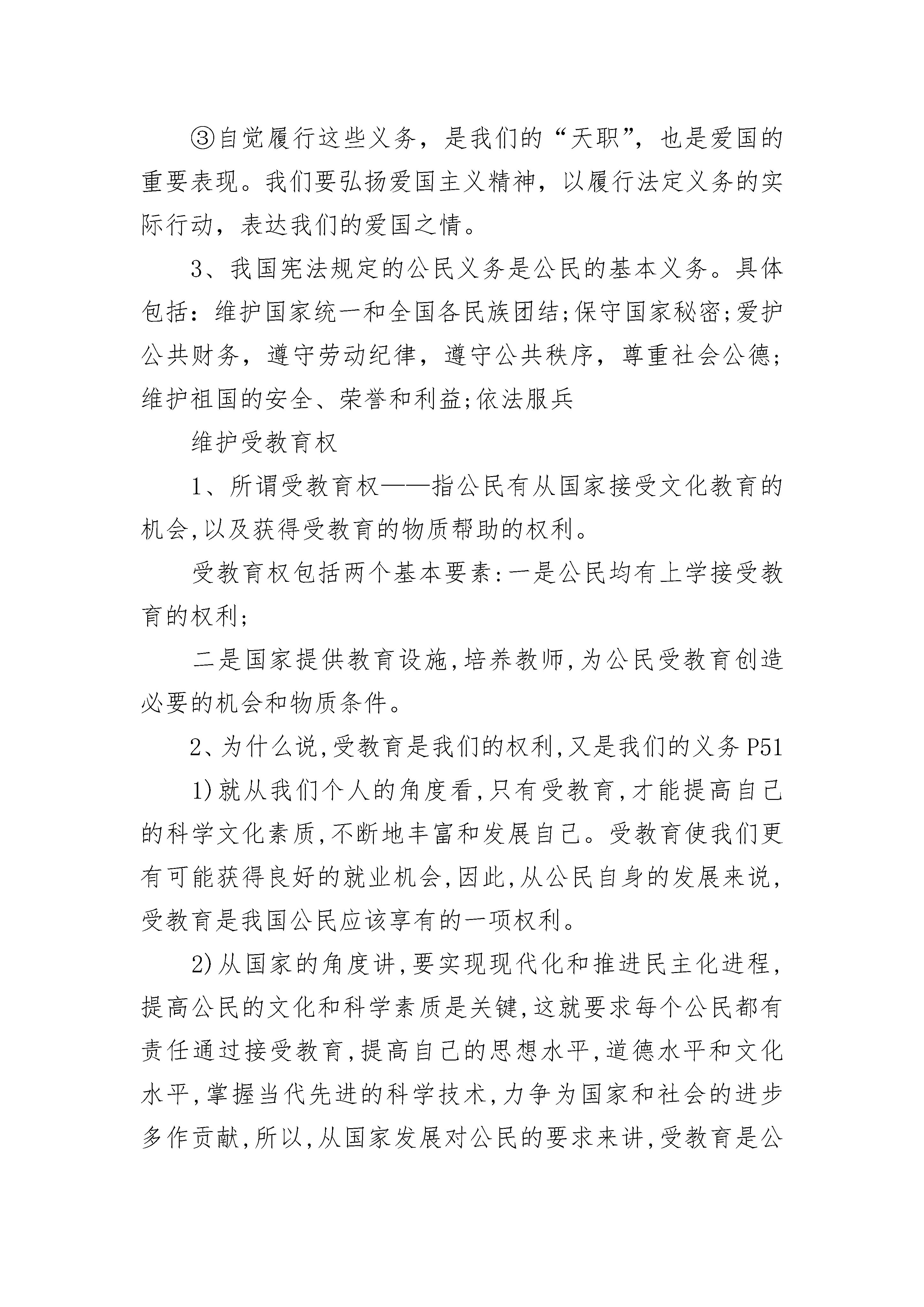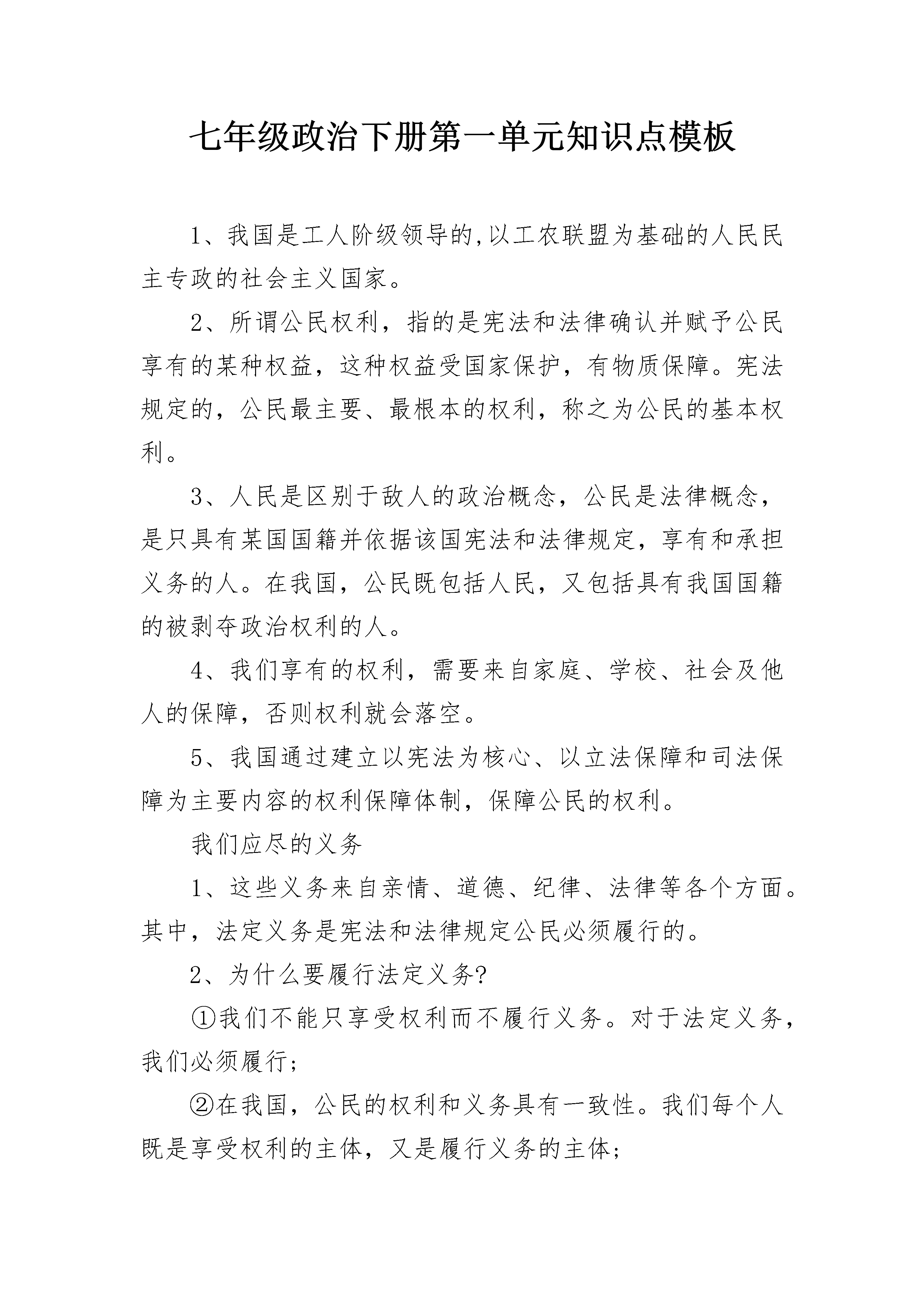 七年级政治下册第一单元知识点模板1、我国是工人阶级领导的,以工农联盟为基础的人民民主专政的社会主义国家。2、所谓公民权利,指的是宪法和法律确认并赋予公民享有的某种权益,这种权益受国家保护,有物质保障。宪法规定的,公民最主要、最根本的权利,称之为公民的基本权利。3、人民是区别于敌人的政治概念,公民是法律概念,是只具有某国国籍并依据该国宪法和法律规定,享有和承担义务的人。在我国,公民既包括人民,又包括具有我国国籍的被剥夺政治权利的人。4、我们享有的权利,需要来自家庭、学校、社会及他人的保障,否则权利就会落空。5、我国通过建立以宪法为核心、以立法保障和司法保障为主要内容的权利保障体制,保障公民的权利。我们应尽的义务1、这些义务来自亲情、道德、纪律、法律等各个方面。其中,法定义务是宪法和法律规定公民必须履行的。2、为什么要履行法定义务?①我们不能只享受权利而不履行义务。对于法定义务,我们必须履行;②在我国,公民的权利和义务具有一致性。我们每个人既是享受权利的主体,又是履行义务的主体;③自觉履行这些义务,是我们的“天职”,也是爱国的重要表现。我们要弘扬爱国主义精神,以履行法定义务的实际行动,表达我们的爱国之情。3、我国宪法规定的公民义务是公民的基本义务。具体包括:维护国家统一和全国各民族团结;保守国家秘密;爱护公共财务,遵守劳动纪律,遵守公共秩序,尊重社会公德;维护祖国的安全、荣誉和利益;依法服兵维护受教育权1、所谓受教育权——指公民有从国家接受文化教育的机会,以及获得受教育的物质帮助的权利。受教育权包括两个基本要素:一是公民均有上学接受教育的权利;二是国家提供教育设施,培养教师,为公民受教育创造必要的机会和物质条件。2、为什么说,受教育是我们的权利,又是我们的义务P511)就从我们个人的角度看,只有受教育,才能提高自己的科学文化素质,不断地丰富和发展自己。受教育使我们更有可能获得良好的就业机会,因此,从公民自身的发展来说,受教育是我国公民应该享有的一项权利。2)从国家的角度讲,要实现现代化和推进民主化进程,提高公民的文化和科学素质是关键,这就要求每个公民都有责任通过接受教育,提高自己的思想水平,道德水平和文化水平,掌握当代先进的科学技术,力争为国家和社会的进步多作贡献,所以,从国家发展对公民的要求来讲,受教育是公民对国家应尽的一项基本义务。3、什么叫义务教育包括哪两个阶段共几年P51义务教育——是依照法律规定,适龄儿童和少年必须接受的,国家,社会,学校和家庭必须予以保证的国民教育。我国的义务教育包括初等教育(小学)和初级中等教育(初中)两阶段。时间跨越度九年,所以也叫"九年义务教育"4、义务教育有哪几个特征P52义务教育有三个特征1)免费性;2)普及性;3)强制性。5、我们如何珍惜受教育的机会呢P521)我们要学会维护自己受教育的权利;2)我们要珍惜学习的机会,自觉履行受教育的义务。①自觉接受规定的九年义务教育,不中途辍学;②自觉遵守纪律,尊敬师长,努力学习,学业上不断进步,做一个德,智,体,美全面发展的好学生。役和参加民兵组织;依法纳税;等等。现阶段我国的人民包括工人、农民、知识分子和其他社会主义劳动者,社会主义事业的建设者,拥护社会主义的爱国者,拥护祖国统一的爱国者。注意,不属于中国人民的中国公民有:①被剥夺政治权利的犯罪分子②拥有中国国籍的外国人③分裂国家的人④敌视和破坏社会主义制度的敌对势力和敌对分子。3、人民是我们国家和社会的主人。(p4)(主人翁地位的表现:平等地享有国家和社会事务的权力)4、什么是公民权利;什么叫公民的基本权利?(p5)公民权利指的是由宪法和法律确认并赋予公民享有的某种权益。由于宪法规定的公民权利,是公民最主要、最根本的权利,所以称之为公民的基本权利5、人民和公民有何异同,我国的公民包括哪些人?(p6)人民是政治概念,在不同的国家和同一个国家的不同历史时期,有着不同的阶级内容公民则是法律概念,是指具有某国国籍并依据该国宪法和法律规定,享有权利和承担义务的人。中国公民:必须要有中国的国籍才能算是中国公民。(有些超生的中国人口没有中国国籍,所以不能算是中国公民)6、我国公民的权利是如何得到保障的(p7)我国建立了以宪法为核心、以立法保障和司法保障为主要内容的权利保障体制,保障公民的权利。立法保障:就是将公民的权利以法律的形式确认下来,运用国家强制力加以维护。司法保障:是指通过法律制裁各种侵权行为,保障公民的权利。