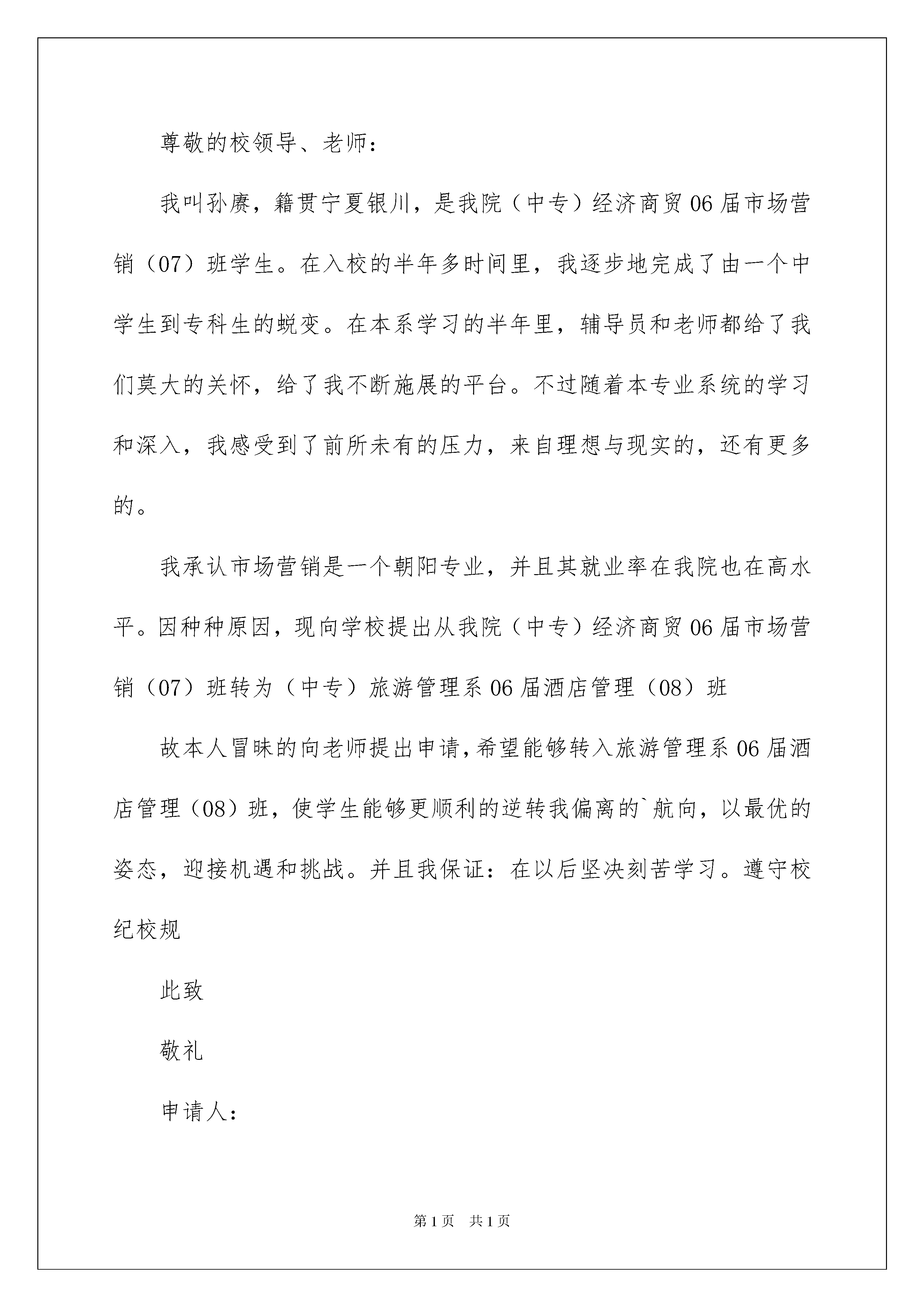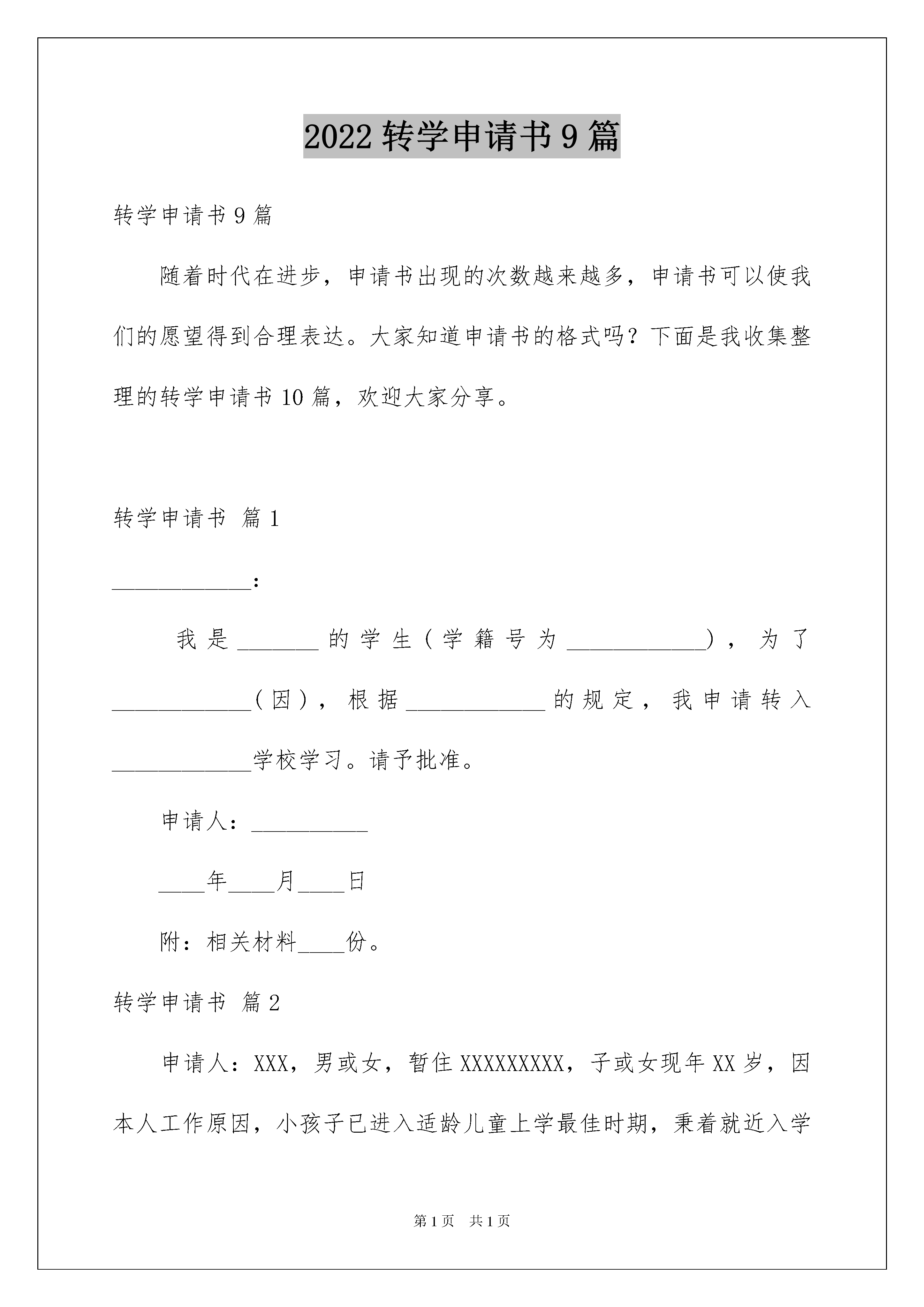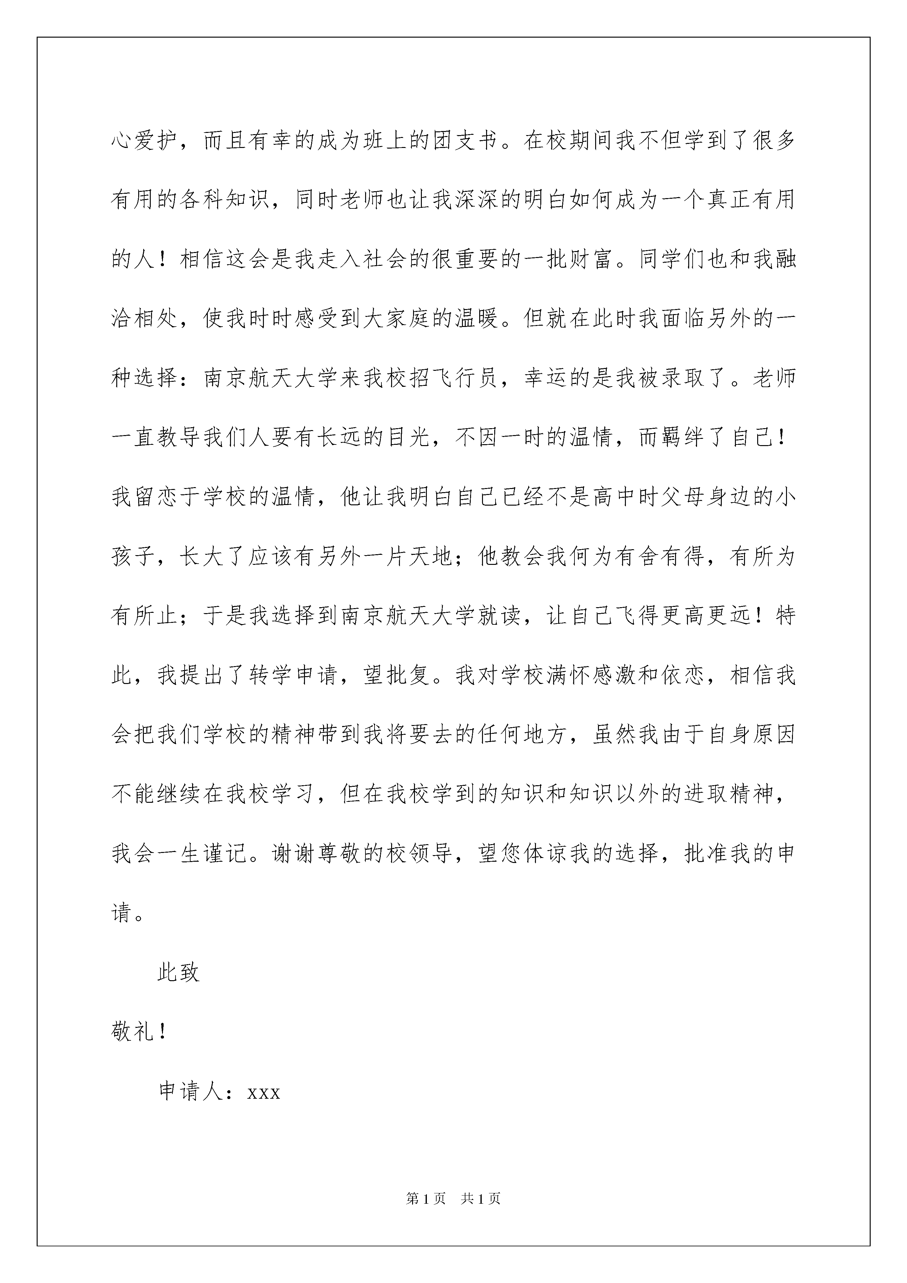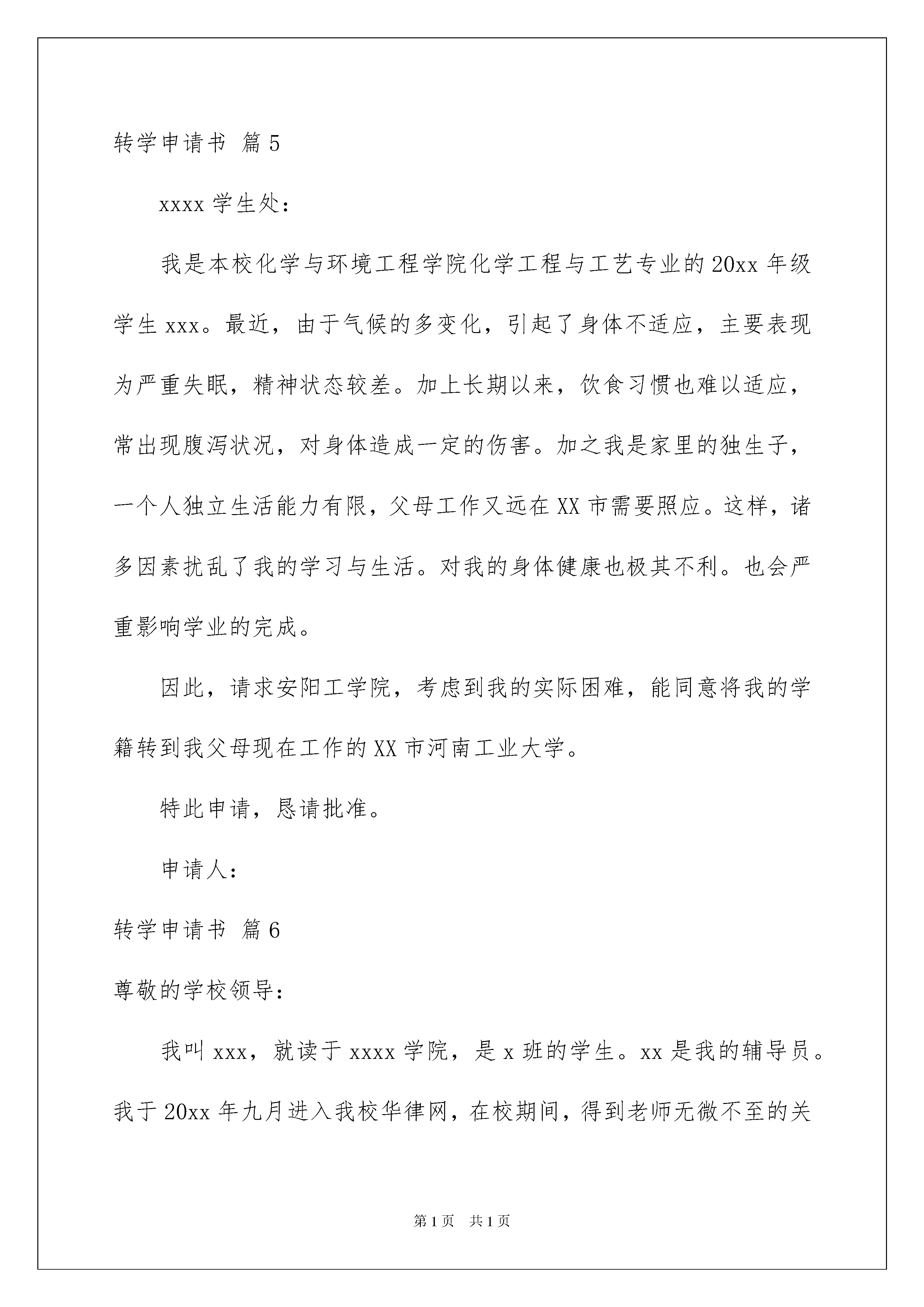 2022转学申请书9篇转学申请书9篇随着时代在进步,申请书出现的次数越来越多,申请书可以使我们的愿望得到合理表达。大家知道申请书的格式吗?下面是我收集整理的转学申请书10篇,欢迎大家分享。转学申请书篇1____________:我是_______的学生(学籍号为____________),为了____________(因),根据____________的规定,我申请转入____________学校学习。请予批准。申请人:______________年____月____日附:相关材料____份。转学申请书篇2申请人:XXX,男或女,暂住XXXXXXXXX,子或女现年XX岁,因本人工作原因,小孩子已进入适龄儿童上学最佳时期,秉着就近入学便于其身体健康、好好学习的宗旨,根据国家相关政策,申请人小孩符合进入该校学习条件,故特申请前来,祁望校领导批准。此致敬礼!申请人:yjbys20xx年xx月xx日转学申请书篇3尊敬的XX校领导:我叫XX,性别,XX年XX月XX日出生,(身份证号:XXXXXXXXXXXXXXXXXX),家住XX,是XX学校XX班学生。因XX年XX月应征入伍(入伍证书编号:),特向校领导申请部队服役期间(XX年XX月XX日——XX年XX月XX日)保留学籍,我将于复员后一年内持复员证到校办理复学手续。特此申请!申请人:YJBYS20xx年**月**日转学申请书篇4尊敬的校领导、老师:我叫孙赓,籍贯宁夏银川,是我院(中专)经济商贸06届市场营销(07)班学生。在入校的半年多时间里,我逐步地完成了由一个中学生到专科生的蜕变。在本系学习的半年里,辅导员和老师都给了我们莫大的关怀,给了我不断施展的平台。不过随着本专业系统的学习和深入,我感受到了前所未有的压力,来自理想与现实的,还有更多的。我承认市场营销是一个朝阳专业,并且其就业率在我院也在高水平。因种种原因,现向学校提出从我院(中专)经济商贸06届市场营销(07)班转为(中专)旅游管理系06届酒店管理(08)班故本人冒昧的向老师提出申请,希望能够转入旅游管理系06届酒店管理(08)班,使学生能够更顺利的逆转我偏离的`航向,以最优的姿态,迎接机遇和挑战。并且我保证:在以后坚决刻苦学习。遵守校纪校规此致敬礼申请人:转学申请书篇5xxxx学生处:我是本校化学与环境工程学院化学工程与工艺专业的20xx年级学生xxx。最近,由于气候的多变化,引起了身体不适应,主要表现为严重失眠,精神状态较差。加上长期以来,饮食习惯也难以适应,常出现腹泻状况,对身体造成一定的伤害。加之我是家里的独生子,一个人独立生活能力有限,父母工作又远在XX市需要照应。这样,诸多因素扰乱了我的学习与生活。对我的身体健康也极其不利。也会严重影响学业的完成。因此,请求安阳工学院,考虑到我的实际困难,能同意将我的学籍转到我父母现在工作的XX市河南工业大学。特此申请,恳请批准。申请人:转学申请书篇6尊敬的学校领导:我叫xxx,就读于xxxx学院,是x班的学生。xx是我的辅导员。我于20xx年九月进入我校华律网,在校期间,得到老师无微不至的关心爱护,而且有幸的成为班上的团支书。在校期间我不但学到了很多有用的各科知识,同时老师也让我深深的明白如何成为一个真正有用的人!相信这会是我走入社会的很重要的一批财富。同学们也和我融洽相处,使我时时感受到大家庭的温暖。但就在此时我面临另外的一种选择:南京航天大学来我校招飞行员,幸运的是我被录取了。老师一直教导我们人要有长远的目光,不因一时的温情,而羁绊了自己!我留恋于学校的温情,他让我明白自己已经不是高中时父母身边的小孩子,长大了应该有另外一片天地;他教会我何为有舍有得,有所为有所止;于是我选择到南京航天大学就读,让自己飞得更高更远!特此,我提出了转学申请,望批复。我对学校满怀感激和依恋,相信我会把我们学校的精神带到我将要去的任何地方,虽然我由于自身原因不能继续在我校学习,但在我校学到的知识和知识以外的进取精神,我会一生谨记。谢谢尊敬的校领导,望您体谅我的选择,批准我的申请。此致敬礼!申请人:xxx申请日期:20xx年xx月xx日转学申请书篇7尊敬的校领导,老师:我是xx班的xx。因xxxxxx原因要转到xxxxxx地上学。特此提出转学申请。我自愿放弃在xx中(写全名)的学习资格。恳请给予批准。谢谢!学生姓名:xx家长签字:xx日期:20xx年x月x日转学申请书篇8小学教导处:我的父母因工作需要,已调往xx市工作,我身边现在无任何亲人,为了方便我的学习和生活,让父母更加安心地工作,特提出申请转入就近学校上学青岛市市南区实验小学,转学至xx