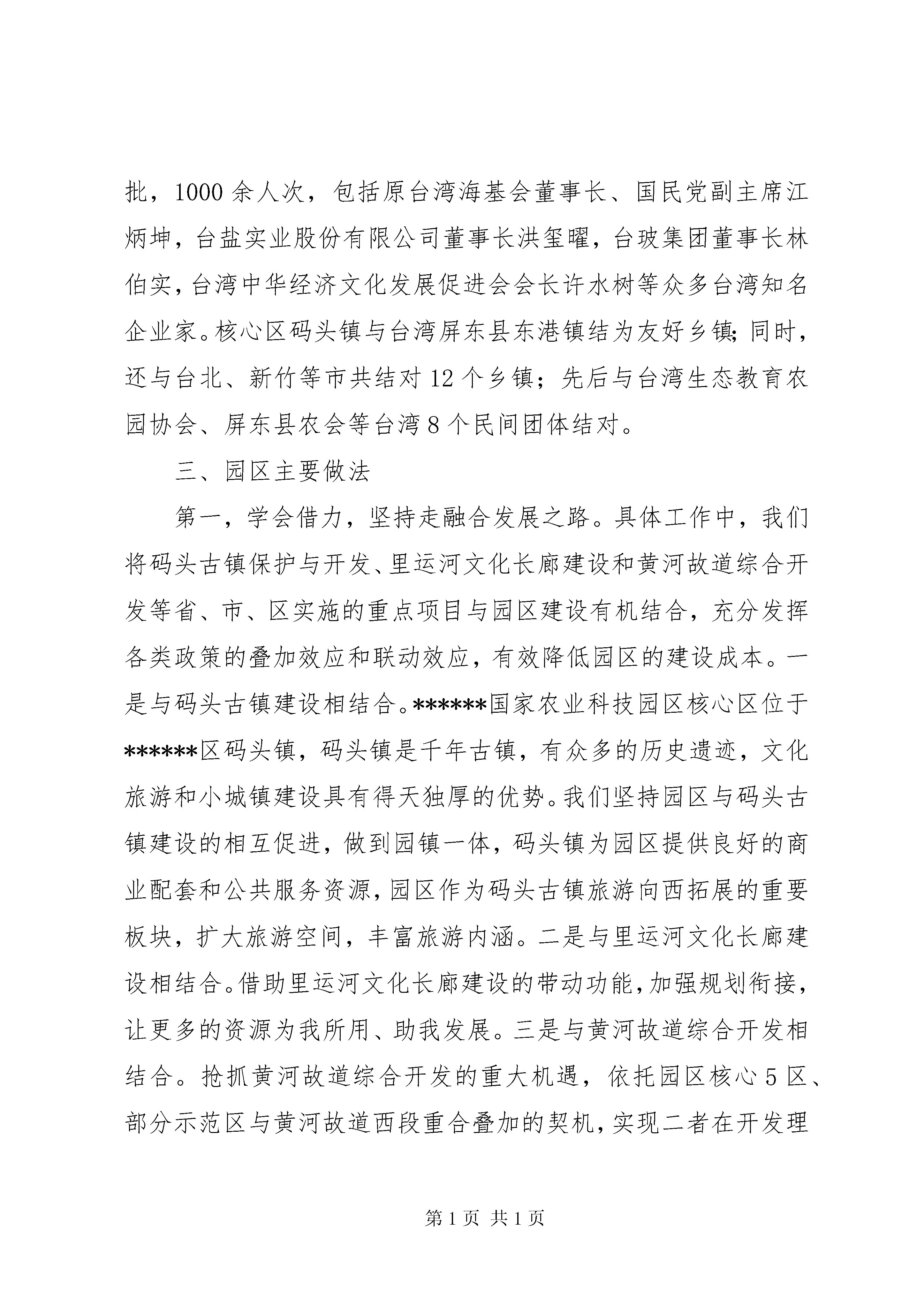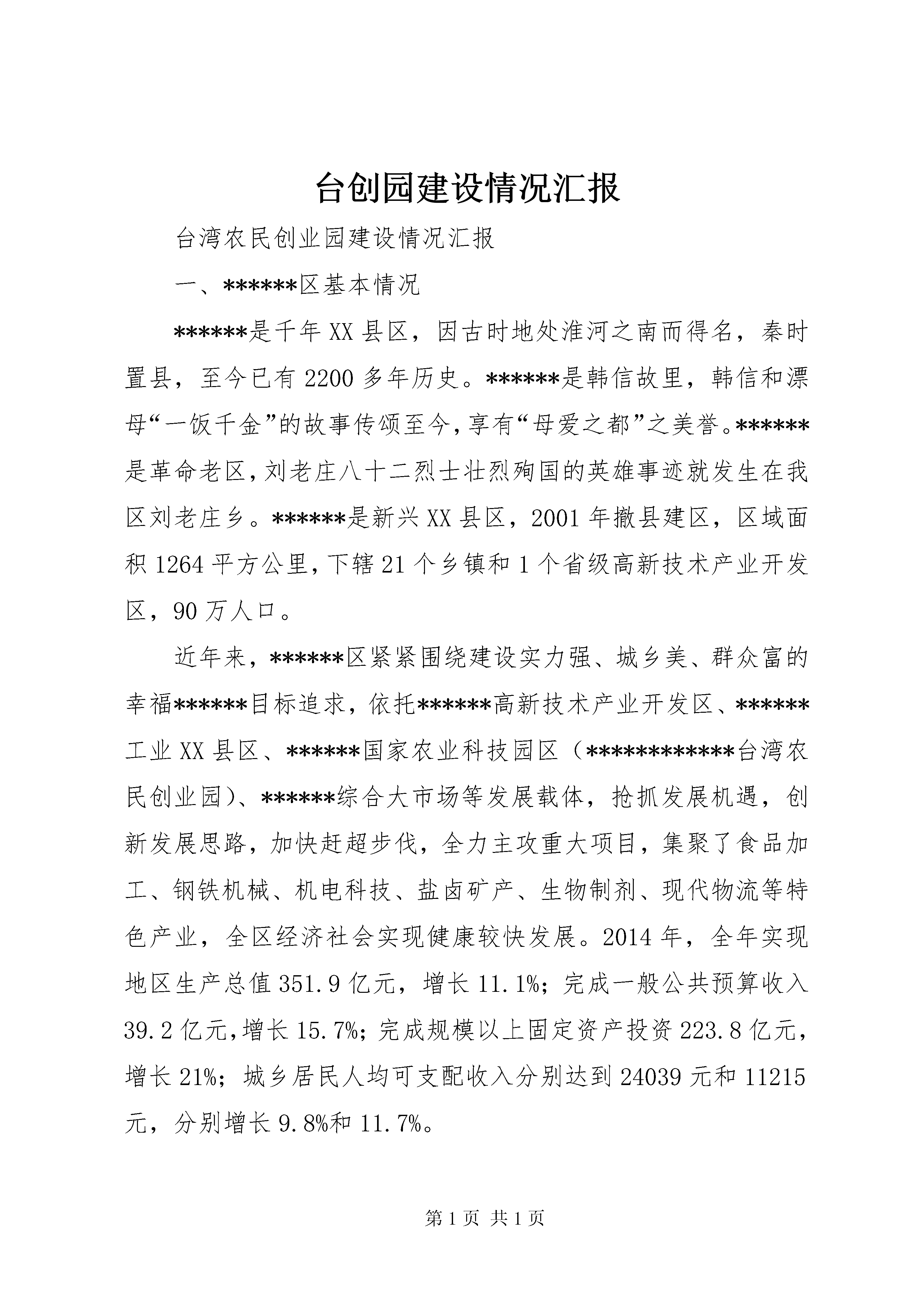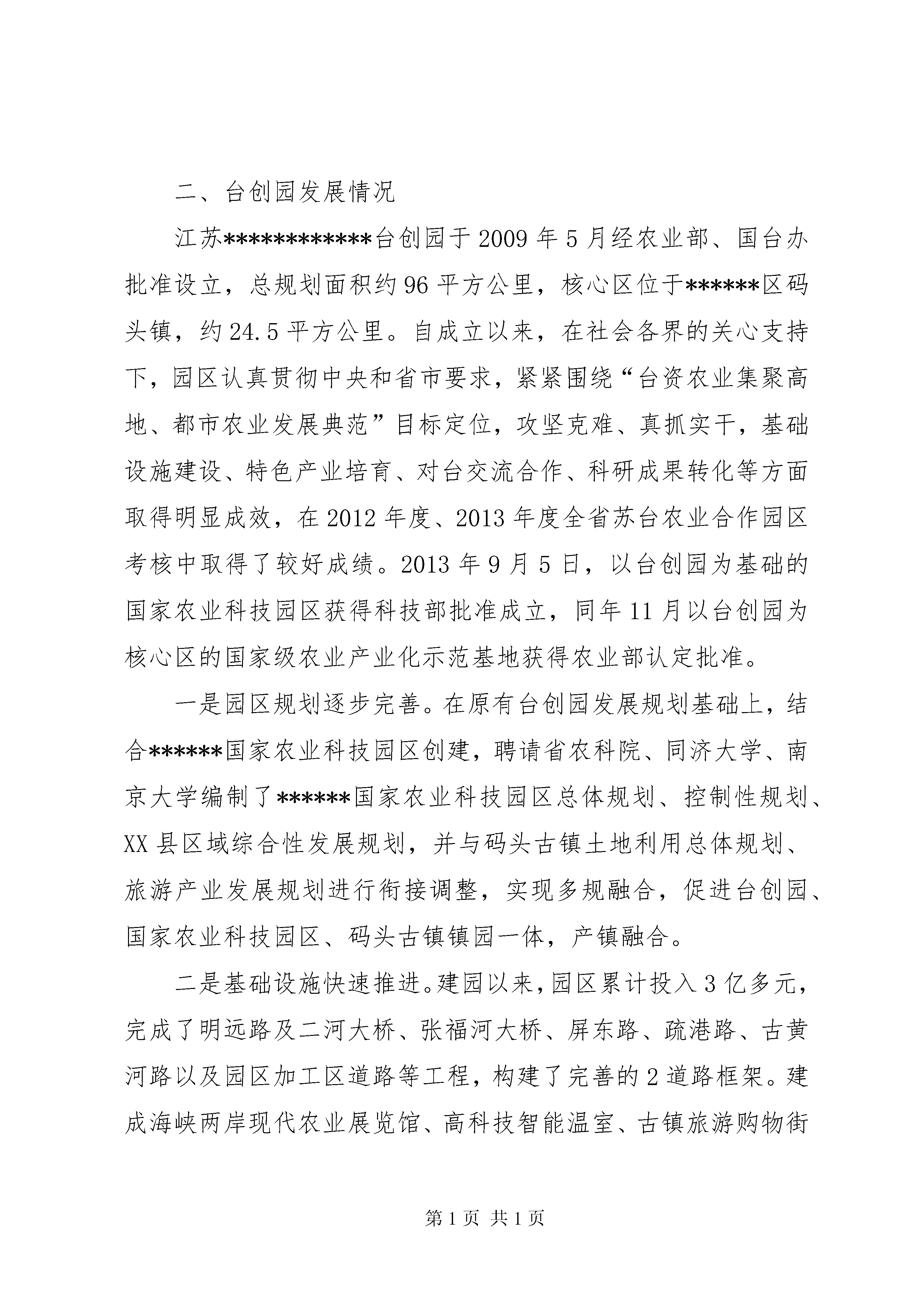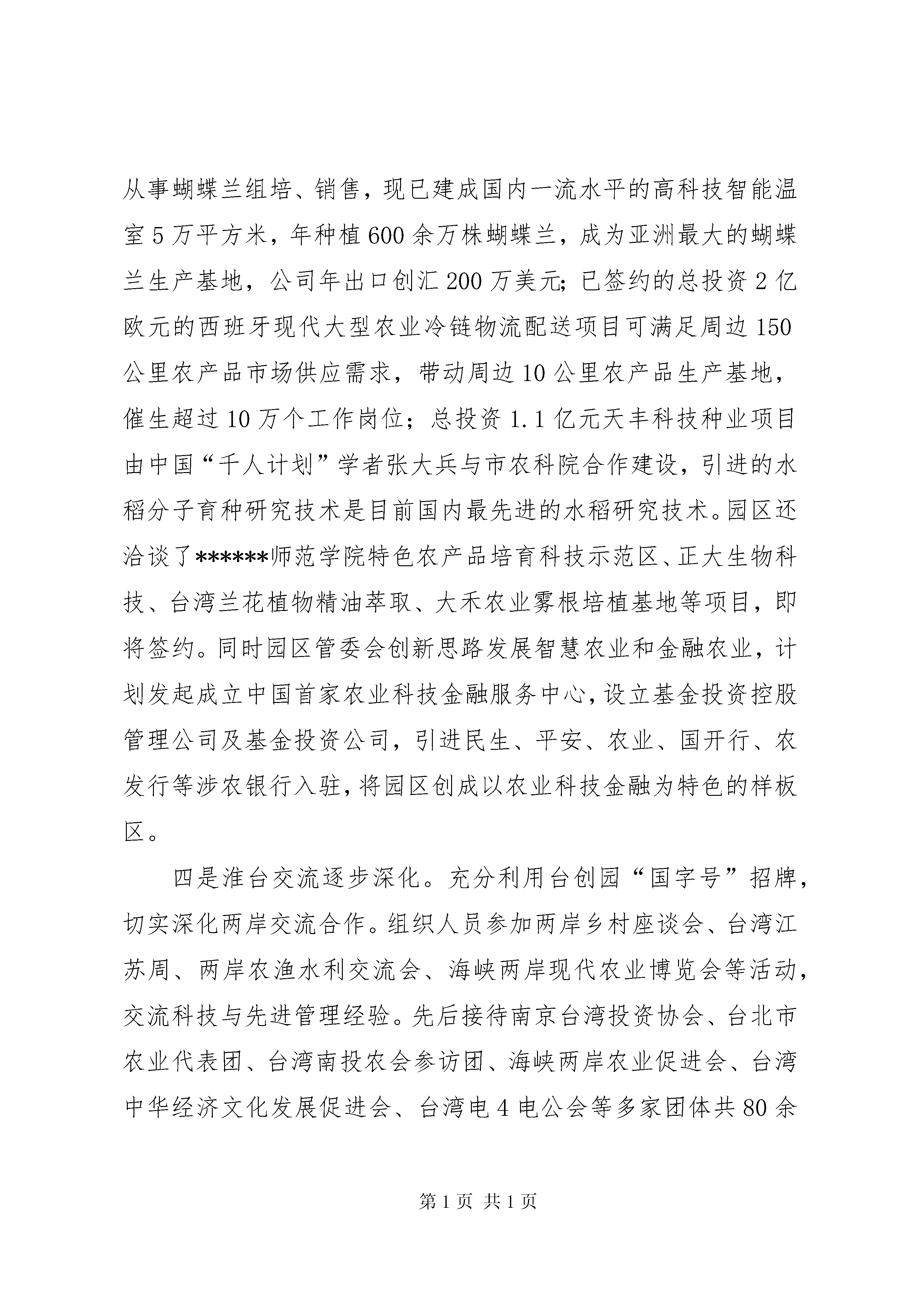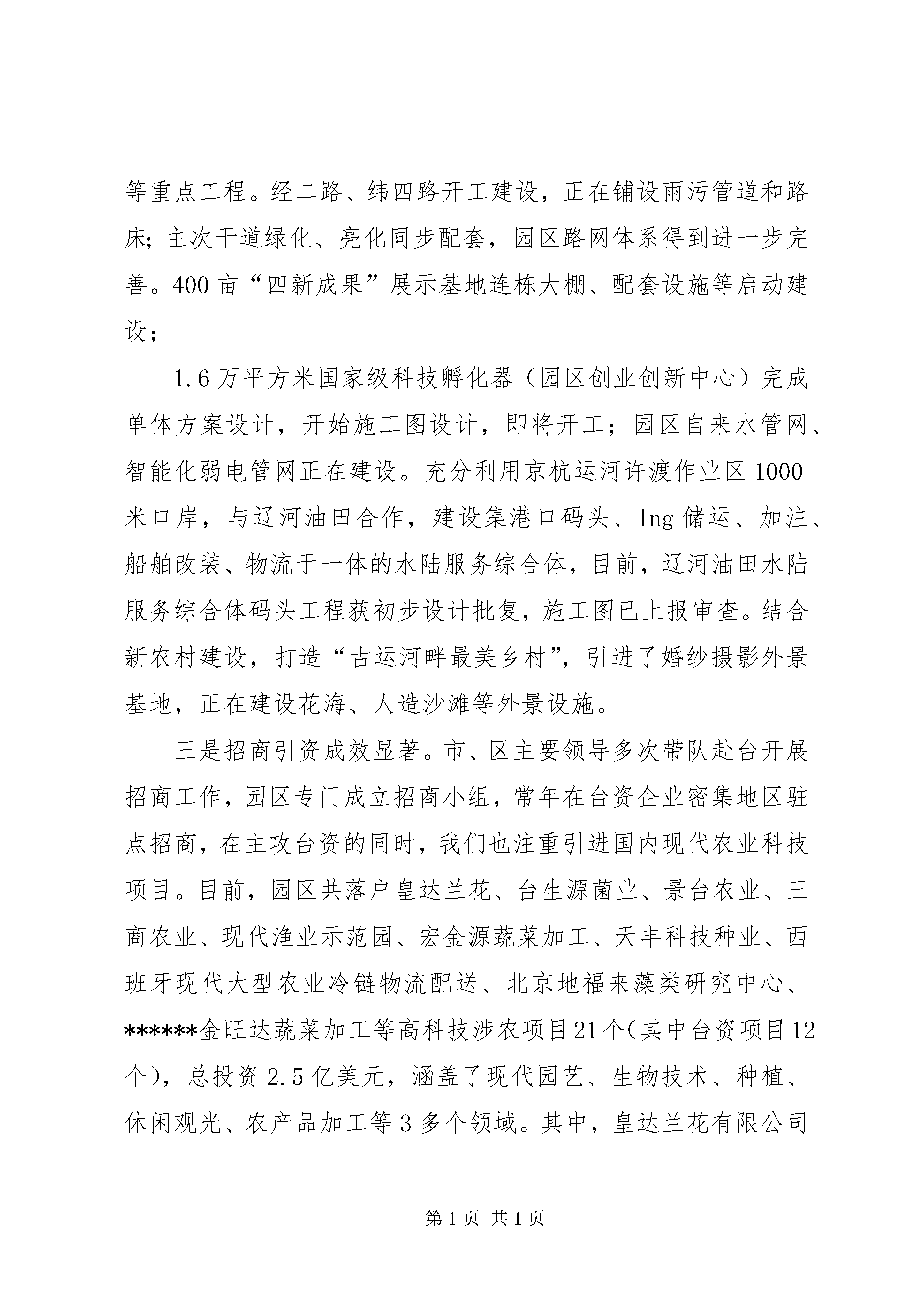 台创园建设情况汇报台湾农民创业园建设情况汇报一、******区基本情况******是千年XX县区,因古时地处淮河之南而得名,秦时置县,至今已有2200多年历史。******是韩信故里,韩信和漂母“一饭千金”的故事传颂至今,享有“母爱之都”之美誉。******是革命老区,刘老庄八十二烈士壮烈殉国的英雄事迹就发生在我区刘老庄乡。******是新兴XX县区,2001年撤县建区,区域面积1264平方公里,下辖21个乡镇和1个省级高新技术产业开发区,90万人口。近年来,******区紧紧围绕建设实力强、城乡美、群众富的幸福******目标追求,依托******高新技术产业开发区、******工业XX县区、******国家农业科技园区(************台湾农民创业园)、******综合大市场等发展载体,抢抓发展机遇,创新发展思路,加快赶超步伐,全力主攻重大项目,集聚了食品加工、钢铁机械、机电科技、盐卤矿产、生物制剂、现代物流等特色产业,全区经济社会实现健康较快发展。2014年,全年实现地区生产总值351.9亿元,增长11.1%;完成一般公共预算收入39.2亿元,增长15.7%;完成规模以上固定资产投资223.8亿元,增长21%;城乡居民人均可支配收入分别达到24039元和11215元,分别增长9.8%和11.7%。二、台创园发展情况江苏************台创园于2009年5月经农业部、国台办批准设立,总规划面积约96平方公里,核心区位于******区码头镇,约24.5平方公里。自成立以来,在社会各界的关心支持下,园区认真贯彻中央和省市要求,紧紧围绕“台资农业集聚高地、都市农业发展典范”目标定位,攻坚克难、真抓实干,基础设施建设、特色产业培育、对台交流合作、科研成果转化等方面取得明显成效,在2012年度、2013年度全省苏台农业合作园区考核中取得了较好成绩。2013年9月5日,以台创园为基础的国家农业科技园区获得科技部批准成立,同年11月以台创园为核心区的国家级农业产业化示范基地获得农业部认定批准。一是园区规划逐步完善。在原有台创园发展规划基础上,结合******国家农业科技园区创建,聘请省农科院、同济大学、南京大学编制了******国家农业科技园区总体规划、控制性规划、XX县区域综合性发展规划,并与码头古镇土地利用总体规划、旅游产业发展规划进行衔接调整,实现多规融合,促进台创园、国家农业科技园区、码头古镇镇园一体,产镇融合。二是基础设施快速推进。建园以来,园区累计投入3亿多元,完成了明远路及二河大桥、张福河大桥、屏东路、疏港路、古黄河路以及园区加工区道路等工程,构建了完善的2道路框架。建成海峡两岸现代农业展览馆、高科技智能温室、古镇旅游购物街等重点工程。经二路、纬四路开工建设,正在铺设雨污管道和路床;主次干道绿化、亮化同步配套,园区路网体系得到进一步完善。400亩“四新成果”展示基地连栋大棚、配套设施等启动建设;1.6万平方米国家级科技孵化器(园区创业创新中心)完成单体方案设计,开始施工图设计,即将开工;园区自来水管网、智能化弱电管网正在建设。充分利用京杭运河许渡作业区1000米口岸,与辽河油田合作,建设集港口码头、lng储运、加注、船舶改装、物流于一体的水陆服务综合体,目前,辽河油田水陆服务综合体码头工程获初步设计批复,施工图已上报审查。结合新农村建设,打造“古运河畔最美乡村”,引进了婚纱摄影外景基地,正在建设花海、人造沙滩等外景设施。三是招商引资成效显著。市、区主要领导多次带队赴台开展招商工作,园区专门成立招商小组,常年在台资企业密集地区驻点招商,在主攻台资的同时,我们也注重引进国内现代农业科技项目。目前,园区共落户皇达兰花、台生源菌业、景台农业、三商农业、现代渔业示范园、宏金源蔬菜加工、天丰科技种业、西班牙现代大型农业冷链物流配送、北京地福来藻类研究中心、******金旺达蔬菜加工等高科技涉农项目21个(其中台资项目12个),总投资2.5亿美元,涵盖了现代园艺、生物技术、种植、休闲观光、农产品加工等3多个领域。其中,皇达兰花有限公司从事蝴蝶兰组培、销售,现已建成国内一流水平的高科技智能温室5万平方米,年种植600余万株蝴蝶兰,成为亚洲最大的蝴蝶兰生产基地,公司年出口创汇200万美元;已签约的总投资2亿欧元的西班牙现代大型农业冷链物流配送项目可满足周边150公里农产品市场供应需求,带动周边10公里农产品生产基地,催生超过10万个工作岗位;总投资1.1亿元天丰科技种业项目由中国“千人计划”学者张大兵与市农科院合作建设,引进的水稻分子育种研究技术是目前国内最先进的水稻研究技术。园区还洽谈了******师范学院特色农产品培育科技示范区、正大生物科技、台湾兰花植物精油萃取、大禾农业雾根培植基地等项目,即