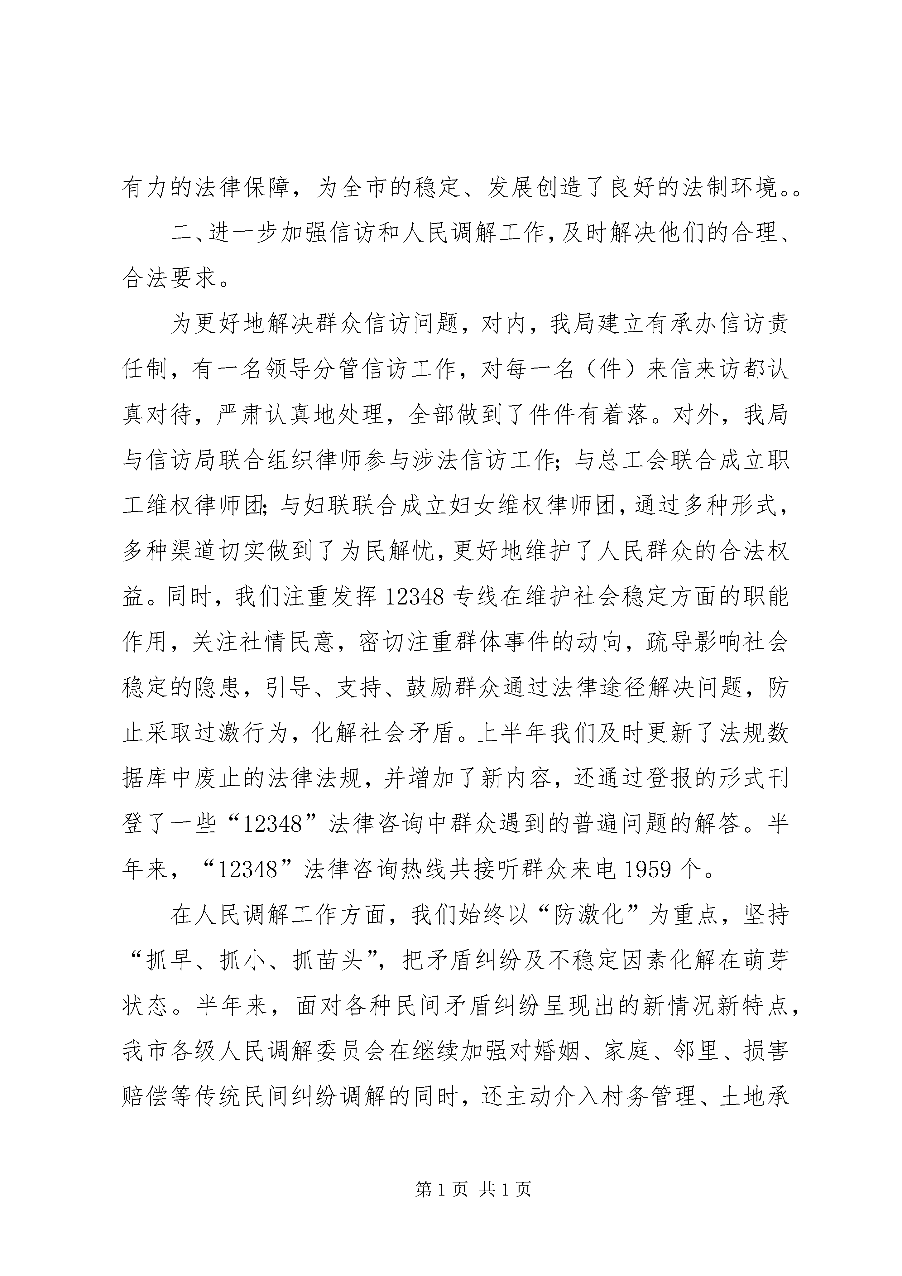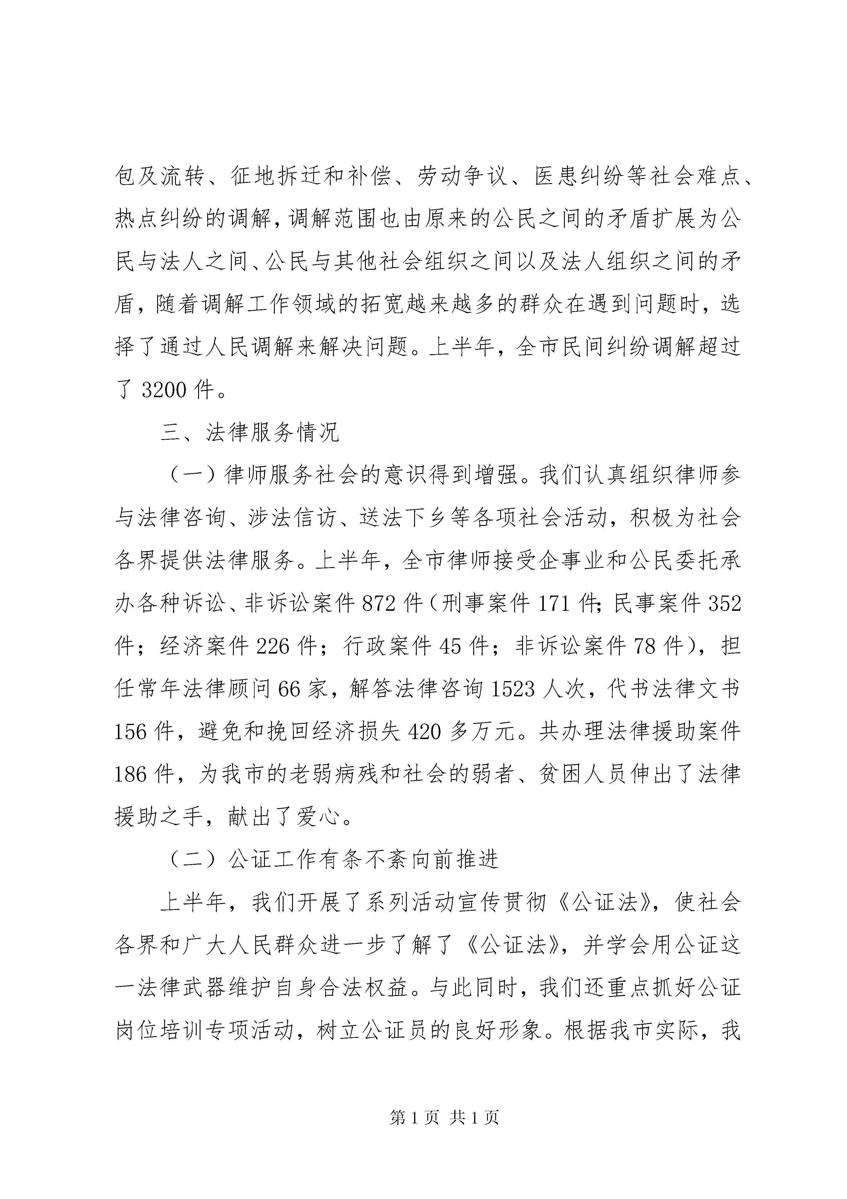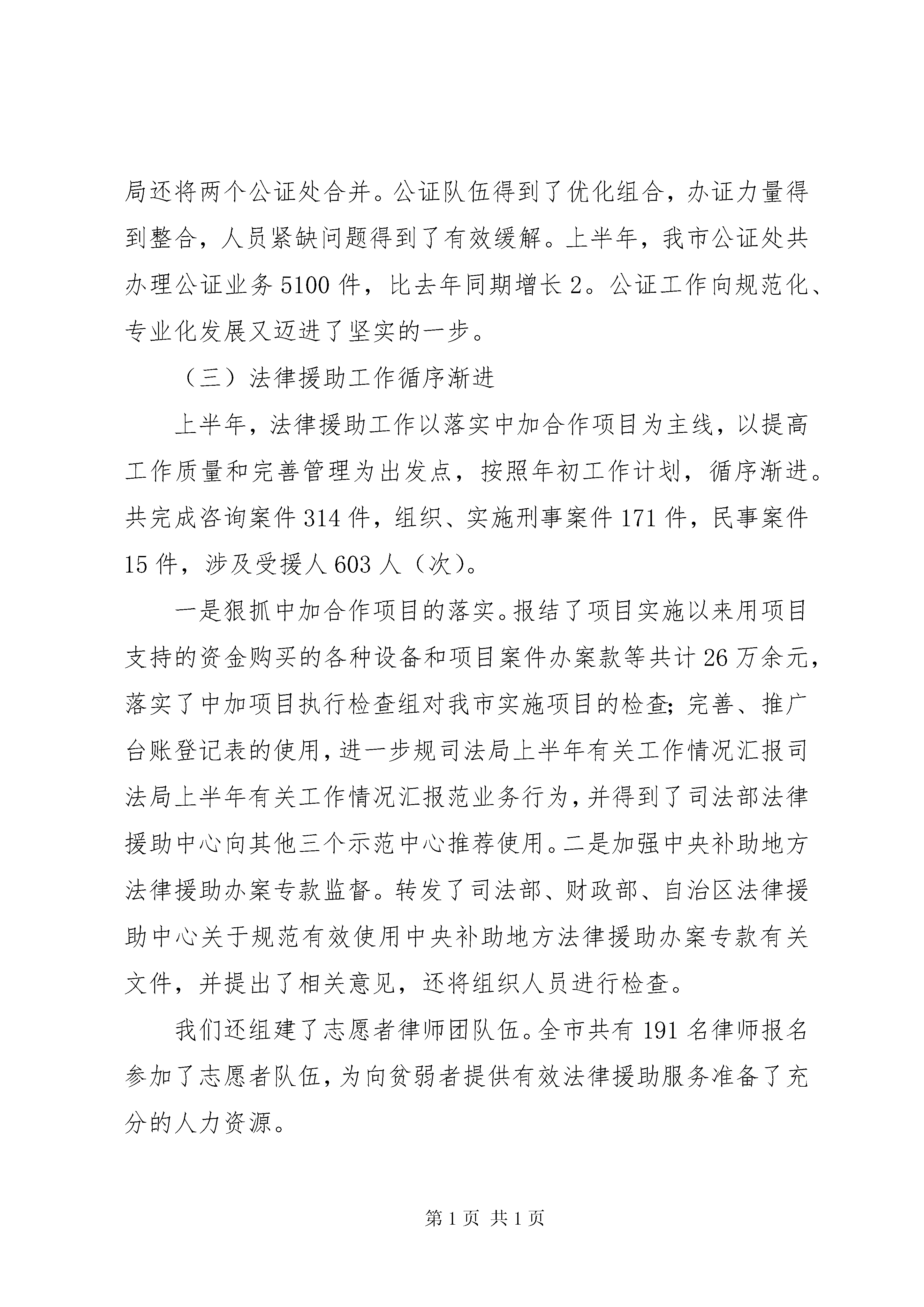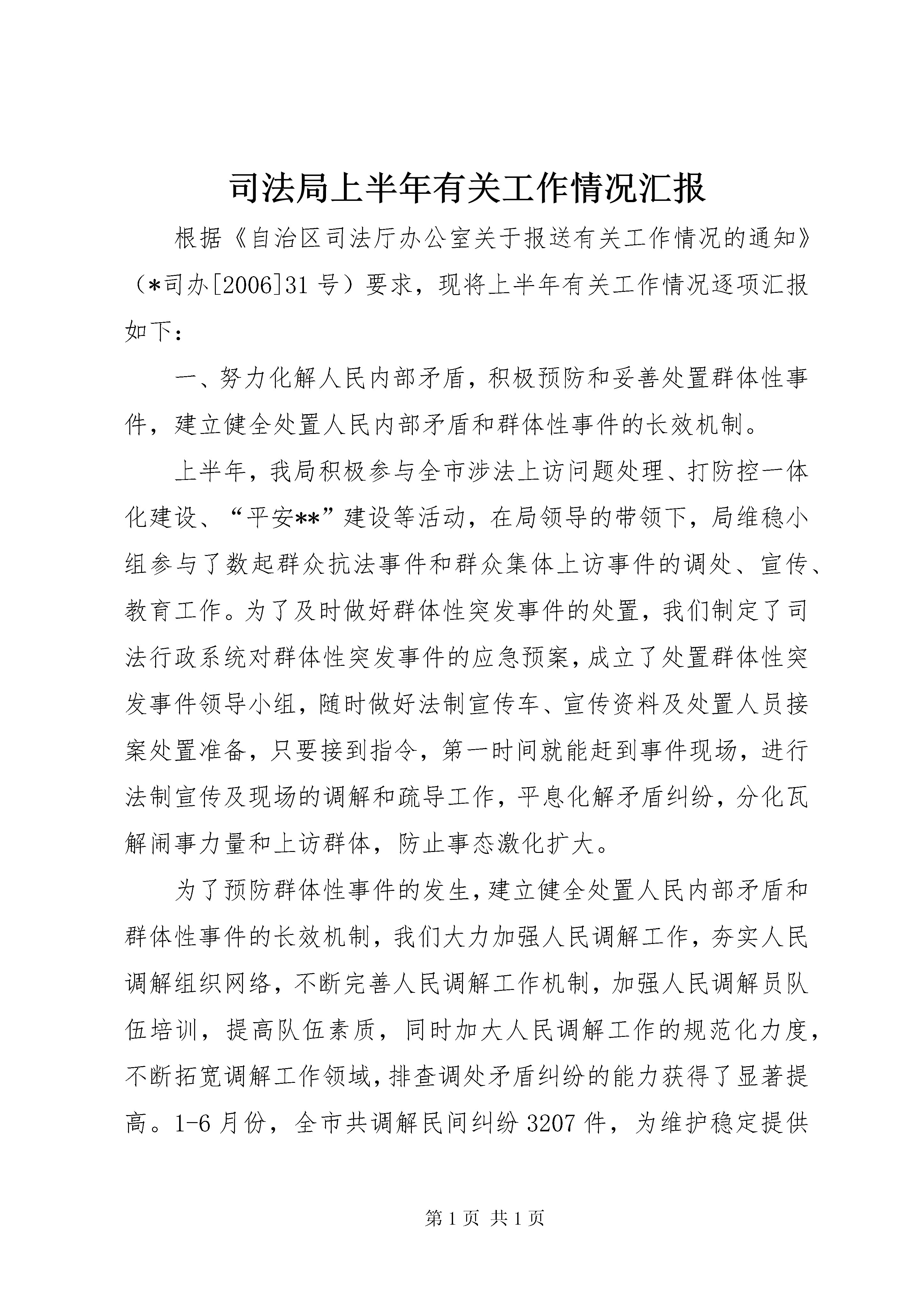 司法局上半年有关工作情况汇报根据《自治区司法厅办公室关于报送有关工作情况的通知》(*司办[2006]31号)要求,现将上半年有关工作情况逐项汇报如下:一、努力化解人民内部矛盾,积极预防和妥善处置群体性事件,建立健全处置人民内部矛盾和群体性事件的长效机制。上半年,我局积极参与全市涉法上访问题处理、打防控一体化建设、“平安**”建设等活动,在局领导的带领下,局维稳小组参与了数起群众抗法事件和群众集体上访事件的调处、宣传、教育工作。为了及时做好群体性突发事件的处置,我们制定了司法行政系统对群体性突发事件的应急预案,成立了处置群体性突发事件领导小组,随时做好法制宣传车、宣传资料及处置人员接案处置准备,只要接到指令,第一时间就能赶到事件现场,进行法制宣传及现场的调解和疏导工作,平息化解矛盾纠纷,分化瓦解闹事力量和上访群体,防止事态激化扩大。为了预防群体性事件的发生,建立健全处置人民内部矛盾和群体性事件的长效机制,我们大力加强人民调解工作,夯实人民调解组织网络,不断完善人民调解工作机制,加强人民调解员队伍培训,提高队伍素质,同时加大人民调解工作的规范化力度,不断拓宽调解工作领域,排查调处矛盾纠纷的能力获得了显著提高。1-6月份,全市共调解民间纠纷3207件,为维护稳定提供有力的法律保障,为全市的稳定、发展创造了良好的法制环境。。二、进一步加强信访和人民调解工作,及时解决他们的合理、合法要求。为更好地解决群众信访问题,对内,我局建立有承办信访责任制,有一名领导分管信访工作,对每一名(件)来信来访都认真对待,严肃认真地处理,全部做到了件件有着落。对外,我局与信访局联合组织律师参与涉法信访工作;与总工会联合成立职工维权律师团;与妇联联合成立妇女维权律师团,通过多种形式,多种渠道切实做到了为民解忧,更好地维护了人民群众的合法权益。同时,我们注重发挥12348专线在维护社会稳定方面的职能作用,关注社情民意,密切注重群体事件的动向,疏导影响社会稳定的隐患,引导、支持、鼓励群众通过法律途径解决问题,防止采取过激行为,化解社会矛盾。上半年我们及时更新了法规数据库中废止的法律法规,并增加了新内容,还通过登报的形式刊登了一些“12348”法律咨询中群众遇到的普遍问题的解答。半年来,“12348”法律咨询热线共接听群众来电1959个。在人民调解工作方面,我们始终以“防激化”为重点,坚持“抓早、抓小、抓苗头”,把矛盾纠纷及不稳定因素化解在萌芽状态。半年来,面对各种民间矛盾纠纷呈现出的新情况新特点,我市各级人民调解委员会在继续加强对婚姻、家庭、邻里、损害赔偿等传统民间纠纷调解的同时,还主动介入村务管理、土地承包及流转、征地拆迁和补偿、劳动争议、医患纠纷等社会难点、热点纠纷的调解,调解范围也由原来的公民之间的矛盾扩展为公民与法人之间、公民与其他社会组织之间以及法人组织之间的矛盾,随着调解工作领域的拓宽越来越多的群众在遇到问题时,选择了通过人民调解来解决问题。上半年,全市民间纠纷调解超过了3200件。三、法律服务情况(一)律师服务社会的意识得到增强。我们认真组织律师参与法律咨询、涉法信访、送法下乡等各项社会活动,积极为社会各界提供法律服务。上半年,全市律师接受企事业和公民委托承办各种诉讼、非诉讼案件872件(刑事案件171件;民事案件352件;经济案件226件;行政案件45件;非诉讼案件78件),担任常年法律顾问66家,解答法律咨询1523人次,代书法律文书156件,避免和挽回经济损失420多万元。共办理法律援助案件186件,为我市的老弱病残和社会的弱者、贫困人员伸出了法律援助之手,献出了爱心。(二)公证工作有条不紊向前推进上半年,我们开展了系列活动宣传贯彻《公证法》,使社会各界和广大人民群众进一步了解了《公证法》,并学会用公证这一法律武器维护自身合法权益。与此同时,我们还重点抓好公证岗位培训专项活动,树立公证员的良好形象。根据我市实际,我局还将两个公证处合并。公证队伍得到了优化组合,办证力量得到整合,人员紧缺问题得到了有效缓解。上半年,我市公证处共办理公证业务5100件,比去年同期增长2。公证工作向规范化、专业化发展又迈进了坚实的一步。(三)法律援助工作循序渐进上半年,法律援助工作以落实中加合作项目为主线,以提高工作质量和完善管理为出发点,按照年初工作计划,循序渐进。共完成咨询案件314件,组织、实施刑事案件171件,民事案件15件,涉及受援人603人(次)。一是狠抓中加合作项目的落实。报结了项目实施以来用项目支持的资金购买的各种设备和项目案件办案款等共计26万余元,落实了中加项目执行检查组对我市实施项目的检查;完善、推广台账登记表的使用,进一步规司法局上半年有关工作情况汇报司法局上半年有关工作情况汇报范业务行为,并得到了司法部法律援助中心