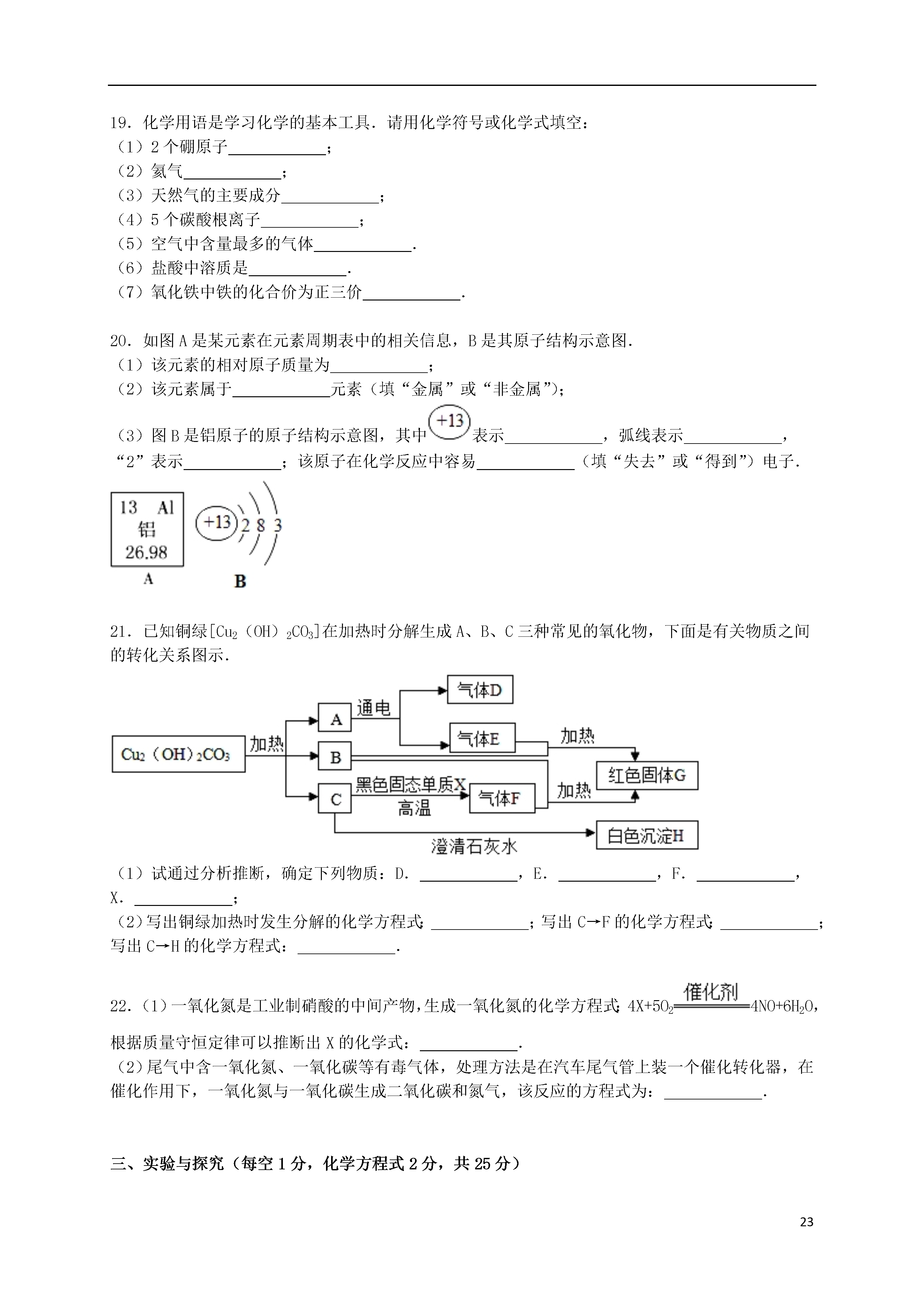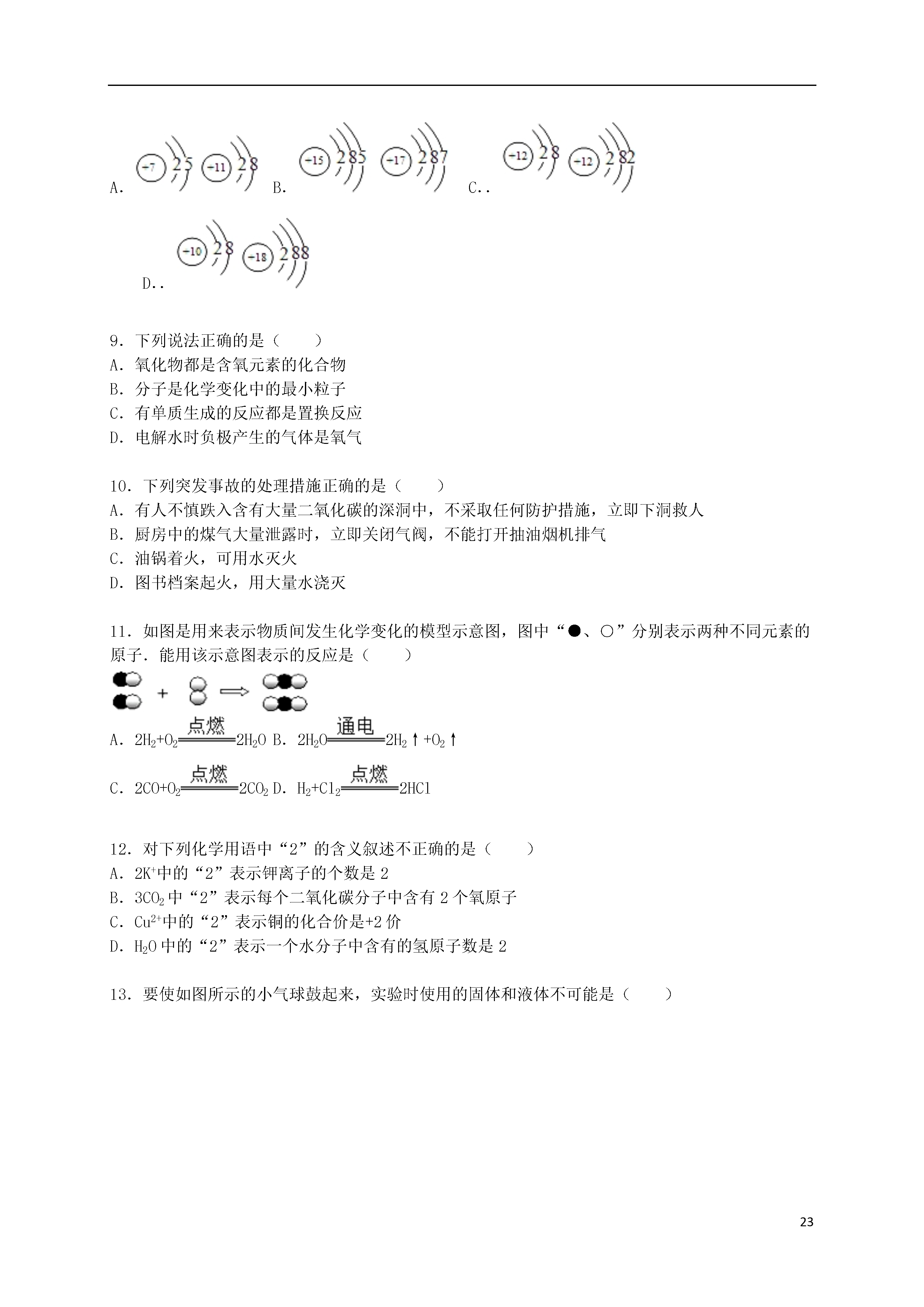 232015-2016学年云南省临沧市云县后箐中学九年级(上)期末化学模拟试卷一、选择题(每题2分,共18题,共36分)1.化学上把“生成新物质的变化叫做化学变化”,下面对化学变化中“新物质”的解释正确的是()A.“新物质”就是自然界中不存在的物质B.“新物质”就是与变化前的物质在颜色、状态等方面有所不同的物质C.“新物质”就是与变化前的物质在元素组成上不同的物质D.“新物质”就是在组成或结构上与变化前的物质不同的物质2.下列实验的基本操作中正确的是()A.用细口瓶盛放固体药品B.洗涤干净的试管倒放在试管架上C.温度计代替玻璃棒用于搅拌D.将实验剩余的药品放回原试剂瓶3.水是生命之源,也是重要的溶剂.下列有关水的说法正确的是()A.水电解生成氢气和氧气,说明水中含有氢分子和氧分子B.用肥皂水不可以区分硬水和软水C.将黄河水经沉降、过滤、吸附,灭菌等净化操作后,可供人们生活用水D.水体有一定的自净功能,部分工业污水可直接排放4.形成化学观念是化学学习的任务之.下列说法中错误的是()A.分子、原子、离子都是构成物质的微粒B.物质在水中的溶解过程实质上是原子重新组合的过程C.化学变化的过程实质上是原子重新组合的过程D.水的三态变化中,分子的能量、运动速率不变5.下列物质的分类中,后者包括前者的是()A.单质化合物B.纯净物混合物C.化合物纯净物D.纯净物单质6.如图表示封闭在某容器中的少量液态水的微观示意图(该容器的活塞可以左右移动).煮沸后,液态水变成水蒸气.在这一过程中,发生的变化是()A.水分子本身变大B.水分子之间的间隔变大C.水分子的数目增多D.水分子受热都跑到容器的一端7.加油站必须粘贴的标志是()A.当心爆炸B.严禁烟火C.节能标志D.绿色食品8.以下是几种粒子的结构示意图,属于同种元素的是()A.B.C..D..9.下列说法正确的是()A.氧化物都是含氧元素的化合物B.分子是化学变化中的最小粒子C.有单质生成的反应都是置换反应D.电解水时负极产生的气体是氧气10.下列突发事故的处理措施正确的是()A.有人不慎跌入含有大量二氧化碳的深洞中,不采取任何防护措施,立即下洞救人B.厨房中的煤气大量泄露时,立即关闭气阀,不能打开抽油烟机排气C.油锅着火,可用水灭火D.图书档案起火,用大量水浇灭11.如图是用来表示物质间发生化学变化的模型示意图,图中“●、○”分别表示两种不同元素的原子.能用该示意图表示的反应是()A.2H2+O22H2OB.2H2O2H2↑+O2↑C.2CO+O22CO2D.H2+Cl22HCl12.对下列化学用语中“2”的含义叙述不正确的是()A.2K+中的“2”表示钾离子的个数是2B.3CO2中“2”表示每个二氧化碳分子中含有2个氧原子C.Cu2+中的“2”表示铜的化合价是+2价D.H2O中的“2”表示一个水分子中含有的氢原子数是213.要使如图所示的小气球鼓起来,实验时使用的固体和液体不可能是()A.氯化钠和水B.过氧化氢和二氧化锰C.锌粒和稀硫酸D.碳酸钙和稀盐酸14.某物质经分析只含有一种元素.该物质在分类中不可能是()A.混合物B.纯净物C.化合物D.单质15.分子模型可以直观的表示分子的微观结构(分子模型中,不同颜色、大小的小球代表不同的原子).如图所示的分子模型表示的分子是()A.HCHOB.CO2C.NH3D.CH416.含磷洗涤剂因含三聚磷酸钠(化学式Na5P3OX),大量使用会造成水体污染.已知三聚磷酸钠中磷元素化合价为+5价,则X值为()A.10B.9C.7D.517.利用下列方法制备和收集气体①用石灰石和稀盐酸制取二氧化碳;②用锌和稀硫酸制取氢气;③用过氧化氢的水溶液和二氧化锰制取氧气;④加热高锰酸钾制取氧气.可以采用图所示装置的是()A.①②③B.①②③④C.②③D.①③18.已知2A+3B=C+3D,用足量的A和49gB恰好完全反应,其生成57gC和1gD,若B的相对分子质量为98,则A的相对分子质量为()A.16B.27C.44D.56二、填空题(每空1分,化学方程式2分,共27分)19.化学用语是学习化学的基本工具.请用化学符号或化学式填空:(1)2个硼原子;(2)氦气;(3)天然气的主要成分;(4)5个碳酸根离子;(5)空气中含量最多的气体.(6)盐酸中溶质是.(7)氧化铁中铁的化合价为正三价.20.如图A是某元素在元素周期表中的相关信息,B是其原子结构示意图.(1)该元素的相对原子质量为;(2)该元素属于元素(填“金属”或“非金属”);