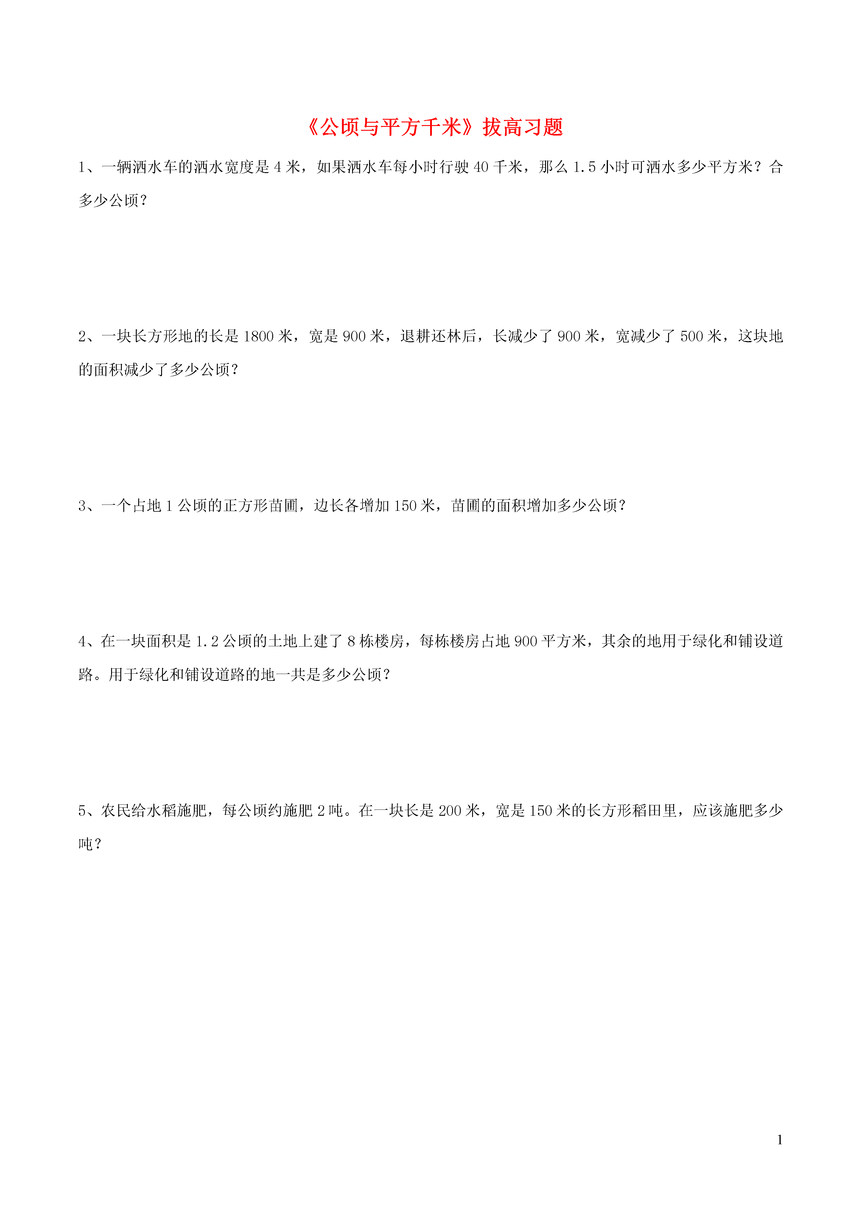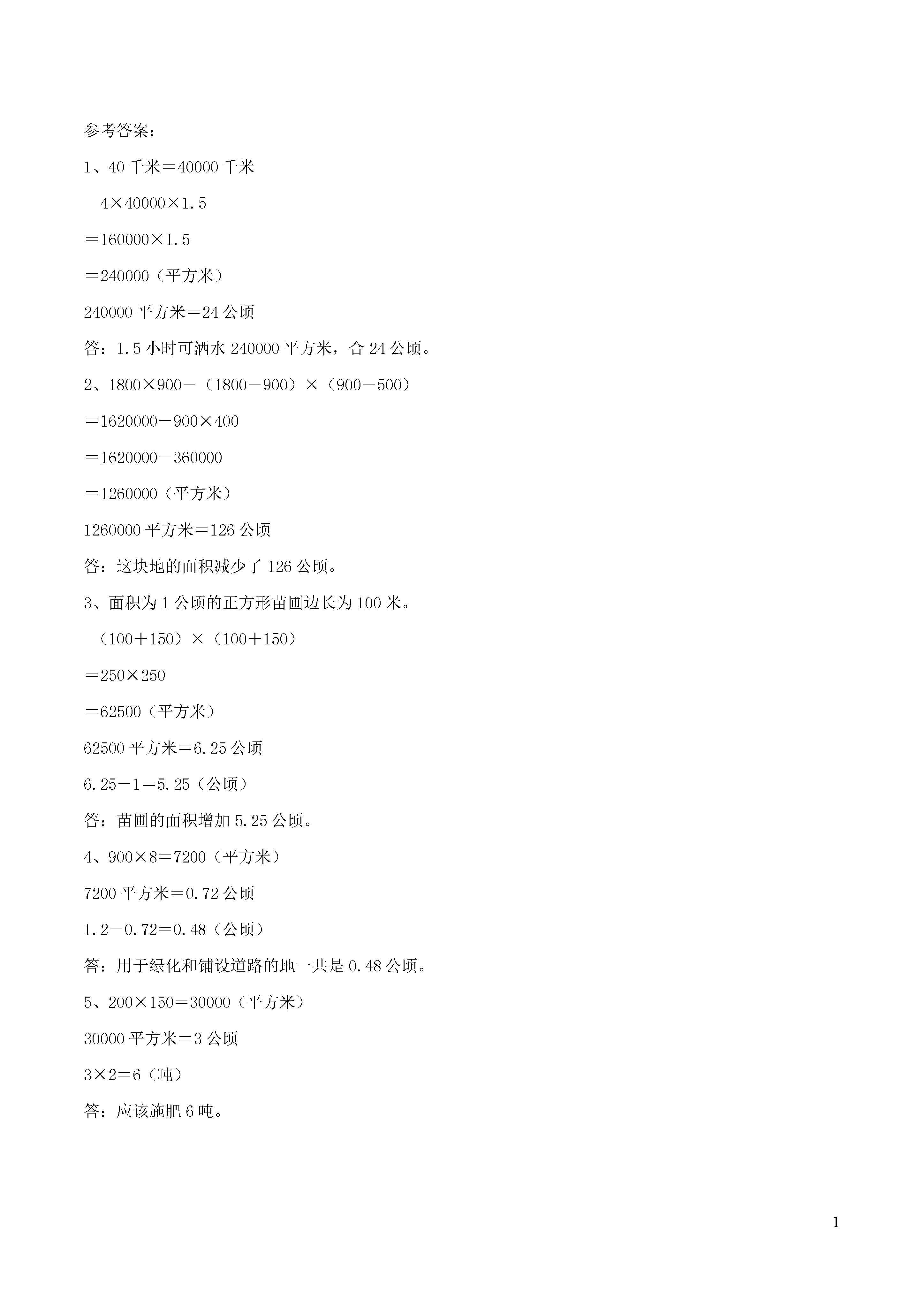 1《公顷与平方千米》拔高习题1、一辆洒水车的洒水宽度是4米,如果洒水车每小时行驶40千米,那么1.5小时可洒水多少平方米?合多少公顷?2、一块长方形地的长是1800米,宽是900米,退耕还林后,长减少了900米,宽减少了500米,这块地的面积减少了多少公顷?3、一个占地1公顷的正方形苗圃,边长各增加150米,苗圃的面积增加多少公顷?4、在一块面积是1.2公顷的土地上建了8栋楼房,每栋楼房占地900平方米,其余的地用于绿化和铺设道路。用于绿化和铺设道路的地一共是多少公顷?5、农民给水稻施肥,每公顷约施肥2吨。在一块长是200米,宽是150米的长方形稻田里,应该施肥多少吨?参考答案:1、40千米=40000千米4×40000×1.5=160000×1.5=240000(平方米)240000平方米=24公顷答:1.5小时可洒水240000平方米,合24公顷。2、1800×900-(1800-900)×(900-500)=1620000-900×400=1620000-360000=1260000(平方米)1260000平方米=126公顷答:这块地的面积减少了126公顷。3、面积为1公顷的正方形苗圃边长为100米。(100+150)×(100+150)=250×250=62500(平方米)62500平方米=6.25公顷6.25-1=5.25(公顷)答:苗圃的面积增加5.25公顷。4、900×8=7200(平方米)7200平方米=0.72公顷1.2-0.72=0.48(公顷)答:用于绿化和铺设道路的地一共是0.48公顷。5、200×150=30000(平方米)30000平方米=3公顷3×2=6(吨)答:应该施肥6吨。