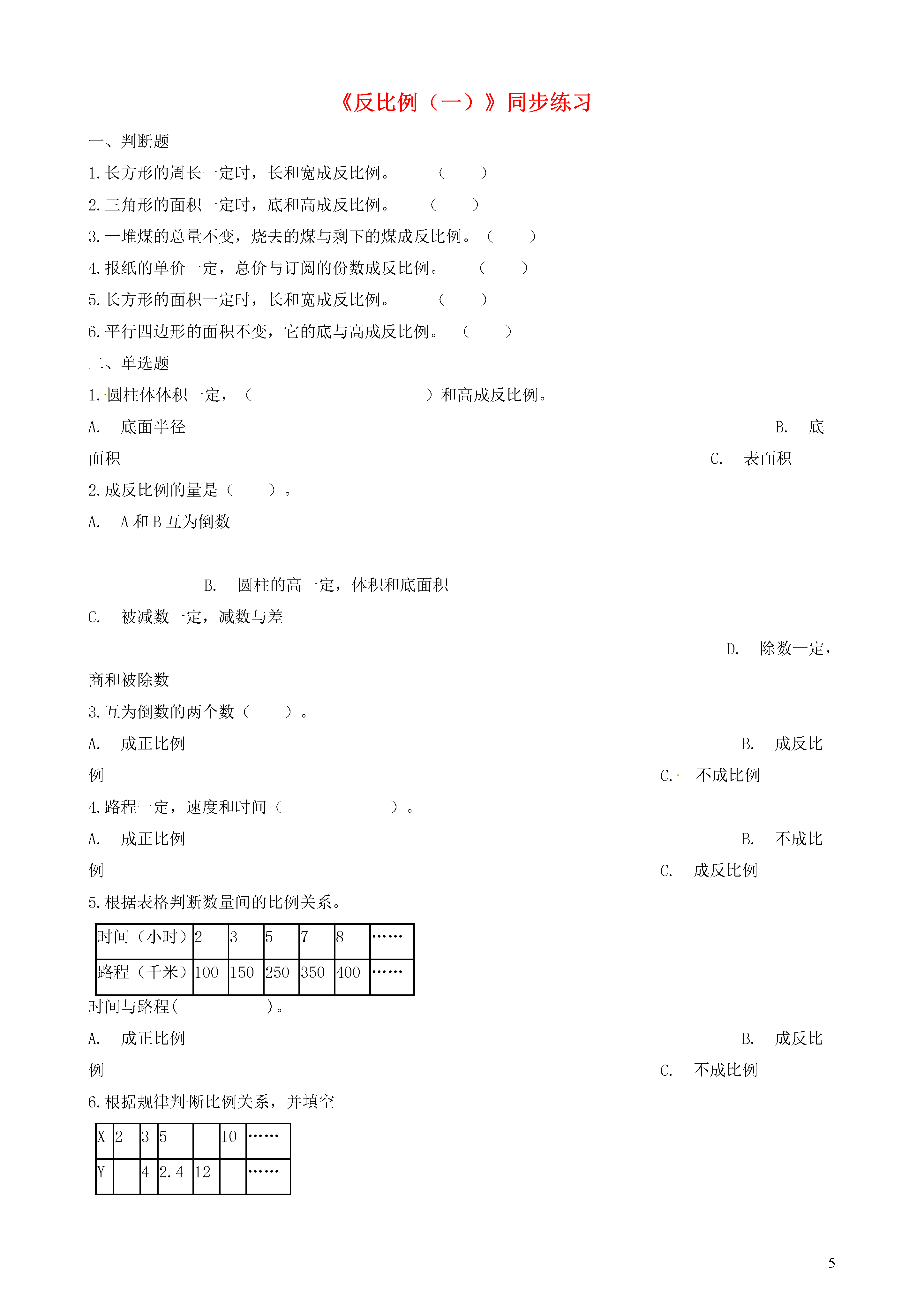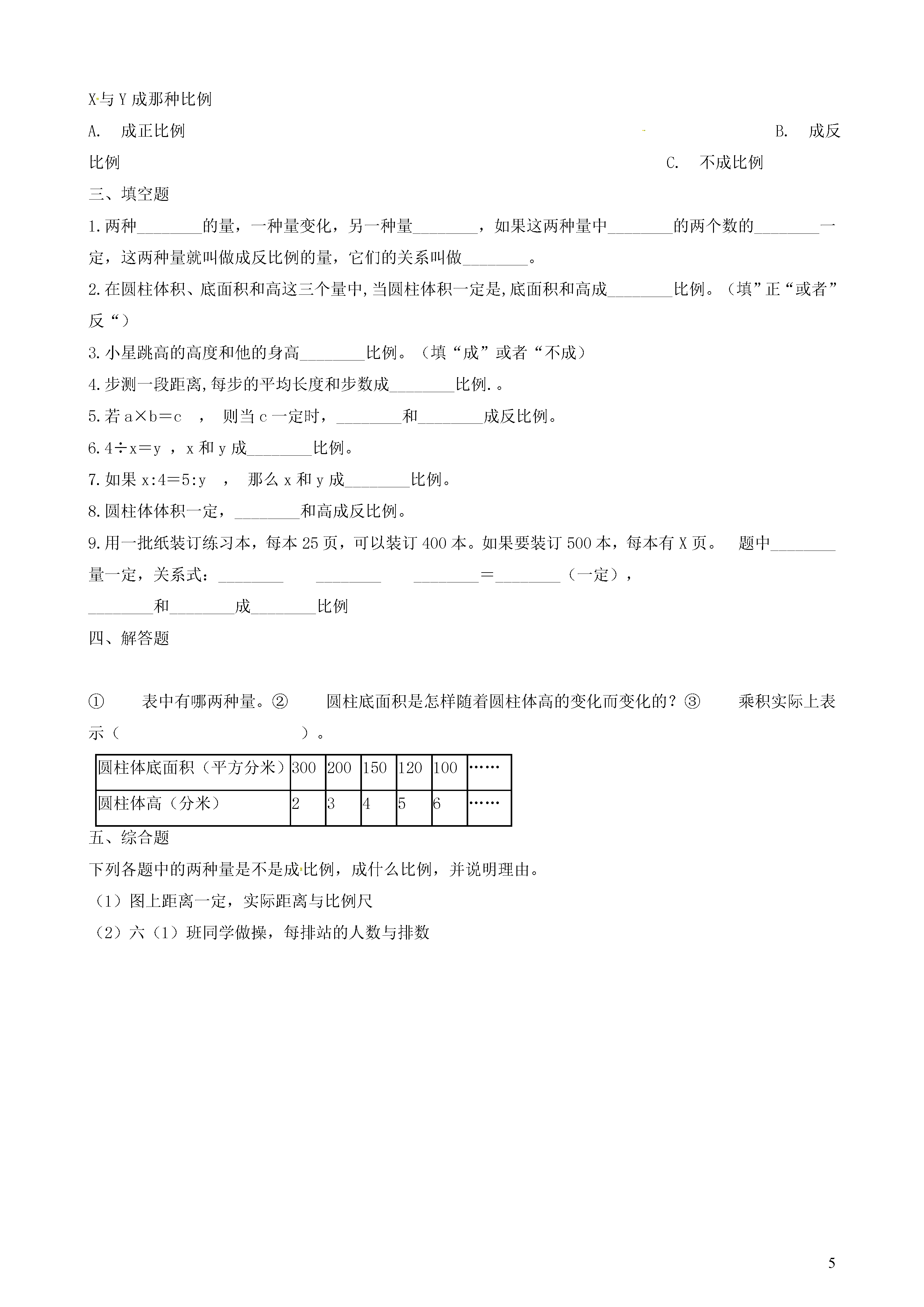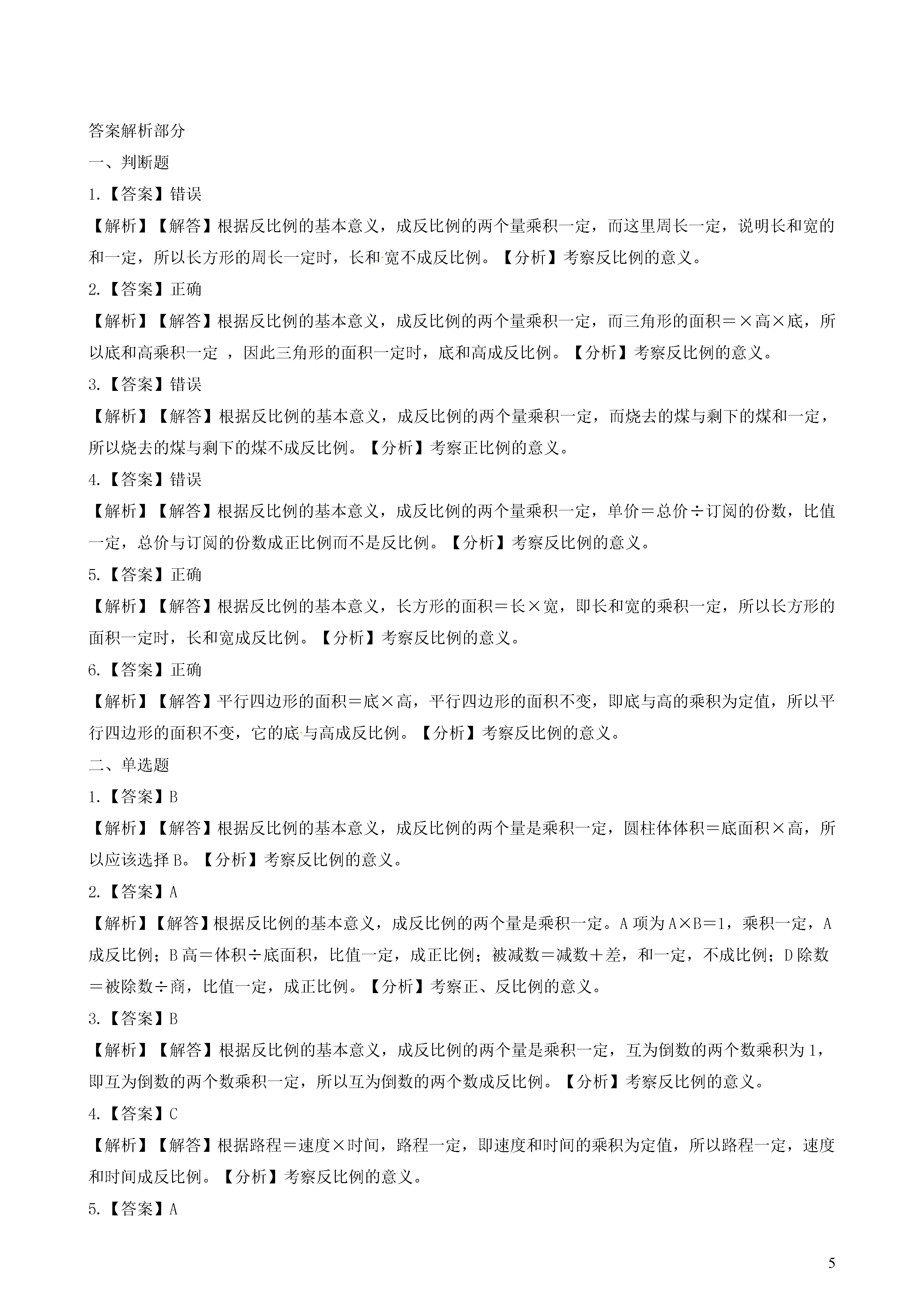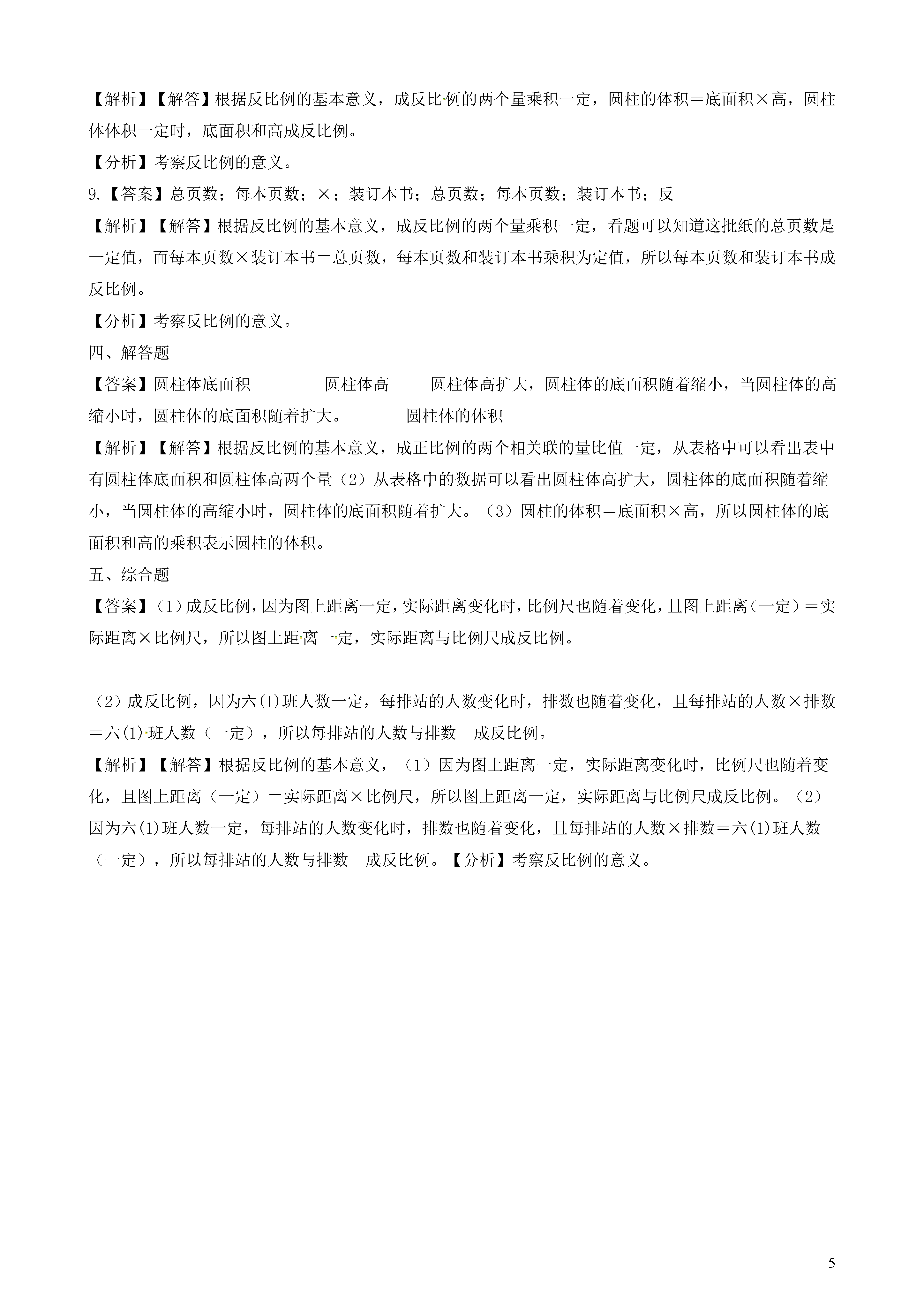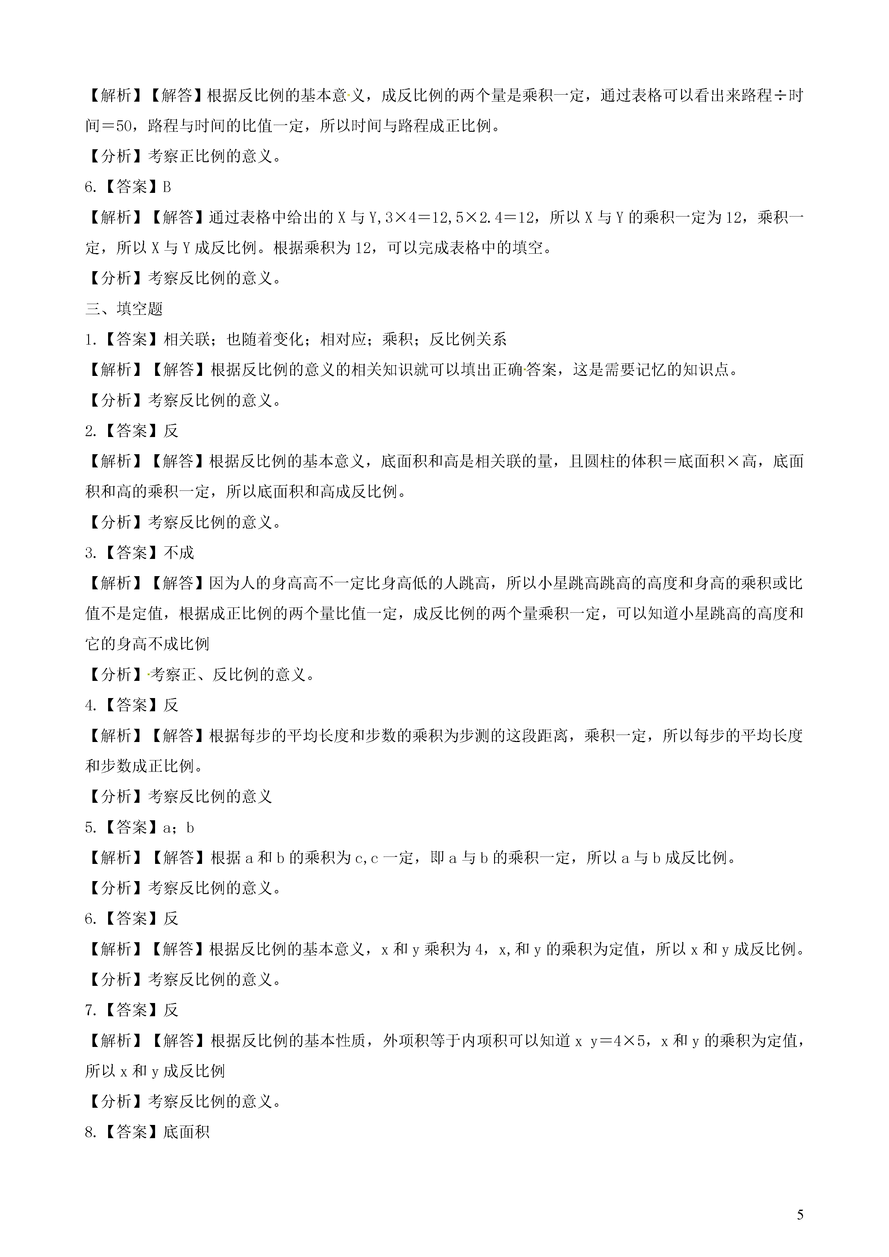 5《反比例(一)》同步练习一、判断题1.长方形的周长一定时,长和宽成反比例。()2.三角形的面积一定时,底和高成反比例。()3.一堆煤的总量不变,烧去的煤与剩下的煤成反比例。()4.报纸的单价一定,总价与订阅的份数成反比例。()5.长方形的面积一定时,长和宽成反比例。()6.平行四边形的面积不变,它的底与高成反比例。()二、单选题1.圆柱体体积一定,()和高成反比例。A.底面半径B.底面积C.表面积2.成反比例的量是()。A.A和B互为倒数B.圆柱的高一定,体积和底面积C.被减数一定,减数与差D.除数一定,商和被除数3.互为倒数的两个数()。A.成正比例B.成反比例C.不成比例4.路程一定,速度和时间()。A.成正比例B.不成比例C.成反比例5.根据表格判断数量间的比例关系。时间(小时)23578……路程(千米)100150250350400……时间与路程()。A.成正比例B.成反比例C.不成比例6.根据规律判断比例关系,并填空X23510……Y42.412……X与Y成那种比例A.成正比例B.成反比例C.不成比例三、填空题1.两种________的量,一种量变化,另一种量________,如果这两种量中________的两个数的________一定,这两种量就叫做成反比例的量,它们的关系叫做________。2.在圆柱体积、底面积和高这三个量中,当圆柱体积一定是,底面积和高成________比例。(填”正“或者”反“)3.小星跳高的高度和他的身高________比例。(填“成”或者“不成)4.步测一段距离,每步的平均长度和步数成________比例.。5.若a×b=c,则当c一定时,________和________成反比例。6.4÷x=y,x和y成________比例。7.如果x:4=5:y,那么x和y成________比例。8.圆柱体体积一定,________和高成反比例。9.用一批纸装订练习本,每本25页,可以装订400本。如果要装订500本,每本有X页。题中________量一定,关系式:________________________=________(一定),________和________成________比例四、解答题①表中有哪两种量。②圆柱底面积是怎样随着圆柱体高的变化而变化的?③乘积实际上表示()。圆柱体底面积(平方分米)300200150120100……圆柱体高(分米)23456……五、综合题下列各题中的两种量是不是成比例,成什么比例,并说明理由。(1)图上距离一定,实际距离与比例尺(2)六(1)班同学做操,每排站的人数与排数答案解析部分一、判断题1.【答案】错误【解析】【解答】根据反比例的基本意义,成反比例的两个量乘积一定,而这里周长一定,说明长和宽的和一定,所以长方形的周长一定时,长和宽不成反比例。【分析】考察反比例的意义。2.【答案】正确【解析】【解答】根据反比例的基本意义,成反比例的两个量乘积一定,而三角形的面积=×高×底,所以底和高乘积一定,因此三角形的面积一定时,底和高成反比例。【分析】考察反比例的意义。3.【答案】错误【解析】【解答】根据反比例的基本意义,成反比例的两个量乘积一定,而烧去的煤与剩下的煤和一定,所以烧去的煤与剩下的煤不成反比例。【分析】考察正比例的意义。4.【答案】错误【解析】【解答】根据反比例的基本意义,成反比例的两个量乘积一定,单价=总价÷订阅的份数,比值一定,总价与订阅的份数成