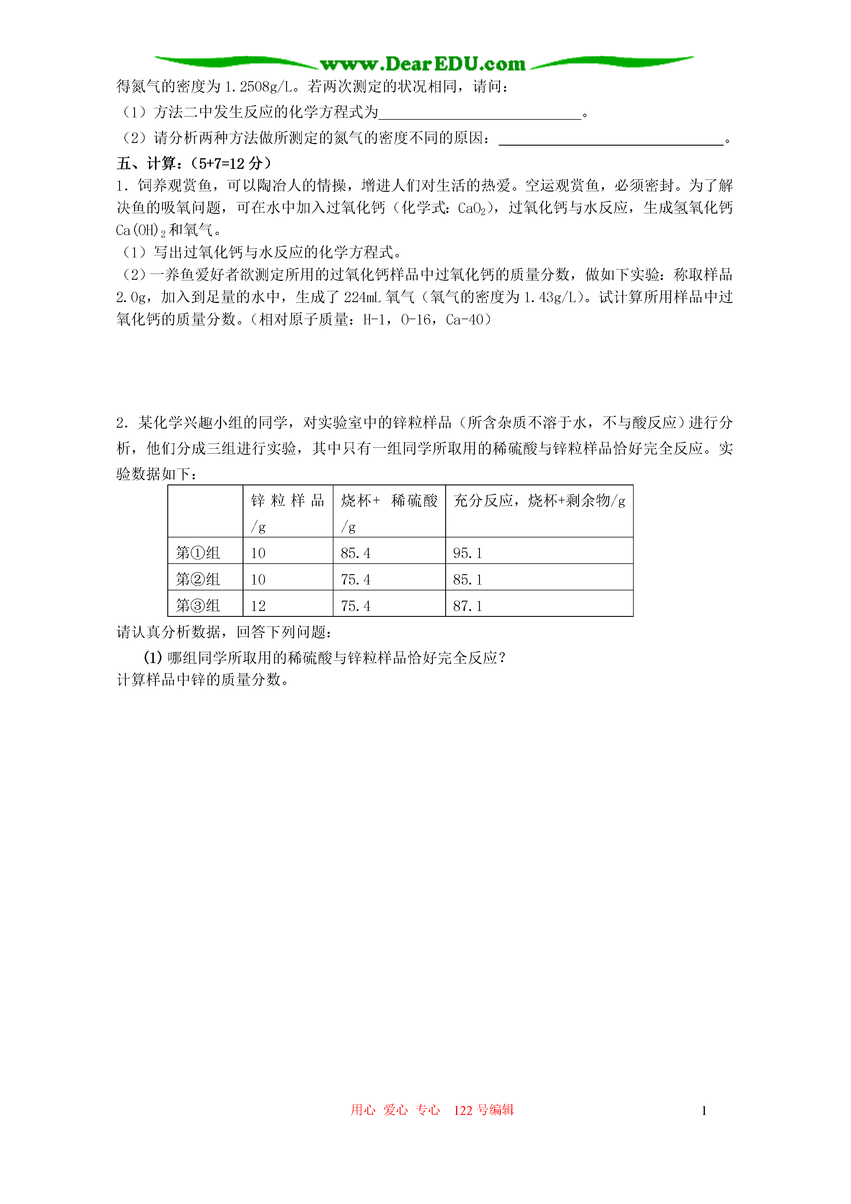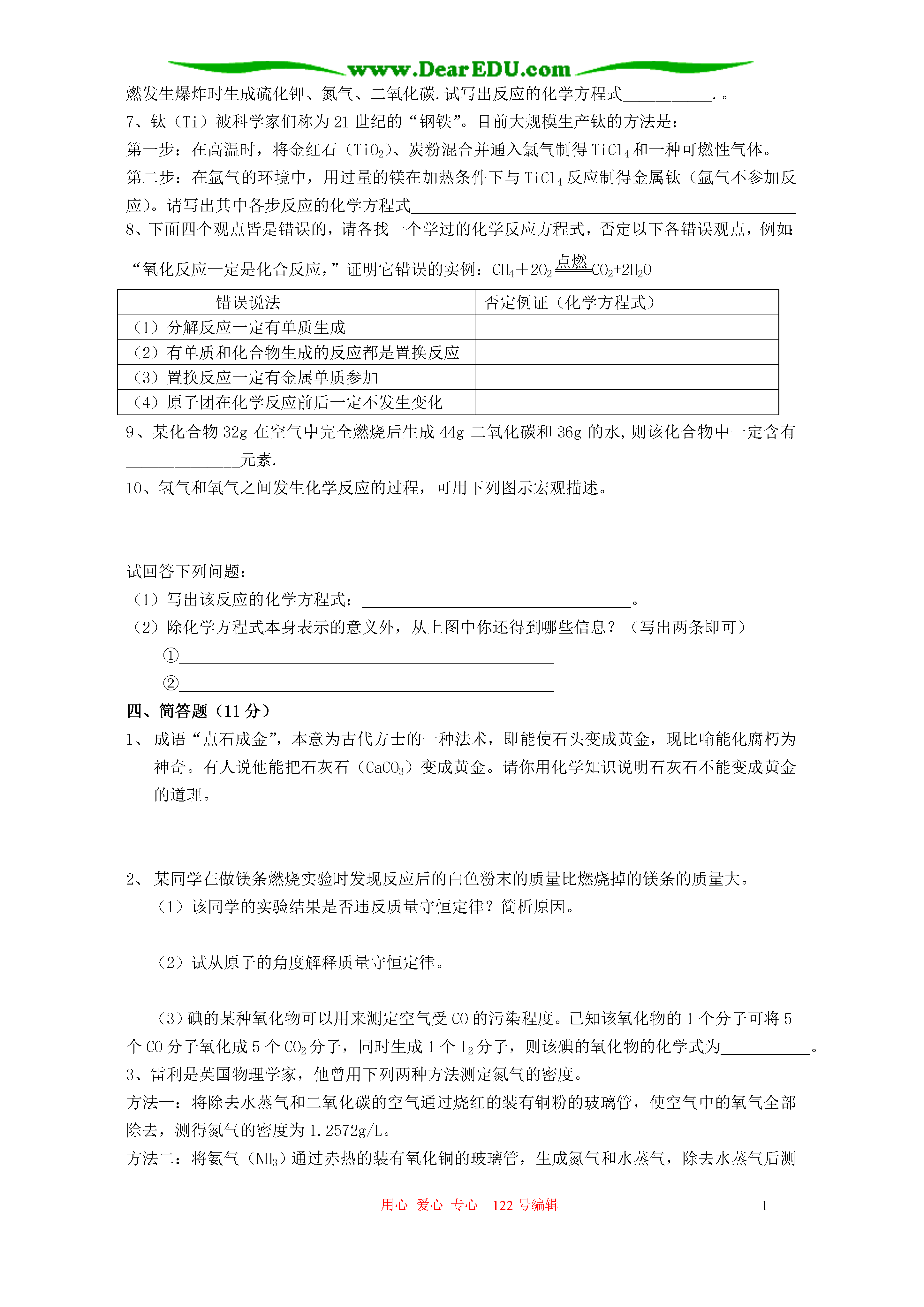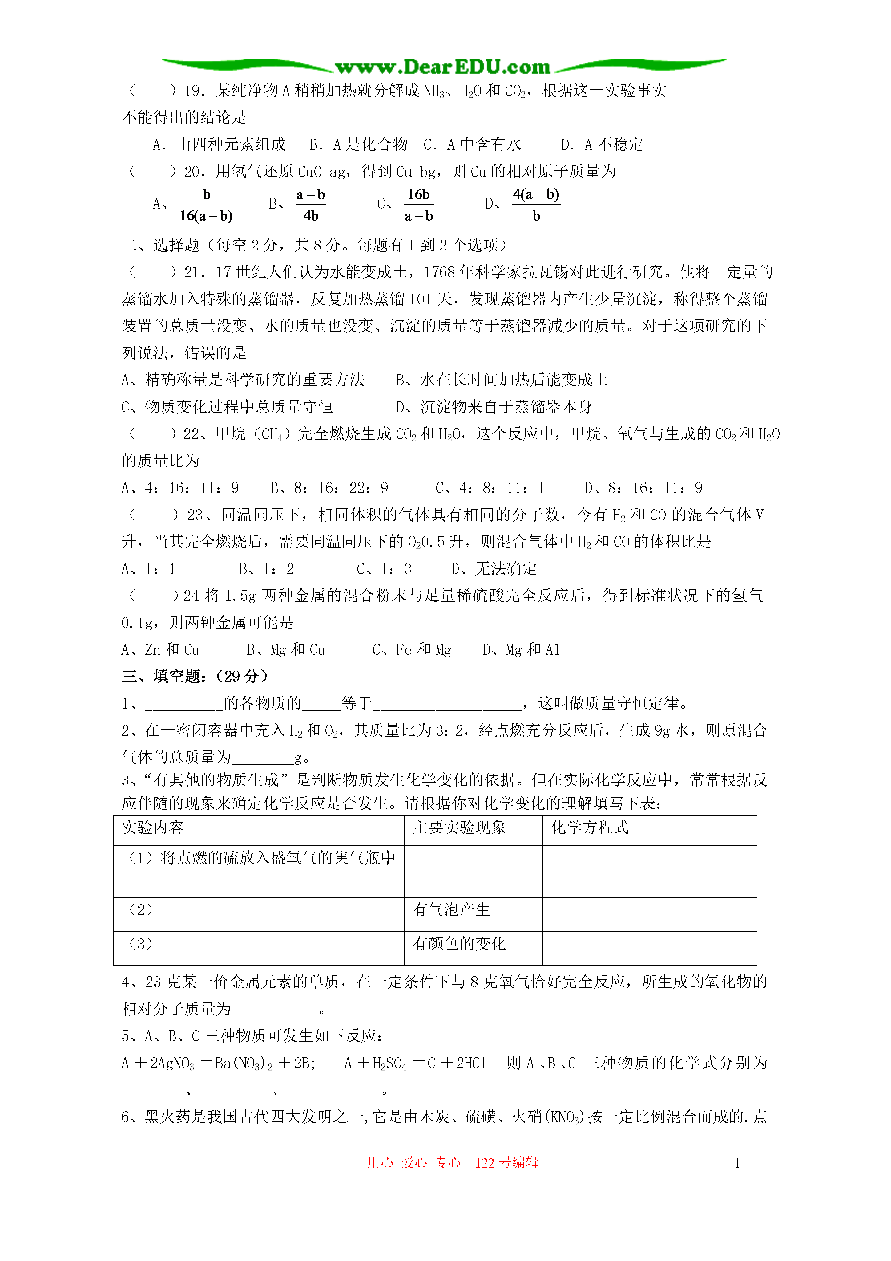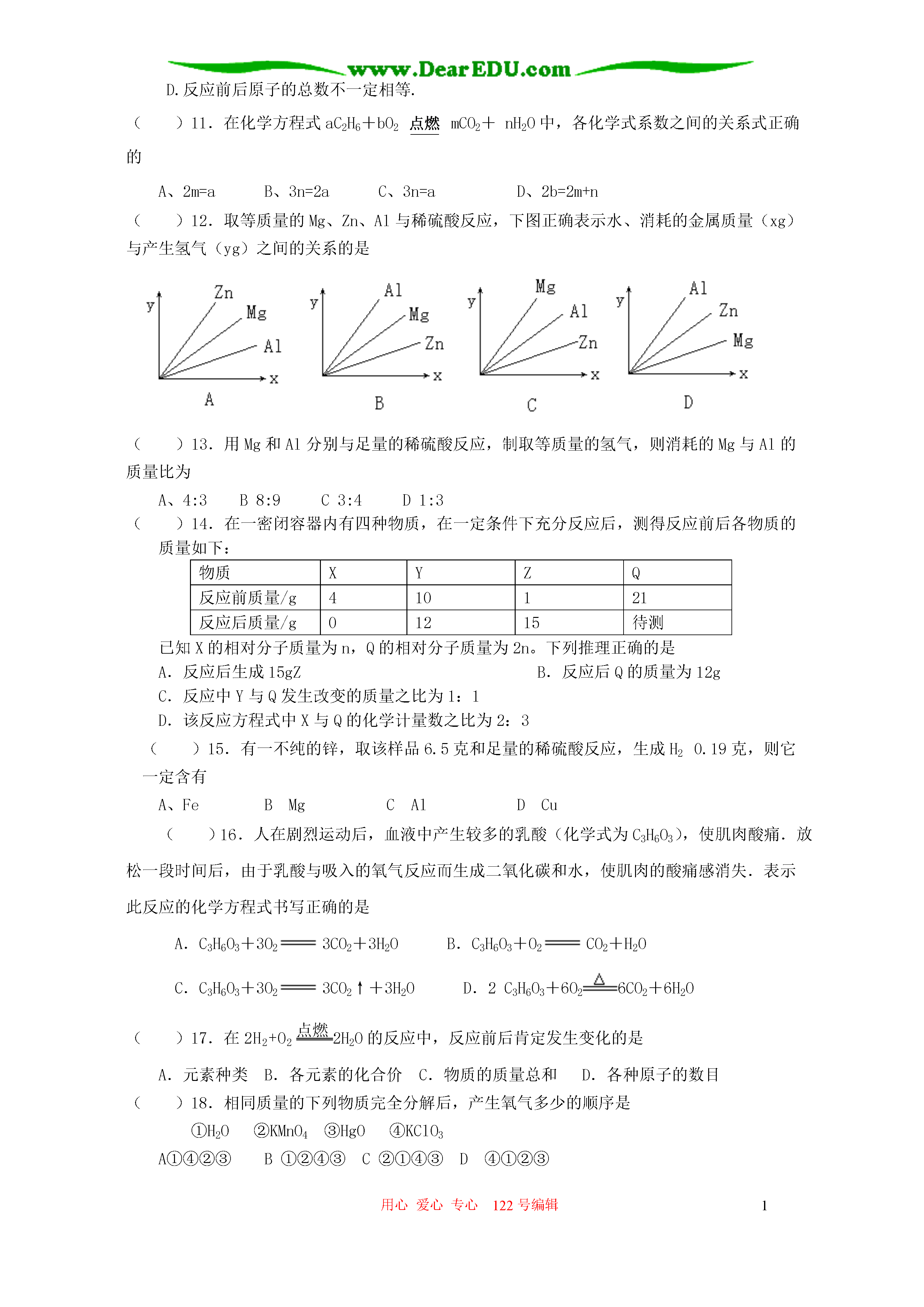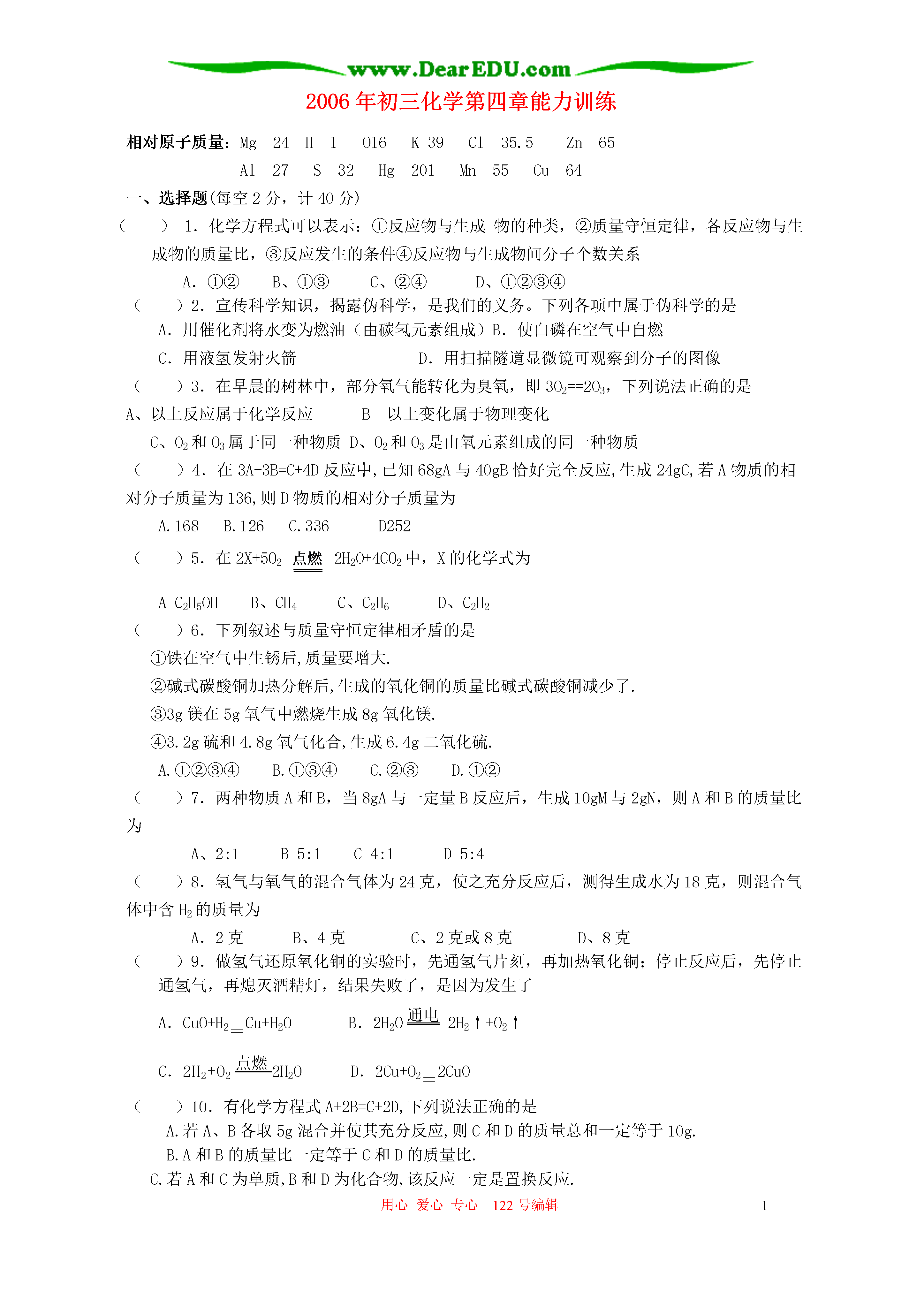 用心爱心专心122号编辑12006年初三化学第四章能力训练相对原子质量:Mg24H1O16K39Cl35.5Zn65Al27S32Hg201Mn55Cu64一、选择题(每空2分,计40分)()1.化学方程式可以表示:①反应物与生成物的种类,②质量守恒定律,各反应物与生成物的质量比,③反应发生的条件④反应物与生成物间分子个数关系A.①②B、①③C、②④D、①②③④()2.宣传科学知识,揭露伪科学,是我们的义务。下列各项中属于伪科学的是A.用催化剂将水变为燃油(由碳氢元素组成)B.使白磷在空气中自燃C.用液氢发射火箭D.用扫描隧道显微镜可观察到分子的图像()3.在早晨的树林中,部分氧气能转化为臭氧,即3O2==2O3,下列说法正确的是A、以上反应属于化学反应B以上变化属于物理变化C、O2和O3属于同一种物质D、O2和O3是由氧元素组成的同一种物质()4.在3A+3B=C+4D反应中,已知68gA与40gB恰好完全反应,生成24gC,若A物质的相对分子质量为136,则D物质的相对分子质量为A.168B.126C.336D252()5.在2X+5O22H2O+4CO2中,X的化学式为AC2H5OHB、CH4C、C2H6D、C2H2()6.下列叙述与质量守恒定律相矛盾的是①铁在空气中生锈后,质量要增大.②碱式碳酸铜加热分解后,生成的氧化铜的质量比碱式碳酸铜减少了.③3g镁在5g氧气中燃烧生成8g氧化镁.④3.2g硫和4.8g氧气化合,生成6.4g二氧化硫.A.①②③④B.①③④C.②③D.①②()7.两种物质A和B,当8gA与一定量B反应后,生成10gM与2gN,则A和B的质量比为A、2:1B5:1C4:1D5:4()8.氢气与氧气的混合气体为24克,使之充分反应后,测得生成水为18克,则混合气体中含H2的质量为A.2克B、4克C、2克或8克D、8克()9.做氢气还原氧化铜的实验时,先通氢气片刻,再加热氧化铜;停止反应后,先停止通氢气,再熄灭酒精灯,结果失败了,是因为发生了A.CuO+H2eq\o(\s\do-4(△),\s\do4(=))Cu+H2OB.2H2O通电2H2↑+O2↑C.2H2+O2点燃2H2OD.2Cu+O2eq\o(\s\do-4(△),\s\do4(=))2CuO()10.有化学方程式A+2B=C+2D,下列说法正确的是A.若A、B各取5g混合并使其充分反应,则C和D的质量总和一定等于10g.B.A和B的质量比一定等于C和D的质量比.C.若A和C为单质,B和D为化合物,该反应一定是置换反应.D.反应前后原子的总数不一定相等.()11.在化学方程式aC2H6+bO2mCO2+nH2O中,各化学式系数之间的关系式正确的A、2m=aB、3n=2aC、3n=aD、2b=2m+n()12.取等质量的Mg、Zn、Al与稀硫酸反应,下图正确表示水、消耗的金属质量(xg)与产生氢气(yg)之间的关系的是()13.用Mg和Al分别与足量的稀硫酸反应,制取等质量的氢气,则消耗的Mg与Al的质量比为A、4:3B8:9C3:4D1:3()14.在一密闭容器内有四种物质,在一定条件下充分反应后,测得反应前后各物质的质量如下:物质XYZQ反应前质量/g410121反应后质量/g01215待测已知X的相对分子质量为n,Q的相对分子质量为2n。下列推理正确的是A.反应后生成15gZB.反应后Q的质量为12gC.反应中Y与Q发生改变的质量之比为1:1D.该反应方程式中X与Q的化学计量数之比为2:3()15.有一不纯的锌,取该样品6.5克和足量的稀硫酸反应,生成H20.19克,则它一定含有A、FeBMgCAlDCu()16.人在剧烈运动后,血液中产生较多的乳酸(化学式为C3H6O3),使肌肉酸痛.放松一段时间后,由于乳酸与吸入的氧气反应而生成二氧化碳和水,使肌肉的酸痛感消失.表示此反应的化学方程式书写正确的是 A.C3H6O3+3O23CO2+3H2OB.C3H6O3+O2CO2+H2OC.C3H6O3+3O23CO2↑+3H2OD.2C3H6O3+6O26CO2+6H2O()17.在2H2+O2点燃2H2O的反应中,反应前后肯定发生变化的是A.元素种类B.各元素的化合价C.物质的质量总和D.各种原子的数目()18.相同质量的下列物质完全分解后,产生氧气多少的顺序是①H2O②KMnO4③HgO④KClO3A①④②③B①②④③C②①④③D④①②③()19.某纯净物A稍稍加热就分解成NH3、H2O和CO2,根据这一实验事实不能得出的结论是A.由四种元素组成B.A是化合物C.A中含有水D.A不稳定()20.用氢气还原Cu