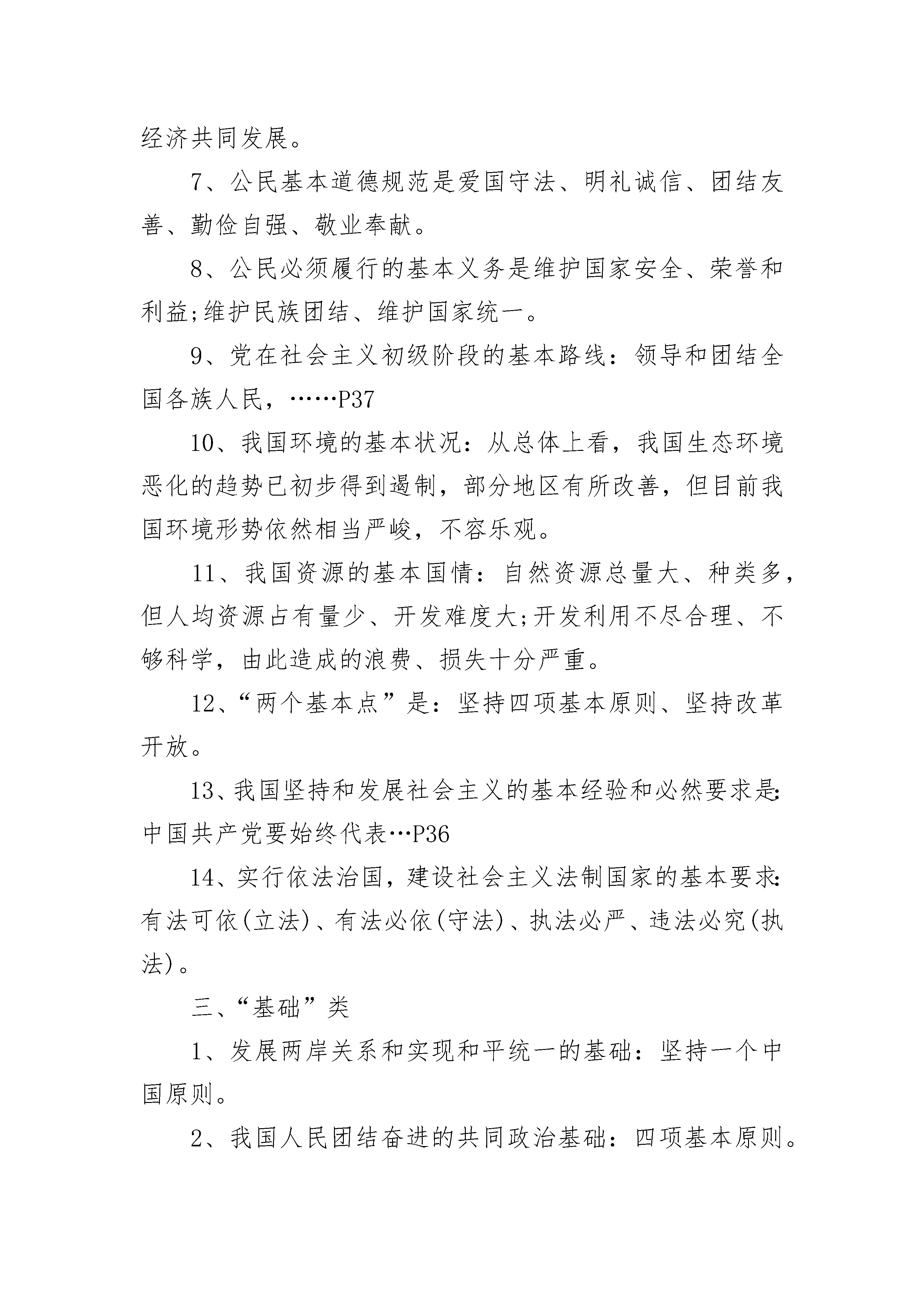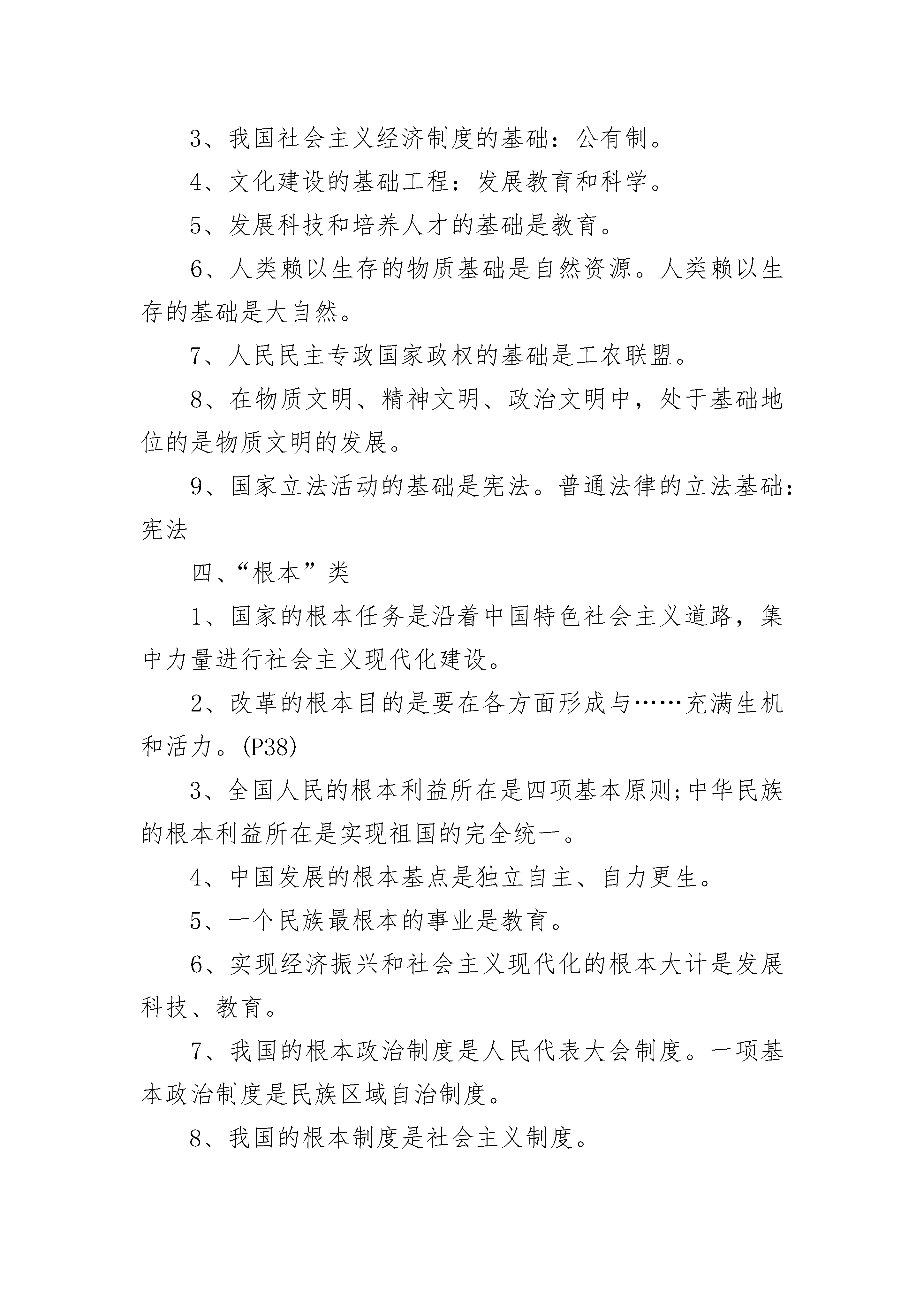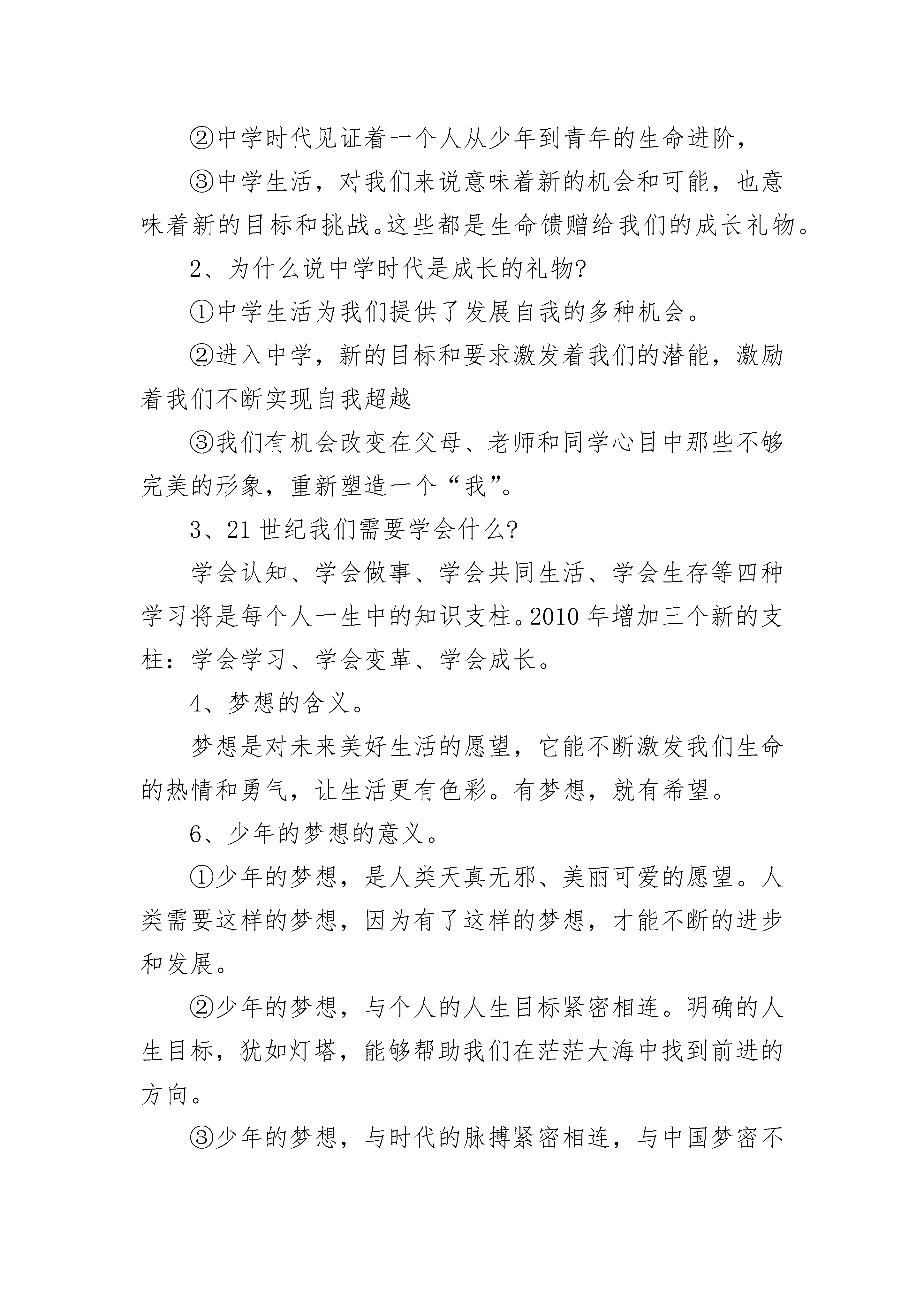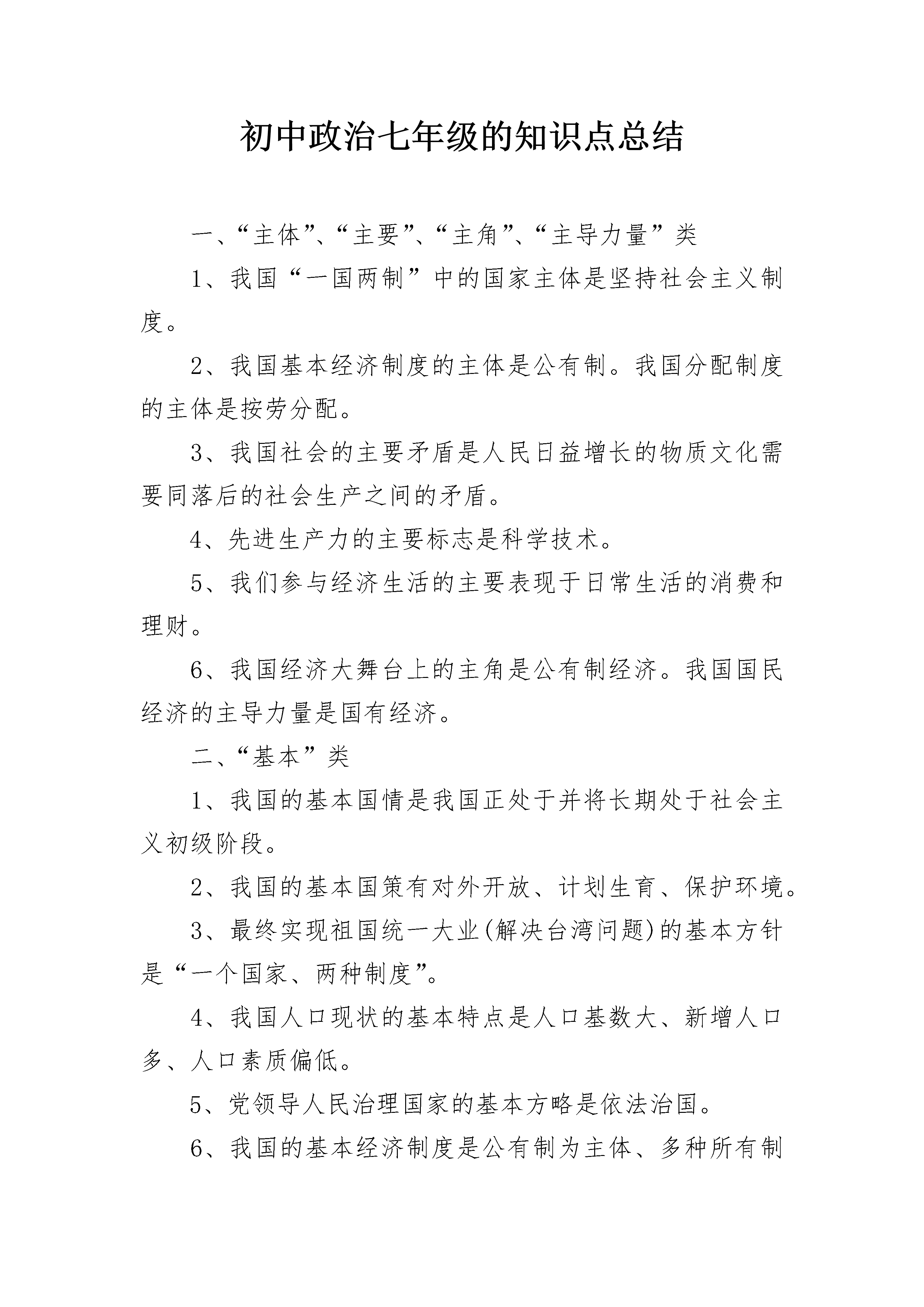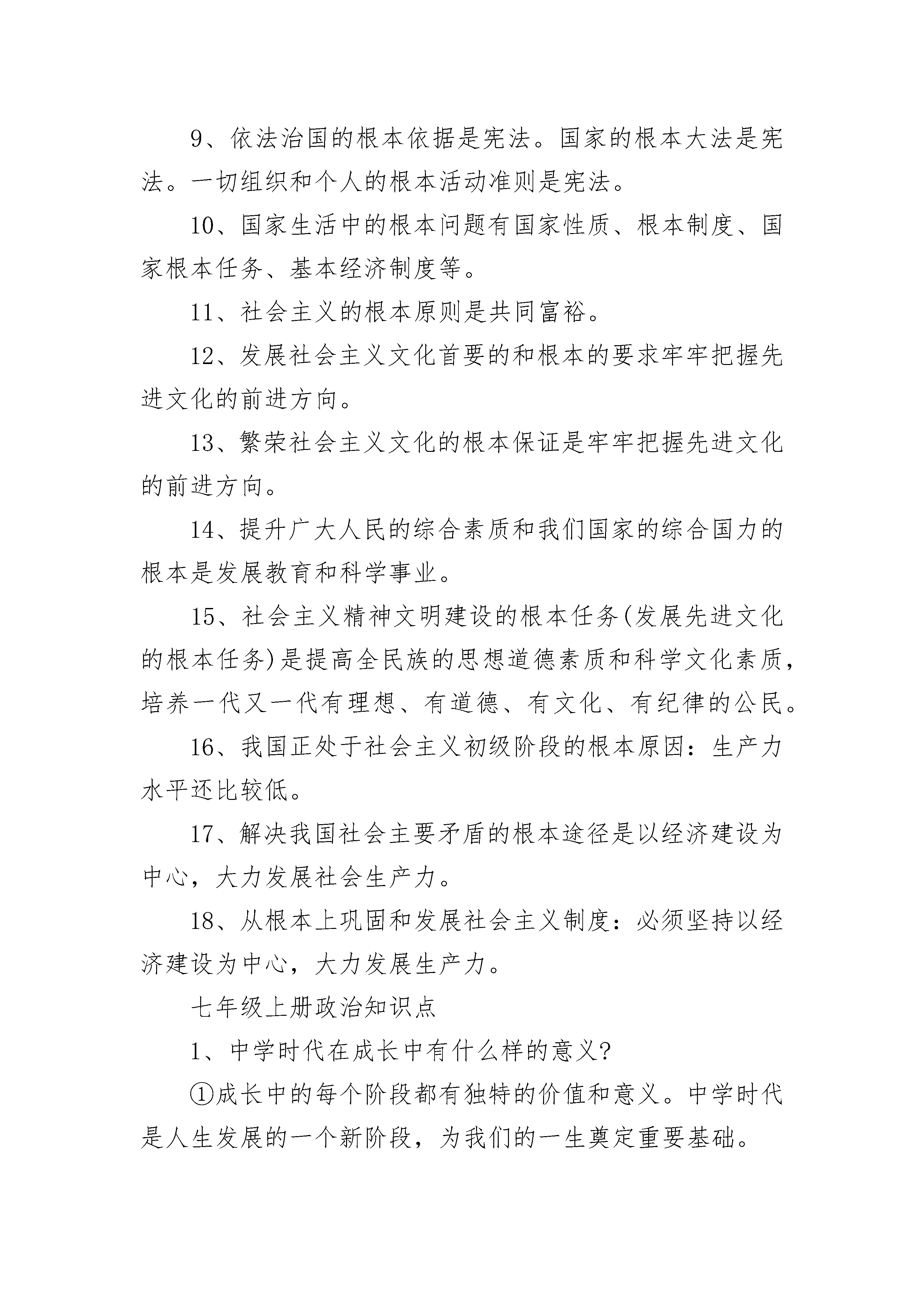 初中政治七年级的知识点总结一、“主体”、“主要”、“主角”、“主导力量”类1、我国“一国两制”中的国家主体是坚持社会主义制度。2、我国基本经济制度的主体是公有制。我国分配制度的主体是按劳分配。3、我国社会的主要矛盾是人民日益增长的物质文化需要同落后的社会生产之间的矛盾。4、先进生产力的主要标志是科学技术。5、我们参与经济生活的主要表现于日常生活的消费和理财。6、我国经济大舞台上的主角是公有制经济。我国国民经济的主导力量是国有经济。二、“基本”类1、我国的基本国情是我国正处于并将长期处于社会主义初级阶段。2、我国的基本国策有对外开放、计划生育、保护环境。3、最终实现祖国统一大业(解决台湾问题)的基本方针是“一个国家、两种制度”。4、我国人口现状的基本特点是人口基数大、新增人口多、人口素质偏低。5、党领导人民治理国家的基本方略是依法治国。6、我国的基本经济制度是公有制为主体、多种所有制经济共同发展。7、公民基本道德规范是爱国守法、明礼诚信、团结友善、勤俭自强、敬业奉献。8、公民必须履行的基本义务是维护国家安全、荣誉和利益;维护民族团结、维护国家统一。9、党在社会主义初级阶段的基本路线:领导和团结全国各族人民,……P3710、我国环境的基本状况:从总体上看,我国生态环境恶化的趋势已初步得到遏制,部分地区有所改善,但目前我国环境形势依然相当严峻,不容乐观。11、我国资源的基本国情:自然资源总量大、种类多,但人均资源占有量少、开发难度大;开发利用不尽合理、不够科学,由此造成的浪费、损失十分严重。12、“两个基本点”是:坚持四项基本原则、坚持改革开放。13、我国坚持和发展社会主义的基本经验和必然要求是:中国共产党要始终代表…P3614、实行依法治国,建设社会主义法制国家的基本要求:有法可依(立法)、有法必依(守法)、执法必严、违法必究(执法)。三、“基础”类1、发展两岸关系和实现和平统一的基础:坚持一个中国原则。2、我国人民团结奋进的共同政治基础:四项基本原则。3、我国社会主义经济制度的基础:公有制。4、文化建设的基础工程:发展教育和科学。5、发展科技和培养人才的基础是教育。6、人类赖以生存的物质基础是自然资源。人类赖以生存的基础是大自然。7、人民民主专政国家政权的基础是工农联盟。8、在物质文明、精神文明、政治文明中,处于基础地位的是物质文明的发展。9、国家立法活动的基础是宪法。普通法律的立法基础:宪法四、“根本”类1、国家的根本任务是沿着中国特色社会主义道路,集中力量进行社会主义现代化建设。2、改革的根本目的是要在各方面形成与……充满生机和活力。(P38)3、全国人民的根本利益所在是四项基本原则;中华民族的根本利益所在是实现祖国的完全统一。4、中国发展的根本基点是独立自主、自力更生。5、一个民族最根本的事业是教育。6、实现经济振兴和社会主义现代化的根本大计是发展科技、教育。7、我国的根本政治制度是人民代表大会制度。一项基本政治制度是民族区域自治制度。8、我国的根本制度是社会主义制度。9、依法治国的根本依据是宪法。国家的根本大法是宪法。一切组织和个人的根本活动准则是宪法。10、国家生活中的根本问题有国家性质、根本制度、国家根本任务、基本经济制度等。11、社会主义的根本原则是共同富裕。12、发展社会主义文化首要的和根本的要求牢牢把握先进文化的前进方向。13、繁荣社会主义文化的根本保证是牢牢把握先进文化的前进方向。14、提升广大人民的综合素质和我们国家的综合国力的根本是发展教育和科学事业。15、社会主义精神文明建设的根本任务(发展先进文化的根本任务)是提高全民族的思想道德素质和科学文化素质,培养一代又一代有理想、有道德、有文化、有纪律的公民。16、我国正处于社会主义初级阶段的根本原因:生产力水平还比较低。17、解决我国社会主要矛盾的根本途径是以经济建设为中心,大力发展社会生产力。18、从根本上巩固和发展社会主义制度:必须坚持以经济建设为中心,大力发展生产力。七年级上册政治知识点1、中学时代在成长中有什么样的意义?①成长中的每个阶段都有独特的价值和意义。中学时代是人生发展的一个新阶段,为我们的一生奠定重要基础。②中学时代见证着一个人从少年到青年的生命进阶,③中学生活,对我们来说意味着新的机会和可能,也意味着新的目标和挑战。这些都是生命馈赠给我们的成长礼物。2、为什么说中学时代是成长的礼物?①中学生活为我们提供了发展自我的多种机会。②进入中学,新的目标和要求激发着我们的潜能,激励着我们不断实现自我超越③我们有机会改变在父母、老师和同学心目中那些不够完美的形象,重新塑造一个“我”。3、21世纪我们需要学会什么?学会认知、学会做事、学会共同生活、学会生存等四种学习将是每个人一生中的知识支柱。2010年增加三个新的支柱:学会学习、学会变革、学会成长