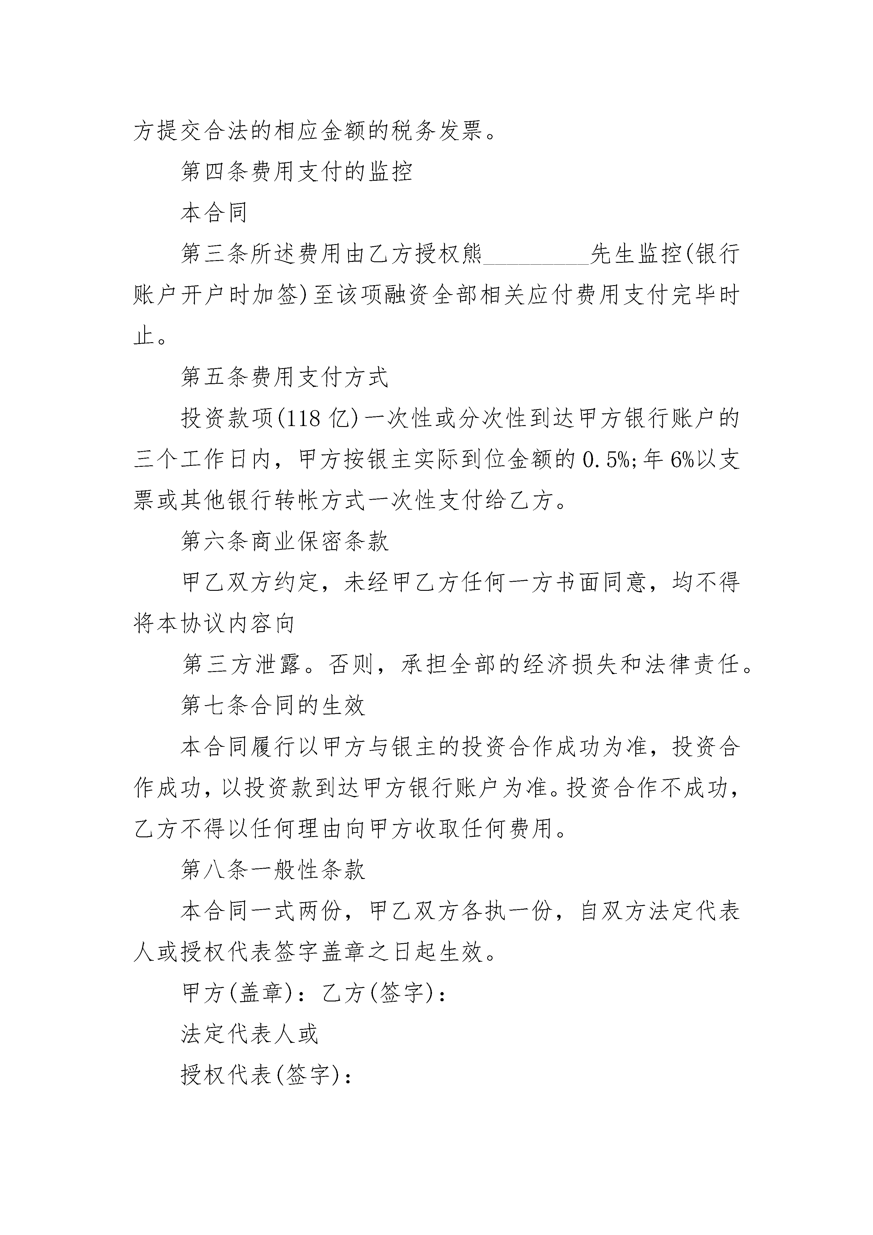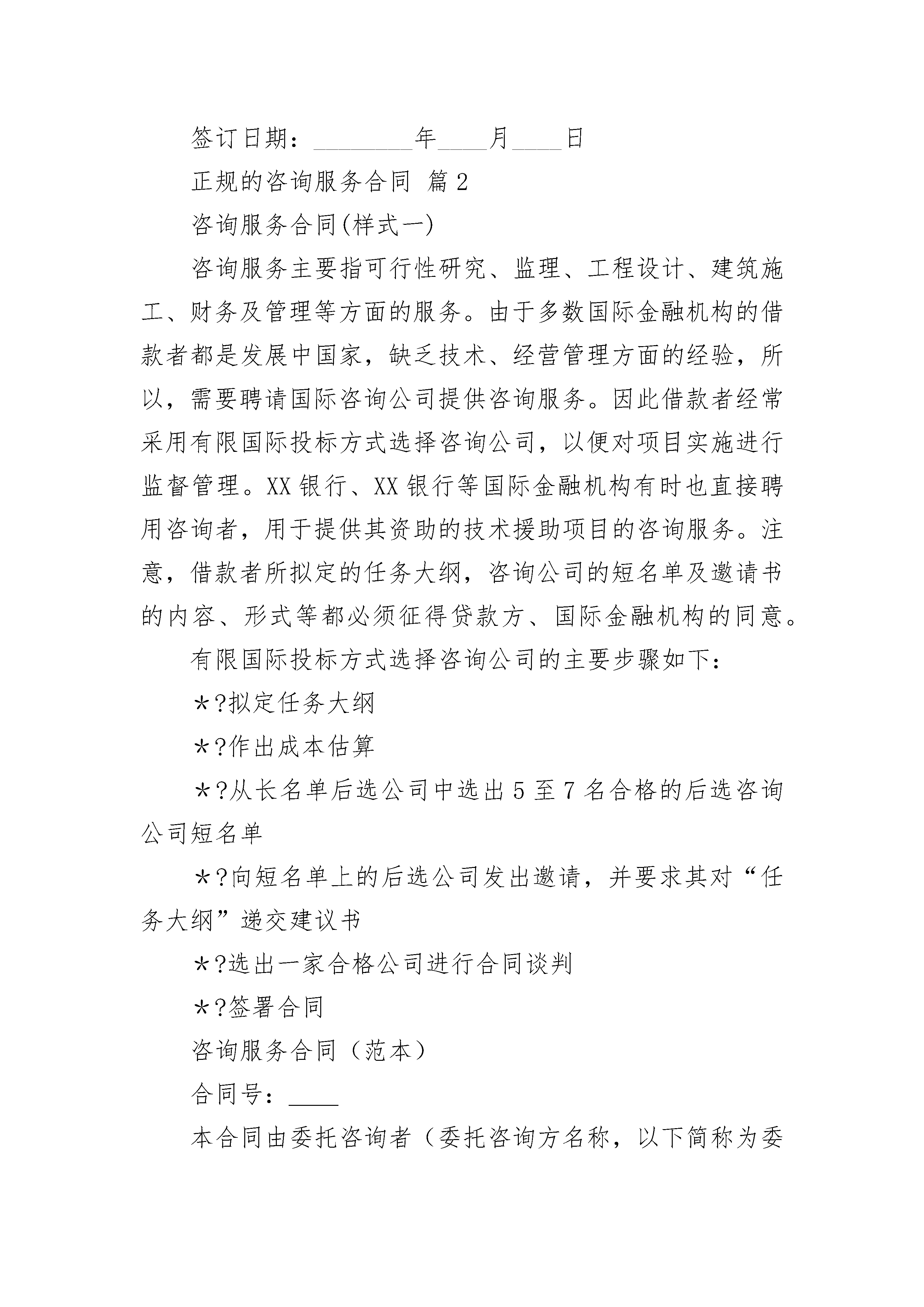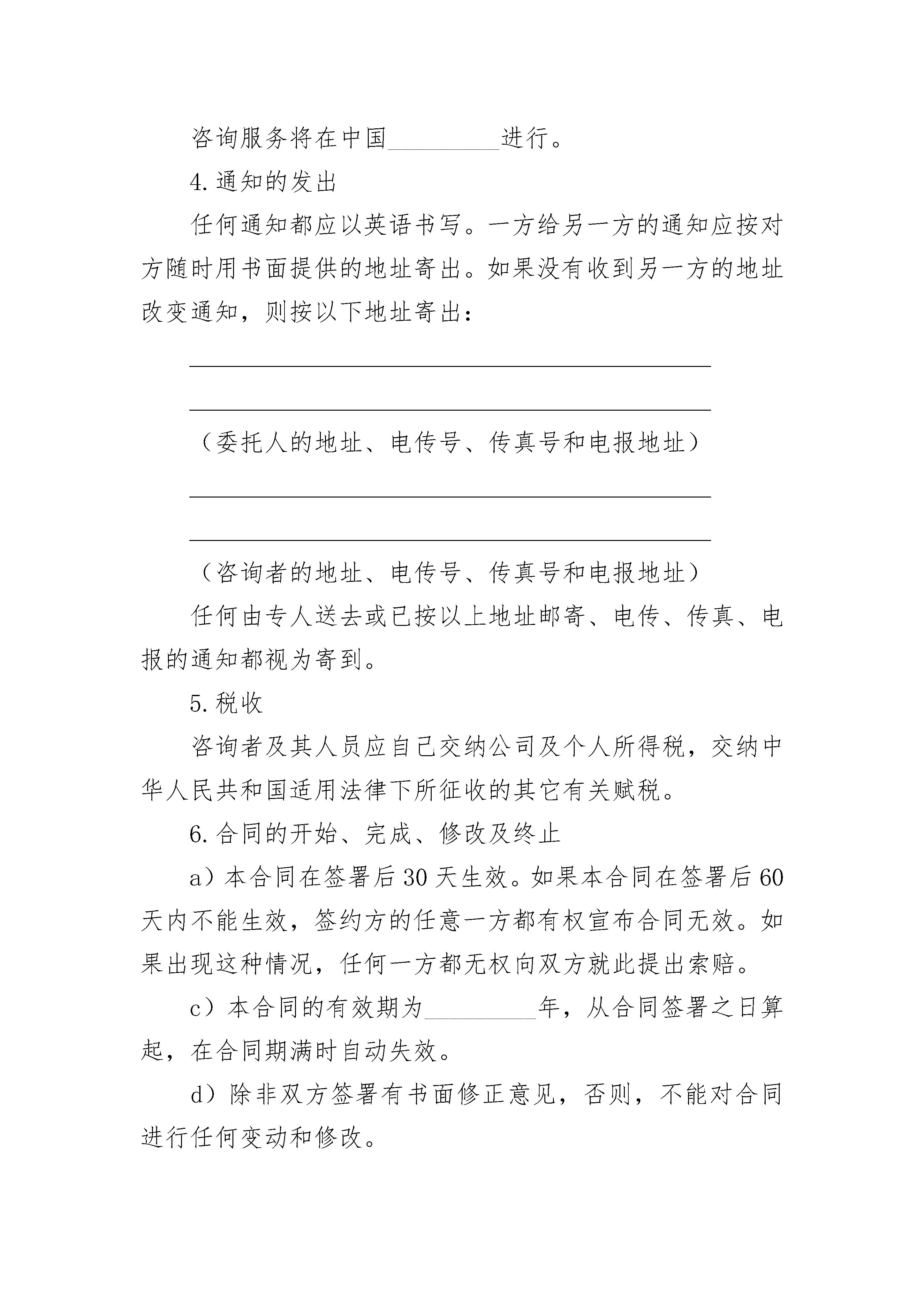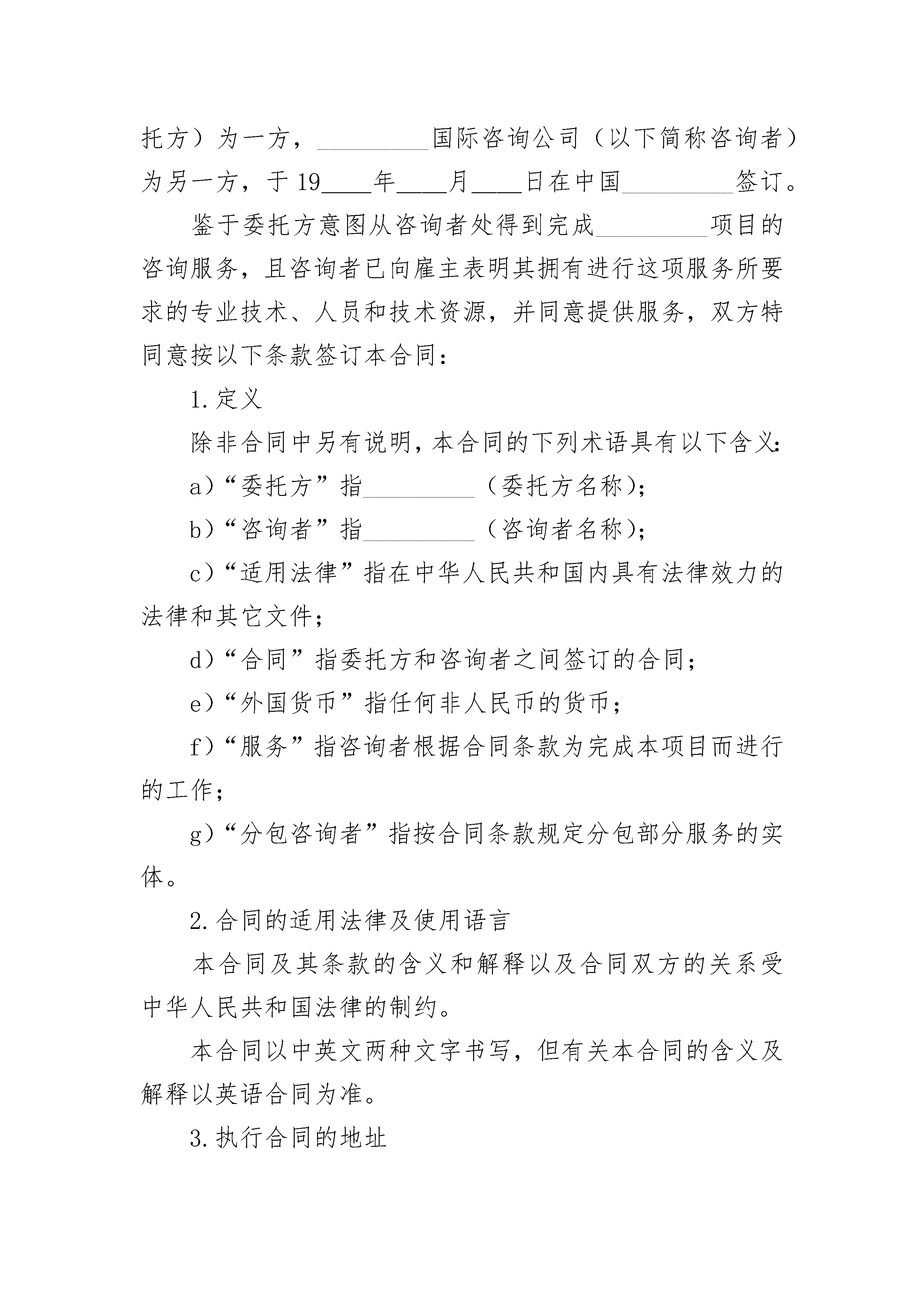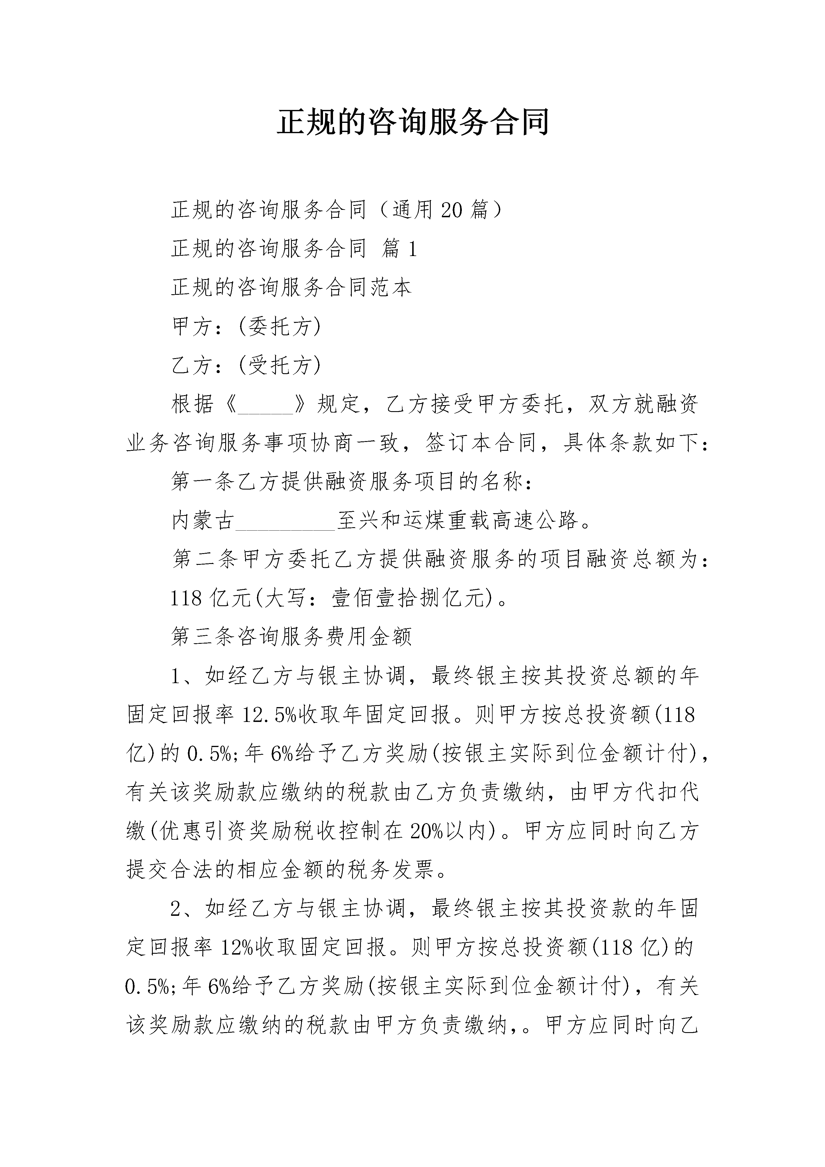 正规的咨询服务合同正规的咨询服务合同(通用20篇)正规的咨询服务合同篇1正规的咨询服务合同范本甲方:(委托方)乙方:(受托方)根据《_____》规定,乙方接受甲方委托,双方就融资业务咨询服务事项协商一致,签订本合同,具体条款如下:第一条乙方提供融资服务项目的名称:内蒙古_________至兴和运煤重载高速公路。第二条甲方委托乙方提供融资服务的项目融资总额为:118亿元(大写:壹佰壹拾捌亿元)。第三条咨询服务费用金额1、如经乙方与银主协调,最终银主按其投资总额的年固定回报率12.5%收取年固定回报。则甲方按总投资额(118亿)的0.5%;年6%给予乙方奖励(按银主实际到位金额计付),有关该奖励款应缴纳的税款由乙方负责缴纳,由甲方代扣代缴(优惠引资奖励税收控制在20%以内)。甲方应同时向乙方提交合法的相应金额的税务发票。2、如经乙方与银主协调,最终银主按其投资款的年固定回报率12%收取固定回报。则甲方按总投资额(118亿)的0.5%;年6%给予乙方奖励(按银主实际到位金额计付),有关该奖励款应缴纳的税款由甲方负责缴纳,。甲方应同时向乙方提交合法的相应金额的税务发票。第四条费用支付的监控本合同第三条所述费用由乙方授权熊_________先生监控(银行账户开户时加签)至该项融资全部相关应付费用支付完毕时止。第五条费用支付方式投资款项(118亿)一次性或分次性到达甲方银行账户的三个工作日内,甲方按银主实际到位金额的0.5%;年6%以支票或其他银行转帐方式一次性支付给乙方。第六条商业保密条款甲乙双方约定,未经甲乙方任何一方书面同意,均不得将本协议内容向第三方泄露。否则,承担全部的经济损失和法律责任。第七条合同的生效本合同履行以甲方与银主的投资合作成功为准,投资合作成功,以投资款到达甲方银行账户为准。投资合作不成功,乙方不得以任何理由向甲方收取任何费用。第八条一般性条款本合同一式两份,甲乙双方各执一份,自双方法定代表人或授权代表签字盖章之日起生效。甲方(盖章):乙方(签字):法定代表人或授权代表(签字):签订日期:________年____月____日正规的咨询服务合同篇2咨询服务合同(样式一)咨询服务主要指可行性研究、监理、工程设计、建筑施工、财务及管理等方面的服务。由于多数国际金融机构的借款者都是发展中国家,缺乏技术、经营管理方面的经验,所以,需要聘请国际咨询公司提供咨询服务。因此借款者经常采用有限国际投标方式选择咨询公司,以便对项目实施进行监督管理。XX银行、XX银行等国际金融机构有时也直接聘用咨询者,用于提供其资助的技术援助项目的咨询服务。注意,借款者所拟定的任务大纲,咨询公司的短名单及邀请书的内容、形式等都必须征得贷款方、国际金融机构的同意。有限国际投标方式选择咨询公司的主要步骤如下:*?拟定任务大纲*?作出成本估算*?从长名单后选公司中选出5至7名合格的后选咨询公司短名单*?向短名单上的后选公司发出邀请,并要求其对“任务大纲”递交建议书*?选出一家合格公司进行合同谈判*?签署合同咨询服务合同(范本)合同号:__本合同由委托咨询者(委托咨询方名称,以下简称为委托方)为一方,_________国际咨询公司(以下简称咨询者)为另一方,于19__年__月__日在中国_________签订。鉴于委托方意图从咨询者处得到完成_________项目的咨询服务,且咨询者已向雇主表明其拥有进行这项服务所要求的专业技术、人员和技术资源,并同意提供服务,双方特同意按以下条款签订本合同:1.定义除非合同中另有说明,本合同的下列术语具有以下含义:a)“委托方”指_________(委托方名称);b)“咨询者”指_________(咨询者名称);c)“适用法律”指在中华人民共和国内具有法律效力的法律和其它文件;d)“合同”指委托方和咨询者之间签订的合同;e)“外国货币”指任何非人民币的货币;f)“服务”指咨询者根据合同条款为完成本项目而进行的工作;g)“分包咨询者”指按合同条款规定分包部分服务的实体。2.合同的适用法律及使用语言本合同及其条款的含义和解释以及合同双方的关系受中华人民共和国法律的制约。本合同以中英文两种文字书写,但有关本合同的含义及解释以英语合同为准。3.执行合同的地址咨询服务将在中国_________进行。4.通知的发出任何通知都应以英语书写。一方给另一方的通知应按对方随时用书面提供的地址寄出。如果没有收到另一方的地址改变通知,则按以下地址寄出:__________________________________________(委托人的地址、电传号、传真号和电报地址)__________________________________________(咨询者的地址、电传号、传真号和电报地址)任何由专人送去或已按以上地址邮寄、电传、传真