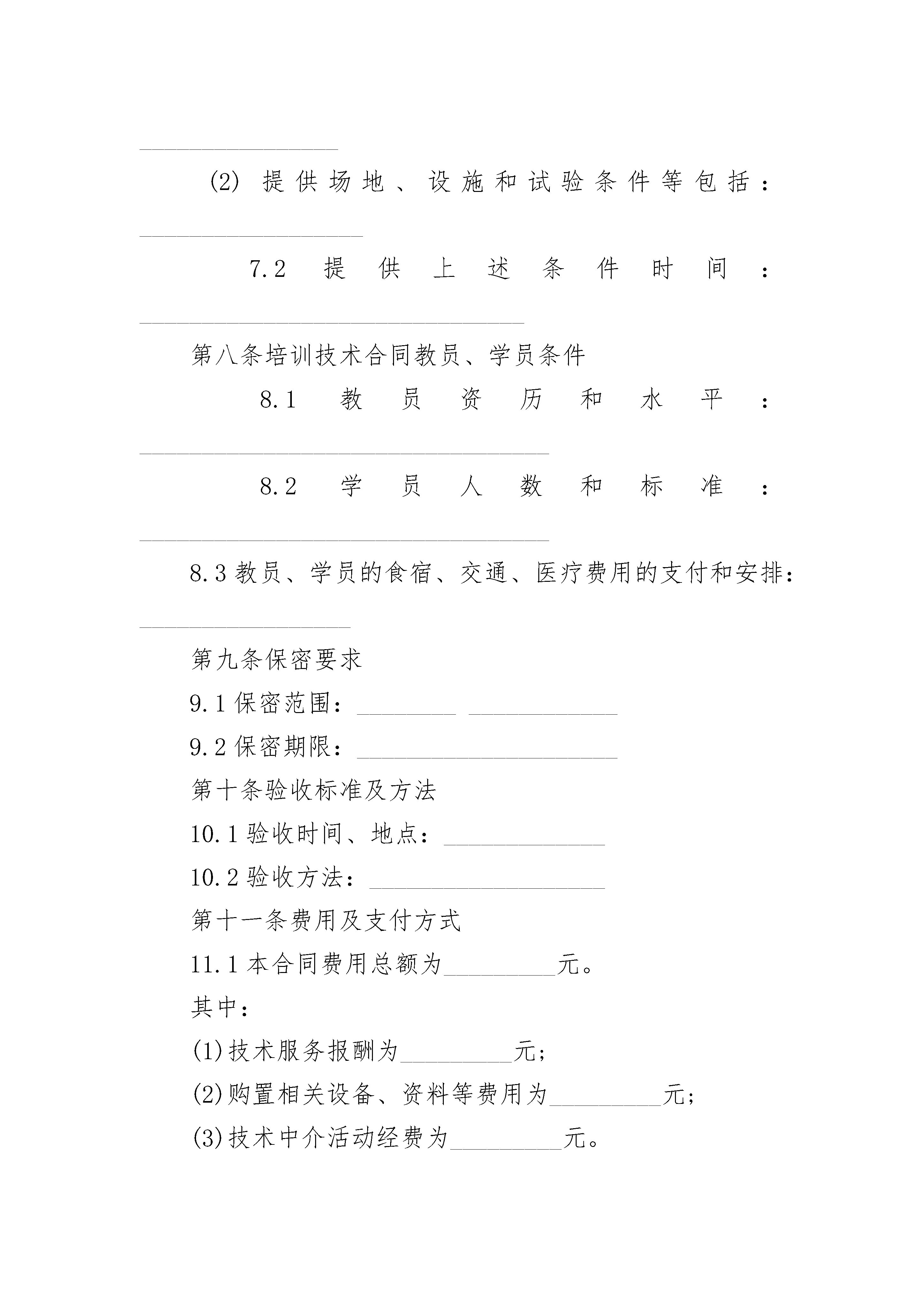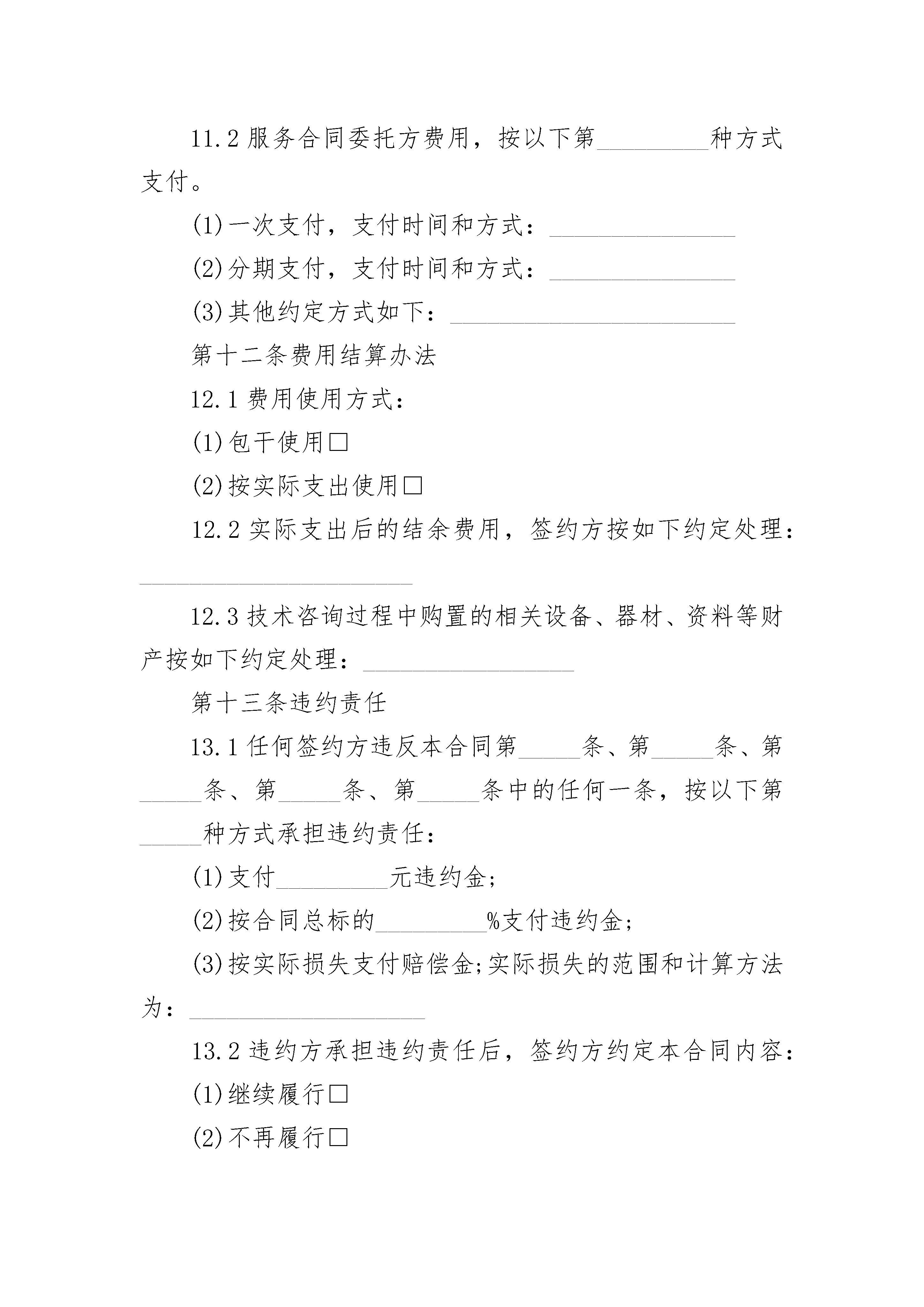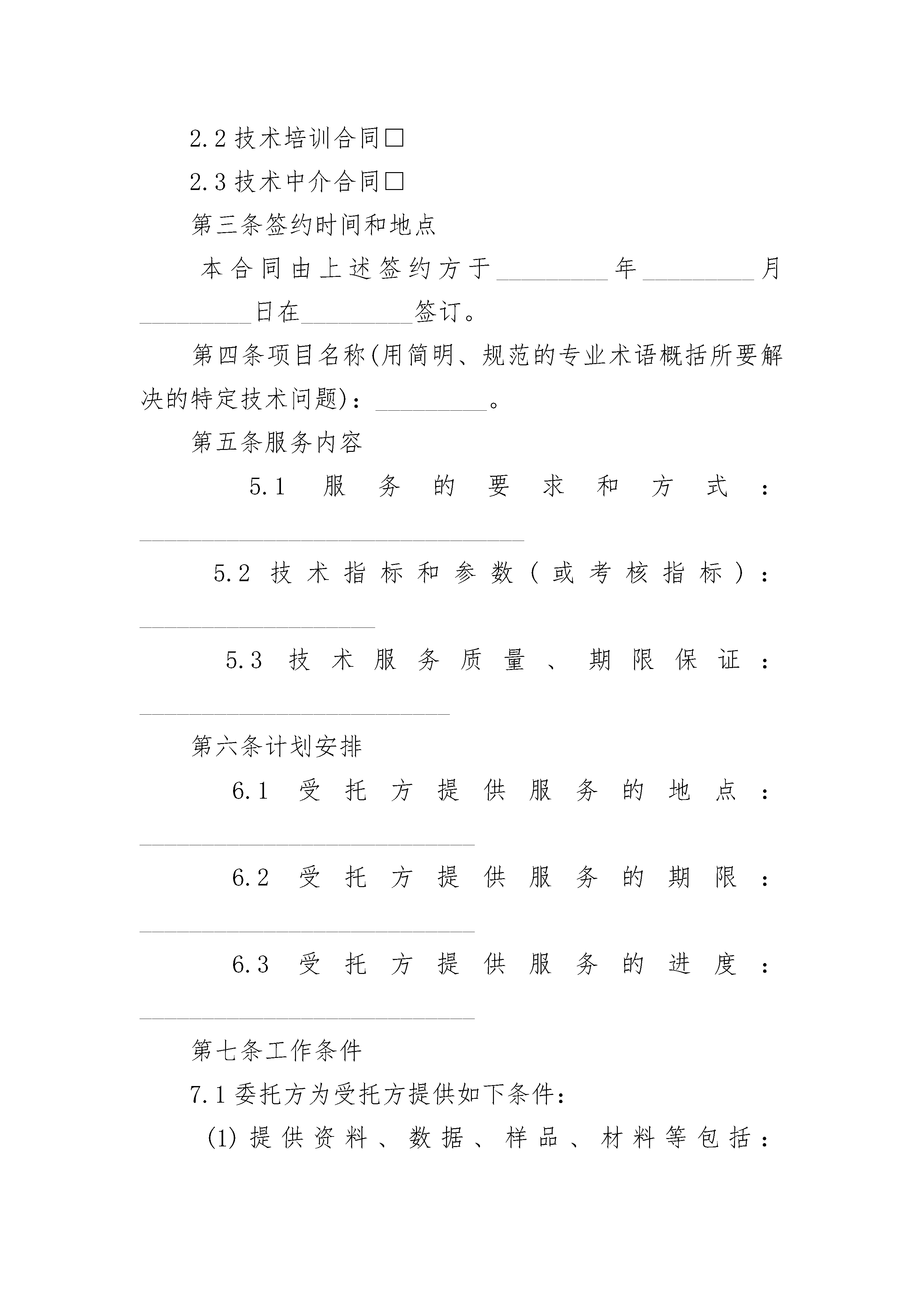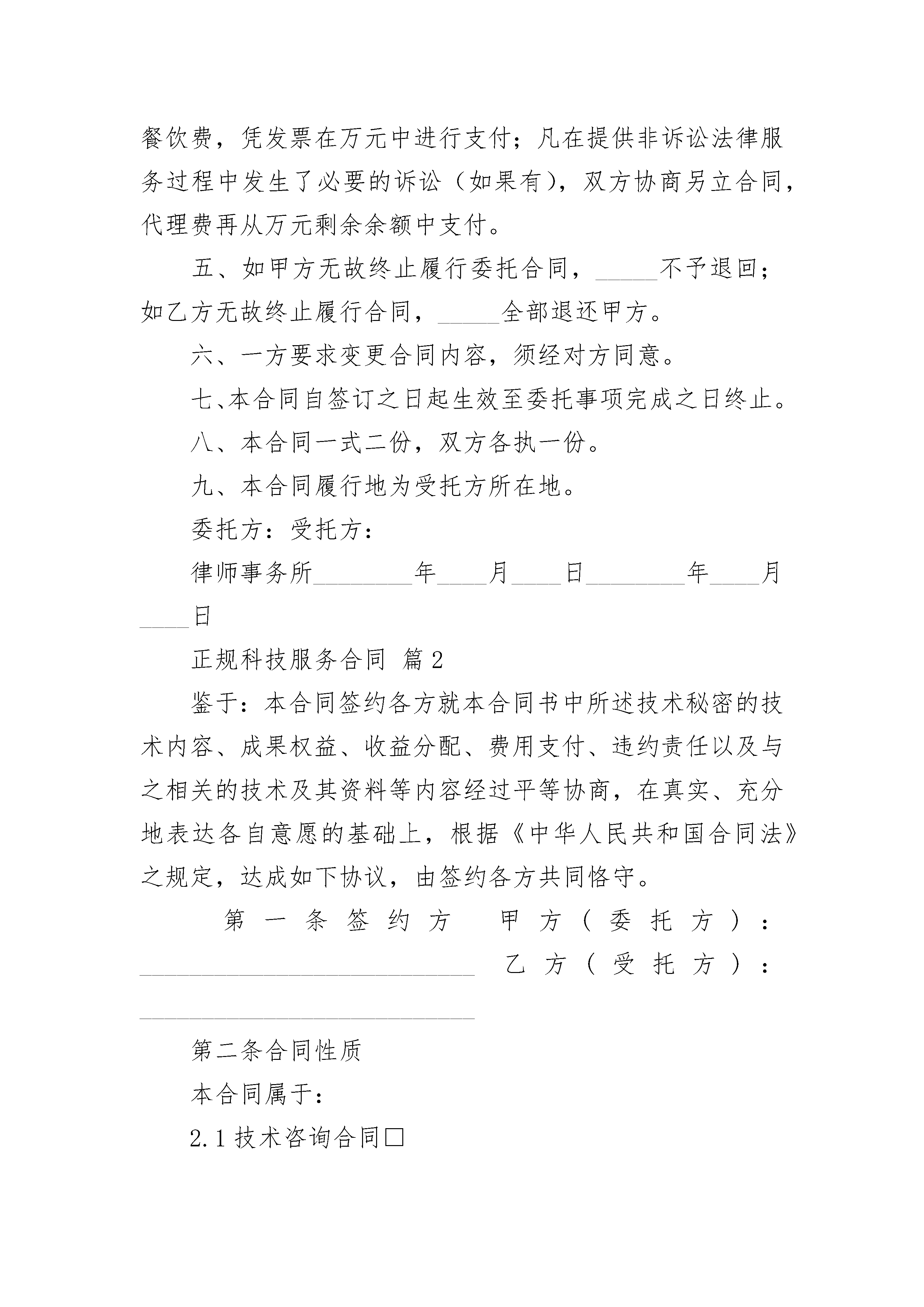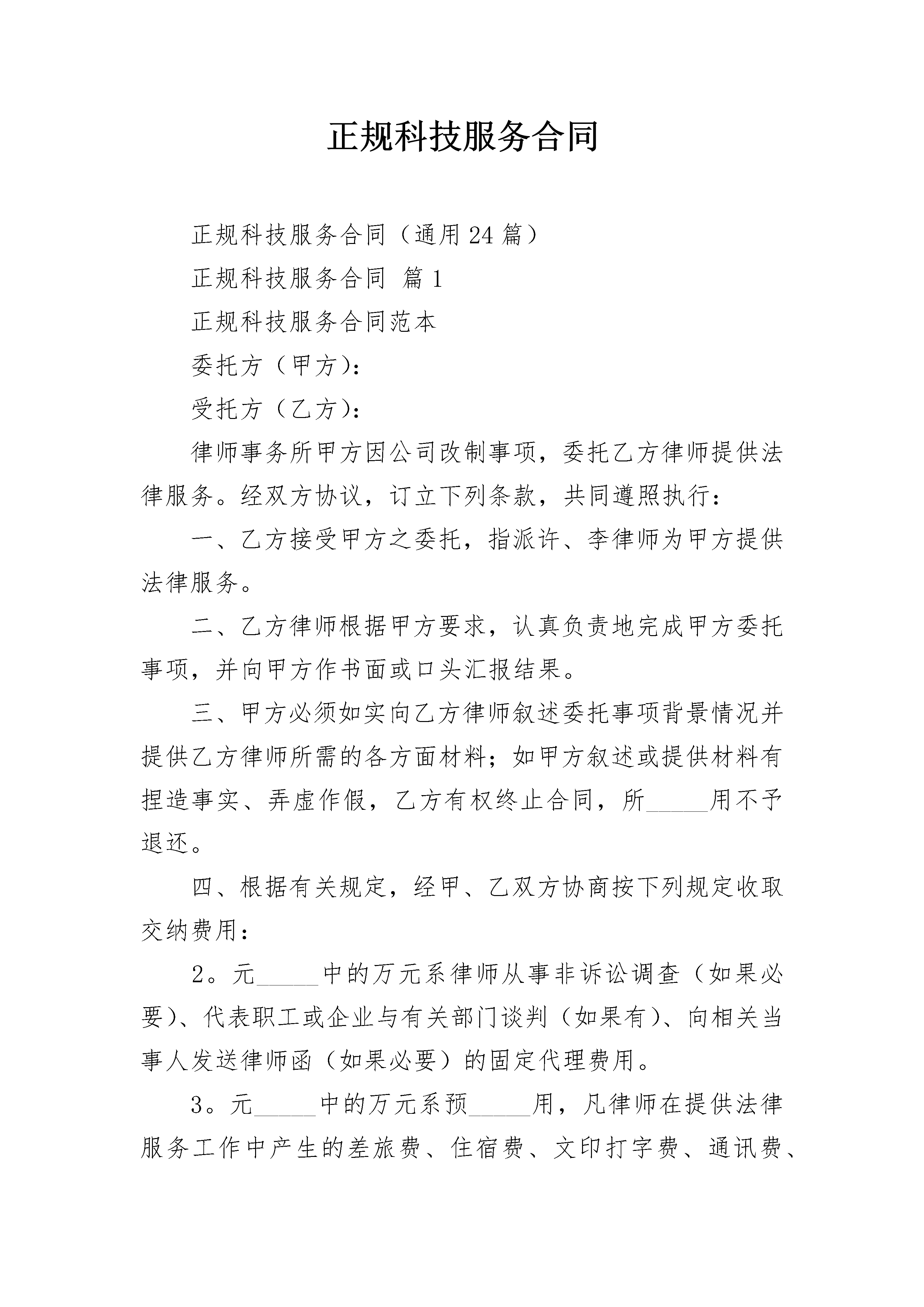 正规科技服务合同正规科技服务合同(通用24篇)正规科技服务合同篇1正规科技服务合同范本委托方(甲方):受托方(乙方):律师事务所甲方因公司改制事项,委托乙方律师提供法律服务。经双方协议,订立下列条款,共同遵照执行:一、乙方接受甲方之委托,指派许、李律师为甲方提供法律服务。二、乙方律师根据甲方要求,认真负责地完成甲方委托事项,并向甲方作书面或口头汇报结果。三、甲方必须如实向乙方律师叙述委托事项背景情况并提供乙方律师所需的各方面材料;如甲方叙述或提供材料有捏造事实、弄虚作假,乙方有权终止合同,所_____用不予退还。四、根据有关规定,经甲、乙双方协商按下列规定收取交纳费用:2。元_____中的万元系律师从事非诉讼调查(如果必要)、代表职工或企业与有关部门谈判(如果有)、向相关当事人发送律师函(如果必要)的固定代理费用。3。元_____中的万元系预_____用,凡律师在提供法律服务工作中产生的差旅费、住宿费、文印打字费、通讯费、餐饮费,凭发票在万元中进行支付;凡在提供非诉讼法律服务过程中发生了必要的诉讼(如果有),双方协商另立合同,代理费再从万元剩余余额中支付。五、如甲方无故终止履行委托合同,_____不予退回;如乙方无故终止履行合同,_____全部退还甲方。六、一方要求变更合同内容,须经对方同意。七、本合同自签订之日起生效至委托事项完成之日终止。八、本合同一式二份,双方各执一份。九、本合同履行地为受托方所在地。委托方:受托方:律师事务所________年____月____日________年____月____日正规科技服务合同篇2鉴于:本合同签约各方就本合同书中所述技术秘密的技术内容、成果权益、收益分配、费用支付、违约责任以及与之相关的技术及其资料等内容经过平等协商,在真实、充分地表达各自意愿的基础上,根据《中华人民共和国合同法》之规定,达成如下协议,由签约各方共同恪守。第一条签约方甲方(委托方):___________________________乙方(受托方):___________________________第二条合同性质本合同属于:2.1技术咨询合同□2.2技术培训合同□2.3技术中介合同□第三条签约时间和地点本合同由上述签约方于_________年_________月_________日在_________签订。第四条项目名称(用简明、规范的专业术语概括所要解决的特定技术问题):_________。第五条服务内容5.1服务的要求和方式:_______________________________5.2技术指标和参数(或考核指标):___________________5.3技术服务质量、期限保证:_________________________第六条计划安排6.1受托方提供服务的地点:___________________________6.2受托方提供服务的期限:___________________________6.3受托方提供服务的进度:___________________________第七条工作条件7.1委托方为受托方提供如下条件:(1)提供资料、数据、样品、材料等包括:________________(2)提供场地、设施和试验条件等包括:__________________7.2提供上述条件时间:_______________________________第八条培训技术合同教员、学员条件8.1教员资历和水平:_________________________________8.2学员人数和标准:_________________________________8.3教员、学员的食宿、交通、医疗费用的支付和安排:_________________第九条保密要求9.1保密范围:____________________9.2保密期限:_____________________第十条验收标准及方法10.1验收时间、地点:_____________10.2验收方法:___________________第十一条费用及支付方式11.1本合同费用总额为_________元。其中:(1)技术服务报酬为_________元;(2)购置相关设备、资料等费用为_________元;(3)技术中介活动经费为_________元。11.2服务合同委托方费用,按以下第_________种方式支付。(1)一次支付,支付时间和方式:_______________(2)分期支付,支付时间和方式:_______________(3)其他约定方式如下:_______________________第十二条费用结算办法12.1费用使用方式:(1)包干使用□(2)按实际支出使用□12.2实际支出后的结余费用,签约方按如下约定处理: