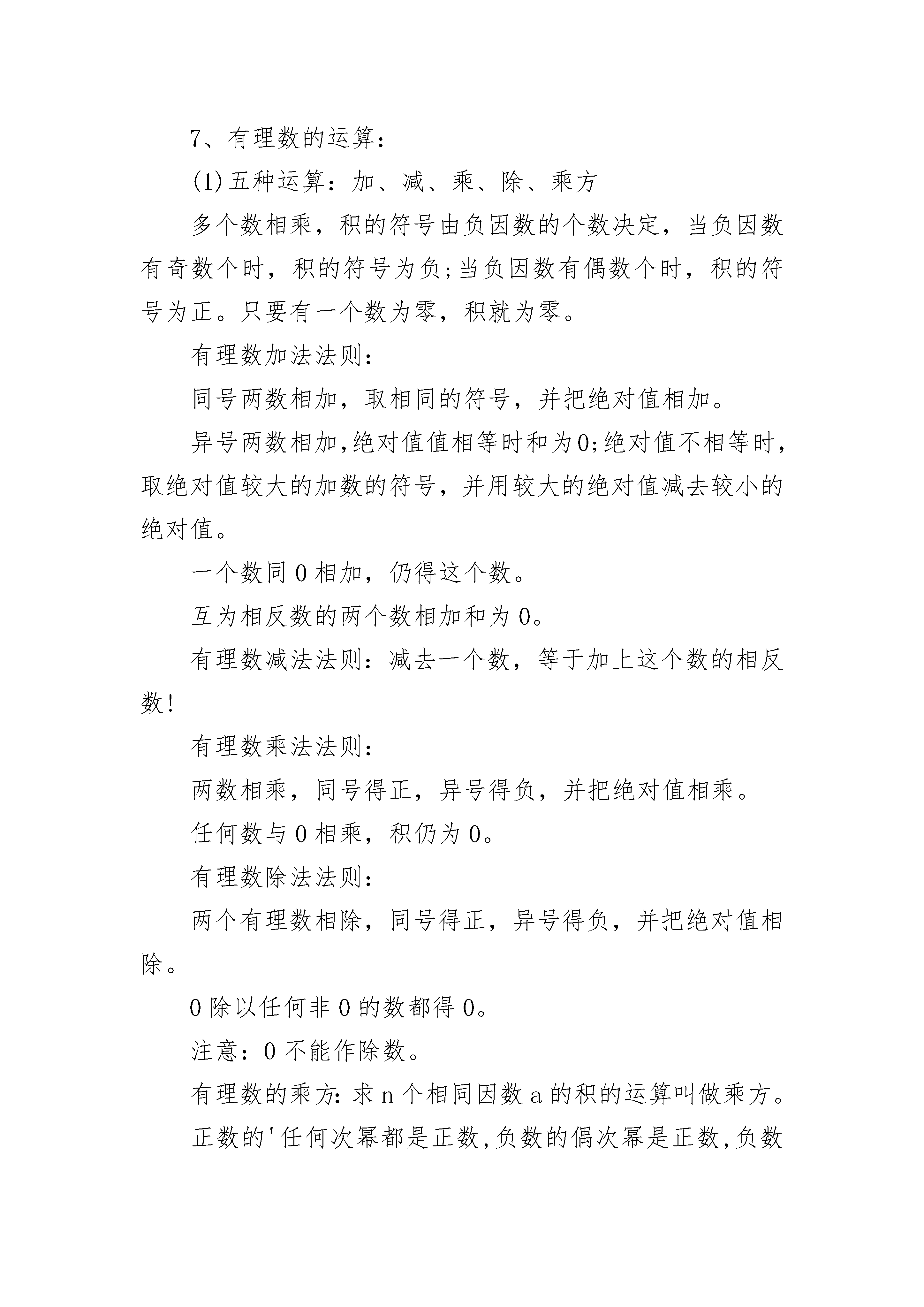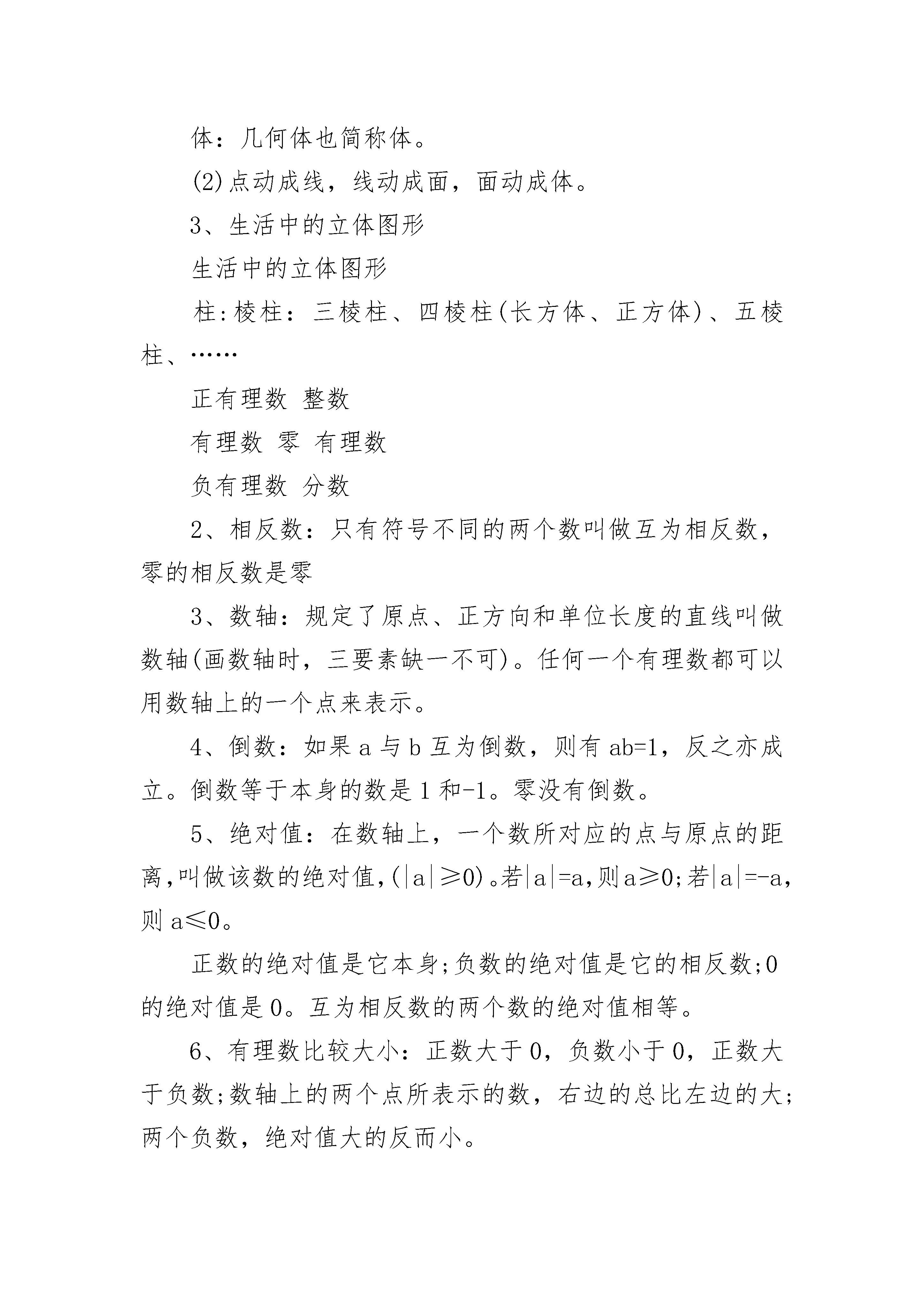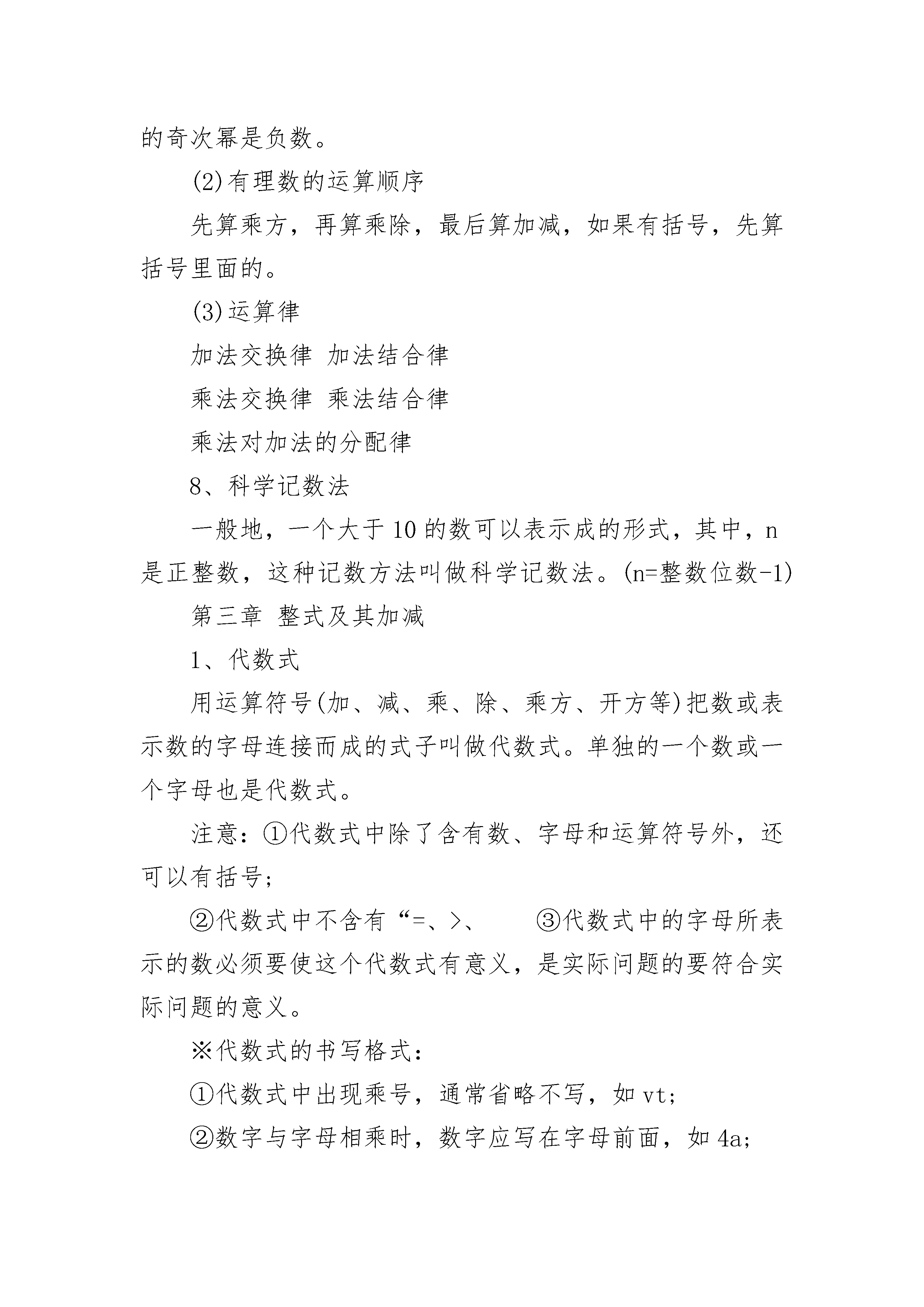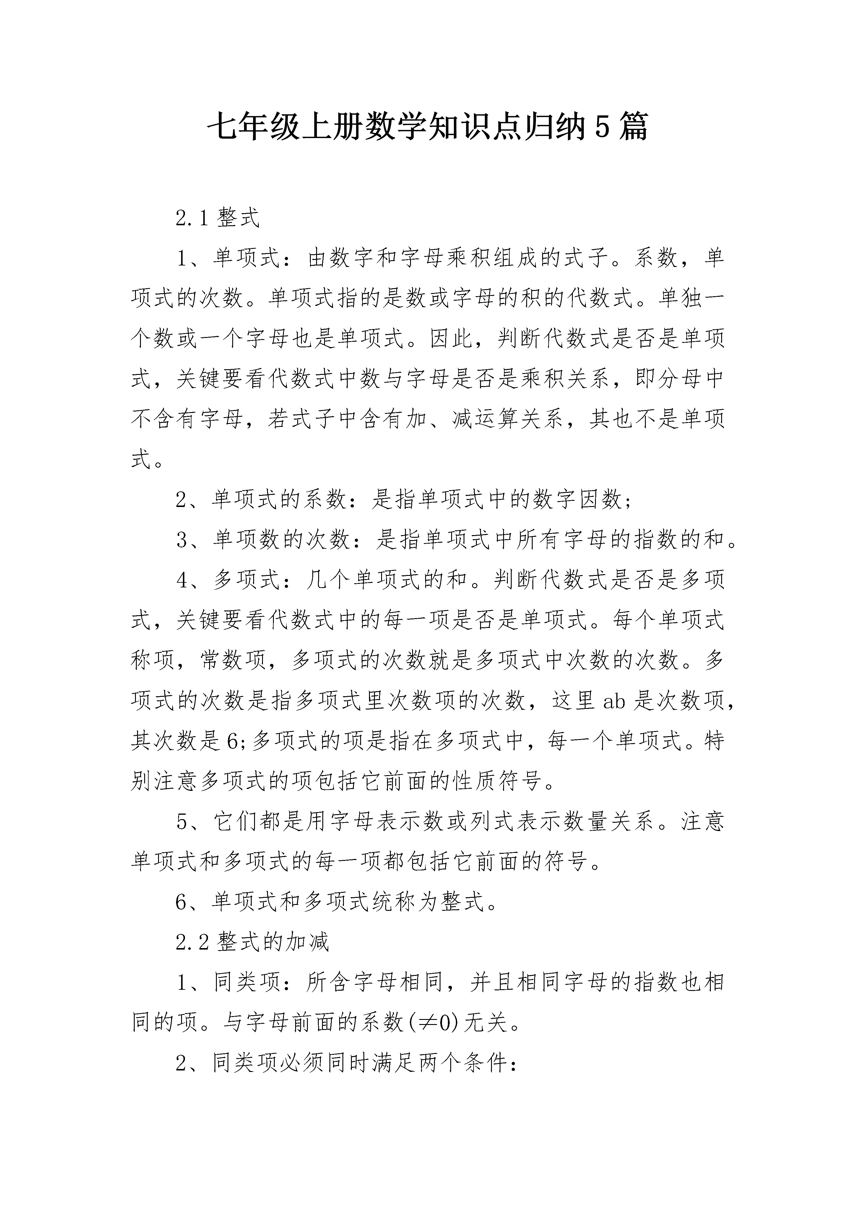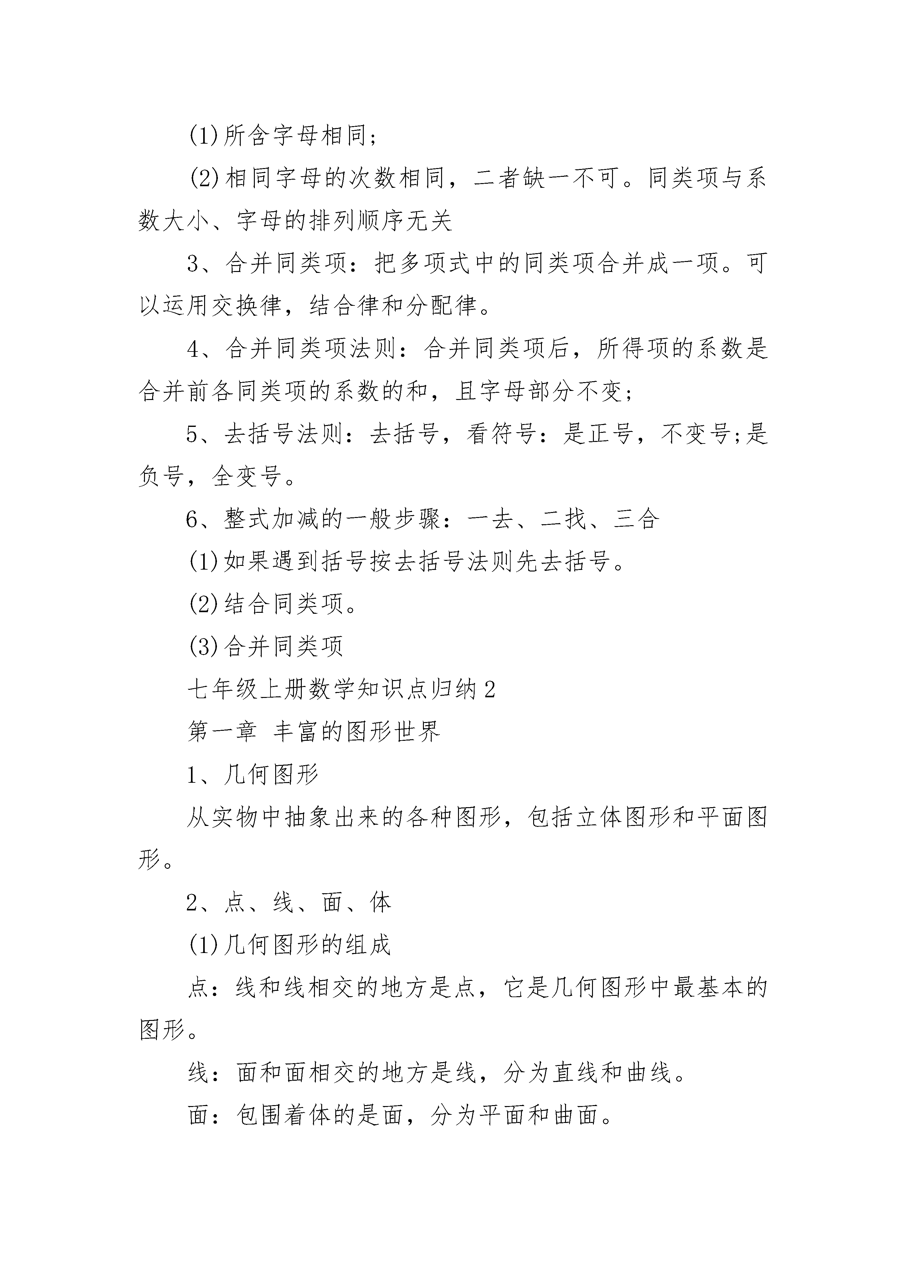 七年级上册数学知识点归纳5篇2.1整式1、单项式:由数字和字母乘积组成的式子。系数,单项式的次数。单项式指的是数或字母的积的代数式。单独一个数或一个字母也是单项式。因此,判断代数式是否是单项式,关键要看代数式中数与字母是否是乘积关系,即分母中不含有字母,若式子中含有加、减运算关系,其也不是单项式。2、单项式的系数:是指单项式中的数字因数;3、单项数的次数:是指单项式中所有字母的指数的和。4、多项式:几个单项式的和。判断代数式是否是多项式,关键要看代数式中的每一项是否是单项式。每个单项式称项,常数项,多项式的次数就是多项式中次数的次数。多项式的次数是指多项式里次数项的次数,这里ab是次数项,其次数是6;多项式的项是指在多项式中,每一个单项式。特别注意多项式的项包括它前面的性质符号。5、它们都是用字母表示数或列式表示数量关系。注意单项式和多项式的每一项都包括它前面的符号。6、单项式和多项式统称为整式。2.2整式的加减1、同类项:所含字母相同,并且相同字母的指数也相同的项。与字母前面的系数(≠0)无关。2、同类项必须同时满足两个条件:(1)所含字母相同;(2)相同字母的次数相同,二者缺一不可。同类项与系数大小、字母的排列顺序无关3、合并同类项:把多项式中的同类项合并成一项。可以运用交换律,结合律和分配律。4、合并同类项法则:合并同类项后,所得项的系数是合并前各同类项的系数的和,且字母部分不变;5、去括号法则:去括号,看符号:是正号,不变号;是负号,全变号。6、整式加减的一般步骤:一去、二找、三合(1)如果遇到括号按去括号法则先去括号。(2)结合同类项。(3)合并同类项七年级上册数学知识点归纳2第一章丰富的图形世界1、几何图形从实物中抽象出来的各种图形,包括立体图形和平面图形。2、点、线、面、体(1)几何图形的组成点:线和线相交的地方是点,它是几何图形中最基本的图形。线:面和面相交的地方是线,分为直线和曲线。面:包围着体的是面,分为平面和曲面。体:几何体也简称体。(2)点动成线,线动成面,面动成体。3、生活中的立体图形生活中的立体图形柱:棱柱:三棱柱、四棱柱(长方体、正方体)、五棱柱、……正有理数整数有理数零有理数负有理数分数2、相反数:只有符号不同的两个数叫做互为相反数,零的相反数是零3、数轴:规定了原点、正方向和单位长度的直线叫做数轴(画数轴时,三要素缺一不可)。任何一个有理数都可以用数轴上的一个点来表示。4、倒数:如果a与b互为倒数,则有ab=1,反之亦成立。倒数等于本身的数是1和-1。零没有倒数。5、绝对值:在数轴上,一个数所对应的点与原点的距离,叫做该数的绝对值,(|a|≥0)。若|a|=a,则a≥0;若|a|=-a,则a≤0。正数的绝对值是它本身;负数的绝对值是它的相反数;0的绝对值是0。互为相反数的两个数的绝对值相等。6、有理数比较大小:正数大于0,负数小于0,正数大于负数;数轴上的两个点所表示的数,右边的总比左边的大;两个负数,绝对值大的反而小。7、有理数的运算:(1)五种运算:加、减、乘、除、乘方多个数相乘,积的符号由负因数的个数决定,当负因数有奇数个时,积的符号为负;当负因数有偶数个时,积的符号为正。只要有一个数为零,积就为零。有理数加法法则:同号两数相加,取相同的符号,并把绝对值相加。异号两数相加,绝对值值相等时和为0;绝对值不相等时,取绝对值较大的加数的符号,并用较大的绝对值减去较小的绝对值。一个数同0相加,仍得这个数。互为相反数的两个数相加和为0。有理数减法法则:减去一个数,等于加上这个数的相反数!有理数乘法法则:两数相乘,同号得正,异号得负,并把绝对值相乘。任何数与0相乘,积仍为0。有理数除法法则:两个有理数相除,同号得正,异号得负,并把绝对值相除。0除以任何非0的数都得0。注意:0不能作除数。有理数的乘方:求n个相同因数a的积的运算叫做乘方。正数的'任何次幂都是正数,负数的偶次幂是正数,负数的奇次幂是负数。(2)有理数的运算顺序先算乘方,再算乘除,最后算加减,如果有括号,先算括号里面的。(3)运算律加法交换律加法结合律乘法交换律乘法结合律乘法对加法的分配律8、科学记数法一般地,一个大于10的数可以表示成的形式,其中,n是正整数,这种记数方法叫做科学记数法。(n=整数位数-1)第三章整式及其加减1、代数式用运算符号(加、减、乘、除、乘方、开方等)把数或表示数的字母连接而成的式子叫做代数式。单独的一个数或一个字母也是代数式。注意:①代数式中除了含有数、字母和运算符号外,还可以有括号;②代数式中不含有“=、>、③代数式中的字母所表示的数必须要使这个代数式有意义,是实际问题的要符合实际问题的意义。※代数式的书写格式:①代数式中出现乘号,通常省略不写,如vt;②数字与字母相乘时,数字应写在字母前面,如4a;③带