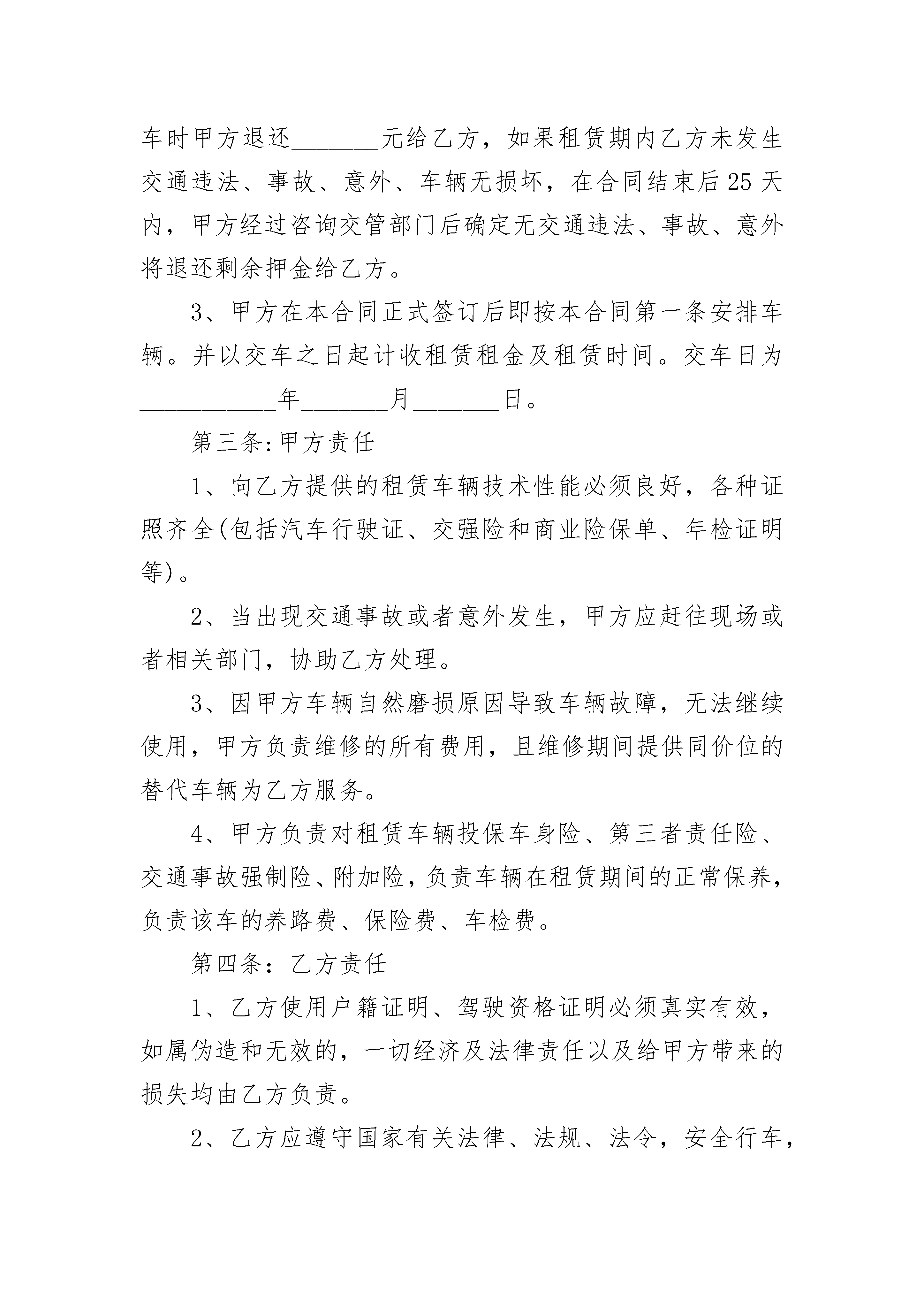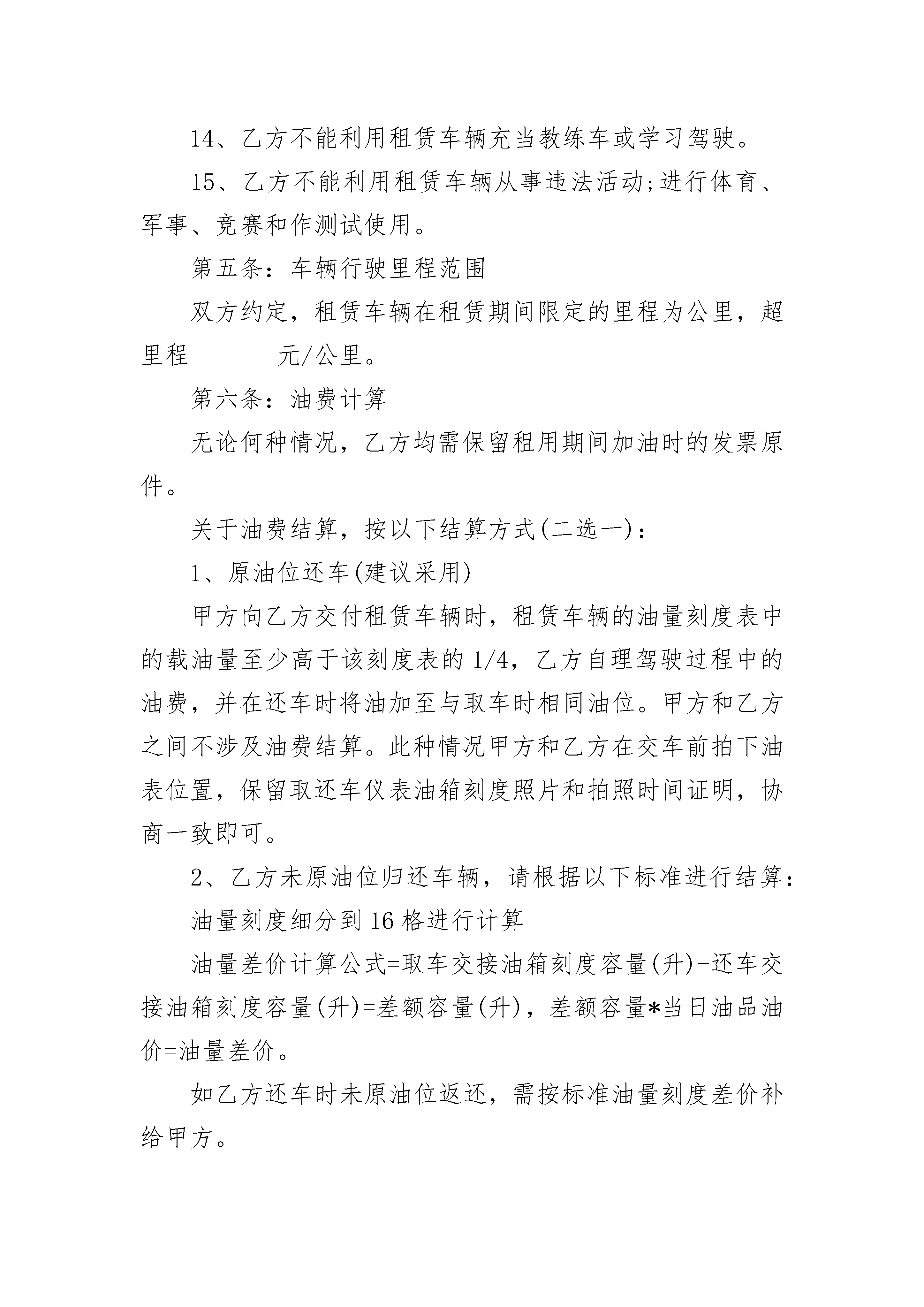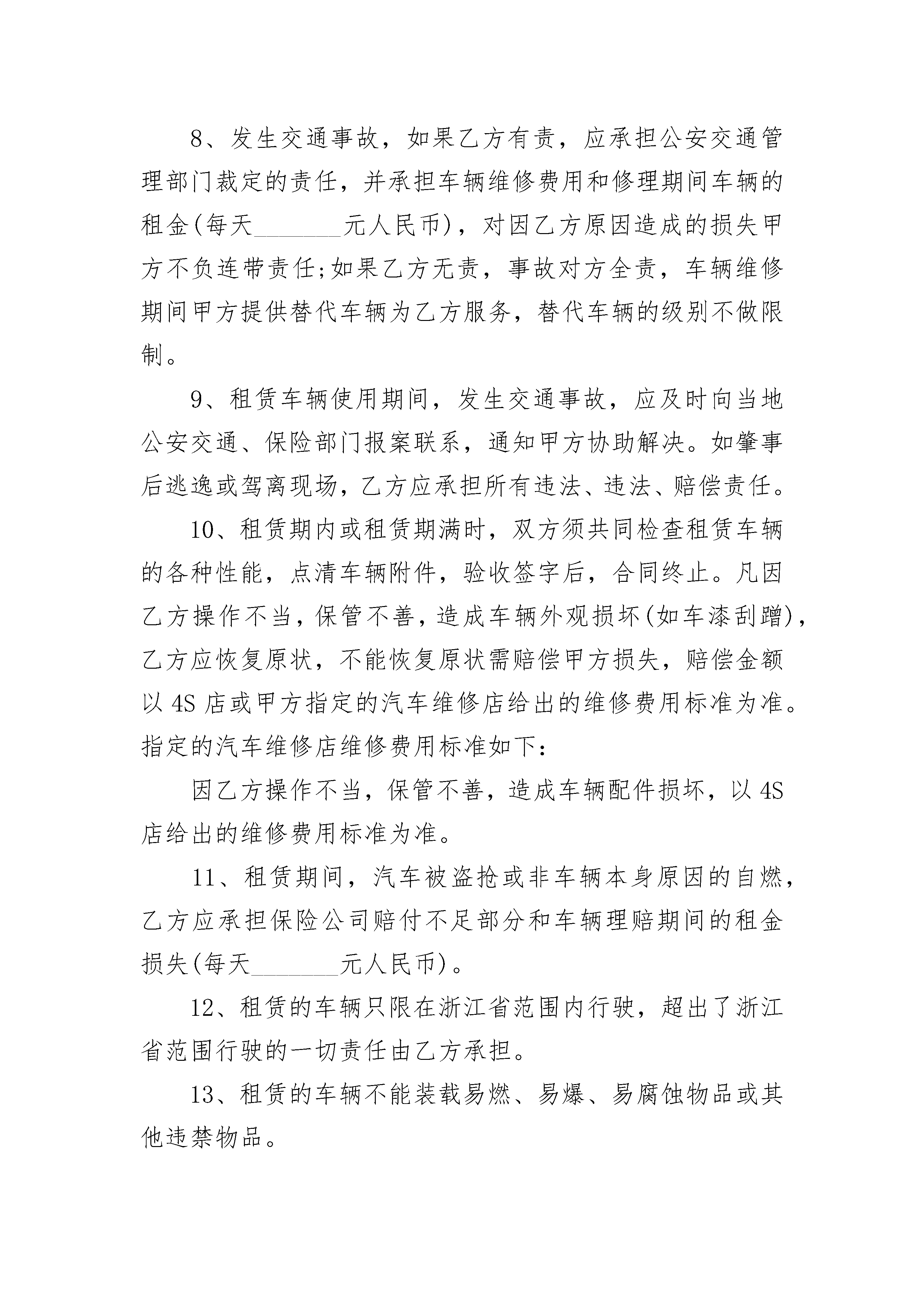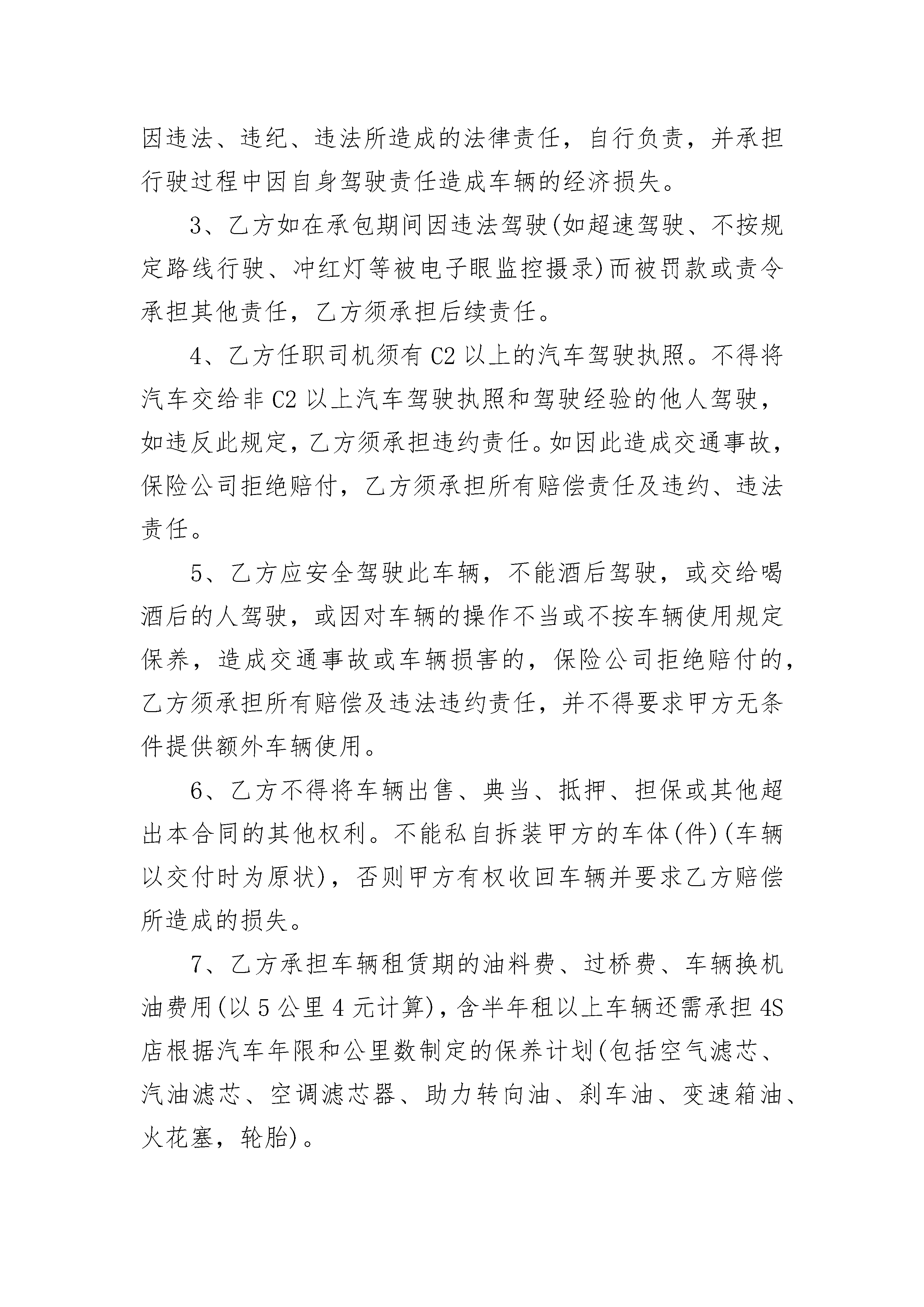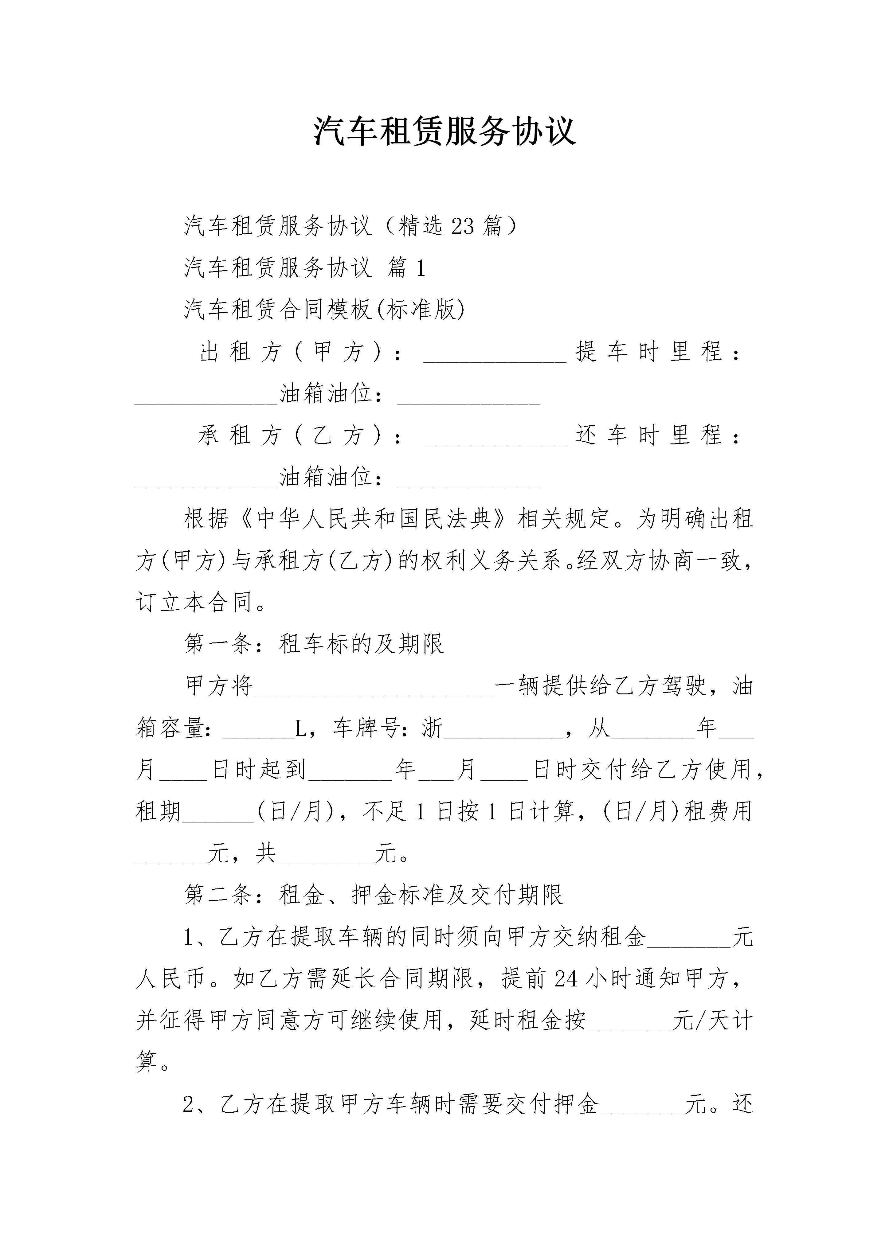 汽车租赁服务协议汽车租赁服务协议(精选23篇)汽车租赁服务协议篇1汽车租赁合同模板(标准版)出租方(甲方):____________提车时里程:____________油箱油位:____________承租方(乙方):____________还车时里程:____________油箱油位:____________根据《中华人民共和国民法典》相关规定。为明确出租方(甲方)与承租方(乙方)的权利义务关系。经双方协商一致,订立本合同。第一条:租车标的及期限甲方将____________________一辆提供给乙方驾驶,油箱容量:______L,车牌号:浙__________,从_______年___月____日时起到_______年___月____日时交付给乙方使用,租期______(日/月),不足1日按1日计算,(日/月)租费用______元,共________元。第二条:租金、押金标准及交付期限1、乙方在提取车辆的同时须向甲方交纳租金_______元人民币。如乙方需延长合同期限,提前24小时通知甲方,并征得甲方同意方可继续使用,延时租金按_______元/天计算。2、乙方在提取甲方车辆时需要交付押金_______元。还车时甲方退还_______元给乙方,如果租赁期内乙方未发生交通违法、事故、意外、车辆无损坏,在合同结束后25天内,甲方经过咨询交管部门后确定无交通违法、事故、意外将退还剩余押金给乙方。3、甲方在本合同正式签订后即按本合同第一条安排车辆。并以交车之日起计收租赁租金及租赁时间。交车日为___________年_______月_______日。第三条:甲方责任1、向乙方提供的租赁车辆技术性能必须良好,各种证照齐全(包括汽车行驶证、交强险和商业险保单、年检证明等)。2、当出现交通事故或者意外发生,甲方应赶往现场或者相关部门,协助乙方处理。3、因甲方车辆自然磨损原因导致车辆故障,无法继续使用,甲方负责维修的所有费用,且维修期间提供同价位的替代车辆为乙方服务。4、甲方负责对租赁车辆投保车身险、第三者责任险、交通事故强制险、附加险,负责车辆在租赁期间的正常保养,负责该车的养路费、保险费、车检费。第四条:乙方责任1、乙方使用户籍证明、驾驶资格证明必须真实有效,如属伪造和无效的,一切经济及法律责任以及给甲方带来的损失均由乙方负责。2、乙方应遵守国家有关法律、法规、法令,安全行车,因违法、违纪、违法所造成的法律责任,自行负责,并承担行驶过程中因自身驾驶责任造成车辆的经济损失。3、乙方如在承包期间因违法驾驶(如超速驾驶、不按规定路线行驶、冲红灯等被电子眼监控摄录)而被罚款或责令承担其他责任,乙方须承担后续责任。4、乙方任职司机须有C2以上的汽车驾驶执照。不得将汽车交给非C2以上汽车驾驶执照和驾驶经验的他人驾驶,如违反此规定,乙方须承担违约责任。如因此造成交通事故,保险公司拒绝赔付,乙方须承担所有赔偿责任及违约、违法责任。5、乙方应安全驾驶此车辆,不能酒后驾驶,或交给喝酒后的人驾驶,或因对车辆的操作不当或不按车辆使用规定保养,造成交通事故或车辆损害的,保险公司拒绝赔付的,乙方须承担所有赔偿及违法违约责任,并不得要求甲方无条件提供额外车辆使用。6、乙方不得将车辆出售、典当、抵押、担保或其他超出本合同的其他权利。不能私自拆装甲方的车体(件)(车辆以交付时为原状),否则甲方有权收回车辆并要求乙方赔偿所造成的损失。7、乙方承担车辆租赁期的油料费、过桥费、车辆换机油费用(以5公里4元计算),含半年租以上车辆还需承担4S店根据汽车年限和公里数制定的保养计划(包括空气滤芯、汽油滤芯、空调滤芯器、助力转向油、刹车油、变速箱油、火花塞,轮胎)。8、发生交通事故,如果乙方有责,应承担公安交通管理部门裁定的责任,并承担车辆维修费用和修理期间车辆的租金(每天_______元人民币),对因乙方原因造成的损失甲方不负连带责任;如果乙方无责,事故对方全责,车辆维修期间甲方提供替代车辆为乙方服务,替代车辆的级别不做限制。9、租赁车辆使用期间,发生交通事故,应及时向当地公安交通、保险部门报案联系,通知甲方协助解决。如肇事后逃逸或驾离现场,乙方应承担所有违法、违法、赔偿责任。10、租赁期内或租赁期满时,双方须共同检查租赁车辆的各种性能,点清车辆附件,验收签字后,合同终止。凡因乙方操作不当,保管不善,造成车辆外观损坏(如车漆刮蹭),乙方应恢复原状,不能恢复原状需赔偿甲方损失,赔偿金额以4S店或甲方指定的汽车维修店给出的维修费用标准为准。指定的汽车维修店维修费用标准如下:因乙方操作不当,保管不善,造成车辆配件损坏,以4S店给出的维修费用标准为准。11、租赁期间,汽车被盗抢或非车辆本身原因的自燃,乙方应承担保险公司赔付不足部分和车辆理赔期间的租金损失(每天_______元人民