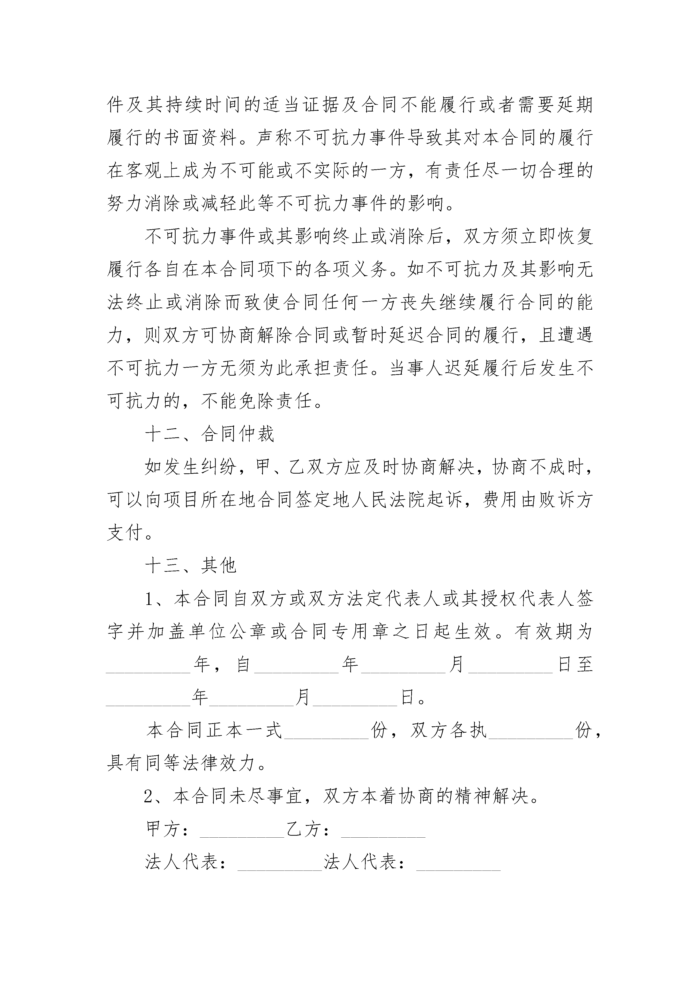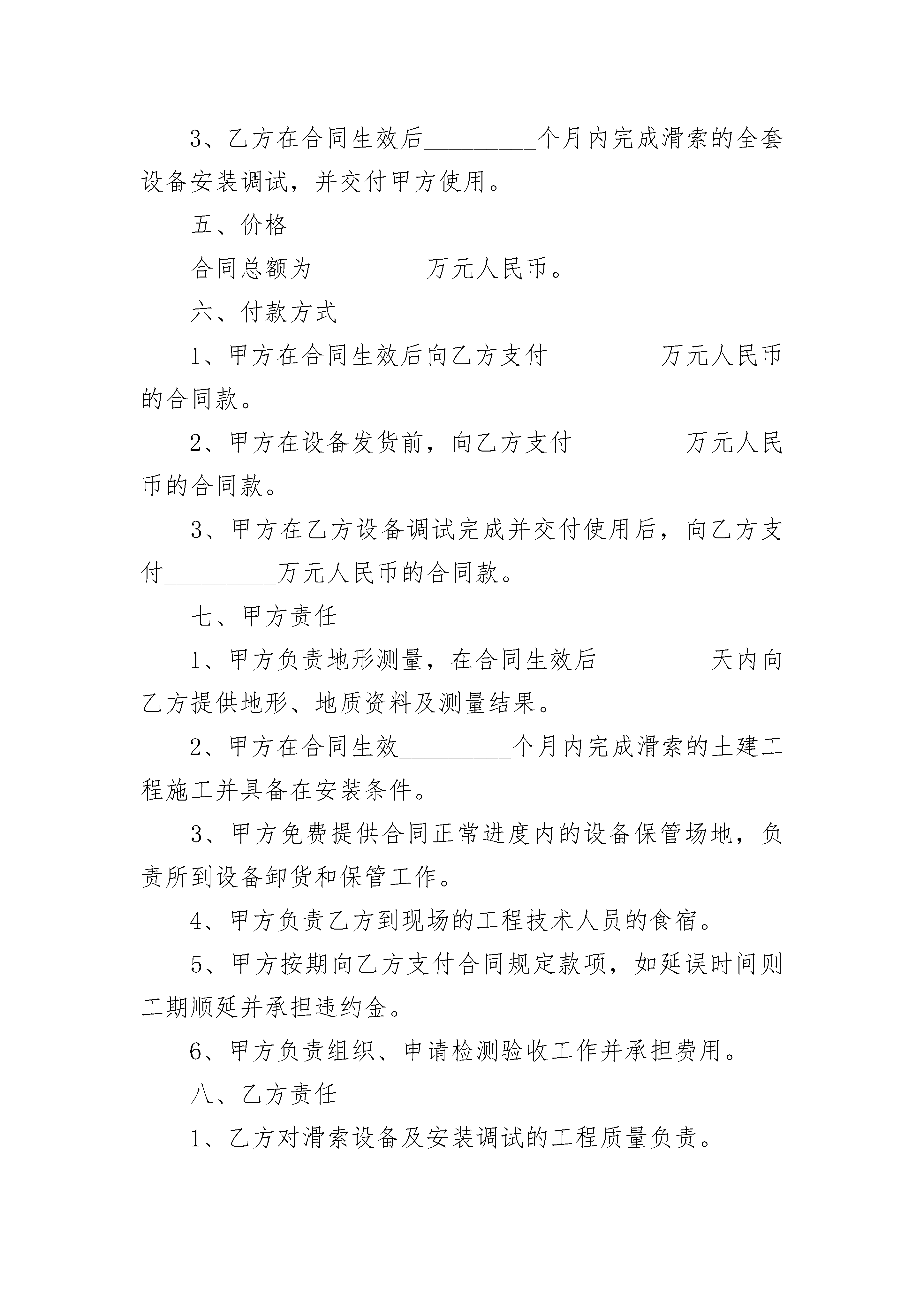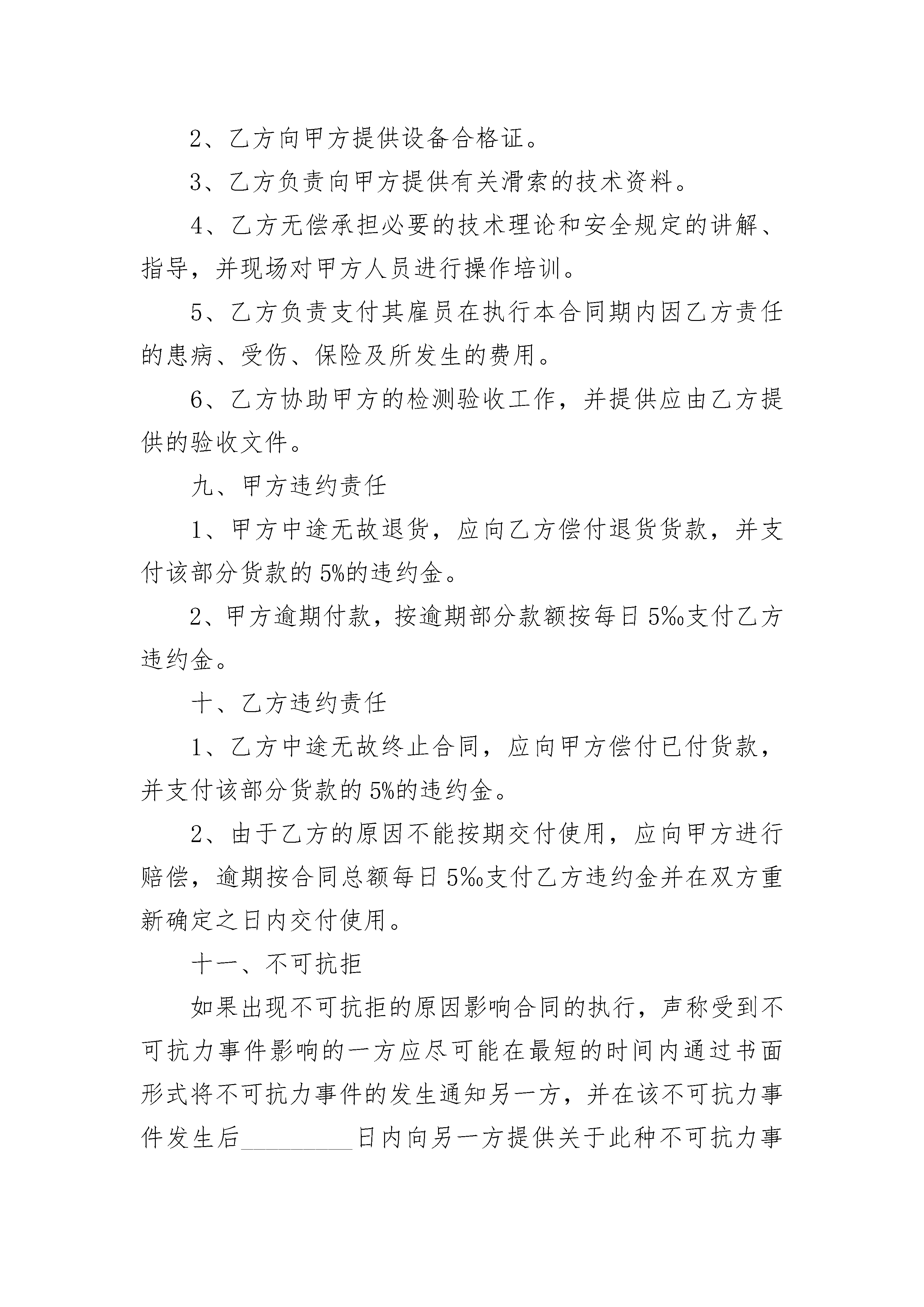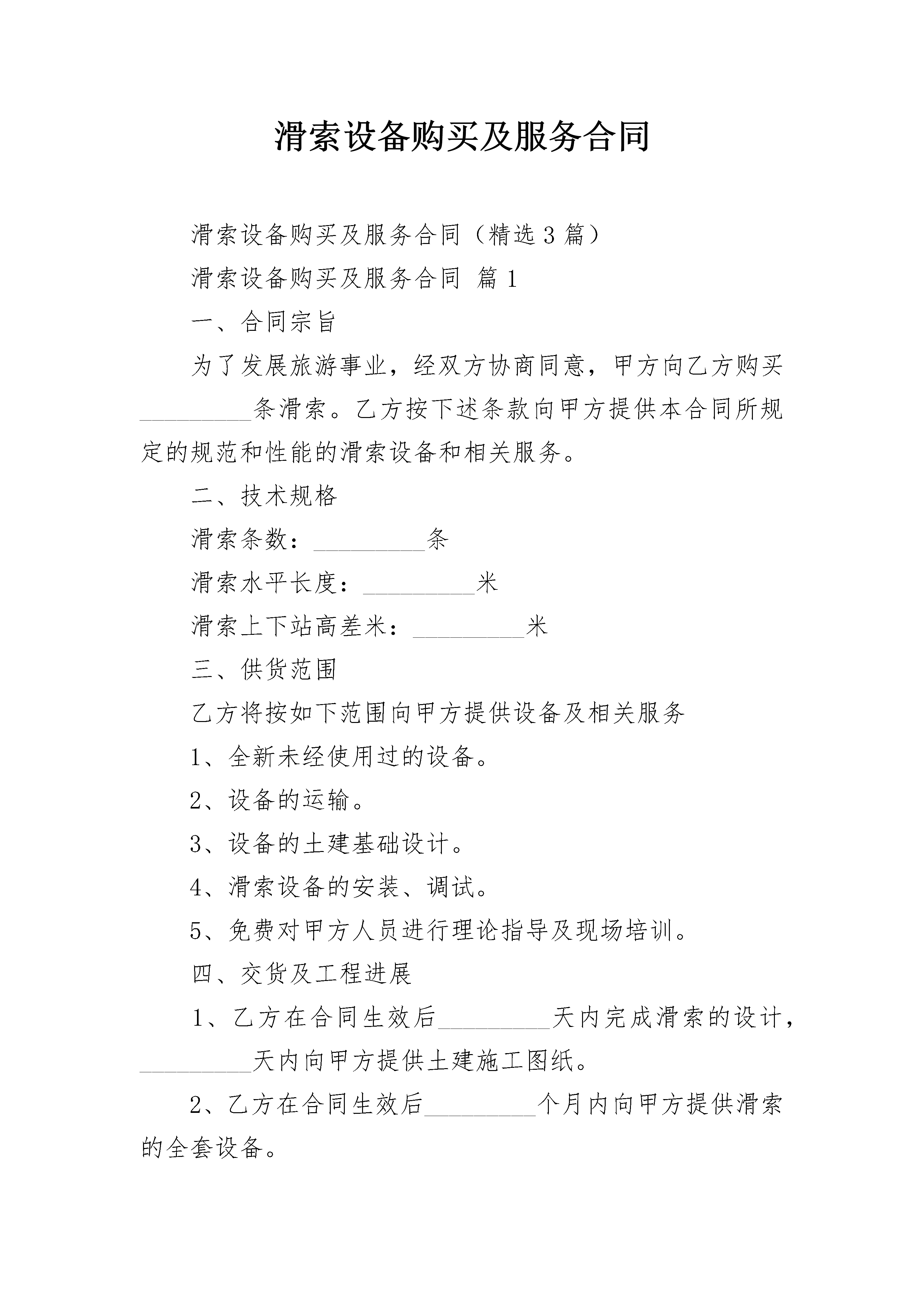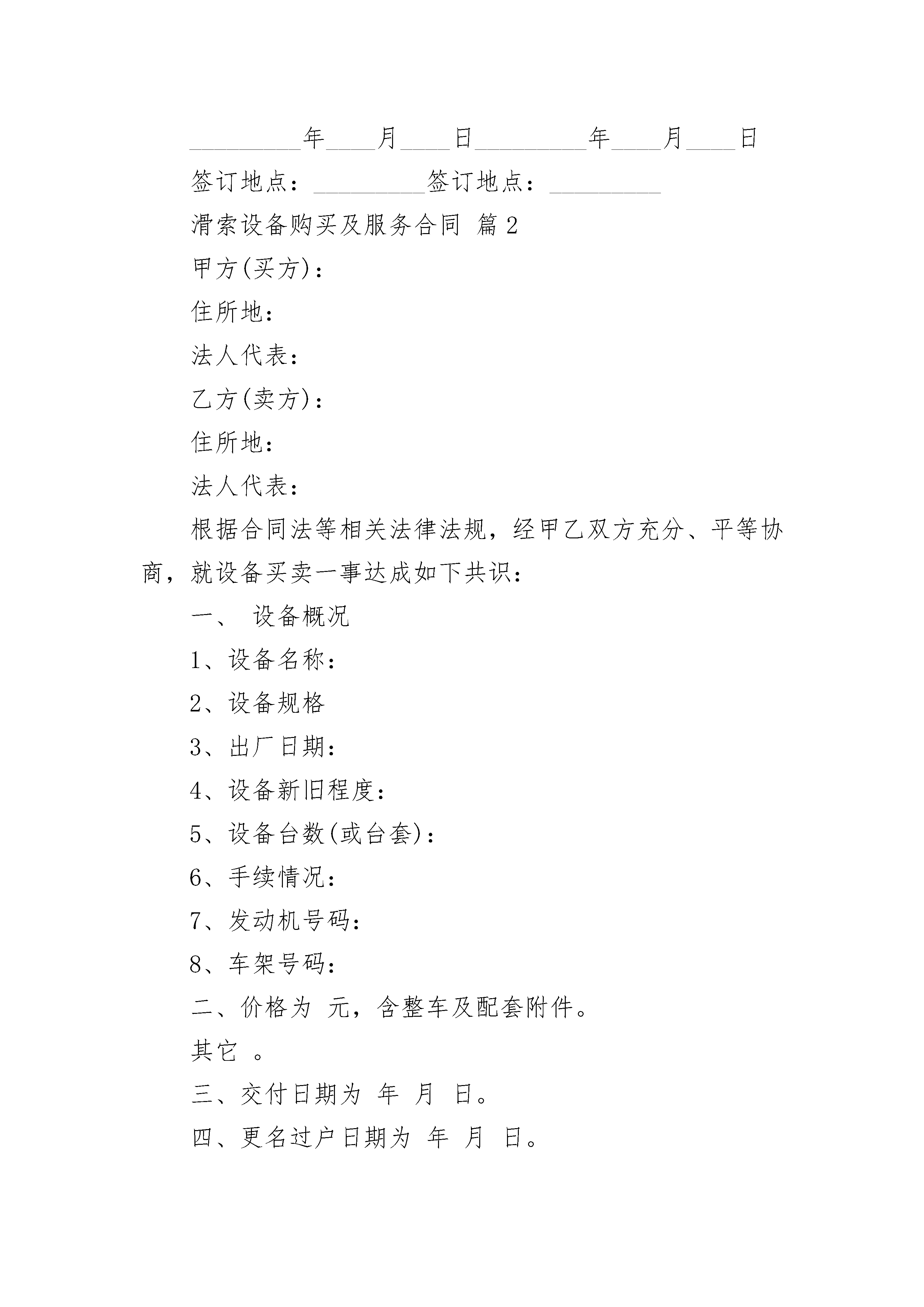 滑索设备购买及服务合同滑索设备购买及服务合同(精选3篇)滑索设备购买及服务合同篇1一、合同宗旨为了发展旅游事业,经双方协商同意,甲方向乙方购买_________条滑索。乙方按下述条款向甲方提供本合同所规定的规范和性能的滑索设备和相关服务。二、技术规格滑索条数:_________条滑索水平长度:_________米滑索上下站高差米:_________米三、供货范围乙方将按如下范围向甲方提供设备及相关服务1、全新未经使用过的设备。2、设备的运输。3、设备的土建基础设计。4、滑索设备的安装、调试。5、免费对甲方人员进行理论指导及现场培训。四、交货及工程进展1、乙方在合同生效后_________天内完成滑索的设计,_________天内向甲方提供土建施工图纸。2、乙方在合同生效后_________个月内向甲方提供滑索的全套设备。3、乙方在合同生效后_________个月内完成滑索的全套设备安装调试,并交付甲方使用。五、价格合同总额为_________万元人民币。六、付款方式1、甲方在合同生效后向乙方支付_________万元人民币的合同款。2、甲方在设备发货前,向乙方支付_________万元人民币的合同款。3、甲方在乙方设备调试完成并交付使用后,向乙方支付_________万元人民币的合同款。七、甲方责任1、甲方负责地形测量,在合同生效后_________天内向乙方提供地形、地质资料及测量结果。2、甲方在合同生效_________个月内完成滑索的土建工程施工并具备在安装条件。3、甲方免费提供合同正常进度内的设备保管场地,负责所到设备卸货和保管工作。4、甲方负责乙方到现场的工程技术人员的食宿。5、甲方按期向乙方支付合同规定款项,如延误时间则工期顺延并承担违约金。6、甲方负责组织、申请检测验收工作并承担费用。八、乙方责任1、乙方对滑索设备及安装调试的工程质量负责。2、乙方向甲方提供设备合格证。3、乙方负责向甲方提供有关滑索的技术资料。4、乙方无偿承担必要的技术理论和安全规定的讲解、指导,并现场对甲方人员进行操作培训。5、乙方负责支付其雇员在执行本合同期内因乙方责任的患病、受伤、保险及所发生的费用。6、乙方协助甲方的检测验收工作,并提供应由乙方提供的验收文件。九、甲方违约责任1、甲方中途无故退货,应向乙方偿付退货货款,并支付该部分货款的5%的违约金。2、甲方逾期付款,按逾期部分款额按每日5‰支付乙方违约金。十、乙方违约责任1、乙方中途无故终止合同,应向甲方偿付已付货款,并支付该部分货款的5%的违约金。2、由于乙方的原因不能按期交付使用,应向甲方进行赔偿,逾期按合同总额每日5‰支付乙方违约金并在双方重新确定之日内交付使用。十一、不可抗拒如果出现不可抗拒的原因影响合同的执行,声称受到不可抗力事件影响的一方应尽可能在最短的时间内通过书面形式将不可抗力事件的发生通知另一方,并在该不可抗力事件发生后_________日内向另一方提供关于此种不可抗力事件及其持续时间的适当证据及合同不能履行或者需要延期履行的书面资料。声称不可抗力事件导致其对本合同的履行在客观上成为不可能或不实际的一方,有责任尽一切合理的努力消除或减轻此等不可抗力事件的影响。不可抗力事件或其影响终止或消除后,双方须立即恢复履行各自在本合同项下的各项义务。如不可抗力及其影响无法终止或消除而致使合同任何一方丧失继续履行合同的能力,则双方可协商解除合同或暂时延迟合同的履行,且遭遇不可抗力一方无须为此承担责任。当事人迟延履行后发生不可抗力的,不能免除责任。十二、合同仲裁如发生纠纷,甲、乙双方应及时协商解决,协商不成时,可以向项目所在地合同签定地人民法院起诉,费用由败诉方支付。十三、其他1、本合同自双方或双方法定代表人或其授权代表人签字并加盖单位公章或合同专用章之日起生效。有效期为_________年,自_________年_________月_________日至_________年_________月_________日。本合同正本一式_________份,双方各执_________份,具有同等法律效力。2、本合同未尽事宜,双方本着协商的精神解决。甲方:_________乙方:_________法人代表:_________法人代表:__________________年____月____日_________年____月____日签订地点:_________签订地点:_________滑索设备购买及服务合同篇2甲方(买方):住所地:法人代表:乙方(卖方):住所地:法人代表:根据合同法等相关法律法规,经甲乙双方充分、平等协商,就设备买卖一事达成如下共识:一、设备概况1、设备名称:2、设备规格3、出厂日期:4、设备新旧程度:5、设备台数(或台套):6、手续情况:7、发动机号码:8、车架号码:二