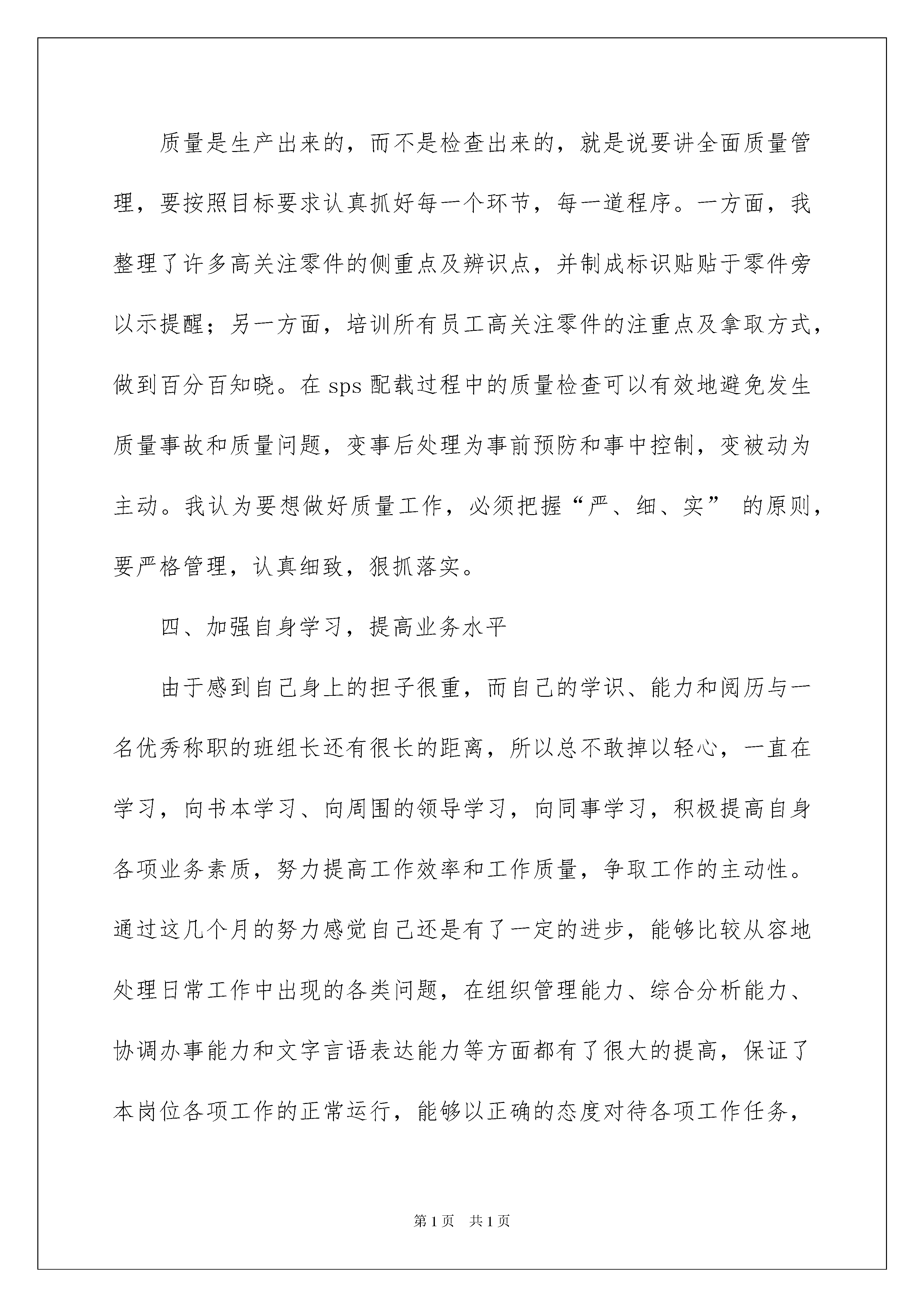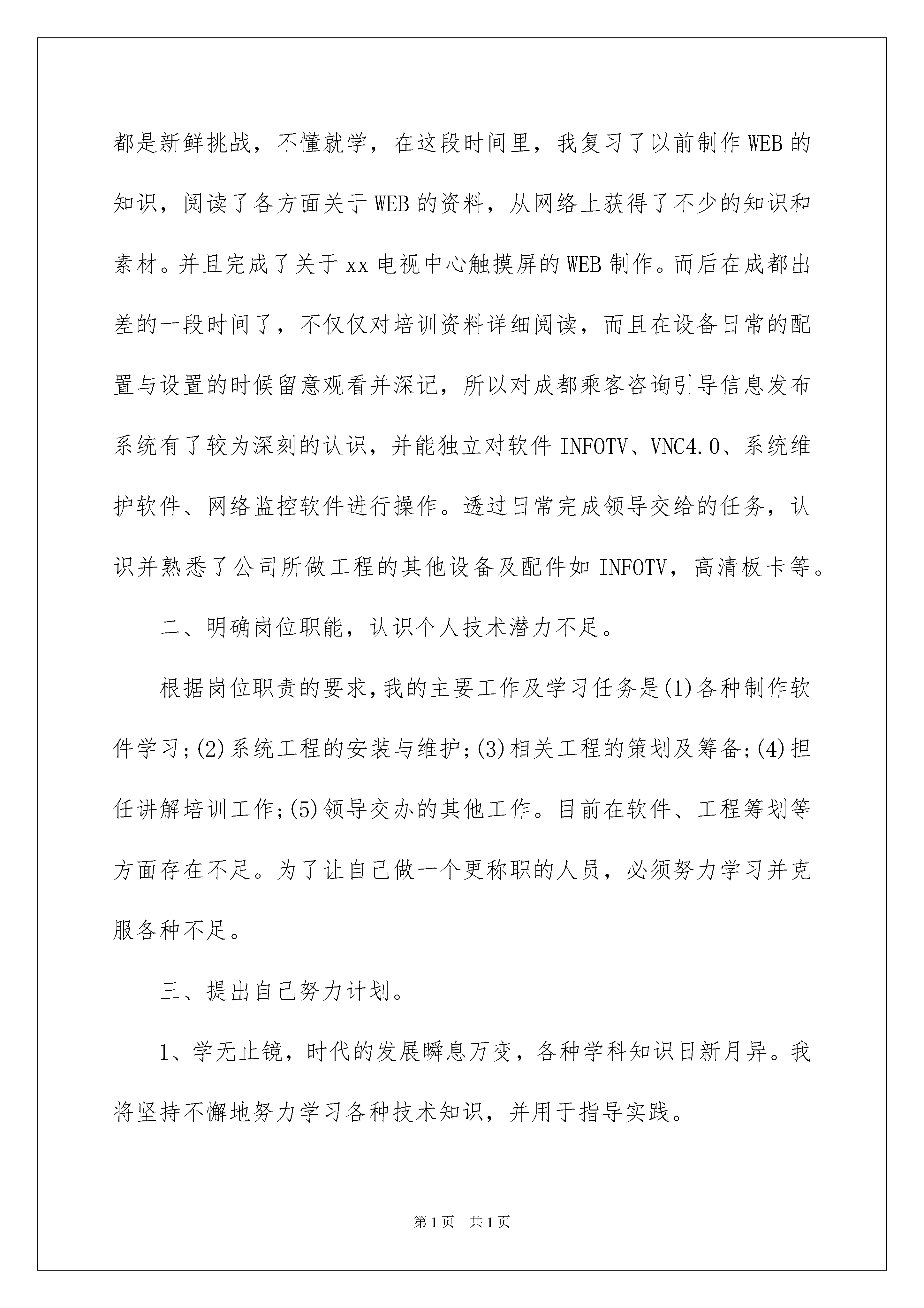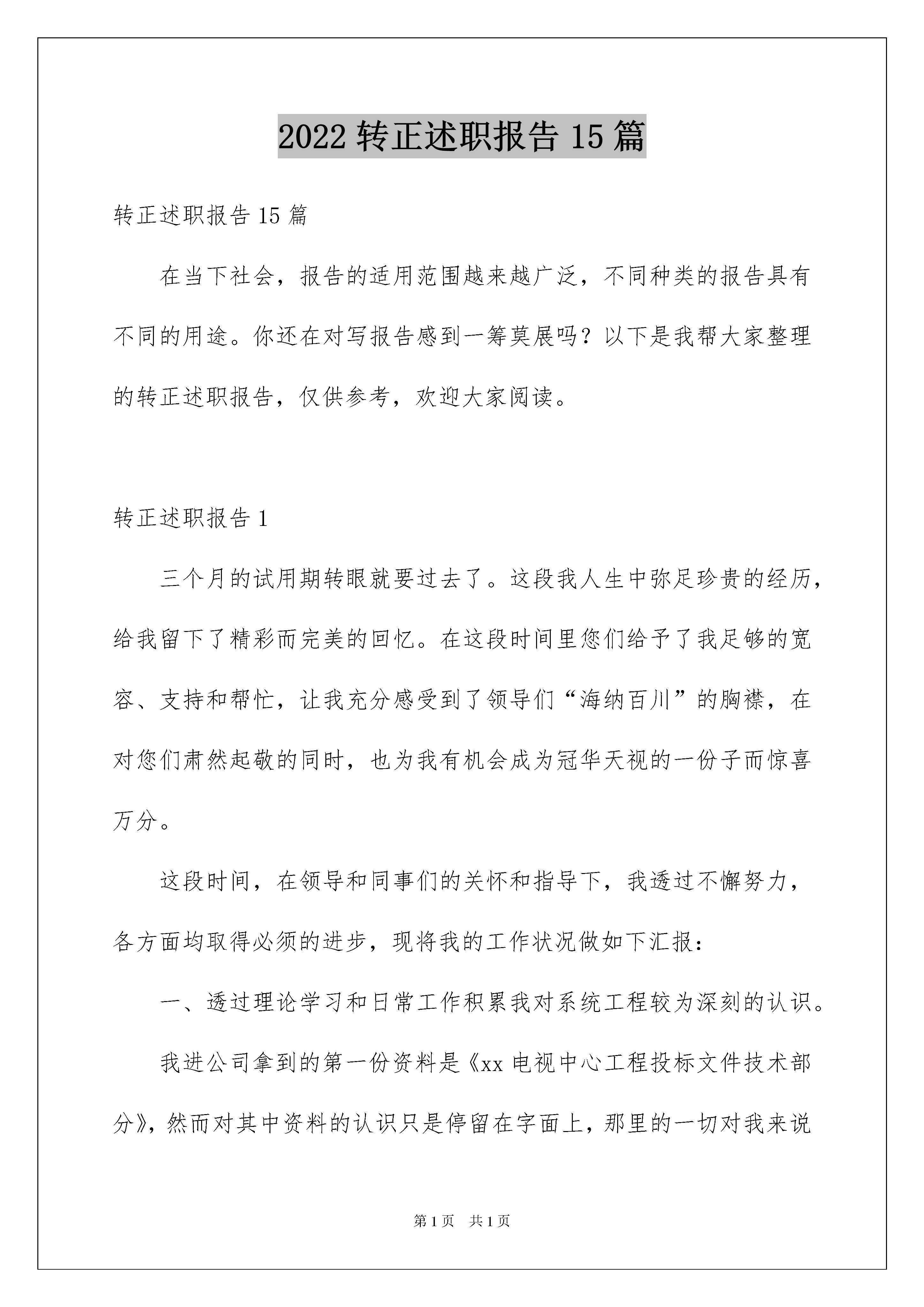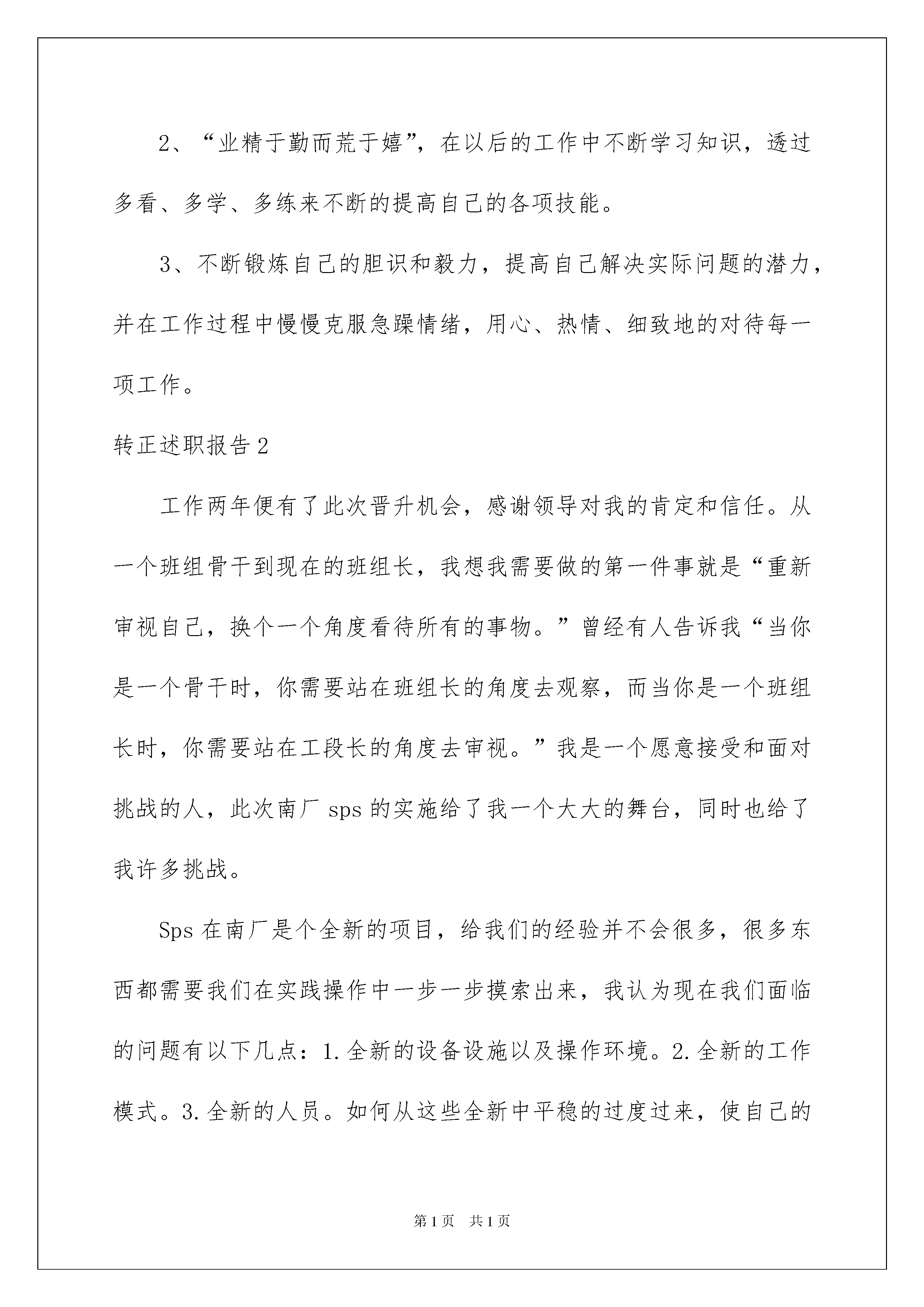 2022转正述职报告15篇转正述职报告15篇在当下社会,报告的适用范围越来越广泛,不同种类的报告具有不同的用途。你还在对写报告感到一筹莫展吗?以下是我帮大家整理的转正述职报告,仅供参考,欢迎大家阅读。转正述职报告1三个月的试用期转眼就要过去了。这段我人生中弥足珍贵的经历,给我留下了精彩而完美的回忆。在这段时间里您们给予了我足够的宽容、支持和帮忙,让我充分感受到了领导们“海纳百川”的胸襟,在对您们肃然起敬的同时,也为我有机会成为冠华天视的一份子而惊喜万分。这段时间,在领导和同事们的关怀和指导下,我透过不懈努力,各方面均取得必须的进步,现将我的工作状况做如下汇报:一、透过理论学习和日常工作积累我对系统工程较为深刻的认识。我进公司拿到的第一份资料是《xx电视中心工程投标文件技术部分》,然而对其中资料的认识只是停留在字面上,那里的一切对我来说都是新鲜挑战,不懂就学,在这段时间里,我复习了以前制作WEB的知识,阅读了各方面关于WEB的资料,从网络上获得了不少的知识和素材。并且完成了关于xx电视中心触摸屏的WEB制作。而后在成都出差的一段时间了,不仅仅对培训资料详细阅读,而且在设备日常的配置与设置的时候留意观看并深记,所以对成都乘客咨询引导信息发布系统有了较为深刻的认识,并能独立对软件INFOTV、VNC4.0、系统维护软件、网络监控软件进行操作。透过日常完成领导交给的任务,认识并熟悉了公司所做工程的其他设备及配件如INFOTV,高清板卡等。二、明确岗位职能,认识个人技术潜力不足。根据岗位职责的要求,我的主要工作及学习任务是(1)各种制作软件学习;(2)系统工程的安装与维护;(3)相关工程的策划及筹备;(4)担任讲解培训工作;(5)领导交办的其他工作。目前在软件、工程筹划等方面存在不足。为了让自己做一个更称职的人员,必须努力学习并克服各种不足。三、提出自己努力计划。1、学无止镜,时代的发展瞬息万变,各种学科知识日新月异。我将坚持不懈地努力学习各种技术知识,并用于指导实践。2、“业精于勤而荒于嬉”,在以后的工作中不断学习知识,透过多看、多学、多练来不断的提高自己的各项技能。3、不断锻炼自己的胆识和毅力,提高自己解决实际问题的潜力,并在工作过程中慢慢克服急躁情绪,用心、热情、细致地的对待每一项工作。转正述职报告2工作两年便有了此次晋升机会,感谢领导对我的肯定和信任。从一个班组骨干到现在的班组长,我想我需要做的第一件事就是“重新审视自己,换个一个角度看待所有的事物。”曾经有人告诉我“当你是一个骨干时,你需要站在班组长的角度去观察,而当你是一个班组长时,你需要站在工段长的角度去审视。”我是一个愿意接受和面对挑战的人,此次南厂sps的实施给了我一个大大的舞台,同时也给了我许多挑战。Sps在南厂是个全新的项目,给我们的经验并不会很多,很多东西都需要我们在实践操作中一步一步摸索出来,我认为现在我们面临的问题有以下几点:1.全新的设备设施以及操作环境。2.全新的工作模式。3.全新的人员。如何从这些全新中平稳的过度过来,使自己的团队成为一支有纪律的,能高效的完成任务的队伍?面对这些种种,我做了以下几点规划:一、班组的管理惩罚分明,公平公正的考核;增加班组的凝聚力,提高员工的团队精神;严格要求员工执行标准化作业,提高专业技术水平,充分调动员工的工作积极性。二、狠抓安全管理,避免事故发生“愚者用鲜血换取教训,智者用教训避免事故”。身为一班之长,虽然能力有限,但肩负着员工的生命安全的重任。首先:在组织班组日常安全培训的过程中真正做到让每一个员工时刻将安全生产牢记于心,及时总结事故的经验教训,避免类似的事件再次的发生;其次:在安全检查方面做到全程跟踪全程检查,发现有违规现象或者危险举动的立即制止;最后:发动员工一起加入危害因素的辨识,将工作场地内的所有可能发现事故风险的地方一一罗列出来,增强员工的风险意识,从而形成“人人重视安全生产,人人参与安全生产”的良好氛围。三、质量控制质量是生产出来的,而不是检查出来的,就是说要讲全面质量管理,要按照目标要求认真抓好每一个环节,每一道程序。一方面,我整理了许多高关注零件的侧重点及辨识点,并制成标识贴贴于零件旁以示提醒;另一方面,培训所有员工高关注零件的注重点及拿取方式,做到百分百知晓。在sps配载过程中的质量检查可以有效地避免发生质量事故和质量问题,变事后处理为事前预防和事中控制,变被动为主动。我认为要想做好质量工作,必须把握“严、细、实”的原则,要严格管理,认真细致,狠抓落实。四、加强自身学习,提高业务水平由于感到自己身上的担子很重,而自己的学识、能力和阅历与一名优秀