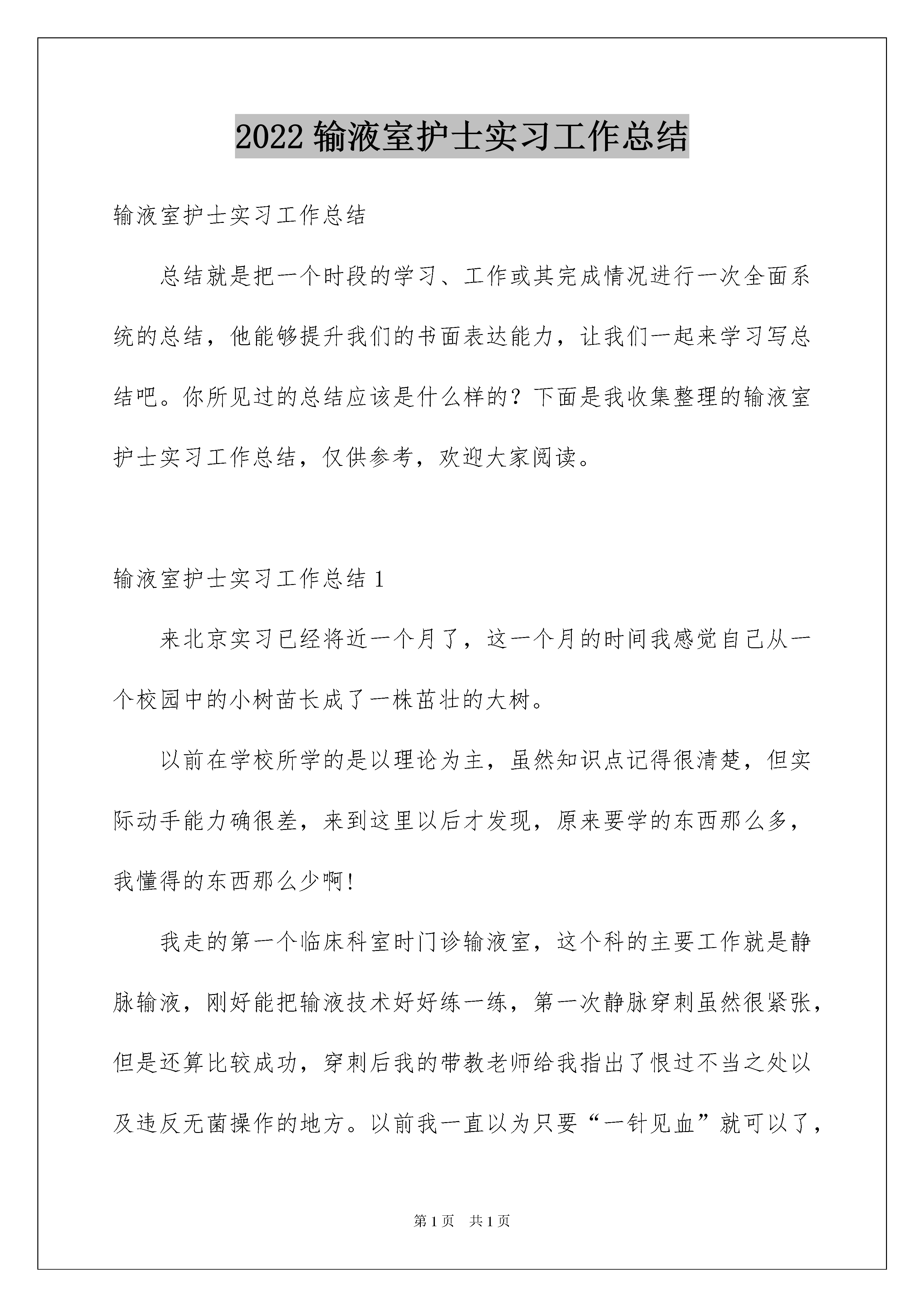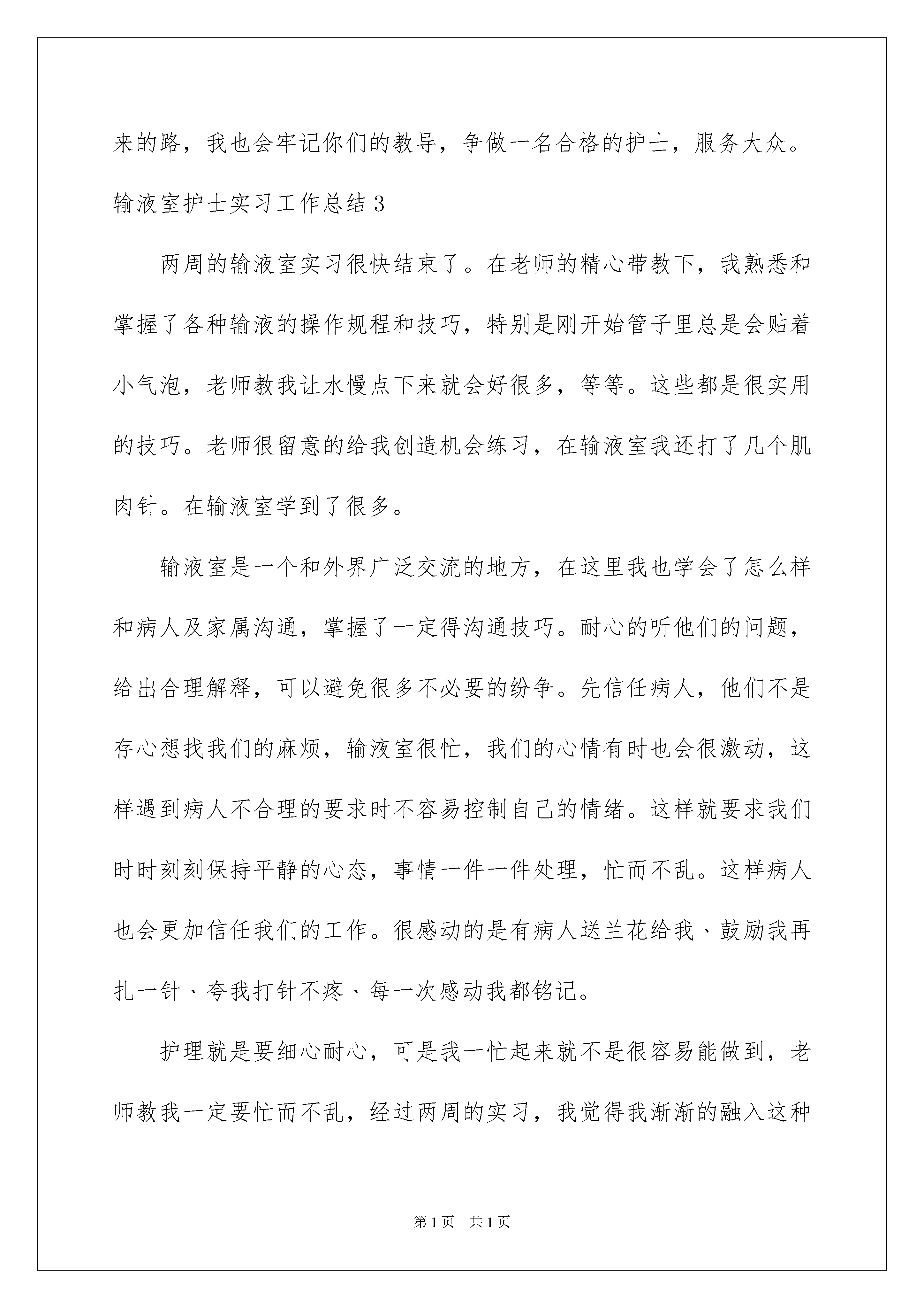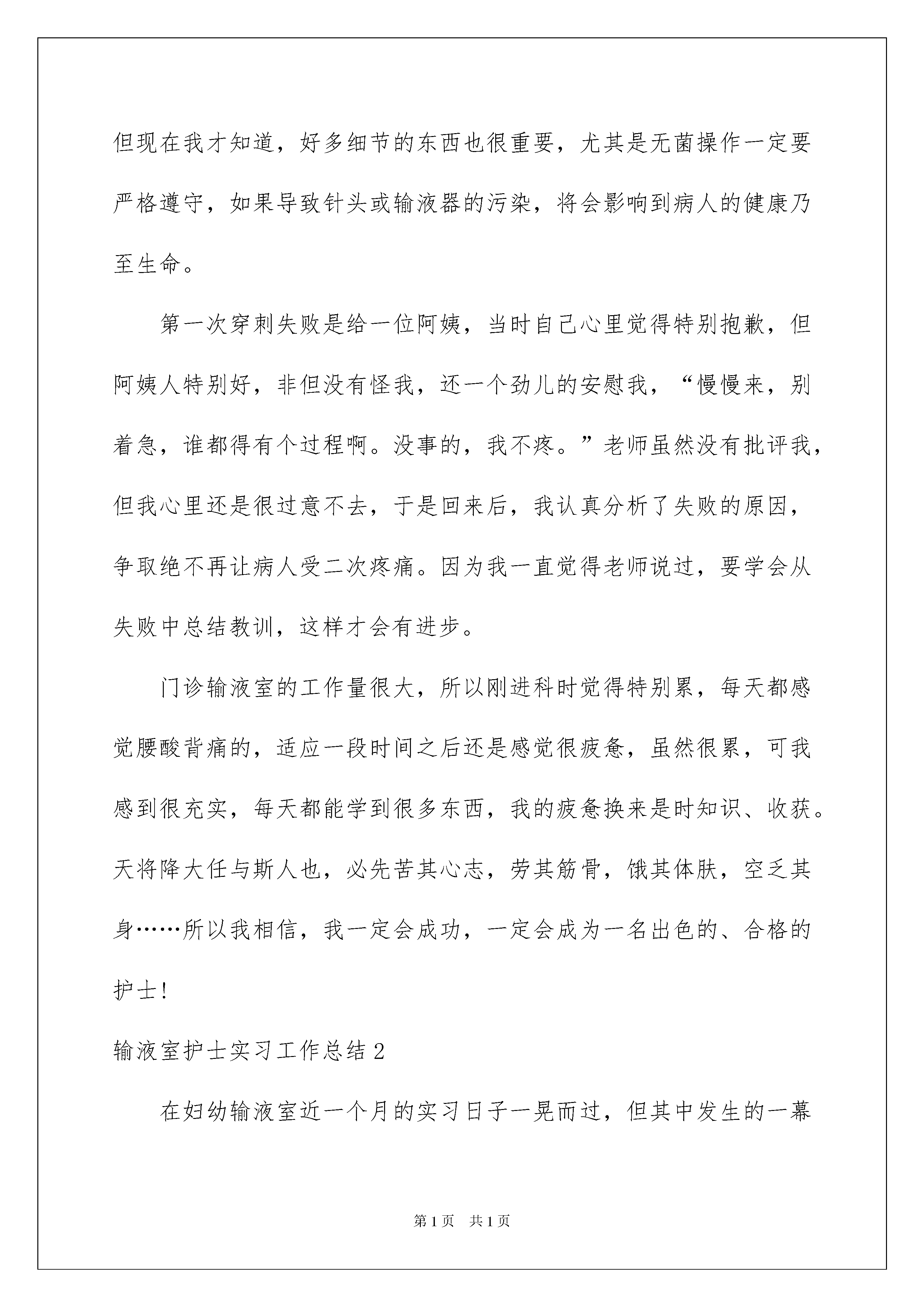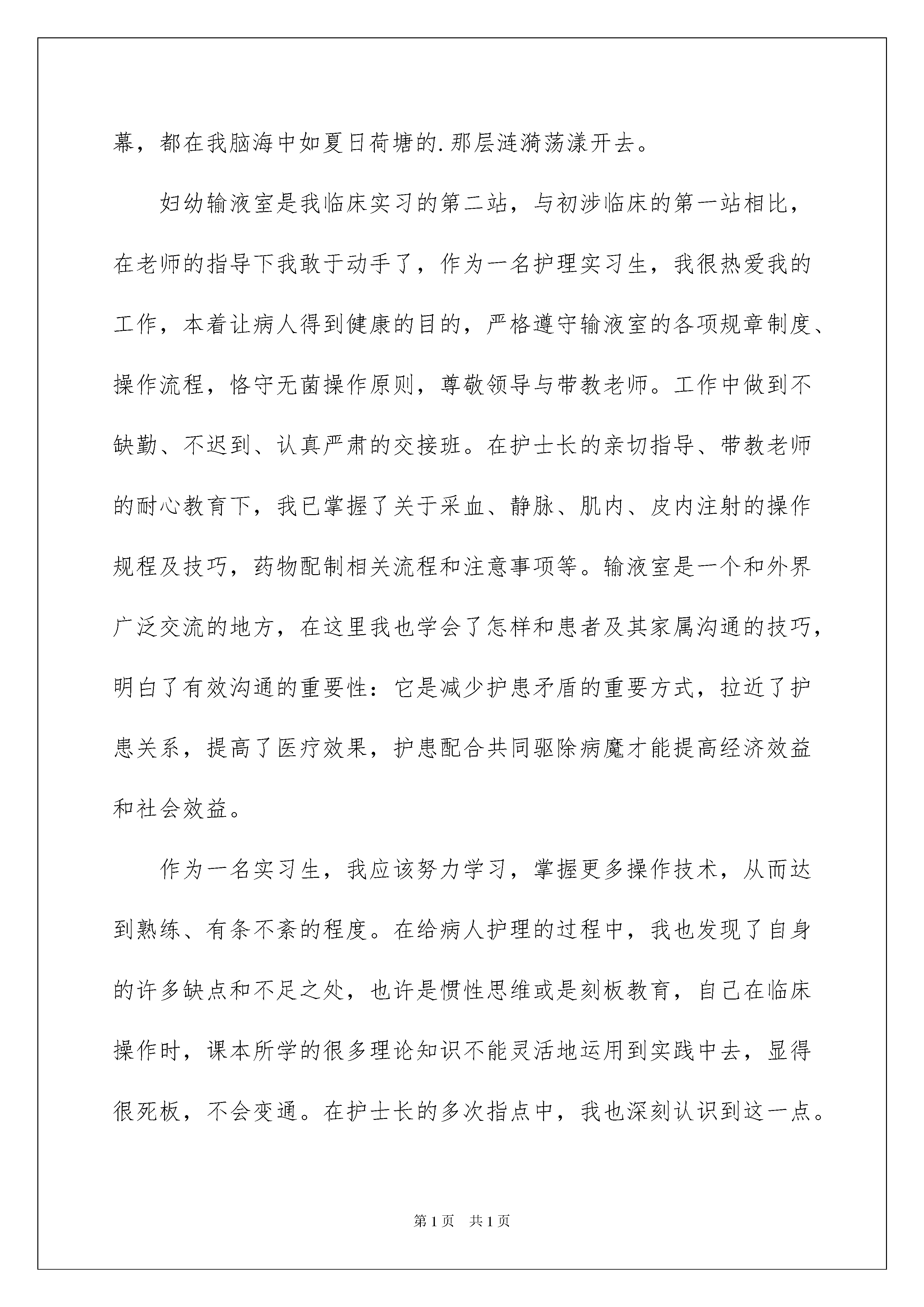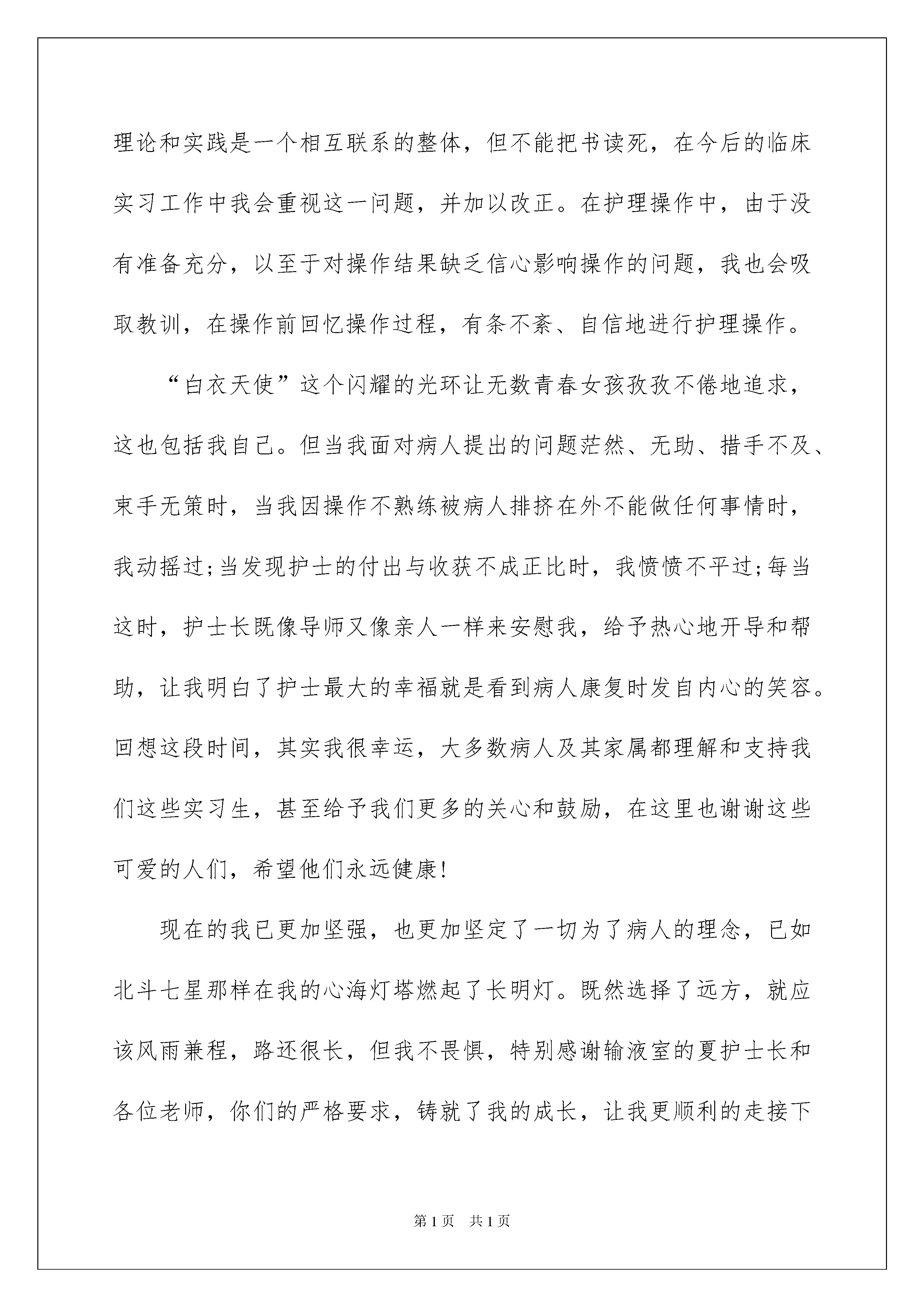 2022输液室护士实习工作总结输液室护士实习工作总结总结就是把一个时段的学习、工作或其完成情况进行一次全面系统的总结,他能够提升我们的书面表达能力,让我们一起来学习写总结吧。你所见过的总结应该是什么样的?下面是我收集整理的输液室护士实习工作总结,仅供参考,欢迎大家阅读。输液室护士实习工作总结1来北京实习已经将近一个月了,这一个月的时间我感觉自己从一个校园中的小树苗长成了一株茁壮的大树。以前在学校所学的是以理论为主,虽然知识点记得很清楚,但实际动手能力确很差,来到这里以后才发现,原来要学的东西那么多,我懂得的东西那么少啊!我走的第一个临床科室时门诊输液室,这个科的主要工作就是静脉输液,刚好能把输液技术好好练一练,第一次静脉穿刺虽然很紧张,但是还算比较成功,穿刺后我的带教老师给我指出了恨过不当之处以及违反无菌操作的地方。以前我一直以为只要“一针见血”就可以了,但现在我才知道,好多细节的东西也很重要,尤其是无菌操作一定要严格遵守,如果导致针头或输液器的污染,将会影响到病人的健康乃至生命。第一次穿刺失败是给一位阿姨,当时自己心里觉得特别抱歉,但阿姨人特别好,非但没有怪我,还一个劲儿的安慰我,“慢慢来,别着急,谁都得有个过程啊。没事的,我不疼。”老师虽然没有批评我,但我心里还是很过意不去,于是回来后,我认真分析了失败的原因,争取绝不再让病人受二次疼痛。因为我一直觉得老师说过,要学会从失败中总结教训,这样才会有进步。门诊输液室的工作量很大,所以刚进科时觉得特别累,每天都感觉腰酸背痛的,适应一段时间之后还是感觉很疲惫,虽然很累,可我感到很充实,每天都能学到很多东西,我的疲惫换来是时知识、收获。天将降大任与斯人也,必先苦其心志,劳其筋骨,饿其体肤,空乏其身……所以我相信,我一定会成功,一定会成为一名出色的、合格的护士!输液室护士实习工作总结2在妇幼输液室近一个月的实习日子一晃而过,但其中发生的一幕幕,都在我脑海中如夏日荷塘的.那层涟漪荡漾开去。妇幼输液室是我临床实习的第二站,与初涉临床的第一站相比,在老师的指导下我敢于动手了,作为一名护理实习生,我很热爱我的工作,本着让病人得到健康的目的,严格遵守输液室的各项规章制度、操作流程,恪守无菌操作原则,尊敬领导与带教老师。工作中做到不缺勤、不迟到、认真严肃的交接班。在护士长的亲切指导、带教老师的耐心教育下,我已掌握了关于采血、静脉、肌内、皮内注射的操作规程及技巧,药物配制相关流程和注意事项等。输液室是一个和外界广泛交流的地方,在这里我也学会了怎样和患者及其家属沟通的技巧,明白了有效沟通的重要性:它是减少护患矛盾的重要方式,拉近了护患关系,提高了医疗效果,护患配合共同驱除病魔才能提高经济效益和社会效益。作为一名实习生,我应该努力学习,掌握更多操作技术,从而达到熟练、有条不紊的程度。在给病人护理的过程中,我也发现了自身的许多缺点和不足之处,也许是惯性思维或是刻板教育,自己在临床操作时,课本所学的很多理论知识不能灵活地运用到实践中去,显得很死板,不会变通。在护士长的多次指点中,我也深刻认识到这一点。理论和实践是一个相互联系的整体,但不能把书读死,在今后的临床实习工作中我会重视这一问题,并加以改正。在护理操作中,由于没有准备充分,以至于对操作结果缺乏信心影响操作的问题,我也会吸取教训,在操作前回忆操作过程,有条不紊、自信地进行护理操作。“白衣天使”这个闪耀的光环让无数青春女孩孜孜不倦地追求,这也包括我自己。但当我面对病人提出的问题茫然、无助、措手不及、束手无策时,当我因操作不熟练被病人排挤在外不能做任何事情时,我动摇过;当发现护士的付出与收获不成正比时,我愤愤不平过;每当这时,护士长既像导师又像亲人一样来安慰我,给予热心地开导和帮助,让我明白了护士最大的幸福就是看到病人康复时发自内心的笑容。回想这段时间,其实我很幸运,大多数病人及其家属都理解和支持我们这些实习生,甚至给予我们更多的关心和鼓励,在这里也谢谢这些可爱的人们,希望他们永远健康!现在的我已更加坚强,也更加坚定了一切为了病人的理念,已如北斗七星那样在我的心海灯塔燃起了长明灯。既然选择了远方,就应该风雨兼程,路还很长,但我不畏惧,特别感谢输液室的夏护士长和各位老师,你们的严格要求,铸就了我的成长,让我更顺利的走接下来的路,我也会牢记你们的教导,争做一名合格的护士,服务大众。输液室护士实习工作总结3两周的输液室实习很快结束了。在老师的精心带教下,我熟悉和掌握了各种输液的操作规程和技巧,特别是刚开始管子里总是会贴着小气泡,老师教我让水慢点下来就会好很多,等等。这些都是很实用的技巧。老师很留意的给我创造