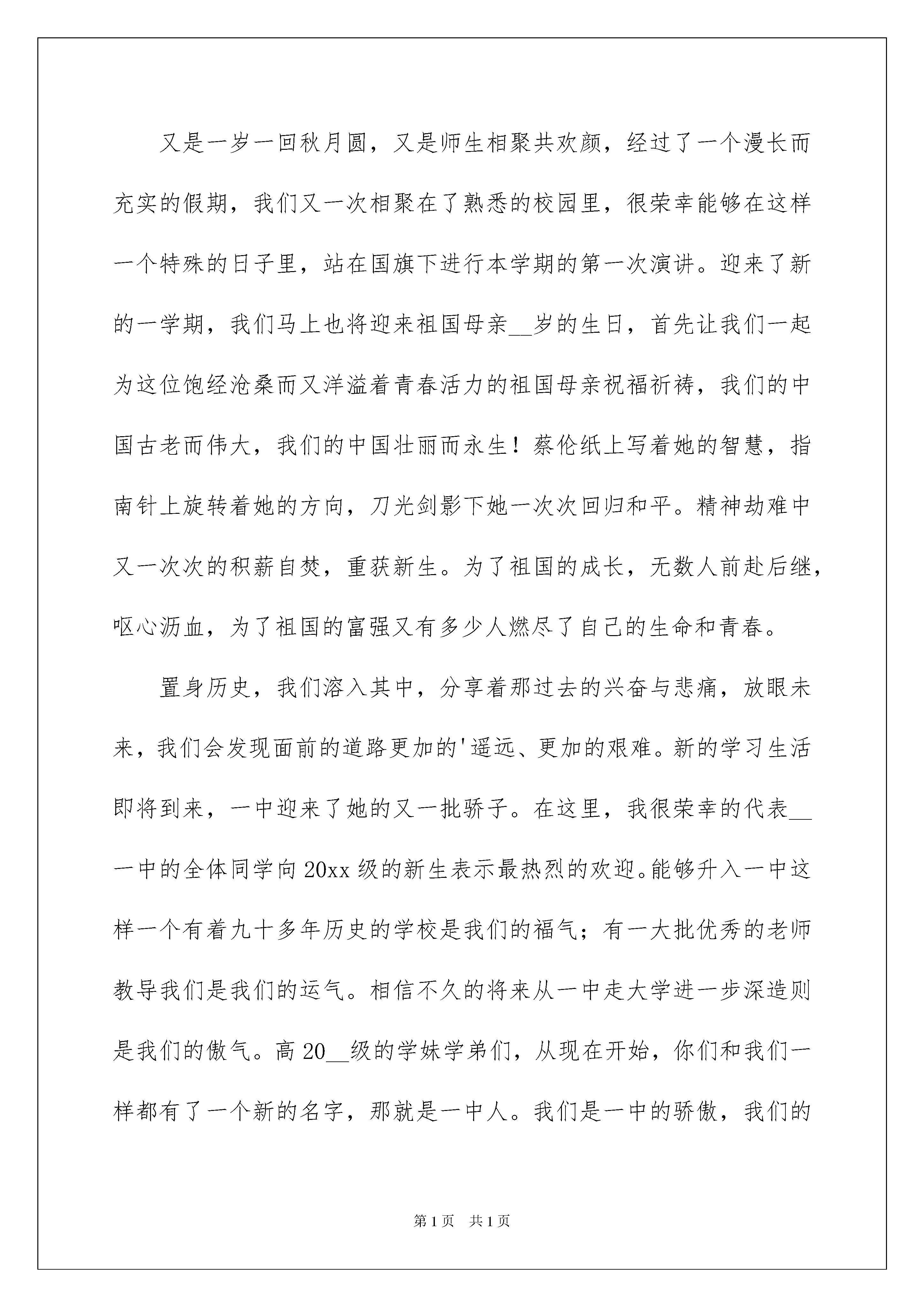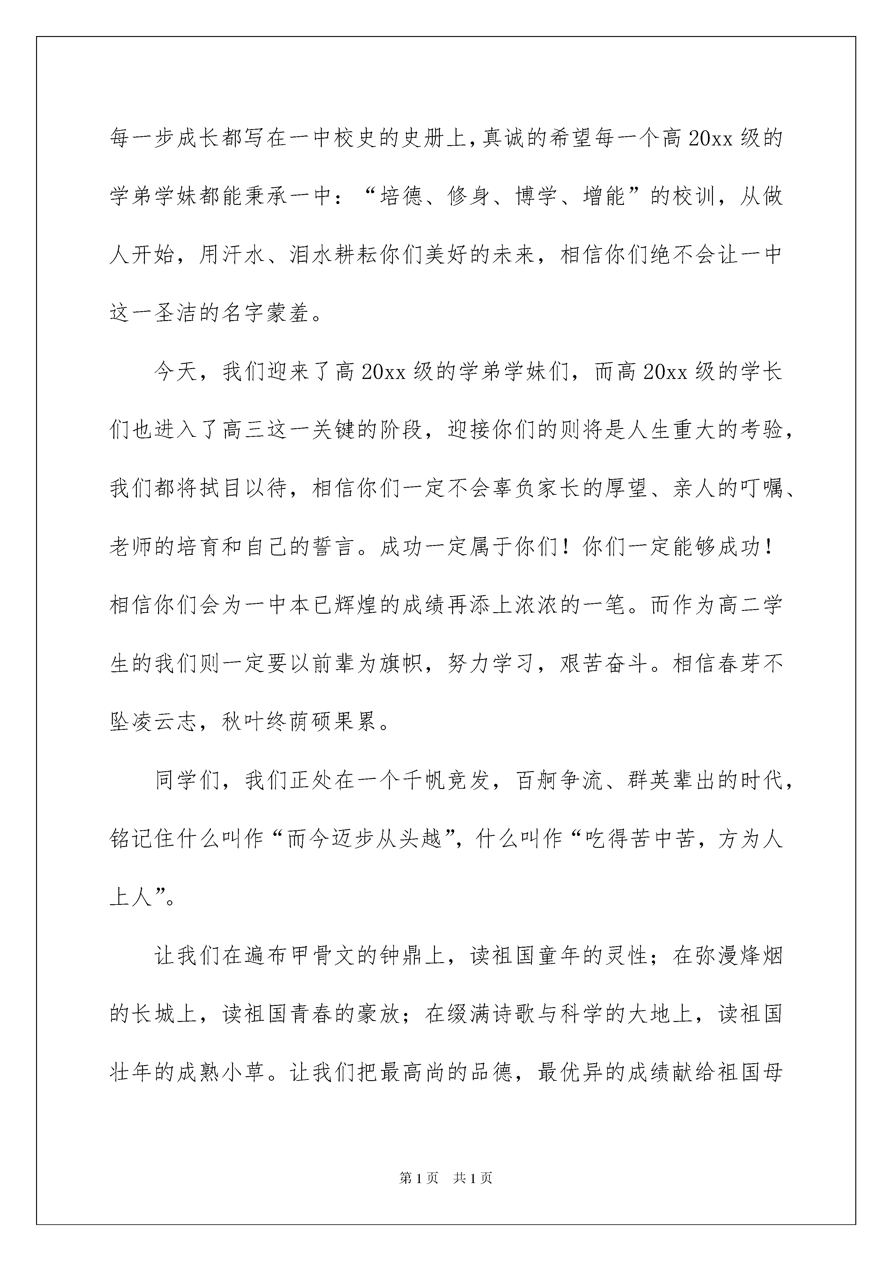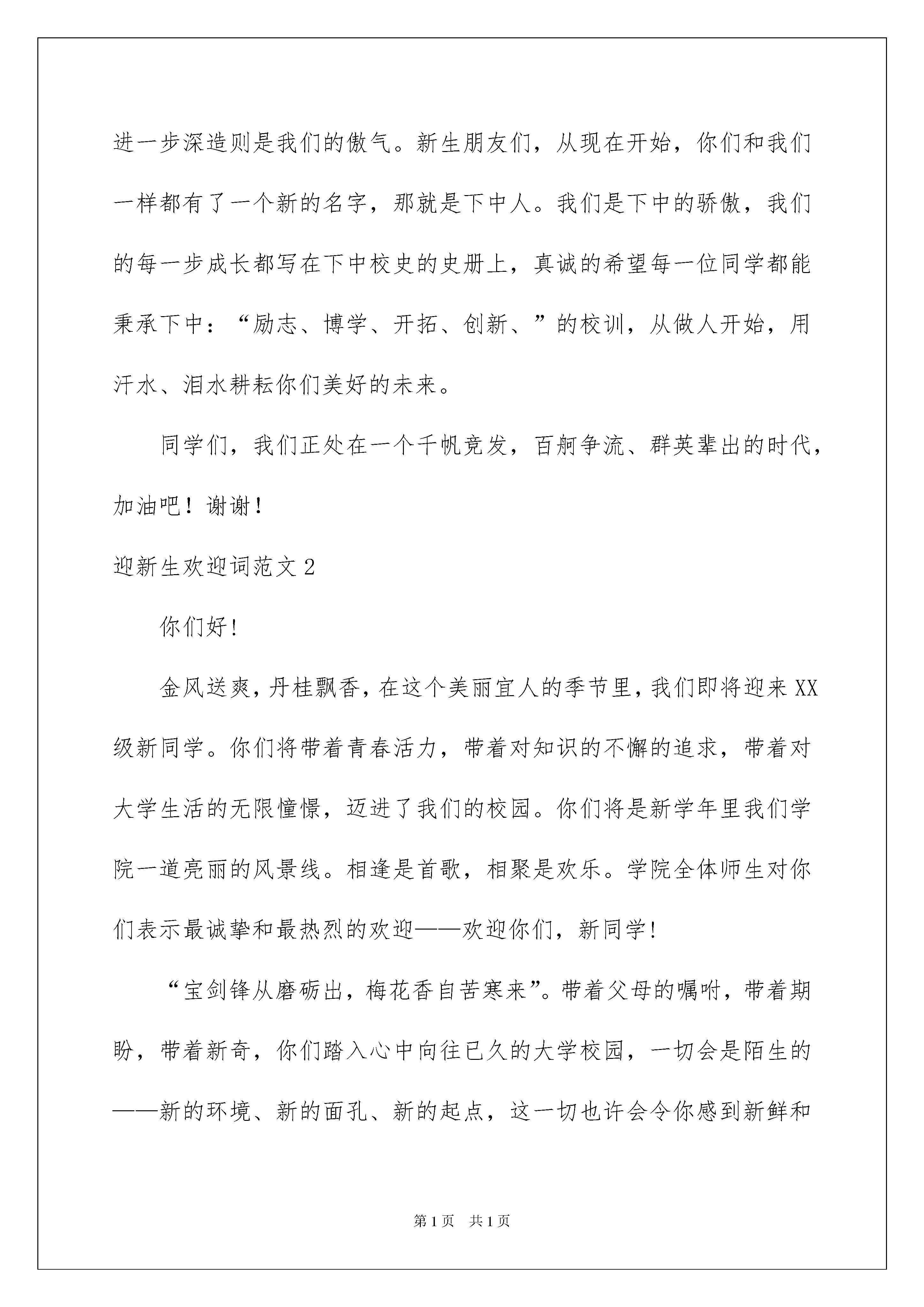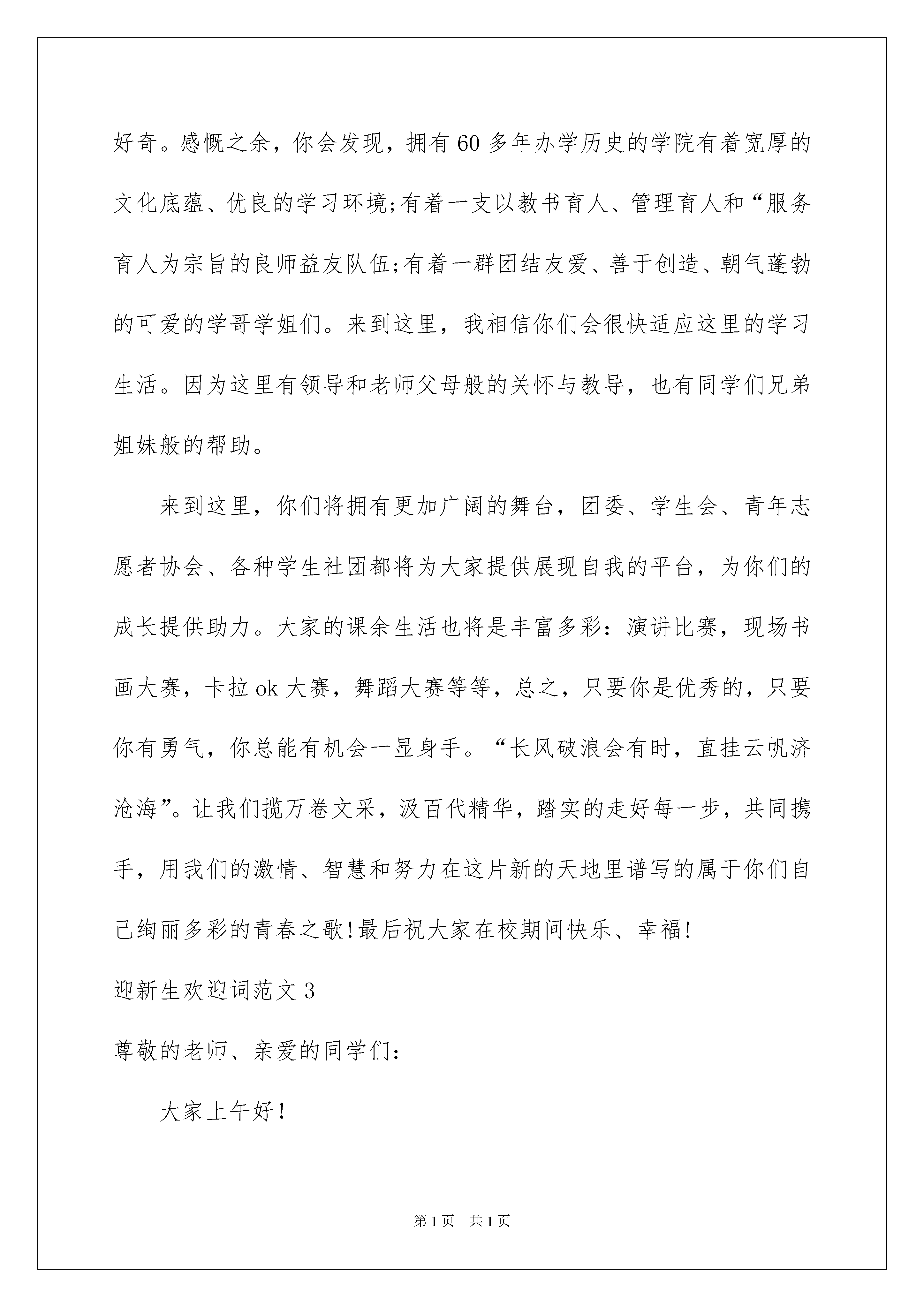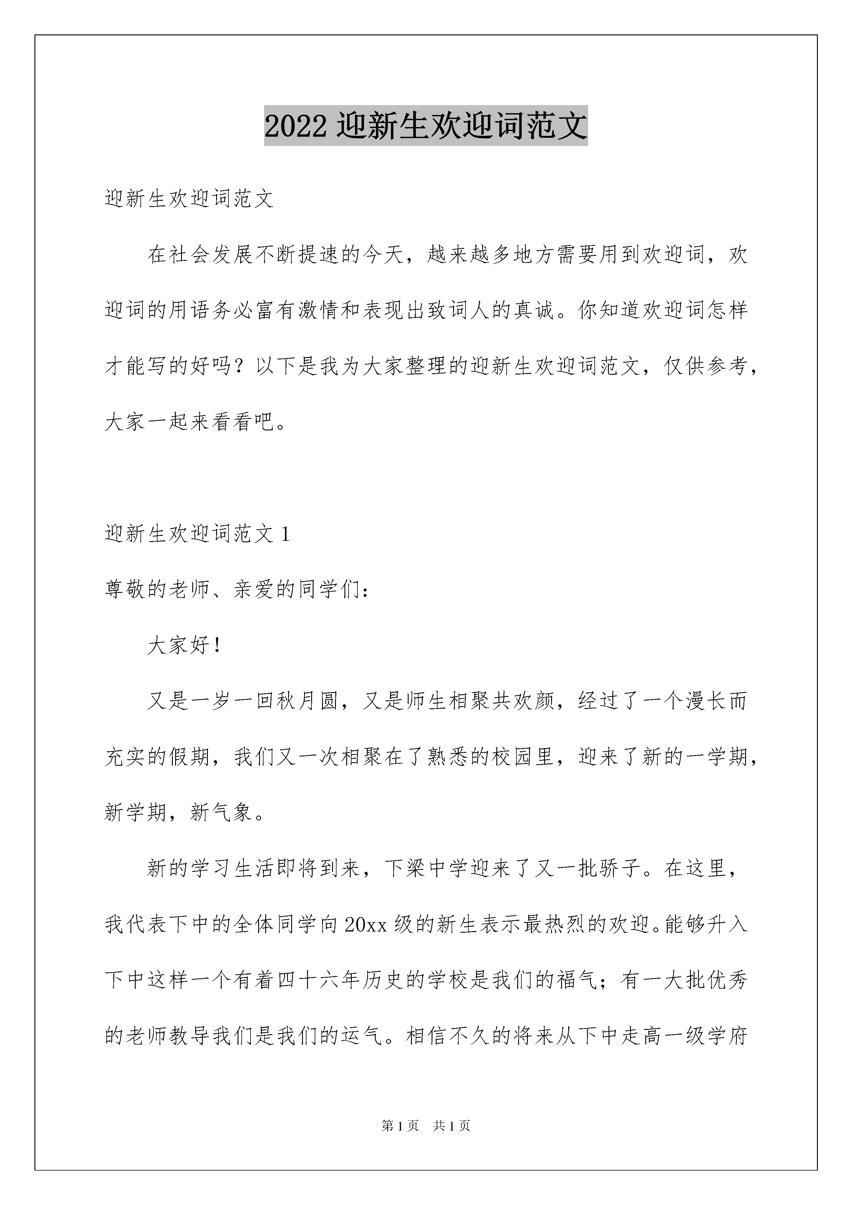 2022迎新生欢迎词范文迎新生欢迎词范文在社会发展不断提速的今天,越来越多地方需要用到欢迎词,欢迎词的用语务必富有激情和表现出致词人的真诚。你知道欢迎词怎样才能写的好吗?以下是我为大家整理的迎新生欢迎词范文,仅供参考,大家一起来看看吧。迎新生欢迎词范文1尊敬的老师、亲爱的同学们:大家好!又是一岁一回秋月圆,又是师生相聚共欢颜,经过了一个漫长而充实的假期,我们又一次相聚在了熟悉的校园里,迎来了新的一学期,新学期,新气象。新的学习生活即将到来,下梁中学迎来了又一批骄子。在这里,我代表下中的全体同学向20xx级的新生表示最热烈的欢迎。能够升入下中这样一个有着四十六年历史的学校是我们的福气;有一大批优秀的老师教导我们是我们的运气。相信不久的将来从下中走高一级学府进一步深造则是我们的傲气。新生朋友们,从现在开始,你们和我们一样都有了一个新的名字,那就是下中人。我们是下中的骄傲,我们的每一步成长都写在下中校史的史册上,真诚的希望每一位同学都能秉承下中:“励志、博学、开拓、创新、”的校训,从做人开始,用汗水、泪水耕耘你们美好的未来。同学们,我们正处在一个千帆竞发,百舸争流、群英辈出的时代,加油吧!谢谢!迎新生欢迎词范文2你们好!金风送爽,丹桂飘香,在这个美丽宜人的季节里,我们即将迎来XX级新同学。你们将带着青春活力,带着对知识的不懈的追求,带着对大学生活的无限憧憬,迈进了我们的校园。你们将是新学年里我们学院一道亮丽的风景线。相逢是首歌,相聚是欢乐。学院全体师生对你们表示最诚挚和最热烈的欢迎——欢迎你们,新同学!“宝剑锋从磨砺出,梅花香自苦寒来”。带着父母的嘱咐,带着期盼,带着新奇,你们踏入心中向往已久的大学校园,一切会是陌生的——新的环境、新的面孔、新的起点,这一切也许会令你感到新鲜和好奇。感慨之余,你会发现,拥有60多年办学历史的学院有着宽厚的文化底蕴、优良的学习环境;有着一支以教书育人、管理育人和“服务育人为宗旨的良师益友队伍;有着一群团结友爱、善于创造、朝气蓬勃的可爱的学哥学姐们。来到这里,我相信你们会很快适应这里的学习生活。因为这里有领导和老师父母般的关怀与教导,也有同学们兄弟姐妹般的帮助。来到这里,你们将拥有更加广阔的舞台,团委、学生会、青年志愿者协会、各种学生社团都将为大家提供展现自我的平台,为你们的成长提供助力。大家的课余生活也将是丰富多彩:演讲比赛,现场书画大赛,卡拉ok大赛,舞蹈大赛等等,总之,只要你是优秀的,只要你有勇气,你总能有机会一显身手。“长风破浪会有时,直挂云帆济沧海”。让我们揽万卷文采,汲百代精华,踏实的走好每一步,共同携手,用我们的激情、智慧和努力在这片新的天地里谱写的属于你们自己绚丽多彩的青春之歌!最后祝大家在校期间快乐、幸福!迎新生欢迎词范文3尊敬的老师、亲爱的同学们:大家上午好!又是一岁一回秋月圆,又是师生相聚共欢颜,经过了一个漫长而充实的假期,我们又一次相聚在了熟悉的校园里,很荣幸能够在这样一个特殊的日子里,站在国旗下进行本学期的第一次演讲。迎来了新的一学期,我们马上也将迎来祖国母亲__岁的生日,首先让我们一起为这位饱经沧桑而又洋溢着青春活力的祖国母亲祝福祈祷,我们的中国古老而伟大,我们的中国壮丽而永生!蔡伦纸上写着她的智慧,指南针上旋转着她的方向,刀光剑影下她一次次回归和平。精神劫难中又一次次的积薪自焚,重获新生。为了祖国的成长,无数人前赴后继,呕心沥血,为了祖国的富强又有多少人燃尽了自己的生命和青春。置身历史,我们溶入其中,分享着那过去的兴奋与悲痛,放眼未来,我们会发现面前的道路更加的'遥远、更加的艰难。新的学习生活即将到来,一中迎来了她的又一批骄子。在这里,我很荣幸的代表__一中的全体同学向20xx级的新生表示最热烈的欢迎。能够升入一中这样一个有着九十多年历史的学校是我们的福气;有一大批优秀的老师教导我们是我们的运气。相信不久的将来从一中走大学进一步深造则是我们的傲气。高20__级的学妹学弟们,从现在开始,你们和我们一样都有了一个新的名字,那就是一中人。我们是一中的骄傲,我们的每一步成长都写在一中校史的史册上,真诚的希望每一个高20xx级的学弟学妹都能秉承一中:“培德、修身、博学、增能”的校训,从做人开始,用汗水、泪水耕耘你们美好的未来,相信你们绝不会让一中这一圣洁的名字蒙羞。今天,我们迎来了高20xx级的学弟学妹们,而高20xx级的学长们也进入了高三这一关键的阶段,迎接你们的则将是人生重大的考验,我们都将拭目以待,相信你们一定不会辜负家长的厚望、亲人的叮嘱、老师的培育和自己的誓言。成功一定属于你们!你们一定能够成功!相信你们会为一中本已辉