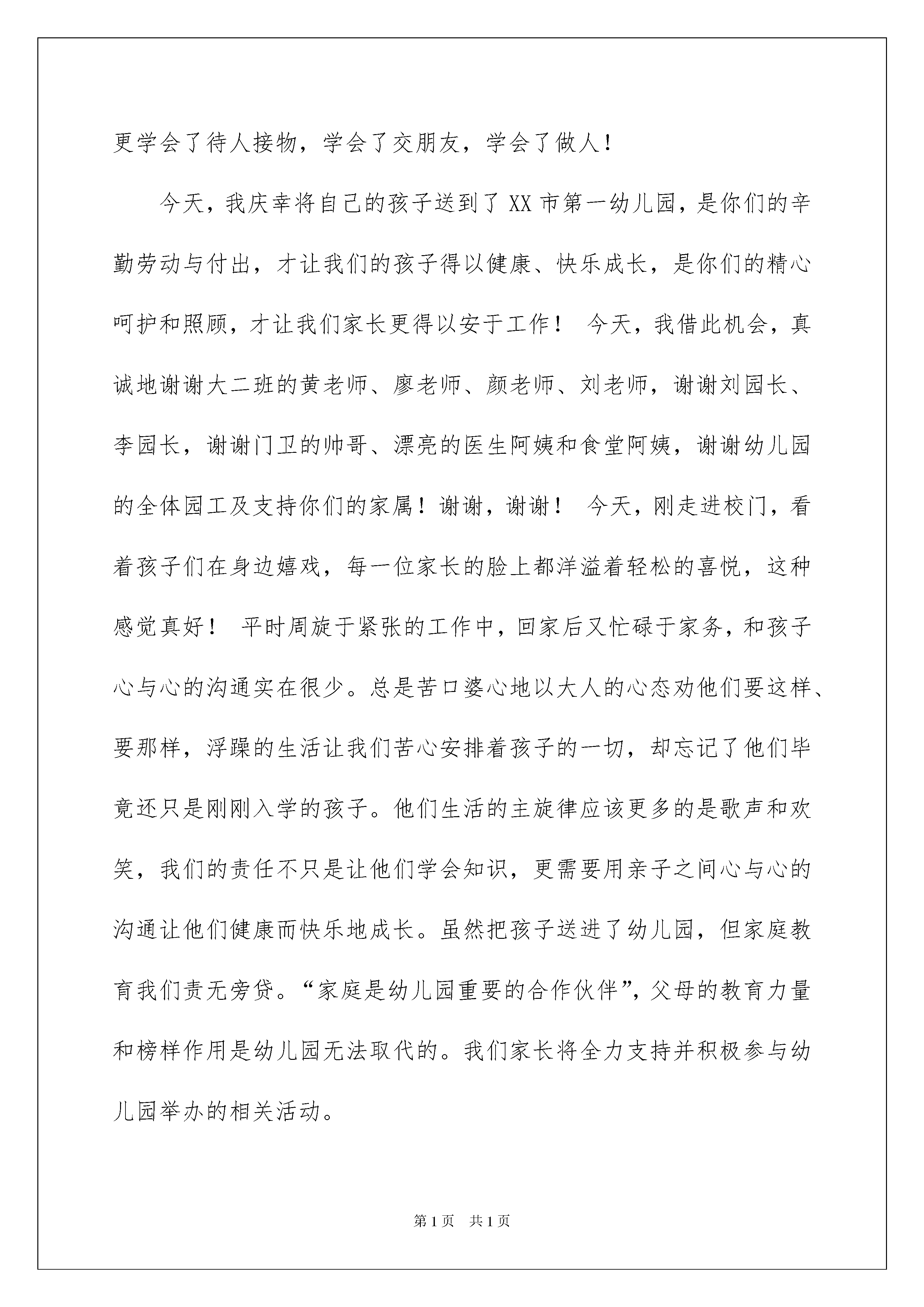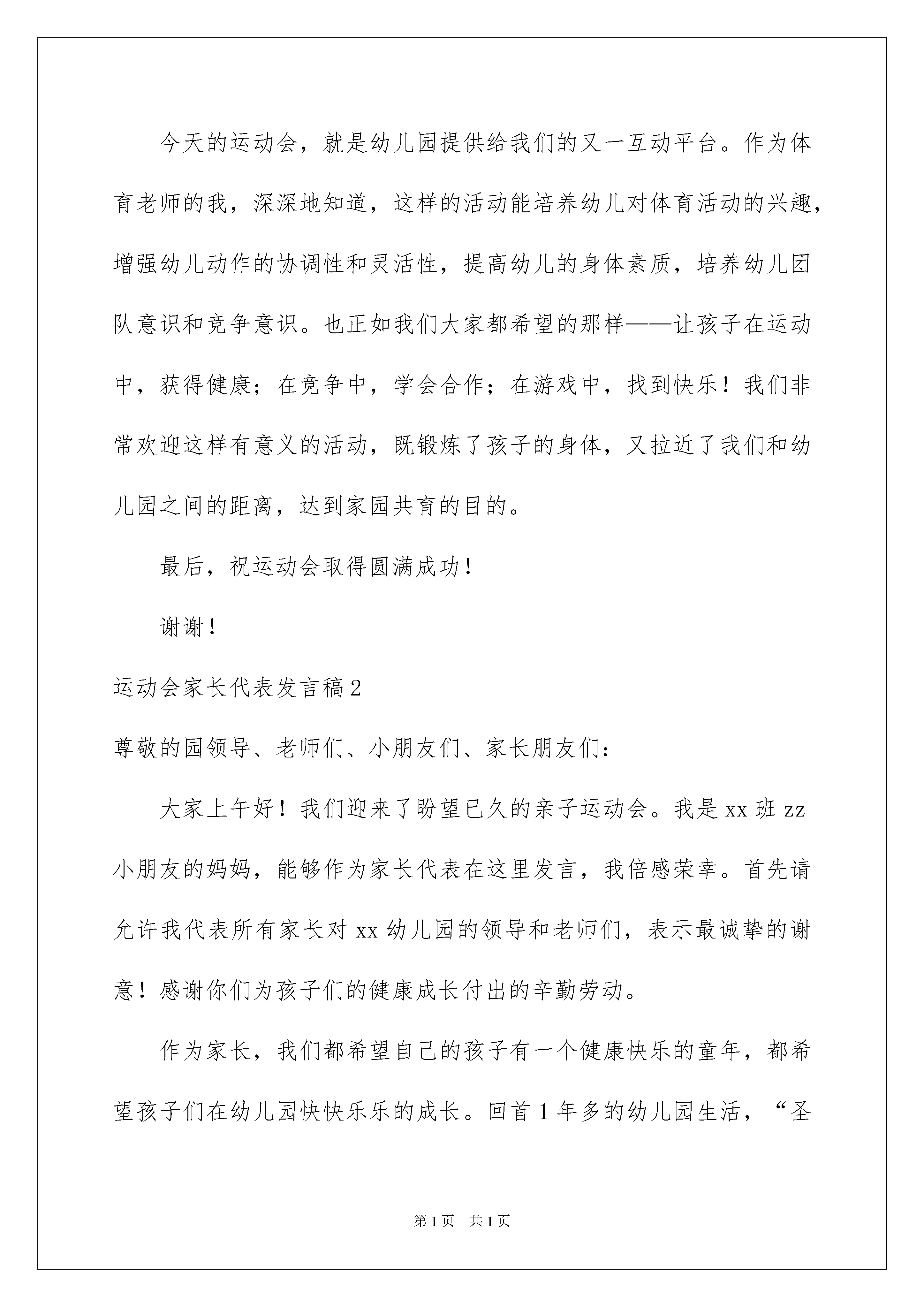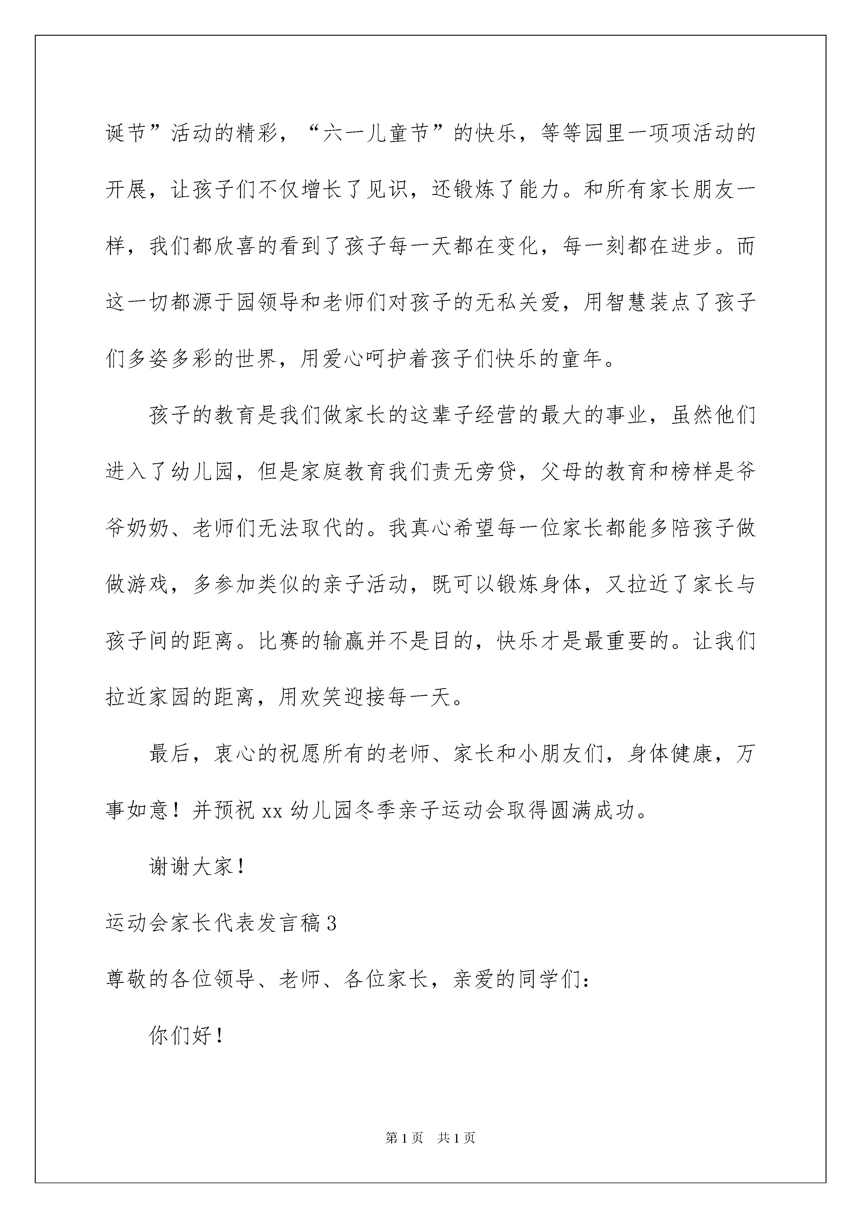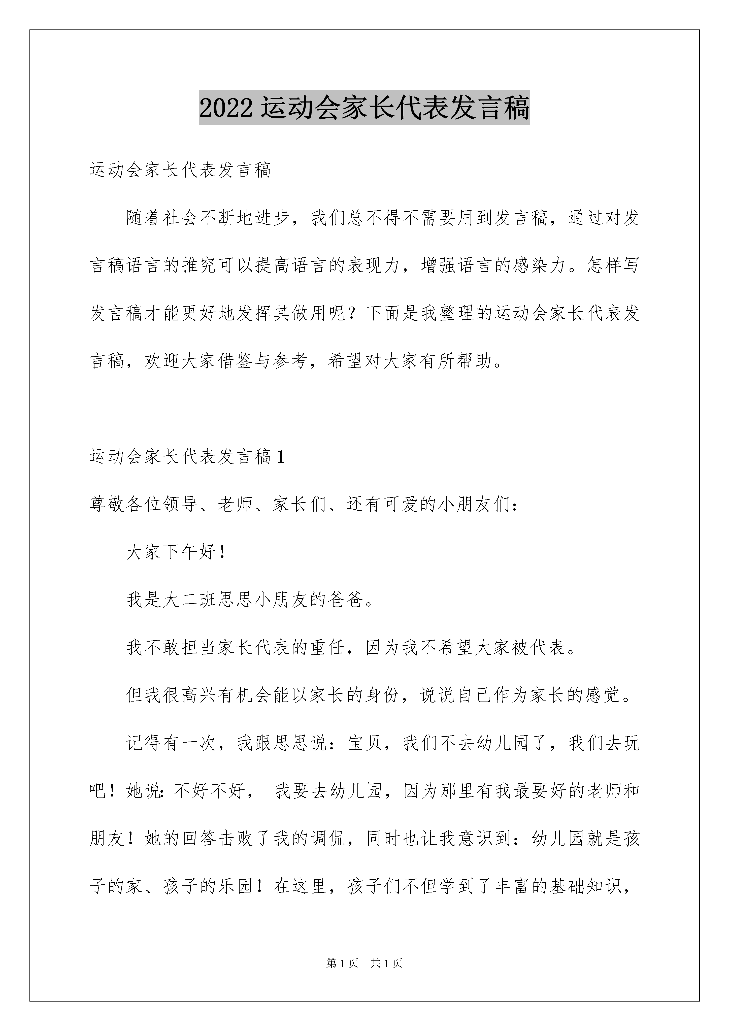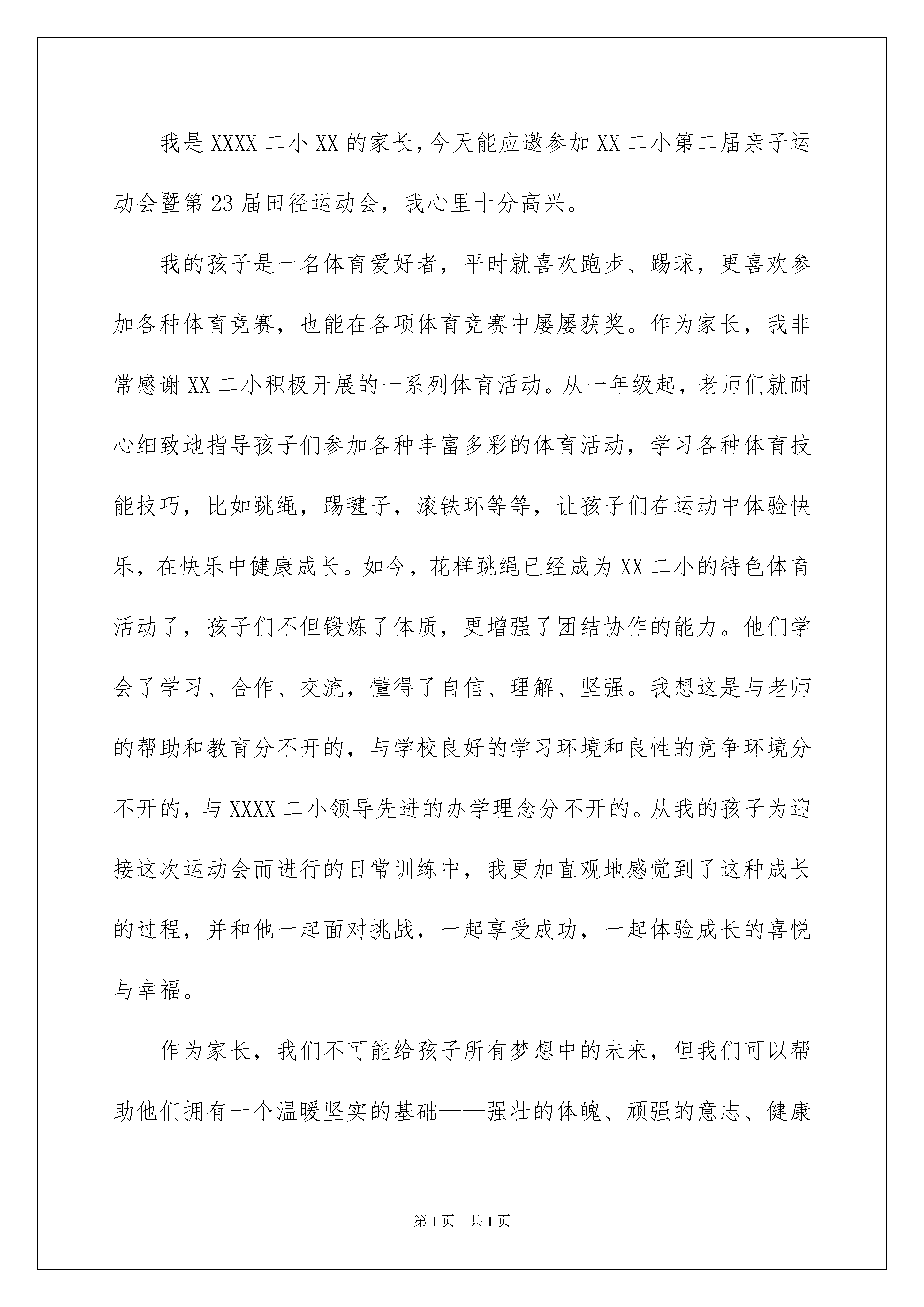 2022运动会家长代表发言稿运动会家长代表发言稿随着社会不断地进步,我们总不得不需要用到发言稿,通过对发言稿语言的推究可以提高语言的表现力,增强语言的感染力。怎样写发言稿才能更好地发挥其做用呢?下面是我整理的运动会家长代表发言稿,欢迎大家借鉴与参考,希望对大家有所帮助。运动会家长代表发言稿1尊敬各位领导、老师、家长们、还有可爱的小朋友们:大家下午好!我是大二班思思小朋友的爸爸。我不敢担当家长代表的重任,因为我不希望大家被代表。但我很高兴有机会能以家长的身份,说说自己作为家长的感觉。记得有一次,我跟思思说:宝贝,我们不去幼儿园了,我们去玩吧!她说:不好不好,我要去幼儿园,因为那里有我最要好的老师和朋友!她的回答击败了我的调侃,同时也让我意识到:幼儿园就是孩子的家、孩子的乐园!在这里,孩子们不但学到了丰富的基础知识,更学会了待人接物,学会了交朋友,学会了做人!今天,我庆幸将自己的孩子送到了XX市第一幼儿园,是你们的辛勤劳动与付出,才让我们的孩子得以健康、快乐成长,是你们的精心呵护和照顾,才让我们家长更得以安于工作!今天,我借此机会,真诚地谢谢大二班的黄老师、廖老师、颜老师、刘老师,谢谢刘园长、李园长,谢谢门卫的帅哥、漂亮的医生阿姨和食堂阿姨,谢谢幼儿园的全体园工及支持你们的家属!谢谢,谢谢!今天,刚走进校门,看着孩子们在身边嬉戏,每一位家长的脸上都洋溢着轻松的喜悦,这种感觉真好!平时周旋于紧张的工作中,回家后又忙碌于家务,和孩子心与心的沟通实在很少。总是苦口婆心地以大人的心态劝他们要这样、要那样,浮躁的生活让我们苦心安排着孩子的一切,却忘记了他们毕竟还只是刚刚入学的孩子。他们生活的主旋律应该更多的是歌声和欢笑,我们的责任不只是让他们学会知识,更需要用亲子之间心与心的沟通让他们健康而快乐地成长。虽然把孩子送进了幼儿园,但家庭教育我们责无旁贷。“家庭是幼儿园重要的合作伙伴”,父母的教育力量和榜样作用是幼儿园无法取代的。我们家长将全力支持并积极参与幼儿园举办的相关活动。今天的运动会,就是幼儿园提供给我们的又一互动平台。作为体育老师的我,深深地知道,这样的活动能培养幼儿对体育活动的兴趣,增强幼儿动作的协调性和灵活性,提高幼儿的身体素质,培养幼儿团队意识和竞争意识。也正如我们大家都希望的那样——让孩子在运动中,获得健康;在竞争中,学会合作;在游戏中,找到快乐!我们非常欢迎这样有意义的活动,既锻炼了孩子的身体,又拉近了我们和幼儿园之间的距离,达到家园共育的目的。最后,祝运动会取得圆满成功!谢谢!运动会家长代表发言稿2尊敬的园领导、老师们、小朋友们、家长朋友们:大家上午好!我们迎来了盼望已久的亲子运动会。我是xx班zz小朋友的妈妈,能够作为家长代表在这里发言,我倍感荣幸。首先请允许我代表所有家长对xx幼儿园的领导和老师们,表示最诚挚的谢意!感谢你们为孩子们的健康成长付出的辛勤劳动。作为家长,我们都希望自己的孩子有一个健康快乐的童年,都希望孩子们在幼儿园快快乐乐的成长。回首1年多的幼儿园生活,“圣诞节”活动的精彩,“六一儿童节”的快乐,等等园里一项项活动的开展,让孩子们不仅增长了见识,还锻炼了能力。和所有家长朋友一样,我们都欣喜的看到了孩子每一天都在变化,每一刻都在进步。而这一切都源于园领导和老师们对孩子的无私关爱,用智慧装点了孩子们多姿多彩的世界,用爱心呵护着孩子们快乐的童年。孩子的教育是我们做家长的这辈子经营的最大的事业,虽然他们进入了幼儿园,但是家庭教育我们责无旁贷,父母的教育和榜样是爷爷奶奶、老师们无法取代的。我真心希望每一位家长都能多陪孩子做做游戏,多参加类似的亲子活动,既可以锻炼身体,又拉近了家长与孩子间的距离。比赛的输赢并不是目的,快乐才是最重要的。让我们拉近家园的距离,用欢笑迎接每一天。最后,衷心的祝愿所有的老师、家长和小朋友们,身体健康,万事如意!并预祝xx幼儿园冬季亲子运动会取得圆满成功。谢谢大家!运动会家长代表发言稿3尊敬的各位领导、老师、各位家长,亲爱的同学们:你们好!我是XXXX二小XX的家长,今天能应邀参加XX二小第二届亲子运动会暨第23届田径运动会,我心里十分高兴。我的孩子是一名体育爱好者,平时就喜欢跑步、踢球,更喜欢参加各种体育竞赛,也能在各项体育竞赛中屡屡获奖。作为家长,我非常感谢XX二小积极开展的一系列体育活动。从一年级起,老师们就耐心细致地指导孩子们参加各种丰富多彩的体育活动,学习各种体育技能技巧,比如跳绳,踢毽子,滚铁环等等,让孩子们在运动中体验快乐,在快乐中健康成长。如今,花样跳绳已经成为XX二小的特色体育活动了,孩子们不但锻炼了体质,更增强了团结协